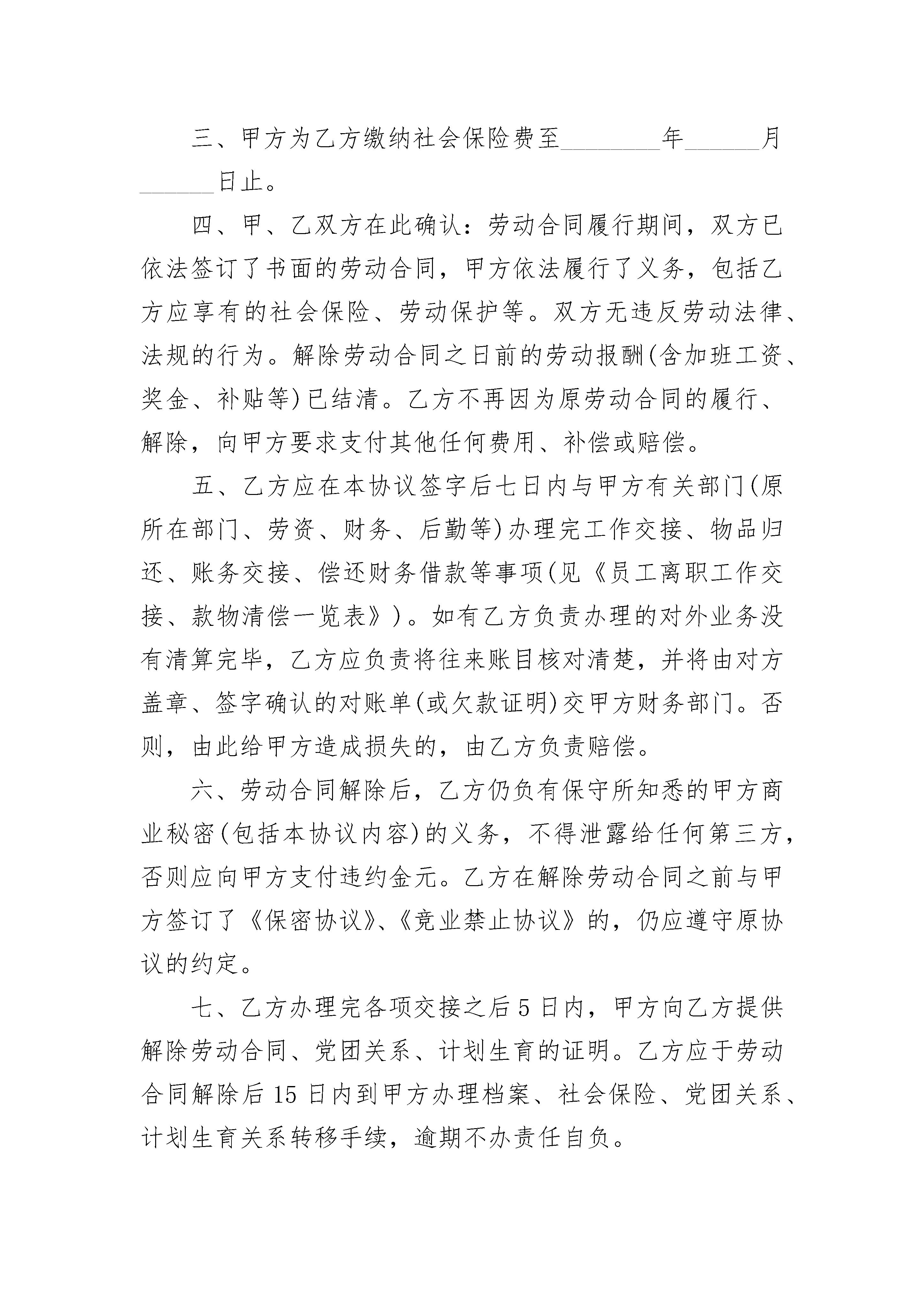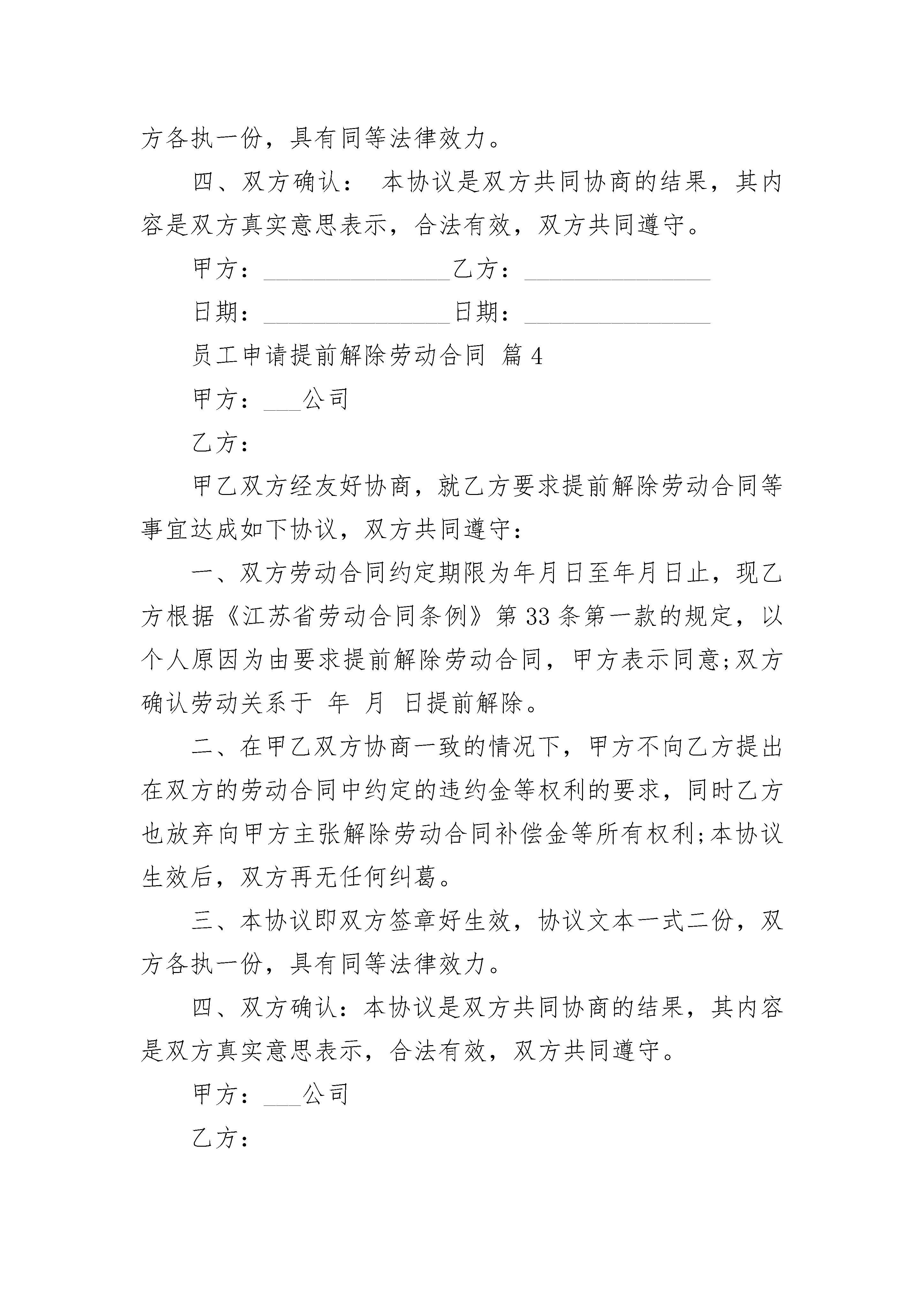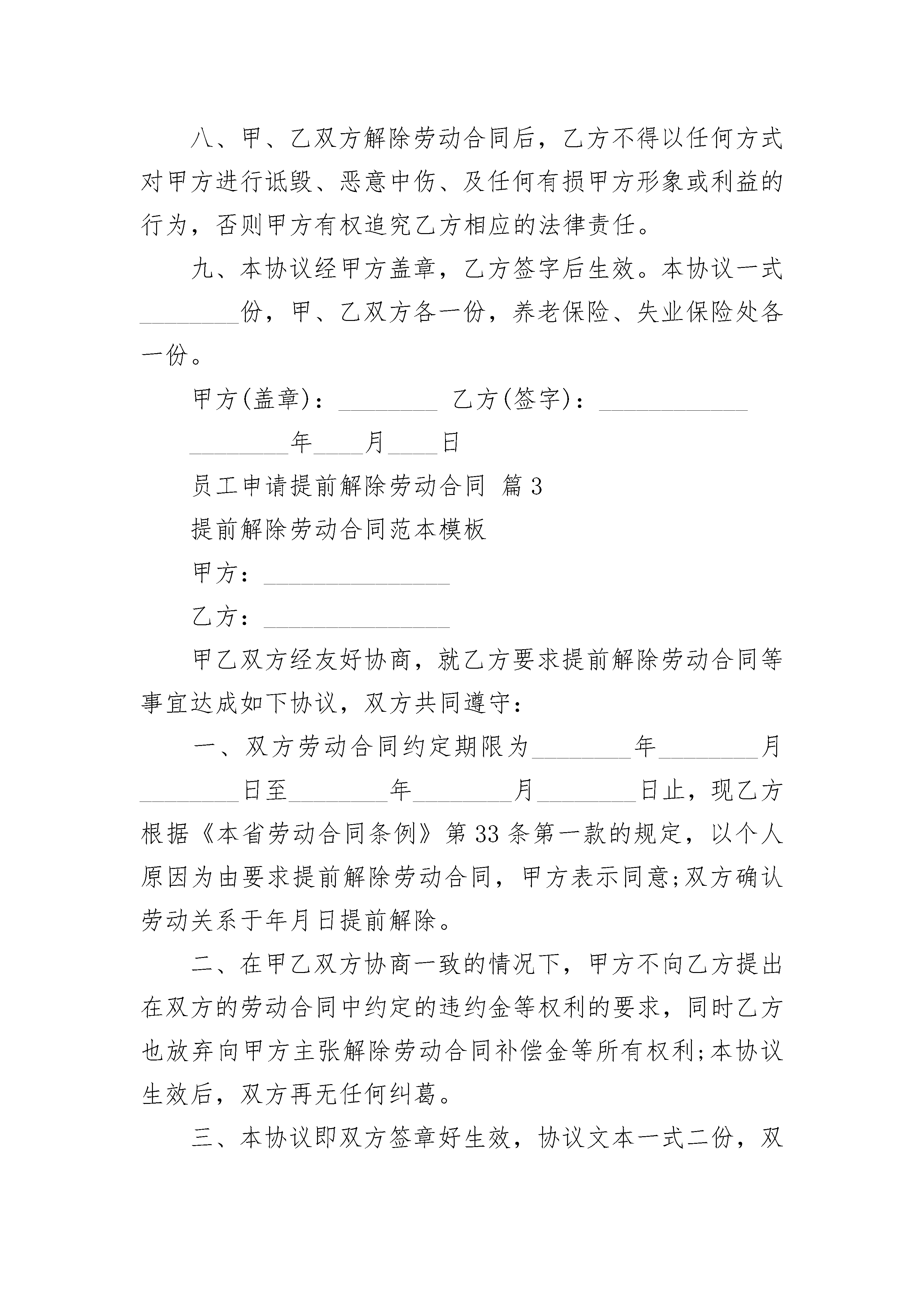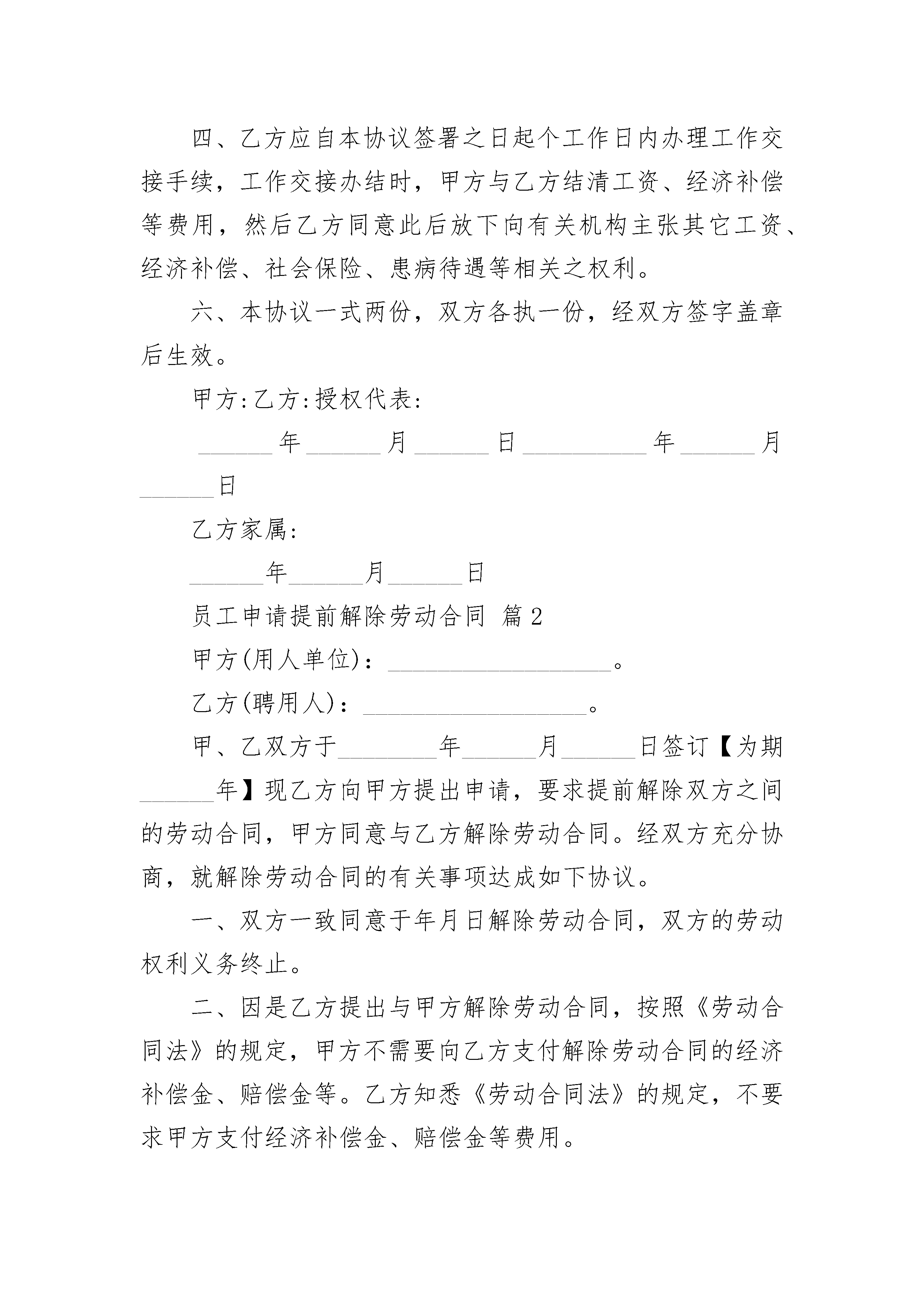 员工申请提前解除劳动合同员工申请提前解除劳动合同(通用24篇)员工申请提前解除劳动合同篇1根据保险条例规定,双方一致认为,该次事故不属于工伤范围,故乙方同意放下工伤认定申请。现因乙方在规定的医疗期满后不能从事原工作,然后是也不能从事由甲方另行安排的工作,根据乙方的申请,双方同意于年月日提前解除劳动合同关系。相关协议资料如下:一、甲方与乙方结清以下款项:1、至劳动合同关系解除之日止乙方医疗期工资______元。2、甲方发给乙方相当于个月工资的经济补偿金人民币______元。3、甲方向乙方额外支付相当于一个月工资代通知金人民币______元。4、甲方向乙方支付相当于9个月工资的医疗补助费人民币______元。上述、2、3、4项共计人民币元,乙方同意现金领取或由甲方支付到乙方工资账户中。二、乙方应于签订本协议当日内向甲方交回工作服、厂牌等属于公司的物品,甲方给乙方开具离职证明。三、乙方承诺由其自行决定是否申请劳动潜力鉴定,甲方将带给协助。四、乙方应自本协议签署之日起个工作日内办理工作交接手续,工作交接办结时,甲方与乙方结清工资、经济补偿等费用,然后乙方同意此后放下向有关机构主张其它工资、经济补偿、社会保险、患病待遇等相关之权利。六、本协议一式两份,双方各执一份,经双方签字盖章后生效。甲方:乙方:授权代表:______年______月______日__________年______月______日乙方家属:______年______月______日员工申请提前解除劳动合同篇2甲方(用人单位):__________________。乙方(聘用人):__________________。甲、乙双方于________年______月______日签订【为期______年】现乙方向甲方提出申请,要求提前解除双方之间的劳动合同,甲方同意与乙方解除劳动合同。经双方充分协商,就解除劳动合同的有关事项达成如下协议。一、双方一致同意于年月日解除劳动合同,双方的劳动权利义务终止。二、因是乙方提出与甲方解除劳动合同,按照《劳动合同法》的规定,甲方不需要向乙方支付解除劳动合同的经济补偿金、赔偿金等。乙方知悉《劳动合同法》的规定,不要求甲方支付经济补偿金、赔偿金等费用。三、甲方为乙方缴纳社会保险费至________年______月______日止。四、甲、乙双方在此确认:劳动合同履行期间,双方已依法签订了书面的劳动合同,甲方依法履行了义务,包括乙方应享有的社会保险、劳动保护等。双方无违反劳动法律、法规的行为。解除劳动合同之日前的劳动报酬(含加班工资、奖金、补贴等)已结清。乙方不再因为原劳动合同的履行、解除,向甲方要求支付其他任何费用、补偿或赔偿。五、乙方应在本协议签字后七日内与甲方有关部门(原所在部门、劳资、财务、后勤等)办理完工作交接、物品归还、账务交接、偿还财务借款等事项(见《员工离职工作交接、款物清偿一览表》)。如有乙方负责办理的对外业务没有清算完毕,乙方应负责将往来账目核对清楚,并将由对方盖章、签字确认的对账单(或欠款证明)交甲方财务部门。否则,由此给甲方造成损失的,由乙方负责赔偿。六、劳动合同解除后,乙方仍负有保守所知悉的甲方商业秘密(包括本协议内容)的义务,不得泄露给任何第三方,否则应向甲方支付违约金元。乙方在解除劳动合同之前与甲方签订了《保密协议》、《竞业禁止协议》的,仍应遵守原协议的约定。七、乙方办理完各项交接之后5日内,甲方向乙方提供解除劳动合同、党团关系、计划生育的证明。乙方应于劳动合同解除后15日内到甲方办理档案、社会保险、党团关系、计划生育关系转移手续,逾期不办责任自负。八、甲、乙双方解除劳动合同后,乙方不得以任何方式对甲方进行诋毁、恶意中伤、及任何有损甲方形象或利益的行为,否则甲方有权追究乙方相应的法律责任。九、本协议经甲方盖章,乙方签字后生效。本协议一式________份,甲、乙双方各一份,养老保险、失业保险处各一份。甲方(盖章):________乙方(签字):____________________年____月____日员工申请提前解除劳动合同篇3提前解除劳动合同范本模板甲方:_______________乙方:_______________甲乙双方经友好协商,就乙方要求提前解除劳动合同等事宜达成如下协议,双方共同遵守:一、双方劳动合同约定期限为________年________月________日至________年________月________日止,现乙方根据《本省劳动合同条例》第33条第一款的规定,以个人原因为由要求提前解除劳动合同,甲方表示同意;双方确认劳动关系于年月日提前解除。二、在甲乙双方协商一致的情况下,甲方不向乙方提出在双方的劳动合同中约定的违约金等权利的要求,同时乙方也放弃向甲方主张解除劳动合同补偿金等所