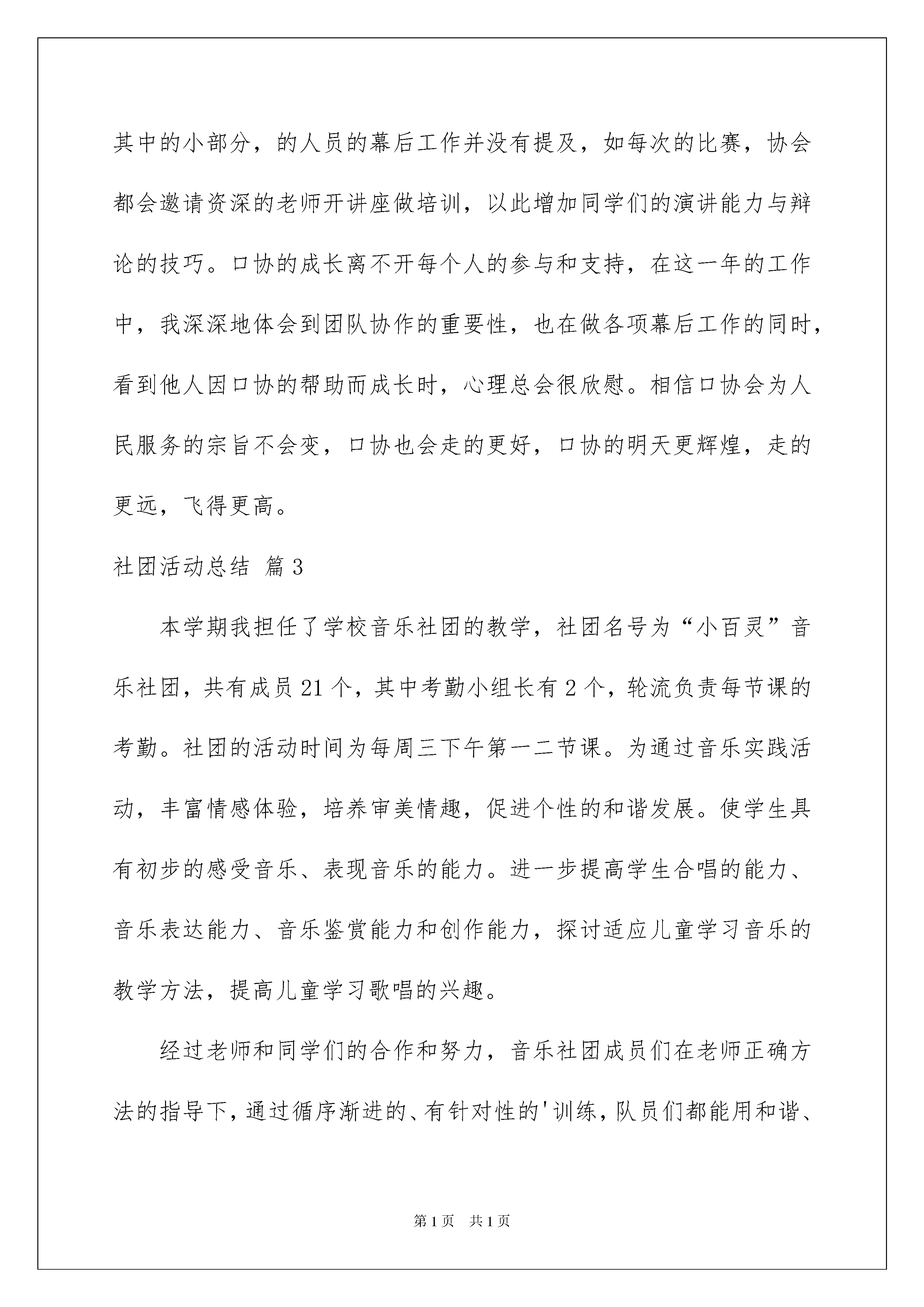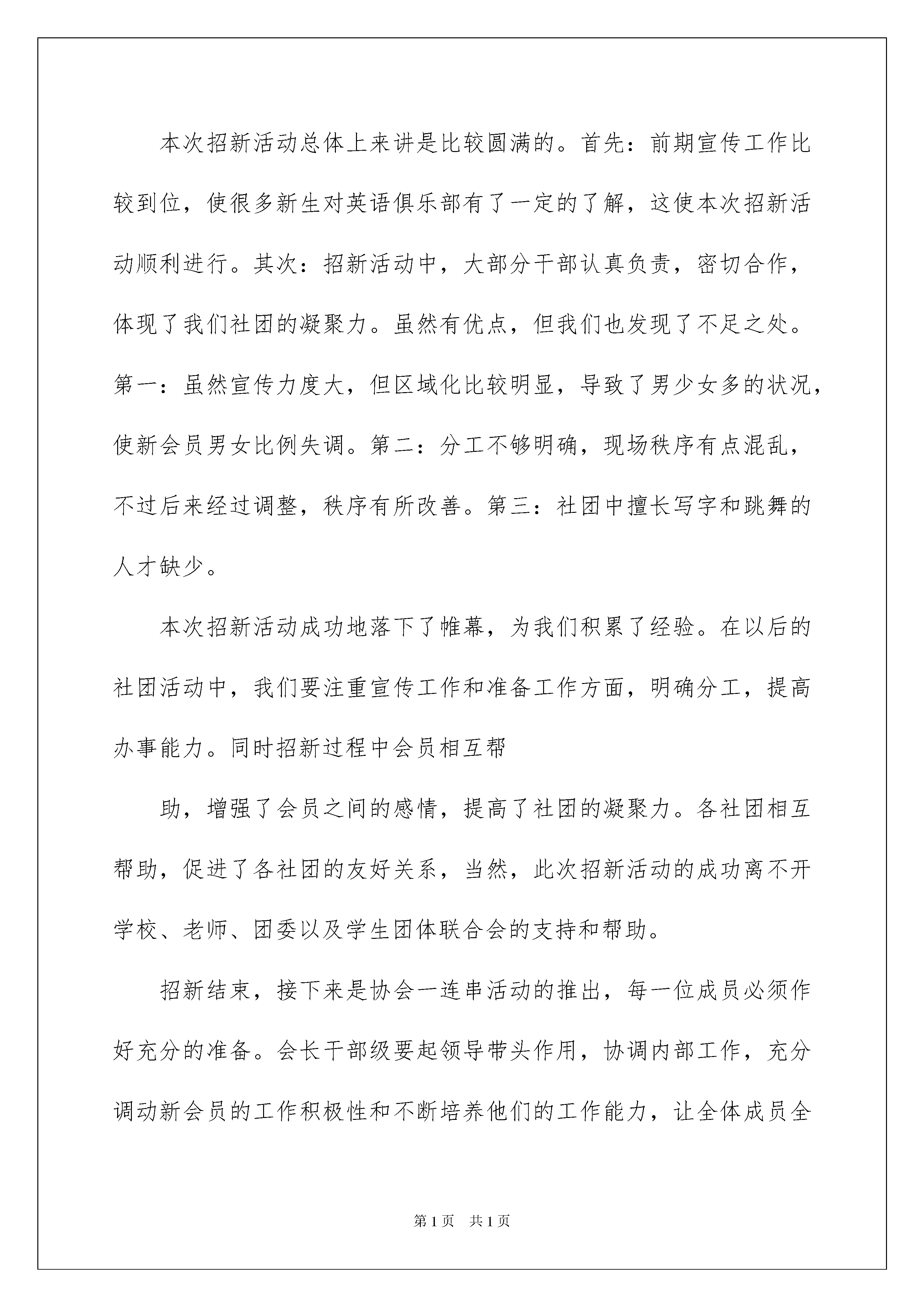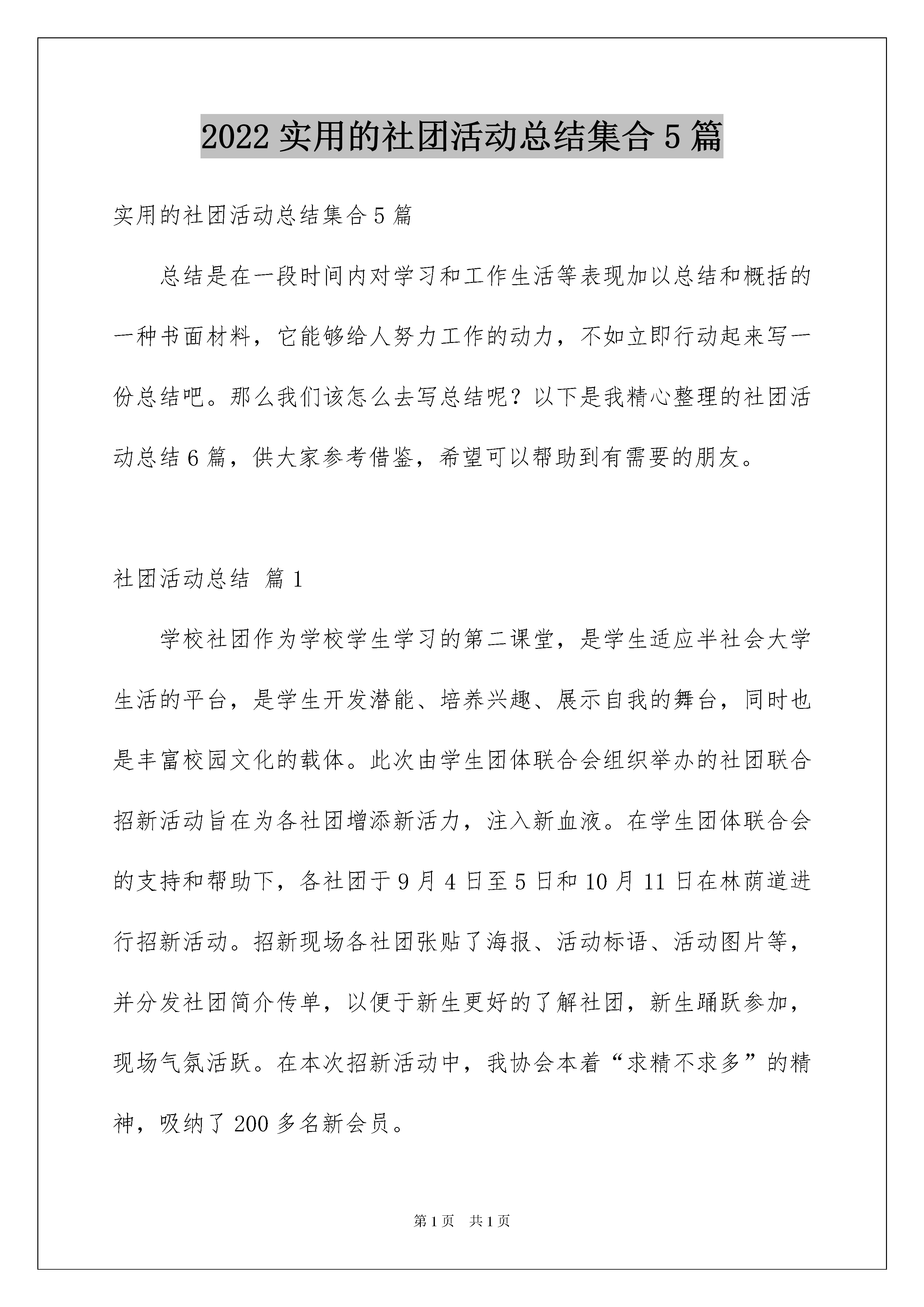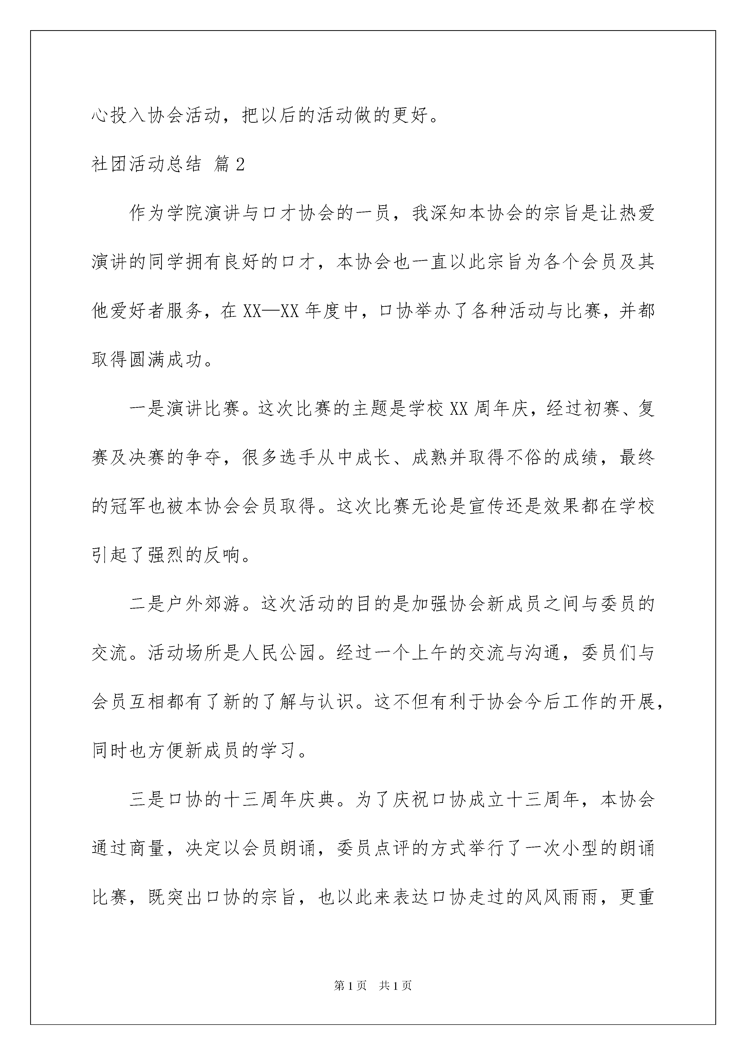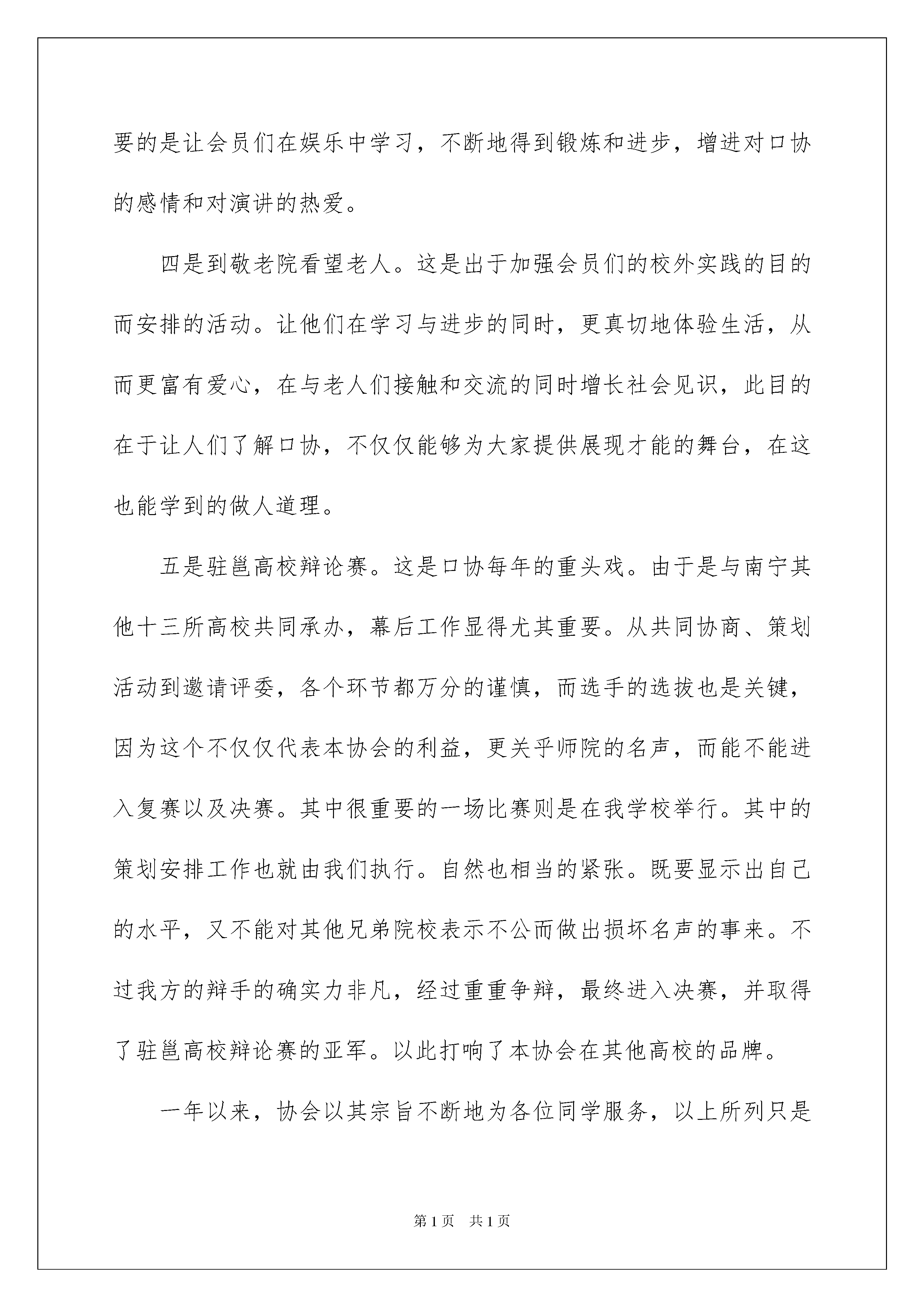 2022实用的社团活动总结集合5篇实用的社团活动总结集合5篇总结是在一段时间内对学习和工作生活等表现加以总结和概括的一种书面材料,它能够给人努力工作的动力,不如立即行动起来写一份总结吧。那么我们该怎么去写总结呢?以下是我精心整理的社团活动总结6篇,供大家参考借鉴,希望可以帮助到有需要的朋友。社团活动总结篇1学校社团作为学校学生学习的第二课堂,是学生适应半社会大学生活的平台,是学生开发潜能、培养兴趣、展示自我的舞台,同时也是丰富校园文化的载体。此次由学生团体联合会组织举办的社团联合招新活动旨在为各社团增添新活力,注入新血液。在学生团体联合会的支持和帮助下,各社团于9月4日至5日和10月11日在林荫道进行招新活动。招新现场各社团张贴了海报、活动标语、活动图片等,并分发社团简介传单,以便于新生更好的了解社团,新生踊跃参加,现场气氛活跃。在本次招新活动中,我协会本着“求精不求多”的精神,吸纳了200多名新会员。本次招新活动总体上来讲是比较圆满的。首先:前期宣传工作比较到位,使很多新生对英语俱乐部有了一定的了解,这使本次招新活动顺利进行。其次:招新活动中,大部分干部认真负责,密切合作,体现了我们社团的凝聚力。虽然有优点,但我们也发现了不足之处。第一:虽然宣传力度大,但区域化比较明显,导致了男少女多的状况,使新会员男女比例失调。第二:分工不够明确,现场秩序有点混乱,不过后来经过调整,秩序有所改善。第三:社团中擅长写字和跳舞的人才缺少。本次招新活动成功地落下了帷幕,为我们积累了经验。在以后的社团活动中,我们要注重宣传工作和准备工作方面,明确分工,提高办事能力。同时招新过程中会员相互帮助,增强了会员之间的感情,提高了社团的凝聚力。各社团相互帮助,促进了各社团的友好关系,当然,此次招新活动的成功离不开学校、老师、团委以及学生团体联合会的支持和帮助。招新结束,接下来是协会一连串活动的推出,每一位成员必须作好充分的准备。会长干部级要起领导带头作用,协调内部工作,充分调动新会员的工作积极性和不断培养他们的工作能力,让全体成员全心投入协会活动,把以后的活动做的更好。社团活动总结篇2作为学院演讲与口才协会的一员,我深知本协会的宗旨是让热爱演讲的同学拥有良好的口才,本协会也一直以此宗旨为各个会员及其他爱好者服务,在XX—XX年度中,口协举办了各种活动与比赛,并都取得圆满成功。一是演讲比赛。这次比赛的主题是学校XX周年庆,经过初赛、复赛及决赛的争夺,很多选手从中成长、成熟并取得不俗的成绩,最终的冠军也被本协会会员取得。这次比赛无论是宣传还是效果都在学校引起了强烈的反响。二是户外郊游。这次活动的目的是加强协会新成员之间与委员的交流。活动场所是人民公园。经过一个上午的交流与沟通,委员们与会员互相都有了新的了解与认识。这不但有利于协会今后工作的开展,同时也方便新成员的学习。三是口协的十三周年庆典。为了庆祝口协成立十三周年,本协会通过商量,决定以会员朗诵,委员点评的方式举行了一次小型的朗诵比赛,既突出口协的宗旨,也以此来表达口协走过的风风雨雨,更重要的是让会员们在娱乐中学习,不断地得到锻炼和进步,增进对口协的感情和对演讲的热爱。四是到敬老院看望老人。这是出于加强会员们的校外实践的目的而安排的活动。让他们在学习与进步的同时,更真切地体验生活,从而更富有爱心,在与老人们接触和交流的同时增长社会见识,此目的在于让人们了解口协,不仅仅能够为大家提供展现才能的舞台,在这也能学到的做人道理。五是驻邕高校辩论赛。这是口协每年的重头戏。由于是与南宁其他十三所高校共同承办,幕后工作显得尤其重要。从共同协商、策划活动到邀请评委,各个环节都万分的谨慎,而选手的选拔也是关键,因为这个不仅仅代表本协会的利益,更关乎师院的名声,而能不能进入复赛以及决赛。其中很重要的一场比赛则是在我学校举行。其中的策划安排工作也就由我们执行。自然也相当的紧张。既要显示出自己的水平,又不能对其他兄弟院校表示不公而做出损坏名声的事来。不过我方的辩手的确实力非凡,经过重重争辩,最终进入决赛,并取得了驻邕高校辩论赛的亚军。以此打响了本协会在其他高校的品牌。一年以来,协会以其宗旨不断地为各位同学服务,以上所列只是其中的小部分,的人员的幕后工作并没有提及,如每次的比赛,协会都会邀请资深的老师开讲座做培训,以此增加同学们的演讲能力与辩论的技巧。口协的成长离不开每个人的参与和支持,在这一年的工作中,我深深地体会到团队协作的重要性,也在做各项幕后工作的同时,看到他人因口协的帮助而成长时,心理总会很欣慰。相信口协会为人民服务的宗旨不会变,口协也会走的更好,口协的明天更辉煌,走
