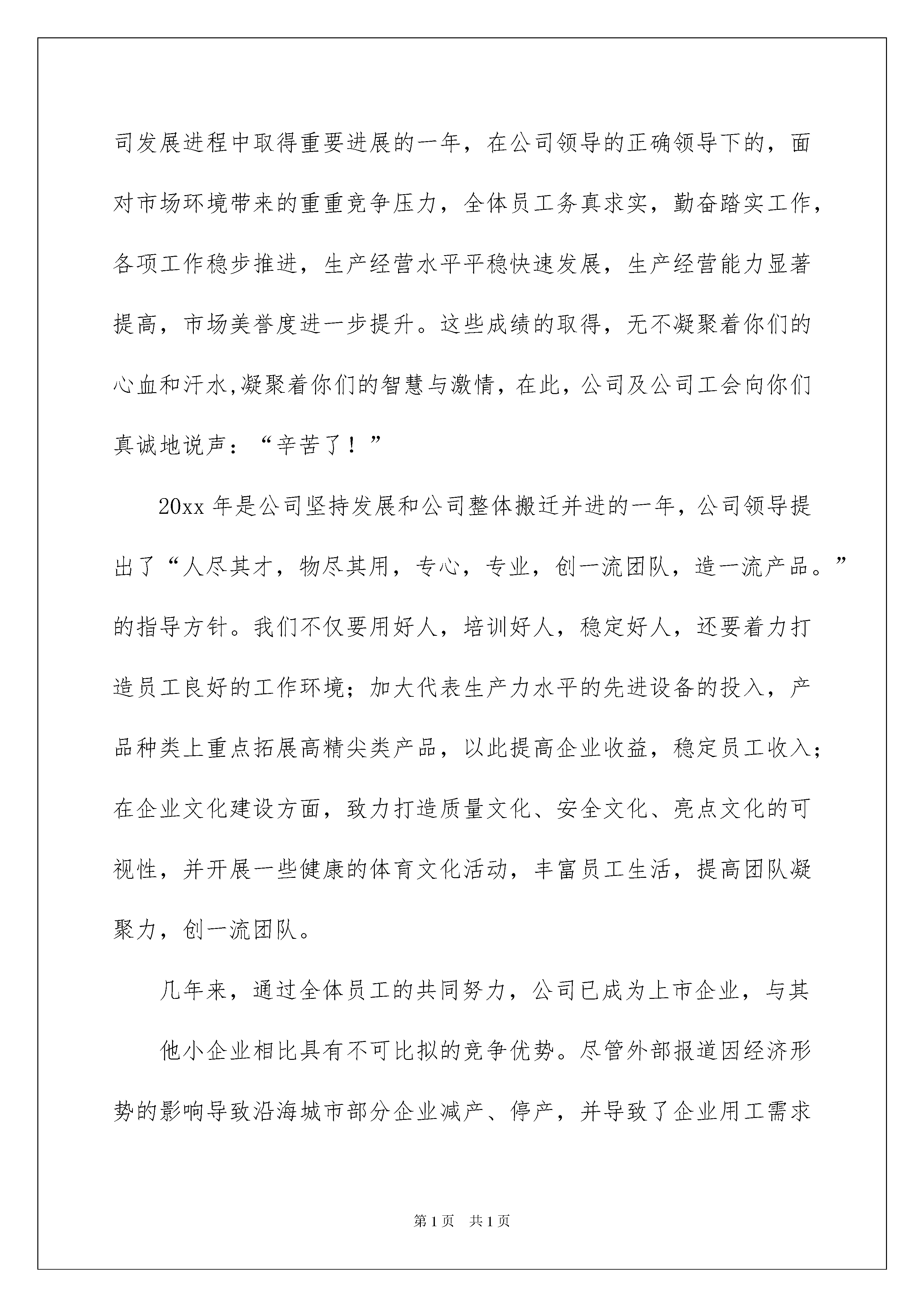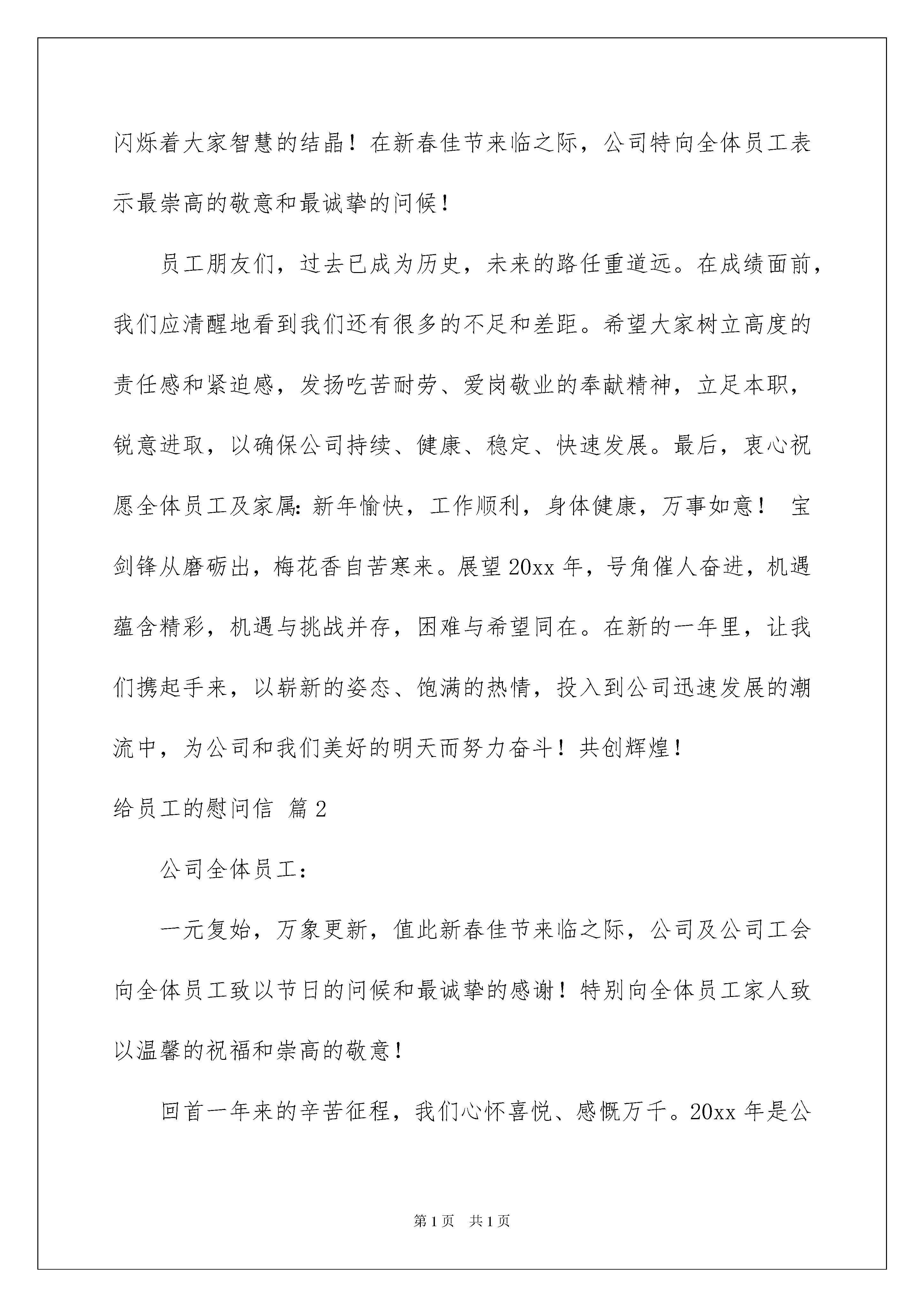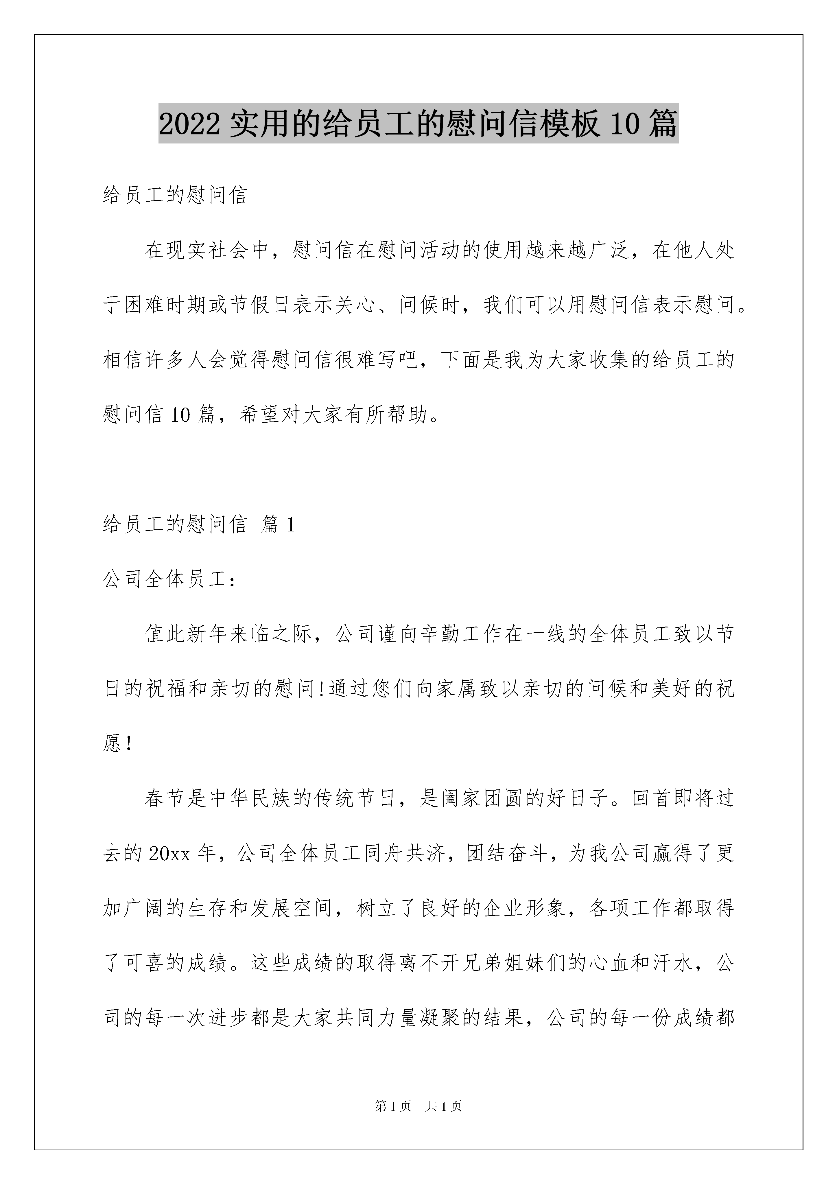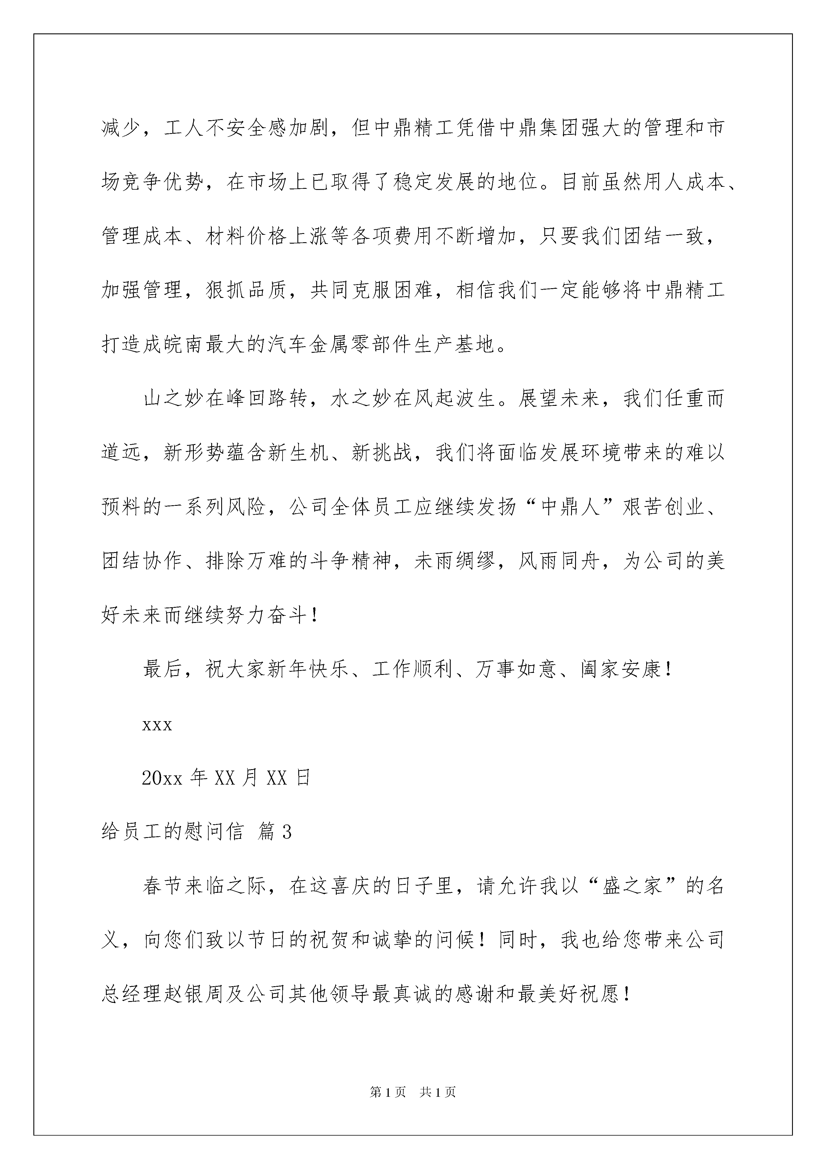 2022实用的给员工的慰问信模板10篇给员工的慰问信在现实社会中,慰问信在慰问活动的使用越来越广泛,在他人处于困难时期或节假日表示关心、问候时,我们可以用慰问信表示慰问。相信许多人会觉得慰问信很难写吧,下面是我为大家收集的给员工的慰问信10篇,希望对大家有所帮助。给员工的慰问信篇1公司全体员工:值此新年来临之际,公司谨向辛勤工作在一线的全体员工致以节日的祝福和亲切的慰问!通过您们向家属致以亲切的问候和美好的祝愿!春节是中华民族的传统节日,是阖家团圆的好日子。回首即将过去的20xx年,公司全体员工同舟共济,团结奋斗,为我公司赢得了更加广阔的生存和发展空间,树立了良好的企业形象,各项工作都取得了可喜的成绩。这些成绩的取得离不开兄弟姐妹们的心血和汗水,公司的每一次进步都是大家共同力量凝聚的结果,公司的每一份成绩都闪烁着大家智慧的结晶!在新春佳节来临之际,公司特向全体员工表示最崇高的敬意和最诚挚的问候!员工朋友们,过去已成为历史,未来的路任重道远。在成绩面前,我们应清醒地看到我们还有很多的不足和差距。希望大家树立高度的责任感和紧迫感,发扬吃苦耐劳、爱岗敬业的奉献精神,立足本职,锐意进取,以确保公司持续、健康、稳定、快速发展。最后,衷心祝愿全体员工及家属:新年愉快,工作顺利,身体健康,万事如意!宝剑锋从磨砺出,梅花香自苦寒来。展望20xx年,号角催人奋进,机遇蕴含精彩,机遇与挑战并存,困难与希望同在。在新的一年里,让我们携起手来,以崭新的姿态、饱满的热情,投入到公司迅速发展的潮流中,为公司和我们美好的明天而努力奋斗!共创辉煌!给员工的慰问信篇2公司全体员工:一元复始,万象更新,值此新春佳节来临之际,公司及公司工会向全体员工致以节日的问候和最诚挚的感谢!特别向全体员工家人致以温馨的祝福和崇高的敬意!回首一年来的辛苦征程,我们心怀喜悦、感慨万千。20xx年是公司发展进程中取得重要进展的一年,在公司领导的正确领导下的,面对市场环境带来的重重竞争压力,全体员工务真求实,勤奋踏实工作,各项工作稳步推进,生产经营水平平稳快速发展,生产经营能力显著提高,市场美誉度进一步提升。这些成绩的取得,无不凝聚着你们的心血和汗水,凝聚着你们的智慧与激情,在此,公司及公司工会向你们真诚地说声:“辛苦了!”20xx年是公司坚持发展和公司整体搬迁并进的一年,公司领导提出了“人尽其才,物尽其用,专心,专业,创一流团队,造一流产品。”的指导方针。我们不仅要用好人,培训好人,稳定好人,还要着力打造员工良好的工作环境;加大代表生产力水平的先进设备的投入,产品种类上重点拓展高精尖类产品,以此提高企业收益,稳定员工收入;在企业文化建设方面,致力打造质量文化、安全文化、亮点文化的可视性,并开展一些健康的体育文化活动,丰富员工生活,提高团队凝聚力,创一流团队。几年来,通过全体员工的共同努力,公司已成为上市企业,与其他小企业相比具有不可比拟的竞争优势。尽管外部报道因经济形势的影响导致沿海城市部分企业减产、停产,并导致了企业用工需求减少,工人不安全感加剧,但中鼎精工凭借中鼎集团强大的管理和市场竞争优势,在市场上已取得了稳定发展的地位。目前虽然用人成本、管理成本、材料价格上涨等各项费用不断增加,只要我们团结一致,加强管理,狠抓品质,共同克服困难,相信我们一定能够将中鼎精工打造成皖南最大的汽车金属零部件生产基地。山之妙在峰回路转,水之妙在风起波生。展望未来,我们任重而道远,新形势蕴含新生机、新挑战,我们将面临发展环境带来的难以预料的一系列风险,公司全体员工应继续发扬“中鼎人”艰苦创业、团结协作、排除万难的斗争精神,未雨绸缪,风雨同舟,为公司的美好未来而继续努力奋斗!最后,祝大家新年快乐、工作顺利、万事如意、阖家安康!xxx20xx年XX月XX日给员工的慰问信篇3春节来临之际,在这喜庆的日子里,请允许我以“盛之家”的名义,向您们致以节日的祝贺和诚挚的问候!同时,我也给您带来公司总经理赵银周及公司其他领导最真诚的感谢和最美好祝愿!感谢您的家属——我们忠实的员工。感谢他(她)在过去的时日里,勤勤恳恳、任劳任怨!感谢他在公司的不同岗位上所做的不懈努力!在公司的员工都知道,过去的20xx年是公司发展史上不平凡的一年,饱含着艰辛和不易,充满了挑战和考验,是催人奋进的一年。在全国经济下行压力越来越大的情况下,在上级主管部门领导及各汽车厂家领导的大力支持支持帮助下,在全体员工的精诚团结下,克服重重困难,使企业在逆境中得到平衡发展,达到了其他同行达不到的目标。当然,这些成绩的取得是您和您的家属——我们公司忠实的员工们大力支持的结果,也是全公司上下勤勉务实