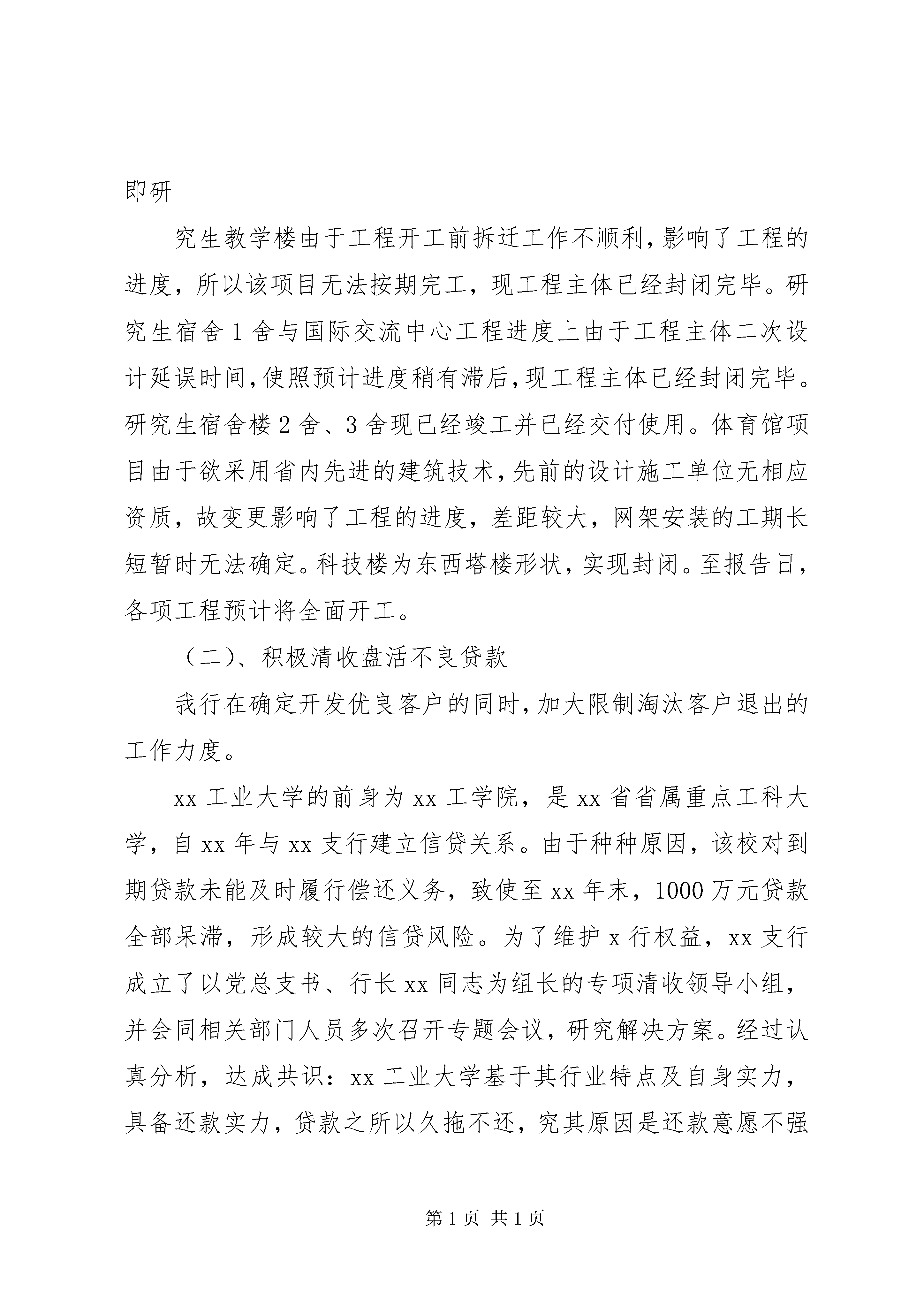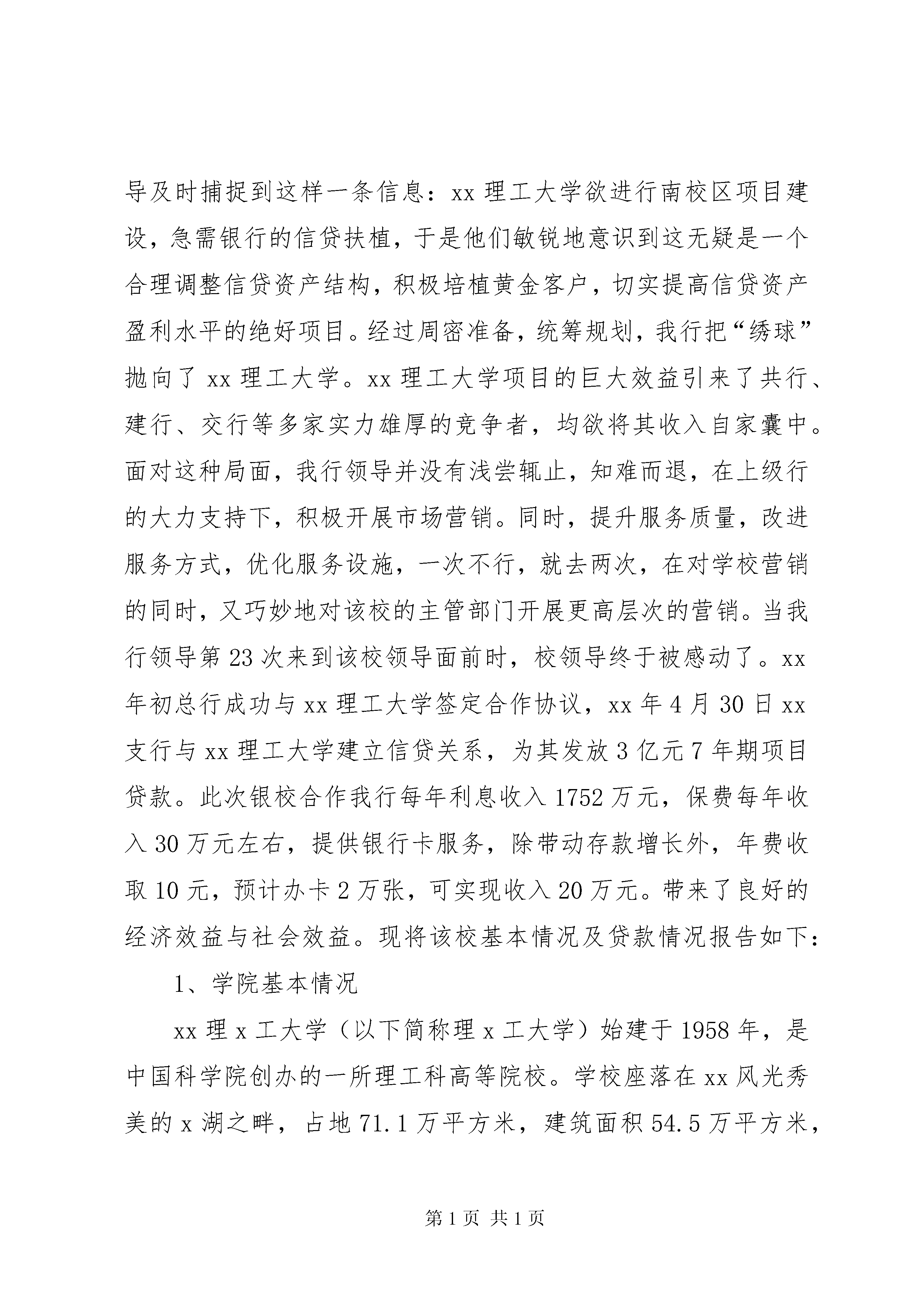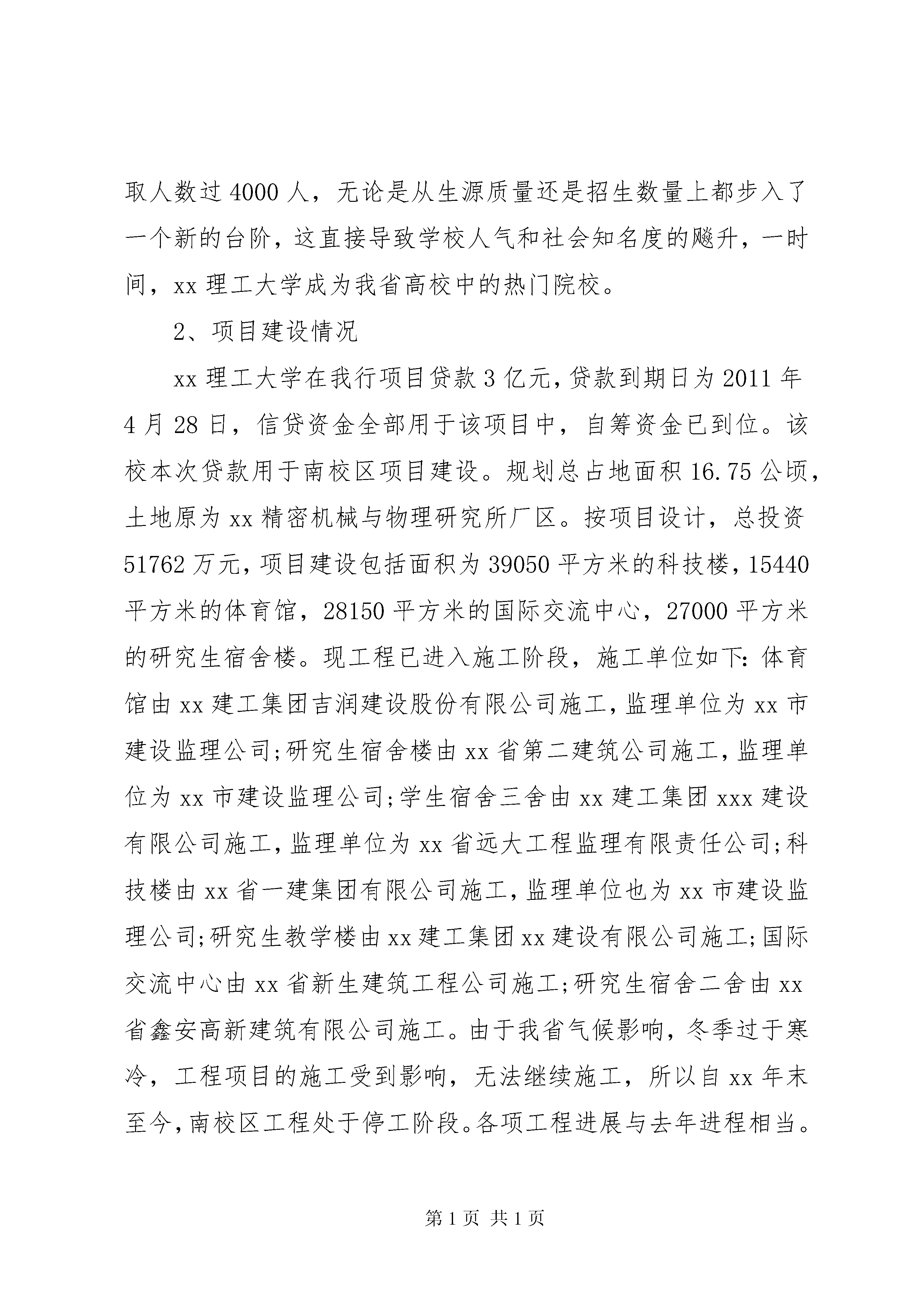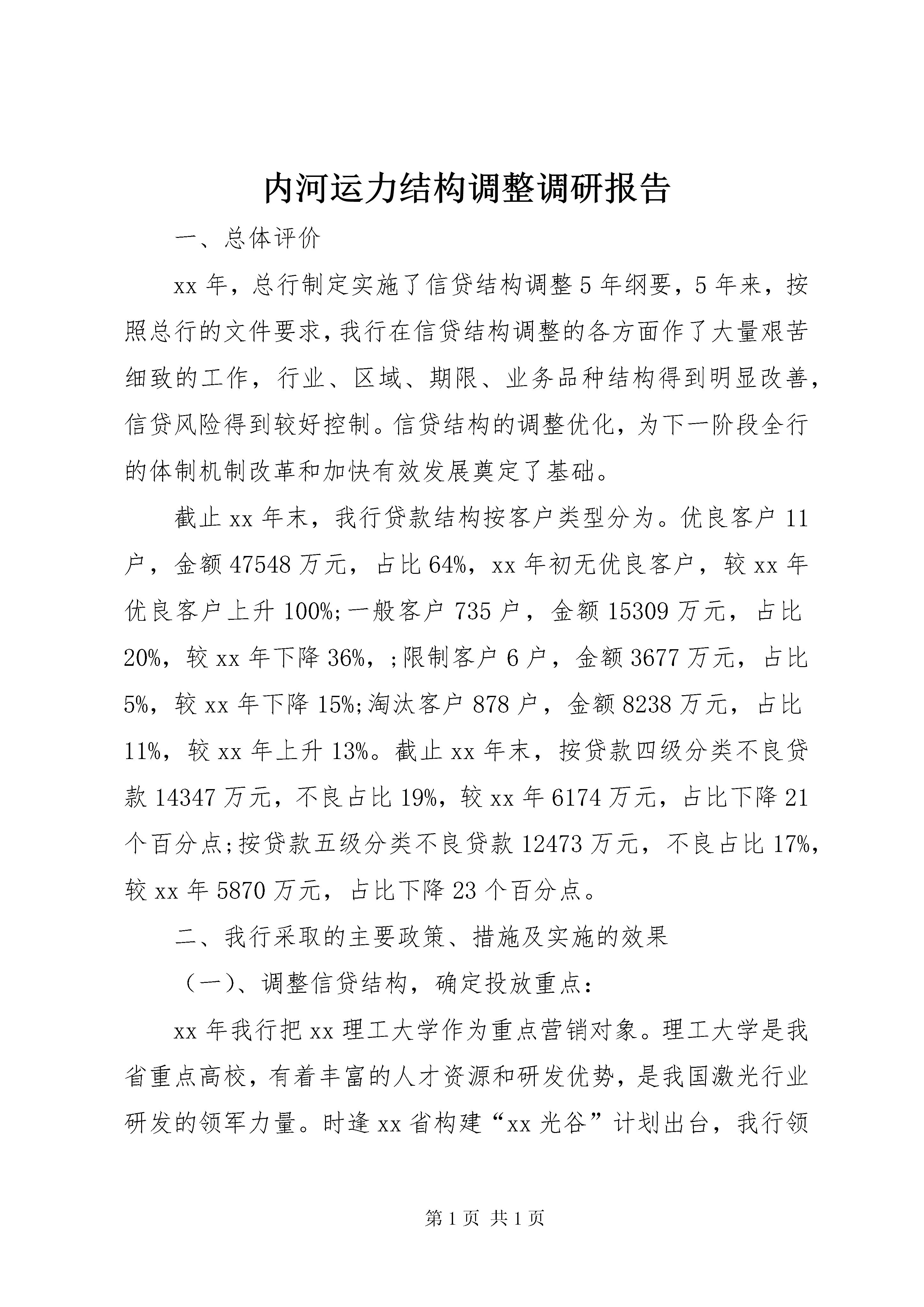 内河运力结构调整调研报告一、总体评价xx年,总行制定实施了信贷结构调整5年纲要,5年来,按照总行的文件要求,我行在信贷结构调整的各方面作了大量艰苦细致的工作,行业、区域、期限、业务品种结构得到明显改善,信贷风险得到较好控制。信贷结构的调整优化,为下一阶段全行的体制机制改革和加快有效发展奠定了基础。截止xx年末,我行贷款结构按客户类型分为。优良客户11户,金额47548万元,占比64%,xx年初无优良客户,较xx年优良客户上升100%;一般客户735户,金额15309万元,占比20%,较xx年下降36%,;限制客户6户,金额3677万元,占比5%,较xx年下降15%;淘汰客户878户,金额8238万元,占比11%,较xx年上升13%。截止xx年末,按贷款四级分类不良贷款14347万元,不良占比19%,较xx年6174万元,占比下降21个百分点;按贷款五级分类不良贷款12473万元,不良占比17%,较xx年5870万元,占比下降23个百分点。二、我行采取的主要政策、措施及实施的效果(一)、调整信贷结构,确定投放重点:xx年我行把xx理工大学作为重点营销对象。理工大学是我省重点高校,有着丰富的人才资源和研发优势,是我国激光行业研发的领军力量。时逢xx省构建“xx光谷”计划出台,我行领导及时捕捉到这样一条信息:xx理工大学欲进行南校区项目建设,急需银行的信贷扶植,于是他们敏锐地意识到这无疑是一个合理调整信贷资产结构,积极培植黄金客户,切实提高信贷资产盈利水平的绝好项目。经过周密准备,统筹规划,我行把“绣球”抛向了xx理工大学。xx理工大学项目的巨大效益引来了共行、建行、交行等多家实力雄厚的竞争者,均欲将其收入自家囊中。面对这种局面,我行领导并没有浅尝辄止,知难而退,在上级行的大力支持下,积极开展市场营销。同时,提升服务质量,改进服务方式,优化服务设施,一次不行,就去两次,在对学校营销的同时,又巧妙地对该校的主管部门开展更高层次的营销。当我行领导第23次来到该校领导面前时,校领导终于被感动了。xx年初总行成功与xx理工大学签定合作协议,xx年4月30日xx支行与xx理工大学建立信贷关系,为其发放3亿元7年期项目贷款。此次银校合作我行每年利息收入1752万元,保费每年收入30万元左右,提供银行卡服务,除带动存款增长外,年费收取10元,预计办卡2万张,可实现收入20万元。带来了良好的经济效益与社会效益。现将该校基本情况及贷款情况报告如下:1、学院基本情况xx理x工大学(以下简称理x工大学)始建于1958年,是中国科学院创办的一所理工科高等院校。学校座落在xx风光秀美的x湖之畔,占地71.1万平方米,建筑面积54.5万平方米,是一所以工为主,理工渗透,文理交融,军民兼顾,技术特色明显,重点学科优势突出,博士、硕士、本科、专科培养层次齐全,工、理、文、经、管、法多学科协调发展的多科性大学。其前身是颇负盛名的中国光学人才的摇篮——xx精密机械学院(简称xxxx学院),xx年更为现名。建校40多年来,该校聚精会神搞教育,一心一意促发展,踏踏实实,孜孜以求,各项工作屡攀新高,累计为祖国社会主义建设事业输送了4xx余名各类专门人才,赢得了政府和社会各界的充分肯定和普遍赞誉。截至xx年末,该校中外文图书120.9万册,在校本专研学生总数22659人。xx理x工大学开设省部级重点学科11个,本科专业43个,覆盖工、理、文、经、管、法6大学科门类。现有实验室56个,有教学、科研仪器设备11038台(套)。xx年,该校招生3850人,招生省份增至30个,部分或全部进入一批次录取的省份增至22个,有效地提高了生源的质量。在毕业生就业方面,由于素质过硬,毕业生受到用人单位的普遍欢迎,1998年以来,毕业生一次就业率都在95%以上。xx年一次就业率达到98.07%,被教育部授予“全国普通高等学校毕业生就业先进单位”。xx年一次就业率达到95%,在xx省高校排名位居首位。此外,该校在国际学术交流与合作方面也取得丰硕的成果,先后与多所国际知名大学建立了校际友好合作关系。xx年,学校招生形势喜人,录取分数线达到480分,较xx省录取分数线392分超出近90分,今年录取人数过4000人,无论是从生源质量还是招生数量上都步入了一个新的台阶,这直接导致学校人气和社会知名度的飚升,一时间,xx理工大学成为我省高校中的热门院校。2、项目建设情况xx理工大学在我行项目贷款3亿元,贷款到期日为2011年4月28日,信贷资金全部用于该项目中,自筹资金已到位。该校本次贷款用于南校区项目建设。规划总占地面积16.75公顷,土地原为xx精密机械与物理研究所厂区。按项目设计,总投资51762万元,项目建设包括面积为39050平方米的科技楼,15440平方米的体育馆,28