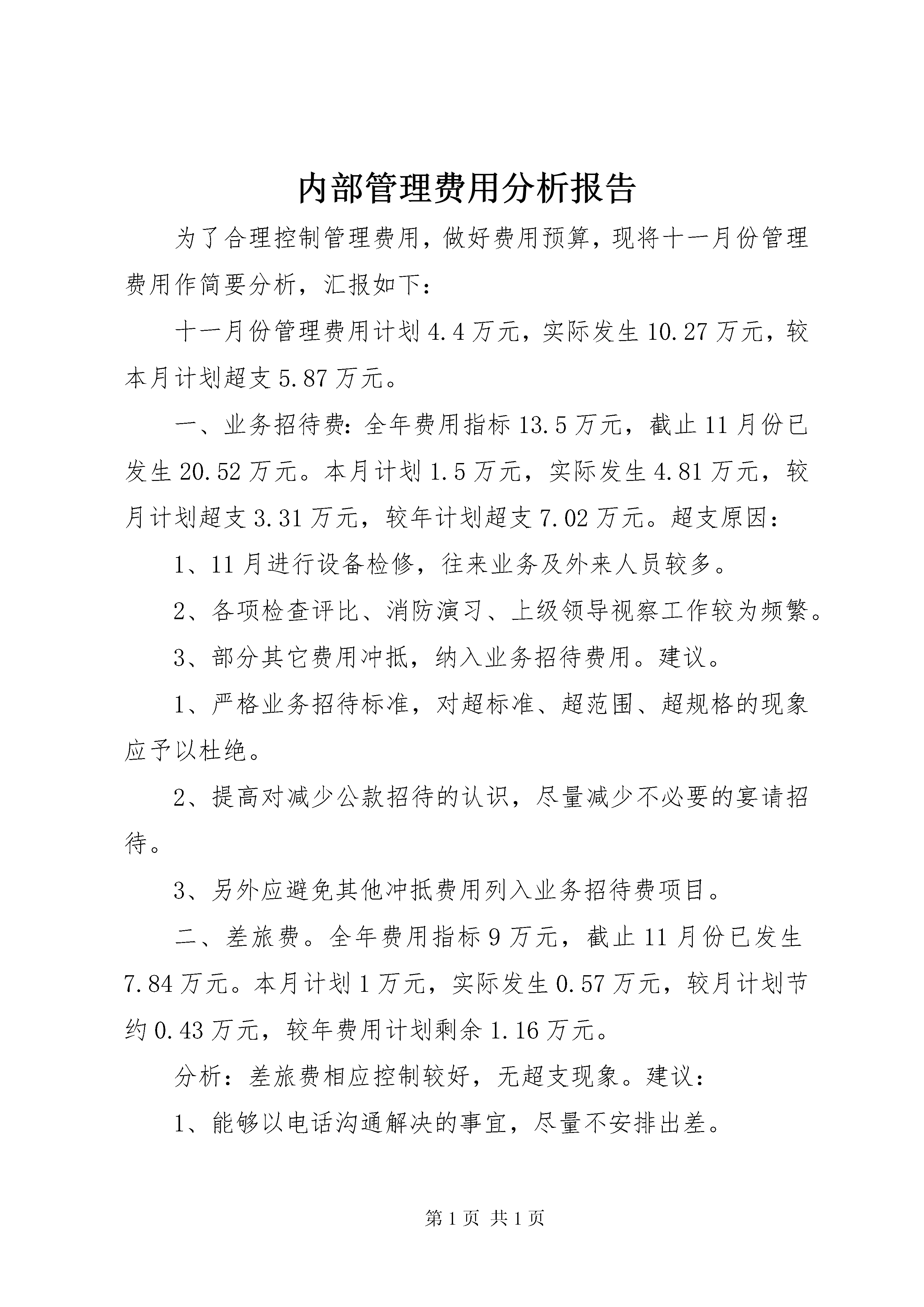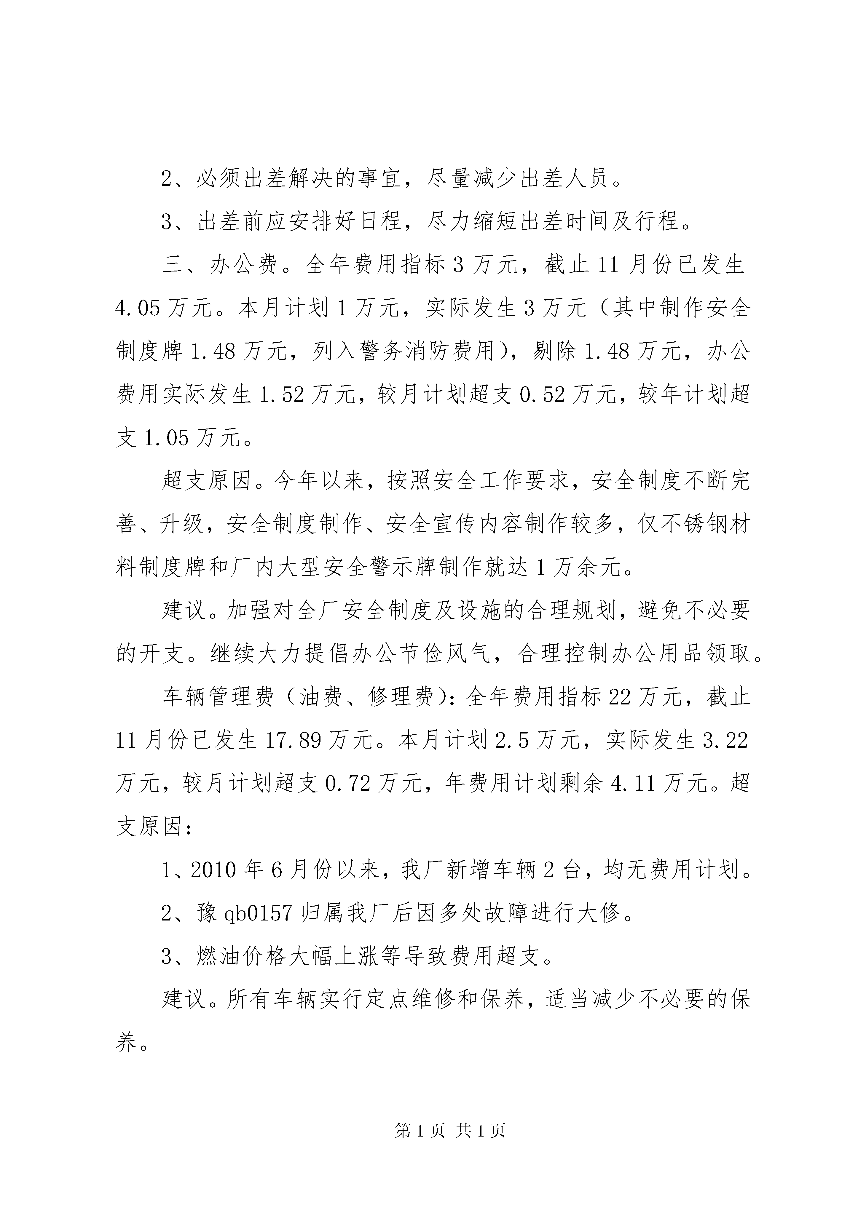 内部管理费用分析报告为了合理控制管理费用,做好费用预算,现将十一月份管理费用作简要分析,汇报如下:十一月份管理费用计划4.4万元,实际发生10.27万元,较本月计划超支5.87万元。一、业务招待费:全年费用指标13.5万元,截止11月份已发生20.52万元。本月计划1.5万元,实际发生4.81万元,较月计划超支3.31万元,较年计划超支7.02万元。超支原因:1、11月进行设备检修,往来业务及外来人员较多。2、各项检查评比、消防演习、上级领导视察工作较为频繁。3、部分其它费用冲抵,纳入业务招待费用。建议。1、严格业务招待标准,对超标准、超范围、超规格的现象应予以杜绝。2、提高对减少公款招待的认识,尽量减少不必要的宴请招待。3、另外应避免其他冲抵费用列入业务招待费项目。二、差旅费。全年费用指标9万元,截止11月份已发生7.84万元。本月计划1万元,实际发生0.57万元,较月计划节约0.43万元,较年费用计划剩余1.16万元。分析:差旅费相应控制较好,无超支现象。建议:1、能够以电话沟通解决的事宜,尽量不安排出差。2、必须出差解决的事宜,尽量减少出差人员。3、出差前应安排好日程,尽力缩短出差时间及行程。三、办公费。全年费用指标3万元,截止11月份已发生4.05万元。本月计划1万元,实际发生3万元(其中制作安全制度牌1.48万元,列入警务消防费用),剔除1.48万元,办公费用实际发生1.52万元,较月计划超支0.52万元,较年计划超支1.05万元。超支原因。今年以来,按照安全工作要求,安全制度不断完善、升级,安全制度制作、安全宣传内容制作较多,仅不锈钢材料制度牌和厂内大型安全警示牌制作就达1万余元。建议。加强对全厂安全制度及设施的合理规划,避免不必要的开支。继续大力提倡办公节俭风气,合理控制办公用品领取。车辆管理费(油费、修理费):全年费用指标22万元,截止11月份已发生17.89万元。本月计划2.5万元,实际发生3.22万元,较月计划超支0.72万元,年费用计划剩余4.11万元。超支原因:1、2010年6月份以来,我厂新增车辆2台,均无费用计划。2、豫qb0157归属我厂后因多处故障进行大修。3、燃油价格大幅上涨等导致费用超支。建议。所有车辆实行定点维修和保养,适当减少不必要的保养。四、通讯费。全年费用指标5万元,截止11月份已发生4.86万元。11月实际发生0.18万元。分析:2010年通讯费用基本在可控范围,由于新增班子成员暂无通讯费用,导致该项费用略微超支。建议:1、增加2011年班子成员通讯费用。2、厂内部事务尽量使用内线电话,减少手机通话。通过以上分析,由于2010年初公司下达管理费用较少,导致部分费用略微超支,建议明年管理费用预算酌情增加。办公室2010年12月6日第二篇:医院内部成本费用管理制度医院内部成本费用管理制度为增强企业自我约束机制,控制财务支出,降低成本费用,保障资金安全,维护股东合法权益,特制定本规定:成本费用贯穿医院的整个经营过程,加强成本费用管理和控制,是提高医院经济效益的重要环节。成本费用的管理,需要全院员工的积极参与。(一)成本费用的内容和开支范围结合医院的特点,成本费用项目包括;各种人力成本(工资费用等)、材料成本(包括医用设备成本、医用器材成本)、血液成本、保障服务成本、药品成本、各种管理费用、其他支出等。(二)成本费用分摊的原则;受益原则,谁受益,谁负担;配比原则,即收入与成本相互配比。(三)各项具体成本费用的分摊标准1、人力成本的控制,人力成本包括人员工资、补贴、津贴、奖金、社会保障费等用于个人部分的各项支出。工资费用根据各科室的实际工资发放数计入科室成本。2、医用设备成本的分摊(1)科室所使用设备的折旧费、修理费由其使用部门负担。(2)医用车、台、柜、架类的修理费由其使用部门负担。(3)医用设备材料在领用时,计入其使用部门成本。3、医用器材成本。各种医用小型器械和消耗材料,包括手术、诊疗等器械和耗材,医用敷料、医用气体、医用仪器维修配件等,在领用时由使用部门负担。4、外购血液成本,由使用部门负担。5、各科室领用的各类药品,以零售价计入成本。6、医用图书购置费,能明确购买单位的,计入使用部门成本。7、被服费,按实际发生费用计入科室成本。8、各种管理费用,包括公杂费、邮电费、印刷费、差旅费、会议费、业务招待费、广告宣传费、水电费等,按实际发生费用计入科室成本。9、财务费用,主要是银行借款利息及手续费,按借款用途及所购的物资使用部门分摊计入科室成本。10、其他支出,主要包括医疗欠费赔偿、固定资产盘亏损失、医疗事故赔偿等,按实际发生的费用计入科室成本。11、间接成本费用(管理部门、后勤部门、车辆费用)是否分摊计入科室成本,另行规定。第三篇:企业费用管理系统可行性分析报告