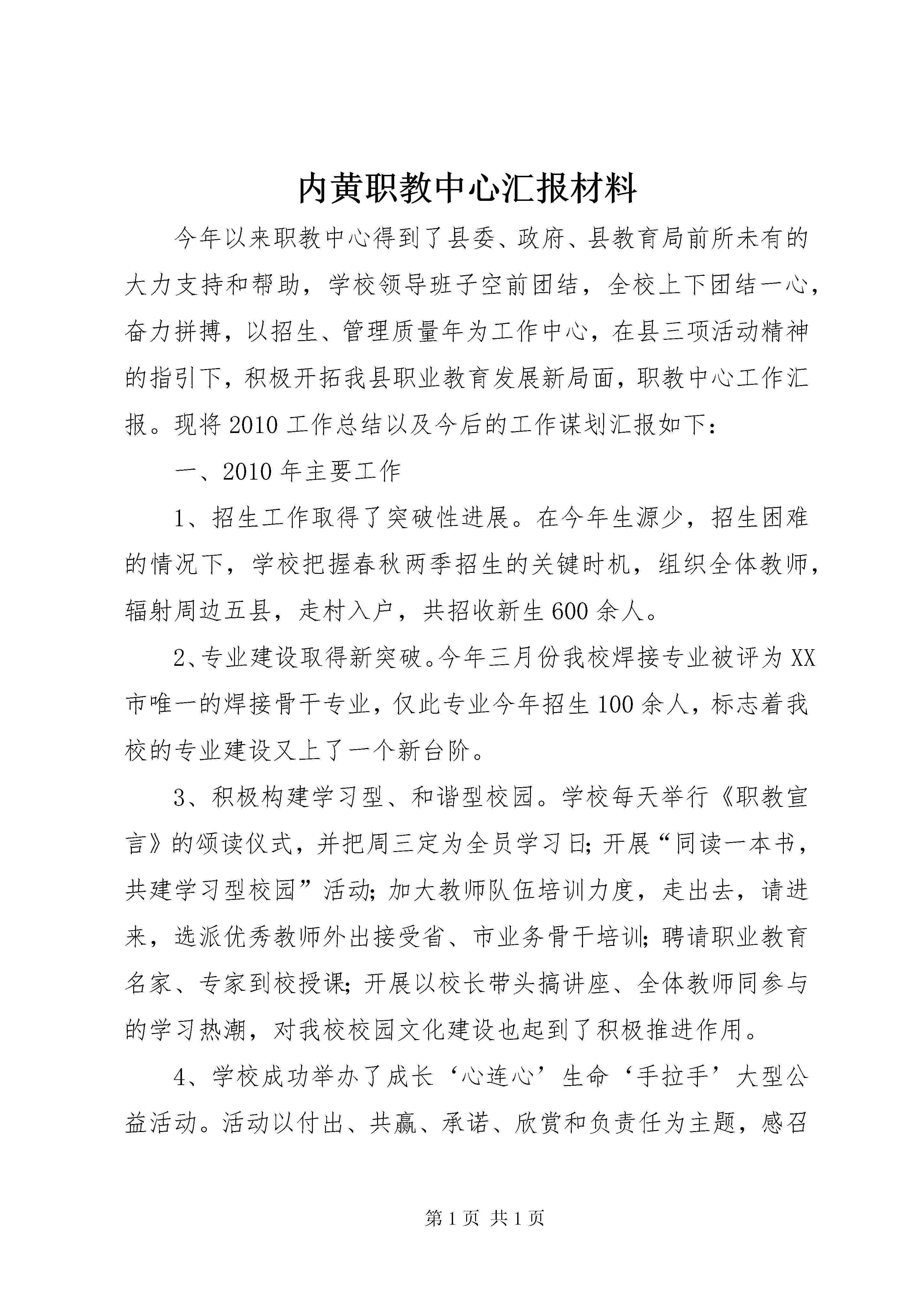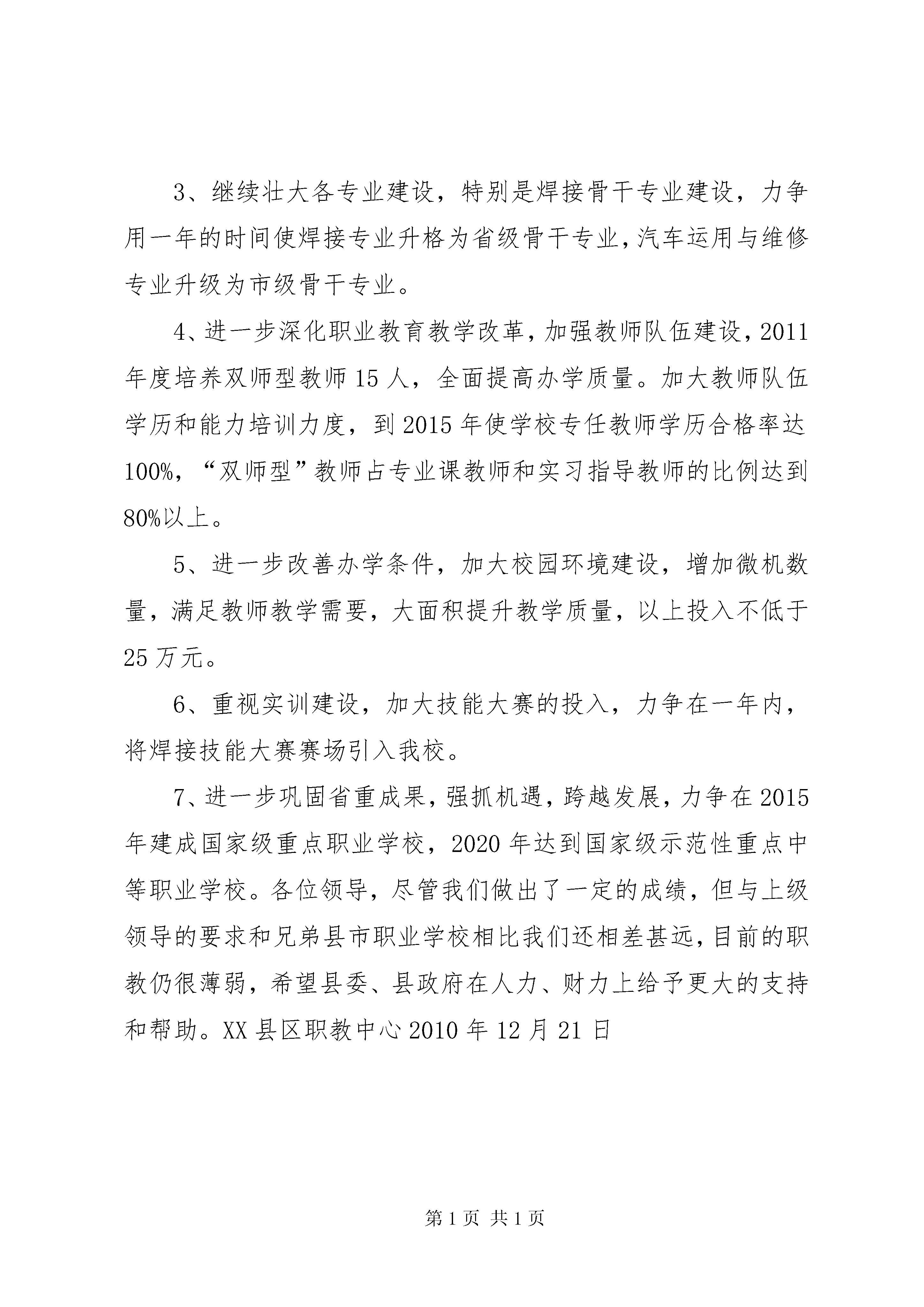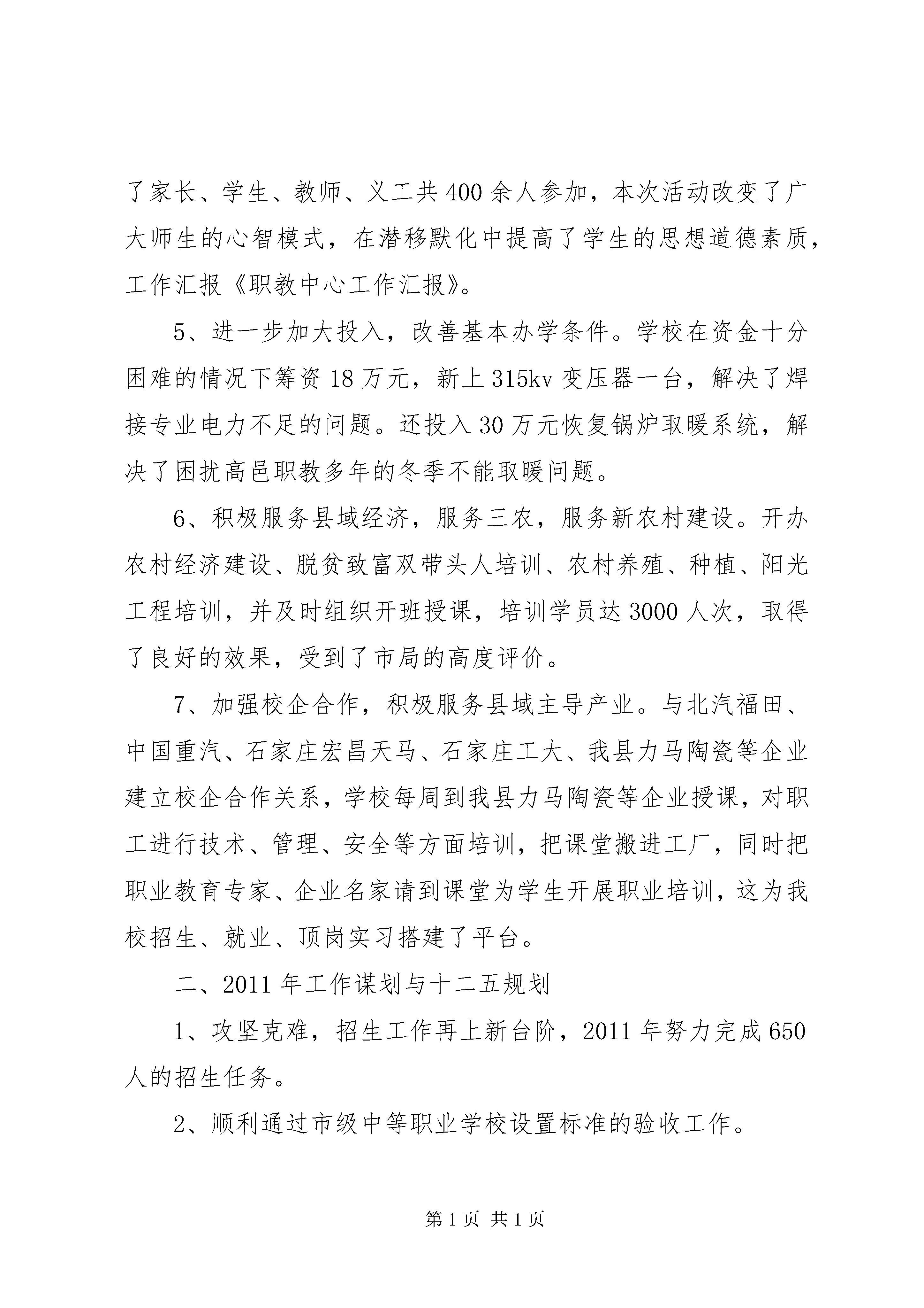 内黄职教中心汇报材料今年以来职教中心得到了县委、政府、县教育局前所未有的大力支持和帮助,学校领导班子空前团结,全校上下团结一心,奋力拼搏,以招生、管理质量年为工作中心,在县三项活动精神的指引下,积极开拓我县职业教育发展新局面,职教中心工作汇报。现将2010工作总结以及今后的工作谋划汇报如下:一、2010年主要工作1、招生工作取得了突破性进展。在今年生源少,招生困难的情况下,学校把握春秋两季招生的关键时机,组织全体教师,辐射周边五县,走村入户,共招收新生600余人。2、专业建设取得新突破。今年三月份我校焊接专业被评为XX市唯一的焊接骨干专业,仅此专业今年招生100余人,标志着我校的专业建设又上了一个新台阶。3、积极构建学习型、和谐型校园。学校每天举行《职教宣言》的颂读仪式,并把周三定为全员学习日;开展“同读一本书,共建学习型校园”活动;加大教师队伍培训力度,走出去,请进来,选派优秀教师外出接受省、市业务骨干培训;聘请职业教育名家、专家到校授课;开展以校长带头搞讲座、全体教师同参与的学习热潮,对我校校园文化建设也起到了积极推进作用。4、学校成功举办了成长‘心连心’生命‘手拉手’大型公益活动。活动以付出、共赢、承诺、欣赏和负责任为主题,感召了家长、学生、教师、义工共400余人参加,本次活动改变了广大师生的心智模式,在潜移默化中提高了学生的思想道德素质,工作汇报《职教中心工作汇报》。5、进一步加大投入,改善基本办学条件。学校在资金十分困难的情况下筹资18万元,新上315kv变压器一台,解决了焊接专业电力不足的问题。还投入30万元恢复锅炉取暖系统,解决了困扰高邑职教多年的冬季不能取暖问题。6、积极服务县域经济,服务三农,服务新农村建设。开办农村经济建设、脱贫致富双带头人培训、农村养殖、种植、阳光工程培训,并及时组织开班授课,培训学员达3000人次,取得了良好的效果,受到了市局的高度评价。7、加强校企合作,积极服务县域主导产业。与北汽福田、中国重汽、石家庄宏昌天马、石家庄工大、我县力马陶瓷等企业建立校企合作关系,学校每周到我县力马陶瓷等企业授课,对职工进行技术、管理、安全等方面培训,把课堂搬进工厂,同时把职业教育专家、企业名家请到课堂为学生开展职业培训,这为我校招生、就业、顶岗实习搭建了平台。二、2011年工作谋划与十二五规划1、攻坚克难,招生工作再上新台阶,2011年努力完成650人的招生任务。2、顺利通过市级中等职业学校设置标准的验收工作。3、继续壮大各专业建设,特别是焊接骨干专业建设,力争用一年的时间使焊接专业升格为省级骨干专业,汽车运用与维修专业升级为市级骨干专业。4、进一步深化职业教育教学改革,加强教师队伍建设,2011年度培养双师型教师15人,全面提高办学质量。加大教师队伍学历和能力培训力度,到2015年使学校专任教师学历合格率达100%,“双师型”教师占专业课教师和实习指导教师的比例达到80%以上。5、进一步改善办学条件,加大校园环境建设,增加微机数量,满足教师教学需要,大面积提升教学质量,以上投入不低于25万元。6、重视实训建设,加大技能大赛的投入,力争在一年内,将焊接技能大赛赛场引入我校。7、进一步巩固省重成果,强抓机遇,跨越发展,力争在2015年建成国家级重点职业学校,2020年达到国家级示范性重点中等职业学校。各位领导,尽管我们做出了一定的成绩,但与上级领导的要求和兄弟县市职业学校相比我们还相差甚远,目前的职教仍很薄弱,希望县委、县政府在人力、财力上给予更大的支持和帮助。XX县区职教中心2010年12月21日