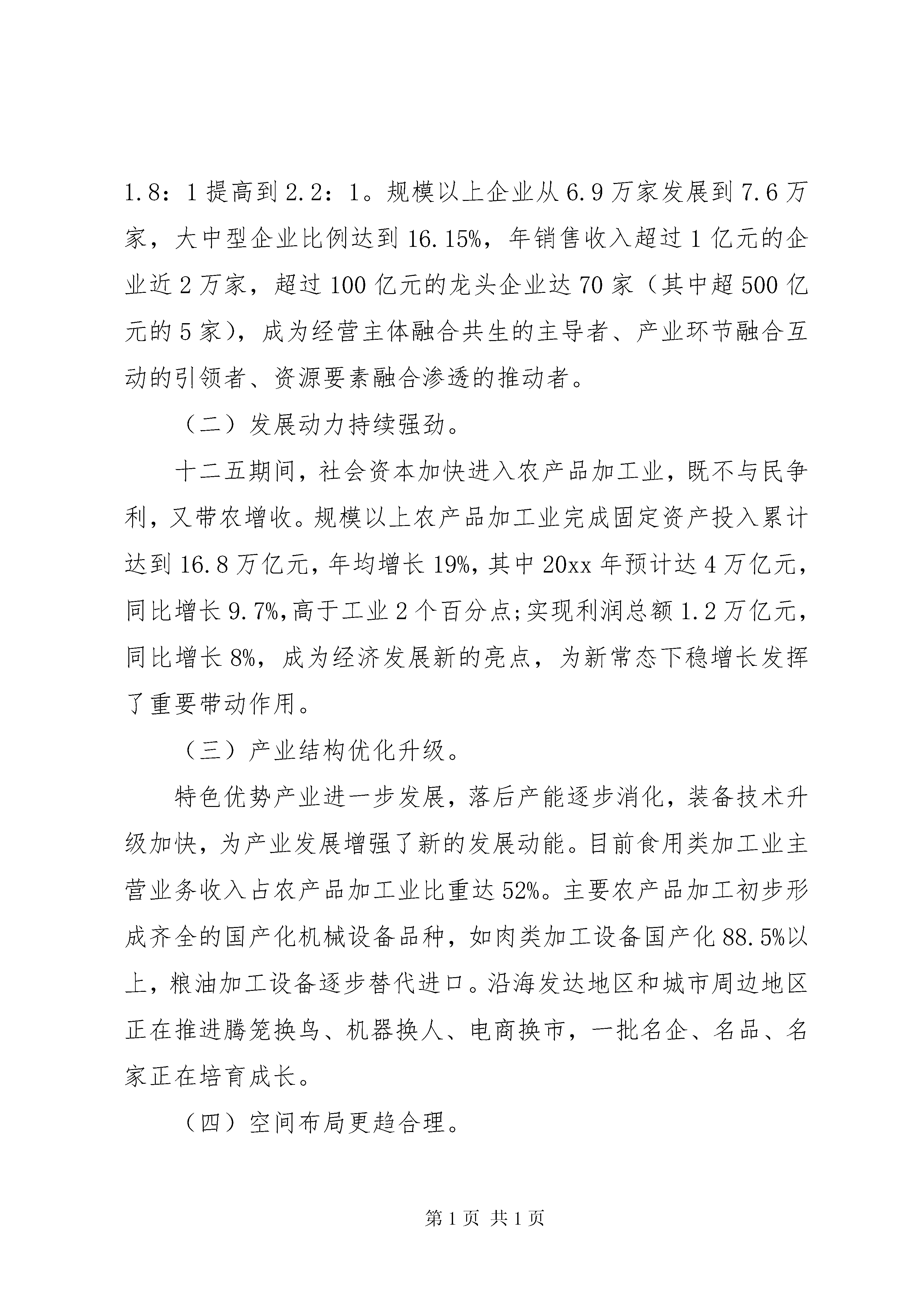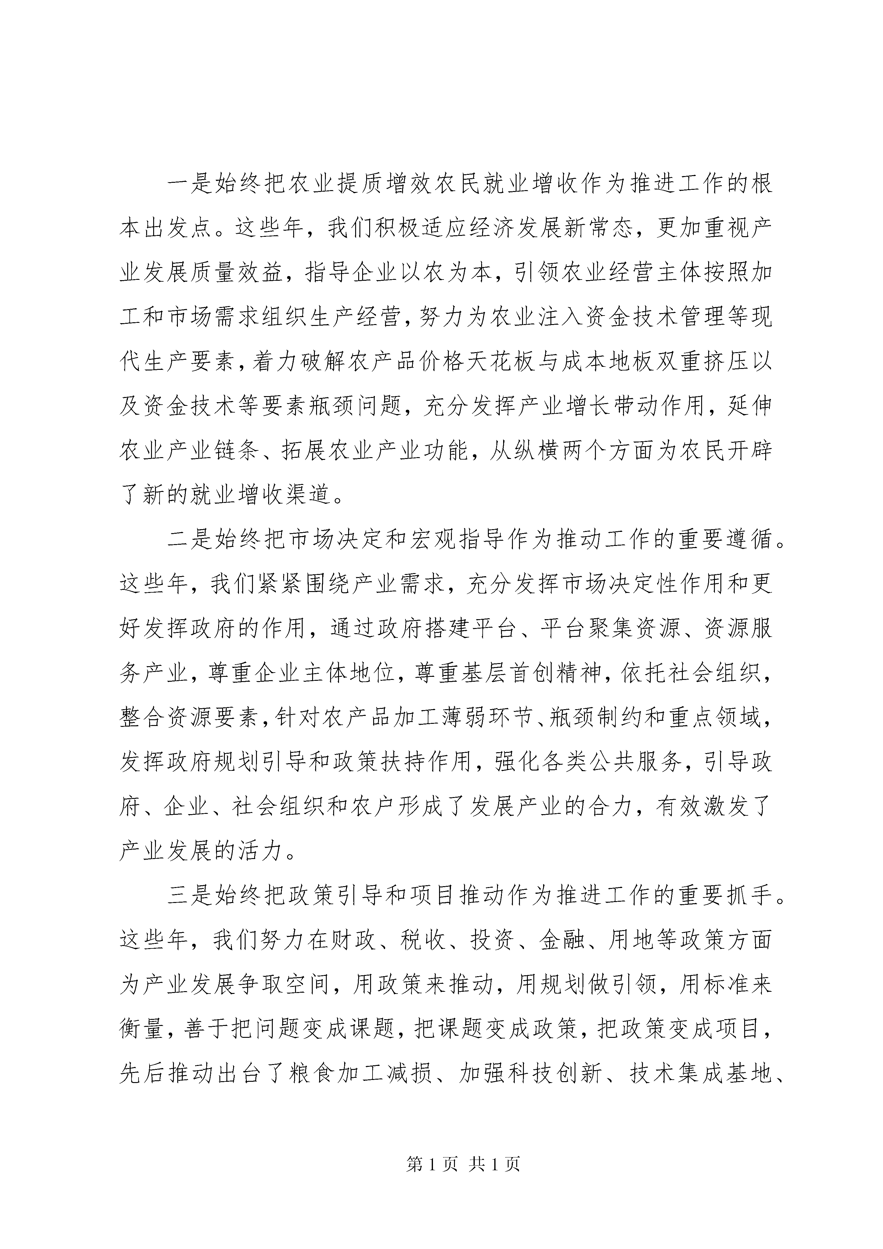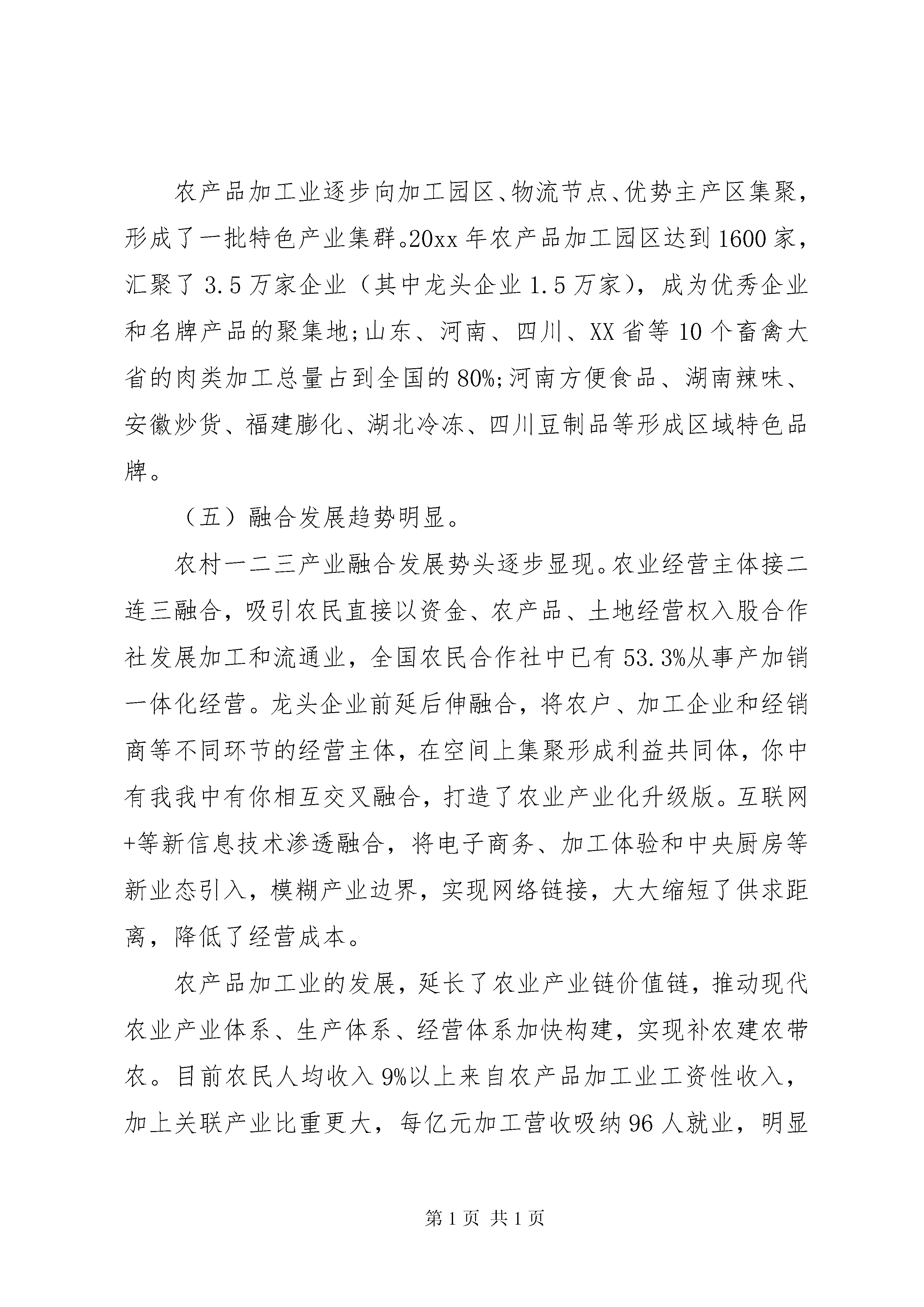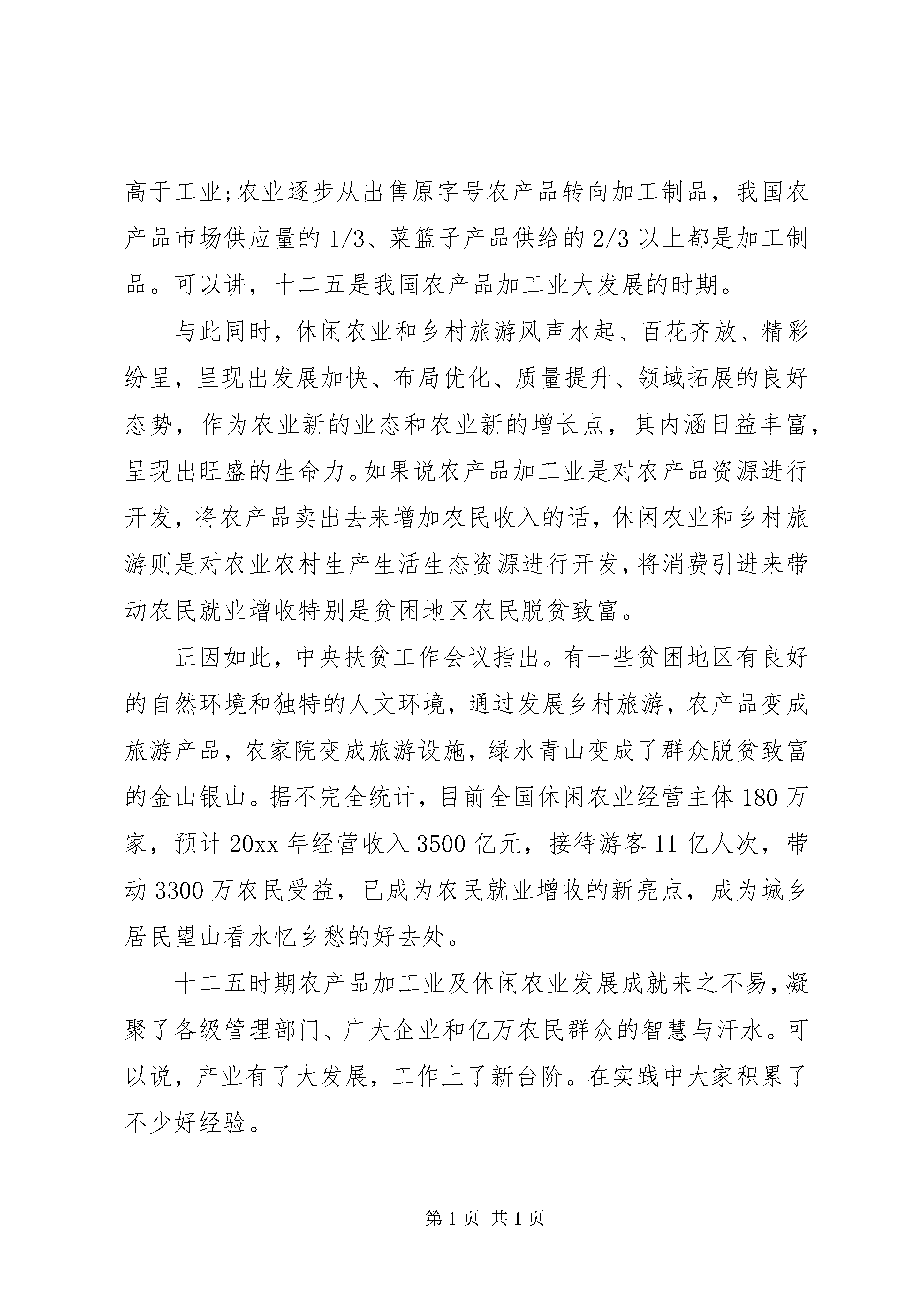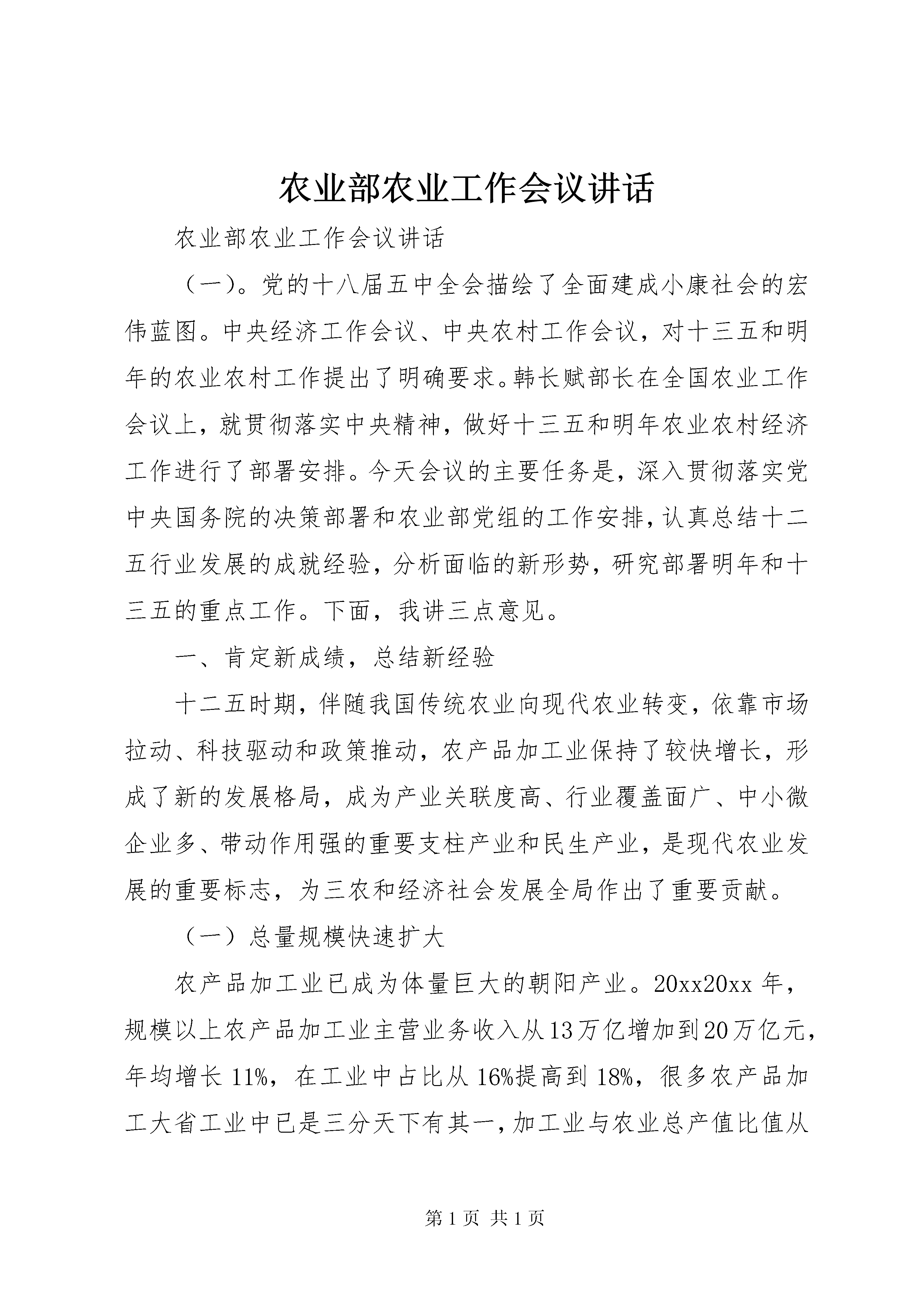 农业部农业工作会议讲话农业部农业工作会议讲话(一)。党的十八届五中全会描绘了全面建成小康社会的宏伟蓝图。中央经济工作会议、中央农村工作会议,对十三五和明年的农业农村工作提出了明确要求。韩长赋部长在全国农业工作会议上,就贯彻落实中央精神,做好十三五和明年农业农村经济工作进行了部署安排。今天会议的主要任务是,深入贯彻落实党中央国务院的决策部署和农业部党组的工作安排,认真总结十二五行业发展的成就经验,分析面临的新形势,研究部署明年和十三五的重点工作。下面,我讲三点意见。一、肯定新成绩,总结新经验十二五时期,伴随我国传统农业向现代农业转变,依靠市场拉动、科技驱动和政策推动,农产品加工业保持了较快增长,形成了新的发展格局,成为产业关联度高、行业覆盖面广、中小微企业多、带动作用强的重要支柱产业和民生产业,是现代农业发展的重要标志,为三农和经济社会发展全局作出了重要贡献。(一)总量规模快速扩大农产品加工业已成为体量巨大的朝阳产业。20xx20xx年,规模以上农产品加工业主营业务收入从13万亿增加到20万亿元,年均增长11%,在工业中占比从16%提高到18%,很多农产品加工大省工业中已是三分天下有其一,加工业与农业总产值比值从1.8:1提高到2.2:1。规模以上企业从6.9万家发展到7.6万家,大中型企业比例达到16.15%,年销售收入超过1亿元的企业近2万家,超过100亿元的龙头企业达70家(其中超500亿元的5家),成为经营主体融合共生的主导者、产业环节融合互动的引领者、资源要素融合渗透的推动者。(二)发展动力持续强劲。十二五期间,社会资本加快进入农产品加工业,既不与民争利,又带农增收。规模以上农产品加工业完成固定资产投入累计达到16.8万亿元,年均增长19%,其中20xx年预计达4万亿元,同比增长9.7%,高于工业2个百分点;实现利润总额1.2万亿元,同比增长8%,成为经济发展新的亮点,为新常态下稳增长发挥了重要带动作用。(三)产业结构优化升级。特色优势产业进一步发展,落后产能逐步消化,装备技术升级加快,为产业发展增强了新的发展动能。目前食用类加工业主营业务收入占农产品加工业比重达52%。主要农产品加工初步形成齐全的国产化机械设备品种,如肉类加工设备国产化88.5%以上,粮油加工设备逐步替代进口。沿海发达地区和城市周边地区正在推进腾笼换鸟、机器换人、电商换市,一批名企、名品、名家正在培育成长。(四)空间布局更趋合理。农产品加工业逐步向加工园区、物流节点、优势主产区集聚,形成了一批特色产业集群。20xx年农产品加工园区达到1600家,汇聚了3.5万家企业(其中龙头企业1.5万家),成为优秀企业和名牌产品的聚集地;山东、河南、四川、XX省等10个畜禽大省的肉类加工总量占到全国的80%;河南方便食品、湖南辣味、安徽炒货、福建膨化、湖北冷冻、四川豆制品等形成区域特色品牌。(五)融合发展趋势明显。农村一二三产业融合发展势头逐步显现。农业经营主体接二连三融合,吸引农民直接以资金、农产品、土地经营权入股合作社发展加工和流通业,全国农民合作社中已有53.3%从事产加销一体化经营。龙头企业前延后伸融合,将农户、加工企业和经销商等不同环节的经营主体,在空间上集聚形成利益共同体,你中有我我中有你相互交叉融合,打造了农业产业化升级版。互联网+等新信息技术渗透融合,将电子商务、加工体验和中央厨房等新业态引入,模糊产业边界,实现网络链接,大大缩短了供求距离,降低了经营成本。农产品加工业的发展,延长了农业产业链价值链,推动现代农业产业体系、生产体系、经营体系加快构建,实现补农建农带农。目前农民人均收入9%以上来自农产品加工业工资性收入,加上关联产业比重更大,每亿元加工营收吸纳96人就业,明显高于工业;农业逐步从出售原字号农产品转向加工制品,我国农产品市场供应量的1/3、菜篮子产品供给的2/3以上都是加工制品。可以讲,十二五是我国农产品加工业大发展的时期。与此同时,休闲农业和乡村旅游风声水起、百花齐放、精彩纷呈,呈现出发展加快、布局优化、质量提升、领域拓展的良好态势,作为农业新的业态和农业新的增长点,其内涵日益丰富,呈现出旺盛的生命力。如果说农产品加工业是对农产品资源进行开发,将农产品卖出去来增加农民收入的话,休闲农业和乡村旅游则是对农业农村生产生活生态资源进行开发,将消费引进来带动农民就业增收特别是贫困地区农民脱贫致富。正因如此,中央扶贫工作会议指出。有一些贫困地区有良好的自然环境和独特的人文环境,通过发展乡村旅游,农产品变成旅游产品,农家院变成旅游设施,绿水青山变成了群众脱贫致富的金山银山。据不完全统计,目前全国休闲农业经营主体180万家,预计20xx年经营收入3500亿元,接待游客11亿人次,带动3300万农民受益,已成为农民就业增收的
