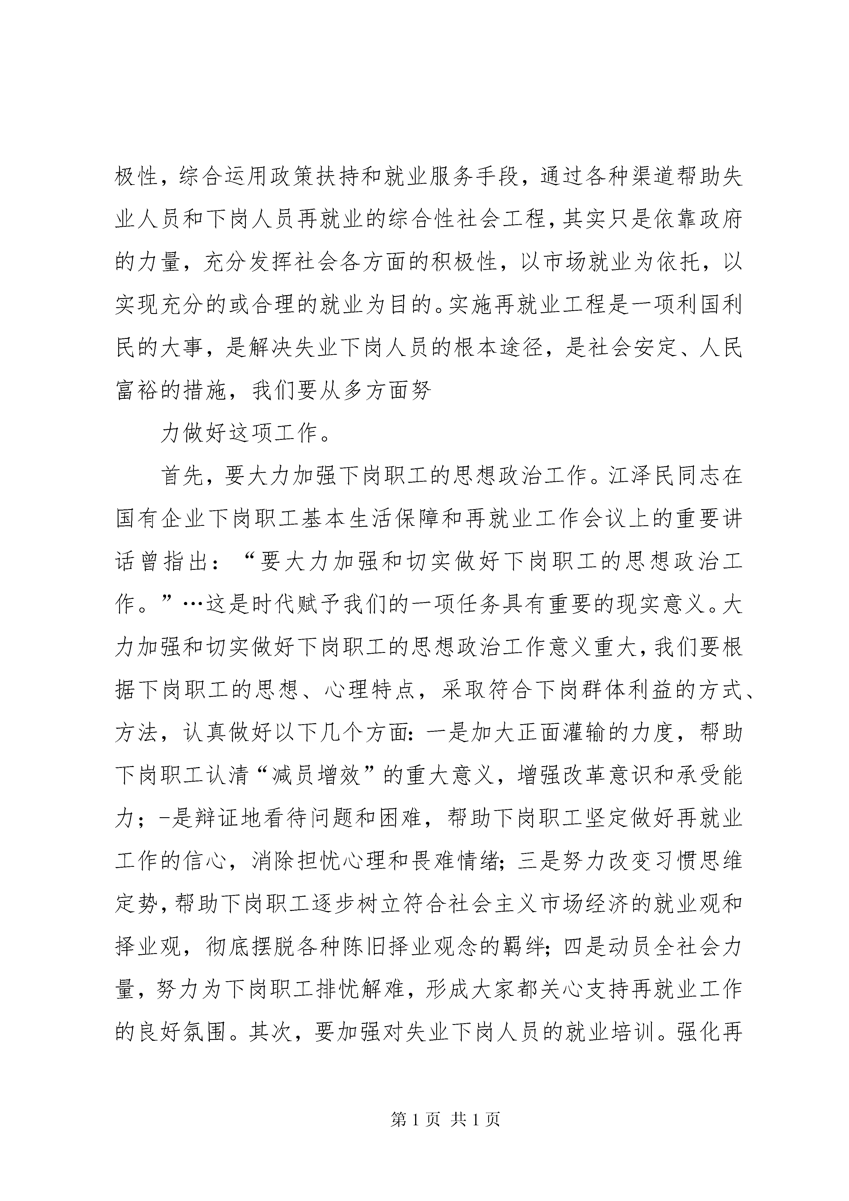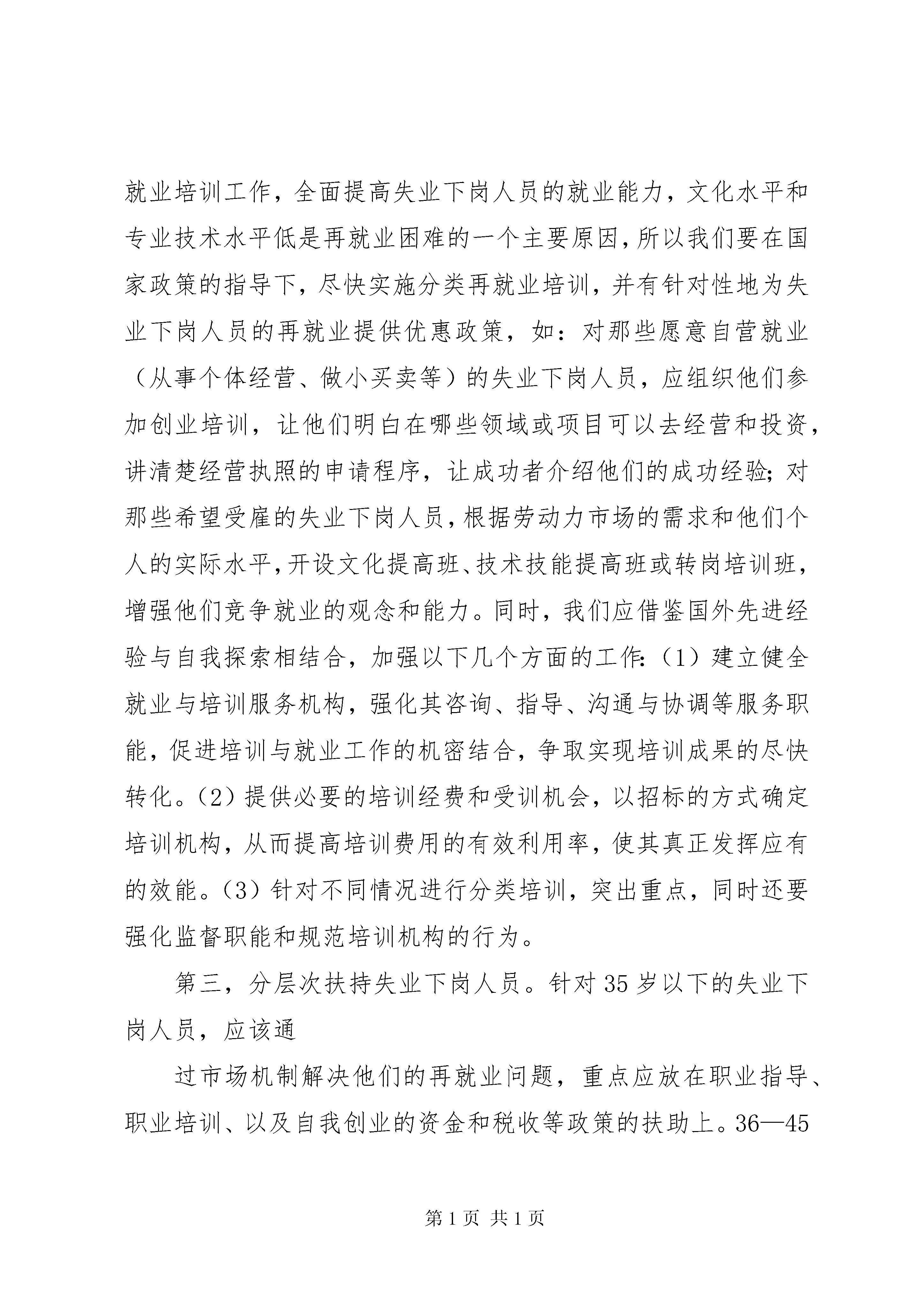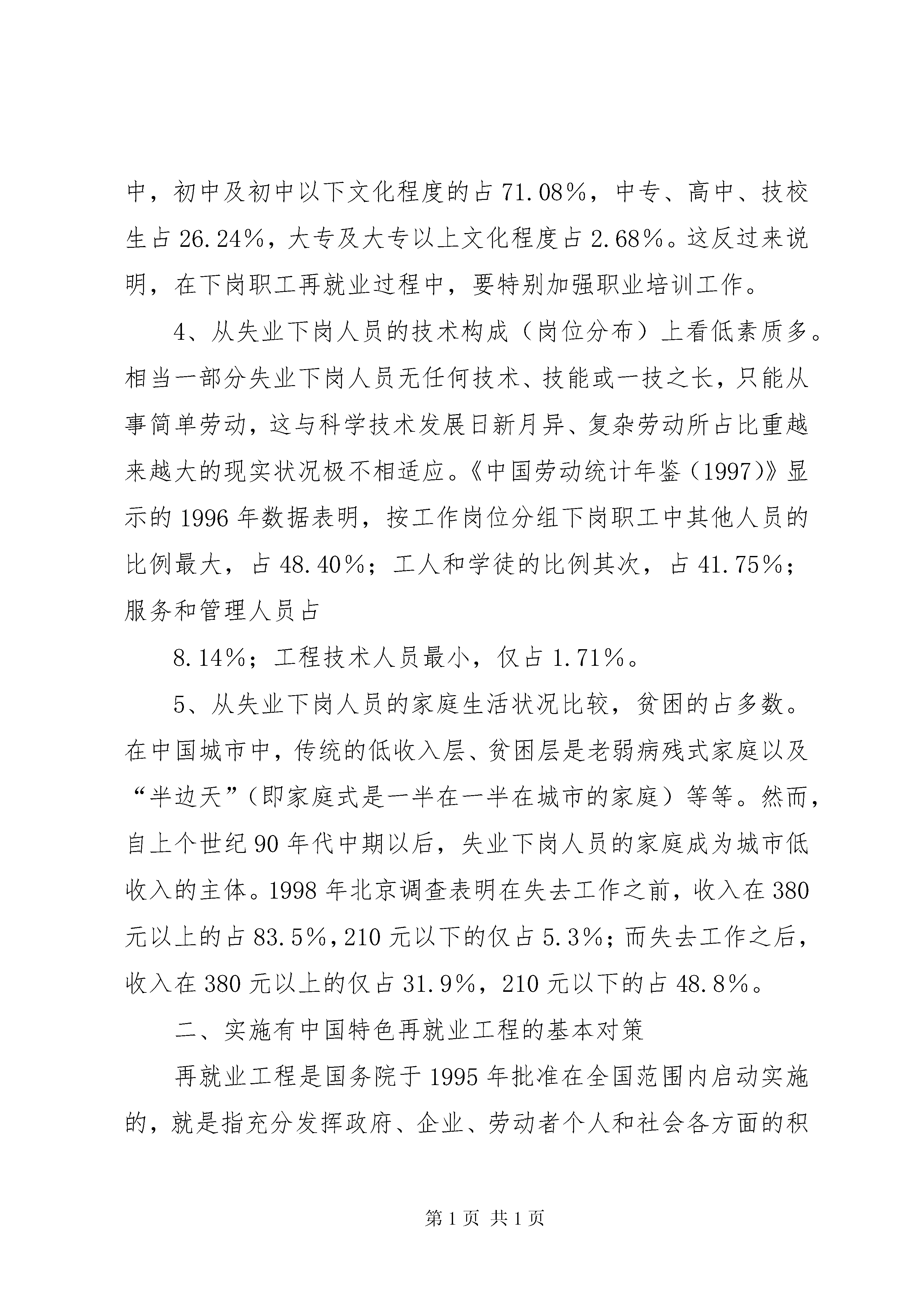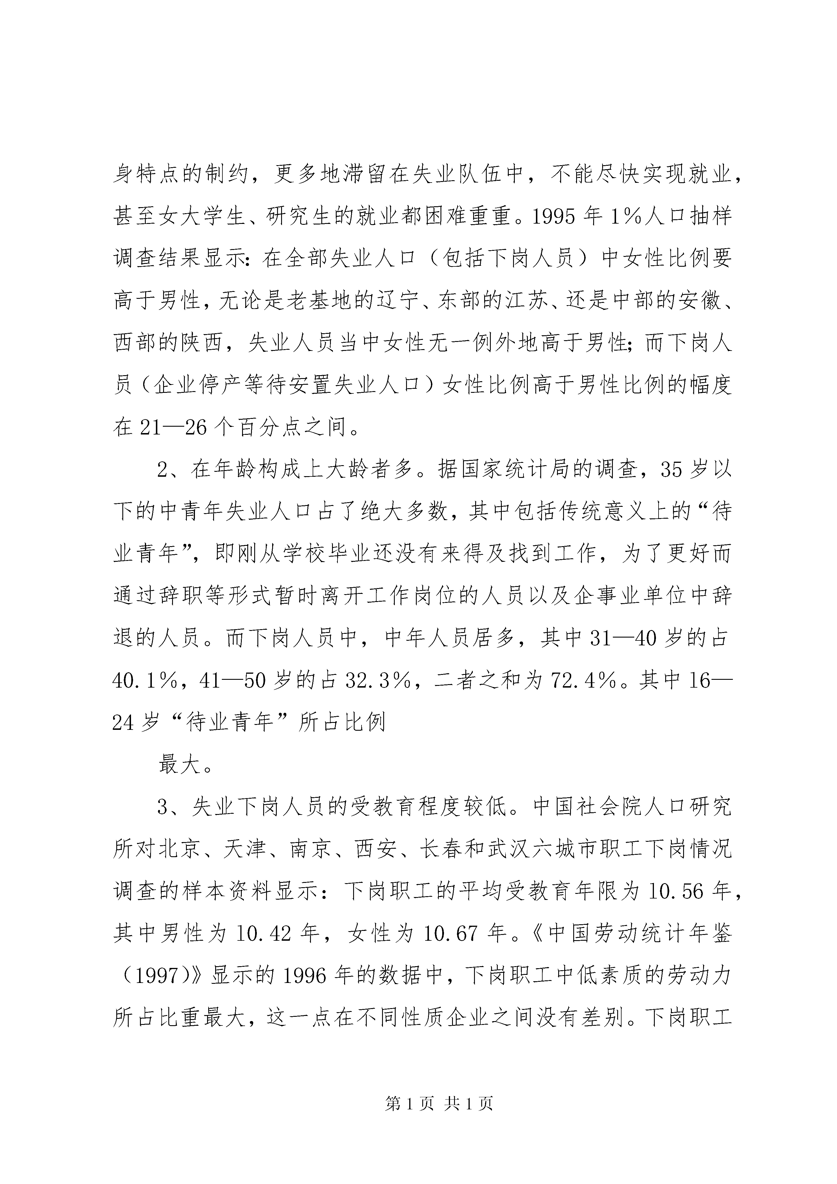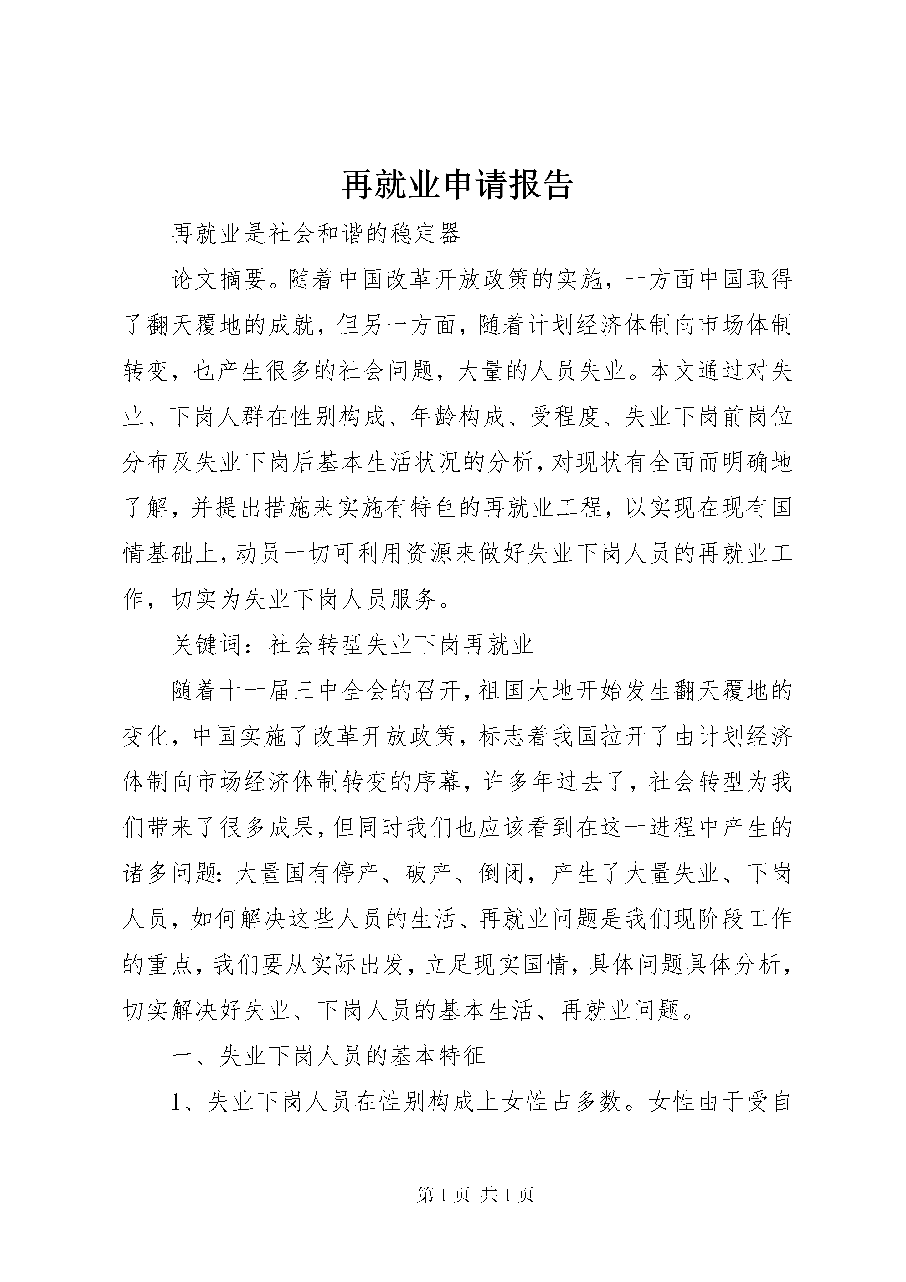 再就业申请报告再就业是社会和谐的稳定器论文摘要。随着中国改革开放政策的实施,一方面中国取得了翻天覆地的成就,但另一方面,随着计划经济体制向市场体制转变,也产生很多的社会问题,大量的人员失业。本文通过对失业、下岗人群在性别构成、年龄构成、受程度、失业下岗前岗位分布及失业下岗后基本生活状况的分析,对现状有全面而明确地了解,并提出措施来实施有特色的再就业工程,以实现在现有国情基础上,动员一切可利用资源来做好失业下岗人员的再就业工作,切实为失业下岗人员服务。关键词:社会转型失业下岗再就业随着十一届三中全会的召开,祖国大地开始发生翻天覆地的变化,中国实施了改革开放政策,标志着我国拉开了由计划经济体制向市场经济体制转变的序幕,许多年过去了,社会转型为我们带来了很多成果,但同时我们也应该看到在这一进程中产生的诸多问题:大量国有停产、破产、倒闭,产生了大量失业、下岗人员,如何解决这些人员的生活、再就业问题是我们现阶段工作的重点,我们要从实际出发,立足现实国情,具体问题具体分析,切实解决好失业、下岗人员的基本生活、再就业问题。一、失业下岗人员的基本特征1、失业下岗人员在性别构成上女性占多数。女性由于受自身特点的制约,更多地滞留在失业队伍中,不能尽快实现就业,甚至女大学生、研究生的就业都困难重重。1995年1%人口抽样调查结果显示:在全部失业人口(包括下岗人员)中女性比例要高于男性,无论是老基地的辽宁、东部的江苏、还是中部的安徽、西部的陕西,失业人员当中女性无一例外地高于男性;而下岗人员(企业停产等待安置失业人口)女性比例高于男性比例的幅度在21—26个百分点之间。2、在年龄构成上大龄者多。据国家统计局的调查,35岁以下的中青年失业人口占了绝大多数,其中包括传统意义上的“待业青年”,即刚从学校毕业还没有来得及找到工作,为了更好而通过辞职等形式暂时离开工作岗位的人员以及企事业单位中辞退的人员。而下岗人员中,中年人员居多,其中31—40岁的占40.1%,41—50岁的占32.3%,二者之和为72.4%。其中l6—24岁“待业青年”所占比例最大。3、失业下岗人员的受教育程度较低。中国社会院人口研究所对北京、天津、南京、西安、长春和武汉六城市职工下岗情况调查的样本资料显示:下岗职工的平均受教育年限为l0.56年,其中男性为l0.42年,女性为10.67年。《中国劳动统计年鉴(1997)》显示的1996年的数据中,下岗职工中低素质的劳动力所占比重最大,这一点在不同性质企业之间没有差别。下岗职工中,初中及初中以下文化程度的占71.08%,中专、高中、技校生占26.24%,大专及大专以上文化程度占2.68%。这反过来说明,在下岗职工再就业过程中,要特别加强职业培训工作。4、从失业下岗人员的技术构成(岗位分布)上看低素质多。相当一部分失业下岗人员无任何技术、技能或一技之长,只能从事简单劳动,这与科学技术发展日新月异、复杂劳动所占比重越来越大的现实状况极不相适应。《中国劳动统计年鉴(1997)》显示的1996年数据表明,按工作岗位分组下岗职工中其他人员的比例最大,占48.40%;工人和学徒的比例其次,占41.75%;服务和管理人员占8.14%;工程技术人员最小,仅占1.71%。5、从失业下岗人员的家庭生活状况比较,贫困的占多数。在中国城市中,传统的低收入层、贫困层是老弱病残式家庭以及“半边天”(即家庭式是一半在一半在城市的家庭)等等。然而,自上个世纪90年代中期以后,失业下岗人员的家庭成为城市低收入的主体。1998年北京调查表明在失去工作之前,收入在380元以上的占83.5%,210元以下的仅占5.3%;而失去工作之后,收入在380元以上的仅占31.9%,210元以下的占48.8%。二、实施有中国特色再就业工程的基本对策再就业工程是国务院于1995年批准在全国范围内启动实施的,就是指充分发挥政府、企业、劳动者个人和社会各方面的积极性,综合运用政策扶持和就业服务手段,通过各种渠道帮助失业人员和下岗人员再就业的综合性社会工程,其实只是依靠政府的力量,充分发挥社会各方面的积极性,以市场就业为依托,以实现充分的或合理的就业为目的。实施再就业工程是一项利国利民的大事,是解决失业下岗人员的根本途径,是社会安定、人民富裕的措施,我们要从多方面努力做好这项工作。首先,要大力加强下岗职工的思想政治工作。江泽民同志在国有企业下岗职工基本生活保障和再就业工作会议上的重要讲话曾指出:“要大力加强和切实做好下岗职工的思想政治工作。”…这是时代赋予我们的一项任务具有重要的现实意义。大力加强和切实做好下岗职工的思想政治工作意义重大,我们要根据下岗职工的思想、心理特点,采取符合下岗群体利益的方式、方法,认真做好以下几个方面:一是加大正面灌输的力度,帮助下岗职工认清“减员