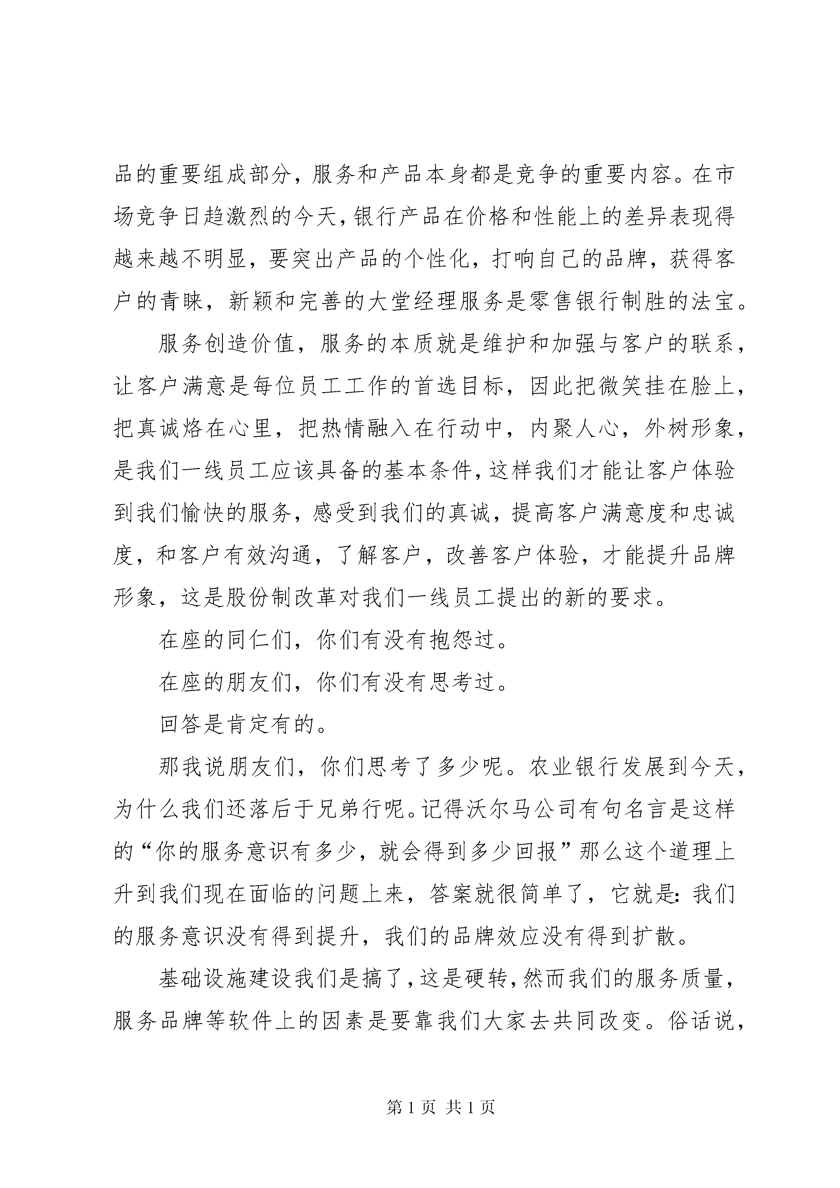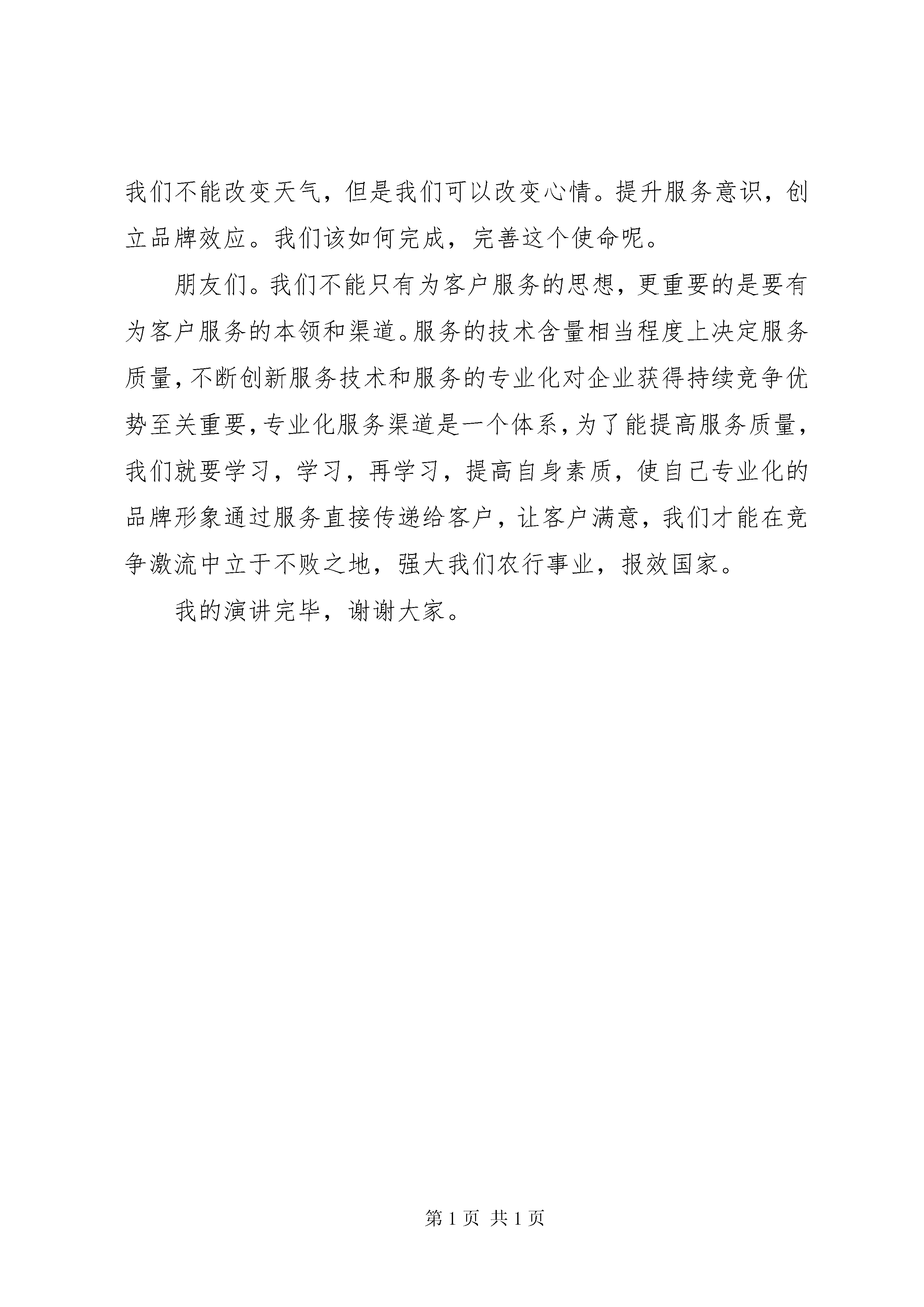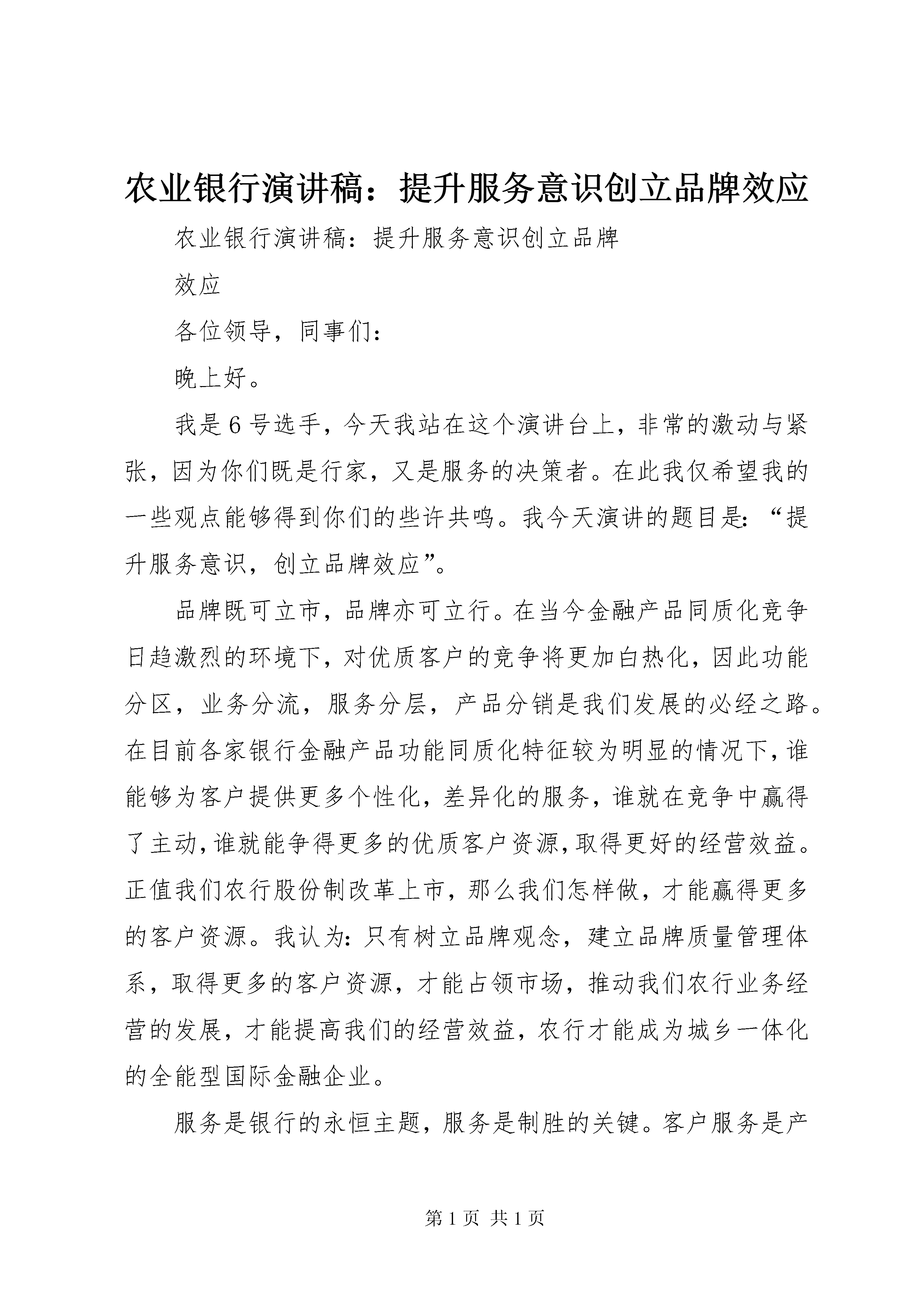 农业银行演讲稿:提升服务意识创立品牌效应农业银行演讲稿:提升服务意识创立品牌效应各位领导,同事们:晚上好。我是6号选手,今天我站在这个演讲台上,非常的激动与紧张,因为你们既是行家,又是服务的决策者。在此我仅希望我的一些观点能够得到你们的些许共鸣。我今天演讲的题目是:“提升服务意识,创立品牌效应”。品牌既可立市,品牌亦可立行。在当今金融产品同质化竞争日趋激烈的环境下,对优质客户的竞争将更加白热化,因此功能分区,业务分流,服务分层,产品分销是我们发展的必经之路。在目前各家银行金融产品功能同质化特征较为明显的情况下,谁能够为客户提供更多个性化,差异化的服务,谁就在竞争中赢得了主动,谁就能争得更多的优质客户资源,取得更好的经营效益。正值我们农行股份制改革上市,那么我们怎样做,才能赢得更多的客户资源。我认为:只有树立品牌观念,建立品牌质量管理体系,取得更多的客户资源,才能占领市场,推动我们农行业务经营的发展,才能提高我们的经营效益,农行才能成为城乡一体化的全能型国际金融企业。服务是银行的永恒主题,服务是制胜的关键。客户服务是产品的重要组成部分,服务和产品本身都是竞争的重要内容。在市场竞争日趋激烈的今天,银行产品在价格和性能上的差异表现得越来越不明显,要突出产品的个性化,打响自己的品牌,获得客户的青睐,新颖和完善的大堂经理服务是零售银行制胜的法宝。服务创造价值,服务的本质就是维护和加强与客户的联系,让客户满意是每位员工工作的首选目标,因此把微笑挂在脸上,把真诚烙在心里,把热情融入在行动中,内聚人心,外树形象,是我们一线员工应该具备的基本条件,这样我们才能让客户体验到我们愉快的服务,感受到我们的真诚,提高客户满意度和忠诚度,和客户有效沟通,了解客户,改善客户体验,才能提升品牌形象,这是股份制改革对我们一线员工提出的新的要求。在座的同仁们,你们有没有抱怨过。在座的朋友们,你们有没有思考过。回答是肯定有的。那我说朋友们,你们思考了多少呢。农业银行发展到今天,为什么我们还落后于兄弟行呢。记得沃尔马公司有句名言是这样的“你的服务意识有多少,就会得到多少回报”那么这个道理上升到我们现在面临的问题上来,答案就很简单了,它就是:我们的服务意识没有得到提升,我们的品牌效应没有得到扩散。基础设施建设我们是搞了,这是硬转,然而我们的服务质量,服务品牌等软件上的因素是要靠我们大家去共同改变。俗话说,我们不能改变天气,但是我们可以改变心情。提升服务意识,创立品牌效应。我们该如何完成,完善这个使命呢。朋友们。我们不能只有为客户服务的思想,更重要的是要有为客户服务的本领和渠道。服务的技术含量相当程度上决定服务质量,不断创新服务技术和服务的专业化对企业获得持续竞争优势至关重要,专业化服务渠道是一个体系,为了能提高服务质量,我们就要学习,学习,再学习,提高自身素质,使自己专业化的品牌形象通过服务直接传递给客户,让客户满意,我们才能在竞争激流中立于不败之地,强大我们农行事业,报效国家。我的演讲完毕,谢谢大家。