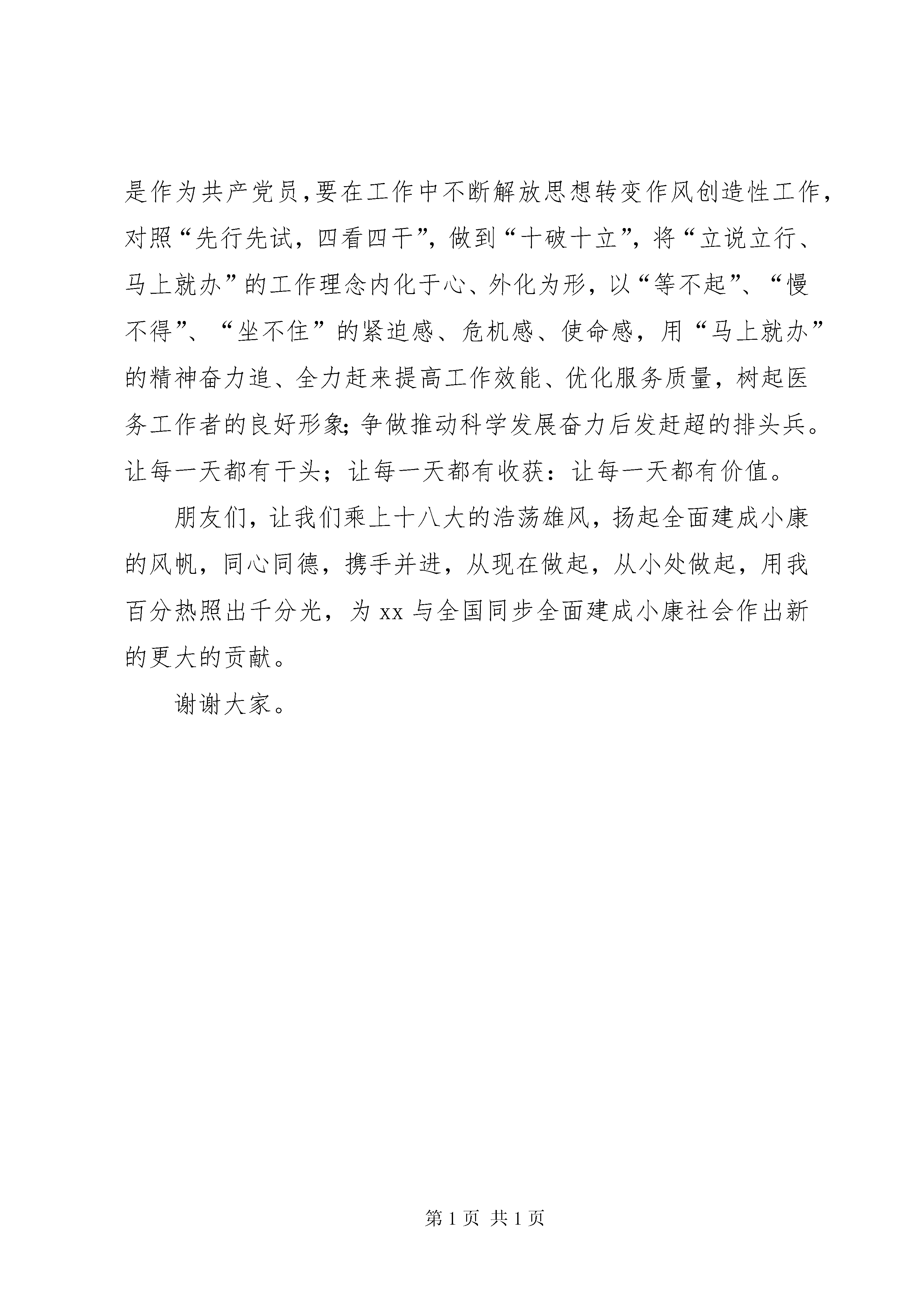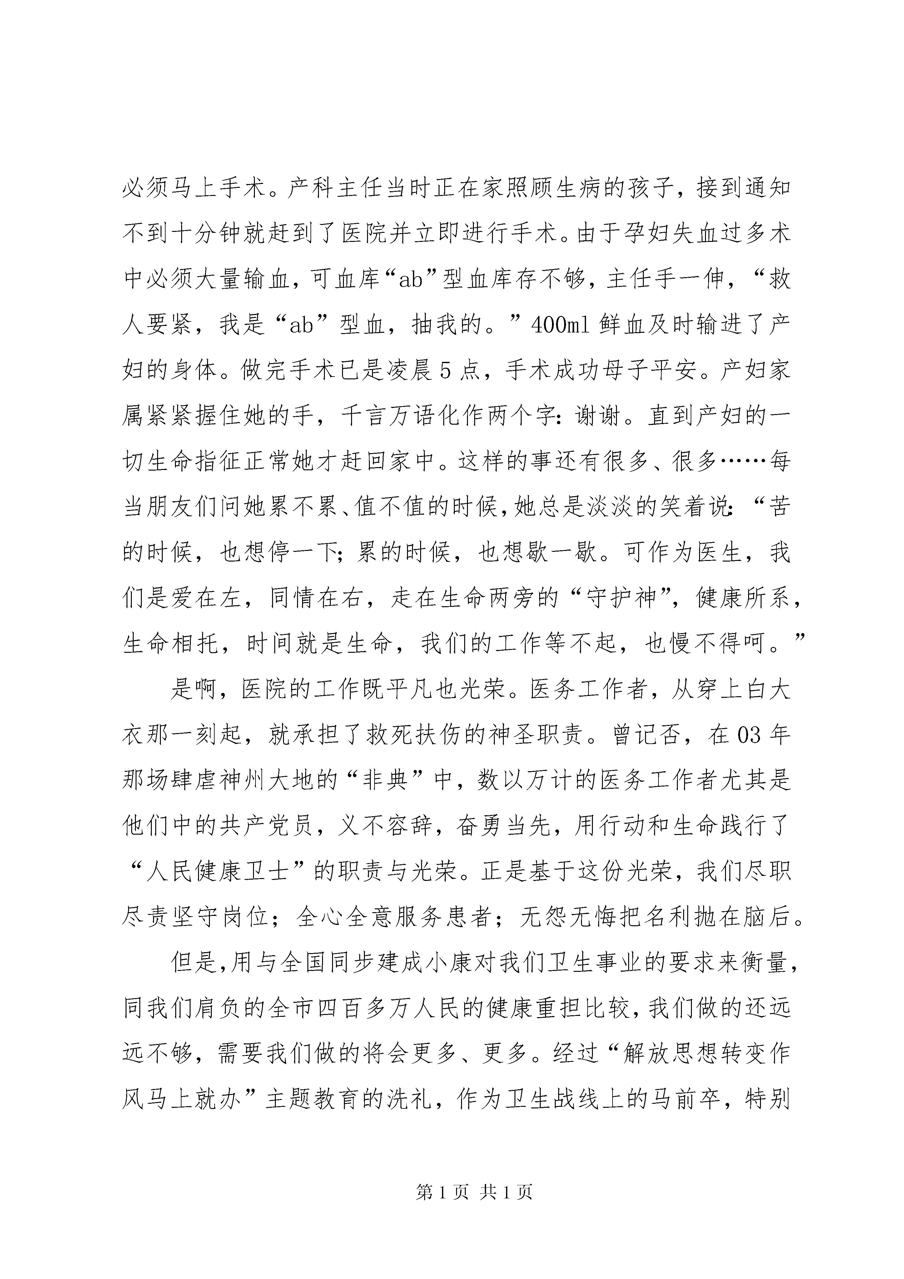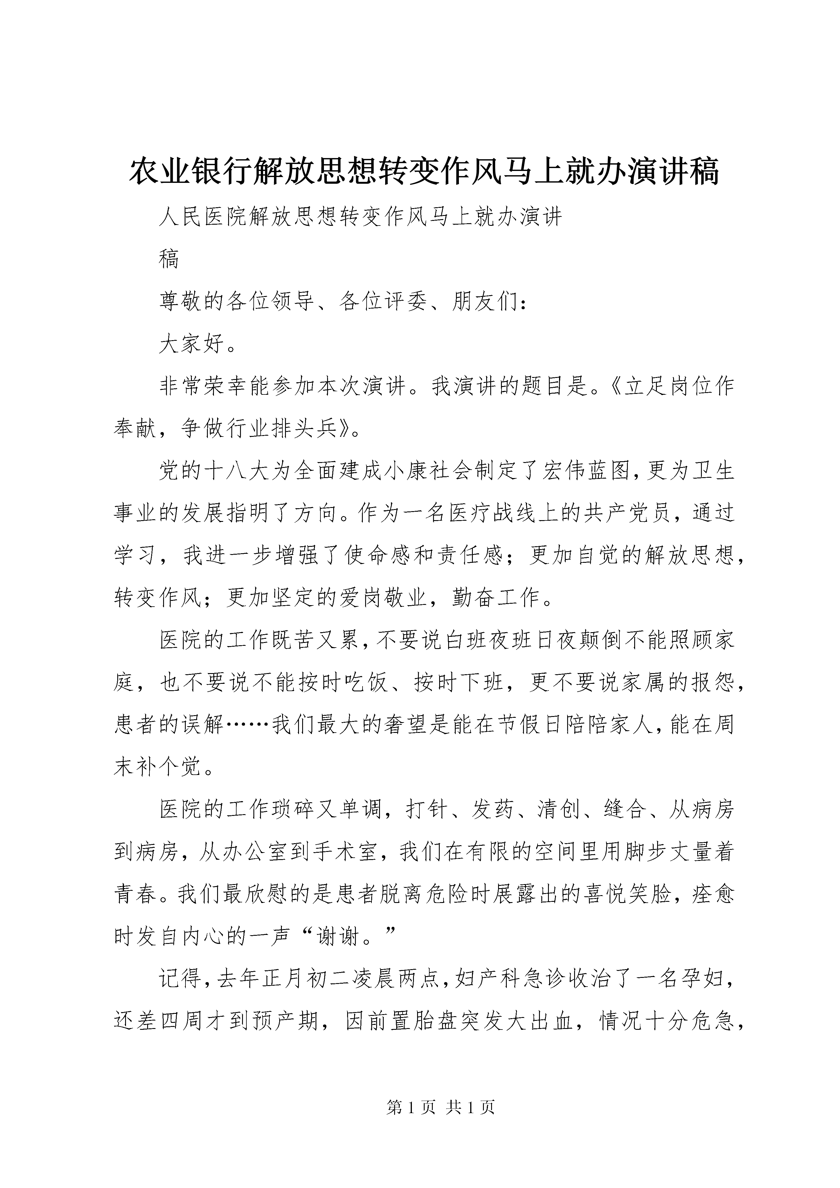 农业银行解放思想转变作风马上就办演讲稿人民医院解放思想转变作风马上就办演讲稿尊敬的各位领导、各位评委、朋友们:大家好。非常荣幸能参加本次演讲。我演讲的题目是。《立足岗位作奉献,争做行业排头兵》。党的十八大为全面建成小康社会制定了宏伟蓝图,更为卫生事业的发展指明了方向。作为一名医疗战线上的共产党员,通过学习,我进一步增强了使命感和责任感;更加自觉的解放思想,转变作风;更加坚定的爱岗敬业,勤奋工作。医院的工作既苦又累,不要说白班夜班日夜颠倒不能照顾家庭,也不要说不能按时吃饭、按时下班,更不要说家属的报怨,患者的误解……我们最大的奢望是能在节假日陪陪家人,能在周末补个觉。医院的工作琐碎又单调,打针、发药、清创、缝合、从病房到病房,从办公室到手术室,我们在有限的空间里用脚步丈量着青春。我们最欣慰的是患者脱离危险时展露出的喜悦笑脸,痊愈时发自内心的一声“谢谢。”记得,去年正月初二凌晨两点,妇产科急诊收治了一名孕妇,还差四周才到预产期,因前置胎盘突发大出血,情况十分危急,必须马上手术。产科主任当时正在家照顾生病的孩子,接到通知不到十分钟就赶到了医院并立即进行手术。由于孕妇失血过多术中必须大量输血,可血库“ab”型血库存不够,主任手一伸,“救人要紧,我是“ab”型血,抽我的。”400ml鲜血及时输进了产妇的身体。做完手术已是凌晨5点,手术成功母子平安。产妇家属紧紧握住她的手,千言万语化作两个字:谢谢。直到产妇的一切生命指征正常她才赶回家中。这样的事还有很多、很多……每当朋友们问她累不累、值不值的时候,她总是淡淡的笑着说:“苦的时候,也想停一下;累的时候,也想歇一歇。可作为医生,我们是爱在左,同情在右,走在生命两旁的“守护神”,健康所系,生命相托,时间就是生命,我们的工作等不起,也慢不得呵。”是啊,医院的工作既平凡也光荣。医务工作者,从穿上白大衣那一刻起,就承担了救死扶伤的神圣职责。曾记否,在03年那场肆虐神州大地的“非典”中,数以万计的医务工作者尤其是他们中的共产党员,义不容辞,奋勇当先,用行动和生命践行了“人民健康卫士”的职责与光荣。正是基于这份光荣,我们尽职尽责坚守岗位;全心全意服务患者;无怨无悔把名利抛在脑后。但是,用与全国同步建成小康对我们卫生事业的要求来衡量,同我们肩负的全市四百多万人民的健康重担比较,我们做的还远远不够,需要我们做的将会更多、更多。经过“解放思想转变作风马上就办”主题教育的洗礼,作为卫生战线上的马前卒,特别是作为共产党员,要在工作中不断解放思想转变作风创造性工作,对照“先行先试,四看四干”,做到“十破十立”,将“立说立行、马上就办”的工作理念内化于心、外化为形,以“等不起”、“慢不得”、“坐不住”的紧迫感、危机感、使命感,用“马上就办”的精神奋力追、全力赶来提高工作效能、优化服务质量,树起医务工作者的良好形象;争做推动科学发展奋力后发赶超的排头兵。让每一天都有干头;让每一天都有收获:让每一天都有价值。朋友们,让我们乘上十八大的浩荡雄风,扬起全面建成小康的风帆,同心同德,携手并进,从现在做起,从小处做起,用我百分热照出千分光,为xx与全国同步全面建成小康社会作出新的更大的贡献。谢谢大家。