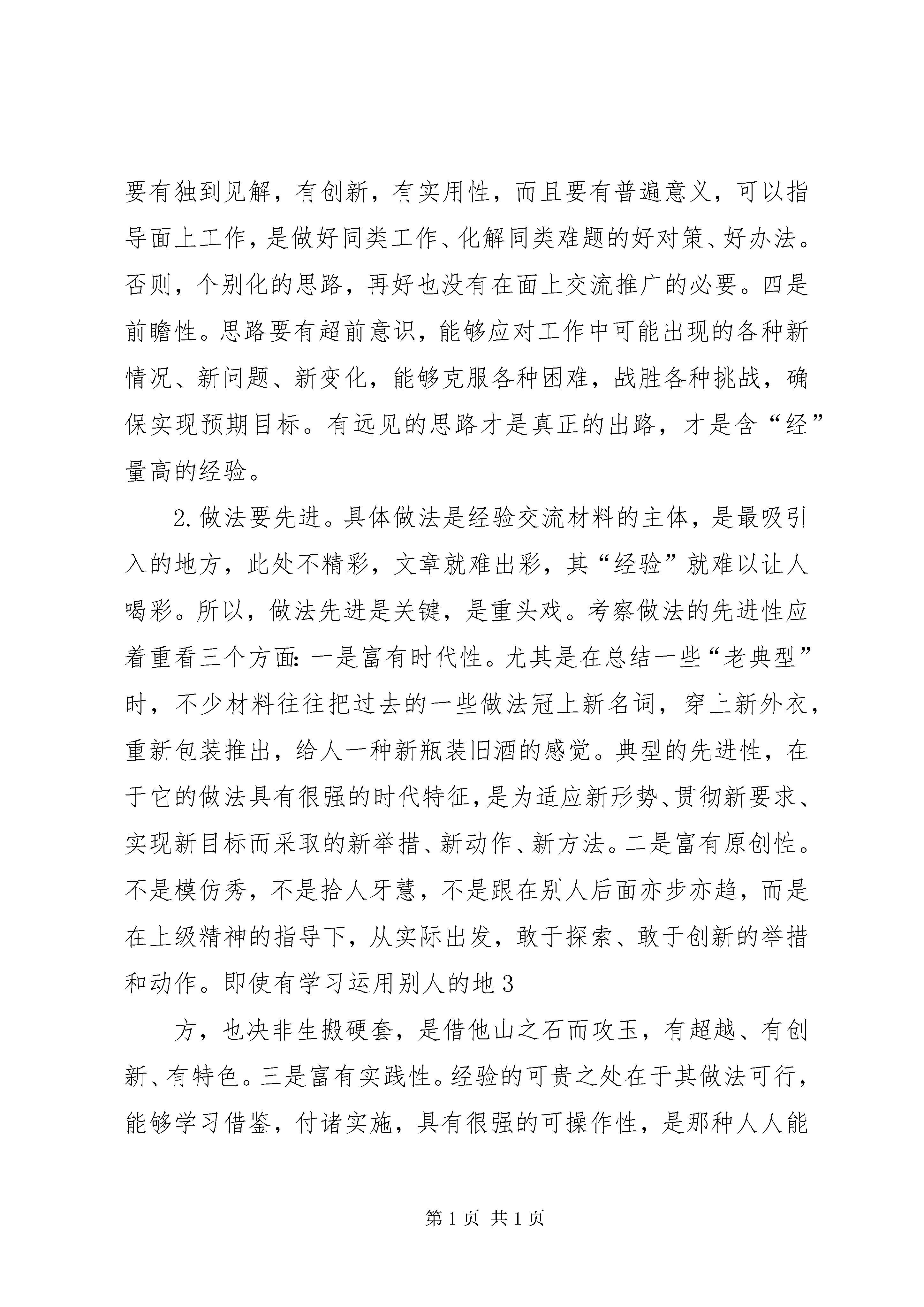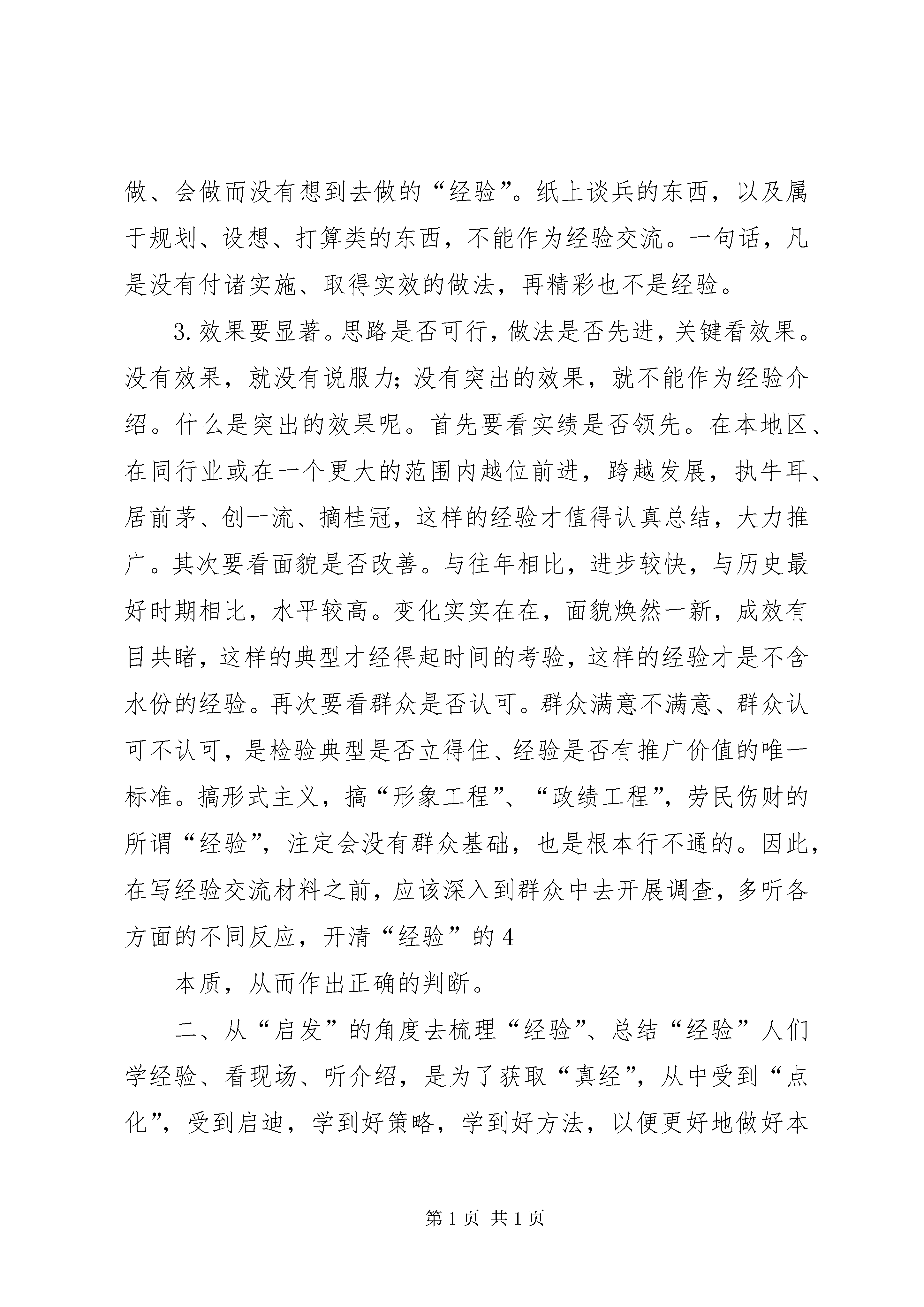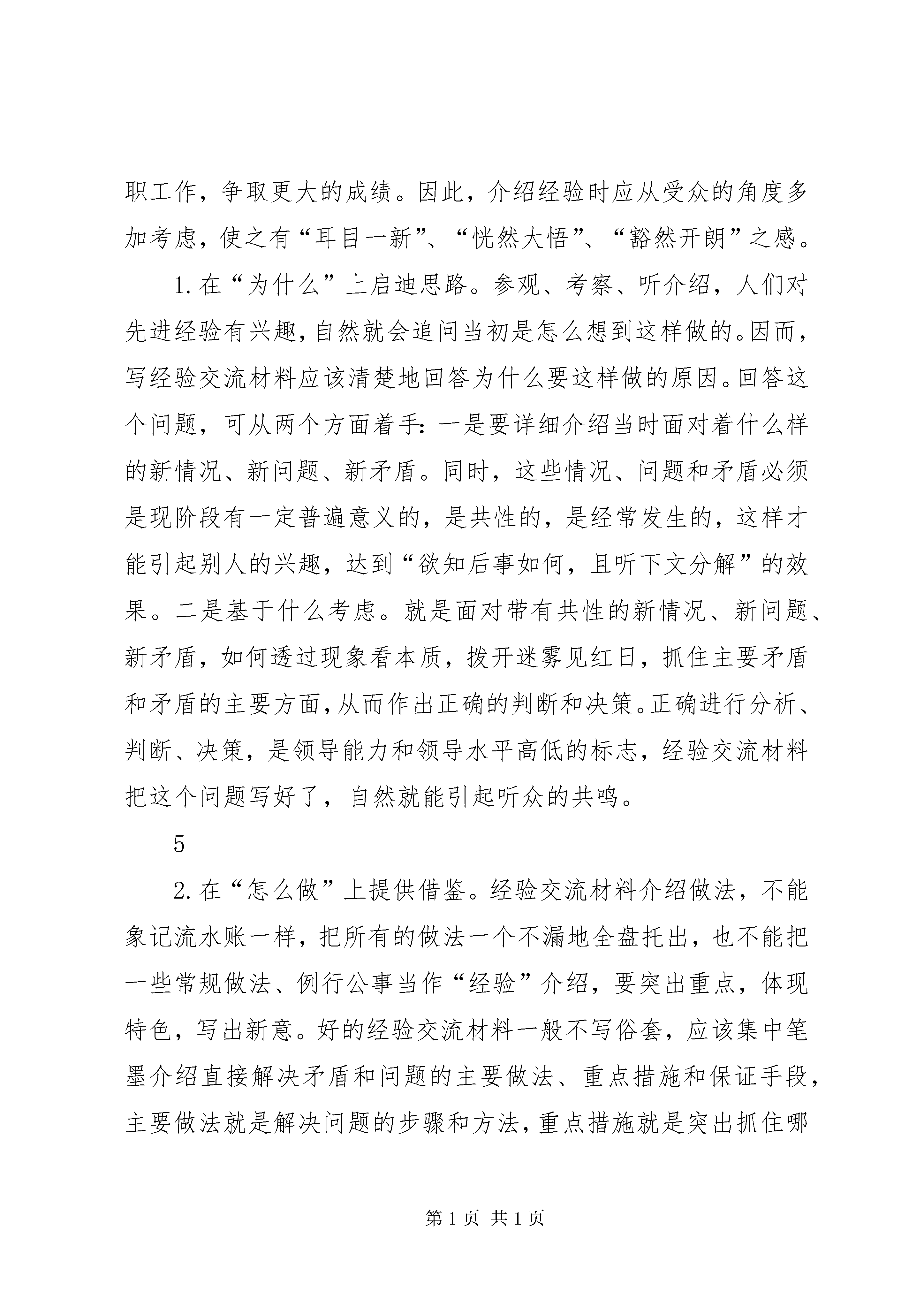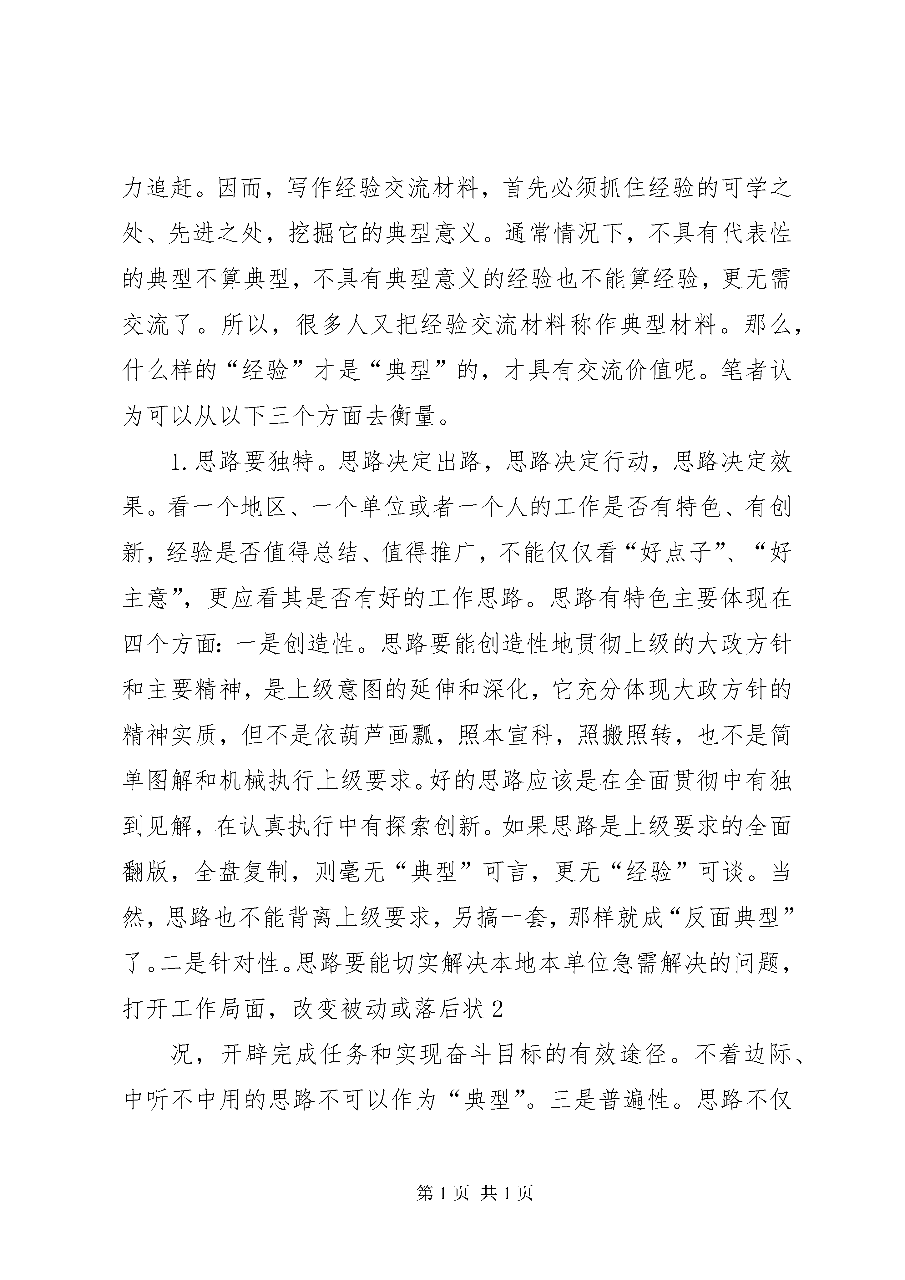 写好汇报材料经验谈浅谈如何写好经验交流材料无论是机关企事业单位,还是社团民间组织,每年都要召开若干大大小小的会议,交流情况,交流经验,交流体会,促进工作,提高水平。对于领导者来说,抓两头促中间、抓典型带一般,更是常用的一种领导方法,胸中有思路、手中有典型,往往被看作一个领导者称职和成熟的标志。因此,在各种大大小小形形色色的会议上,经验交流材料总是必不可少的,其在实际工作中应用广且大。经验交流材料不属于正式文件,也不是规范性公文,没有特别的规定,没有固定的格式,是应用文中限制最少的文种之一,完全应该写得活泼引人。但在实际生活中,真正吸引人、感动人、启发人的经验交流材料可谓凤毛麟角,图解政策、矫揉造作、空洞乏味的经验交流材料常常成为开无效会的“帮凶”。究其原因,很大程度上是写作经验交流材料的人凭“经验”、套格式,缺乏创新意识,往往把活材料写死了。写活经验交流材料,没有现成的模式,没有标准的套路,只有在实践中去体会、去探索。一、从“典型”的角度去寻找“经验”、发现“经验”既然是经验交流材料,就必然要有其先进性、典型性、代1表性,可以供人学习,供人借鉴,催人奋进,以此为榜样努力追赶。因而,写作经验交流材料,首先必须抓住经验的可学之处、先进之处,挖掘它的典型意义。通常情况下,不具有代表性的典型不算典型,不具有典型意义的经验也不能算经验,更无需交流了。所以,很多人又把经验交流材料称作典型材料。那么,什么样的“经验”才是“典型”的,才具有交流价值呢。笔者认为可以从以下三个方面去衡量。1.思路要独特。思路决定出路,思路决定行动,思路决定效果。看一个地区、一个单位或者一个人的工作是否有特色、有创新,经验是否值得总结、值得推广,不能仅仅看“好点子”、“好主意”,更应看其是否有好的工作思路。思路有特色主要体现在四个方面:一是创造性。思路要能创造性地贯彻上级的大政方针和主要精神,是上级意图的延伸和深化,它充分体现大政方针的精神实质,但不是依葫芦画瓢,照本宣科,照搬照转,也不是简单图解和机械执行上级要求。好的思路应该是在全面贯彻中有独到见解,在认真执行中有探索创新。如果思路是上级要求的全面翻版,全盘复制,则毫无“典型”可言,更无“经验”可谈。当然,思路也不能背离上级要求,另搞一套,那样就成“反面典型”了。二是针对性。思路要能切实解决本地本单位急需解决的问题,打开工作局面,改变被动或落后状2况,开辟完成任务和实现奋斗目标的有效途径。不着边际、中听不中用的思路不可以作为“典型”。三是普遍性。思路不仅要有独到见解,有创新,有实用性,而且要有普遍意义,可以指导面上工作,是做好同类工作、化解同类难题的好对策、好办法。否则,个别化的思路,再好也没有在面上交流推广的必要。四是前瞻性。思路要有超前意识,能够应对工作中可能出现的各种新情况、新问题、新变化,能够克服各种困难,战胜各种挑战,确保实现预期目标。有远见的思路才是真正的出路,才是含“经”量高的经验。2.做法要先进。具体做法是经验交流材料的主体,是最吸引入的地方,此处不精彩,文章就难出彩,其“经验”就难以让人喝彩。所以,做法先进是关键,是重头戏。考察做法的先进性应着重看三个方面:一是富有时代性。尤其是在总结一些“老典型”时,不少材料往往把过去的一些做法冠上新名词,穿上新外衣,重新包装推出,给人一种新瓶装旧酒的感觉。典型的先进性,在于它的做法具有很强的时代特征,是为适应新形势、贯彻新要求、实现新目标而采取的新举措、新动作、新方法。二是富有原创性。不是模仿秀,不是拾人牙慧,不是跟在别人后面亦步亦趋,而是在上级精神的指导下,从实际出发,敢于探索、敢于创新的举措和动作。即使有学习运用别人的地3方,也决非生搬硬套,是借他山之石而攻玉,有超越、有创新、有特色。三是富有实践性。经验的可贵之处在于其做法可行,能够学习借鉴,付诸实施,具有很强的可操作性,是那种人人能做、会做而没有想到去做的“经验”。纸上谈兵的东西,以及属于规划、设想、打算类的东西,不能作为经验交流。一句话,凡是没有付诸实施、取得实效的做法,再精彩也不是经验。3.效果要显著。思路是否可行,做法是否先进,关键看效果。没有效果,就没有说服力;没有突出的效果,就不能作为经验介绍。什么是突出的效果呢。首先要看实绩是否领先。在本地区、在同行业或在一个更大的范围内越位前进,跨越发展,执牛耳、居前茅、创一流、摘桂冠,这样的经验才值得认真总结,大力推广。其次要看面貌是否改善。与往年相比,进步较快,与历史最好时期相比,水平较高。变化实实在在,面貌焕然一新,成效有目共睹,这样的典型才经得起时间的考验,这样的经验才是不含水份的经验。再次要看群众是否认可。群众满意不满意、群众认可不认可,是检验典型是否立得住、经验是否有推广价值的唯一标准。搞形式主义,搞“形象工程”、