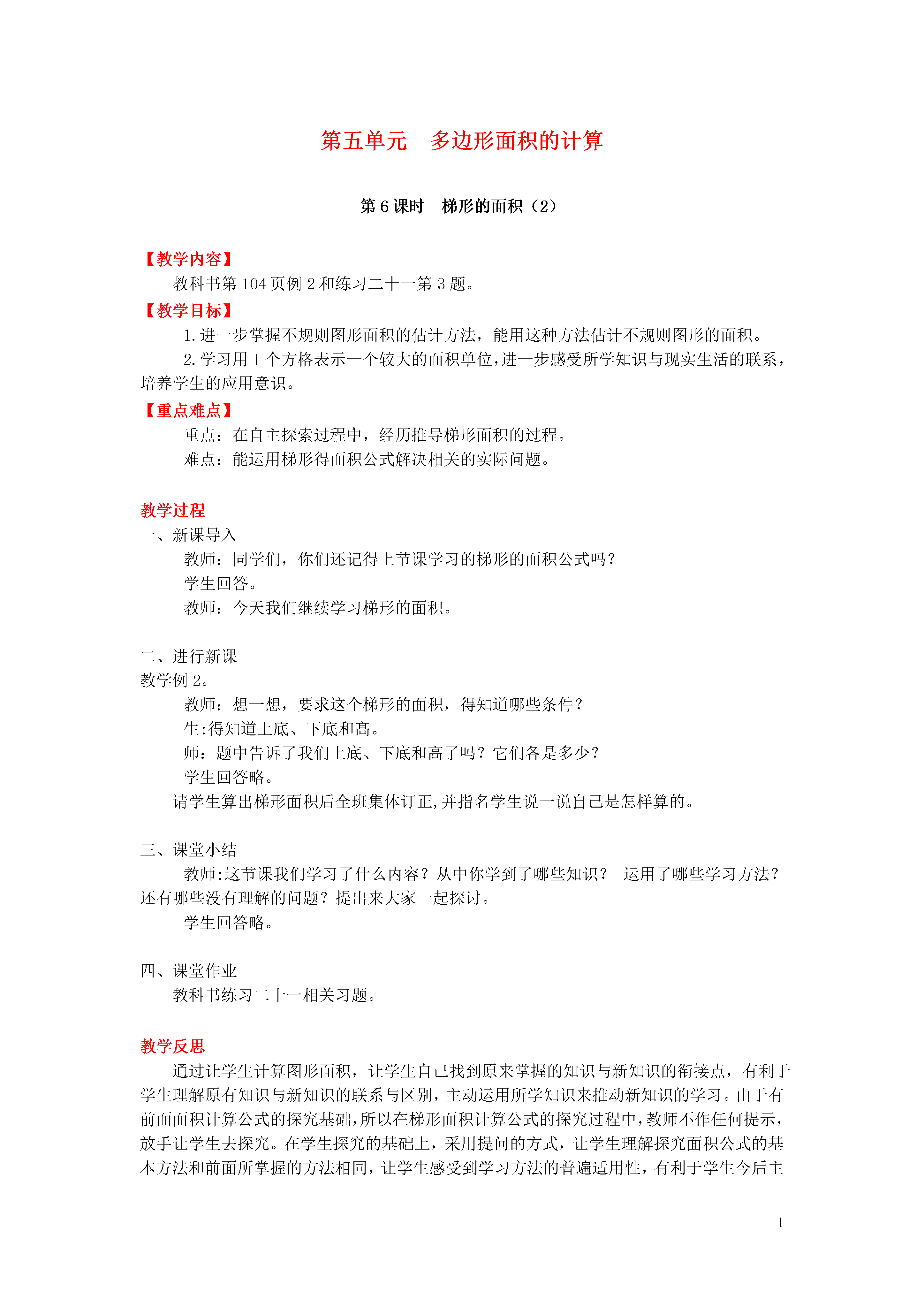 1第五单元多边形面积的计算第6课时梯形的面积(2)【教学内容】教科书例2和练习二十一第3题。【教学目标】1.进一步掌握不规则图形面积的估计方法,能用这种方法估计不规则图形的面积。2.学习用1个方格表示一个较大的面积单位,进一步感受所学知识与现实生活的联系,培养学生的应用意识。【重点难点】重点:在自主探索过程中,经历推导梯形面积的过程。难点:能运用梯形得面积公式解决相关的实际问题。教学过程一、新课导入教师:同学们,你们还记得上节课学习的梯形的面积公式吗?学生回答。教师:今天我们继续学习梯形的面积。二、进行新课教学例2。教师:想一想,要求这个梯形的面积,得知道哪些条件?生:得知道上底、下底和髙。师:题中告诉了我们上底、下底和高了吗?它们各是多少?学生回答略。请学生算出梯形面积后全班集体订正,并指名学生说一说自己是怎样算的。三、课堂小结教师:这节课我们学习了什么内容?从中你学到了哪些知识?运用了哪些学习方法?还有哪些没有理解的问题?提出来大家一起探讨。学生回答略。四、课堂作业教科书练习二十一相关习题。教学反思通过让学生计算图形面积,让学生自己找到原来掌握的知识与新知识的衔接点,有利于学生理解原有知识与新知识的联系与区别,主动运用所学知识来推动新知识的学习。由于有前面面积计算公式的探究基础,所以在梯形面积计算公式的探究过程中,教师不作任何提示,放手让学生去探究。在学生探究的基础上,采用提问的方式,让学生理解探究面积公式的基本方法和前面所掌握的方法相同,让学生感受到学习方法的普遍适用性,有利于学生今后主动运用自己掌握的学习方法学习新知识。在这个环节中还体现了学生解决问题策略的多样化,通过这种方式发展学生的个性,使学生的创新意识得到充分的体现。本课还有以下几个特点:一是把前面图形面积计算公式的推导方法运用到本课内容的学习中,有效地运用前面掌握的学习方法推动新知识的学习。二是分“转化”和“推导”两个环节来进行探讨,使研究的进程清晰,研究的重点突出。三是尊重学生的选择,让学生选自己喜欢的图形来进行推导,能更好地激发学生学习兴趣,有效地促进学生主动学习和发展。