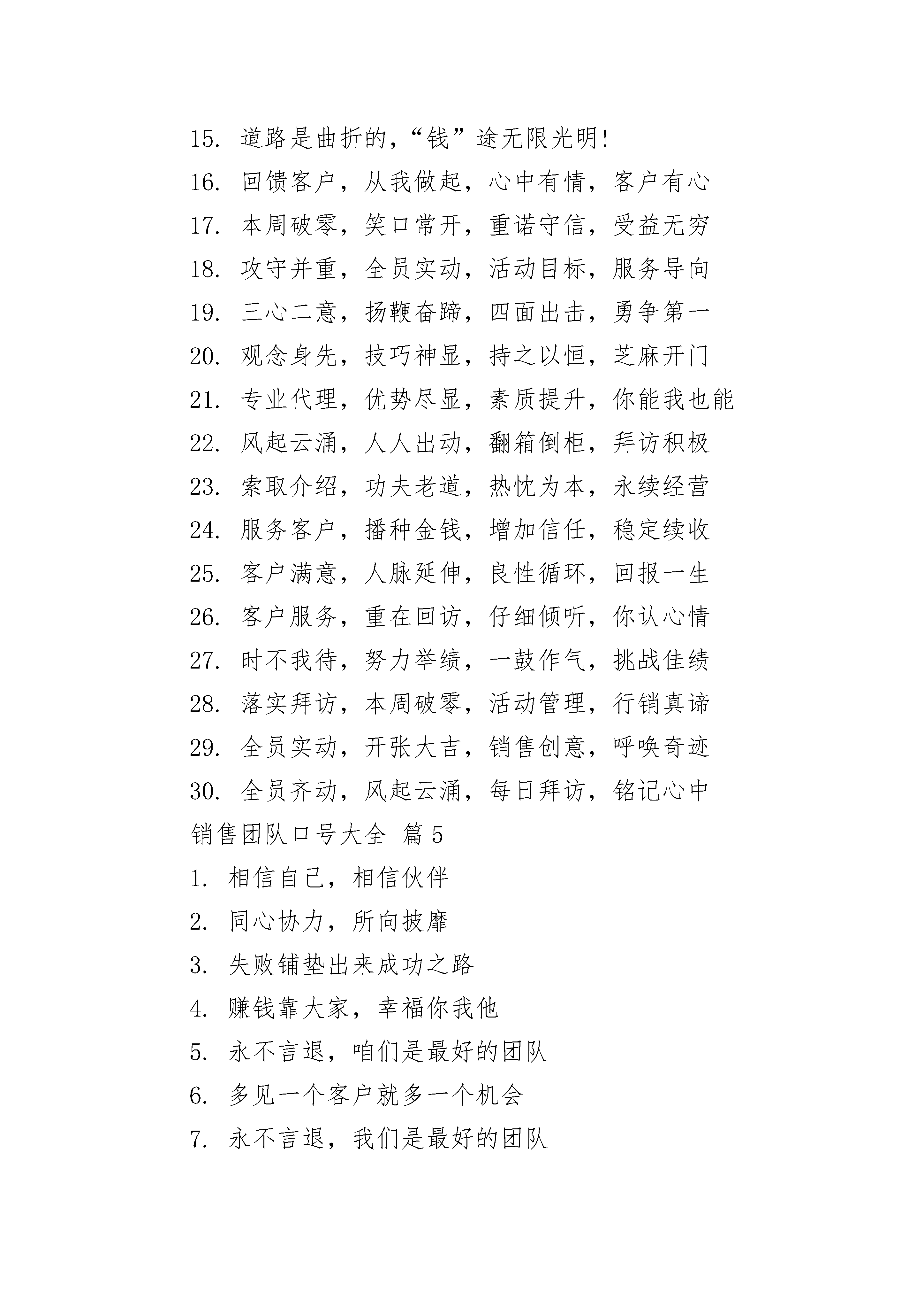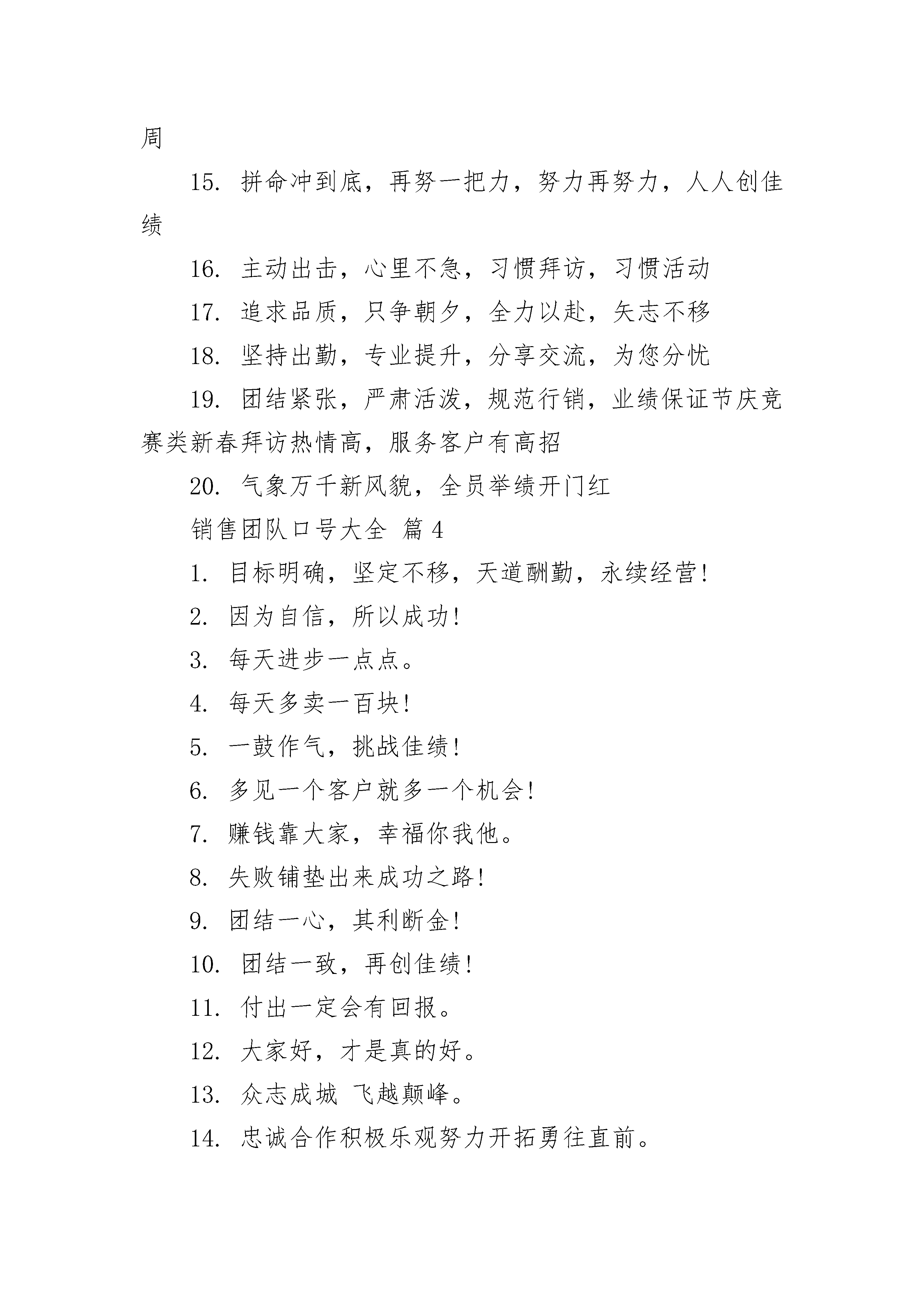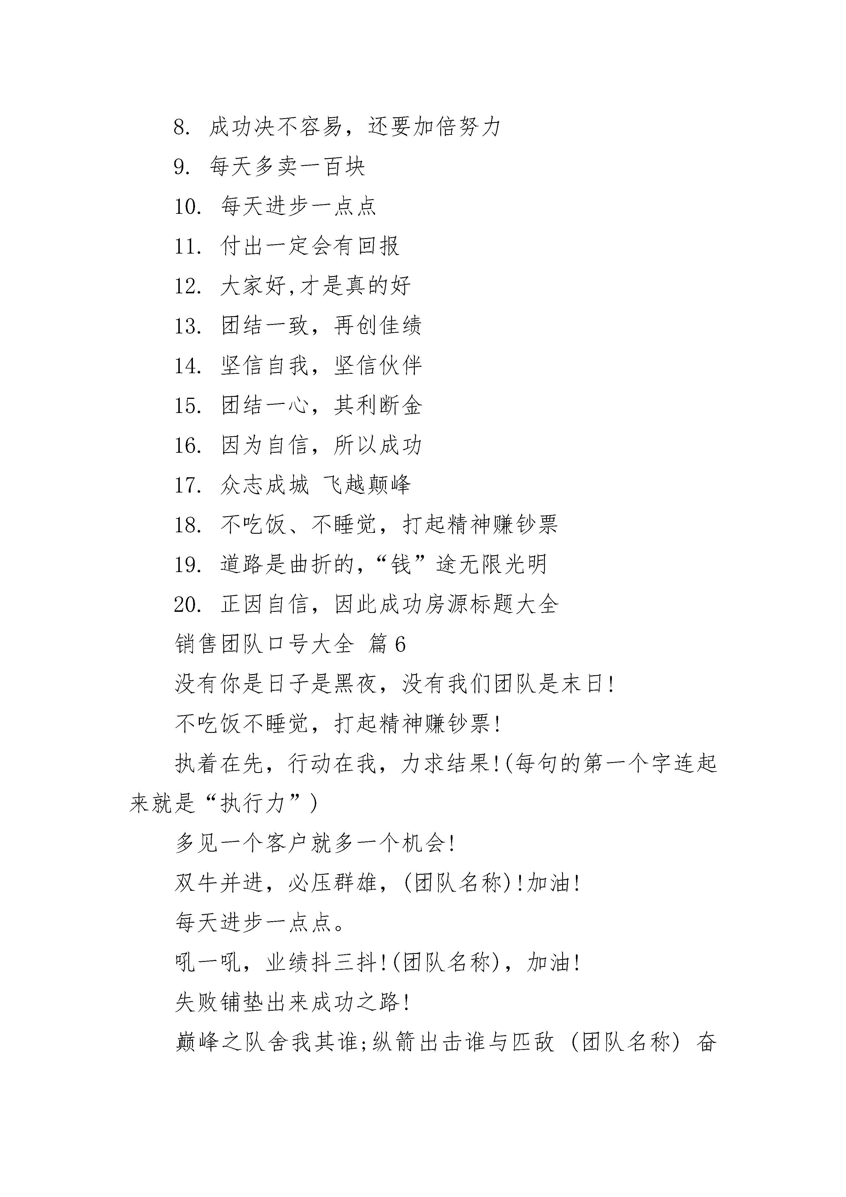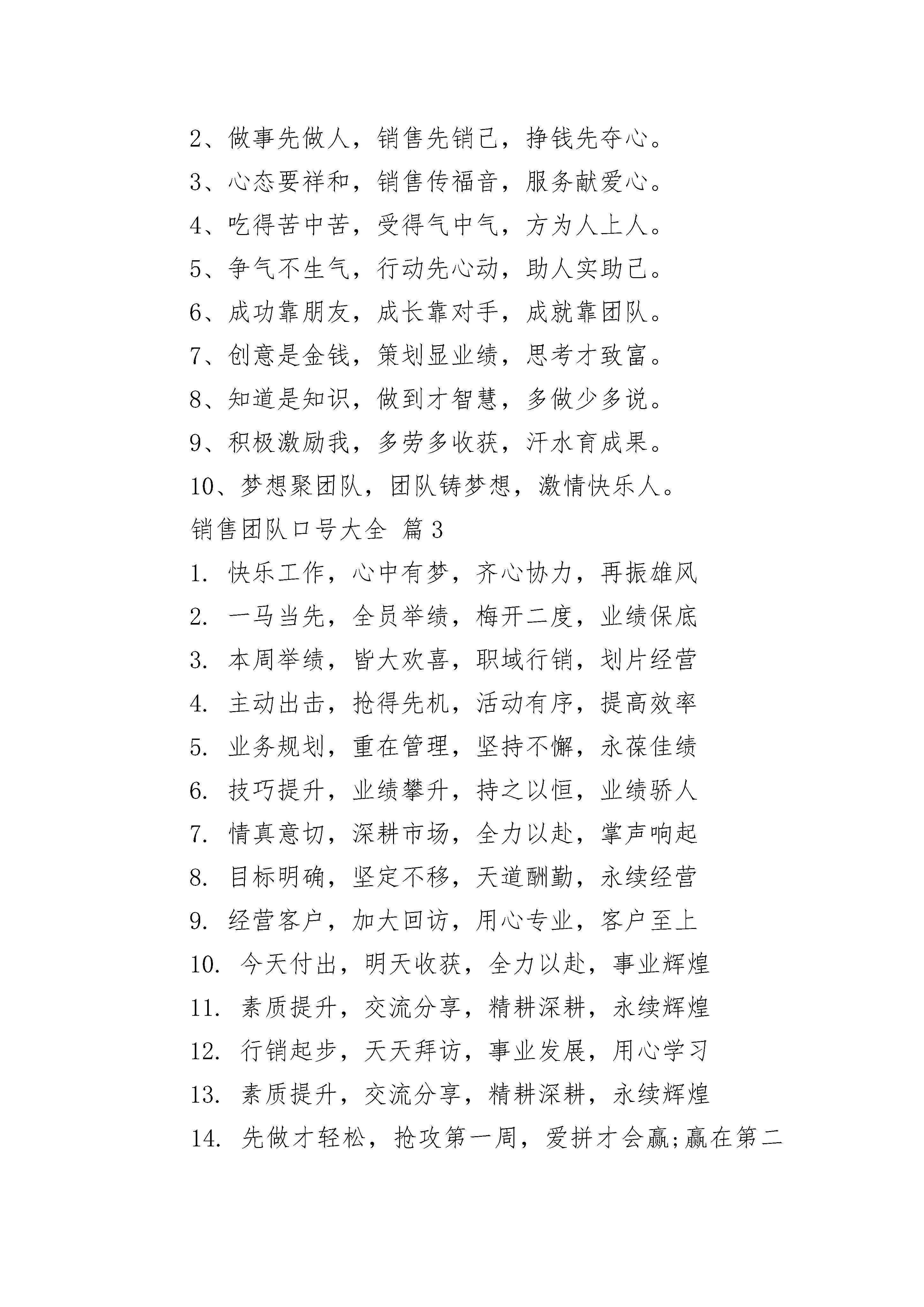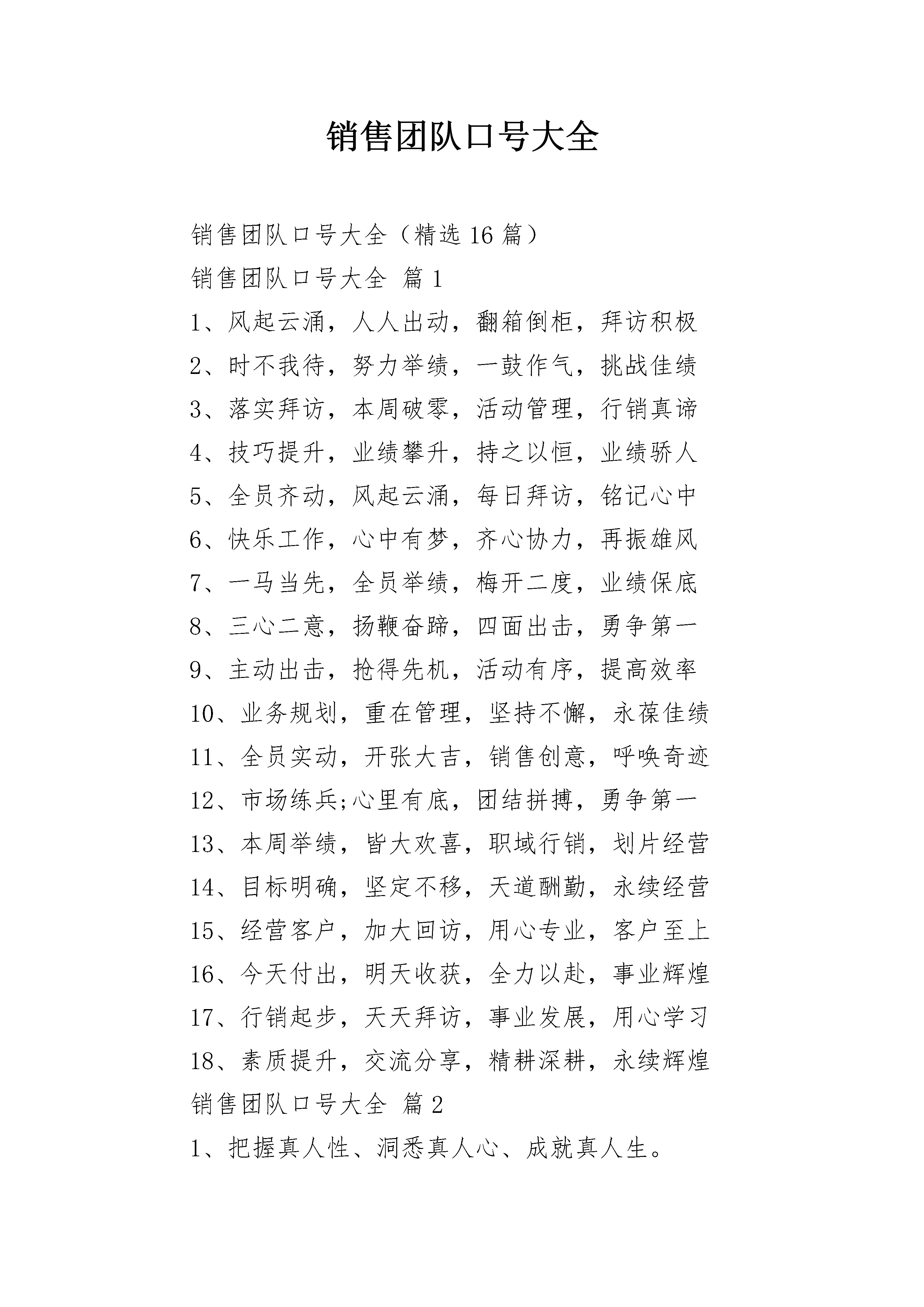 销售团队口号大全销售团队口号大全(精选16篇)销售团队口号大全篇11、风起云涌,人人出动,翻箱倒柜,拜访积极2、时不我待,努力举绩,一鼓作气,挑战佳绩3、落实拜访,本周破零,活动管理,行销真谛4、技巧提升,业绩攀升,持之以恒,业绩骄人5、全员齐动,风起云涌,每日拜访,铭记心中6、快乐工作,心中有梦,齐心协力,再振雄风7、一马当先,全员举绩,梅开二度,业绩保底8、三心二意,扬鞭奋蹄,四面出击,勇争第一9、主动出击,抢得先机,活动有序,提高效率10、业务规划,重在管理,坚持不懈,永葆佳绩11、全员实动,开张大吉,销售创意,呼唤奇迹12、市场练兵;心里有底,团结拼搏,勇争第一13、本周举绩,皆大欢喜,职域行销,划片经营14、目标明确,坚定不移,天道酬勤,永续经营15、经营客户,加大回访,用心专业,客户至上16、今天付出,明天收获,全力以赴,事业辉煌17、行销起步,天天拜访,事业发展,用心学习18、素质提升,交流分享,精耕深耕,永续辉煌销售团队口号大全篇21、把握真人性、洞悉真人心、成就真人生。2、做事先做人,销售先销己,挣钱先夺心。3、心态要祥和,销售传福音,服务献爱心。4、吃得苦中苦,受得气中气,方为人上人。5、争气不生气,行动先心动,助人实助己。6、成功靠朋友,成长靠对手,成就靠团队。7、创意是金钱,策划显业绩,思考才致富。8、知道是知识,做到才智慧,多做少多说。9、积极激励我,多劳多收获,汗水育成果。10、梦想聚团队,团队铸梦想,激情快乐人。销售团队口号大全篇31.快乐工作,心中有梦,齐心协力,再振雄风2.一马当先,全员举绩,梅开二度,业绩保底3.本周举绩,皆大欢喜,职域行销,划片经营4.主动出击,抢得先机,活动有序,提高效率5.业务规划,重在管理,坚持不懈,永葆佳绩6.技巧提升,业绩攀升,持之以恒,业绩骄人7.情真意切,深耕市场,全力以赴,掌声响起8.目标明确,坚定不移,天道酬勤,永续经营9.经营客户,加大回访,用心专业,客户至上10.今天付出,明天收获,全力以赴,事业辉煌11.素质提升,交流分享,精耕深耕,永续辉煌12.行销起步,天天拜访,事业发展,用心学习13.素质提升,交流分享,精耕深耕,永续辉煌14.先做才轻松,抢攻第一周,爱拼才会赢;赢在第二周15.拼命冲到底,再努一把力,努力再努力,人人创佳绩16.主动出击,心里不急,习惯拜访,习惯活动17.追求品质,只争朝夕,全力以赴,矢志不移18.坚持出勤,专业提升,分享交流,为您分忧19.团结紧张,严肃活泼,规范行销,业绩保证节庆竞赛类新春拜访热情高,服务客户有高招20.气象万千新风貌,全员举绩开门红销售团队口号大全篇41.目标明确,坚定不移,天道酬勤,永续经营!2.因为自信,所以成功!3.每天进步一点点。4.每天多卖一百块!5.一鼓作气,挑战佳绩!6.多见一个客户就多一个机会!7.赚钱靠大家,幸福你我他。8.失败铺垫出来成功之路!9.团结一心,其利断金!10.团结一致,再创佳绩!11.付出一定会有回报。12.大家好,才是真的好。13.众志成城飞越颠峰。14.忠诚合作积极乐观努力开拓勇往直前。15.道路是曲折的,“钱”途无限光明!16.回馈客户,从我做起,心中有情,客户有心17.本周破零,笑口常开,重诺守信,受益无穷18.攻守并重,全员实动,活动目标,服务导向19.三心二意,扬鞭奋蹄,四面出击,勇争第一20.观念身先,技巧神显,持之以恒,芝麻开门21.专业代理,优势尽显,素质提升,你能我也能22.风起云涌,人人出动,翻箱倒柜,拜访积极23.索取介绍,功夫老道,热忱为本,永续经营24.服务客户,播种金钱,增加信任,稳定续收25.客户满意,人脉延伸,良性循环,回报一生26.客户服务,重在回访,仔细倾听,你认心情27.时不我待,努力举绩,一鼓作气,挑战佳绩28.落实拜访,本周破零,活动管理,行销真谛29.全员实动,开张大吉,销售创意,呼唤奇迹30.全员齐动,风起云涌,每日拜访,铭记心中销售团队口号大全篇51.相信自己,相信伙伴2.同心协力,所向披靡3.失败铺垫出来成功之路4.赚钱靠大家,幸福你我他5.永不言退,咱们是最好的团队6.多见一个客户就多一个机会7.永不言退,我们是最好的团队8.成功决不容易,还要加倍努力9.每天多卖一百块10.每天进步一点点11.付出一定会有回报12.大家好,才是真的好13.团结一致,再创佳绩14.坚信自我,坚信伙伴15.团结一心,其利断金16.因为自信,所以成功17.众志成城飞越颠峰18.不吃饭、不睡觉,打起精神赚钞票19.道路是曲折的,“钱”途无限光明20.正因自信,因此成功房源标题大全销售团队口号大全篇6没有你是日子是黑夜,没有我们团队是末日!不吃饭不睡觉,打起精神赚钞票!执着在先,行动在我,力求结果!(每句的第一个字连起来就是“执行力”)多见