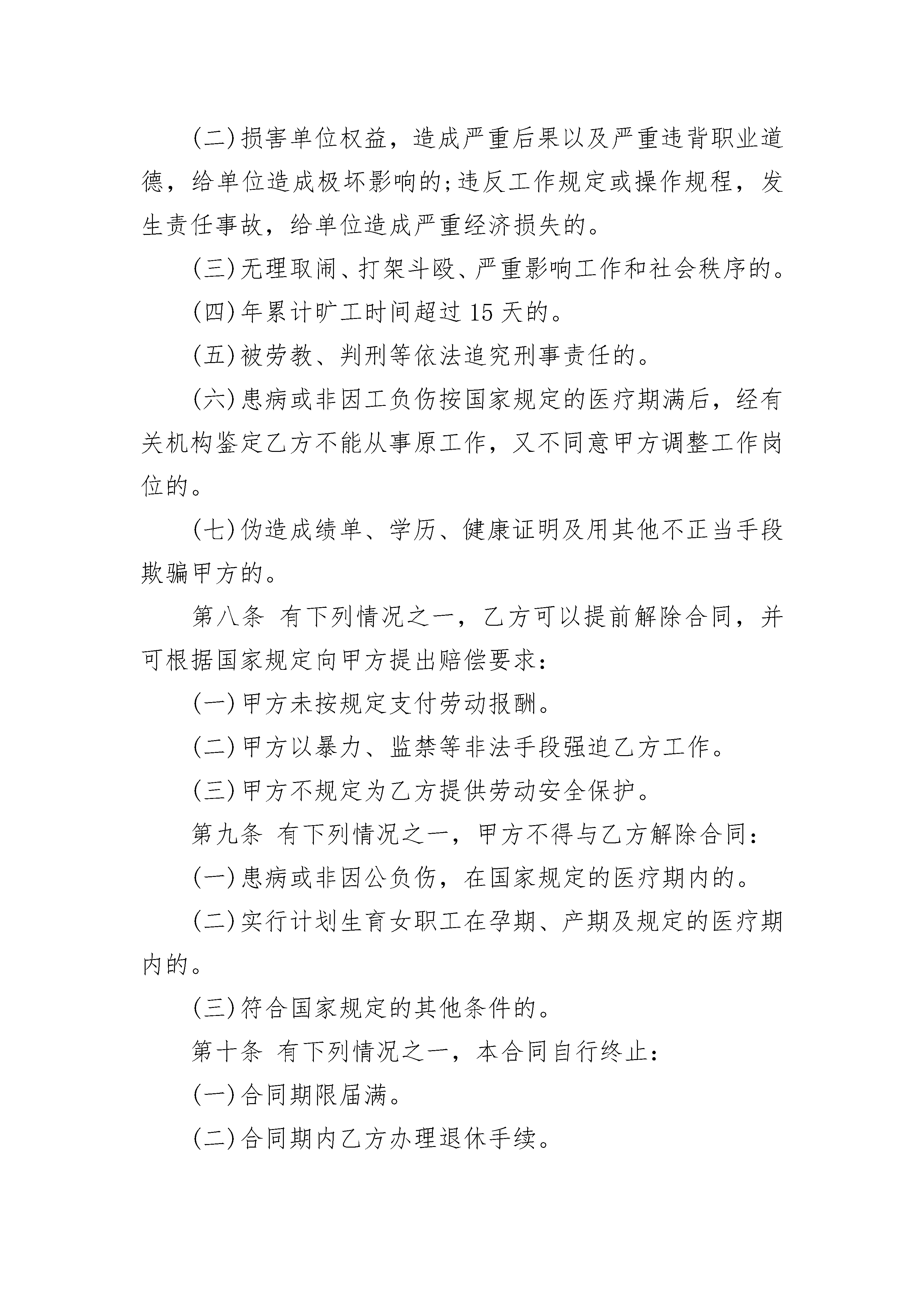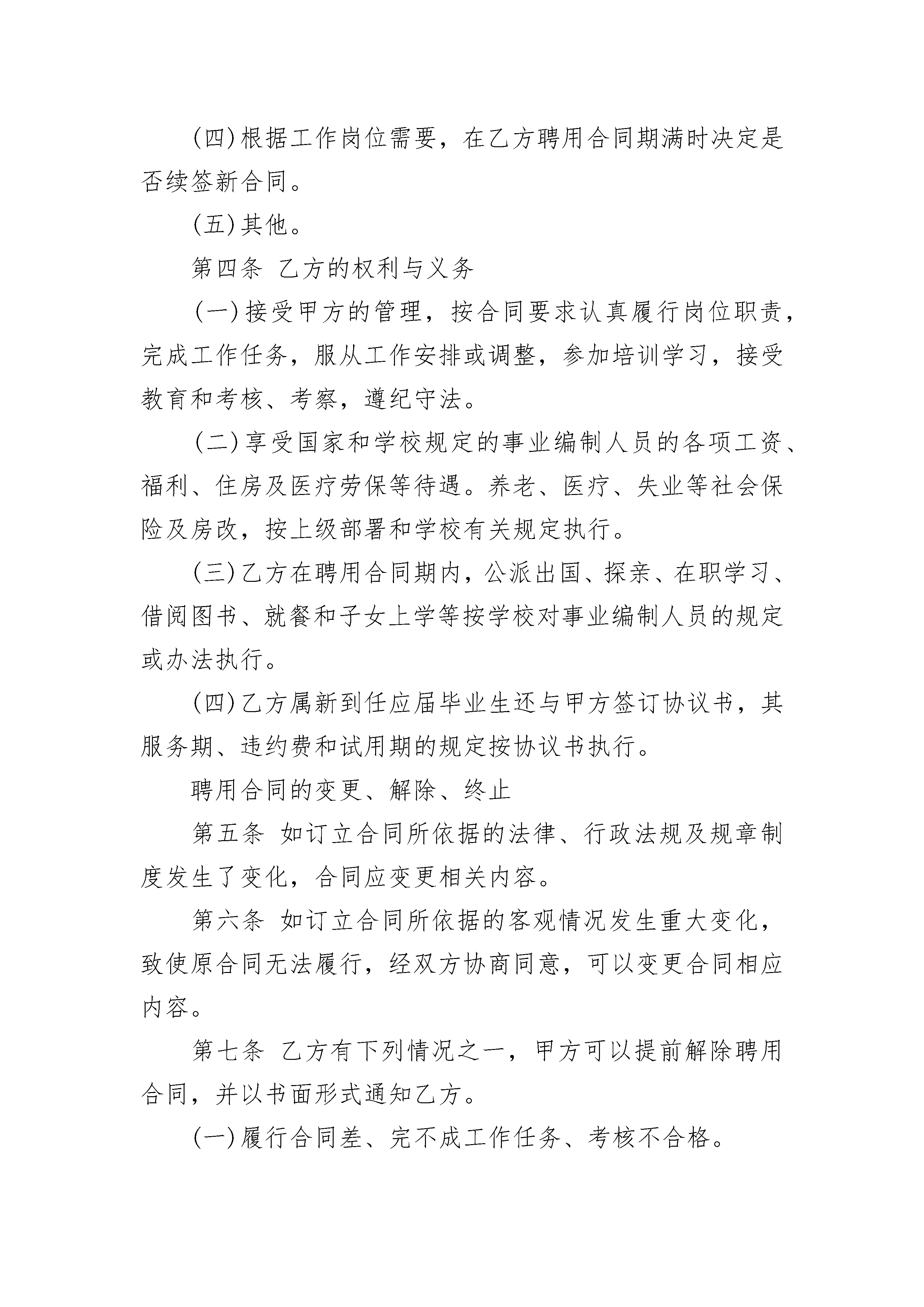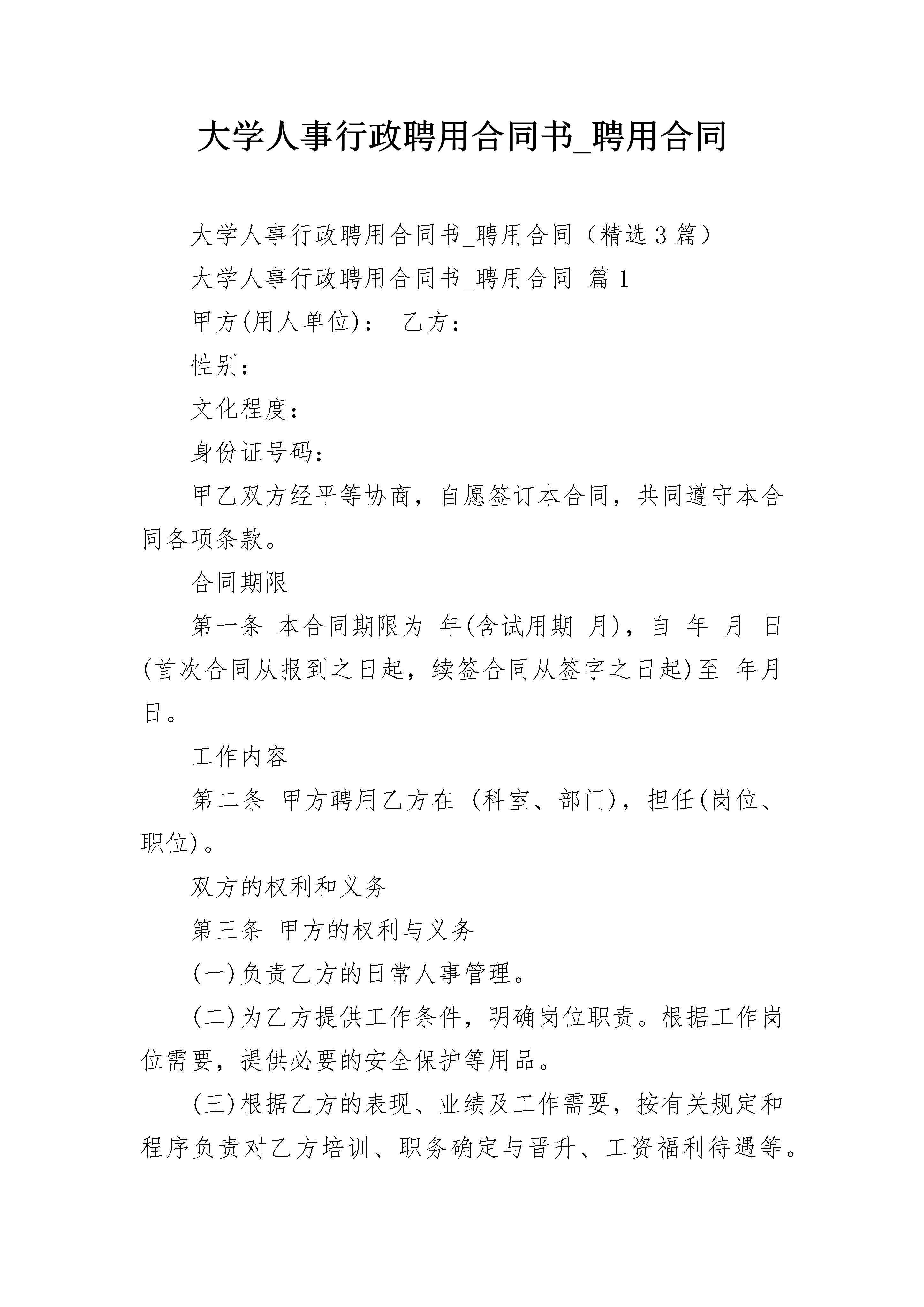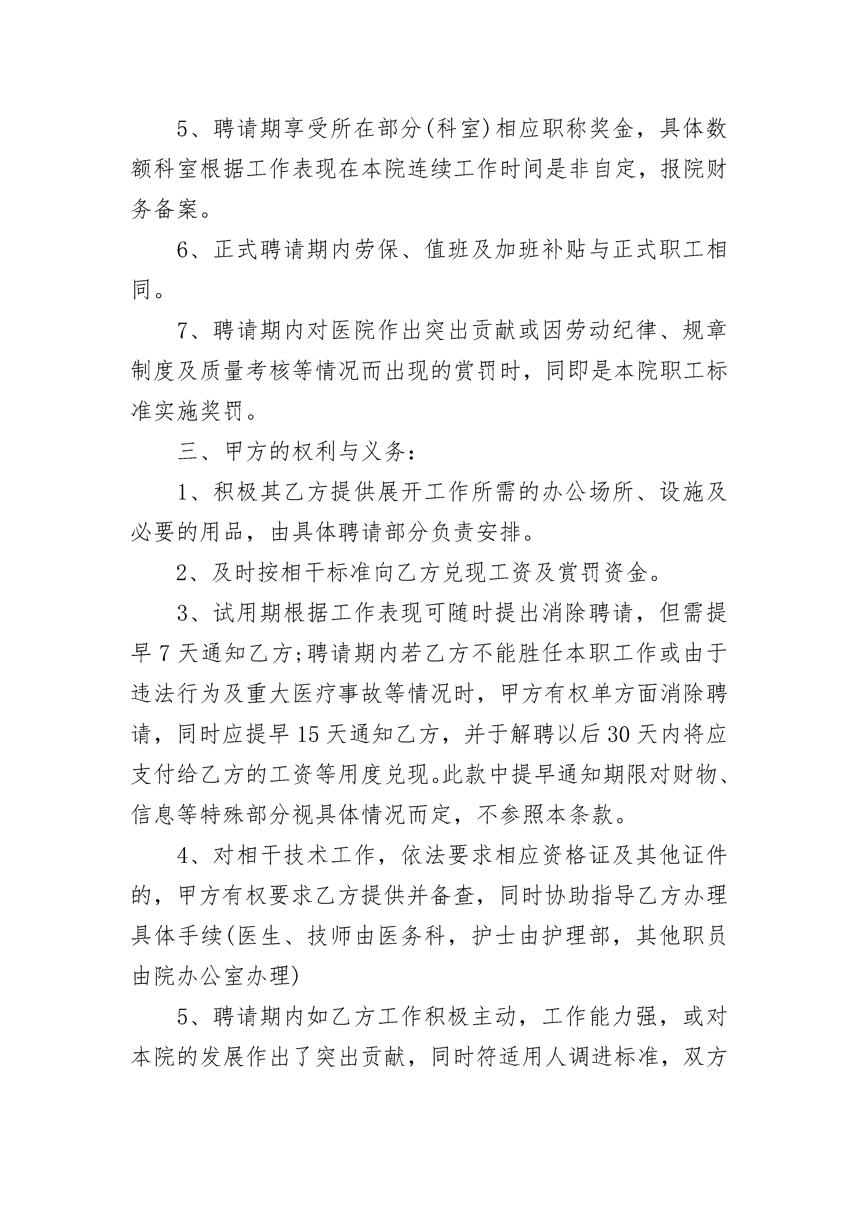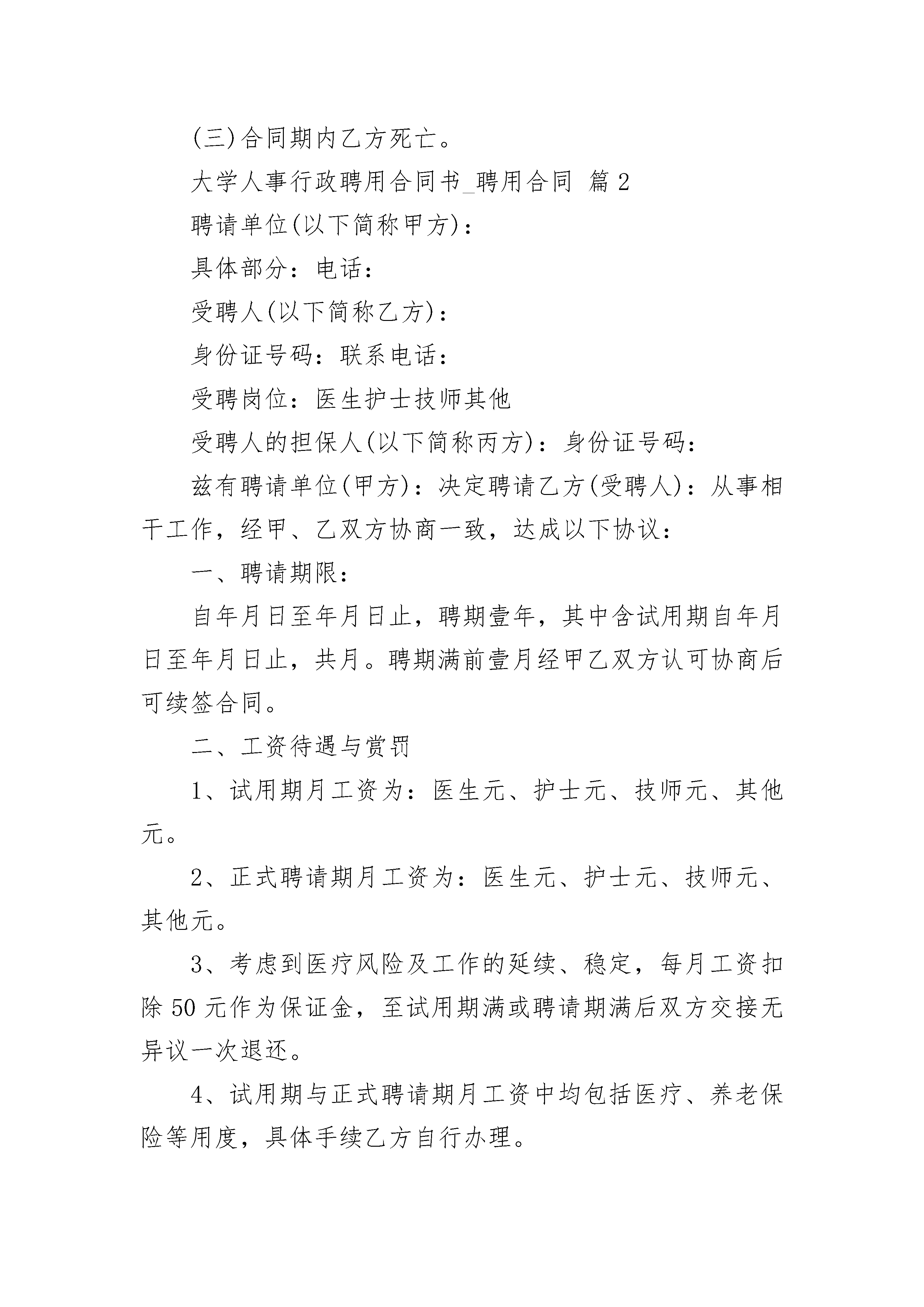 大学人事行政聘用合同书_聘用合同大学人事行政聘用合同书_聘用合同(精选3篇)大学人事行政聘用合同书_聘用合同篇1甲方(用人单位):乙方:性别:文化程度:身份证号码:甲乙双方经平等协商,自愿签订本合同,共同遵守本合同各项条款。合同期限第一条本合同期限为年(含试用期月),自年月日(首次合同从报到之日起,续签合同从签字之日起)至年月日。工作内容第二条甲方聘用乙方在(科室、部门),担任(岗位、职位)。双方的权利和义务第三条甲方的权利与义务(一)负责乙方的日常人事管理。(二)为乙方提供工作条件,明确岗位职责。根据工作岗位需要,提供必要的安全保护等用品。(三)根据乙方的表现、业绩及工作需要,按有关规定和程序负责对乙方培训、职务确定与晋升、工资福利待遇等。(四)根据工作岗位需要,在乙方聘用合同期满时决定是否续签新合同。(五)其他。第四条乙方的权利与义务(一)接受甲方的管理,按合同要求认真履行岗位职责,完成工作任务,服从工作安排或调整,参加培训学习,接受教育和考核、考察,遵纪守法。(二)享受国家和学校规定的事业编制人员的各项工资、福利、住房及医疗劳保等待遇。养老、医疗、失业等社会保险及房改,按上级部署和学校有关规定执行。(三)乙方在聘用合同期内,公派出国、探亲、在职学习、借阅图书、就餐和子女上学等按学校对事业编制人员的规定或办法执行。(四)乙方属新到任应届毕业生还与甲方签订协议书,其服务期、违约费和试用期的规定按协议书执行。聘用合同的变更、解除、终止第五条如订立合同所依据的法律、行政法规及规章制度发生了变化,合同应变更相关内容。第六条如订立合同所依据的客观情况发生重大变化,致使原合同无法履行,经双方协商同意,可以变更合同相应内容。第七条乙方有下列情况之一,甲方可以提前解除聘用合同,并以书面形式通知乙方。(一)履行合同差、完不成工作任务、考核不合格。(二)损害单位权益,造成严重后果以及严重违背职业道德,给单位造成极坏影响的;违反工作规定或操作规程,发生责任事故,给单位造成严重经济损失的。(三)无理取闹、打架斗殴、严重影响工作和社会秩序的。(四)年累计旷工时间超过15天的。(五)被劳教、判刑等依法追究刑事责任的。(六)患病或非因工负伤按国家规定的医疗期满后,经有关机构鉴定乙方不能从事原工作,又不同意甲方调整工作岗位的。(七)伪造成绩单、学历、健康证明及用其他不正当手段欺骗甲方的。第八条有下列情况之一,乙方可以提前解除合同,并可根据国家规定向甲方提出赔偿要求:(一)甲方未按规定支付劳动报酬。(二)甲方以暴力、监禁等非法手段强迫乙方工作。(三)甲方不规定为乙方提供劳动安全保护。第九条有下列情况之一,甲方不得与乙方解除合同:(一)患病或非因公负伤,在国家规定的医疗期内的。(二)实行计划生育女职工在孕期、产期及规定的医疗期内的。(三)符合国家规定的其他条件的。第十条有下列情况之一,本合同自行终止:(一)合同期限届满。(二)合同期内乙方办理退休手续。(三)合同期内乙方死亡。大学人事行政聘用合同书_聘用合同篇2聘请单位(以下简称甲方):具体部分:电话:受聘人(以下简称乙方):身份证号码:联系电话:受聘岗位:医生护士技师其他受聘人的担保人(以下简称丙方):身份证号码:兹有聘请单位(甲方):决定聘请乙方(受聘人):从事相干工作,经甲、乙双方协商一致,达成以下协议:一、聘请期限:自年月日至年月日止,聘期壹年,其中含试用期自年月日至年月日止,共月。聘期满前壹月经甲乙双方认可协商后可续签合同。二、工资待遇与赏罚1、试用期月工资为:医生元、护士元、技师元、其他元。2、正式聘请期月工资为:医生元、护士元、技师元、其他元。3、考虑到医疗风险及工作的延续、稳定,每月工资扣除50元作为保证金,至试用期满或聘请期满后双方交接无异议一次退还。4、试用期与正式聘请期月工资中均包括医疗、养老保险等用度,具体手续乙方自行办理。5、聘请期享受所在部分(科室)相应职称奖金,具体数额科室根据工作表现在本院连续工作时间是非自定,报院财务备案。6、正式聘请期内劳保、值班及加班补贴与正式职工相同。7、聘请期内对医院作出突出贡献或因劳动纪律、规章制度及质量考核等情况而出现的赏罚时,同即是本院职工标准实施奖罚。三、甲方的权利与义务:1、积极其乙方提供展开工作所需的办公场所、设施及必要的用品,由具体聘请部分负责安排。2、及时按相干标准向乙方兑现工资及赏罚资金。3、试用期根据工作表现可随时提出消除聘请,但需提早7天通知乙方;聘请期内若乙方不能胜任本职工作或由于违法行为及重大医疗事故等情况时,甲方有权单方面消除聘请,同时应提早15天通知乙方,并于解聘以后30天内将应支付给乙方的工资等用度兑现。此款中提早通知期限对财物、信息等特殊部分视具体情况而定,不参照本条款。4、对相干技术工作,依法要求相应资格证及其他