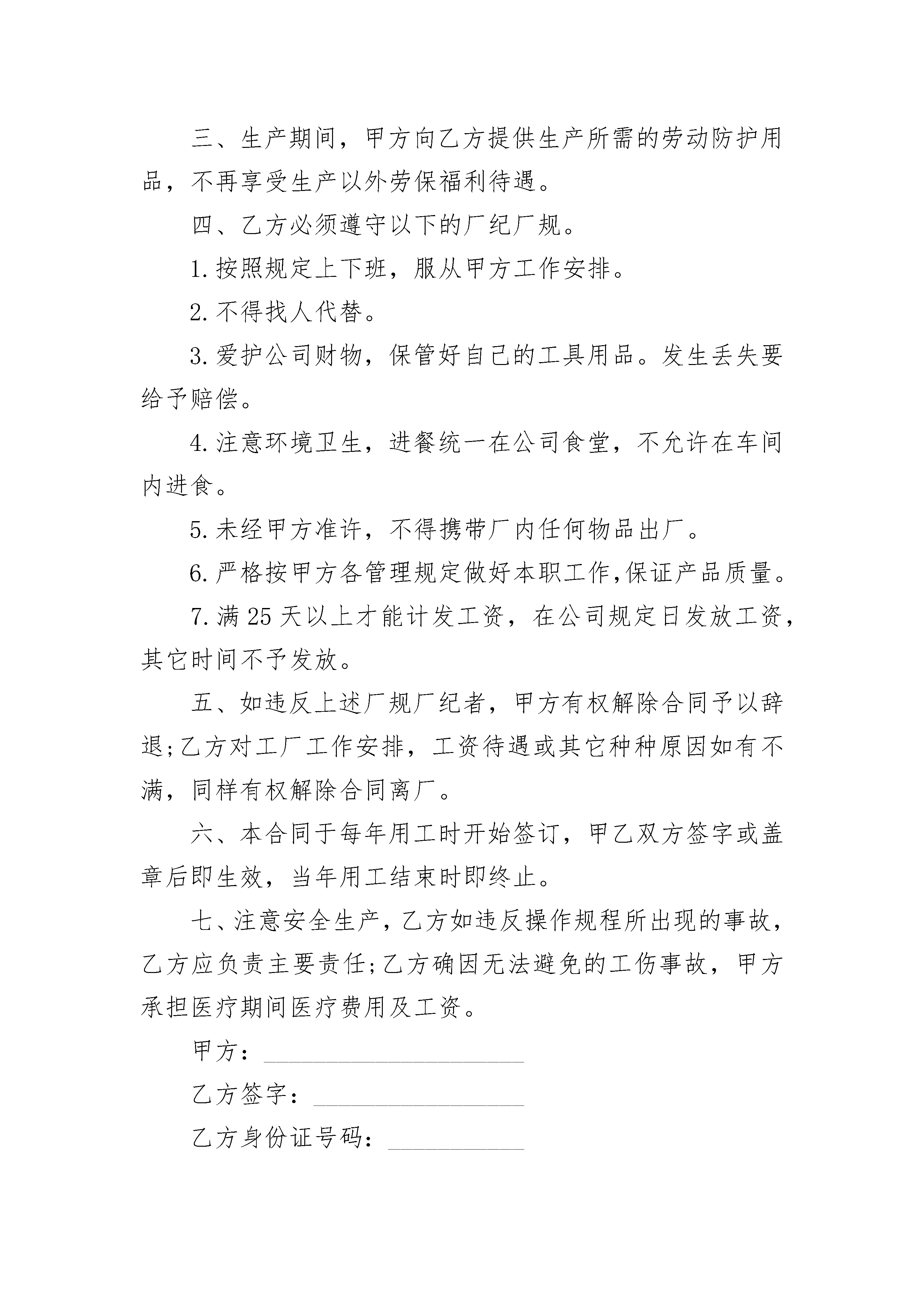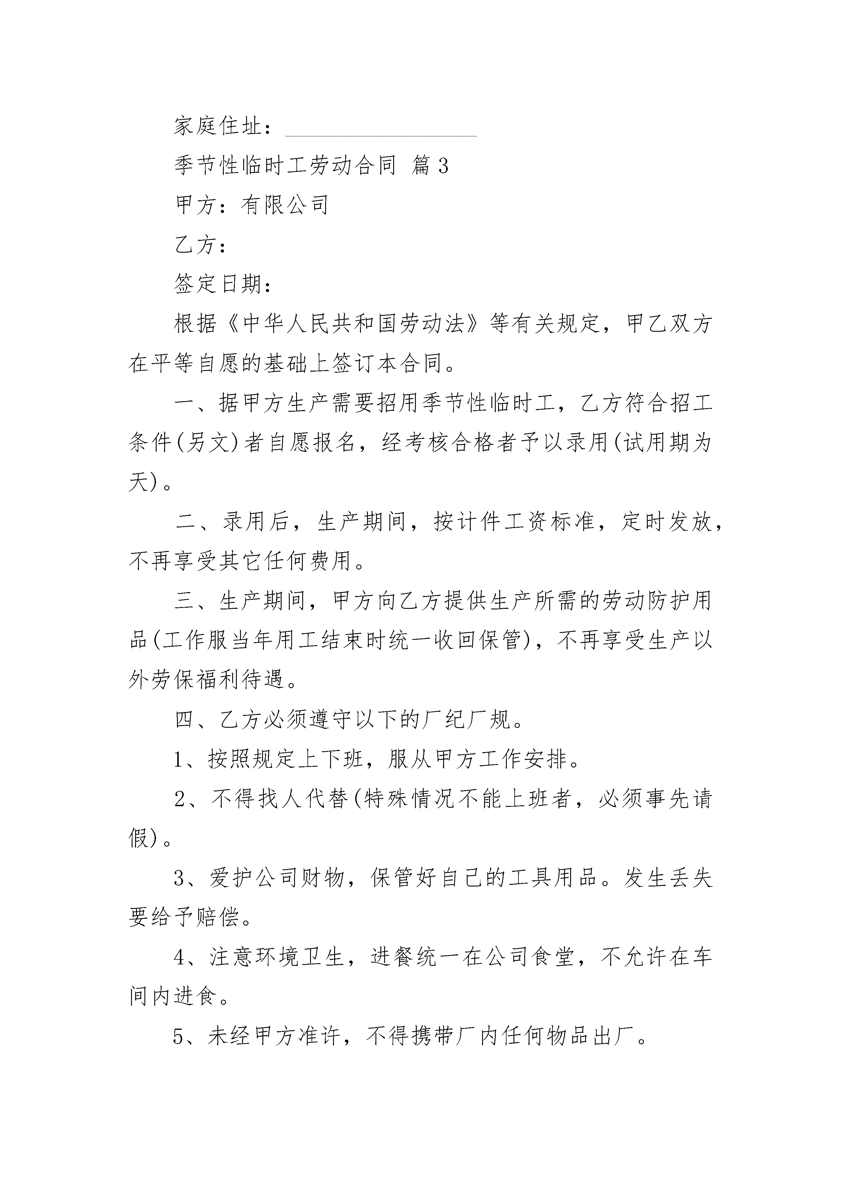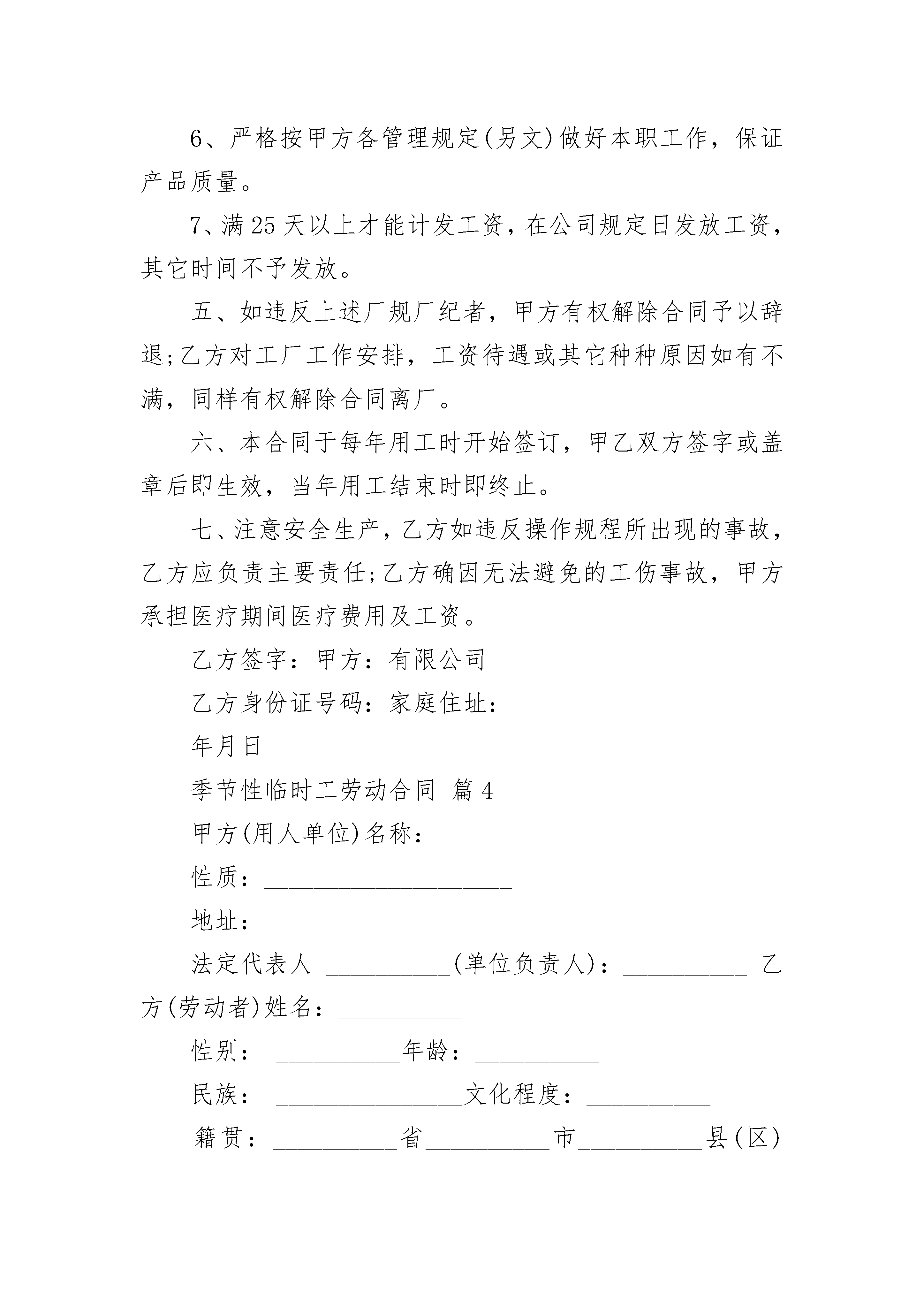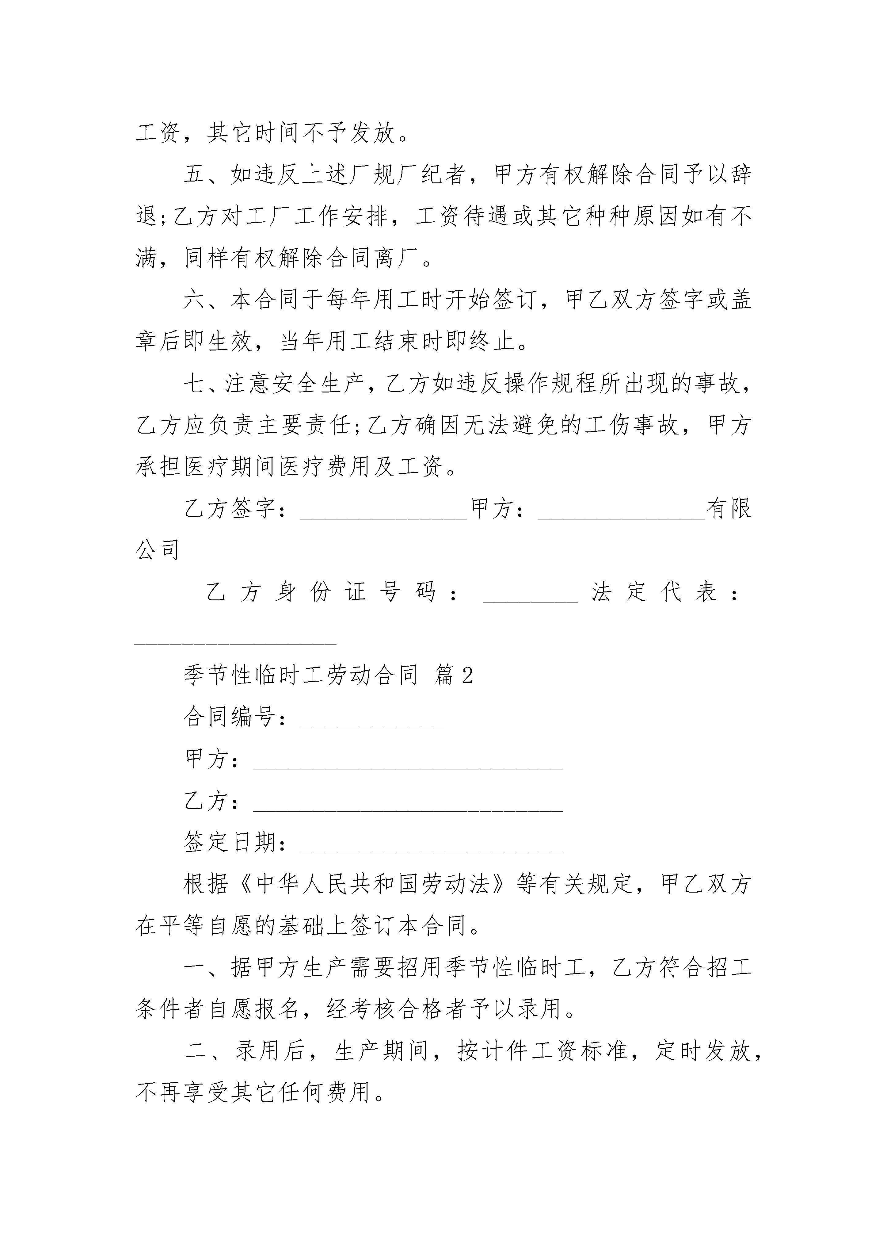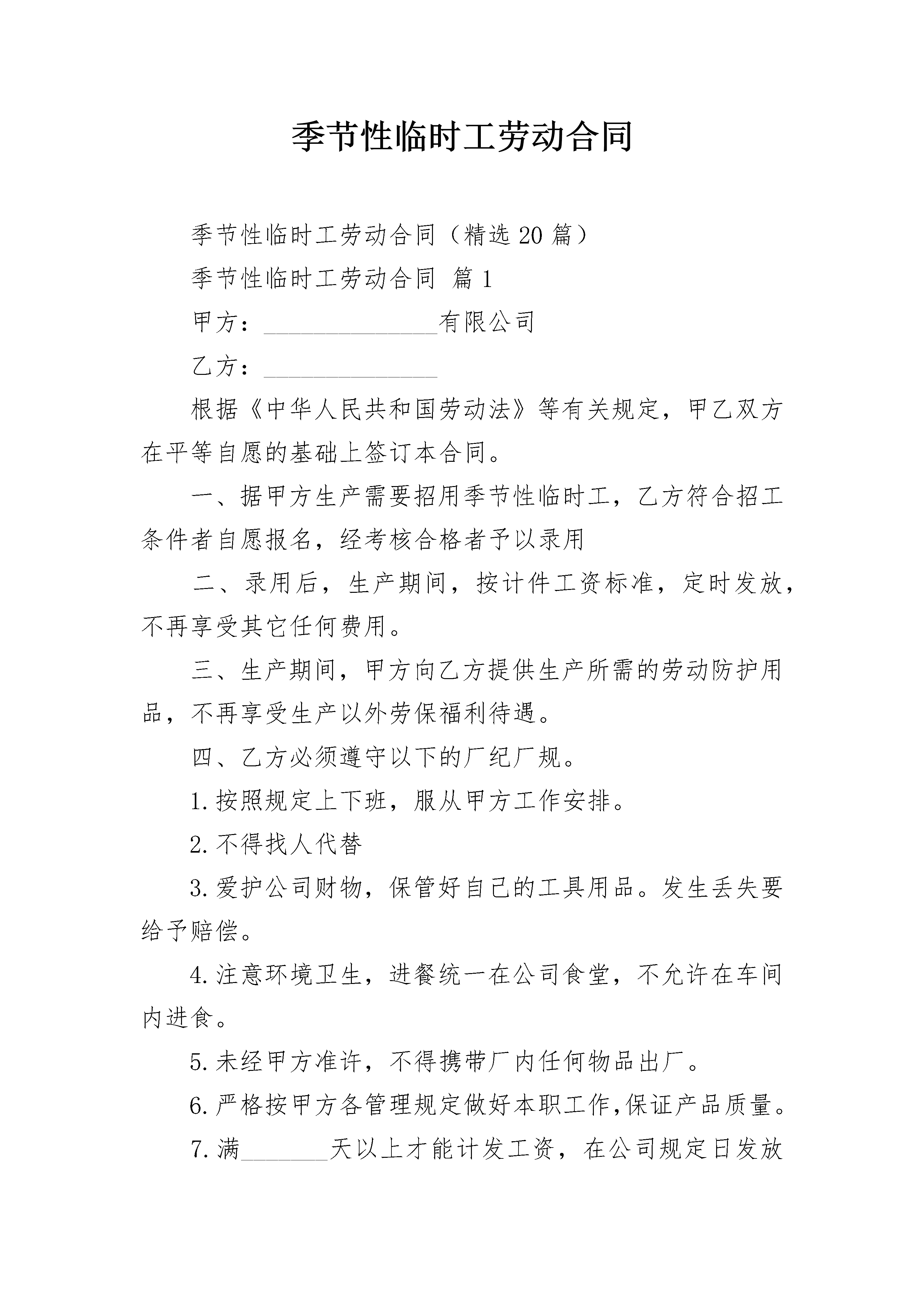 季节性临时工劳动合同季节性临时工劳动合同(精选20篇)季节性临时工劳动合同篇1甲方:______________有限公司乙方:______________根据《中华人民共和国劳动法》等有关规定,甲乙双方在平等自愿的基础上签订本合同。一、据甲方生产需要招用季节性临时工,乙方符合招工条件者自愿报名,经考核合格者予以录用二、录用后,生产期间,按计件工资标准,定时发放,不再享受其它任何费用。三、生产期间,甲方向乙方提供生产所需的劳动防护用品,不再享受生产以外劳保福利待遇。四、乙方必须遵守以下的厂纪厂规。1.按照规定上下班,服从甲方工作安排。2.不得找人代替3.爱护公司财物,保管好自己的工具用品。发生丢失要给予赔偿。4.注意环境卫生,进餐统一在公司食堂,不允许在车间内进食。5.未经甲方准许,不得携带厂内任何物品出厂。6.严格按甲方各管理规定做好本职工作,保证产品质量。7.满_______天以上才能计发工资,在公司规定日发放工资,其它时间不予发放。五、如违反上述厂规厂纪者,甲方有权解除合同予以辞退;乙方对工厂工作安排,工资待遇或其它种种原因如有不满,同样有权解除合同离厂。六、本合同于每年用工时开始签订,甲乙双方签字或盖章后即生效,当年用工结束时即终止。七、注意安全生产,乙方如违反操作规程所出现的事故,乙方应负责主要责任;乙方确因无法避免的工伤事故,甲方承担医疗期间医疗费用及工资。乙方签字:______________甲方:______________有限公司乙方身份证号码:________法定代表:_________________季节性临时工劳动合同篇2合同编号:____________甲方:__________________________乙方:__________________________签定日期:______________________根据《中华人民共和国劳动法》等有关规定,甲乙双方在平等自愿的基础上签订本合同。一、据甲方生产需要招用季节性临时工,乙方符合招工条件者自愿报名,经考核合格者予以录用。二、录用后,生产期间,按计件工资标准,定时发放,不再享受其它任何费用。三、生产期间,甲方向乙方提供生产所需的劳动防护用品,不再享受生产以外劳保福利待遇。四、乙方必须遵守以下的厂纪厂规。1.按照规定上下班,服从甲方工作安排。2.不得找人代替。3.爱护公司财物,保管好自己的工具用品。发生丢失要给予赔偿。4.注意环境卫生,进餐统一在公司食堂,不允许在车间内进食。5.未经甲方准许,不得携带厂内任何物品出厂。6.严格按甲方各管理规定做好本职工作,保证产品质量。7.满25天以上才能计发工资,在公司规定日发放工资,其它时间不予发放。五、如违反上述厂规厂纪者,甲方有权解除合同予以辞退;乙方对工厂工作安排,工资待遇或其它种种原因如有不满,同样有权解除合同离厂。六、本合同于每年用工时开始签订,甲乙双方签字或盖章后即生效,当年用工结束时即终止。七、注意安全生产,乙方如违反操作规程所出现的事故,乙方应负责主要责任;乙方确因无法避免的工伤事故,甲方承担医疗期间医疗费用及工资。甲方:_____________________乙方签字:_________________乙方身份证号码:___________家庭住址:_________________季节性临时工劳动合同篇3甲方:有限公司乙方:签定日期:根据《中华人民共和国劳动法》等有关规定,甲乙双方在平等自愿的基础上签订本合同。一、据甲方生产需要招用季节性临时工,乙方符合招工条件(另文)者自愿报名,经考核合格者予以录用(试用期为天)。二、录用后,生产期间,按计件工资标准,定时发放,不再享受其它任何费用。三、生产期间,甲方向乙方提供生产所需的劳动防护用品(工作服当年用工结束时统一收回保管),不再享受生产以外劳保福利待遇。四、乙方必须遵守以下的厂纪厂规。1、按照规定上下班,服从甲方工作安排。2、不得找人代替(特殊情况不能上班者,必须事先请假)。3、爱护公司财物,保管好自己的工具用品。发生丢失要给予赔偿。4、注意环境卫生,进餐统一在公司食堂,不允许在车间内进食。5、未经甲方准许,不得携带厂内任何物品出厂。6、严格按甲方各管理规定(另文)做好本职工作,保证产品质量。7、满25天以上才能计发工资,在公司规定日发放工资,其它时间不予发放。五、如违反上述厂规厂纪者,甲方有权解除合同予以辞退;乙方对工厂工作安排,工资待遇或其它种种原因如有不满,同样有权解除合同离厂。六、本合同于每年用工时开始签订,甲乙双方签字或盖章后即生效,当年用工结束时即终止。七、注意安全生产,乙方如违反操作规程所出现的事故,乙方应负责主要责任;乙方确因无法避免的工伤事故,甲方承担医疗期间医疗费用及工资。乙方签字:甲方:有限公司乙方身份证号码:家庭