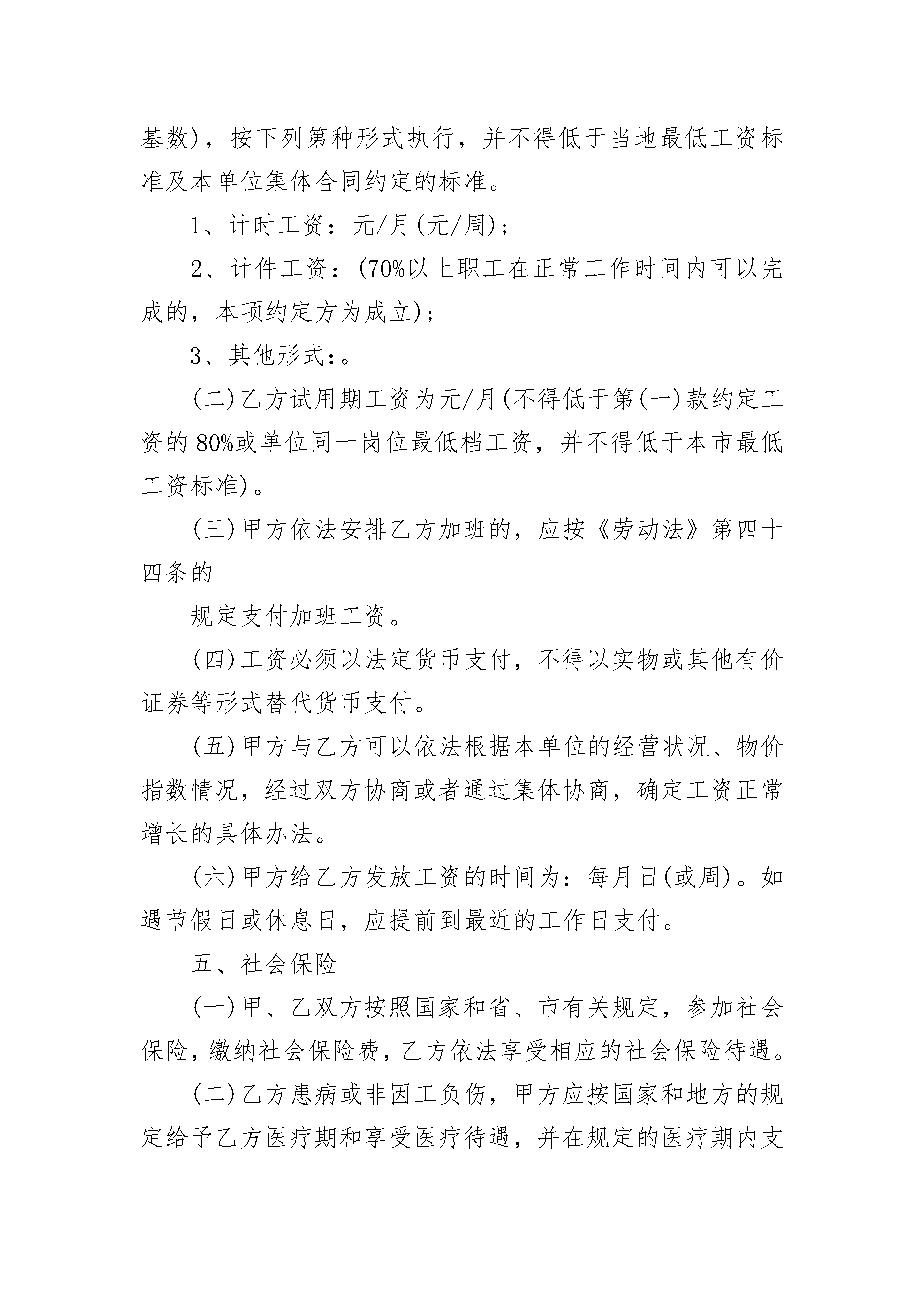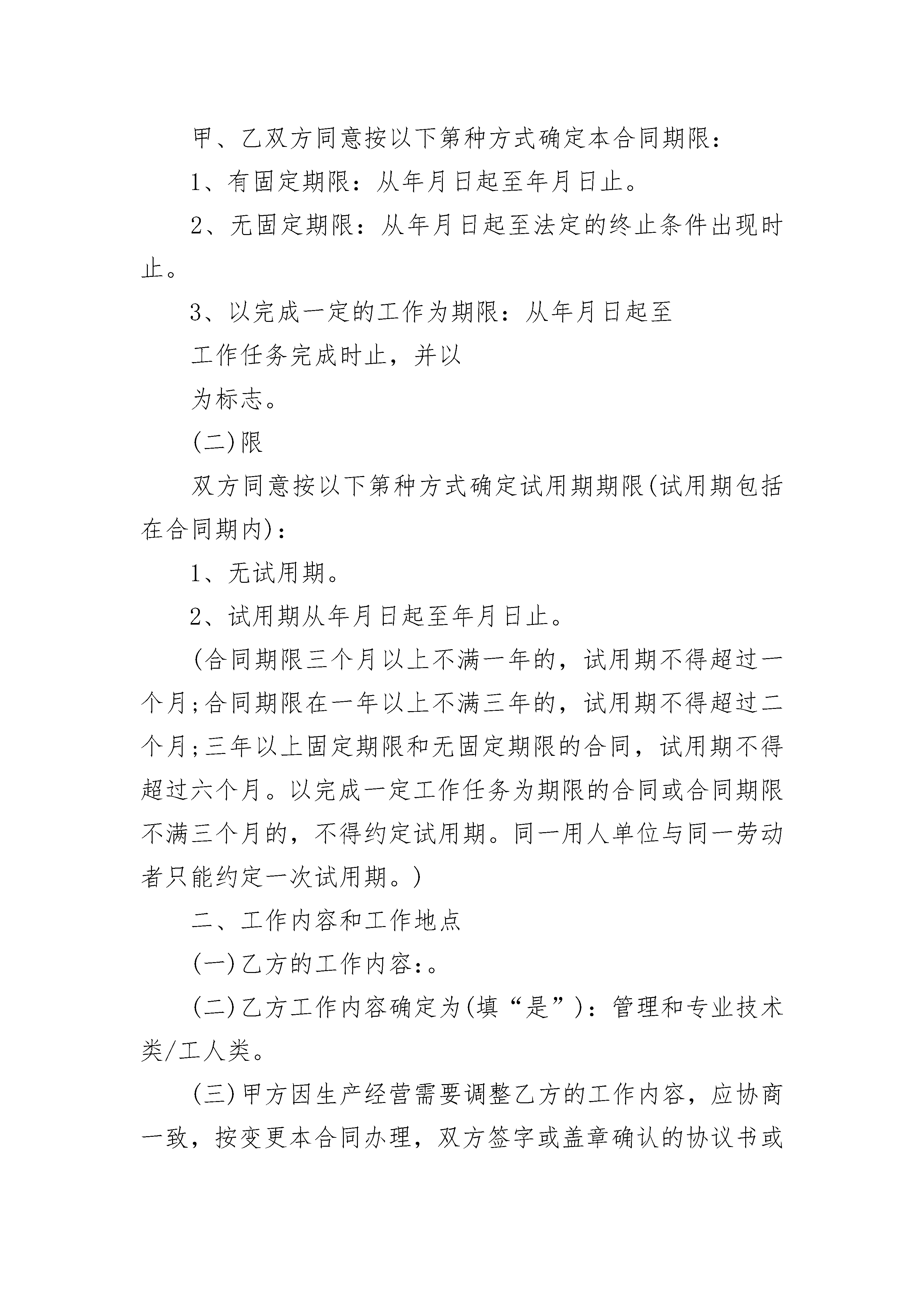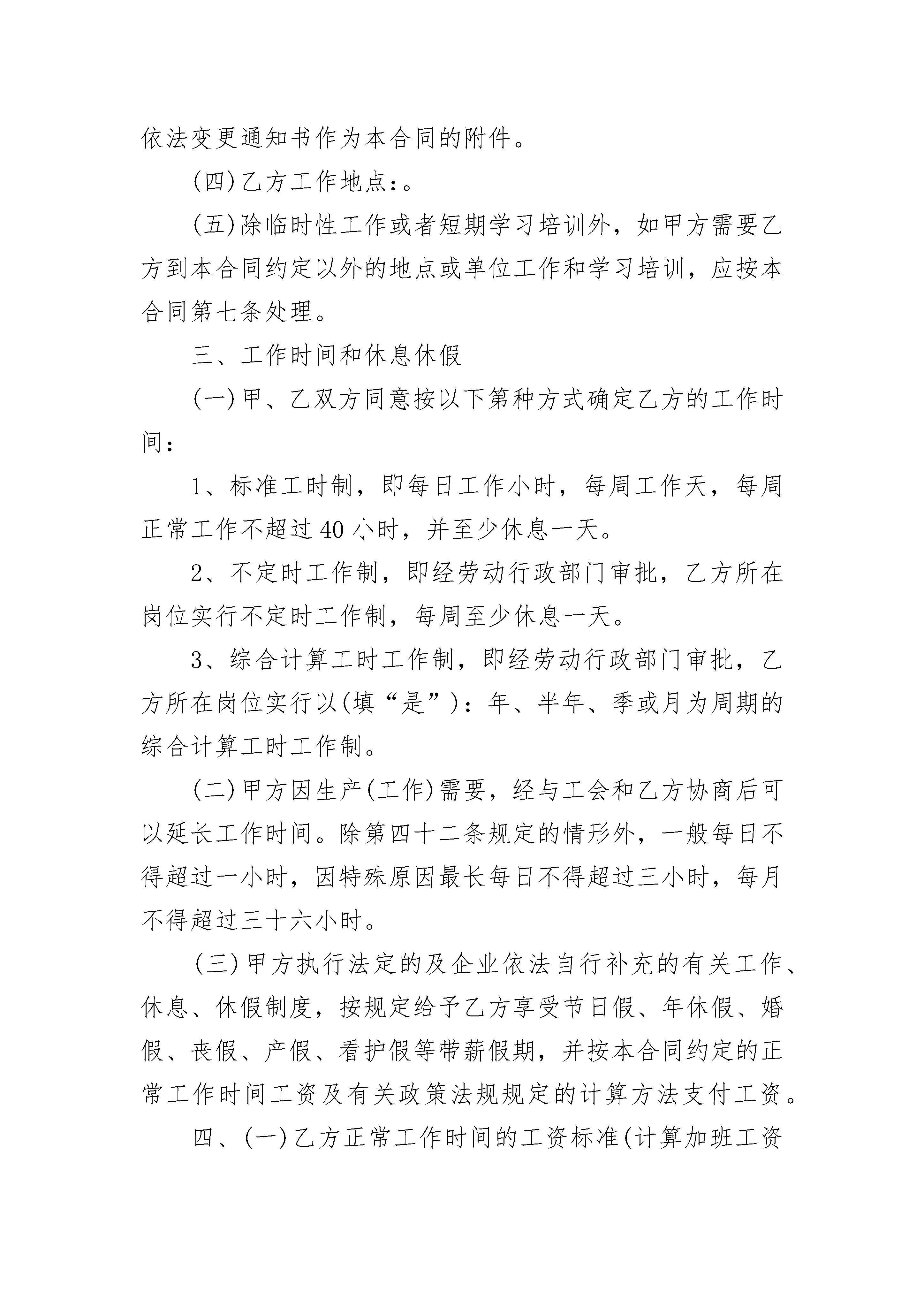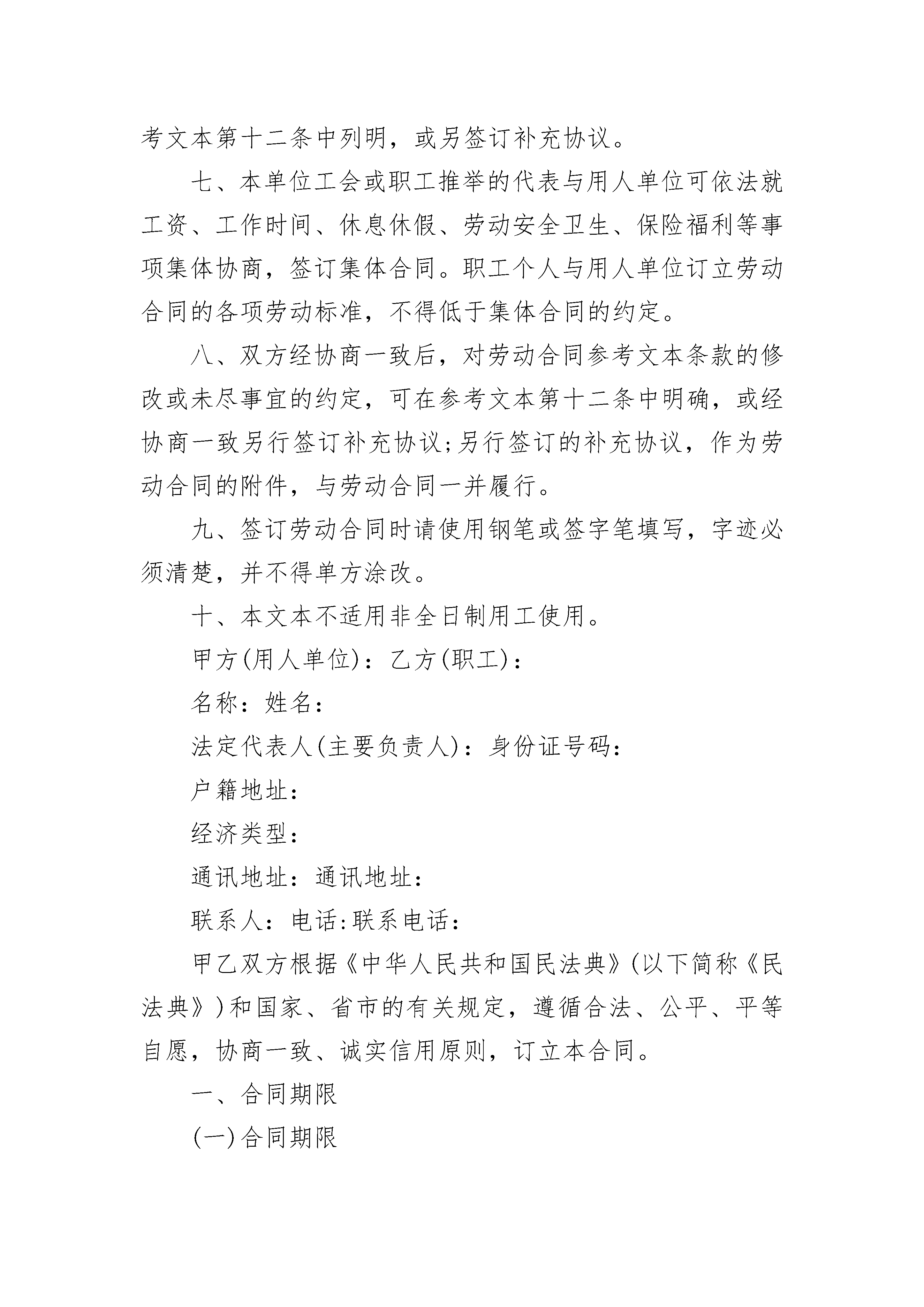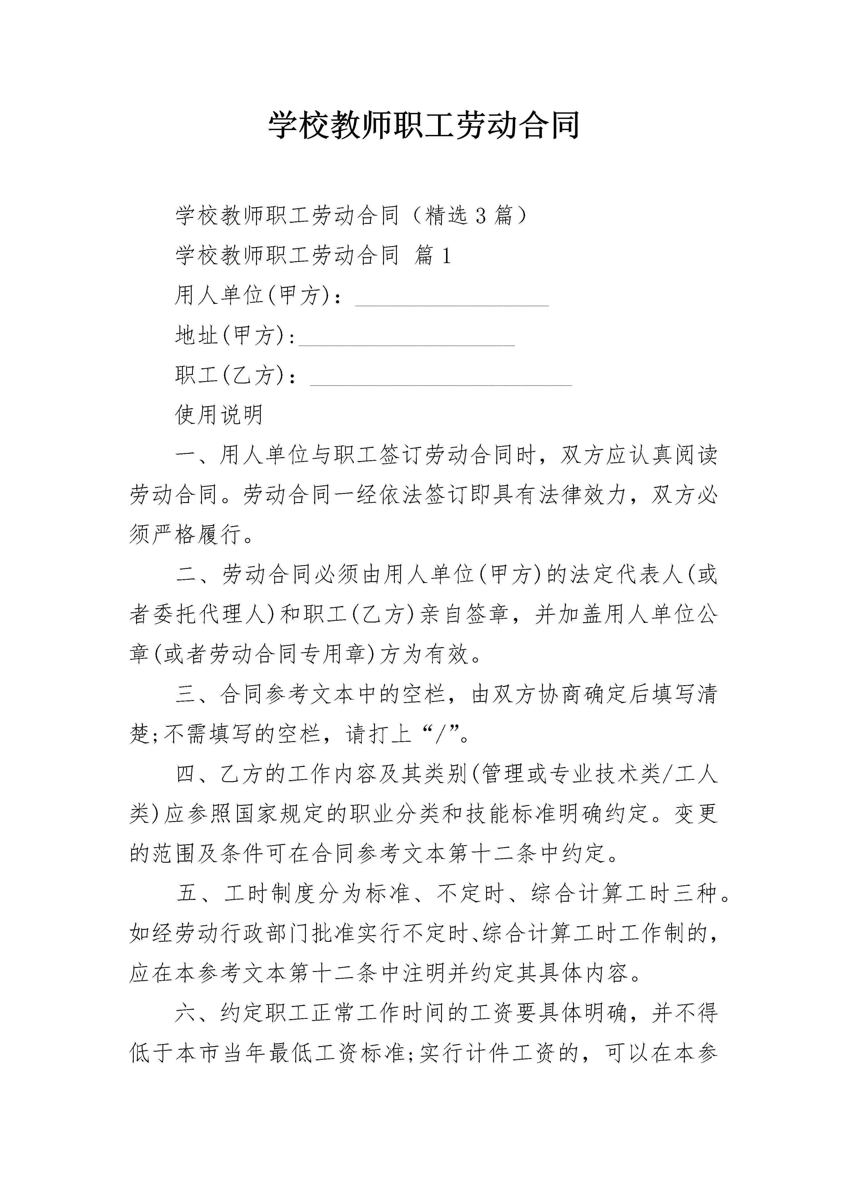 学校教师职工劳动合同学校教师职工劳动合同(精选3篇)学校教师职工劳动合同篇1用人单位(甲方):_________________地址(甲方):___________________职工(乙方):_______________________使用说明一、用人单位与职工签订劳动合同时,双方应认真阅读劳动合同。劳动合同一经依法签订即具有法律效力,双方必须严格履行。二、劳动合同必须由用人单位(甲方)的法定代表人(或者委托代理人)和职工(乙方)亲自签章,并加盖用人单位公章(或者劳动合同专用章)方为有效。三、合同参考文本中的空栏,由双方协商确定后填写清楚;不需填写的空栏,请打上“/”。四、乙方的工作内容及其类别(管理或专业技术类/工人类)应参照国家规定的职业分类和技能标准明确约定。变更的范围及条件可在合同参考文本第十二条中约定。五、工时制度分为标准、不定时、综合计算工时三种。如经劳动行政部门批准实行不定时、综合计算工时工作制的,应在本参考文本第十二条中注明并约定其具体内容。六、约定职工正常工作时间的工资要具体明确,并不得低于本市当年最低工资标准;实行计件工资的,可以在本参考文本第十二条中列明,或另签订补充协议。七、本单位工会或职工推举的代表与用人单位可依法就工资、工作时间、休息休假、劳动安全卫生、保险福利等事项集体协商,签订集体合同。职工个人与用人单位订立劳动合同的各项劳动标准,不得低于集体合同的约定。八、双方经协商一致后,对劳动合同参考文本条款的修改或未尽事宜的约定,可在参考文本第十二条中明确,或经协商一致另行签订补充协议;另行签订的补充协议,作为劳动合同的附件,与劳动合同一并履行。九、签订劳动合同时请使用钢笔或签字笔填写,字迹必须清楚,并不得单方涂改。十、本文本不适用非全日制用工使用。甲方(用人单位):乙方(职工):名称:姓名:法定代表人(主要负责人):身份证号码:户籍地址:经济类型:通讯地址:通讯地址:联系人:电话:联系电话:甲乙双方根据《中华人民共和国民法典》(以下简称《民法典》)和国家、省市的有关规定,遵循合法、公平、平等自愿,协商一致、诚实信用原则,订立本合同。一、合同期限(一)合同期限甲、乙双方同意按以下第种方式确定本合同期限:1、有固定期限:从年月日起至年月日止。2、无固定期限:从年月日起至法定的终止条件出现时止。3、以完成一定的工作为期限:从年月日起至工作任务完成时止,并以为标志。(二)限双方同意按以下第种方式确定试用期期限(试用期包括在合同期内):1、无试用期。2、试用期从年月日起至年月日止。(合同期限三个月以上不满一年的,试用期不得超过一个月;合同期限在一年以上不满三年的,试用期不得超过二个月;三年以上固定期限和无固定期限的合同,试用期不得超过六个月。以完成一定工作任务为期限的合同或合同期限不满三个月的,不得约定试用期。同一用人单位与同一劳动者只能约定一次试用期。)二、工作内容和工作地点(一)乙方的工作内容:。(二)乙方工作内容确定为(填“是”):管理和专业技术类/工人类。(三)甲方因生产经营需要调整乙方的工作内容,应协商一致,按变更本合同办理,双方签字或盖章确认的协议书或依法变更通知书作为本合同的附件。(四)乙方工作地点:。(五)除临时性工作或者短期学习培训外,如甲方需要乙方到本合同约定以外的地点或单位工作和学习培训,应按本合同第七条处理。三、工作时间和休息休假(一)甲、乙双方同意按以下第种方式确定乙方的工作时间:1、标准工时制,即每日工作小时,每周工作天,每周正常工作不超过40小时,并至少休息一天。2、不定时工作制,即经劳动行政部门审批,乙方所在岗位实行不定时工作制,每周至少休息一天。3、综合计算工时工作制,即经劳动行政部门审批,乙方所在岗位实行以(填“是”):年、半年、季或月为周期的综合计算工时工作制。(二)甲方因生产(工作)需要,经与工会和乙方协商后可以延长工作时间。除第四十二条规定的情形外,一般每日不得超过一小时,因特殊原因最长每日不得超过三小时,每月不得超过三十六小时。(三)甲方执行法定的及企业依法自行补充的有关工作、休息、休假制度,按规定给予乙方享受节日假、年休假、婚假、丧假、产假、看护假等带薪假期,并按本合同约定的正常工作时间工资及有关政策法规规定的计算方法支付工资。四、(一)乙方正常工作时间的工资标准(计算加班工资基数),按下列第种形式执行,并不得低于当地最低工资标准及本单位集体合同约定的标准。1、计时工资:元/月(元/周);2、计件工资:(70%以上职工在正常工作时间内可以完成的,本项约定方为成立);3、其他形式:。(二)乙方试用期工资为元/月(不得低于第(一)款约定工资的80%或单位同一岗位最低档工资,并不得低于本市最低工资标准)。(三)甲方依法安排乙方加班的,应按《劳动法》第四十四条的规定