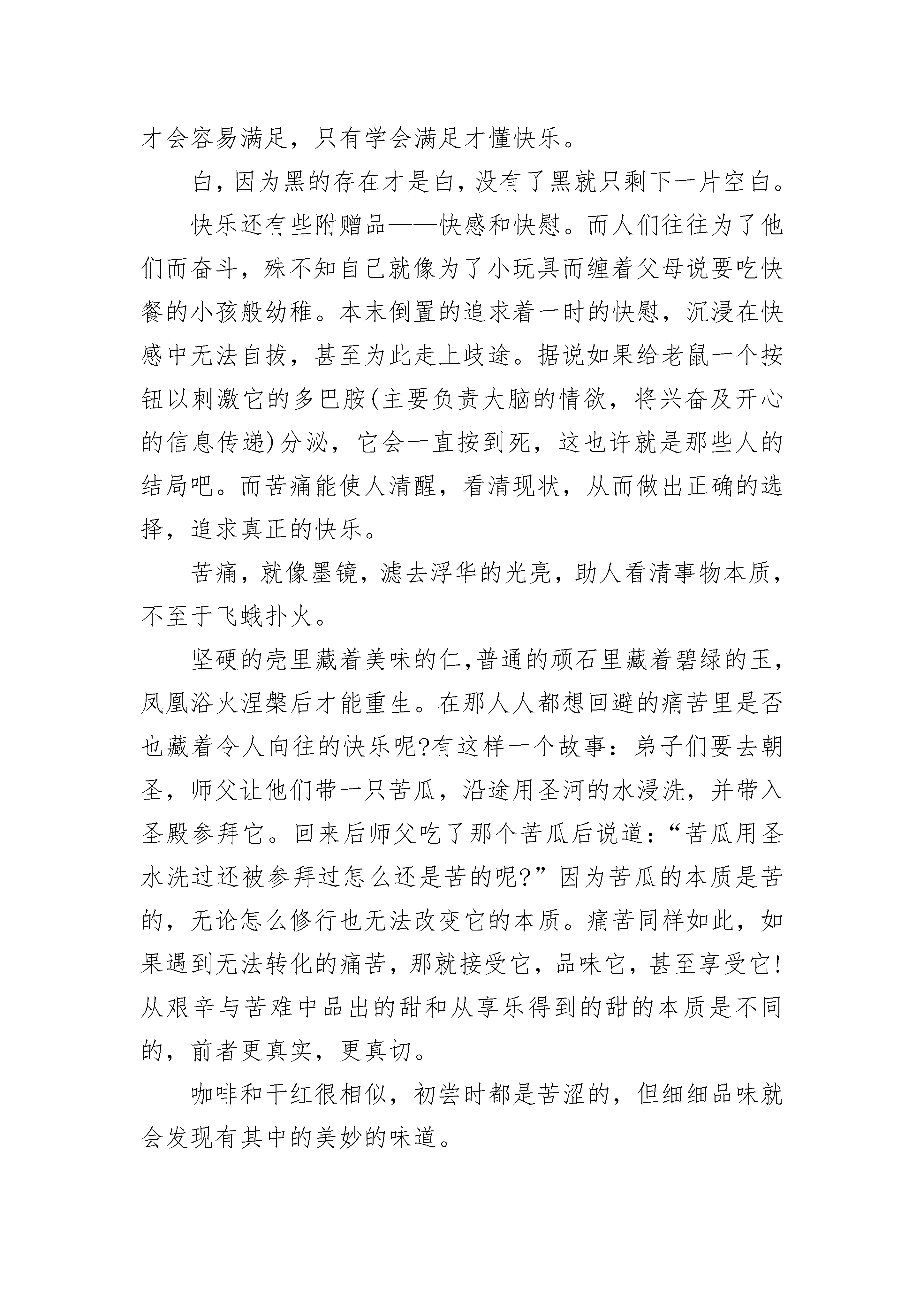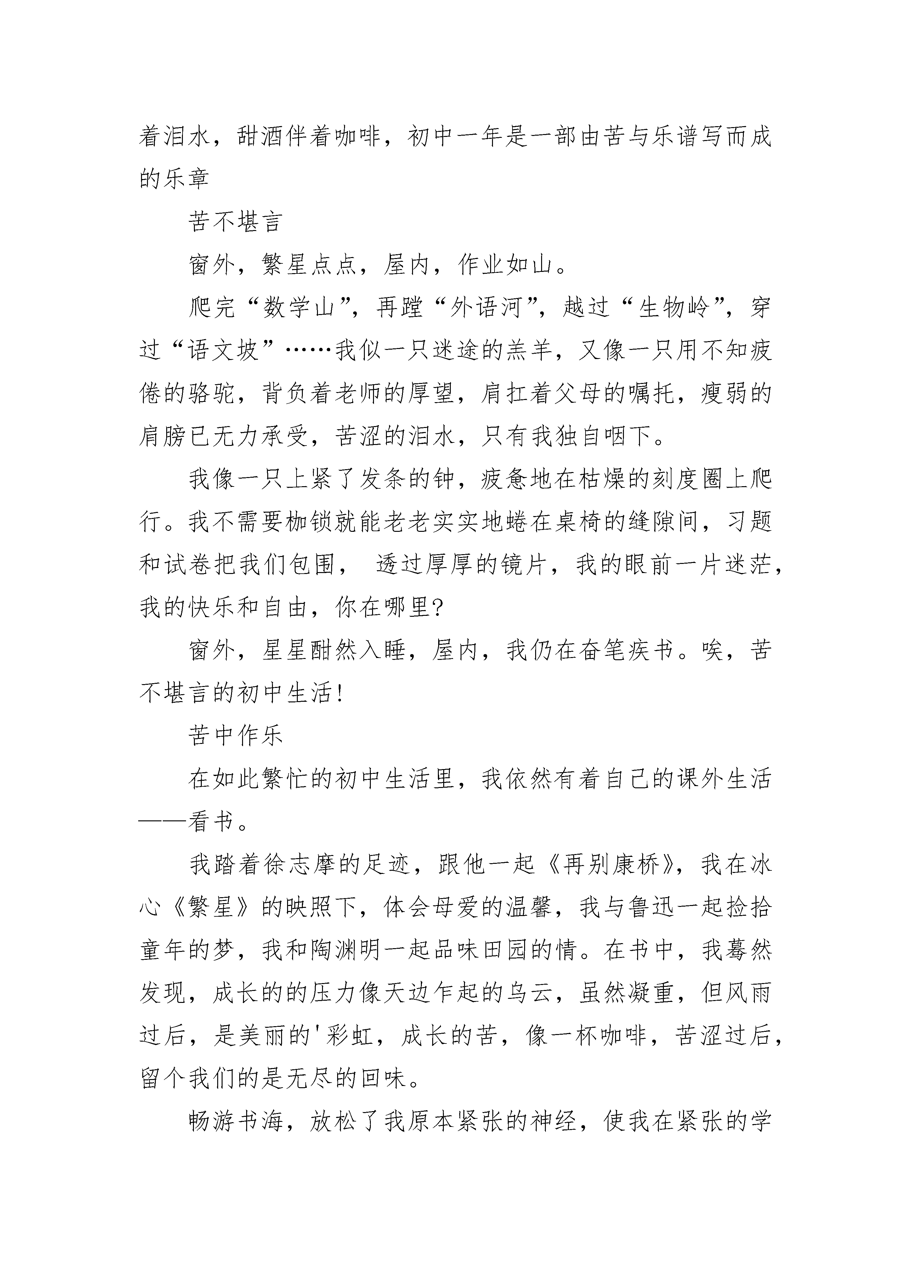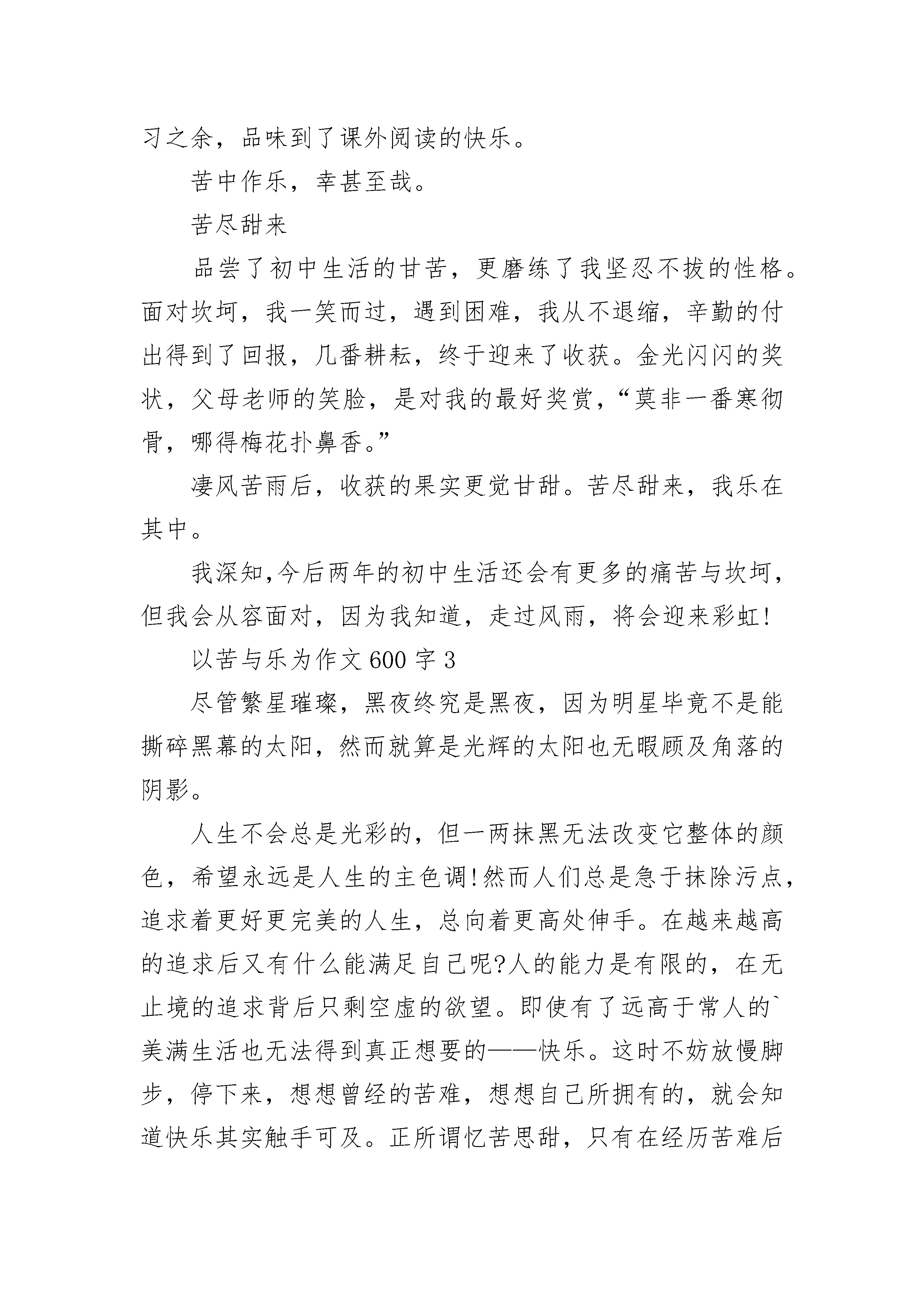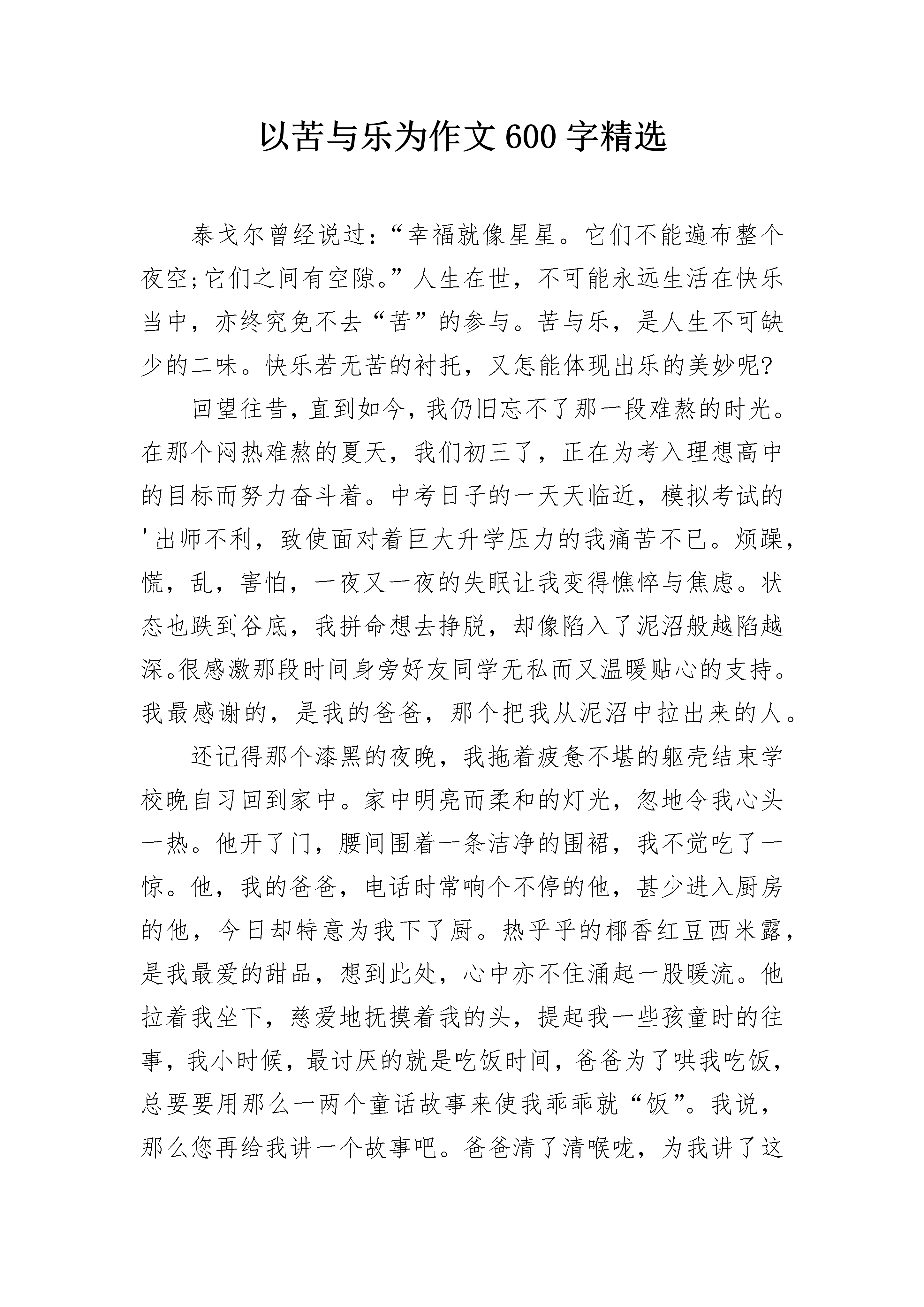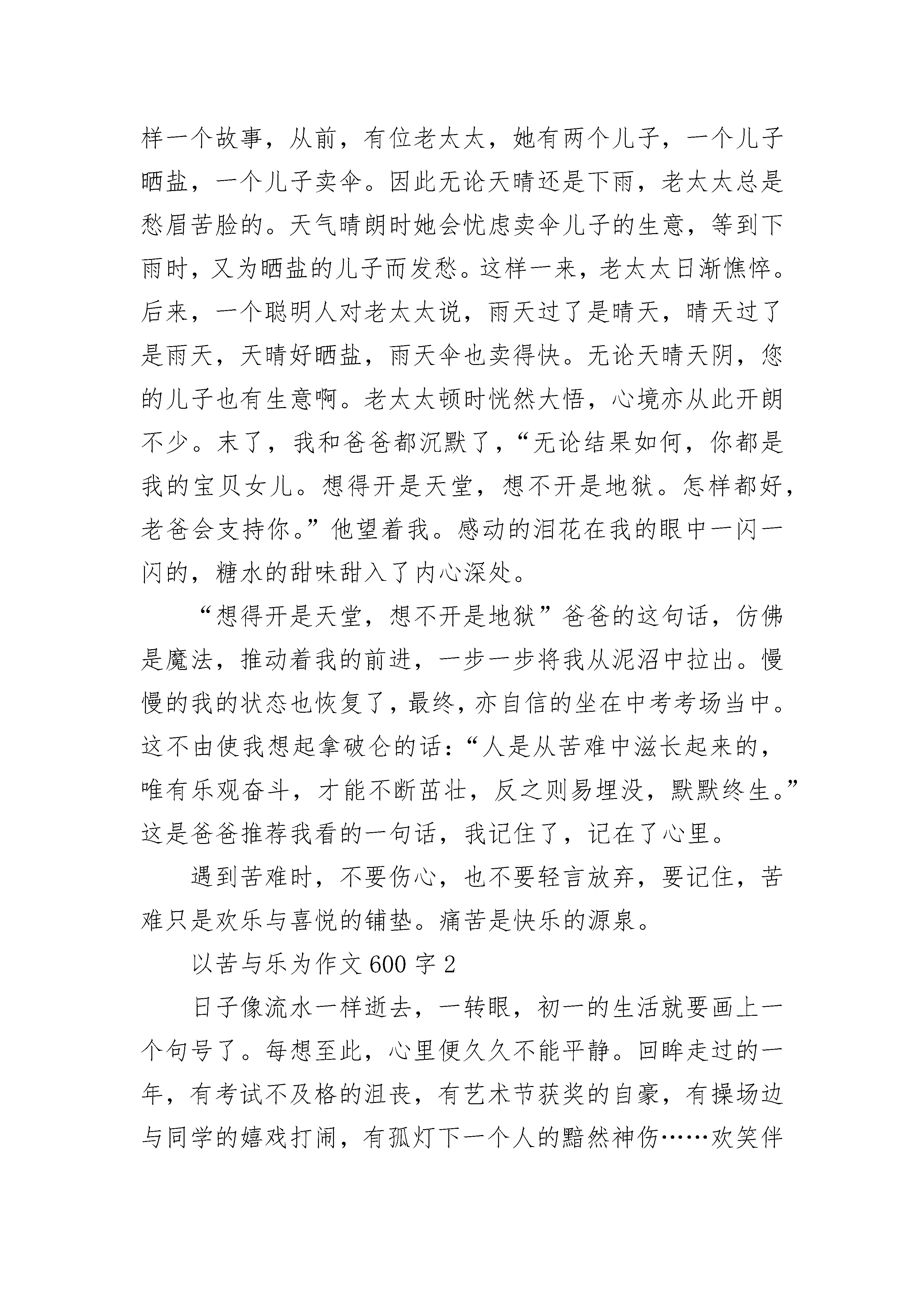 以苦与乐为作文600字精选泰戈尔曾经说过:“幸福就像星星。它们不能遍布整个夜空;它们之间有空隙。”人生在世,不可能永远生活在快乐当中,亦终究免不去“苦”的参与。苦与乐,是人生不可缺少的二味。快乐若无苦的衬托,又怎能体现出乐的美妙呢?回望往昔,直到如今,我仍旧忘不了那一段难熬的时光。在那个闷热难熬的夏天,我们初三了,正在为考入理想高中的目标而努力奋斗着。中考日子的一天天临近,模拟考试的'出师不利,致使面对着巨大升学压力的我痛苦不已。烦躁,慌,乱,害怕,一夜又一夜的失眠让我变得憔悴与焦虑。状态也跌到谷底,我拼命想去挣脱,却像陷入了泥沼般越陷越深。很感激那段时间身旁好友同学无私而又温暖贴心的支持。我最感谢的,是我的爸爸,那个把我从泥沼中拉出来的人。还记得那个漆黑的夜晚,我拖着疲惫不堪的躯壳结束学校晚自习回到家中。家中明亮而柔和的灯光,忽地令我心头一热。他开了门,腰间围着一条洁净的围裙,我不觉吃了一惊。他,我的爸爸,电话时常响个不停的他,甚少进入厨房的他,今日却特意为我下了厨。热乎乎的椰香红豆西米露,是我最爱的甜品,想到此处,心中亦不住涌起一股暖流。他拉着我坐下,慈爱地抚摸着我的头,提起我一些孩童时的往事,我小时候,最讨厌的就是吃饭时间,爸爸为了哄我吃饭,总要要用那么一两个童话故事来使我乖乖就“饭”。我说,那么您再给我讲一个故事吧。爸爸清了清喉咙,为我讲了这样一个故事,从前,有位老太太,她有两个儿子,一个儿子晒盐,一个儿子卖伞。因此无论天晴还是下雨,老太太总是愁眉苦脸的。天气晴朗时她会忧虑卖伞儿子的生意,等到下雨时,又为晒盐的儿子而发愁。这样一来,老太太日渐憔悴。后来,一个聪明人对老太太说,雨天过了是晴天,晴天过了是雨天,天晴好晒盐,雨天伞也卖得快。无论天晴天阴,您的儿子也有生意啊。老太太顿时恍然大悟,心境亦从此开朗不少。末了,我和爸爸都沉默了,“无论结果如何,你都是我的宝贝女儿。想得开是天堂,想不开是地狱。怎样都好,老爸会支持你。”他望着我。感动的泪花在我的眼中一闪一闪的,糖水的甜味甜入了内心深处。“想得开是天堂,想不开是地狱”爸爸的这句话,仿佛是魔法,推动着我的前进,一步一步将我从泥沼中拉出。慢慢的我的状态也恢复了,最终,亦自信的坐在中考考场当中。这不由使我想起拿破仑的话:“人是从苦难中滋长起来的,唯有乐观奋斗,才能不断茁壮,反之则易埋没,默默终生。”这是爸爸推荐我看的一句话,我记住了,记在了心里。遇到苦难时,不要伤心,也不要轻言放弃,要记住,苦难只是欢乐与喜悦的铺垫。痛苦是快乐的源泉。以苦与乐为作文600字2日子像流水一样逝去,一转眼,初一的生活就要画上一个句号了。每想至此,心里便久久不能平静。回眸走过的一年,有考试不及格的沮丧,有艺术节获奖的自豪,有操场边与同学的嬉戏打闹,有孤灯下一个人的黯然神伤……欢笑伴着泪水,甜酒伴着咖啡,初中一年是一部由苦与乐谱写而成的乐章苦不堪言窗外,繁星点点,屋内,作业如山。爬完“数学山”,再蹚“外语河”,越过“生物岭”,穿过“语文坡”……我似一只迷途的羔羊,又像一只用不知疲倦的骆驼,背负着老师的厚望,肩扛着父母的嘱托,瘦弱的肩膀已无力承受,苦涩的泪水,只有我独自咽下。我像一只上紧了发条的钟,疲惫地在枯燥的刻度圈上爬行。我不需要枷锁就能老老实实地蜷在桌椅的缝隙间,习题和试卷把我们包围,透过厚厚的镜片,我的眼前一片迷茫,我的快乐和自由,你在哪里?窗外,星星酣然入睡,屋内,我仍在奋笔疾书。唉,苦不堪言的初中生活!苦中作乐在如此繁忙的初中生活里,我依然有着自己的课外生活——看书。我踏着徐志摩的足迹,跟他一起《再别康桥》,我在冰心《繁星》的映照下,体会母爱的温馨,我与鲁迅一起捡拾童年的梦,我和陶渊明一起品味田园的情。在书中,我蓦然发现,成长的的压力像天边乍起的乌云,虽然凝重,但风雨过后,是美丽的'彩虹,成长的苦,像一杯咖啡,苦涩过后,留个我们的是无尽的回味。畅游书海,放松了我原本紧张的神经,使我在紧张的学习之余,品味到了课外阅读的快乐。苦中作乐,幸甚至哉。苦尽甜来品尝了初中生活的甘苦,更磨练了我坚忍不拔的性格。面对坎坷,我一笑而过,遇到困难,我从不退缩,辛勤的付出得到了回报,几番耕耘,终于迎来了收获。金光闪闪的奖状,父母老师的笑脸,是对我的最好奖赏,“莫非一番寒彻骨,哪得梅花扑鼻香。”凄风苦雨后,收获的果实更觉甘甜。苦尽甜来,我乐在其中。我深知,今后两年的初中生活还会有更多的痛苦与坎坷,但我会从容面对,因为我知道,走过风雨,将会迎来彩虹!以苦与乐为作文600字3尽管繁星璀璨,黑夜终究是黑夜,因为明星毕竟不是能撕碎黑幕的太阳,然而就算是光辉的太阳也无暇顾及角落的阴影。人生不会总是光彩的,但一两抹黑无法改变它整体的颜色,希望永远是人生的主色调!然而人们总是急于抹除污点,追求着更好更完美的人生,总向着更高处伸