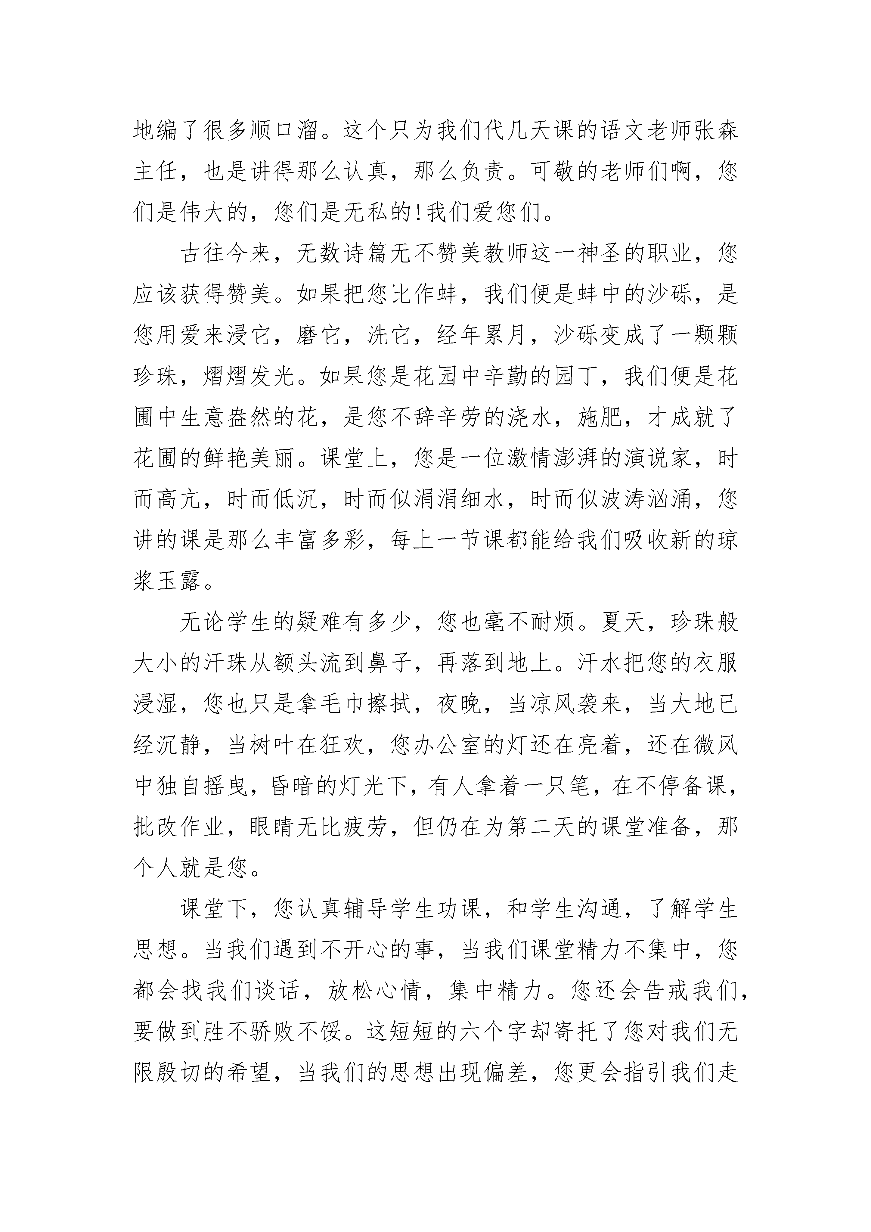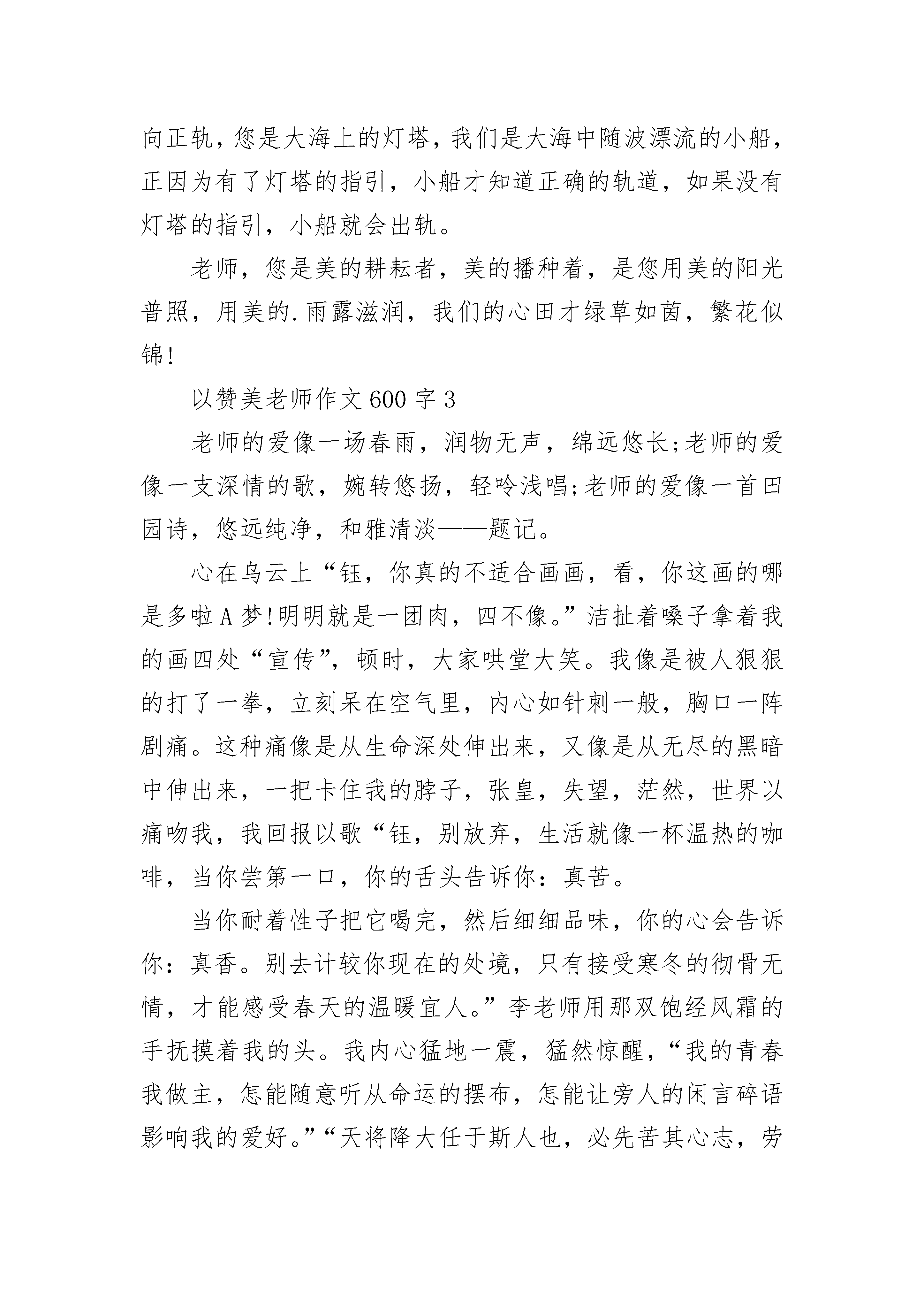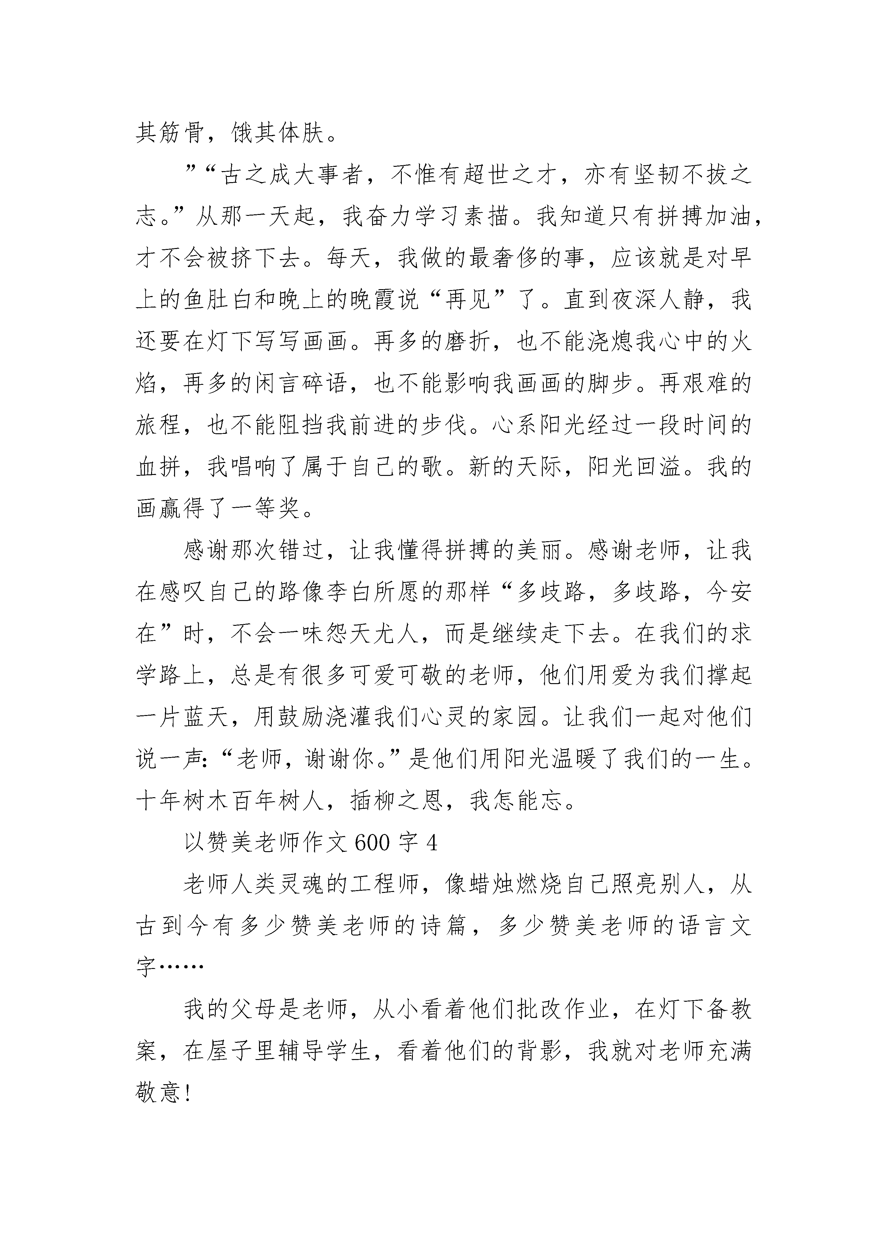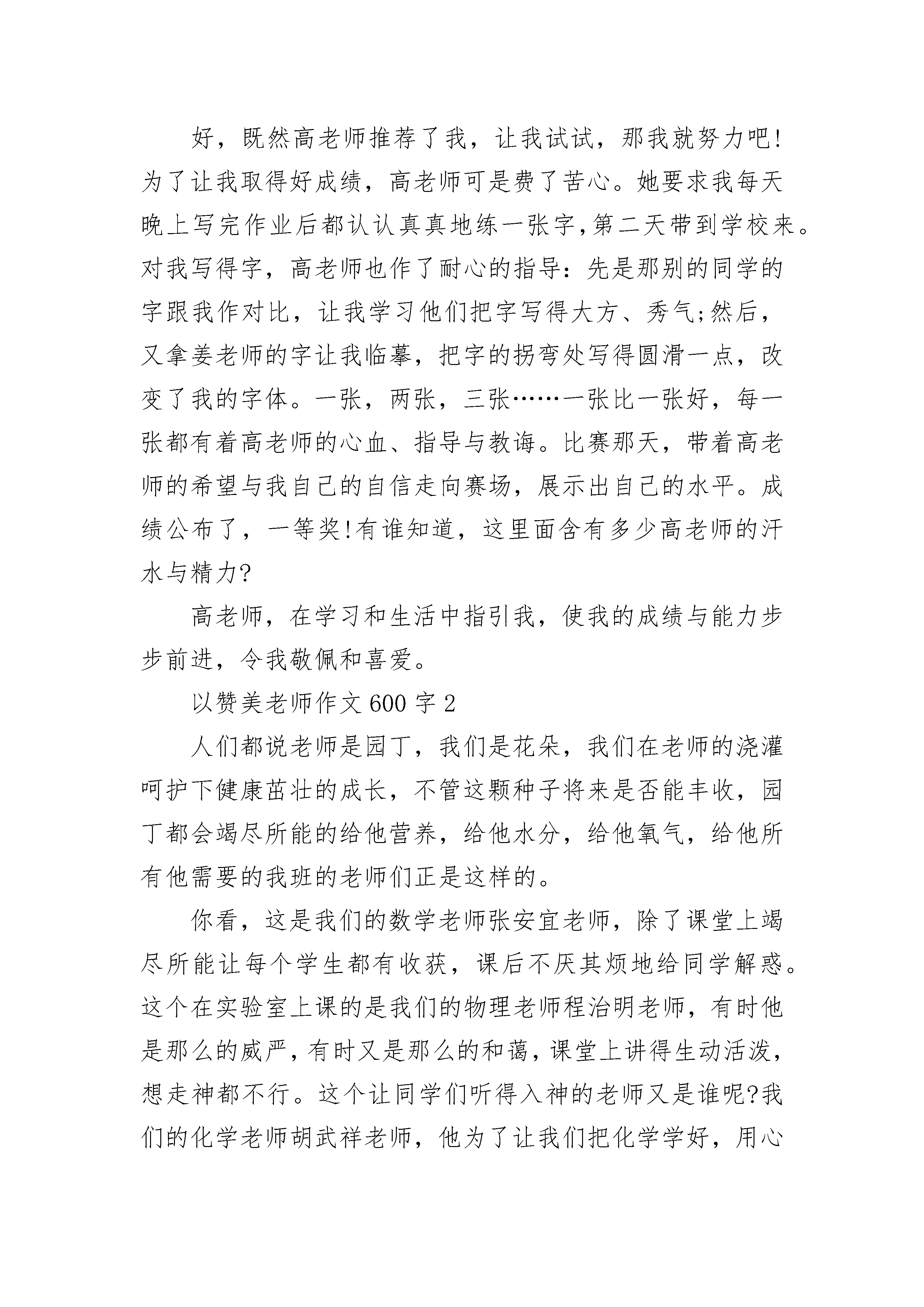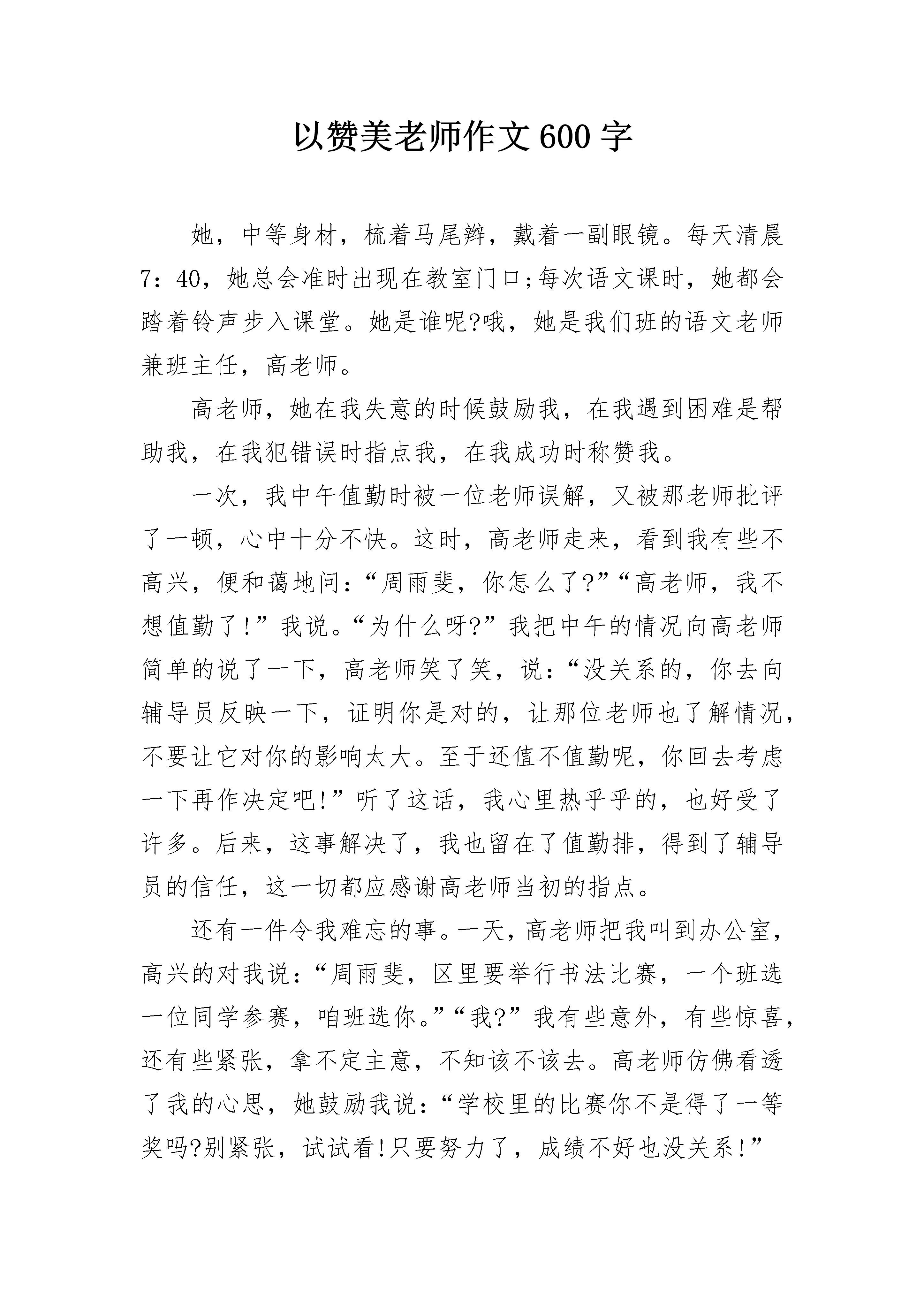 以赞美老师作文600字她,中等身材,梳着马尾辫,戴着一副眼镜。每天清晨7:40,她总会准时出现在教室门口;每次语文课时,她都会踏着铃声步入课堂。她是谁呢?哦,她是我们班的语文老师兼班主任,高老师。高老师,她在我失意的时候鼓励我,在我遇到困难是帮助我,在我犯错误时指点我,在我成功时称赞我。一次,我中午值勤时被一位老师误解,又被那老师批评了一顿,心中十分不快。这时,高老师走来,看到我有些不高兴,便和蔼地问:“周雨斐,你怎么了?”“高老师,我不想值勤了!”我说。“为什么呀?”我把中午的情况向高老师简单的说了一下,高老师笑了笑,说:“没关系的,你去向辅导员反映一下,证明你是对的,让那位老师也了解情况,不要让它对你的影响太大。至于还值不值勤呢,你回去考虑一下再作决定吧!”听了这话,我心里热乎乎的,也好受了许多。后来,这事解决了,我也留在了值勤排,得到了辅导员的信任,这一切都应感谢高老师当初的指点。还有一件令我难忘的事。一天,高老师把我叫到办公室,高兴的对我说:“周雨斐,区里要举行书法比赛,一个班选一位同学参赛,咱班选你。”“我?”我有些意外,有些惊喜,还有些紧张,拿不定主意,不知该不该去。高老师仿佛看透了我的心思,她鼓励我说:“学校里的比赛你不是得了一等奖吗?别紧张,试试看!只要努力了,成绩不好也没关系!”好,既然高老师推荐了我,让我试试,那我就努力吧!为了让我取得好成绩,高老师可是费了苦心。她要求我每天晚上写完作业后都认认真真地练一张字,第二天带到学校来。对我写得字,高老师也作了耐心的指导:先是那别的同学的字跟我作对比,让我学习他们把字写得大方、秀气;然后,又拿姜老师的字让我临摹,把字的拐弯处写得圆滑一点,改变了我的字体。一张,两张,三张……一张比一张好,每一张都有着高老师的心血、指导与教诲。比赛那天,带着高老师的希望与我自己的自信走向赛场,展示出自己的水平。成绩公布了,一等奖!有谁知道,这里面含有多少高老师的汗水与精力?高老师,在学习和生活中指引我,使我的成绩与能力步步前进,令我敬佩和喜爱。以赞美老师作文600字2人们都说老师是园丁,我们是花朵,我们在老师的浇灌呵护下健康茁壮的成长,不管这颗种子将来是否能丰收,园丁都会竭尽所能的给他营养,给他水分,给他氧气,给他所有他需要的我班的老师们正是这样的。你看,这是我们的数学老师张安宜老师,除了课堂上竭尽所能让每个学生都有收获,课后不厌其烦地给同学解惑。这个在实验室上课的是我们的物理老师程治明老师,有时他是那么的威严,有时又是那么的和蔼,课堂上讲得生动活泼,想走神都不行。这个让同学们听得入神的老师又是谁呢?我们的化学老师胡武祥老师,他为了让我们把化学学好,用心地编了很多顺口溜。这个只为我们代几天课的语文老师张森主任,也是讲得那么认真,那么负责。可敬的老师们啊,您们是伟大的,您们是无私的!我们爱您们。古往今来,无数诗篇无不赞美教师这一神圣的职业,您应该获得赞美。如果把您比作蚌,我们便是蚌中的沙砾,是您用爱来浸它,磨它,洗它,经年累月,沙砾变成了一颗颗珍珠,熠熠发光。如果您是花园中辛勤的园丁,我们便是花圃中生意盎然的花,是您不辞辛劳的浇水,施肥,才成就了花圃的鲜艳美丽。课堂上,您是一位激情澎湃的演说家,时而高亢,时而低沉,时而似涓涓细水,时而似波涛汹涌,您讲的课是那么丰富多彩,每上一节课都能给我们吸收新的琼浆玉露。无论学生的疑难有多少,您也毫不耐烦。夏天,珍珠般大小的汗珠从额头流到鼻子,再落到地上。汗水把您的衣服浸湿,您也只是拿毛巾擦拭,夜晚,当凉风袭来,当大地已经沉静,当树叶在狂欢,您办公室的灯还在亮着,还在微风中独自摇曳,昏暗的灯光下,有人拿着一只笔,在不停备课,批改作业,眼睛无比疲劳,但仍在为第二天的课堂准备,那个人就是您。课堂下,您认真辅导学生功课,和学生沟通,了解学生思想。当我们遇到不开心的事,当我们课堂精力不集中,您都会找我们谈话,放松心情,集中精力。您还会告戒我们,要做到胜不骄败不馁。这短短的六个字却寄托了您对我们无限殷切的希望,当我们的思想出现偏差,您更会指引我们走向正轨,您是大海上的灯塔,我们是大海中随波漂流的小船,正因为有了灯塔的指引,小船才知道正确的轨道,如果没有灯塔的指引,小船就会出轨。老师,您是美的耕耘者,美的播种着,是您用美的阳光普照,用美的.雨露滋润,我们的心田才绿草如茵,繁花似锦!以赞美老师作文600字3老师的爱像一场春雨,润物无声,绵远悠长;老师的爱像一支深情的歌,婉转悠扬,轻呤浅唱;老师的爱像一首田园诗,悠远纯净,和雅清淡——题记。心在乌云上“钰,你真的不适合画画,看,你这画的哪是多啦A梦!明明就是一团肉,四不像。”洁扯着嗓子拿着我的画四处“宣传”,顿时,大家哄堂大笑。我像是被人狠狠的打了一拳,立刻呆在空气里,内心如针刺一般,胸口一阵剧痛。这种痛像是从生命