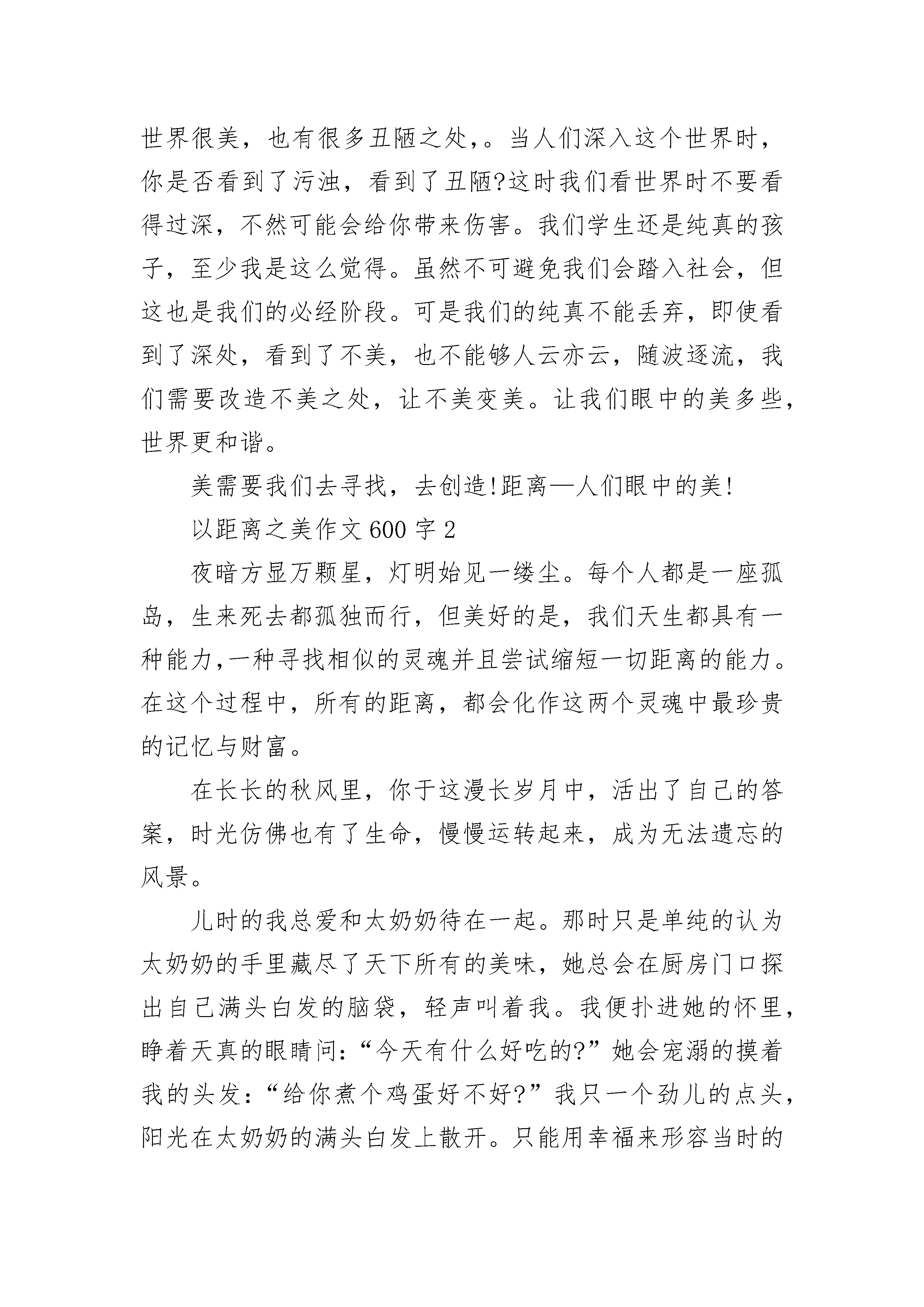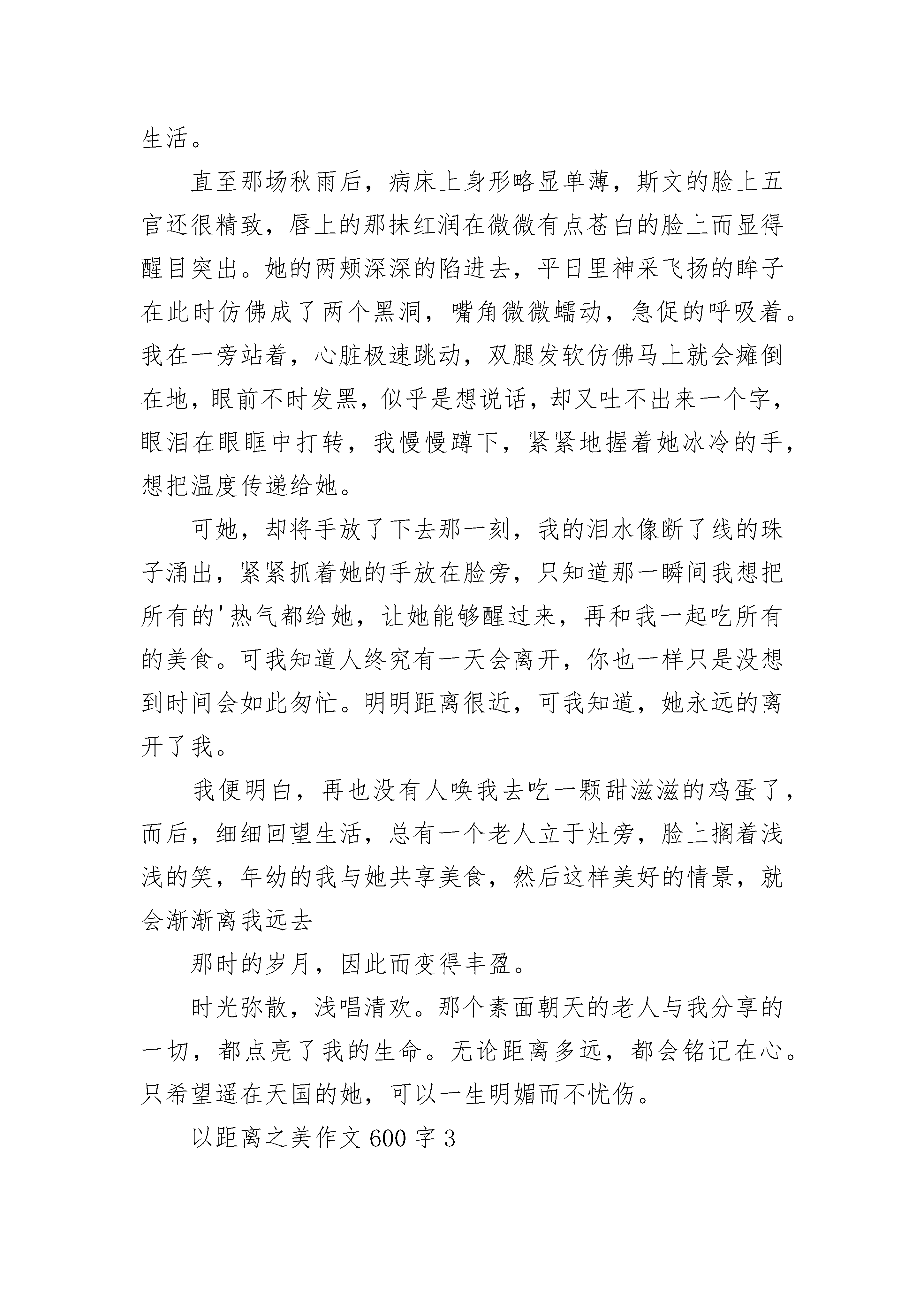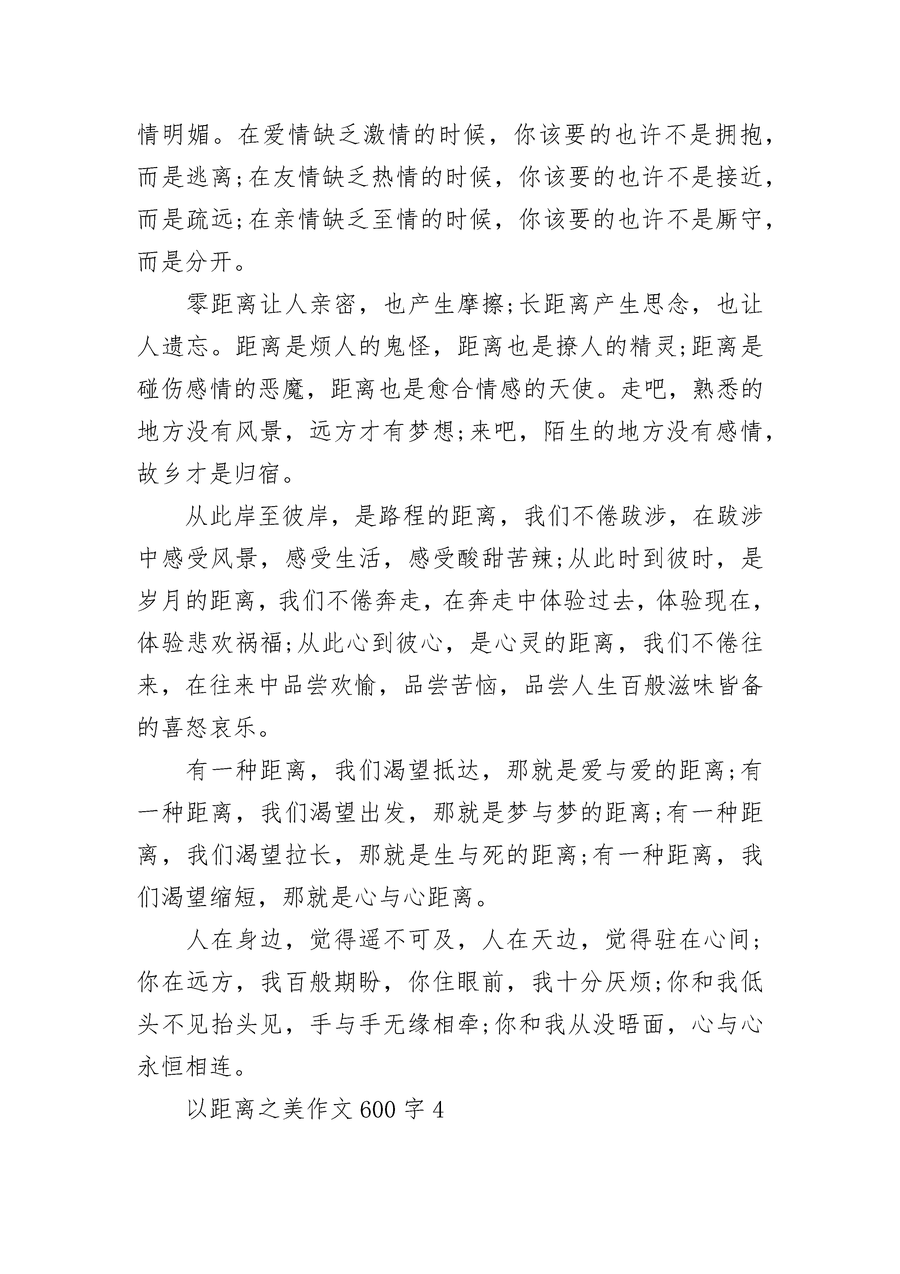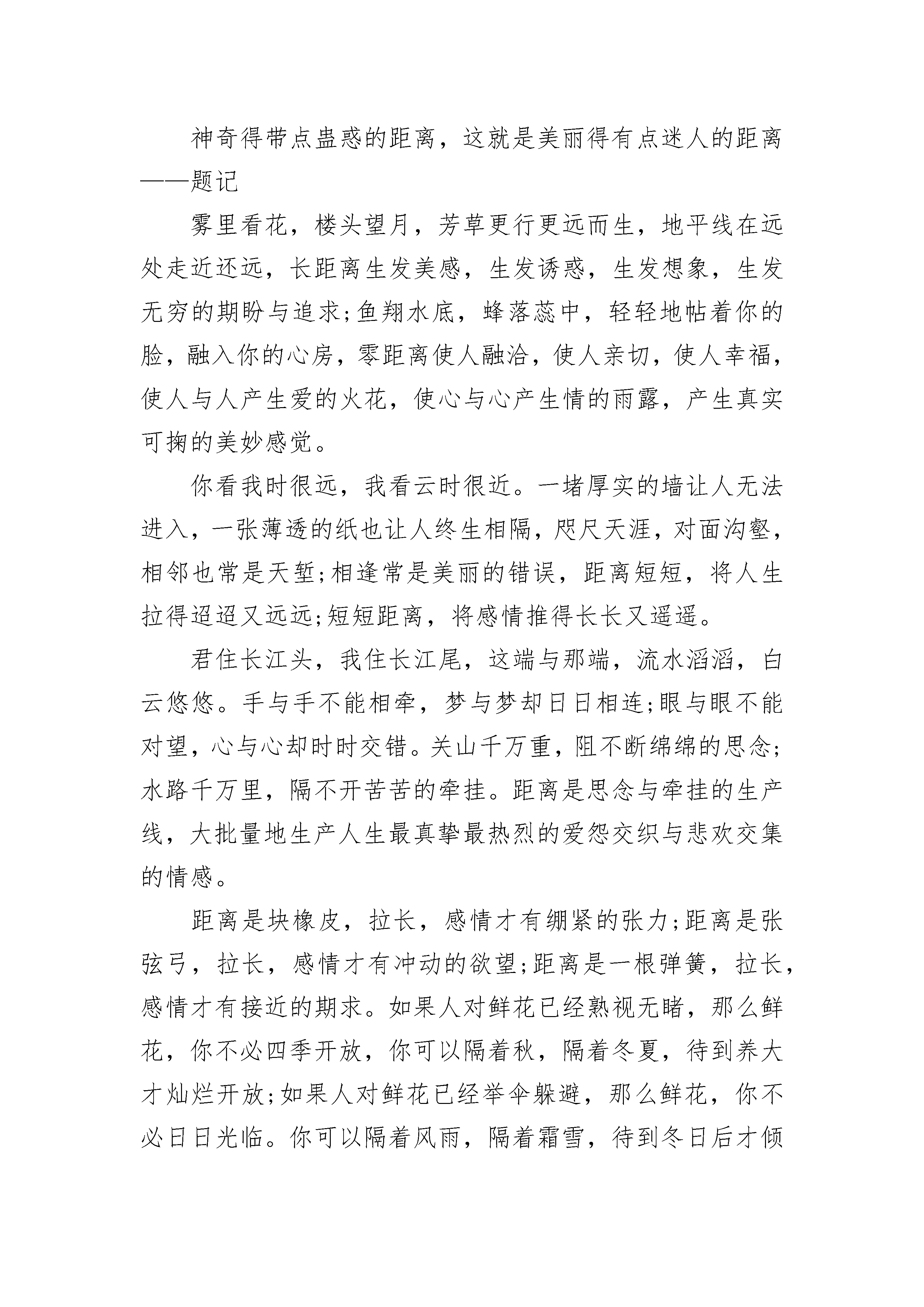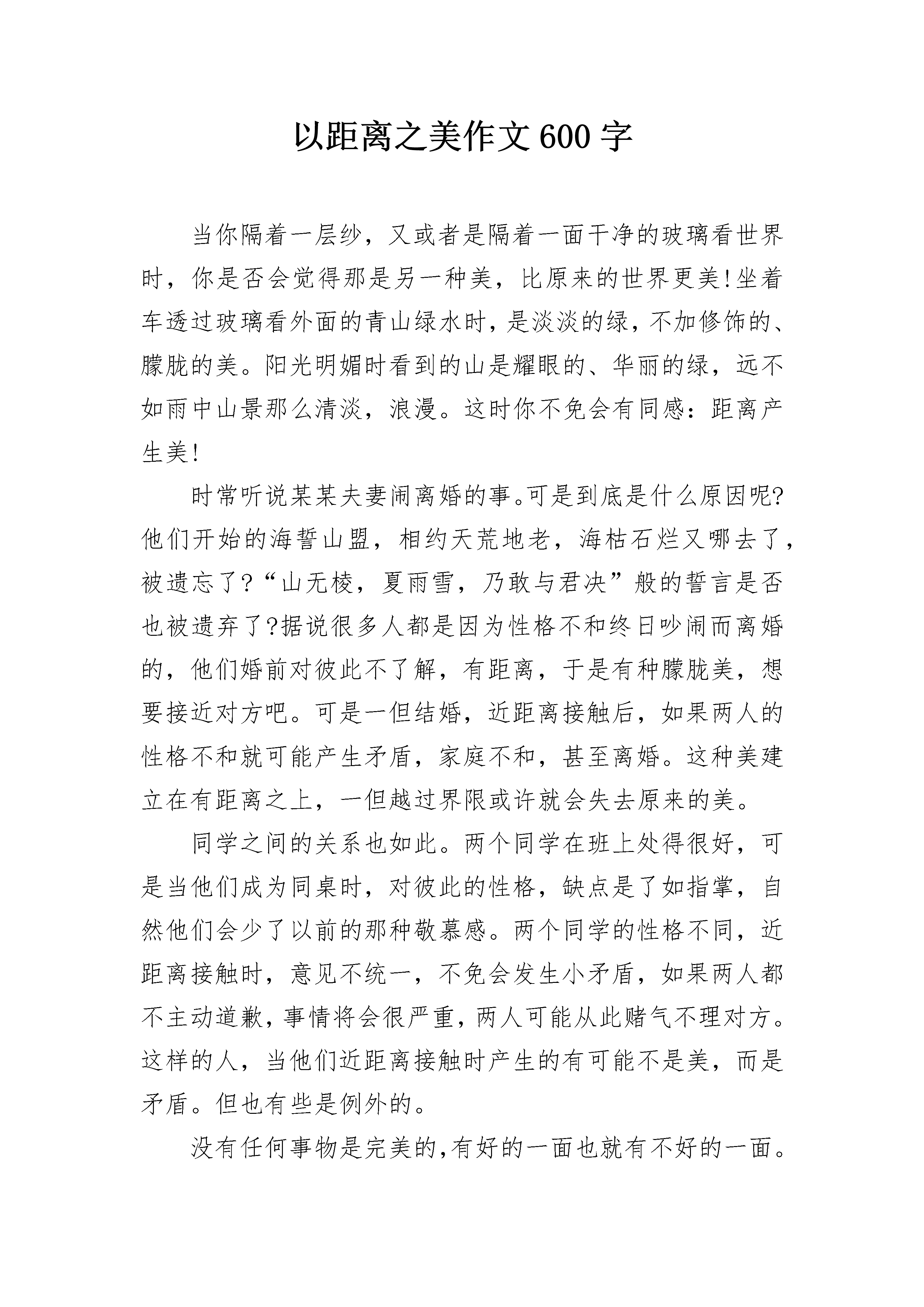 以距离之美作文600字当你隔着一层纱,又或者是隔着一面干净的玻璃看世界时,你是否会觉得那是另一种美,比原来的世界更美!坐着车透过玻璃看外面的青山绿水时,是淡淡的绿,不加修饰的、朦胧的美。阳光明媚时看到的山是耀眼的、华丽的绿,远不如雨中山景那么清淡,浪漫。这时你不免会有同感:距离产生美!时常听说某某夫妻闹离婚的事。可是到底是什么原因呢?他们开始的海誓山盟,相约天荒地老,海枯石烂又哪去了,被遗忘了?“山无棱,夏雨雪,乃敢与君决”般的誓言是否也被遗弃了?据说很多人都是因为性格不和终日吵闹而离婚的,他们婚前对彼此不了解,有距离,于是有种朦胧美,想要接近对方吧。可是一但结婚,近距离接触后,如果两人的性格不和就可能产生矛盾,家庭不和,甚至离婚。这种美建立在有距离之上,一但越过界限或许就会失去原来的美。同学之间的关系也如此。两个同学在班上处得很好,可是当他们成为同桌时,对彼此的性格,缺点是了如指掌,自然他们会少了以前的那种敬慕感。两个同学的性格不同,近距离接触时,意见不统一,不免会发生小矛盾,如果两人都不主动道歉,事情将会很严重,两人可能从此赌气不理对方。这样的人,当他们近距离接触时产生的有可能不是美,而是矛盾。但也有些是例外的。没有任何事物是完美的,有好的一面也就有不好的一面。世界很美,也有很多丑陋之处,。当人们深入这个世界时,你是否看到了污浊,看到了丑陋?这时我们看世界时不要看得过深,不然可能会给你带来伤害。我们学生还是纯真的孩子,至少我是这么觉得。虽然不可避免我们会踏入社会,但这也是我们的必经阶段。可是我们的纯真不能丢弃,即使看到了深处,看到了不美,也不能够人云亦云,随波逐流,我们需要改造不美之处,让不美变美。让我们眼中的美多些,世界更和谐。美需要我们去寻找,去创造!距离—人们眼中的美!以距离之美作文600字2夜暗方显万颗星,灯明始见一缕尘。每个人都是一座孤岛,生来死去都孤独而行,但美好的是,我们天生都具有一种能力,一种寻找相似的灵魂并且尝试缩短一切距离的能力。在这个过程中,所有的距离,都会化作这两个灵魂中最珍贵的记忆与财富。在长长的秋风里,你于这漫长岁月中,活出了自己的答案,时光仿佛也有了生命,慢慢运转起来,成为无法遗忘的风景。儿时的我总爱和太奶奶待在一起。那时只是单纯的认为太奶奶的手里藏尽了天下所有的美味,她总会在厨房门口探出自己满头白发的脑袋,轻声叫着我。我便扑进她的怀里,睁着天真的眼睛问:“今天有什么好吃的?”她会宠溺的摸着我的头发:“给你煮个鸡蛋好不好?”我只一个劲儿的点头,阳光在太奶奶的满头白发上散开。只能用幸福来形容当时的生活。直至那场秋雨后,病床上身形略显单薄,斯文的脸上五官还很精致,唇上的那抹红润在微微有点苍白的脸上而显得醒目突出。她的两颊深深的陷进去,平日里神采飞扬的眸子在此时仿佛成了两个黑洞,嘴角微微蠕动,急促的呼吸着。我在一旁站着,心脏极速跳动,双腿发软仿佛马上就会瘫倒在地,眼前不时发黑,似乎是想说话,却又吐不出来一个字,眼泪在眼眶中打转,我慢慢蹲下,紧紧地握着她冰冷的手,想把温度传递给她。可她,却将手放了下去那一刻,我的泪水像断了线的珠子涌出,紧紧抓着她的手放在脸旁,只知道那一瞬间我想把所有的'热气都给她,让她能够醒过来,再和我一起吃所有的美食。可我知道人终究有一天会离开,你也一样只是没想到时间会如此匆忙。明明距离很近,可我知道,她永远的离开了我。我便明白,再也没有人唤我去吃一颗甜滋滋的鸡蛋了,而后,细细回望生活,总有一个老人立于灶旁,脸上搁着浅浅的笑,年幼的我与她共享美食,然后这样美好的情景,就会渐渐离我远去那时的岁月,因此而变得丰盈。时光弥散,浅唱清欢。那个素面朝天的老人与我分享的一切,都点亮了我的生命。无论距离多远,都会铭记在心。只希望遥在天国的她,可以一生明媚而不忧伤。以距离之美作文600字3神奇得带点蛊惑的距离,这就是美丽得有点迷人的距离——题记雾里看花,楼头望月,芳草更行更远而生,地平线在远处走近还远,长距离生发美感,生发诱惑,生发想象,生发无穷的期盼与追求;鱼翔水底,蜂落蕊中,轻轻地帖着你的脸,融入你的心房,零距离使人融洽,使人亲切,使人幸福,使人与人产生爱的火花,使心与心产生情的雨露,产生真实可掬的美妙感觉。你看我时很远,我看云时很近。一堵厚实的墙让人无法进入,一张薄透的纸也让人终生相隔,咫尺天涯,对面沟壑,相邻也常是天堑;相逢常是美丽的错误,距离短短,将人生拉得迢迢又远远;短短距离,将感情推得长长又遥遥。君住长江头,我住长江尾,这端与那端,流水滔滔,白云悠悠。手与手不能相牵,梦与梦却日日相连;眼与眼不能对望,心与心却时时交错。关山千万重,阻不断绵绵的思念;水路千万里,隔不开苦苦的牵挂。距离是思念与牵挂的生产线,大批量地生产人生最真挚最热烈的爱怨交织与悲欢交集的情感。距离是块橡皮,拉长,感