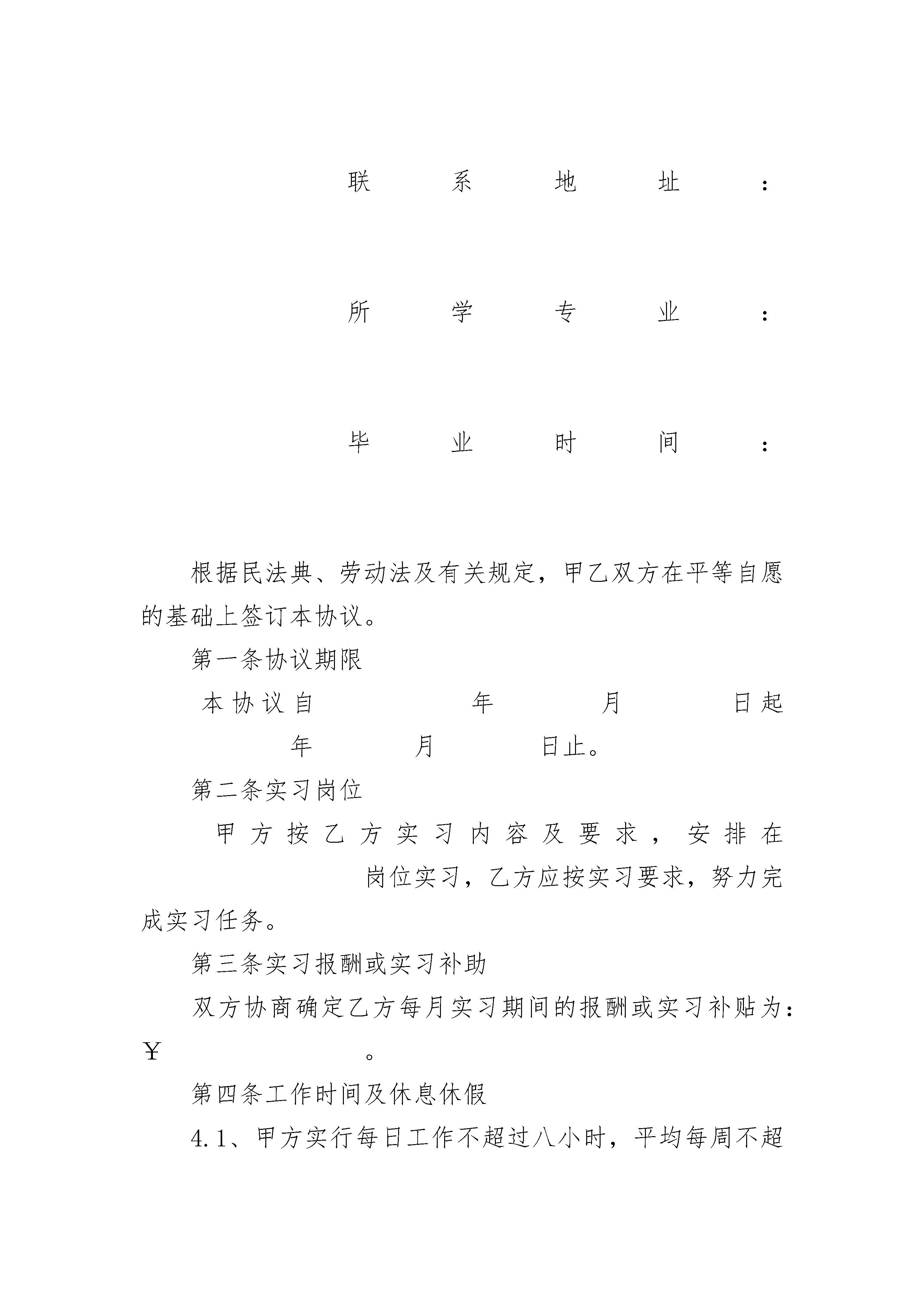 实习生劳动协议书实习生劳动协议书(精选22篇)实习生劳动协议书篇1实习生劳动协议书甲方(实习单位):单位名称:住所地:乙方(实习生)姓名:性别:民族:年龄:身份证号码:户籍所在地:联系地址:所学专业:毕业时间:根据民法典、劳动法及有关规定,甲乙双方在平等自愿的基础上签订本协议。第一条协议期限本协议自年月日起年月日止。第二条实习岗位甲方按乙方实习内容及要求,安排在岗位实习,乙方应按实习要求,努力完成实习任务。第三条实习报酬或实习补助双方协商确定乙方每月实习期间的报酬或实习补贴为:¥。第四条工作时间及休息休假4.1、甲方实行每日工作不超过八小时,平均每周不超过四十小时的工作时间,非标准工时岗位的工作时间按岗位要求。4.2、甲方保证乙方按国家和本市有关规定享受各种休息、休假。第五条保险福利待遇5.1、乙方在实习中发生人身伤害,根据劳动法应由甲方负责的,由甲方负责。第六条劳动保护和劳动条件6.1、在实习期间甲方应根据国家及本市有关规定为乙方提供劳动安全卫生的实习条件,为乙方配备必须的劳动防护用品。6.2、甲方应对乙方进行安全教育和岗位技能培训,实习学生不得从事特种作业。6.3、甲方不得安排18周岁以下的学生从事矿山井下、有毒、有害国家规定的第四级体力劳动强度和其他禁忌从事的工作。6.4、甲方不得安排女实习生在经期从事高温、低温、冷水作业和国家规定的第三级体力劳动强度的工作。6.5、乙方在实习工作过程中应严格遵守劳动安全卫生规程和操作规程,有权拒绝违章指挥,对甲方及其管理人员漠视人身安全和健康的行为有权拒绝执行、检举或控告。第七条劳动纪律7.1、甲方有权按照国家及本市的有关规定及企业的规章制度对乙方实行管理。7.2、乙方应遵守甲方依法制定的各项规章制度和劳动纪律,保守甲方的商业秘密。第八条本协议的解除、变更、终止8.1、经甲乙双方协商同意,本协议可以变更或解除;8.2、双方均可单方解除本协议,但须提前1个月书面告知对方。8.3、本协议到期即终止。第九条违反本协议的责任及双方约定的其他事项:。第十条甲乙双方履行本协议发生争议先经企业调解委员会或实习学生所在学校进行调解,调解未成按国家法律规定解决。第十一条本协议自双方签字盖章之日起生效。甲方(盖章):法定代表人或委托代理人(签字或盖章):年月日乙方(签字):年月日实习生劳动协议书篇2甲方(实习单位)乙方(实习生)单位名称姓名经济类型身份证号码法定代表人户籍住址地址通讯地址邮政编码邮政编码乙方为学校学生,在学校推荐或乙方自主申请的前提下,甲方同意并接收乙方到本单位实习。为确保双方在实习期间的权利和义务,经甲乙双方协商,达成本实习协议,有关约定如下:第一条协议期限和工作时间:1、经双方协商一致,本协议期限:自年月日至年月日。2、乙方实习期间的出勤考核及休假,参照甲方规章制度执行;乙方休假期间,甲方不承担对乙方的教育和管理义务。第二条实习内容及实习地点1、甲方在实习期间,根据乙方的个人情况及自身的管理需要,负责乙方的工作安排、劳动安全、劳动纪律教育、考勤记录和必要的技术指导工作。2、甲方安排乙方的实习地点:。第三条实习期待遇:1、甲方依其规章制度对乙方的实习进行考核评价,乙方按照实习计划或甲方规定完成实习内容的,甲方给予乙方实习补贴,补贴标准为X元/工作日,补贴发放在实习结束时发放。2、乙方实习期间因从事实习范围内的工作发生的正常费用,经甲方认可后,可凭票据实报销。3、在实习期间,乙方不享受甲方员工依据《劳动合同》和甲方规章制度所享受的福利待遇。考虑到实习生的实际经济状况,解决实习生的生活困难,甲方根