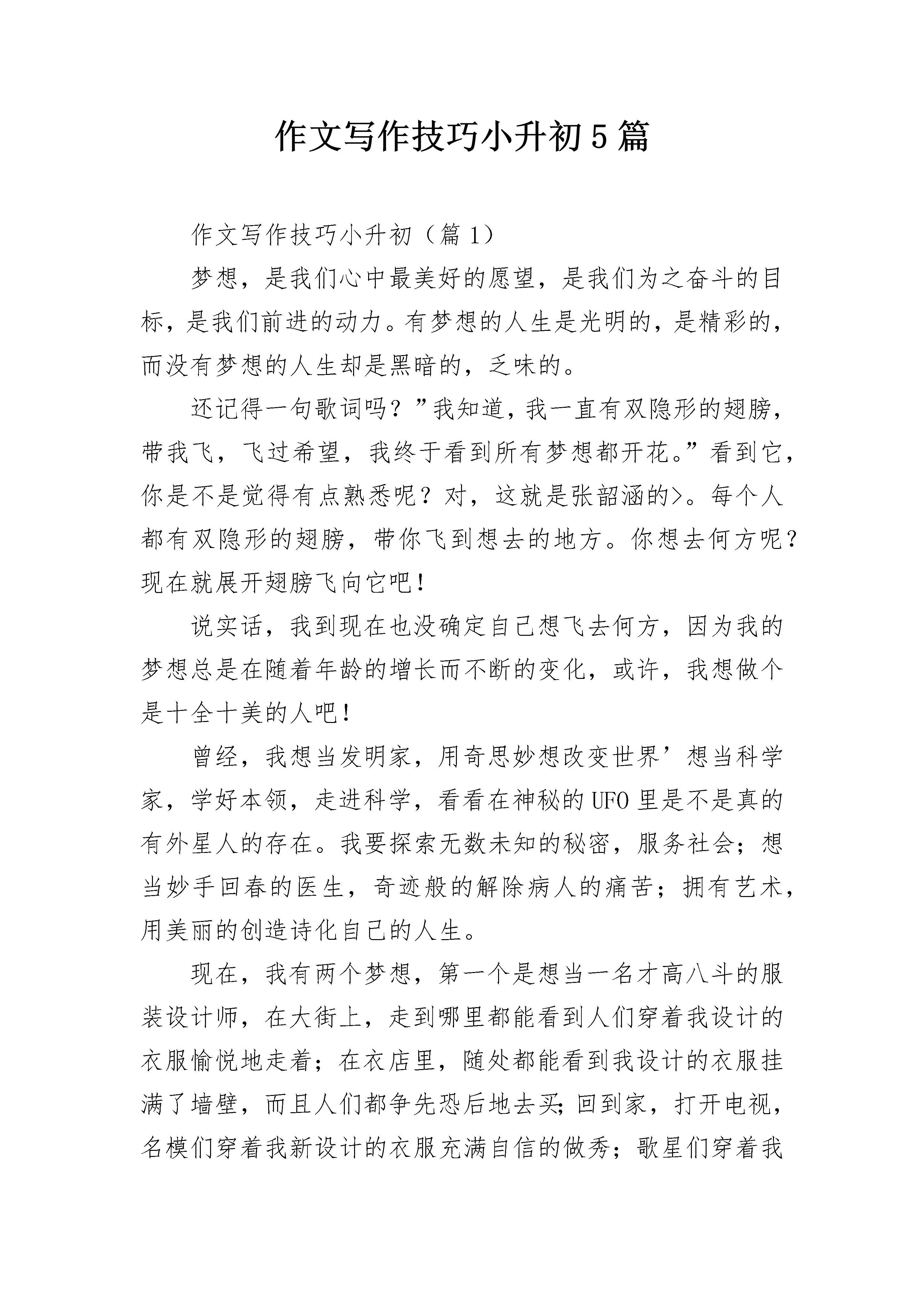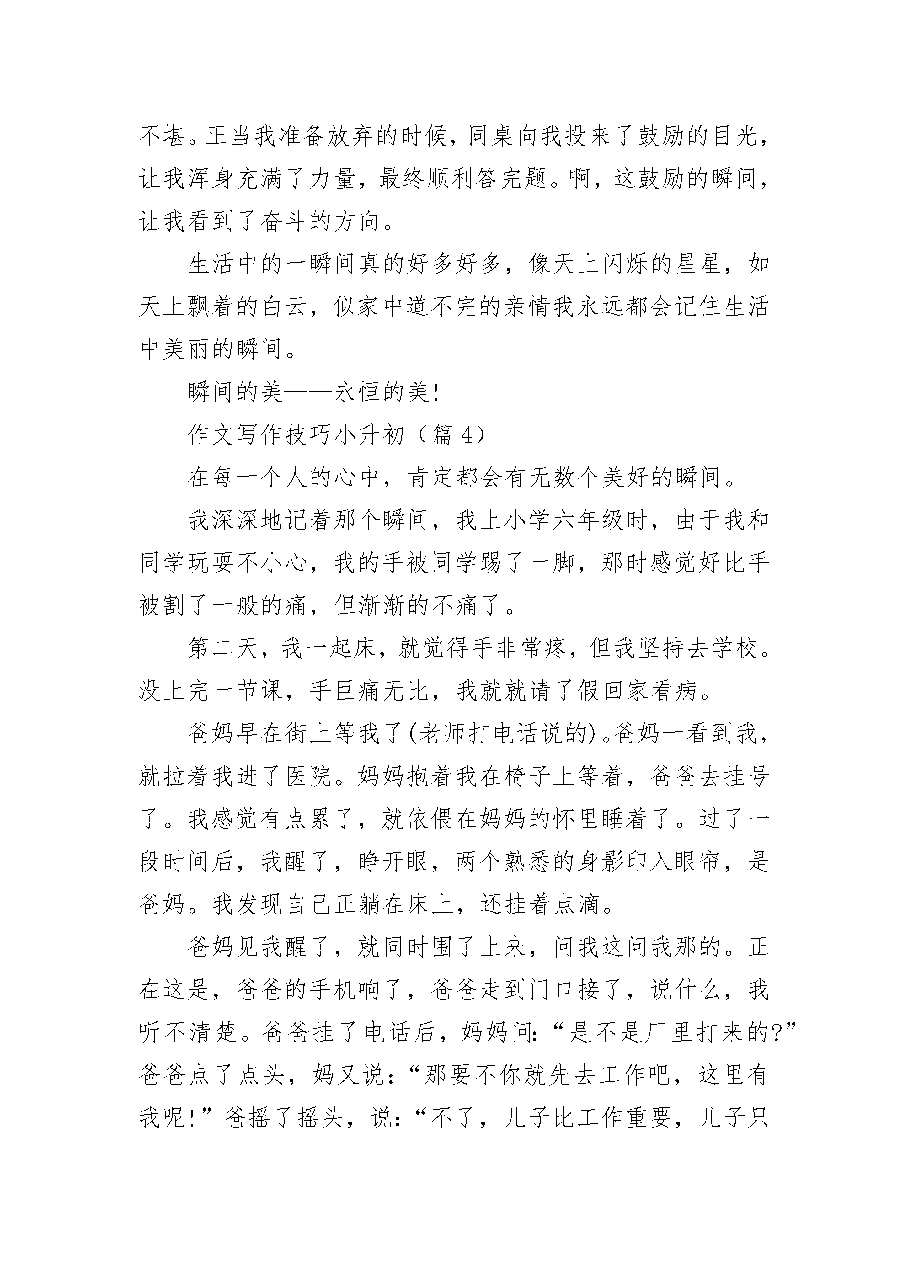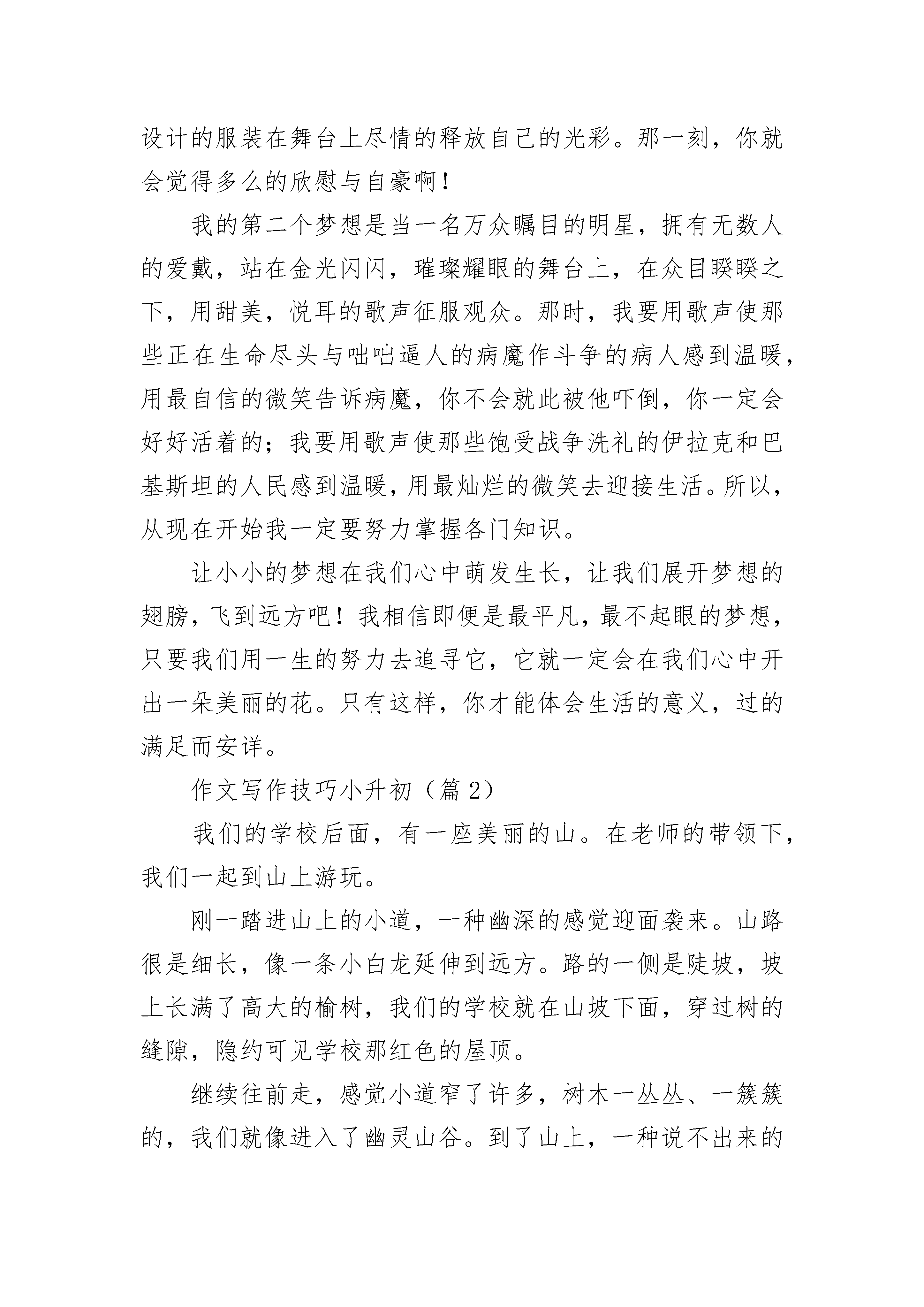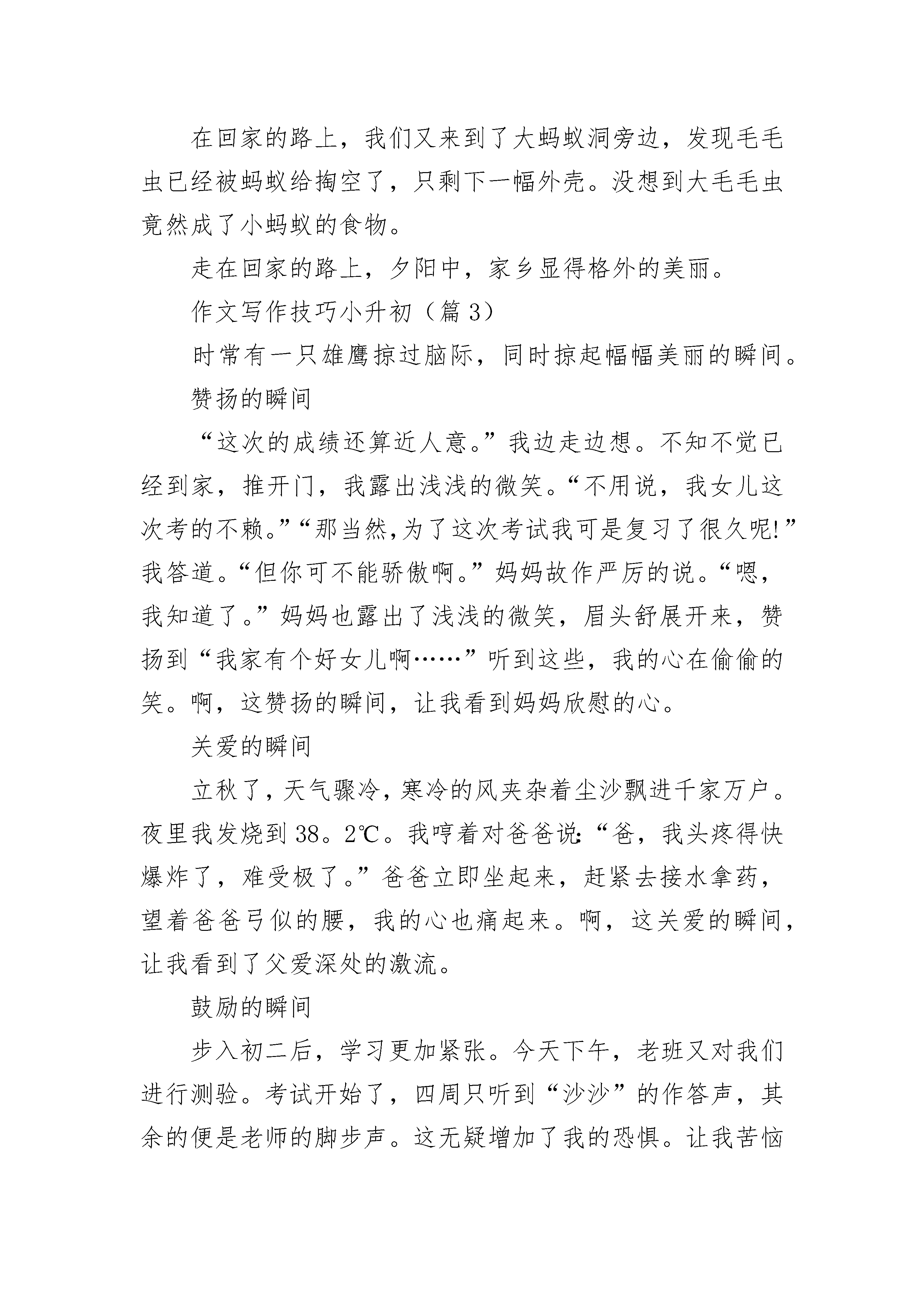 作文写作技巧小升初5篇作文写作技巧小升初(篇1)梦想,是我们心中最美好的愿望,是我们为之奋斗的目标,是我们前进的动力。有梦想的人生是光明的,是精彩的,而没有梦想的人生却是黑暗的,乏味的。还记得一句歌词吗?”我知道,我一直有双隐形的翅膀,带我飞,飞过希望,我终于看到所有梦想都开花。”看到它,你是不是觉得有点熟悉呢?对,这就是张韶涵的>。每个人都有双隐形的翅膀,带你飞到想去的地方。你想去何方呢?现在就展开翅膀飞向它吧!说实话,我到现在也没确定自己想飞去何方,因为我的梦想总是在随着年龄的增长而不断的变化,或许,我想做个是十全十美的人吧!曾经,我想当发明家,用奇思妙想改变世界’想当科学家,学好本领,走进科学,看看在神秘的UFO里是不是真的有外星人的存在。我要探索无数未知的秘密,服务社会;想当妙手回春的医生,奇迹般的解除病人的痛苦;拥有艺术,用美丽的创造诗化自己的人生。现在,我有两个梦想,第一个是想当一名才高八斗的服装设计师,在大街上,走到哪里都能看到人们穿着我设计的衣服愉悦地走着;在衣店里,随处都能看到我设计的衣服挂满了墙壁,而且人们都争先恐后地去买;回到家,打开电视,名模们穿着我新设计的衣服充满自信的做秀;歌星们穿着我设计的服装在舞台上尽情的释放自己的光彩。那一刻,你就会觉得多么的欣慰与自豪啊!我的第二个梦想是当一名万众瞩目的明星,拥有无数人的爱戴,站在金光闪闪,璀璨耀眼的舞台上,在众目睽睽之下,用甜美,悦耳的歌声征服观众。那时,我要用歌声使那些正在生命尽头与咄咄逼人的病魔作斗争的病人感到温暖,用最自信的微笑告诉病魔,你不会就此被他吓倒,你一定会好好活着的;我要用歌声使那些饱受战争洗礼的伊拉克和巴基斯坦的人民感到温暖,用最灿烂的微笑去迎接生活。所以,从现在开始我一定要努力掌握各门知识。让小小的梦想在我们心中萌发生长,让我们展开梦想的翅膀,飞到远方吧!我相信即便是最平凡,最不起眼的梦想,只要我们用一生的努力去追寻它,它就一定会在我们心中开出一朵美丽的花。只有这样,你才能体会生活的意义,过的满足而安详。作文写作技巧小升初(篇2)我们的学校后面,有一座美丽的山。在老师的带领下,我们一起到山上游玩。刚一踏进山上的小道,一种幽深的感觉迎面袭来。山路很是细长,像一条小白龙延伸到远方。路的一侧是陡坡,坡上长满了高大的榆树,我们的学校就在山坡下面,穿过树的缝隙,隐约可见学校那红色的屋顶。继续往前走,感觉小道窄了许多,树木一丛丛、一簇簇的,我们就像进入了幽灵山谷。到了山上,一种说不出来的美展现在我的眼前。向山下望去,万良犹如一只千年章鱼盘旋在崇山峻岭之中。当我被眼前的美景所陶醉时,却意外发现两只大蚂蚁正在围攻一只毛毛虫。我觉得很有趣,就和孙彦童拿小棍子把毛毛虫塞进了蚂蚁的洞穴里,有一只蚂蚁看到了这个大食物,赶紧回到洞里,一会儿蚂蚁们陆陆续续从洞里出来,在毛毛虫的周围越聚越多,最后它们涌洞而出,想把毛毛虫拖进洞去。我们正看得入神,却听见其他同学在招呼我们快走,我们只好起身跟上。走到一个树林边,我隐约看到草丛在有一个桔黄色的小点,仔细一看,原来是一朵野花,我非常兴奋,因为我从来没见过那么美丽的花。刚想去摘,孙彦童却迅速冲到草丛中替我摘了下来,同学们高兴地一阵欢呼。我不知这种花叫什么名字,就去问老师,老师告诉我,它叫野百合。我仔细端详这朵野百合,它真是美丽极了,而且桔红色的花瓣上从里往外,由大到小排列着许多小黑点,芯上有嫩嫩的花蕊和深红的花药。走进树林,我又发现了一朵深粉色的小花,老师说那是野玫瑰。野玫瑰的叶子不大,细细的茎上有着尖尖的刺,就像保护自己的武器。在山上我们看到一片绿油油的葱地,大家禁不住诱惑,拔了几颗津津有味地吃起来。这时,李佳欣忽然发现了什么似地喊到:呀!这是我家的菜园子!大家一听都笑起来,哈哈!这可是你把我们带进来的。在回家的路上,我们又来到了大蚂蚁洞旁边,发现毛毛虫已经被蚂蚁给掏空了,只剩下一幅外壳。没想到大毛毛虫竟然成了小蚂蚁的食物。走在回家的路上,夕阳中,家乡显得格外的美丽。作文写作技巧小升初(篇3)时常有一只雄鹰掠过脑际,同时掠起幅幅美丽的瞬间。赞扬的瞬间“这次的成绩还算近人意。”我边走边想。不知不觉已经到家,推开门,我露出浅浅的微笑。“不用说,我女儿这次考的不赖。”“那当然,为了这次考试我可是复习了很久呢!”我答道。“但你可不能骄傲啊。”妈妈故作严厉的说。“嗯,我知道了。”妈妈也露出了浅浅的微笑,眉头舒展开来,赞扬到“我家有个好女儿啊……”听到这些,我的心在偷偷的笑。啊,这赞扬的瞬间,让我看到妈妈欣慰的心。关爱的瞬间立秋了,天气骤冷,寒冷的风夹杂着尘沙飘进千家万户。夜里我发烧到38。2℃。我哼着对爸爸说:“爸,我头疼得快爆炸了,难受极了。”爸爸立即坐起来,赶紧去接水拿药,望着爸爸弓似的腰,我的心也痛起来。啊,这关爱的瞬间,让