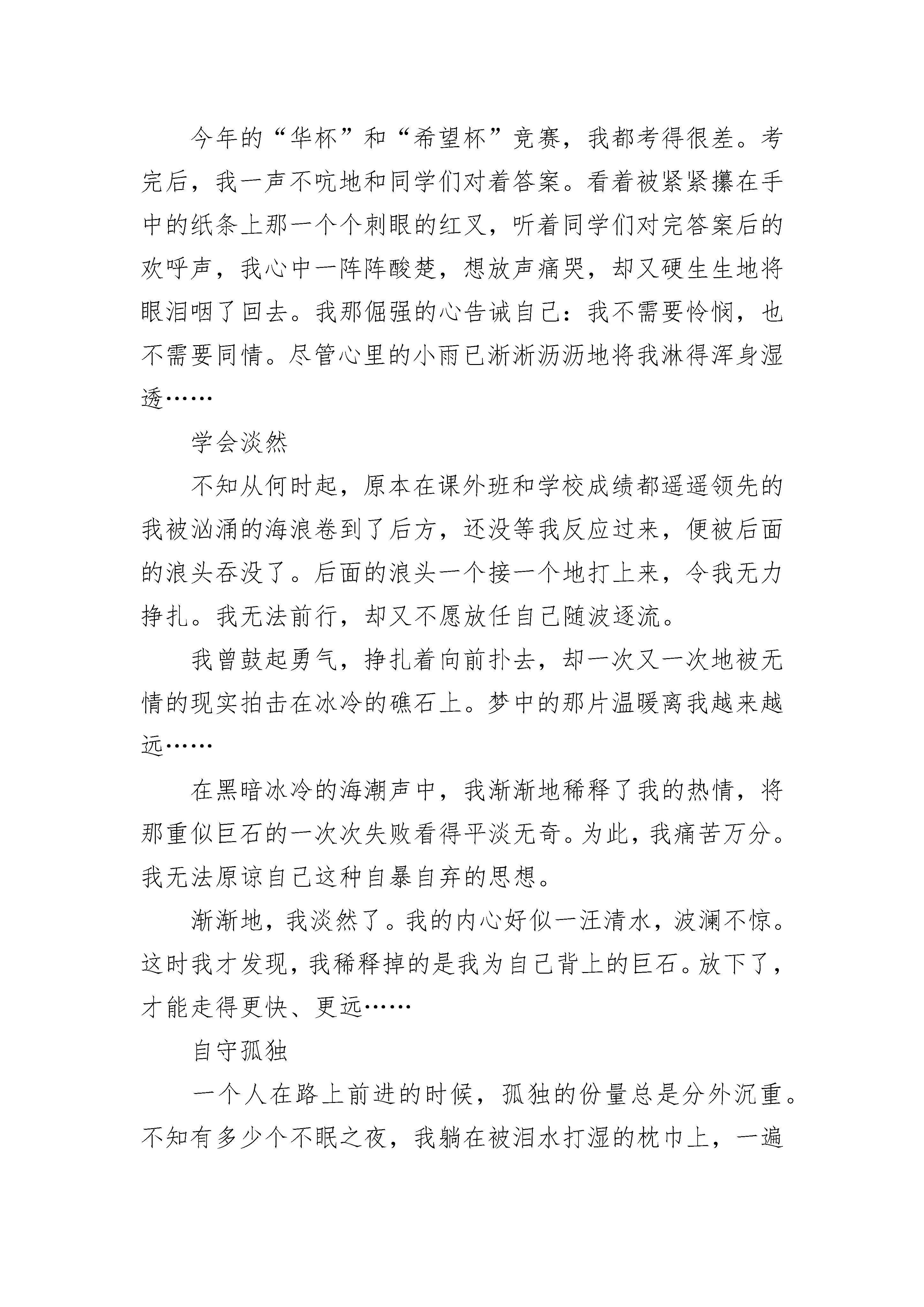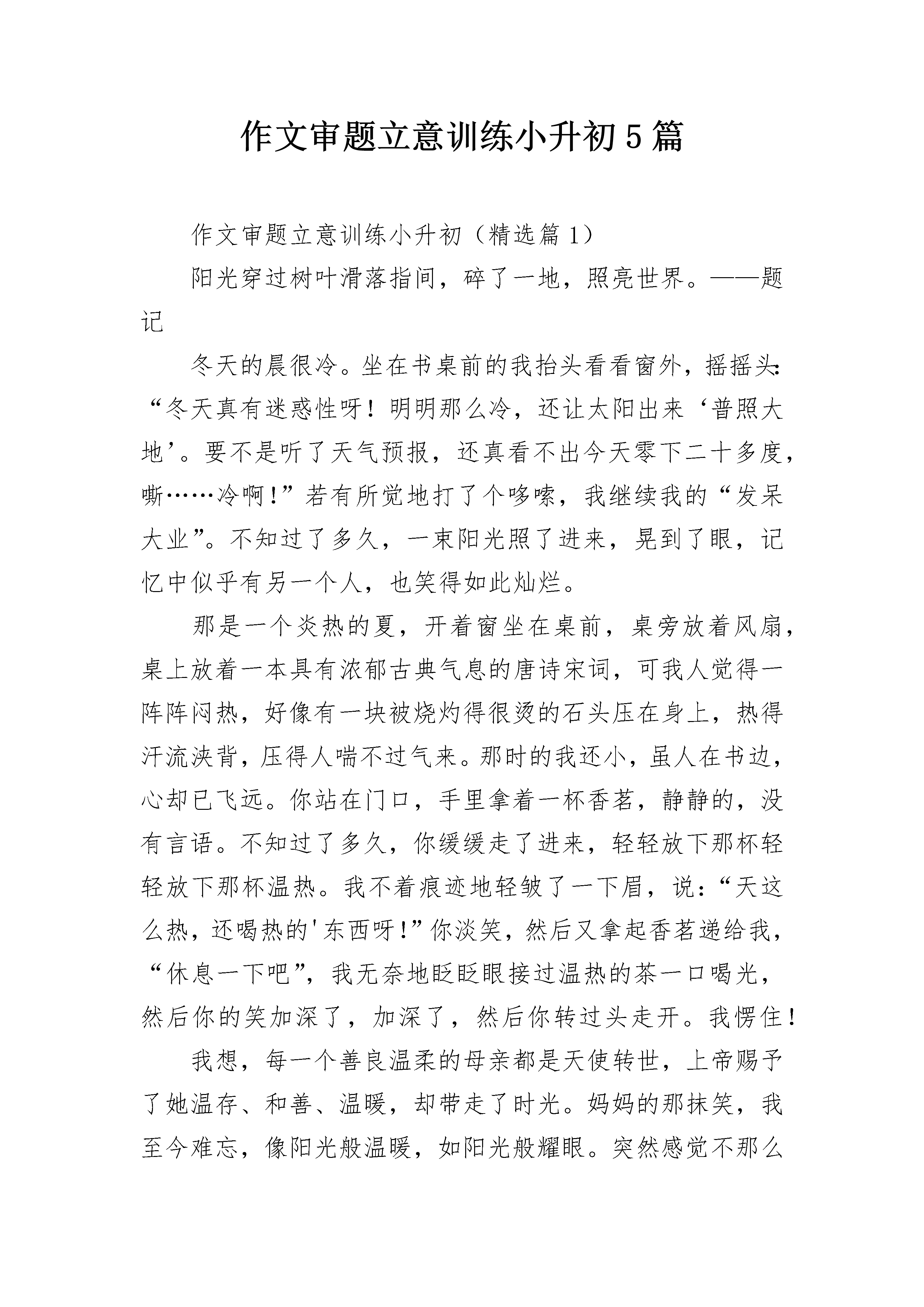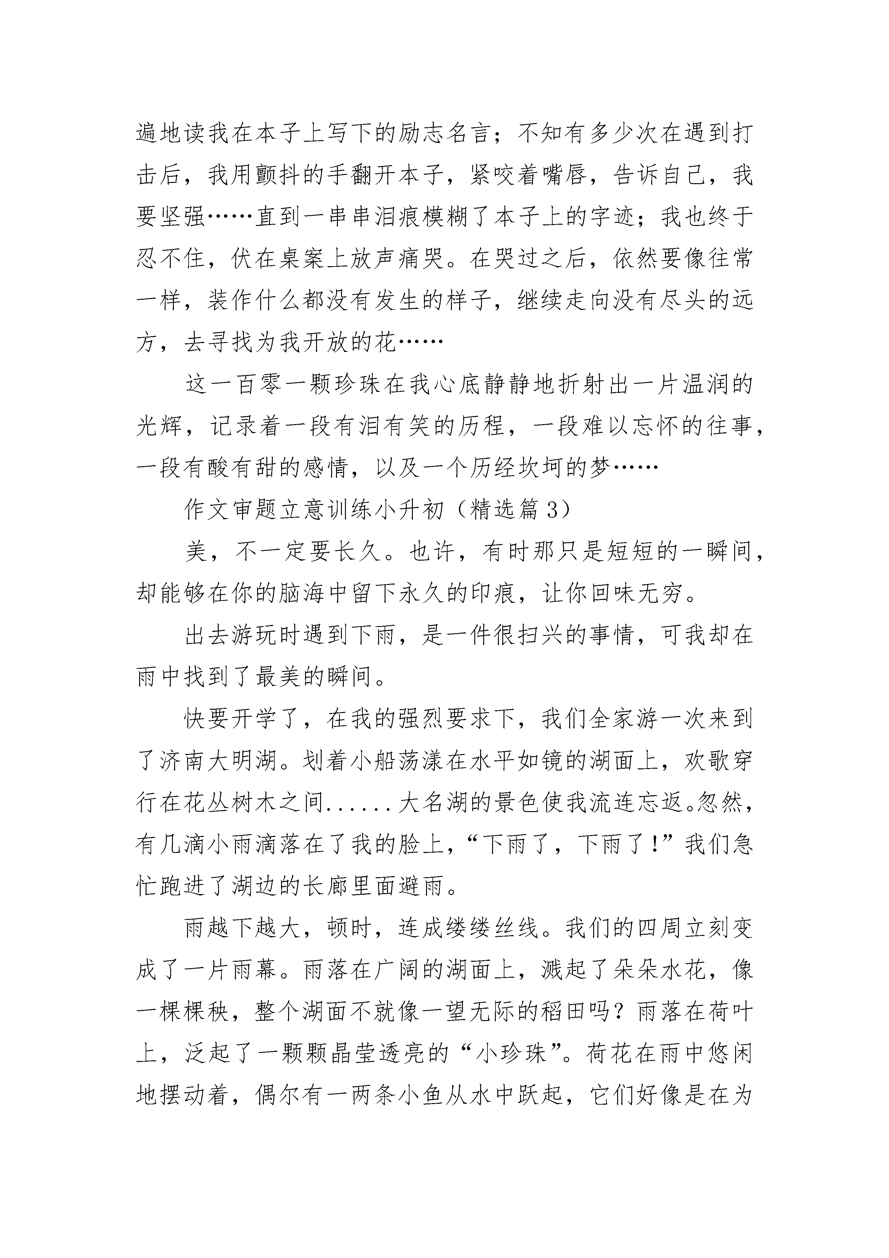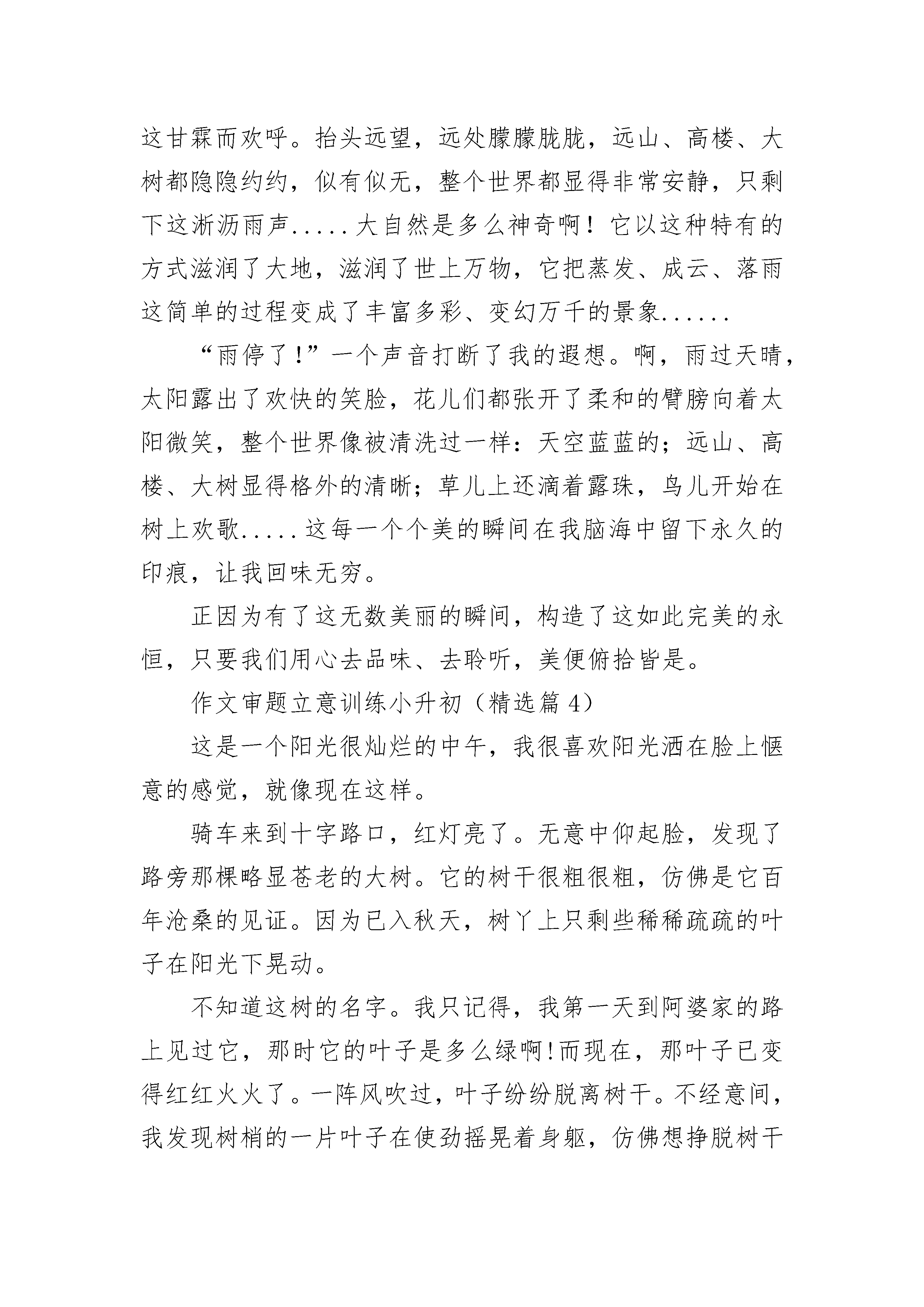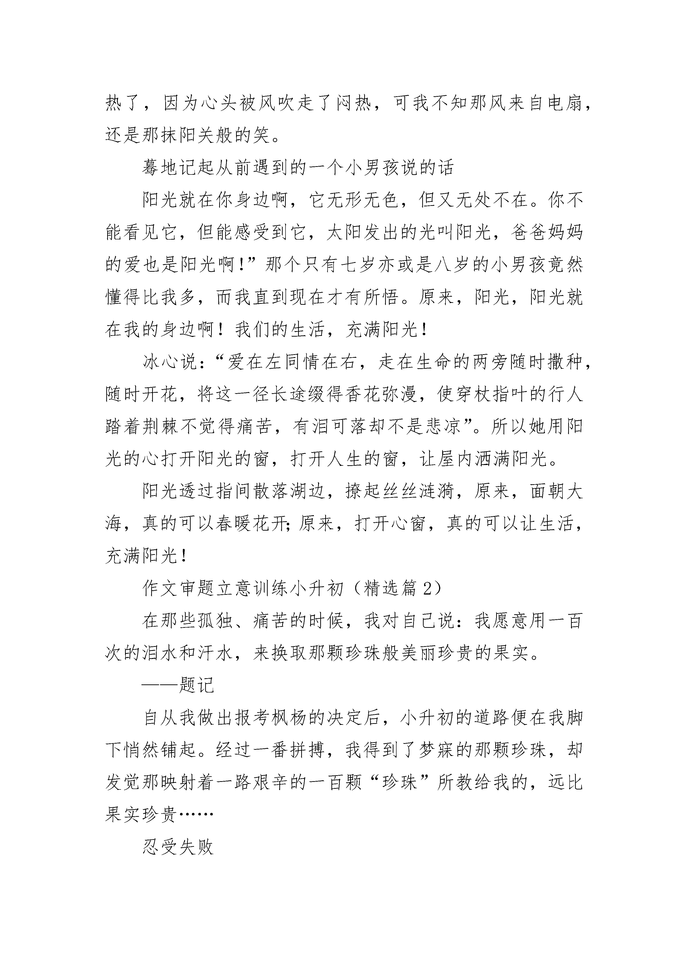 作文审题立意训练小升初5篇作文审题立意训练小升初(精选篇1)阳光穿过树叶滑落指间,碎了一地,照亮世界。——题记冬天的晨很冷。坐在书桌前的我抬头看看窗外,摇摇头:“冬天真有迷惑性呀!明明那么冷,还让太阳出来‘普照大地’。要不是听了天气预报,还真看不出今天零下二十多度,嘶……冷啊!”若有所觉地打了个哆嗦,我继续我的“发呆大业”。不知过了多久,一束阳光照了进来,晃到了眼,记忆中似乎有另一个人,也笑得如此灿烂。那是一个炎热的夏,开着窗坐在桌前,桌旁放着风扇,桌上放着一本具有浓郁古典气息的唐诗宋词,可我人觉得一阵阵闷热,好像有一块被烧灼得很烫的石头压在身上,热得汗流浃背,压得人喘不过气来。那时的我还小,虽人在书边,心却已飞远。你站在门口,手里拿着一杯香茗,静静的,没有言语。不知过了多久,你缓缓走了进来,轻轻放下那杯轻轻放下那杯温热。我不着痕迹地轻皱了一下眉,说:“天这么热,还喝热的'东西呀!”你淡笑,然后又拿起香茗递给我,“休息一下吧”,我无奈地眨眨眼接过温热的茶一口喝光,然后你的笑加深了,加深了,然后你转过头走开。我愣住!我想,每一个善良温柔的母亲都是天使转世,上帝赐予了她温存、和善、温暖,却带走了时光。妈妈的那抹笑,我至今难忘,像阳光般温暖,如阳光般耀眼。突然感觉不那么热了,因为心头被风吹走了闷热,可我不知那风来自电扇,还是那抹阳关般的笑。蓦地记起从前遇到的一个小男孩说的话阳光就在你身边啊,它无形无色,但又无处不在。你不能看见它,但能感受到它,太阳发出的光叫阳光,爸爸妈妈的爱也是阳光啊!”那个只有七岁亦或是八岁的小男孩竟然懂得比我多,而我直到现在才有所悟。原来,阳光,阳光就在我的身边啊!我们的生活,充满阳光!冰心说:“爱在左同情在右,走在生命的两旁随时撒种,随时开花,将这一径长途缀得香花弥漫,使穿杖指叶的行人踏着荆棘不觉得痛苦,有泪可落却不是悲凉”。所以她用阳光的心打开阳光的窗,打开人生的窗,让屋内洒满阳光。阳光透过指间散落湖边,撩起丝丝涟漪,原来,面朝大海,真的可以春暖花开;原来,打开心窗,真的可以让生活,充满阳光!作文审题立意训练小升初(精选篇2)在那些孤独、痛苦的时候,我对自己说:我愿意用一百次的泪水和汗水,来换取那颗珍珠般美丽珍贵的果实。——题记自从我做出报考枫杨的决定后,小升初的道路便在我脚下悄然铺起。经过一番拼搏,我得到了梦寐的那颗珍珠,却发觉那映射着一路艰辛的一百颗“珍珠”所教给我的,远比果实珍贵……忍受失败今年的“华杯”和“希望杯”竞赛,我都考得很差。考完后,我一声不吭地和同学们对着答案。看着被紧紧攥在手中的纸条上那一个个刺眼的红叉,听着同学们对完答案后的欢呼声,我心中一阵阵酸楚,想放声痛哭,却又硬生生地将眼泪咽了回去。我那倔强的心告诫自己:我不需要怜悯,也不需要同情。尽管心里的小雨已淅淅沥沥地将我淋得浑身湿透……学会淡然不知从何时起,原本在课外班和学校成绩都遥遥领先的我被汹涌的海浪卷到了后方,还没等我反应过来,便被后面的浪头吞没了。后面的浪头一个接一个地打上来,令我无力挣扎。我无法前行,却又不愿放任自己随波逐流。我曾鼓起勇气,挣扎着向前扑去,却一次又一次地被无情的现实拍击在冰冷的礁石上。梦中的那片温暖离我越来越远……在黑暗冰冷的海潮声中,我渐渐地稀释了我的热情,将那重似巨石的一次次失败看得平淡无奇。为此,我痛苦万分。我无法原谅自己这种自暴自弃的思想。渐渐地,我淡然了。我的内心好似一汪清水,波澜不惊。这时我才发现,我稀释掉的是我为自己背上的巨石。放下了,才能走得更快、更远……自守孤独一个人在路上前进的时候,孤独的份量总是分外沉重。不知有多少个不眠之夜,我躺在被泪水打湿的枕巾上,一遍遍地读我在本子上写下的励志名言;不知有多少次在遇到打击后,我用颤抖的手翻开本子,紧咬着嘴唇,告诉自己,我要坚强……直到一串串泪痕模糊了本子上的字迹;我也终于忍不住,伏在桌案上放声痛哭。在哭过之后,依然要像往常一样,装作什么都没有发生的样子,继续走向没有尽头的远方,去寻找为我开放的花……这一百零一颗珍珠在我心底静静地折射出一片温润的光辉,记录着一段有泪有笑的历程,一段难以忘怀的往事,一段有酸有甜的感情,以及一个历经坎坷的梦……作文审题立意训练小升初(精选篇3)美,不一定要长久。也许,有时那只是短短的一瞬间,却能够在你的脑海中留下永久的印痕,让你回味无穷。出去游玩时遇到下雨,是一件很扫兴的事情,可我却在雨中找到了最美的瞬间。快要开学了,在我的强烈要求下,我们全家游一次来到了济南大明湖。划着小船荡漾在水平如镜的湖面上,欢歌穿行在花丛树木之间......大名湖的景色使我流连忘返。忽然,有几滴小雨滴落在了我的脸上,“下雨了,下雨了!”我们急忙跑进了湖边的长廊里面避雨。雨越下越大,顿时,连成缕缕丝线。我们的四周立刻变成了一片雨幕。雨落在广阔的湖面上