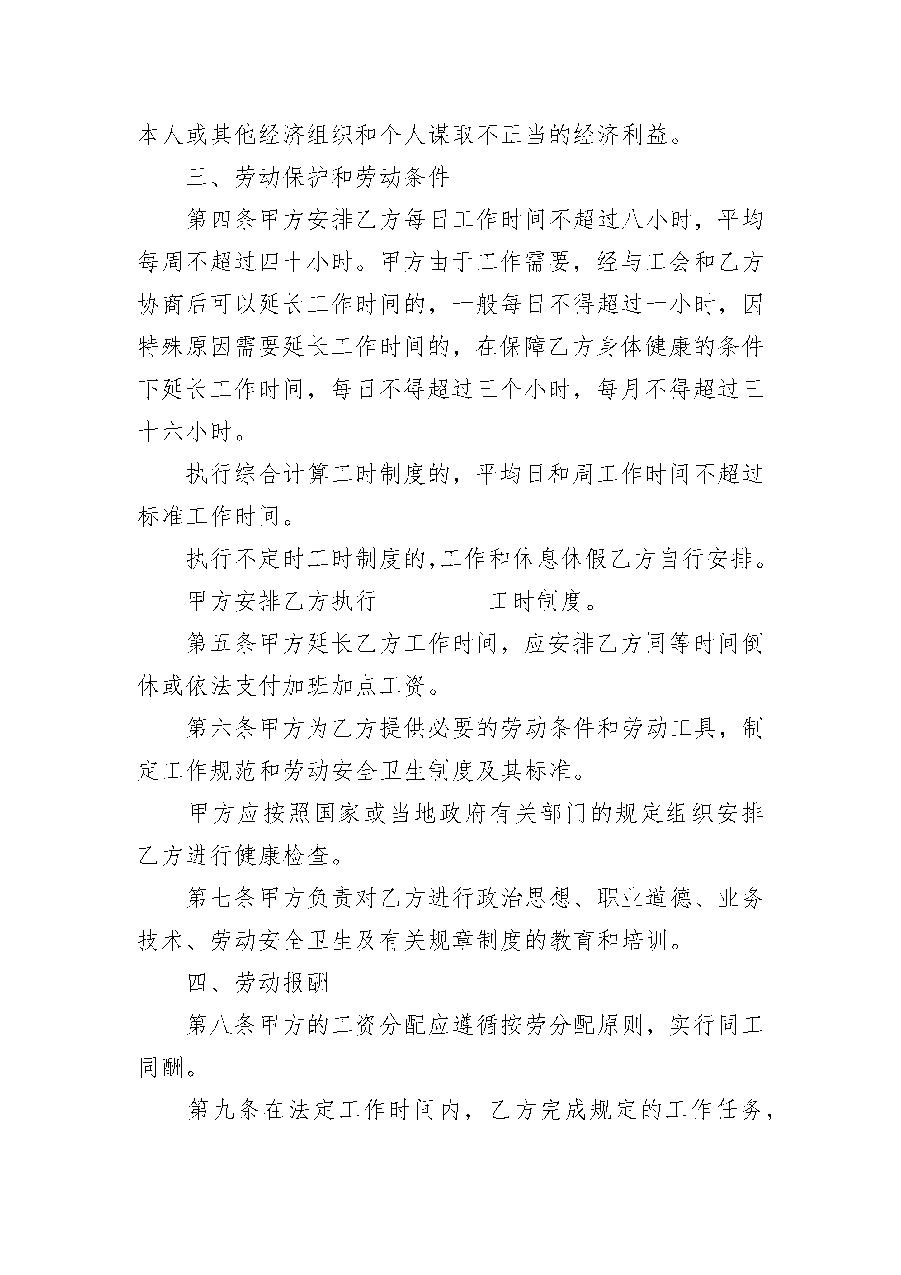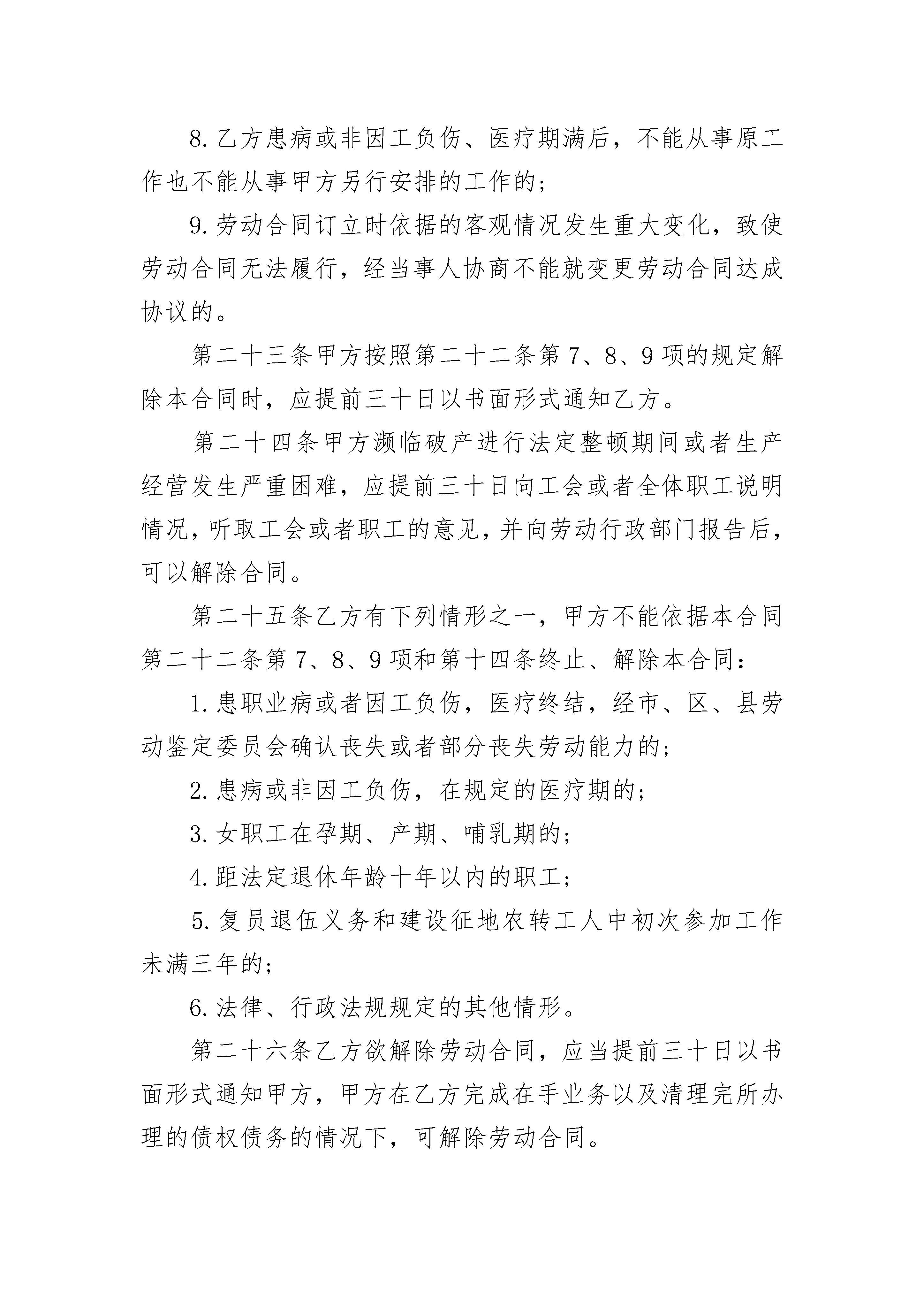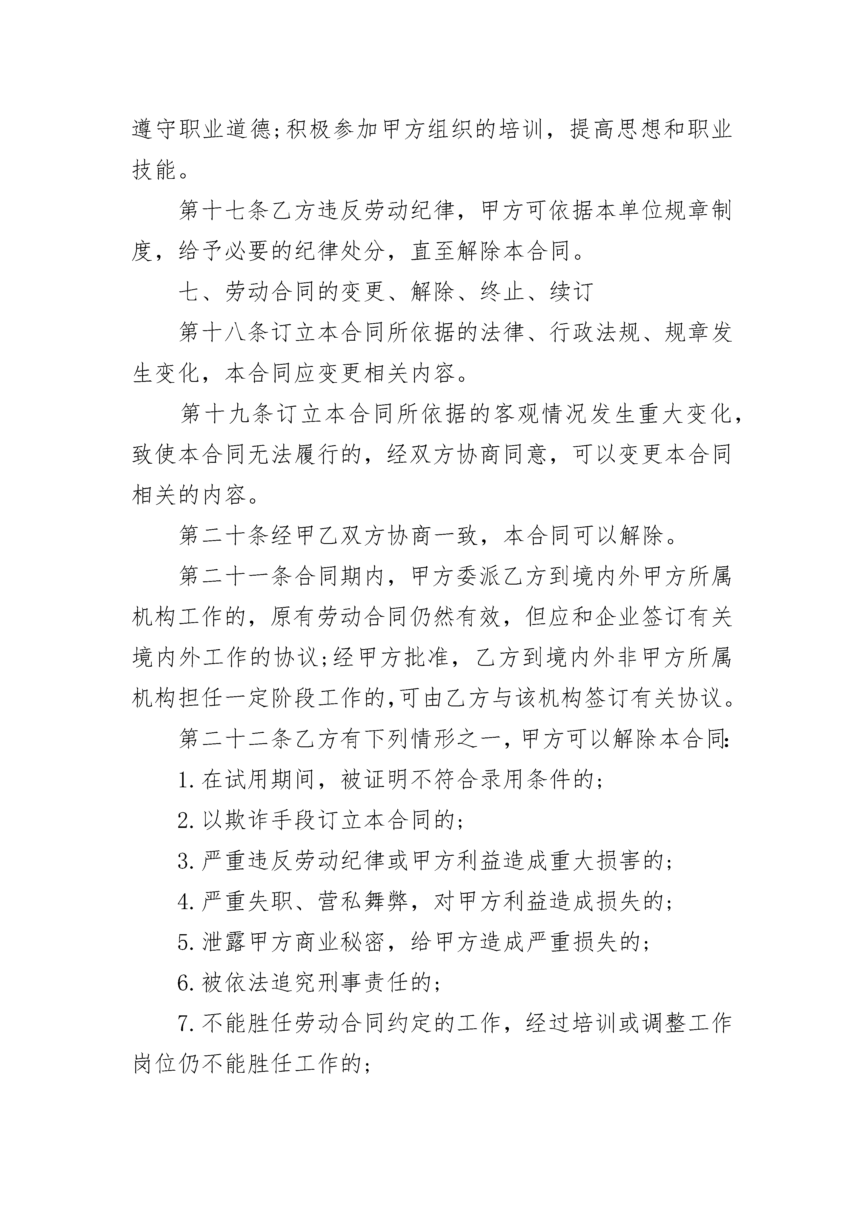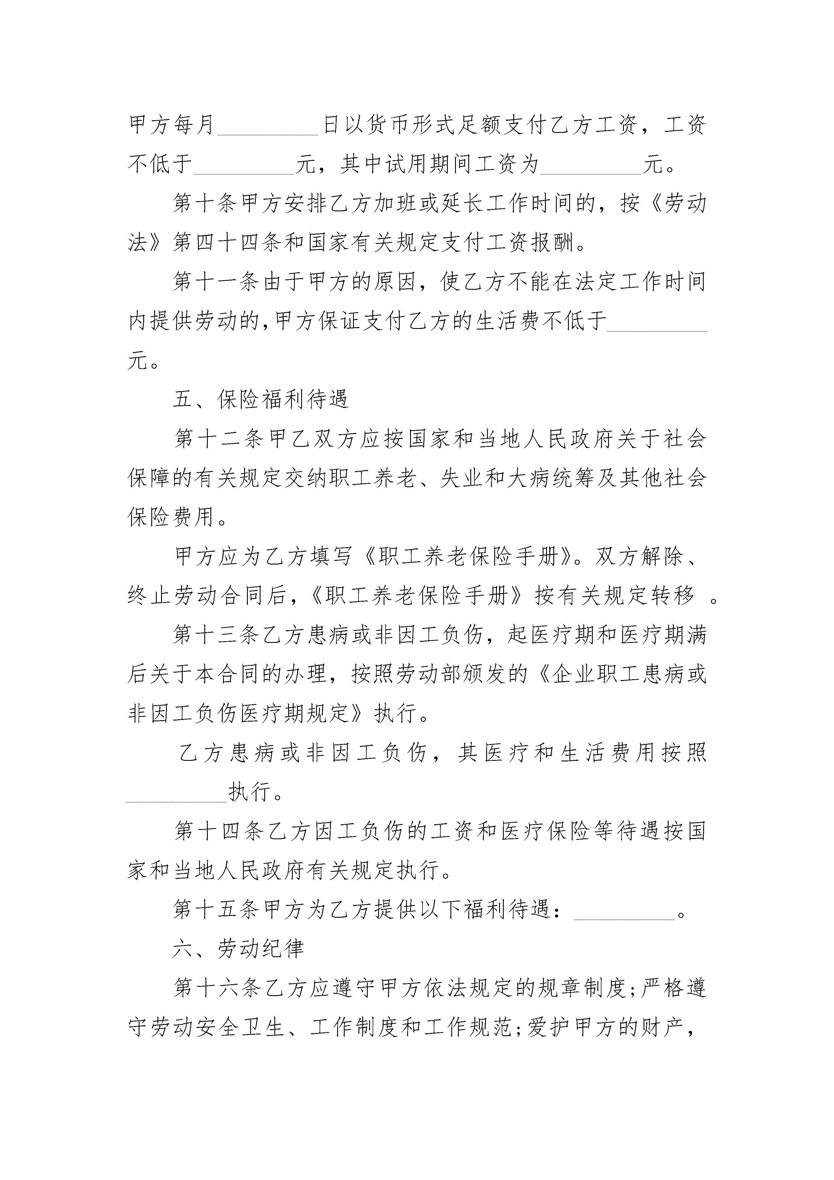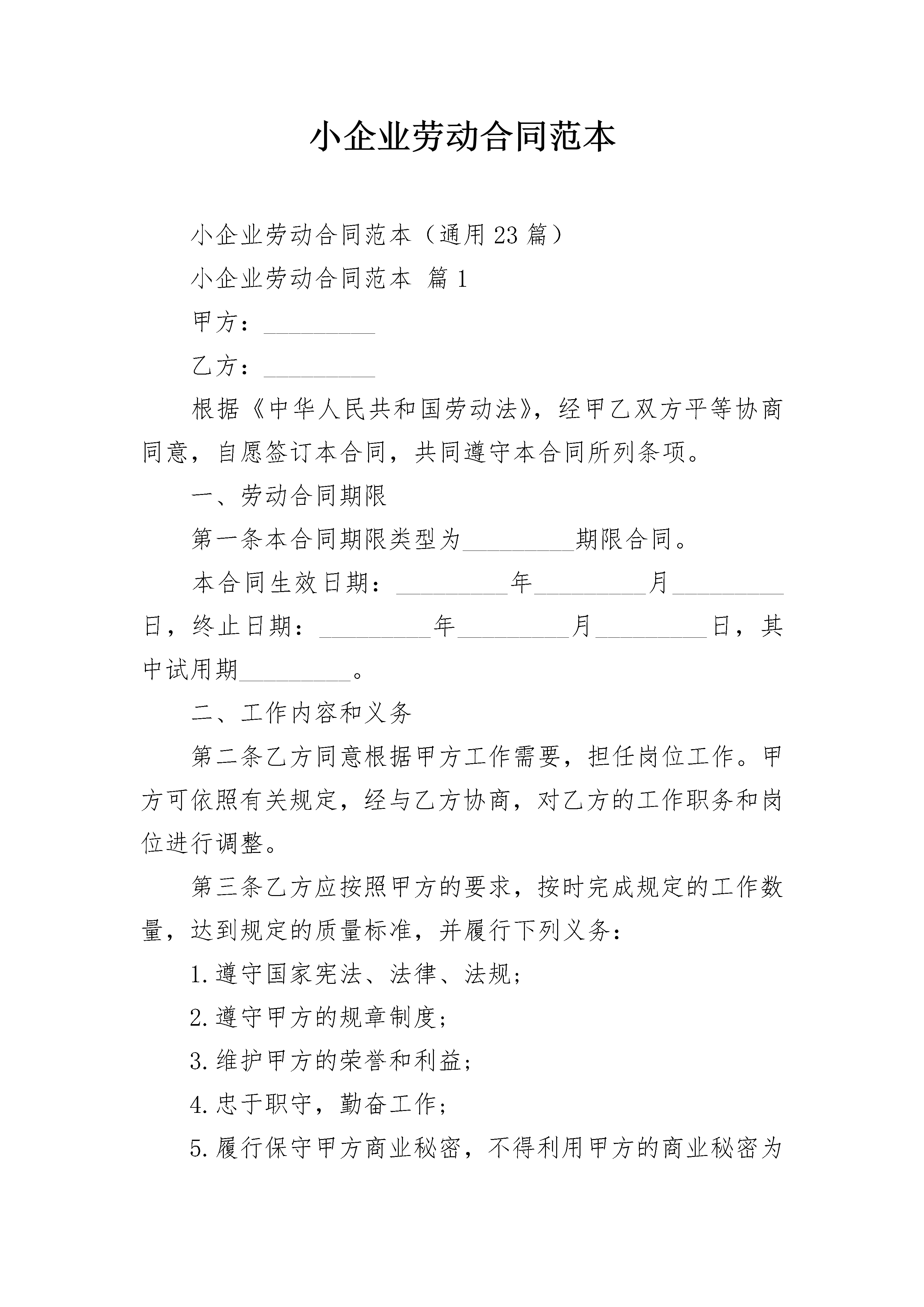 小企业劳动合同范本小企业劳动合同范本(通用23篇)小企业劳动合同范本篇1甲方:_________乙方:_________根据《中华人民共和国劳动法》,经甲乙双方平等协商同意,自愿签订本合同,共同遵守本合同所列条项。一、劳动合同期限第一条本合同期限类型为_________期限合同。本合同生效日期:_________年_________月_________日,终止日期:_________年_________月_________日,其中试用期_________。二、工作内容和义务第二条乙方同意根据甲方工作需要,担任岗位工作。甲方可依照有关规定,经与乙方协商,对乙方的工作职务和岗位进行调整。第三条乙方应按照甲方的要求,按时完成规定的工作数量,达到规定的质量标准,并履行下列义务:1.遵守国家宪法、法律、法规;2.遵守甲方的规章制度;3.维护甲方的荣誉和利益;4.忠于职守,勤奋工作;5.履行保守甲方商业秘密,不得利用甲方的商业秘密为本人或其他经济组织和个人谋取不正当的经济利益。三、劳动保护和劳动条件第四条甲方安排乙方每日工作时间不超过八小时,平均每周不超过四十小时。甲方由于工作需要,经与工会和乙方协商后可以延长工作时间的,一般每日不得超过一小时,因特殊原因需要延长工作时间的,在保障乙方身体健康的条件下延长工作时间,每日不得超过三个小时,每月不得超过三十六小时。执行综合计算工时制度的,平均日和周工作时间不超过标准工作时间。执行不定时工时制度的,工作和休息休假乙方自行安排。甲方安排乙方执行_________工时制度。第五条甲方延长乙方工作时间,应安排乙方同等时间倒休或依法支付加班加点工资。第六条甲方为乙方提供必要的劳动条件和劳动工具,制定工作规范和劳动安全卫生制度及其标准。甲方应按照国家或当地政府有关部门的规定组织安排乙方进行健康检查。第七条甲方负责对乙方进行政治思想、职业道德、业务技术、劳动安全卫生及有关规章制度的教育和培训。四、劳动报酬第八条甲方的工资分配应遵循按劳分配原则,实行同工同酬。第九条在法定工作时间内,乙方完成规定的工作任务,甲方每月_________日以货币形式足额支付乙方工资,工资不低于_________元,其中试用期间工资为_________元。第十条甲方安排乙方加班或延长工作时间的,按《劳动法》第四十四条和国家有关规定支付工资报酬。第十一条由于甲方的原因,使乙方不能在法定工作时间内提供劳动的,甲方保证支付乙方的生活费不低于_________元。五、保险福利待遇第十二条甲乙双方应按国家和当地人民政府关于社会保障的有关规定交纳职工养老、失业和大病统筹及其他社会保险费用。甲方应为乙方填写《职工养老保险手册》。双方解除、终止劳动合同后,《职工养老保险手册》按有关规定转移。第十三条乙方患病或非因工负伤,起医疗期和医疗期满后关于本合同的办理,按照劳动部颁发的《企业职工患病或非因工负伤医疗期规定》执行。乙方患病或非因工负伤,其医疗和生活费用按照_________执行。第十四条乙方因工负伤的工资和医疗保险等待遇按国家和当地人民政府有关规定执行。第十五条甲方为乙方提供以下福利待遇:_________。六、劳动纪律第十六条乙方应遵守甲方依法规定的规章制度;严格遵守劳动安全卫生、工作制度和工作规范;爱护甲方的财产,遵守职业道德;积极参加甲方组织的培训,提高思想和职业技能。第十七条乙方违反劳动纪律,甲方可依据本单位规章制度,给予必要的纪律处分,直至解除本合同。七、劳动合同的变更、解除、终止、续订第十八条订立本合同所依据的法律、行政法规、规章发生变化,本合同应变更相关内容。第十九条订立本合同所依据的客观情况发生重大变化,致使本合同无法履行的,经双方协商同意,可以变更本合同相关的内容。第二十条经甲乙双方协商一致,本合同可以解除。第二十一条合同期内,甲方委派乙方到境内外甲方所属机构工作的,原有劳动合同仍然有效,但应和企业签订有关境内外工作的协议;经甲方批准,乙方到境内外非甲方所属机构担任一定阶段工作的,可由乙方与该机构签订有关协议。第二十二条乙方有下列情形之一,甲方可以解除本合同:1.在试用期间,被证明不符合录用条件的;2.以欺诈手段订立本合同的;3.严重违反劳动纪律或甲方利益造成重大损害的;4.严重失职、营私舞弊,对甲方利益造成损失的;5.泄露甲方商业秘密,给甲方造成严重损失的;6.被依法追究刑事责任的;7.不能胜任劳动合同约定的工作,经过培训或调整工作岗位仍不能胜任工作的;8.乙方患病或非因工负伤、医疗期满后,不能从事原工作也不能从事甲方另行安排的工作的;9.劳动合同订立时依据的客观情况发生重大变化,致使劳动合同无法履行,经当事人协商不能就变更劳动合同达成协议的。第二十三条甲方按照第二十二条第7、8、9项的规定解除本合同时,应提前三十日以书面