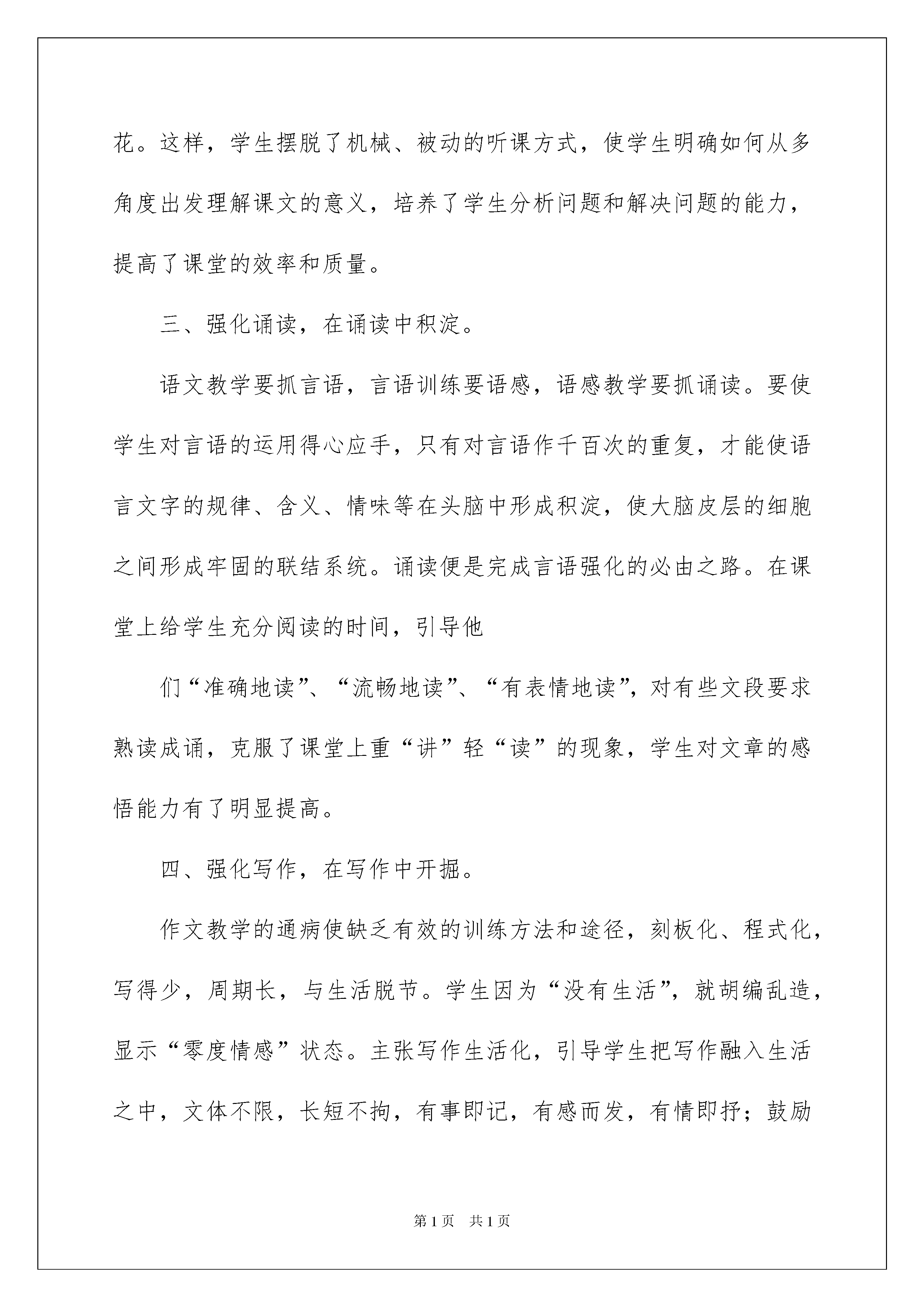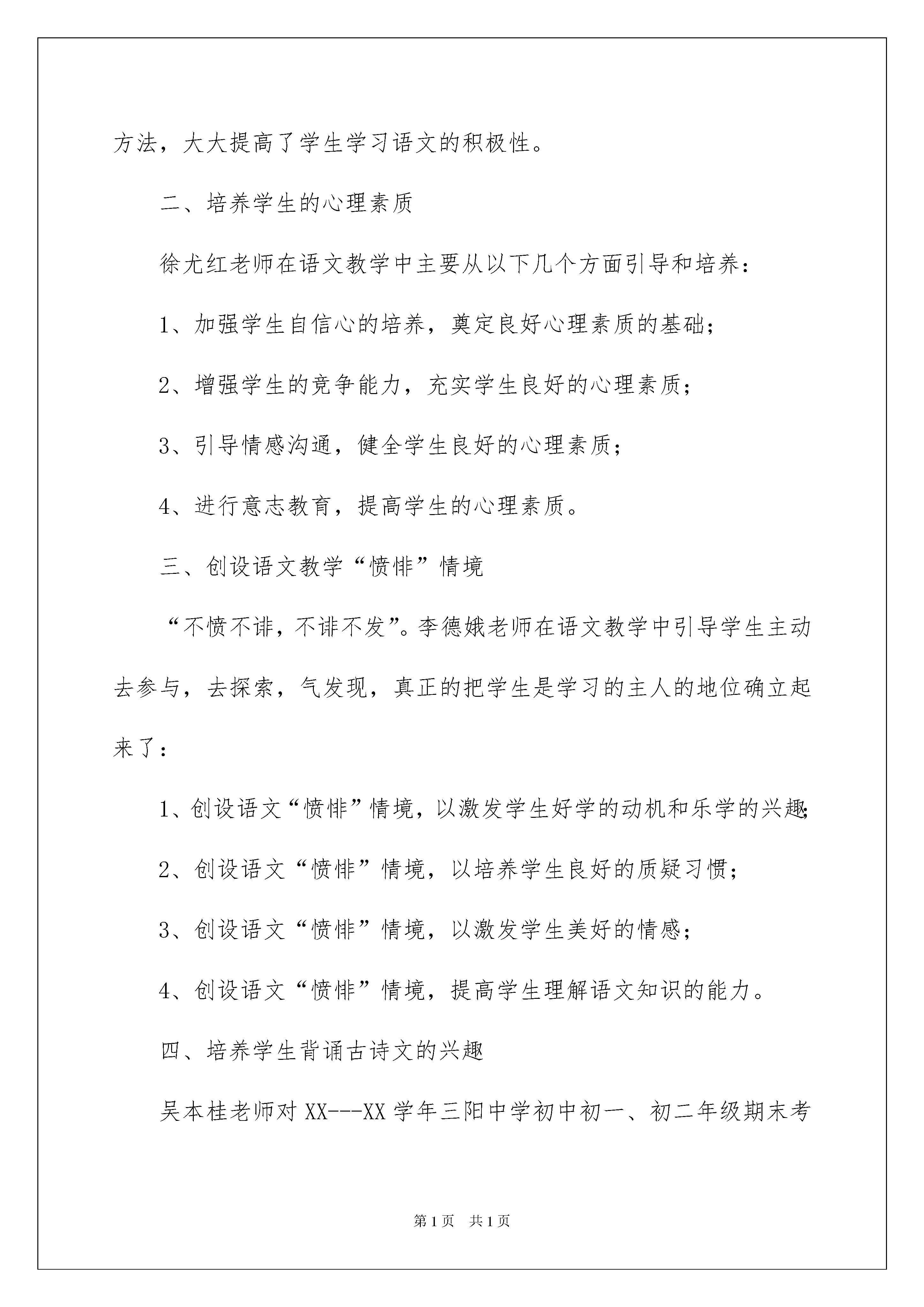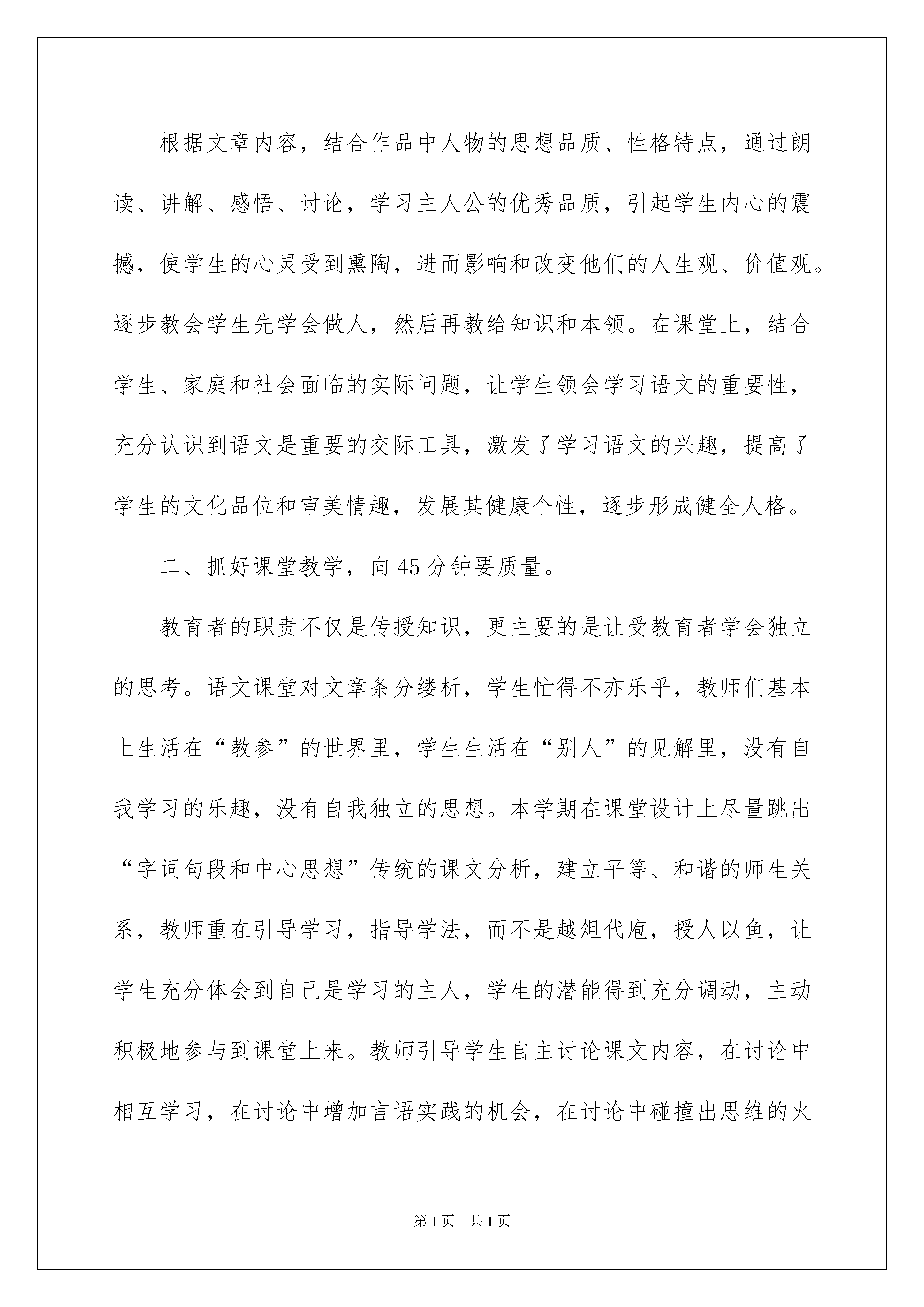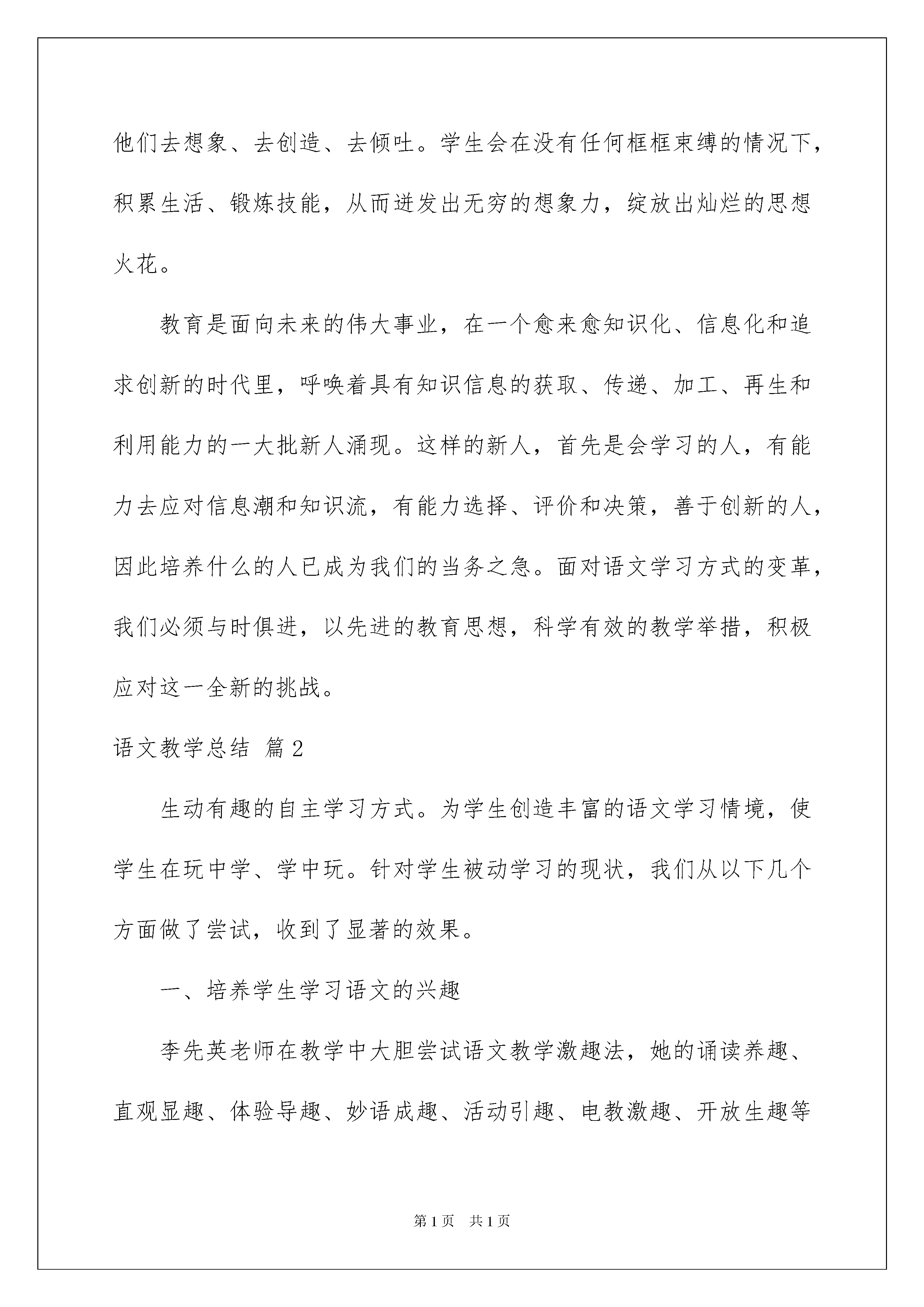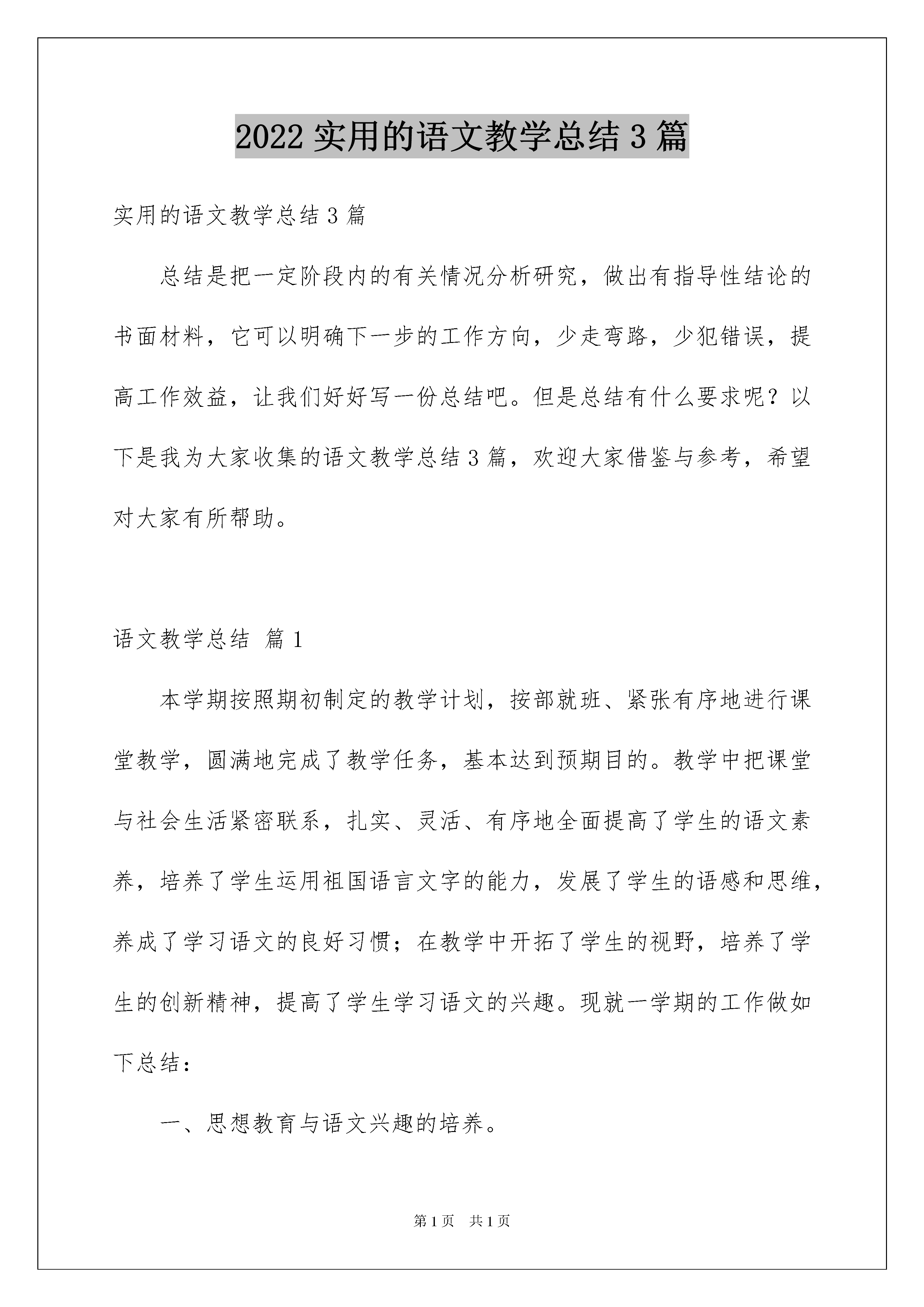 2022实用的语文教学总结3篇实用的语文教学总结3篇总结是把一定阶段内的有关情况分析研究,做出有指导性结论的书面材料,它可以明确下一步的工作方向,少走弯路,少犯错误,提高工作效益,让我们好好写一份总结吧。但是总结有什么要求呢?以下是我为大家收集的语文教学总结3篇,欢迎大家借鉴与参考,希望对大家有所帮助。语文教学总结篇1本学期按照期初制定的教学计划,按部就班、紧张有序地进行课堂教学,圆满地完成了教学任务,基本达到预期目的。教学中把课堂与社会生活紧密联系,扎实、灵活、有序地全面提高了学生的语文素养,培养了学生运用祖国语言文字的能力,发展了学生的语感和思维,养成了学习语文的良好习惯;在教学中开拓了学生的视野,培养了学生的创新精神,提高了学生学习语文的兴趣。现就一学期的工作做如下总结:一、思想教育与语文兴趣的培养。根据文章内容,结合作品中人物的思想品质、性格特点,通过朗读、讲解、感悟、讨论,学习主人公的优秀品质,引起学生内心的震撼,使学生的心灵受到熏陶,进而影响和改变他们的人生观、价值观。逐步教会学生先学会做人,然后再教给知识和本领。在课堂上,结合学生、家庭和社会面临的实际问题,让学生领会学习语文的重要性,充分认识到语文是重要的交际工具,激发了学习语文的兴趣,提高了学生的文化品位和审美情趣,发展其健康个性,逐步形成健全人格。二、抓好课堂教学,向45分钟要质量。教育者的职责不仅是传授知识,更主要的是让受教育者学会独立的思考。语文课堂对文章条分缕析,学生忙得不亦乐乎,教师们基本上生活在“教参”的世界里,学生生活在“别人”的见解里,没有自我学习的乐趣,没有自我独立的思想。本学期在课堂设计上尽量跳出“字词句段和中心思想”传统的课文分析,建立平等、和谐的师生关系,教师重在引导学习,指导学法,而不是越俎代庖,授人以鱼,让学生充分体会到自己是学习的主人,学生的潜能得到充分调动,主动积极地参与到课堂上来。教师引导学生自主讨论课文内容,在讨论中相互学习,在讨论中增加言语实践的机会,在讨论中碰撞出思维的火花。这样,学生摆脱了机械、被动的听课方式,使学生明确如何从多角度出发理解课文的意义,培养了学生分析问题和解决问题的能力,提高了课堂的效率和质量。三、强化诵读,在诵读中积淀。语文教学要抓言语,言语训练要语感,语感教学要抓诵读。要使学生对言语的运用得心应手,只有对言语作千百次的重复,才能使语言文字的规律、含义、情味等在头脑中形成积淀,使大脑皮层的细胞之间形成牢固的联结系统。诵读便是完成言语强化的必由之路。在课堂上给学生充分阅读的时间,引导他们“准确地读”、“流畅地读”、“有表情地读”,对有些文段要求熟读成诵,克服了课堂上重“讲”轻“读”的现象,学生对文章的感悟能力有了明显提高。四、强化写作,在写作中开掘。作文教学的通病使缺乏有效的训练方法和途径,刻板化、程式化,写得少,周期长,与生活脱节。学生因为“没有生活”,就胡编乱造,显示“零度情感”状态。主张写作生活化,引导学生把写作融入生活之中,文体不限,长短不拘,有事即记,有感而发,有情即抒;鼓励他们去想象、去创造、去倾吐。学生会在没有任何框框束缚的情况下,积累生活、锻炼技能,从而迸发出无穷的想象力,绽放出灿烂的思想火花。教育是面向未来的伟大事业,在一个愈来愈知识化、信息化和追求创新的时代里,呼唤着具有知识信息的获取、传递、加工、再生和利用能力的一大批新人涌现。这样的新人,首先是会学习的人,有能力去应对信息潮和知识流,有能力选择、评价和决策,善于创新的人,因此培养什么的人已成为我们的当务之急。面对语文学习方式的变革,我们必须与时俱进,以先进的教育思想,科学有效的教学举措,积极应对这一全新的挑战。语文教学总结篇2生动有趣的自主学习方式。为学生创造丰富的语文学习情境,使学生在玩中学、学中玩。针对学生被动学习的现状,我们从以下几个方面做了尝试,收到了显著的效果。一、培养学生学习语文的兴趣李先英老师在教学中大胆尝试语文教学激趣法,她的诵读养趣、直观显趣、体验导趣、妙语成趣、活动引趣、电教激趣、开放生趣等方法,大大提高了学生学习语文的积极性。二、培养学生的心理素质徐尤红老师在语文教学中主要从以下几个方面引导和培养:1、加强学生自信心的培养,奠定良好心理素质的基础;2、增强学生的竞争能力,充实学生良好的心理素质;3、引导情感沟通,健全学生良好的心理素质;4、进行意志教育,提高学生的心理素质。三、创设语文教学“愤悱”情境“不愤不诽,不诽不发”。李德娥老师在语文教学中引导学生主动去参与,去探索,气发现,真正的把学生是学习的主人的地位确立起来了:1、创设语文“愤悱”情境,以激发
