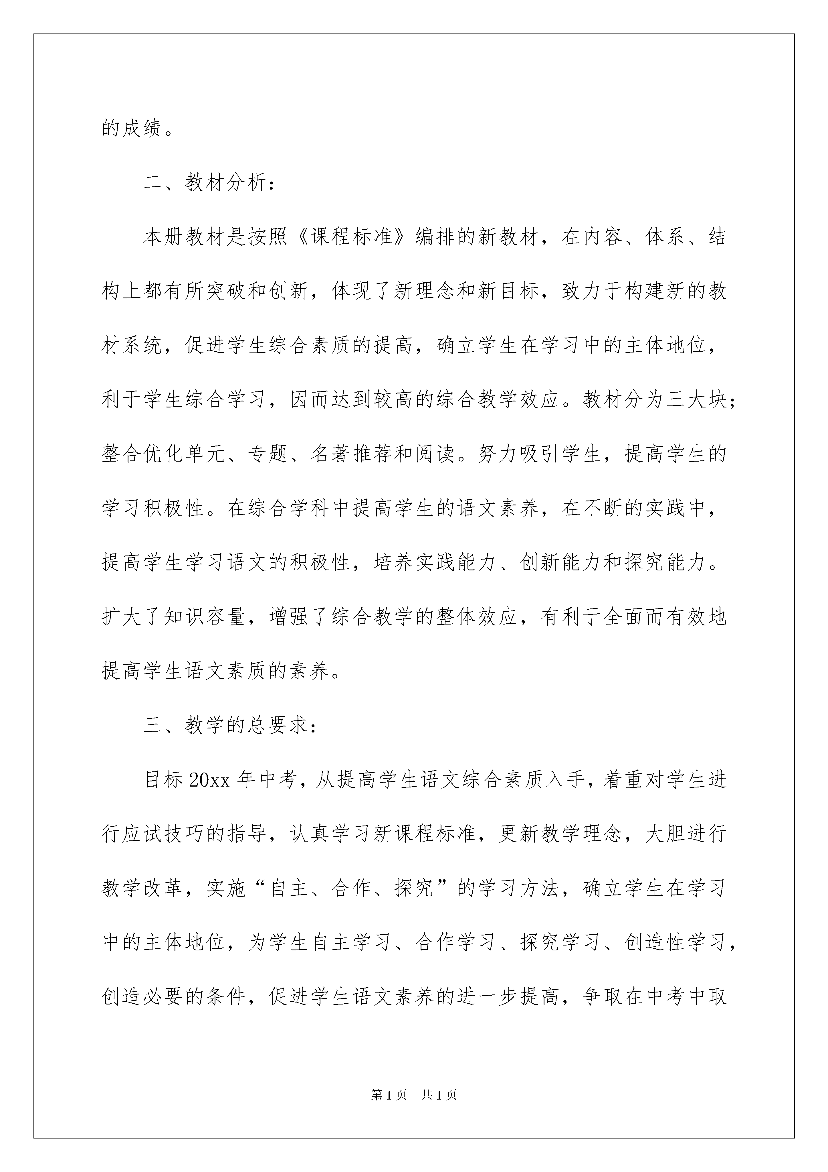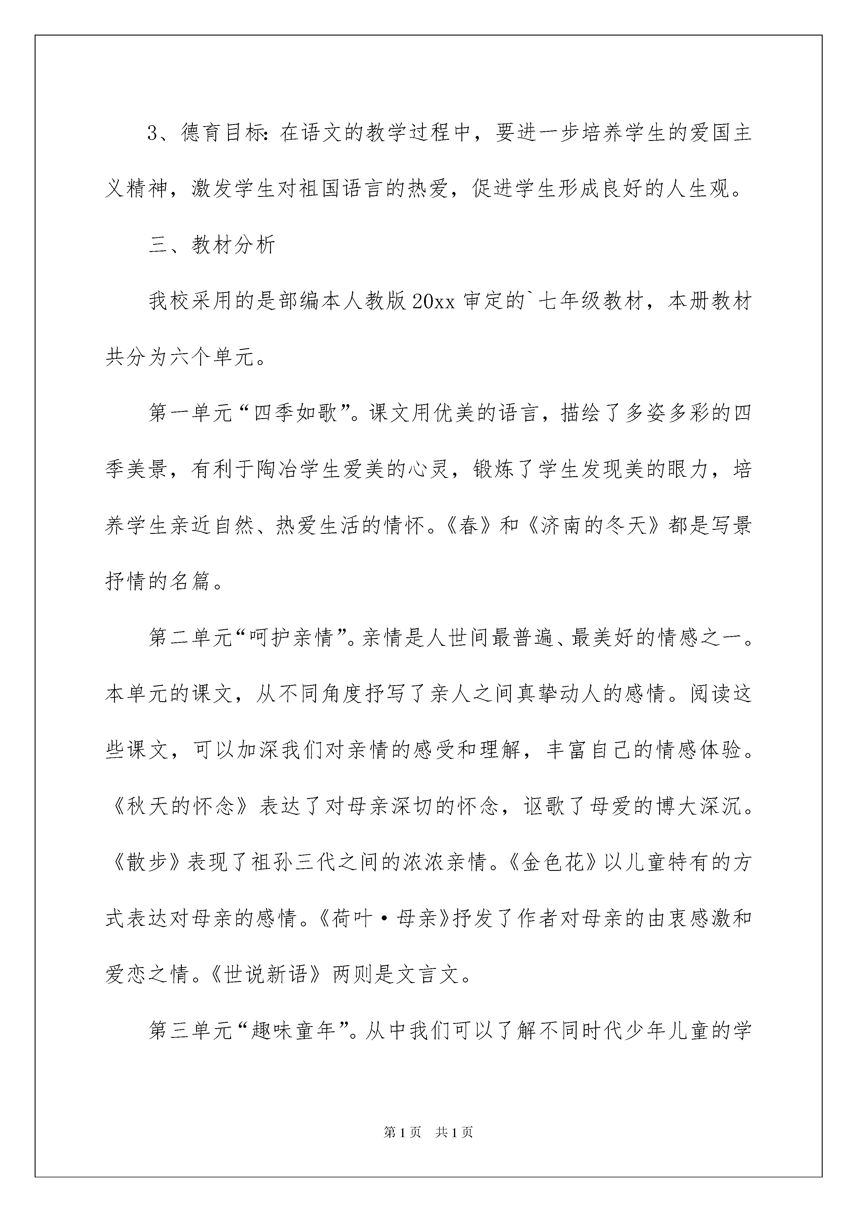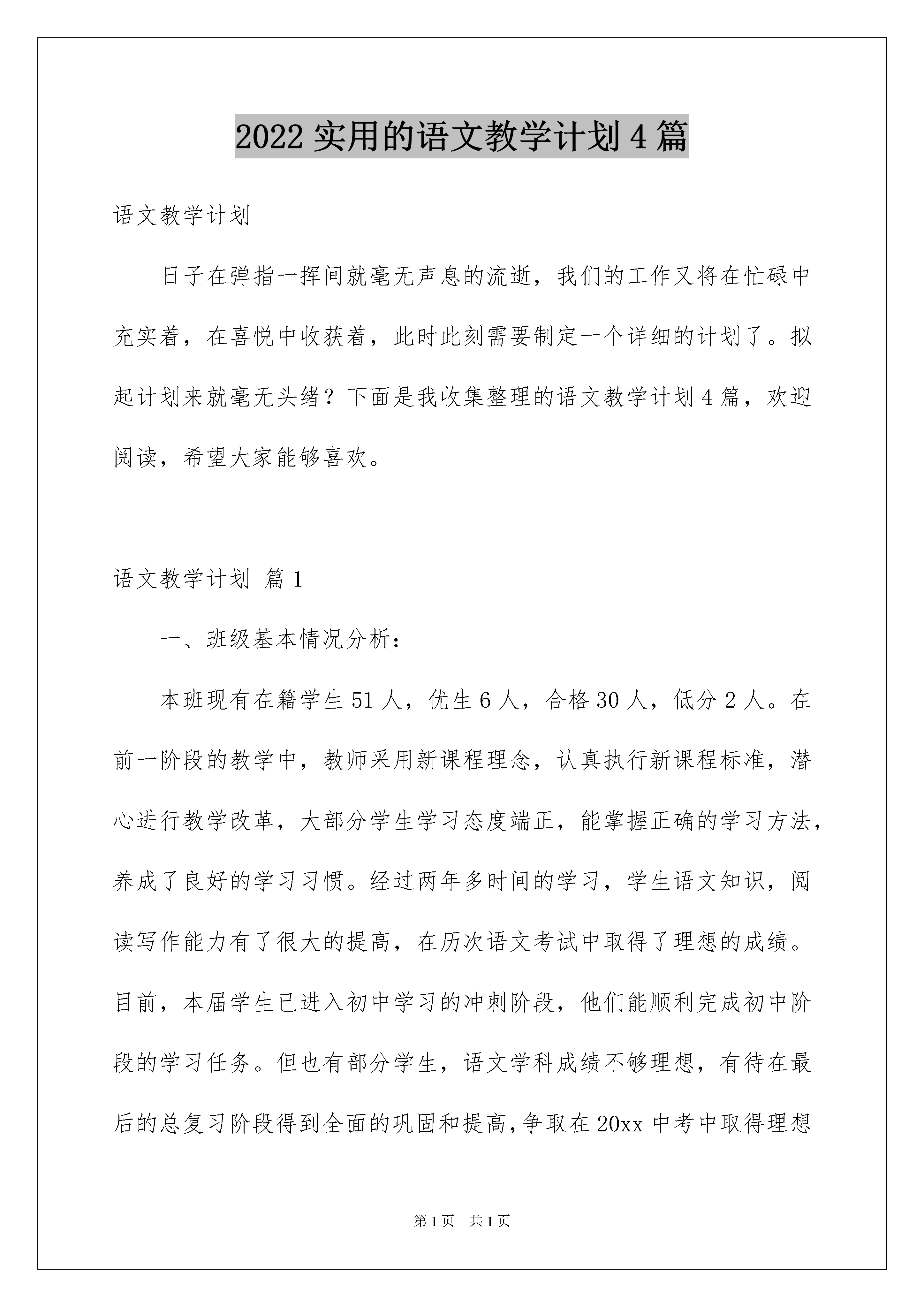 2022实用的语文教学计划4篇语文教学计划日子在弹指一挥间就毫无声息的流逝,我们的工作又将在忙碌中充实着,在喜悦中收获着,此时此刻需要制定一个详细的计划了。拟起计划来就毫无头绪?下面是我收集整理的语文教学计划4篇,欢迎阅读,希望大家能够喜欢。语文教学计划篇1一、班级基本情况分析:本班现有在籍学生51人,优生6人,合格30人,低分2人。在前一阶段的教学中,教师采用新课程理念,认真执行新课程标准,潜心进行教学改革,大部分学生学习态度端正,能掌握正确的学习方法,养成了良好的学习习惯。经过两年多时间的学习,学生语文知识,阅读写作能力有了很大的提高,在历次语文考试中取得了理想的成绩。目前,本届学生已进入初中学习的冲刺阶段,他们能顺利完成初中阶段的学习任务。但也有部分学生,语文学科成绩不够理想,有待在最后的总复习阶段得到全面的巩固和提高,争取在20xx中考中取得理想的成绩。二、教材分析:本册教材是按照《课程标准》编排的新教材,在内容、体系、结构上都有所突破和创新,体现了新理念和新目标,致力于构建新的教材系统,促进学生综合素质的提高,确立学生在学习中的主体地位,利于学生综合学习,因而达到较高的综合教学效应。教材分为三大块;整合优化单元、专题、名著推荐和阅读。努力吸引学生,提高学生的学习积极性。在综合学科中提高学生的语文素养,在不断的实践中,提高学生学习语文的积极性,培养实践能力、创新能力和探究能力。扩大了知识容量,增强了综合教学的整体效应,有利于全面而有效地提高学生语文素质的素养。三、教学的总要求:目标20xx年中考,从提高学生语文综合素质入手,着重对学生进行应试技巧的指导,认真学习新课程标准,更新教学理念,大胆进行教学改革,实施“自主、合作、探究”的学习方法,确立学生在学习中的主体地位,为学生自主学习、合作学习、探究学习、创造性学习,创造必要的条件,促进学生语文素养的进一步提高,争取在中考中取得理想的成绩。四、教改措施:(一)以深化语文教学改革为契机,认真解读课程标准,吃透教材的编辑意图,理清教材的文化内涵,摆正形成性学习与终结性学习的关系,加大课堂教学改革力度,积极投身新课改,运用先进教学理念和多媒体手段进行教学,在减轻学生负担的同时,激发学生地学习兴趣,唤起问题意识,实施教学民主化,努力提高课堂教学质量。(二)教师要做到教学五认真,实施集体备课,集思广益,总揽全局,教师在备课是要充分利用教材留下的空间,恰当把握教材的量和度,面向全体,对全套教材进行宏观的把握,理出知识能力训练点,进行有针对性的训练,以此来减轻学生过重的课业负担。认真做好试卷分析,找出教学中的薄弱环节,注重补差补缺,争取教学大面积丰收。语文教学计划篇2为了使本学期的教学工作有计划有步骤地顺利进行,高标准的完成我所承担的教学任务,特制定本教学计划如下:一、指导思想以学校工作计划为依据,以语文新课程标准为指导,不断丰富学生的阅读积累,有的放矢进行写作训练,全面提高学生的语文素养。使学生的现代文阅读能力、写作能力和口语交际能力得到提高,具有初步的文学鉴赏能力和阅读课外文言文的能力。掌握语文学习的基本方法,初步实现由“要我学”向“我要学”转变,养成自学语文的习惯。二、教学目标1、知识能力目标:掌握七年级上册语文所要掌握的生字、新词;学习朗读方法,注意语气的停顿、转折,感情的转化,为培养学生语文的语感打下基础;阅读大量的课外读物,提高对文本理解的深度;了解写作的基本技巧,理解文本的思想内容和文章的思路,提高文字敏感度;培养良好的语文学习习惯。养成边读边圈点、敢于提问与答辩的习惯。2、人文素质目标:能注意对象和场合,学习文明得体地进行交流。能够较完整的讲述见闻,内容具体、语言生动。复述转述,完整准确、突出重点。把课本上学习到的东西,活用到生活当中,提高自身的文化品味。3、德育目标:在语文的教学过程中,要进一步培养学生的爱国主义精神,激发学生对祖国语言的热爱,促进学生形成良好的人生观。三、教材分析我校采用的是部编本人教版20xx审定的`七年级教材,本册教材共分为六个单元。第一单元“四季如歌”。课文用优美的语言,描绘了多姿多彩的四季美景,有利于陶冶学生爱美的心灵,锻炼了学生发现美的眼力,培养学生亲近自然、热爱生活的情怀。《春》和《济南的冬天》都是写景抒情的名篇。第二单元“呵护亲情”。亲情是人世间最普遍、最美好的情感之一。本单元的课文,从不同角度抒写了亲人之间真挚动人的感情。阅读这些课文,可以加深我们对亲情的感受和理解,丰富自己的情感体验。《秋天的怀念》表达了对母亲深切的怀念,讴歌了母爱的博大深沉。《散步》表现了祖孙三代之间的浓浓亲