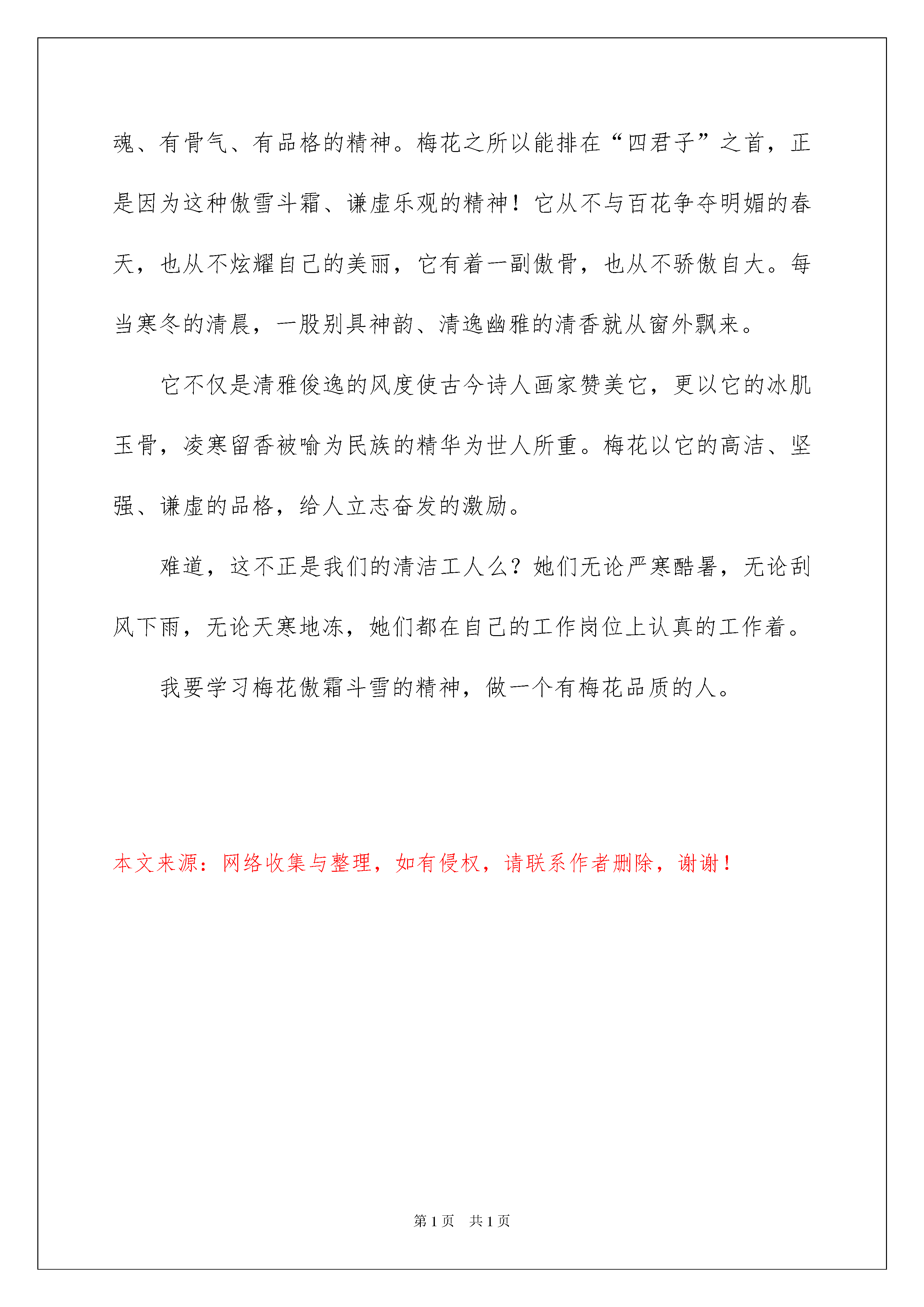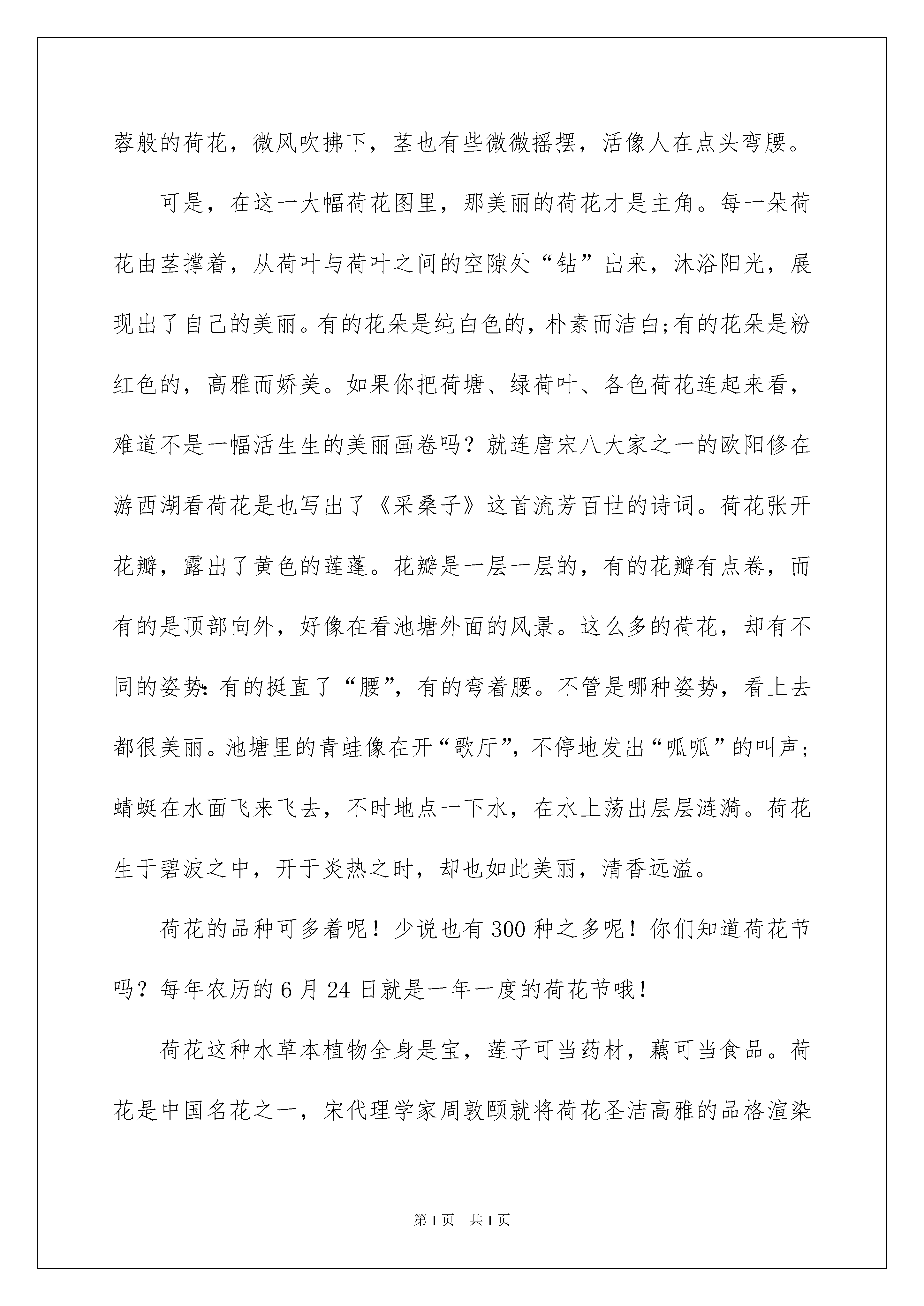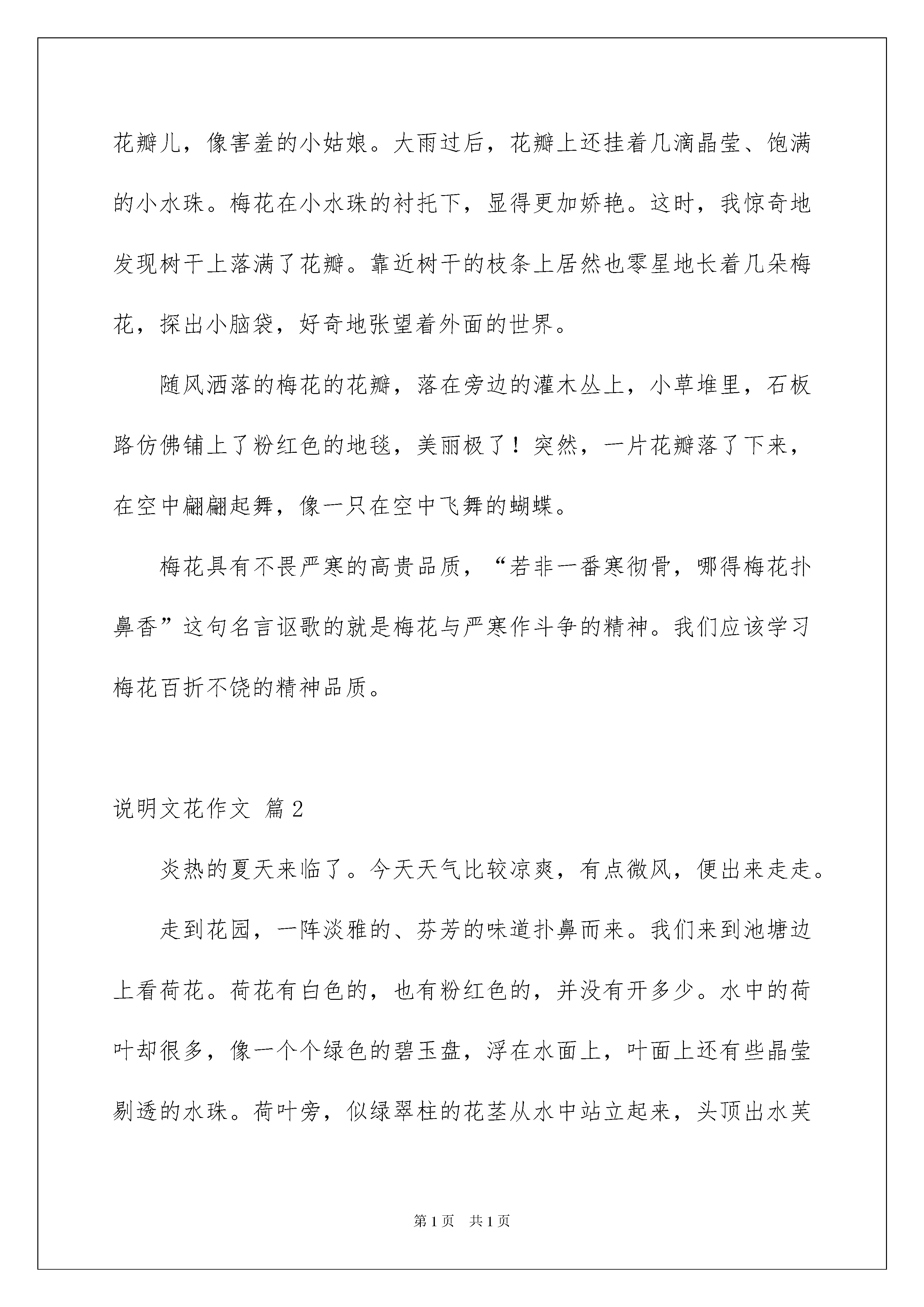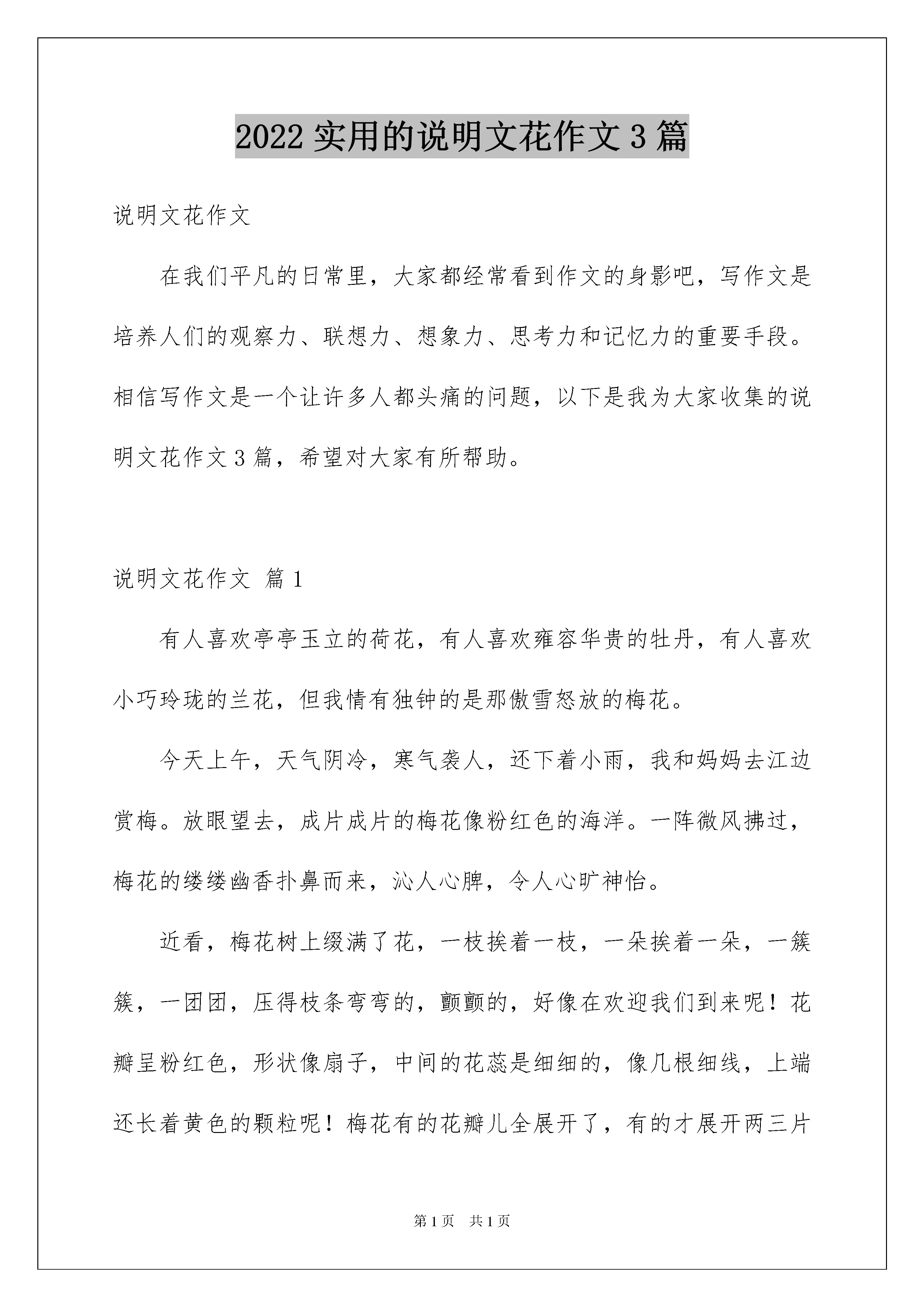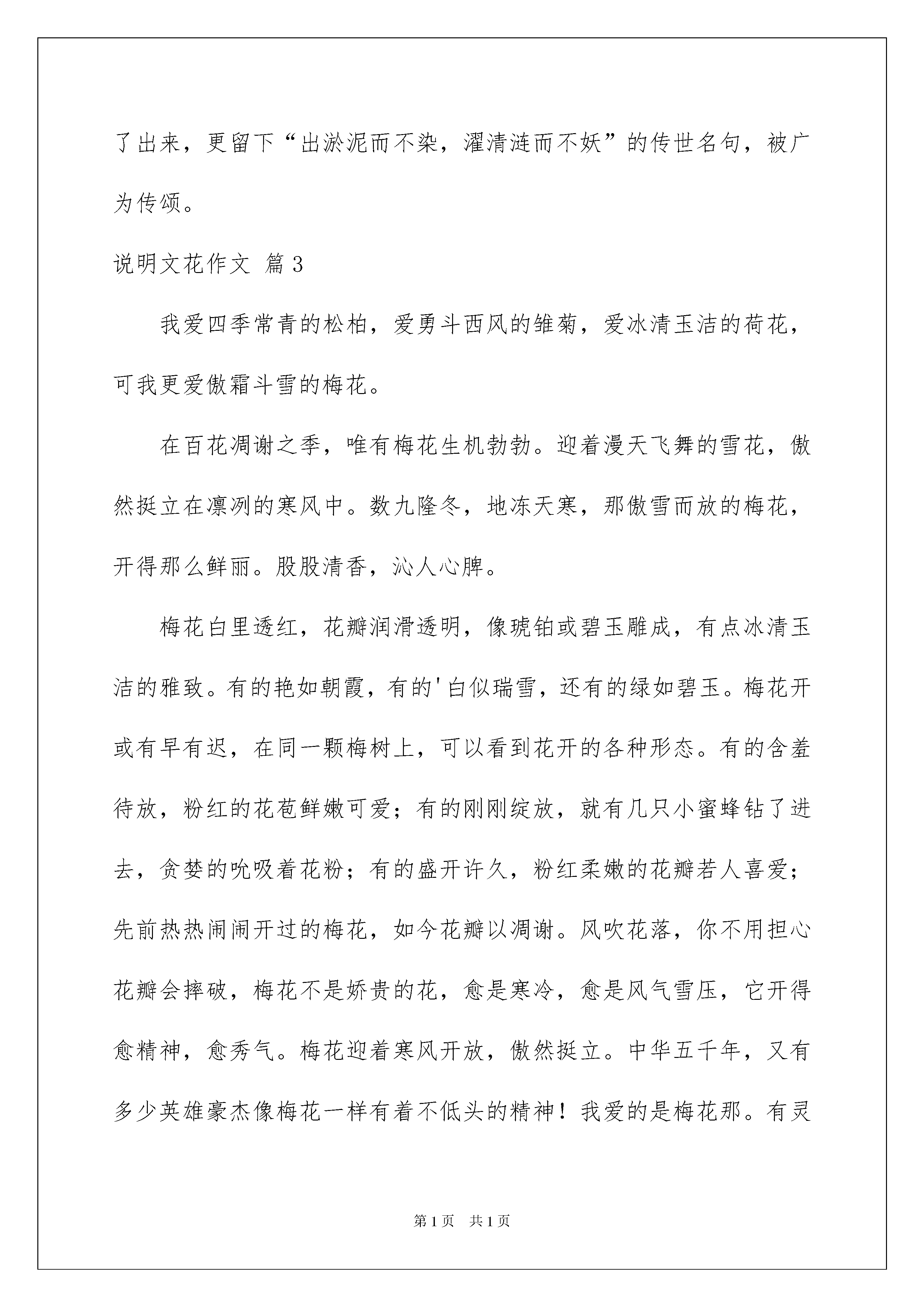 2022实用的说明文花作文3篇说明文花作文在我们平凡的日常里,大家都经常看到作文的身影吧,写作文是培养人们的观察力、联想力、想象力、思考力和记忆力的重要手段。相信写作文是一个让许多人都头痛的问题,以下是我为大家收集的说明文花作文3篇,希望对大家有所帮助。说明文花作文篇1有人喜欢亭亭玉立的荷花,有人喜欢雍容华贵的牡丹,有人喜欢小巧玲珑的兰花,但我情有独钟的是那傲雪怒放的梅花。今天上午,天气阴冷,寒气袭人,还下着小雨,我和妈妈去江边赏梅。放眼望去,成片成片的梅花像粉红色的海洋。一阵微风拂过,梅花的缕缕幽香扑鼻而来,沁人心脾,令人心旷神怡。近看,梅花树上缀满了花,一枝挨着一枝,一朵挨着一朵,一簇簇,一团团,压得枝条弯弯的,颤颤的,好像在欢迎我们到来呢!花瓣呈粉红色,形状像扇子,中间的花蕊是细细的,像几根细线,上端还长着黄色的颗粒呢!梅花有的花瓣儿全展开了,有的才展开两三片花瓣儿,像害羞的小姑娘。大雨过后,花瓣上还挂着几滴晶莹、饱满的小水珠。梅花在小水珠的衬托下,显得更加娇艳。这时,我惊奇地发现树干上落满了花瓣。靠近树干的枝条上居然也零星地长着几朵梅花,探出小脑袋,好奇地张望着外面的世界。随风洒落的梅花的花瓣,落在旁边的灌木丛上,小草堆里,石板路仿佛铺上了粉红色的地毯,美丽极了!突然,一片花瓣落了下来,在空中翩翩起舞,像一只在空中飞舞的蝴蝶。梅花具有不畏严寒的高贵品质,“若非一番寒彻骨,哪得梅花扑鼻香”这句名言讴歌的就是梅花与严寒作斗争的精神。我们应该学习梅花百折不饶的精神品质。说明文花作文篇2炎热的夏天来临了。今天天气比较凉爽,有点微风,便出来走走。走到花园,一阵淡雅的、芬芳的味道扑鼻而来。我们来到池塘边上看荷花。荷花有白色的,也有粉红色的,并没有开多少。水中的荷叶却很多,像一个个绿色的碧玉盘,浮在水面上,叶面上还有些晶莹剔透的水珠。荷叶旁,似绿翠柱的花茎从水中站立起来,头顶出水芙蓉般的荷花,微风吹拂下,茎也有些微微摇摆,活像人在点头弯腰。可是,在这一大幅荷花图里,那美丽的荷花才是主角。每一朵荷花由茎撑着,从荷叶与荷叶之间的空隙处“钻”出来,沐浴阳光,展现出了自己的美丽。有的花朵是纯白色的,朴素而洁白;有的花朵是粉红色的,高雅而娇美。如果你把荷塘、绿荷叶、各色荷花连起来看,难道不是一幅活生生的美丽画卷吗?就连唐宋八大家之一的欧阳修在游西湖看荷花是也写出了《采桑子》这首流芳百世的诗词。荷花张开花瓣,露出了黄色的莲蓬。花瓣是一层一层的,有的花瓣有点卷,而有的是顶部向外,好像在看池塘外面的风景。这么多的荷花,却有不同的姿势:有的挺直了“腰”,有的弯着腰。不管是哪种姿势,看上去都很美丽。池塘里的青蛙像在开“歌厅”,不停地发出“呱呱”的叫声;蜻蜓在水面飞来飞去,不时地点一下水,在水上荡出层层涟漪。荷花生于碧波之中,开于炎热之时,却也如此美丽,清香远溢。荷花的品种可多着呢!少说也有300种之多呢!你们知道荷花节吗?每年农历的6月24日就是一年一度的荷花节哦!荷花这种水草本植物全身是宝,莲子可当药材,藕可当食品。荷花是中国名花之一,宋代理学家周敦颐就将荷花圣洁高雅的品格渲染了出来,更留下“出淤泥而不染,濯清涟而不妖”的传世名句,被广为传颂。说明文花作文篇3我爱四季常青的松柏,爱勇斗西风的雏菊,爱冰清玉洁的荷花,可我更爱傲霜斗雪的梅花。在百花凋谢之季,唯有梅花生机勃勃。迎着漫天飞舞的雪花,傲然挺立在凛冽的寒风中。数九隆冬,地冻天寒,那傲雪而放的梅花,开得那么鲜丽。股股清香,沁人心脾。梅花白里透红,花瓣润滑透明,像琥铂或碧玉雕成,有点冰清玉洁的雅致。有的艳如朝霞,有的'白似瑞雪,还有的绿如碧玉。梅花开或有早有迟,在同一颗梅树上,可以看到花开的各种形态。有的含羞待放,粉红的花苞鲜嫩可爱;有的刚刚绽放,就有几只小蜜蜂钻了进去,贪婪的吮吸着花粉;有的盛开许久,粉红柔嫩的花瓣若人喜爱;先前热热闹闹开过的梅花,如今花瓣以凋谢。风吹花落,你不用担心花瓣会摔破,梅花不是娇贵的花,愈是寒冷,愈是风气雪压,它开得愈精神,愈秀气。梅花迎着寒风开放,傲然挺立。中华五千年,又有多少英雄豪杰像梅花一样有着不低头的精神!我爱的是梅花那。有灵魂、有骨气、有品格的精神。梅花之所以能排在“四君子”之首,正是因为这种傲雪斗霜、谦虚乐观的精神!它从不与百花争夺明媚的春天,也从不炫耀自己的美丽,它有着一副傲骨,也从不骄傲自大。每当寒冬的清晨,一股别具神韵、清逸幽雅的清香就从窗外飘来。它不仅是清雅俊逸的风度使古今诗人画家赞美它,更以它的冰肌玉骨,凌寒留香被喻为民族的精华为世人所重。梅花以它的高洁、坚强、谦虚的品格,给人立志奋发的激励。难