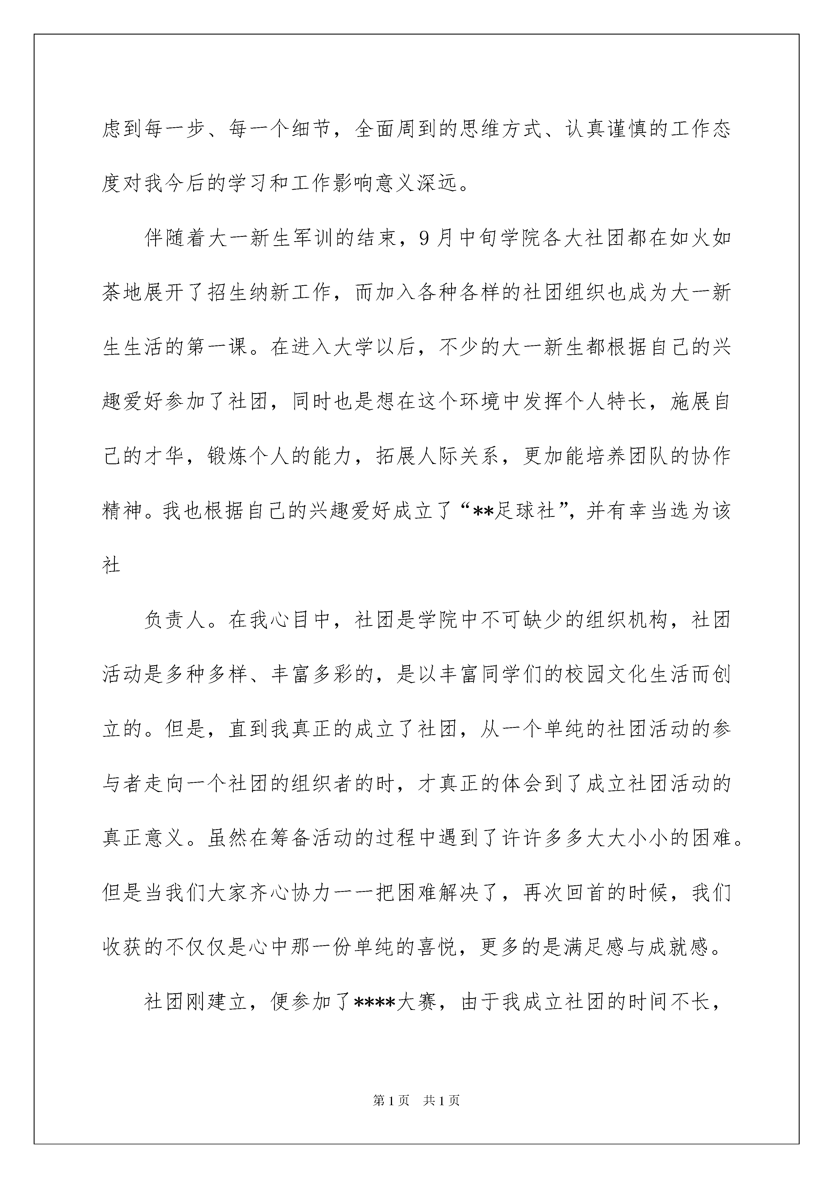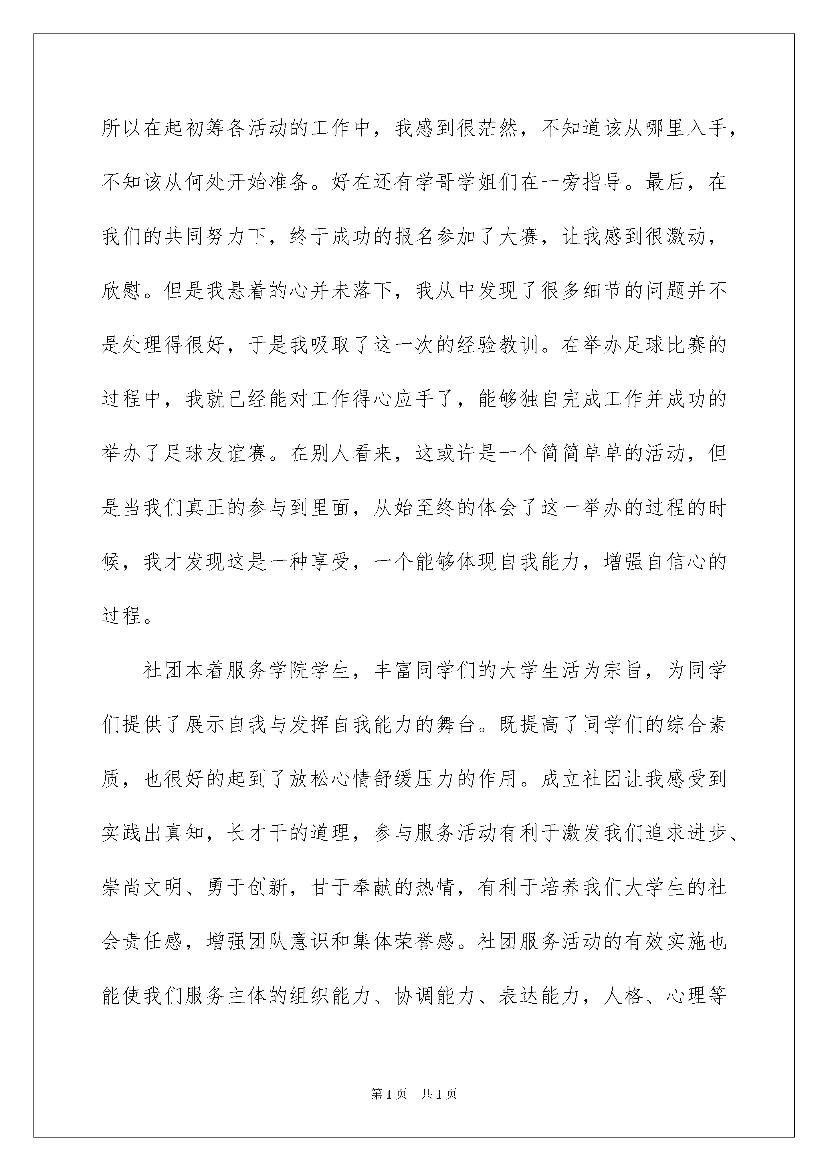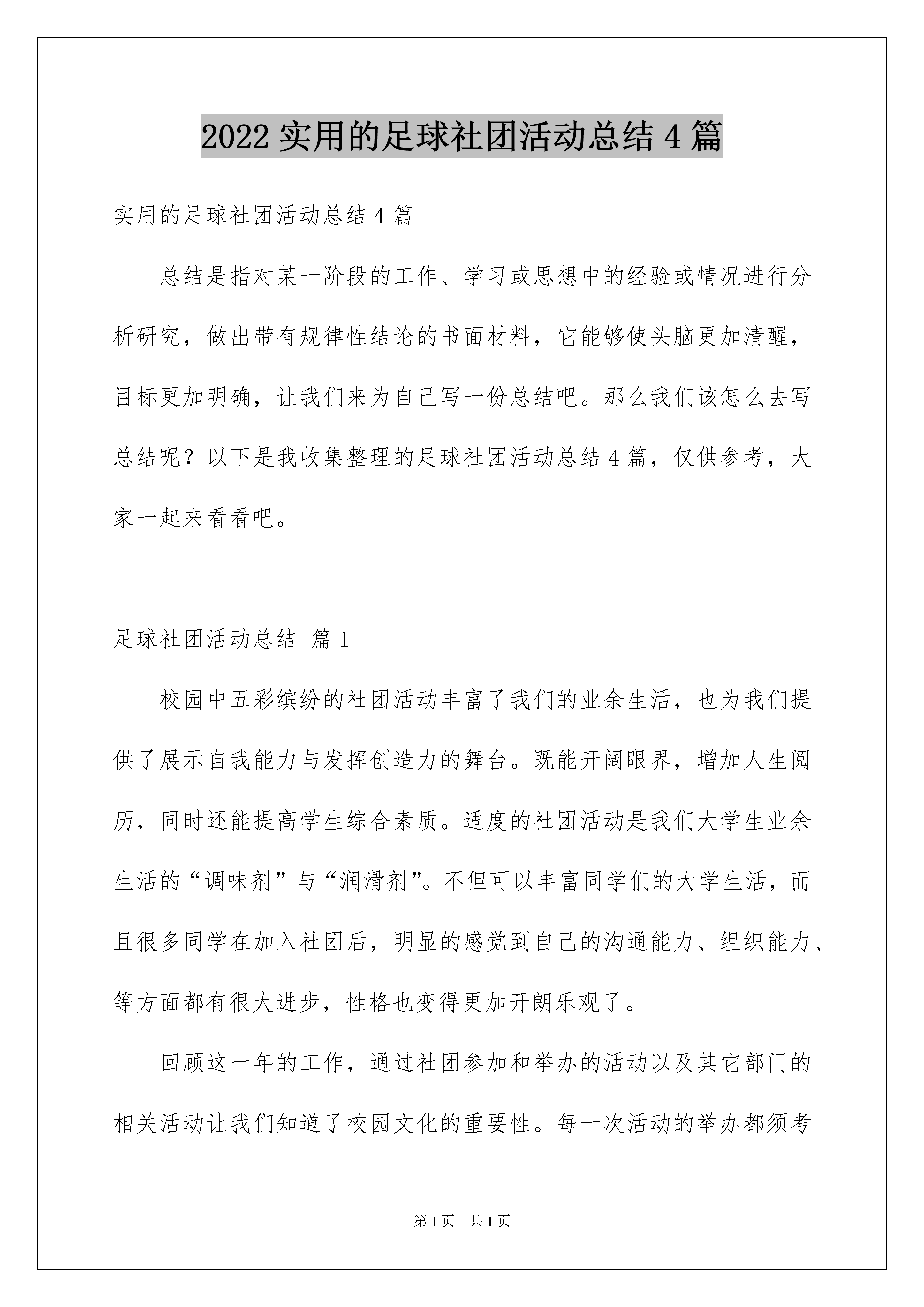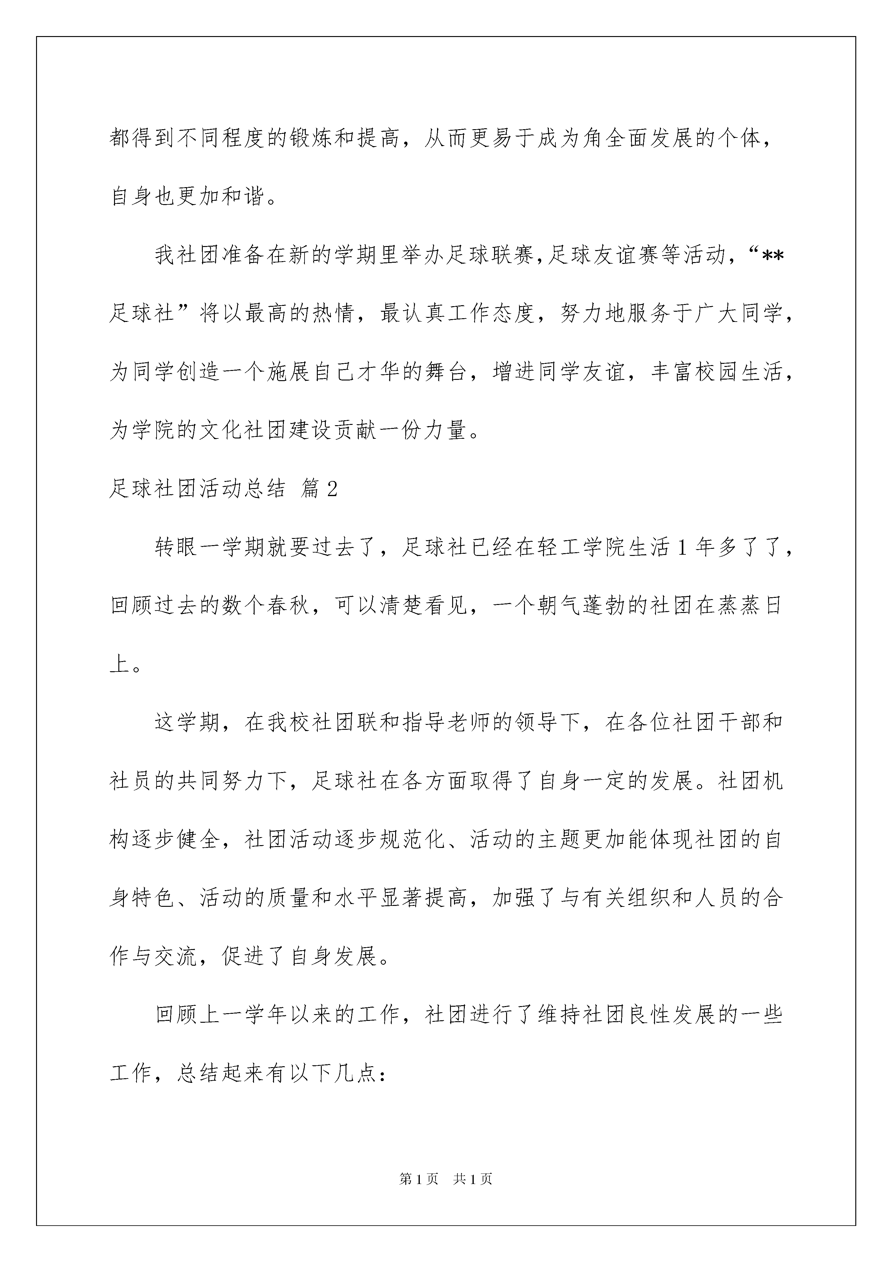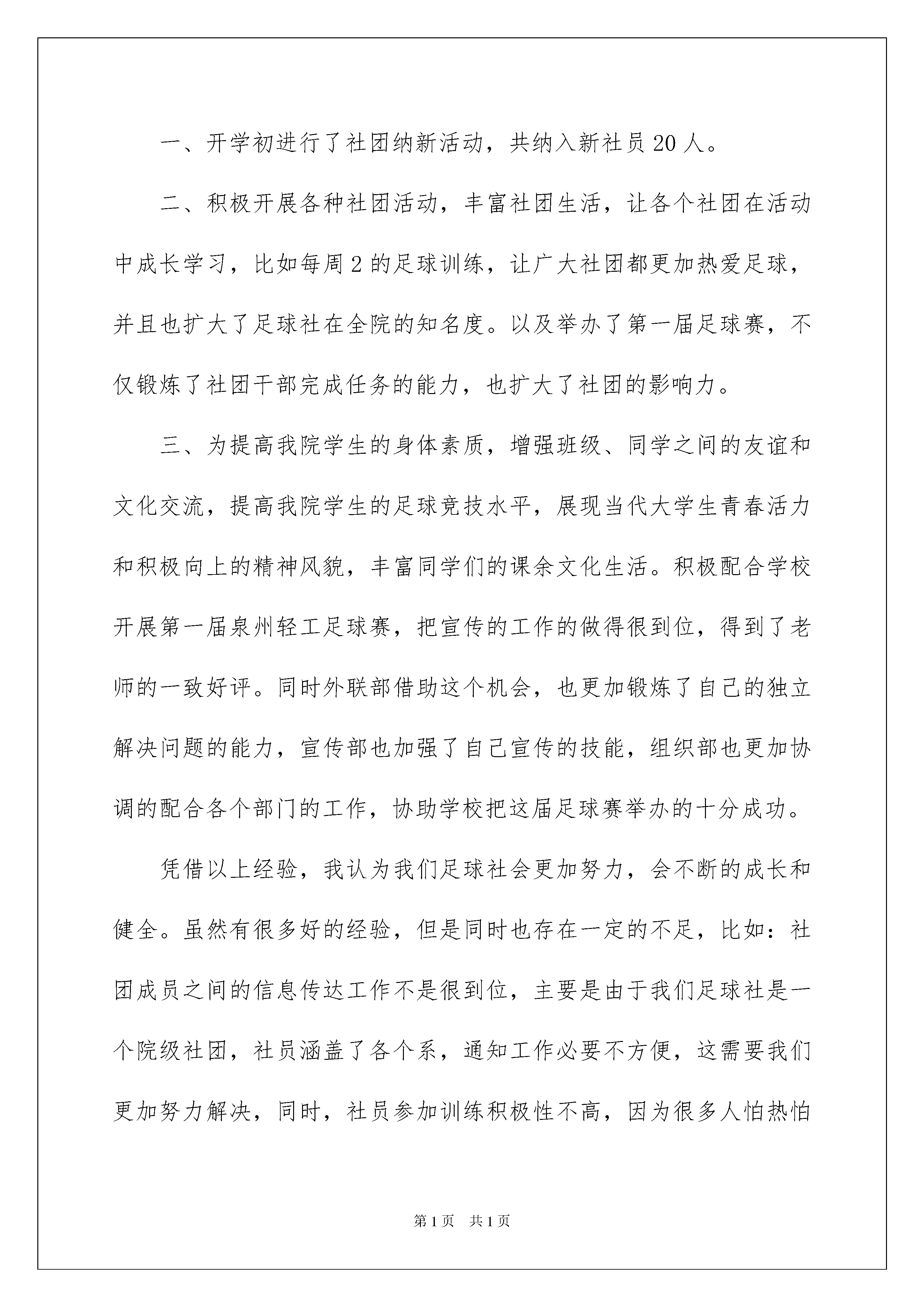 2022实用的足球社团活动总结4篇实用的足球社团活动总结4篇总结是指对某一阶段的工作、学习或思想中的经验或情况进行分析研究,做出带有规律性结论的书面材料,它能够使头脑更加清醒,目标更加明确,让我们来为自己写一份总结吧。那么我们该怎么去写总结呢?以下是我收集整理的足球社团活动总结4篇,仅供参考,大家一起来看看吧。足球社团活动总结篇1校园中五彩缤纷的社团活动丰富了我们的业余生活,也为我们提供了展示自我能力与发挥创造力的舞台。既能开阔眼界,增加人生阅历,同时还能提高学生综合素质。适度的社团活动是我们大学生业余生活的“调味剂”与“润滑剂”。不但可以丰富同学们的大学生活,而且很多同学在加入社团后,明显的感觉到自己的沟通能力、组织能力、等方面都有很大进步,性格也变得更加开朗乐观了。回顾这一年的工作,通过社团参加和举办的活动以及其它部门的相关活动让我们知道了校园文化的重要性。每一次活动的举办都须考虑到每一步、每一个细节,全面周到的思维方式、认真谨慎的工作态度对我今后的学习和工作影响意义深远。伴随着大一新生军训的结束,9月中旬学院各大社团都在如火如荼地展开了招生纳新工作,而加入各种各样的社团组织也成为大一新生生活的第一课。在进入大学以后,不少的大一新生都根据自己的兴趣爱好参加了社团,同时也是想在这个环境中发挥个人特长,施展自己的才华,锻炼个人的能力,拓展人际关系,更加能培养团队的协作精神。我也根据自己的兴趣爱好成立了“**足球社”,并有幸当选为该社负责人。在我心目中,社团是学院中不可缺少的组织机构,社团活动是多种多样、丰富多彩的,是以丰富同学们的校园文化生活而创立的。但是,直到我真正的成立了社团,从一个单纯的社团活动的参与者走向一个社团的组织者的时,才真正的体会到了成立社团活动的真正意义。虽然在筹备活动的过程中遇到了许许多多大大小小的困难。但是当我们大家齐心协力一一把困难解决了,再次回首的时候,我们收获的不仅仅是心中那一份单纯的喜悦,更多的是满足感与成就感。社团刚建立,便参加了****大赛,由于我成立社团的时间不长,所以在起初筹备活动的工作中,我感到很茫然,不知道该从哪里入手,不知该从何处开始准备。好在还有学哥学姐们在一旁指导。最后,在我们的共同努力下,终于成功的报名参加了大赛,让我感到很激动,欣慰。但是我悬着的心并未落下,我从中发现了很多细节的问题并不是处理得很好,于是我吸取了这一次的经验教训。在举办足球比赛的过程中,我就已经能对工作得心应手了,能够独自完成工作并成功的举办了足球友谊赛。在别人看来,这或许是一个简简单单的活动,但是当我们真正的参与到里面,从始至终的体会了这一举办的过程的时候,我才发现这是一种享受,一个能够体现自我能力,增强自信心的过程。社团本着服务学院学生,丰富同学们的大学生活为宗旨,为同学们提供了展示自我与发挥自我能力的舞台。既提高了同学们的综合素质,也很好的起到了放松心情舒缓压力的作用。成立社团让我感受到实践出真知,长才干的道理,参与服务活动有利于激发我们追求进步、崇尚文明、勇于创新,甘于奉献的热情,有利于培养我们大学生的社会责任感,增强团队意识和集体荣誉感。社团服务活动的有效实施也能使我们服务主体的组织能力、协调能力、表达能力,人格、心理等都得到不同程度的锻炼和提高,从而更易于成为角全面发展的个体,自身也更加和谐。我社团准备在新的学期里举办足球联赛,足球友谊赛等活动,“**足球社”将以最高的热情,最认真工作态度,努力地服务于广大同学,为同学创造一个施展自己才华的舞台,增进同学友谊,丰富校园生活,为学院的文化社团建设贡献一份力量。足球社团活动总结篇2转眼一学期就要过去了,足球社已经在轻工学院生活1年多了了,回顾过去的数个春秋,可以清楚看见,一个朝气蓬勃的社团在蒸蒸日上。这学期,在我校社团联和指导老师的领导下,在各位社团干部和社员的共同努力下,足球社在各方面取得了自身一定的发展。社团机构逐步健全,社团活动逐步规范化、活动的主题更加能体现社团的自身特色、活动的质量和水平显著提高,加强了与有关组织和人员的合作与交流,促进了自身发展。回顾上一学年以来的工作,社团进行了维持社团良性发展的一些工作,总结起来有以下几点:一、开学初进行了社团纳新活动,共纳入新社员20人。二、积极开展各种社团活动,丰富社团生活,让各个社团在活动中成长学习,比如每周2的足球训练,让广大社团都更加热爱足球,并且也扩大了足球社在全院的知名度。以及举办了第一届足球赛,不仅锻炼了社团干部完成任务的能力,也扩大了社团的影响力。三、为提高我院学生的身体素质,增强班级、同学之间的友谊和文化交流,提高我院学生的足球竞