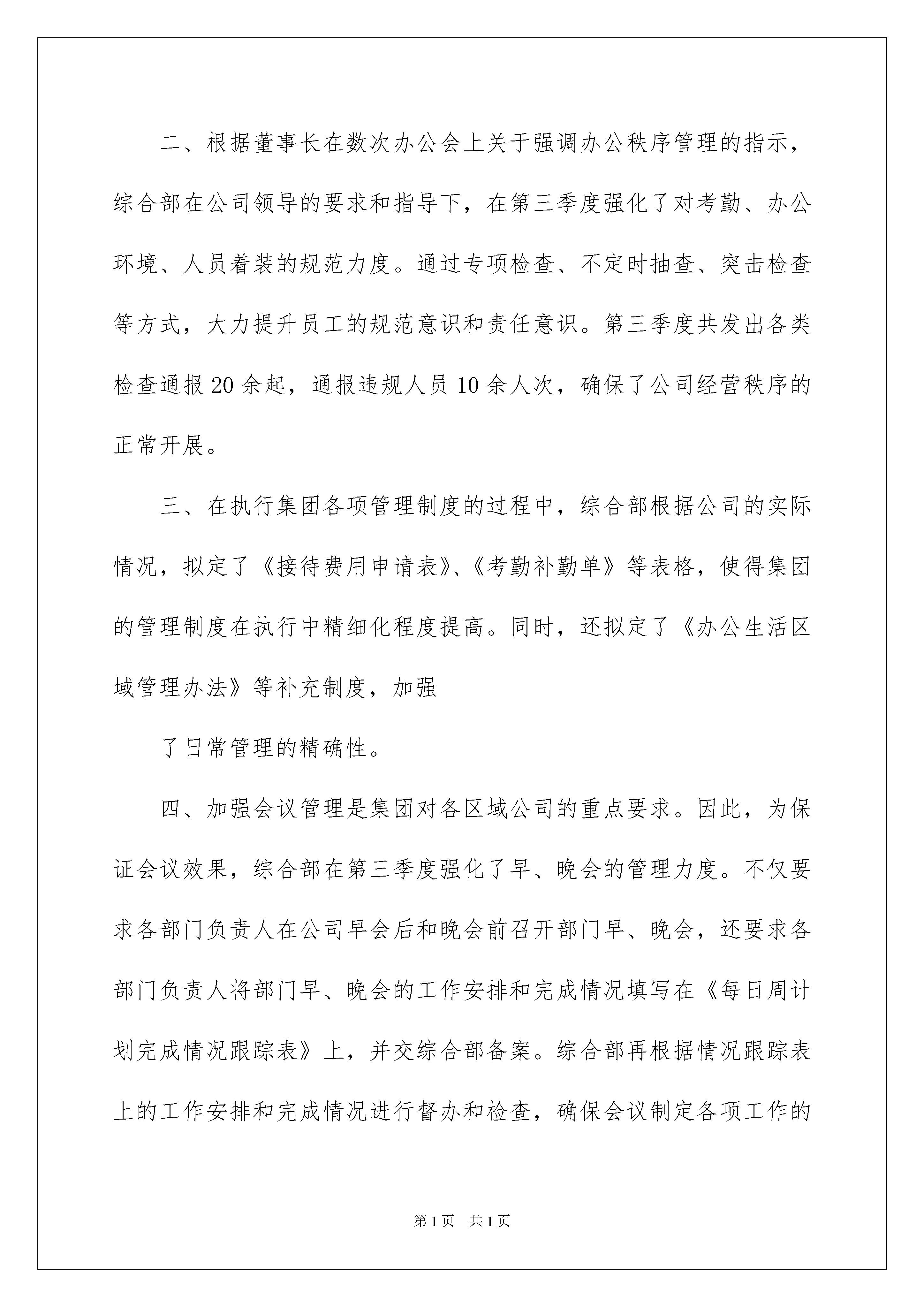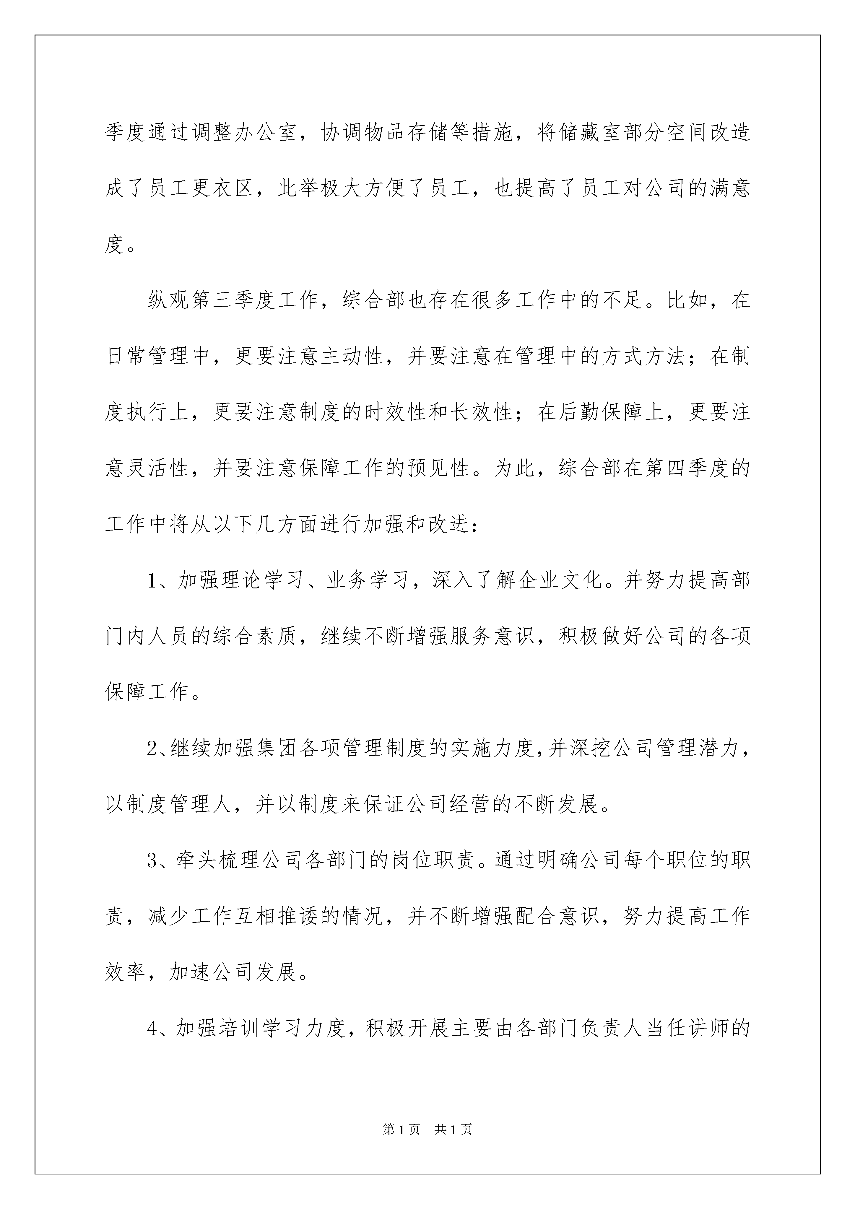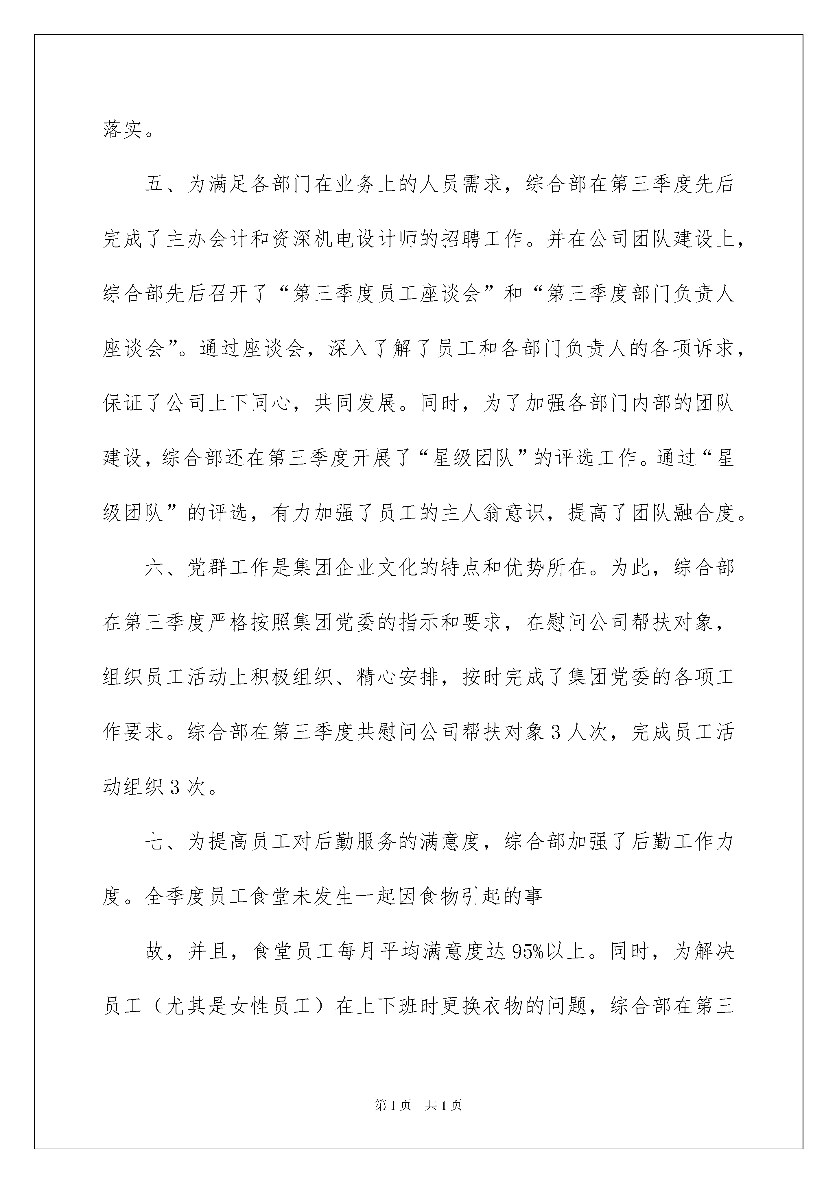 2022实用的部门工作计划集锦7篇实用的部门工作计划集锦7篇时间过得可真快,从来都不等人,我们的工作又将在忙碌中充实着,在喜悦中收获着,何不好好地做个工作计划呢?但是相信很多人都是毫无头绪的状态吧,下面是我为大家整理的部门工作计划7篇,仅供参考,欢迎大家阅读。部门工作计划篇1在公司领导的精心指导下,在相关部门的大力配合下,综合部在第三季度顺利完成了细化管理制度、强化办公秩序规范、深化业务培训、大力加强后勤保障等工作。现将第三季度工作总结汇报如下:一、为进一步加强经营效果,以生产促发展,集团在第三季度实行了新的计划管理考核模式和体系。为此,综合部在严格按集团制定的考核标准进行考核的同时,也结合区域公司自行考核的实际情况,拟定了《综合考核扣分细则》和《绩效考核分解细则》。通过细则,使得计划管理考核更能真实反映每位员工的工作情况,有力促进了公司各项经营活动的正常开展。二、根据董事长在数次办公会上关于强调办公秩序管理的指示,综合部在公司领导的要求和指导下,在第三季度强化了对考勤、办公环境、人员着装的规范力度。通过专项检查、不定时抽查、突击检查等方式,大力提升员工的规范意识和责任意识。第三季度共发出各类检查通报20余起,通报违规人员10余人次,确保了公司经营秩序的正常开展。三、在执行集团各项管理制度的过程中,综合部根据公司的实际情况,拟定了《接待费用申请表》、《考勤补勤单》等表格,使得集团的管理制度在执行中精细化程度提高。同时,还拟定了《办公生活区域管理办法》等补充制度,加强了日常管理的精确性。四、加强会议管理是集团对各区域公司的重点要求。因此,为保证会议效果,综合部在第三季度强化了早、晚会的管理力度。不仅要求各部门负责人在公司早会后和晚会前召开部门早、晚会,还要求各部门负责人将部门早、晚会的工作安排和完成情况填写在《每日周计划完成情况跟踪表》上,并交综合部备案。综合部再根据情况跟踪表上的工作安排和完成情况进行督办和检查,确保会议制定各项工作的落实。五、为满足各部门在业务上的人员需求,综合部在第三季度先后完成了主办会计和资深机电设计师的招聘工作。并在公司团队建设上,综合部先后召开了“第三季度员工座谈会”和“第三季度部门负责人座谈会”。通过座谈会,深入了解了员工和各部门负责人的各项诉求,保证了公司上下同心,共同发展。同时,为了加强各部门内部的团队建设,综合部还在第三季度开展了“星级团队”的评选工作。通过“星级团队”的评选,有力加强了员工的主人翁意识,提高了团队融合度。六、党群工作是集团企业文化的特点和优势所在。为此,综合部在第三季度严格按照集团党委的指示和要求,在慰问公司帮扶对象,组织员工活动上积极组织、精心安排,按时完成了集团党委的各项工作要求。综合部在第三季度共慰问公司帮扶对象3人次,完成员工活动组织3次。七、为提高员工对后勤服务的满意度,综合部加强了后勤工作力度。全季度员工食堂未发生一起因食物引起的事故,并且,食堂员工每月平均满意度达95%以上。同时,为解决员工(尤其是女性员工)在上下班时更换衣物的问题,综合部在第三季度通过调整办公室,协调物品存储等措施,将储藏室部分空间改造成了员工更衣区,此举极大方便了员工,也提高了员工对公司的满意度。纵观第三季度工作,综合部也存在很多工作中的不足。比如,在日常管理中,更要注意主动性,并要注意在管理中的方式方法;在制度执行上,更要注意制度的时效性和长效性;在后勤保障上,更要注意灵活性,并要注意保障工作的预见性。为此,综合部在第四季度的工作中将从以下几方面进行加强和改进:1、加强理论学习、业务学习,深入了解企业文化。并努力提高部门内人员的综合素质,继续不断增强服务意识,积极做好公司的各项保障工作。2、继续加强集团各项管理制度的实施力度,并深挖公司管理潜力,以制度管理人,并以制度来保证公司经营的不断发展。3、牵头梳理公司各部门的岗位职责。通过明确公司每个职位的职责,减少工作互相推诿的情况,并不断增强配合意识,努力提高工作效率,加速公司发展。4、加强培训学习力度,积极开展主要由各部门负责人当任讲师的“锦鸥百家谈”活动。通过部门负责人在培训活动中的积极参与,促进公司良好学习氛围的形成,从而提高各部门员工的培训学习效果。5、积极做好自查自纠和和查遗补漏工作,及时对工作过程中出现的问题进行更正和处理,使综合部成为既坚持原则、又讲风格,服务周到、办事高效的部门。部门工作计划篇2回顾年,在公司领导的正确领导下,我们的工作着重于公司的经营方针、宗旨和效益目标上,紧紧围绕重点展开工作,紧跟公司各项工作部署。在管理方面尽到了应尽的责任。为了总结经验,继续发扬成绩同