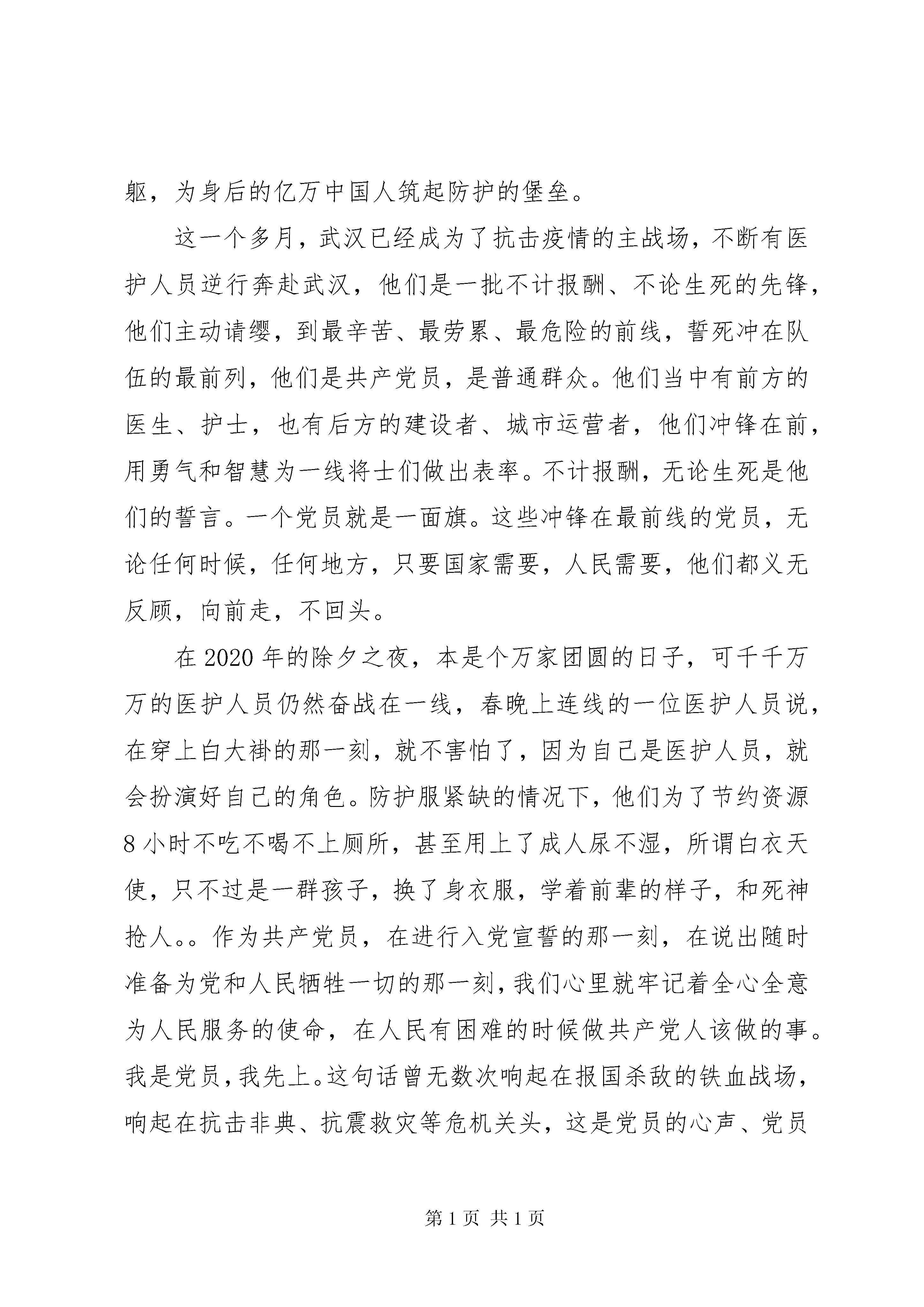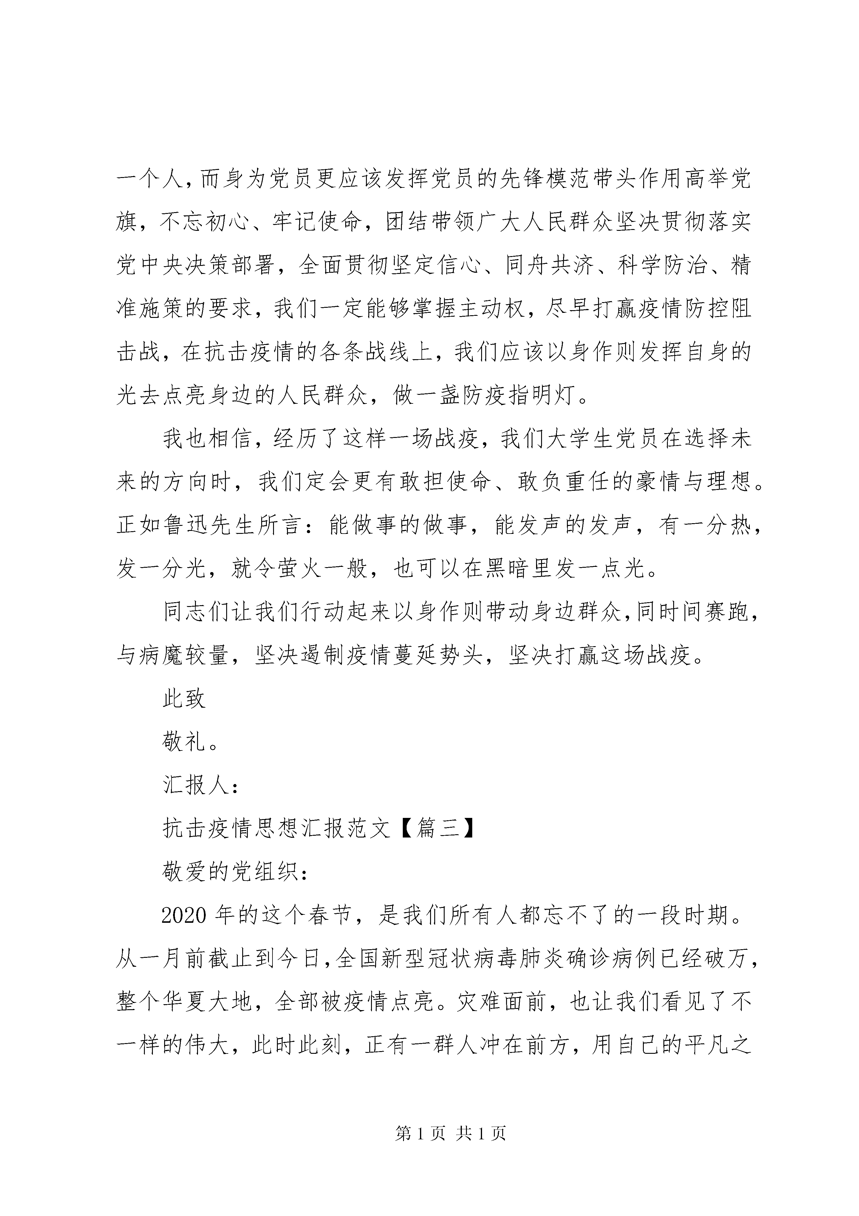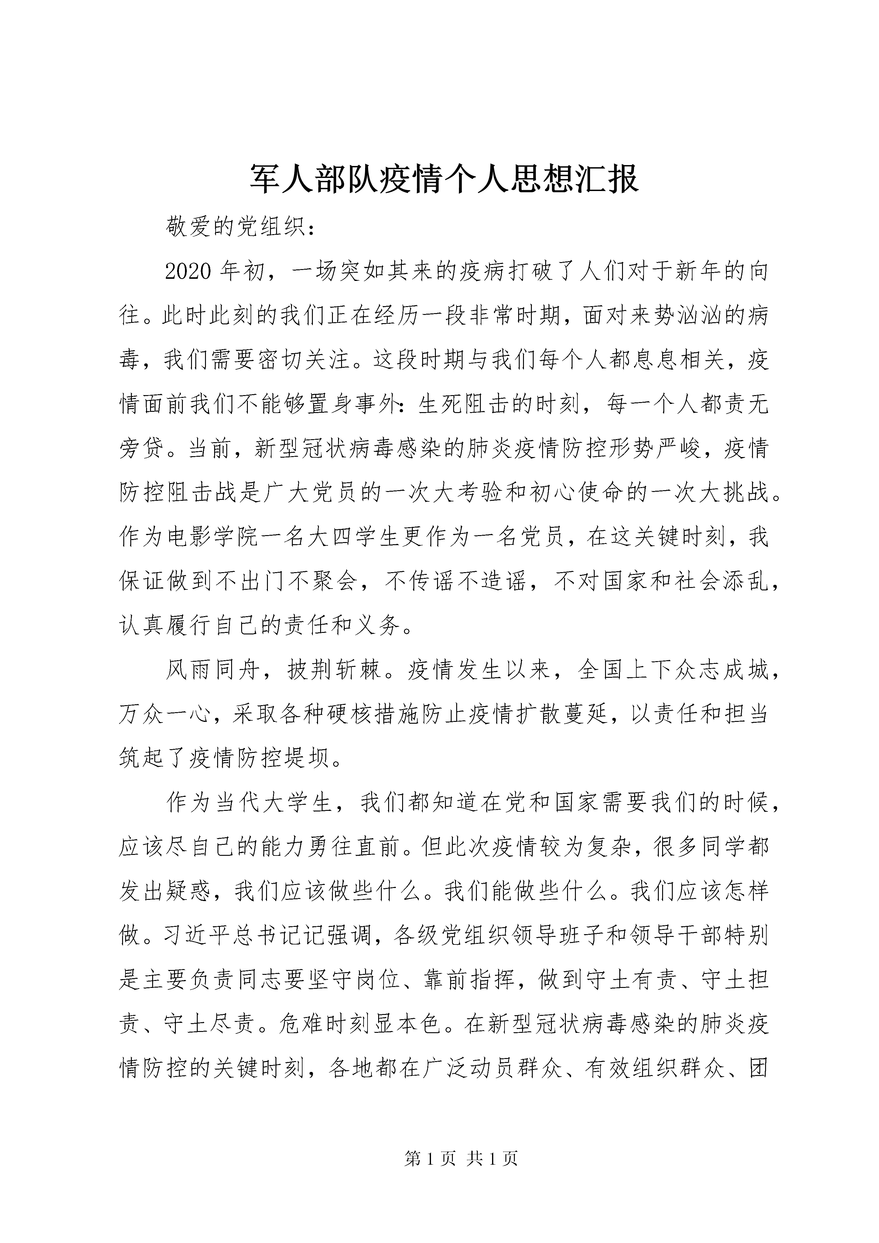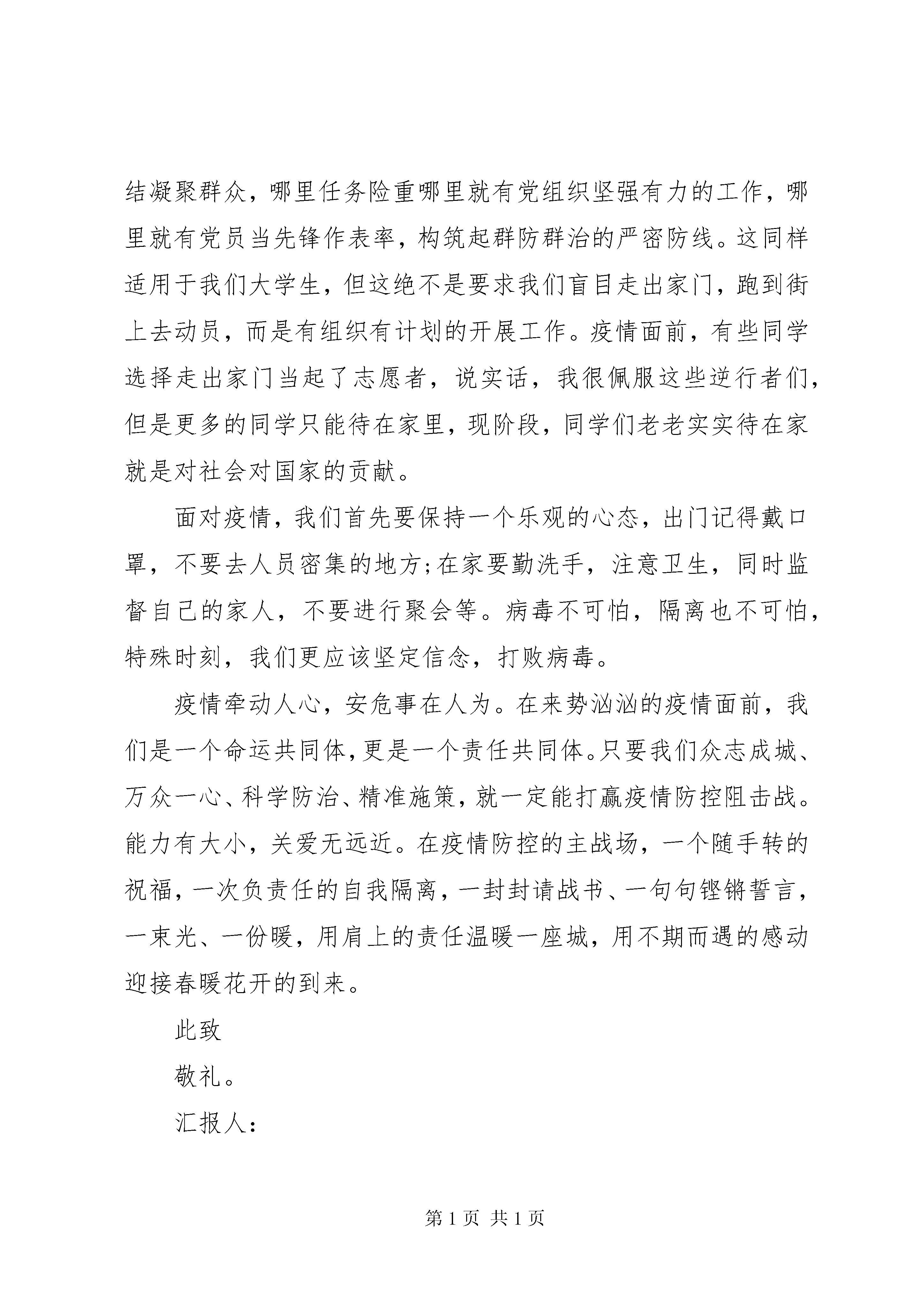 军人部队疫情个人思想汇报敬爱的党组织:2020年初,一场突如其来的疫病打破了人们对于新年的向往。此时此刻的我们正在经历一段非常时期,面对来势汹汹的病毒,我们需要密切关注。这段时期与我们每个人都息息相关,疫情面前我们不能够置身事外:生死阻击的时刻,每一个人都责无旁贷。当前,新型冠状病毒感染的肺炎疫情防控形势严峻,疫情防控阻击战是广大党员的一次大考验和初心使命的一次大挑战。作为电影学院一名大四学生更作为一名党员,在这关键时刻,我保证做到不出门不聚会,不传谣不造谣,不对国家和社会添乱,认真履行自己的责任和义务。风雨同舟,披荆斩棘。疫情发生以来,全国上下众志成城,万众一心,采取各种硬核措施防止疫情扩散蔓延,以责任和担当筑起了疫情防控堤坝。作为当代大学生,我们都知道在党和国家需要我们的时候,应该尽自己的能力勇往直前。但此次疫情较为复杂,很多同学都发出疑惑,我们应该做些什么。我们能做些什么。我们应该怎样做。习近平总书记记强调,各级党组织领导班子和领导干部特别是主要负责同志要坚守岗位、靠前指挥,做到守土有责、守土担责、守土尽责。危难时刻显本色。在新型冠状病毒感染的肺炎疫情防控的关键时刻,各地都在广泛动员群众、有效组织群众、团结凝聚群众,哪里任务险重哪里就有党组织坚强有力的工作,哪里就有党员当先锋作表率,构筑起群防群治的严密防线。这同样适用于我们大学生,但这绝不是要求我们盲目走出家门,跑到街上去动员,而是有组织有计划的开展工作。疫情面前,有些同学选择走出家门当起了志愿者,说实话,我很佩服这些逆行者们,但是更多的同学只能待在家里,现阶段,同学们老老实实待在家就是对社会对国家的贡献。面对疫情,我们首先要保持一个乐观的心态,出门记得戴口罩,不要去人员密集的地方;在家要勤洗手,注意卫生,同时监督自己的家人,不要进行聚会等。病毒不可怕,隔离也不可怕,特殊时刻,我们更应该坚定信念,打败病毒。疫情牵动人心,安危事在人为。在来势汹汹的疫情面前,我们是一个命运共同体,更是一个责任共同体。只要我们众志成城、万众一心、科学防治、精准施策,就一定能打赢疫情防控阻击战。能力有大小,关爱无远近。在疫情防控的主战场,一个随手转的祝福,一次负责任的自我隔离,一封封请战书、一句句铿锵誓言,一束光、一份暖,用肩上的责任温暖一座城,用不期而遇的感动迎接春暖花开的到来。此致敬礼。汇报人:抗击疫情思想汇报范文【篇二】敬爱的党组织:一场突如其来的疫情打破了庚子年春节的平静,时至今日,这场疫情防控阻击战形势仍十分严峻,作为一名党员我时时刻刻在关注着疫情的发展,现将我近来的思想以及所做工作向党组织汇报。习近平总书记记1月27日再次作出重要指示,强调各级党委(党组),各级领导班子和领导干部、基层党组织和广大党员要不忘初心、牢记使命,团结带领广大人民群众坚定不移把党中央决策部署落到实处,坚决打赢疫情防控阻击战,作为一名党员积极响应党组织号召虽不能亲临防疫一线,但深知疫情就是命令,防控就是责任,关键时刻挺立关键英雄,紧急形势检验党性担当,身为一名党员,我的第一反应就是调动家里人积极的以通信的方式跟身边的亲戚朋友做疏导并告诫身边人民群众要相信科学相信党,积极防控,勤洗手,不出屋,不信谣,不传谣,积极做好基层人民该做的事。并尽个人努力调动身边的基层人员,发挥主动能动性,尽能力告诫身边人民群众要听从社区命令,不随意走动出门,作为一名党员就应该担当尽责,必须当好维护社会稳定的先锋者,从加强联防联控到加强舆论引导,增强身边人民群众抗击疫情、战胜疫情的决心和信心,确保社会安定有序。这是一场没有硝烟的战争,而抗击这场战争的战士是我们每一个人,而身为党员更应该发挥党员的先锋模范带头作用高举党旗,不忘初心、牢记使命,团结带领广大人民群众坚决贯彻落实党中央决策部署,全面贯彻坚定信心、同舟共济、科学防治、精准施策的要求,我们一定能够掌握主动权,尽早打赢疫情防控阻击战,在抗击疫情的各条战线上,我们应该以身作则发挥自身的光去点亮身边的人民群众,做一盏防疫指明灯。我也相信,经历了这样一场战疫,我们大学生党员在选择未来的方向时,我们定会更有敢担使命、敢负重任的豪情与理想。正如鲁迅先生所言:能做事的做事,能发声的发声,有一分热,发一分光,就令萤火一般,也可以在黑暗里发一点光。同志们让我们行动起来以身作则带动身边群众,同时间赛跑,与病魔较量,坚决遏制疫情蔓延势头,坚决打赢这场战疫。此致敬礼。汇报人:抗击疫情思想汇报范文【篇三】敬爱的党组织:2020年的这个春节,是我们所有人都忘不了的一段时期。从一月前截止到今日,全国新型冠状病毒肺炎确诊病例已经破万,整个华夏大地,全部被疫情点亮。灾难面前,也让我们看见了不一样的伟大,此时此刻,正有一群人冲在前方,用自己的平凡之躯,为身后的亿万中国人筑起防护的堡垒。这一个