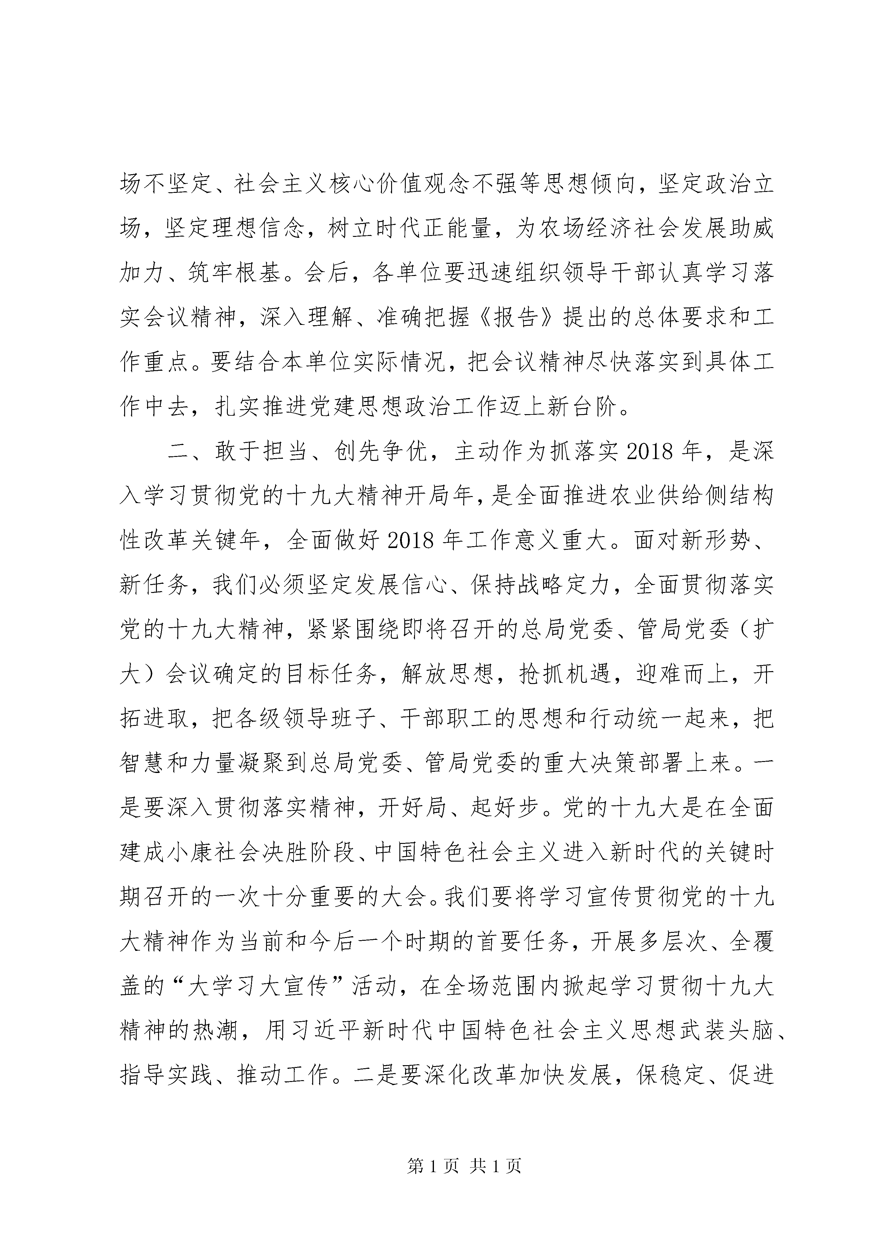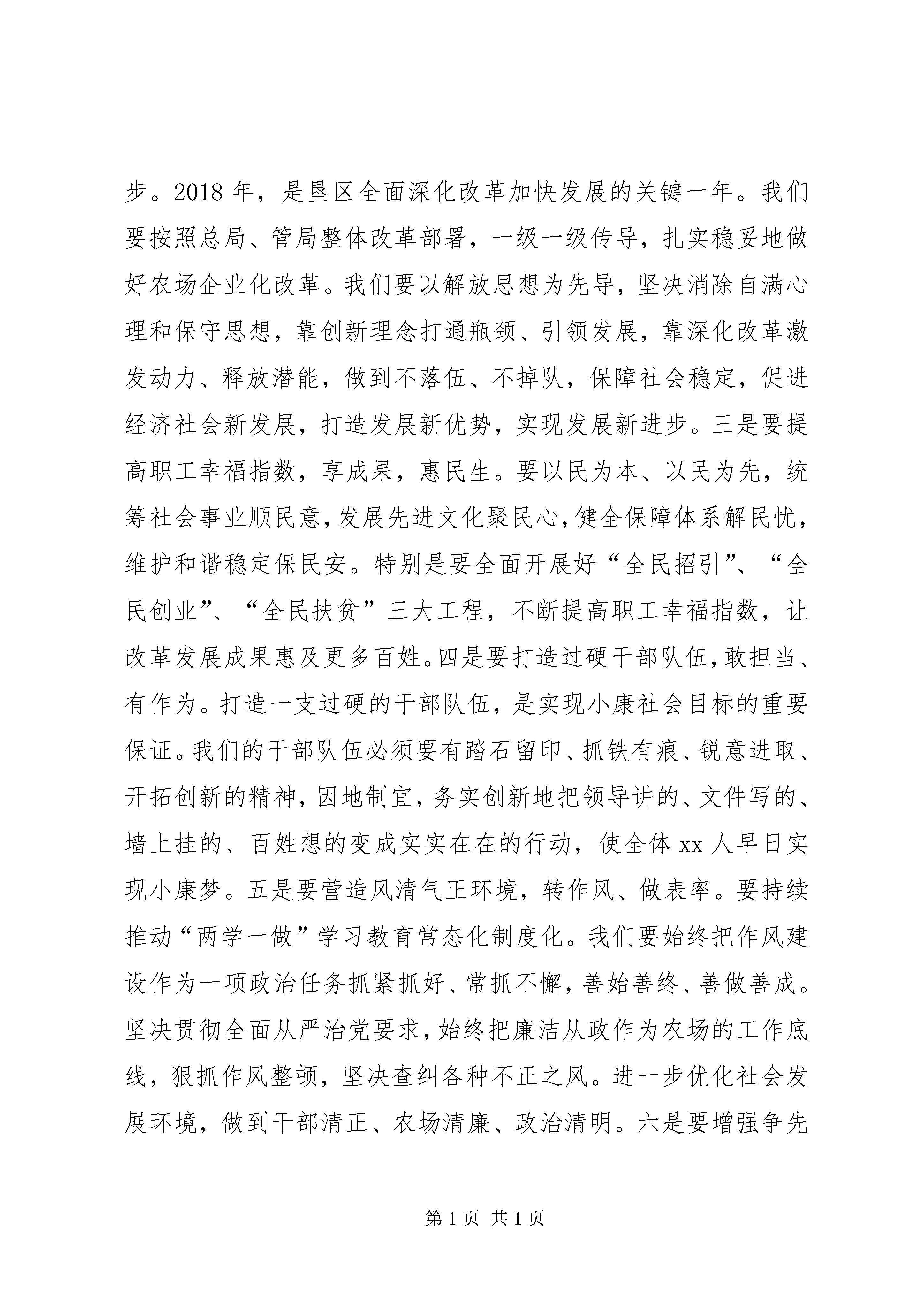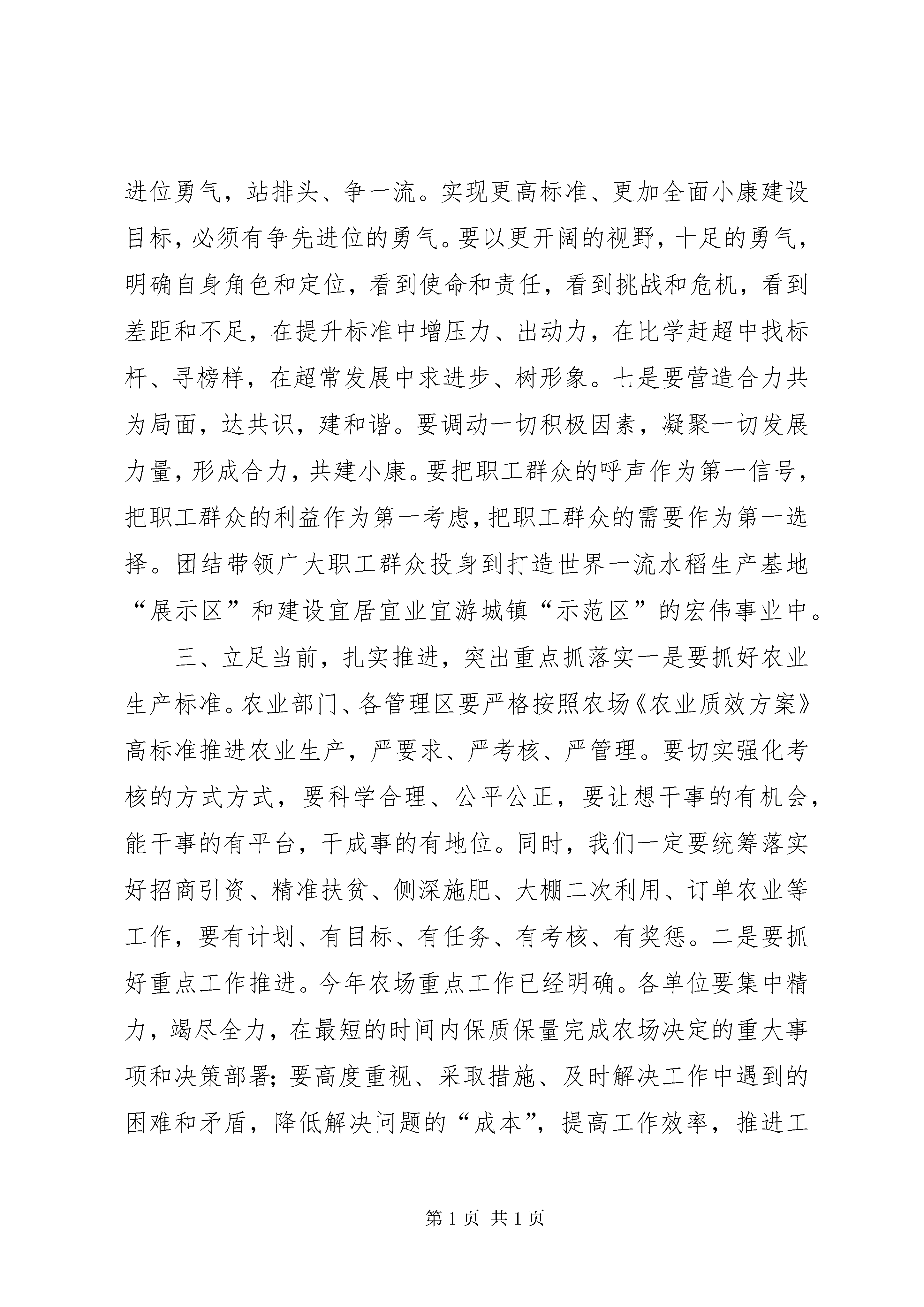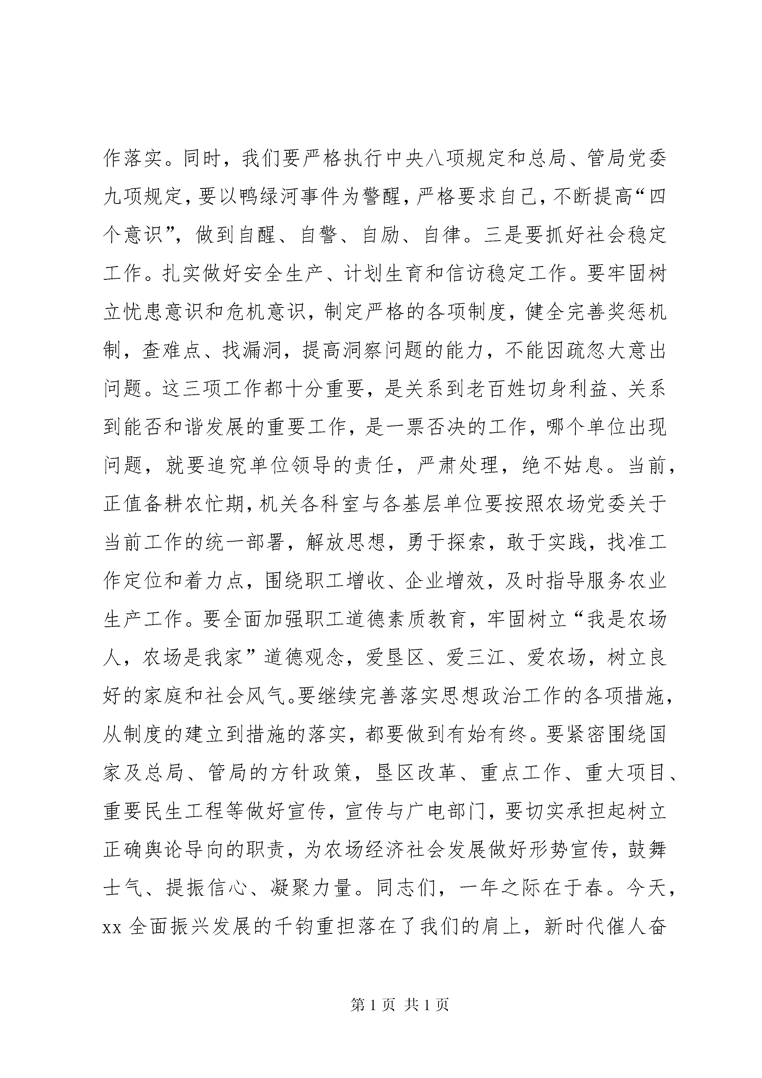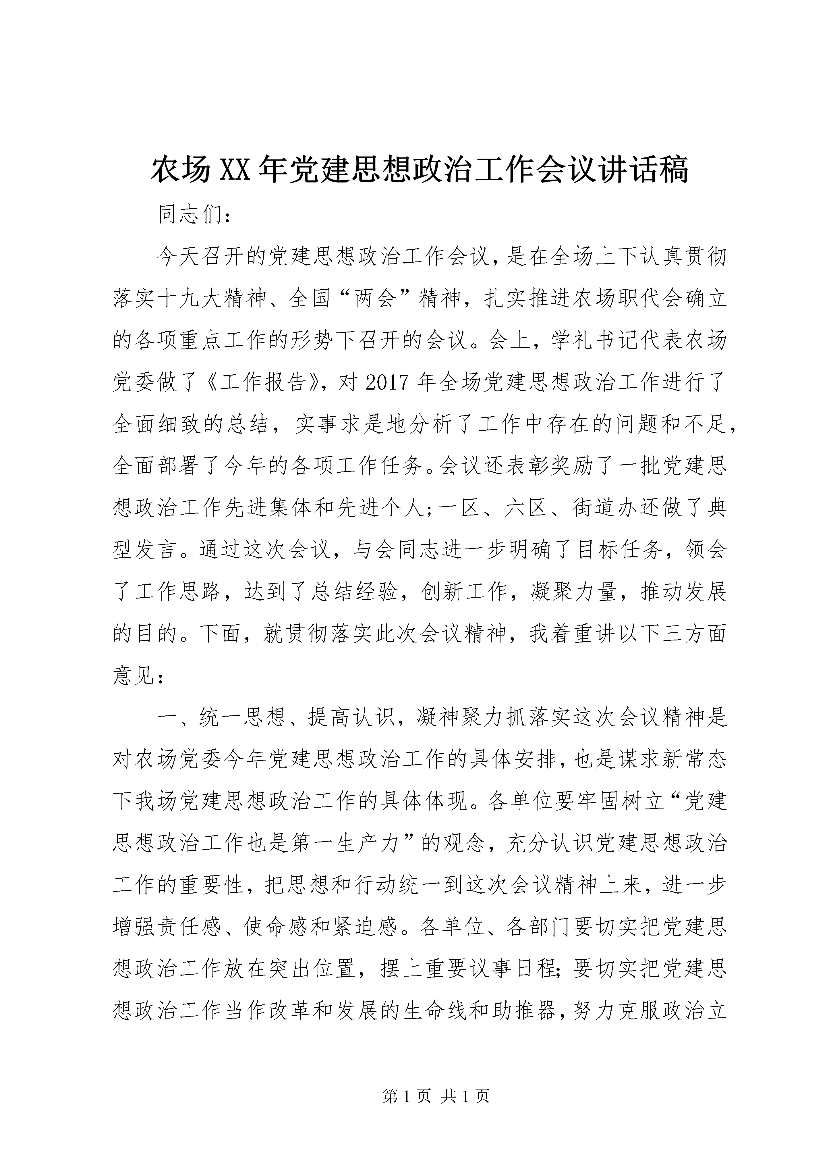 农场XX年党建思想政治工作会议讲话稿同志们:今天召开的党建思想政治工作会议,是在全场上下认真贯彻落实十九大精神、全国“两会”精神,扎实推进农场职代会确立的各项重点工作的形势下召开的会议。会上,学礼书记代表农场党委做了《工作报告》,对2017年全场党建思想政治工作进行了全面细致的总结,实事求是地分析了工作中存在的问题和不足,全面部署了今年的各项工作任务。会议还表彰奖励了一批党建思想政治工作先进集体和先进个人;一区、六区、街道办还做了典型发言。通过这次会议,与会同志进一步明确了目标任务,领会了工作思路,达到了总结经验,创新工作,凝聚力量,推动发展的目的。下面,就贯彻落实此次会议精神,我着重讲以下三方面意见:一、统一思想、提高认识,凝神聚力抓落实这次会议精神是对农场党委今年党建思想政治工作的具体安排,也是谋求新常态下我场党建思想政治工作的具体体现。各单位要牢固树立“党建思想政治工作也是第一生产力”的观念,充分认识党建思想政治工作的重要性,把思想和行动统一到这次会议精神上来,进一步增强责任感、使命感和紧迫感。各单位、各部门要切实把党建思想政治工作放在突出位置,摆上重要议事日程;要切实把党建思想政治工作当作改革和发展的生命线和助推器,努力克服政治立场不坚定、社会主义核心价值观念不强等思想倾向,坚定政治立场,坚定理想信念,树立时代正能量,为农场经济社会发展助威加力、筑牢根基。会后,各单位要迅速组织领导干部认真学习落实会议精神,深入理解、准确把握《报告》提出的总体要求和工作重点。要结合本单位实际情况,把会议精神尽快落实到具体工作中去,扎实推进党建思想政治工作迈上新台阶。二、敢于担当、创先争优,主动作为抓落实2018年,是深入学习贯彻党的十九大精神开局年,是全面推进农业供给侧结构性改革关键年,全面做好2018年工作意义重大。面对新形势、新任务,我们必须坚定发展信心、保持战略定力,全面贯彻落实党的十九大精神,紧紧围绕即将召开的总局党委、管局党委(扩大)会议确定的目标任务,解放思想,抢抓机遇,迎难而上,开拓进取,把各级领导班子、干部职工的思想和行动统一起来,把智慧和力量凝聚到总局党委、管局党委的重大决策部署上来。一是要深入贯彻落实精神,开好局、起好步。党的十九大是在全面建成小康社会决胜阶段、中国特色社会主义进入新时代的关键时期召开的一次十分重要的大会。我们要将学习宣传贯彻党的十九大精神作为当前和今后一个时期的首要任务,开展多层次、全覆盖的“大学习大宣传”活动,在全场范围内掀起学习贯彻十九大精神的热潮,用习近平新时代中国特色社会主义思想武装头脑、指导实践、推动工作。二是要深化改革加快发展,保稳定、促进步。2018年,是垦区全面深化改革加快发展的关键一年。我们要按照总局、管局整体改革部署,一级一级传导,扎实稳妥地做好农场企业化改革。我们要以解放思想为先导,坚决消除自满心理和保守思想,靠创新理念打通瓶颈、引领发展,靠深化改革激发动力、释放潜能,做到不落伍、不掉队,保障社会稳定,促进经济社会新发展,打造发展新优势,实现发展新进步。三是要提高职工幸福指数,享成果,惠民生。要以民为本、以民为先,统筹社会事业顺民意,发展先进文化聚民心,健全保障体系解民忧,维护和谐稳定保民安。特别是要全面开展好“全民招引”、“全民创业”、“全民扶贫”三大工程,不断提高职工幸福指数,让改革发展成果惠及更多百姓。四是要打造过硬干部队伍,敢担当、有作为。打造一支过硬的干部队伍,是实现小康社会目标的重要保证。我们的干部队伍必须要有踏石留印、抓铁有痕、锐意进取、开拓创新的精神,因地制宜,务实创新地把领导讲的、文件写的、墙上挂的、百姓想的变成实实在在的行动,使全体xx人早日实现小康梦。五是要营造风清气正环境,转作风、做表率。要持续推动“两学一做”学习教育常态化制度化。我们要始终把作风建设作为一项政治任务抓紧抓好、常抓不懈,善始善终、善做善成。坚决贯彻全面从严治党要求,始终把廉洁从政作为农场的工作底线,狠抓作风整顿,坚决查纠各种不正之风。进一步优化社会发展环境,做到干部清正、农场清廉、政治清明。六是要增强争先进位勇气,站排头、争一流。实现更高标准、更加全面小康建设目标,必须有争先进位的勇气。要以更开阔的视野,十足的勇气,明确自身角色和定位,看到使命和责任,看到挑战和危机,看到差距和不足,在提升标准中增压力、出动力,在比学赶超中找标杆、寻榜样,在超常发展中求进步、树形象。七是要营造合力共为局面,达共识,建和谐。要调动一切积极因素,凝聚一切发展力量,形成合力,共建小康。要把职工群众的呼声作为第一信号,把职工群众的利益作为第一考虑,把职工群众的需要作为第一选择。团结带领广大职工群众投身到打造世界一流水稻生产基地“展示区”和建设宜居宜业宜游城镇“示范区”的宏伟事业中。三、立