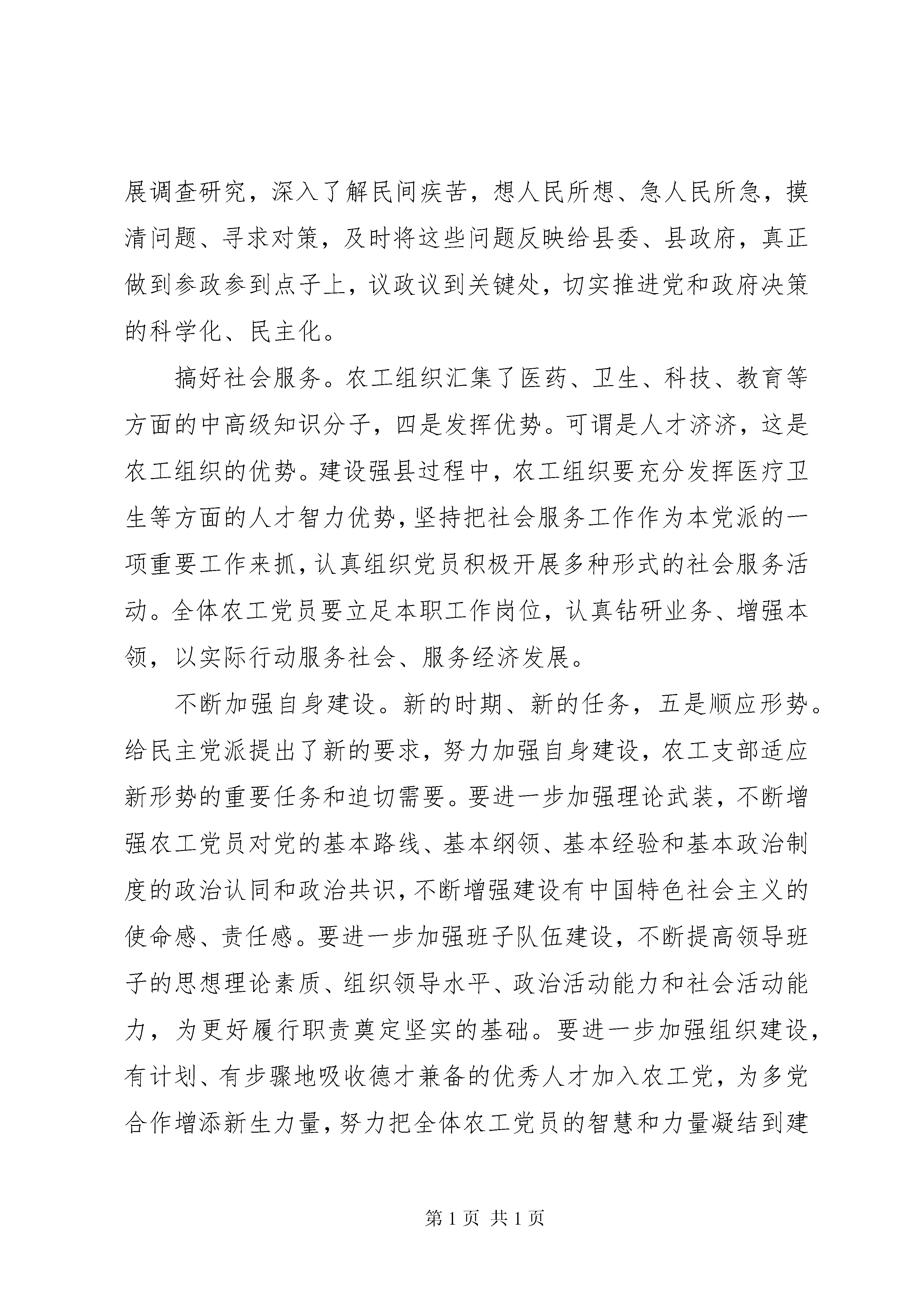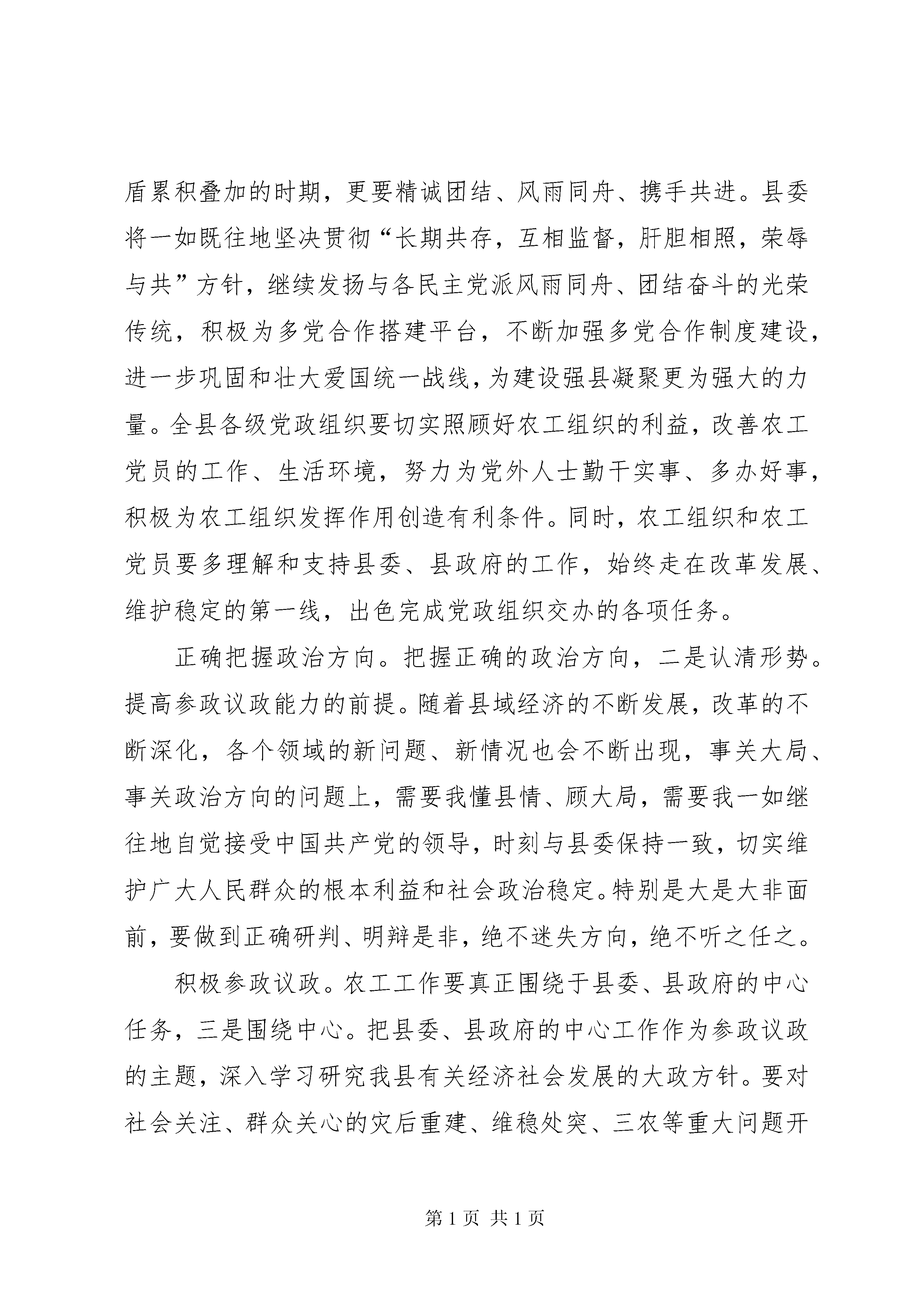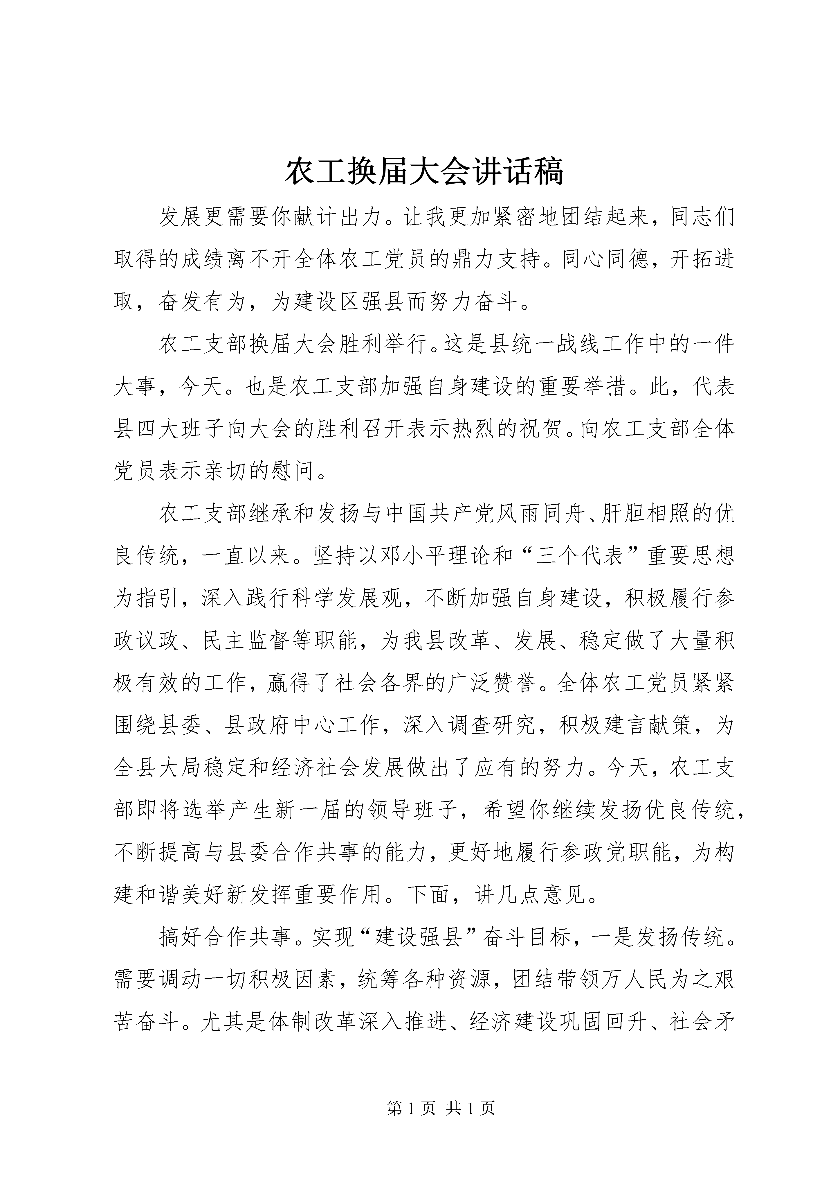 农工换届大会讲话稿发展更需要你献计出力。让我更加紧密地团结起来,同志们取得的成绩离不开全体农工党员的鼎力支持。同心同德,开拓进取,奋发有为,为建设区强县而努力奋斗。农工支部换届大会胜利举行。这是县统一战线工作中的一件大事,今天。也是农工支部加强自身建设的重要举措。此,代表县四大班子向大会的胜利召开表示热烈的祝贺。向农工支部全体党员表示亲切的慰问。农工支部继承和发扬与中国共产党风雨同舟、肝胆相照的优良传统,一直以来。坚持以邓小平理论和“三个代表”重要思想为指引,深入践行科学发展观,不断加强自身建设,积极履行参政议政、民主监督等职能,为我县改革、发展、稳定做了大量积极有效的工作,赢得了社会各界的广泛赞誉。全体农工党员紧紧围绕县委、县政府中心工作,深入调查研究,积极建言献策,为全县大局稳定和经济社会发展做出了应有的努力。今天,农工支部即将选举产生新一届的领导班子,希望你继续发扬优良传统,不断提高与县委合作共事的能力,更好地履行参政党职能,为构建和谐美好新发挥重要作用。下面,讲几点意见。搞好合作共事。实现“建设强县”奋斗目标,一是发扬传统。需要调动一切积极因素,统筹各种资源,团结带领万人民为之艰苦奋斗。尤其是体制改革深入推进、经济建设巩固回升、社会矛盾累积叠加的时期,更要精诚团结、风雨同舟、携手共进。县委将一如既往地坚决贯彻“长期共存,互相监督,肝胆相照,荣辱与共”方针,继续发扬与各民主党派风雨同舟、团结奋斗的光荣传统,积极为多党合作搭建平台,不断加强多党合作制度建设,进一步巩固和壮大爱国统一战线,为建设强县凝聚更为强大的力量。全县各级党政组织要切实照顾好农工组织的利益,改善农工党员的工作、生活环境,努力为党外人士勤干实事、多办好事,积极为农工组织发挥作用创造有利条件。同时,农工组织和农工党员要多理解和支持县委、县政府的工作,始终走在改革发展、维护稳定的第一线,出色完成党政组织交办的各项任务。正确把握政治方向。把握正确的政治方向,二是认清形势。提高参政议政能力的前提。随着县域经济的不断发展,改革的不断深化,各个领域的新问题、新情况也会不断出现,事关大局、事关政治方向的问题上,需要我懂县情、顾大局,需要我一如继往地自觉接受中国共产党的领导,时刻与县委保持一致,切实维护广大人民群众的根本利益和社会政治稳定。特别是大是大非面前,要做到正确研判、明辩是非,绝不迷失方向,绝不听之任之。积极参政议政。农工工作要真正围绕于县委、县政府的中心任务,三是围绕中心。把县委、县政府的中心工作作为参政议政的主题,深入学习研究我县有关经济社会发展的大政方针。要对社会关注、群众关心的灾后重建、维稳处突、三农等重大问题开展调查研究,深入了解民间疾苦,想人民所想、急人民所急,摸清问题、寻求对策,及时将这些问题反映给县委、县政府,真正做到参政参到点子上,议政议到关键处,切实推进党和政府决策的科学化、民主化。搞好社会服务。农工组织汇集了医药、卫生、科技、教育等方面的中高级知识分子,四是发挥优势。可谓是人才济济,这是农工组织的优势。建设强县过程中,农工组织要充分发挥医疗卫生等方面的人才智力优势,坚持把社会服务工作作为本党派的一项重要工作来抓,认真组织党员积极开展多种形式的社会服务活动。全体农工党员要立足本职工作岗位,认真钻研业务、增强本领,以实际行动服务社会、服务经济发展。不断加强自身建设。新的时期、新的任务,五是顺应形势。给民主党派提出了新的要求,努力加强自身建设,农工支部适应新形势的重要任务和迫切需要。要进一步加强理论武装,不断增强农工党员对党的基本路线、基本纲领、基本经验和基本政治制度的政治认同和政治共识,不断增强建设有中国特色社会主义的使命感、责任感。要进一步加强班子队伍建设,不断提高领导班子的思想理论素质、组织领导水平、政治活动能力和社会活动能力,为更好履行职责奠定坚实的基础。要进一步加强组织建设,有计划、有步骤地吸收德才兼备的优秀人才加入农工党,为多党合作增添新生力量,努力把全体农工党员的智慧和力量凝结到建设强县的实践中来,为构建和谐美好新作出贡献。