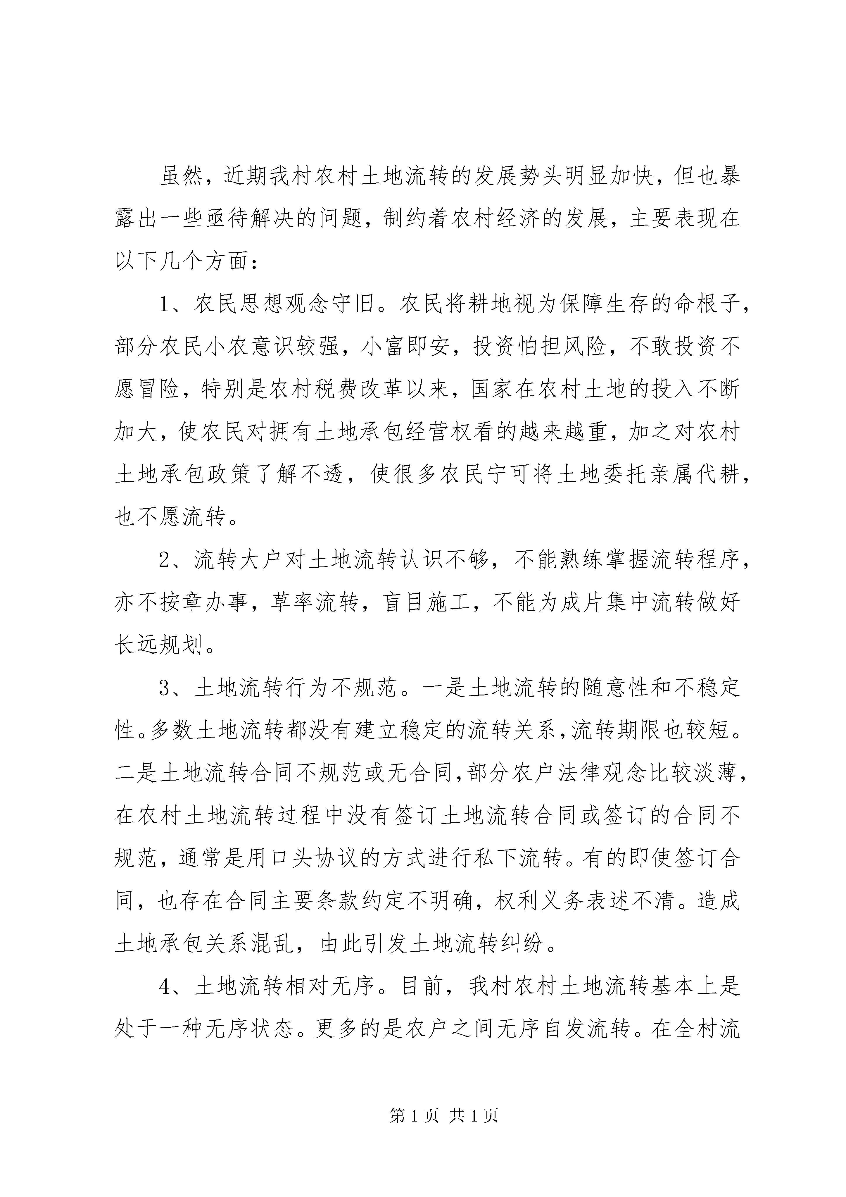 军高村土地流转工作情况汇报土地是农村经济发展中的基本生产要素。在坚持农村土地承包经营的基础上,加快土地流转,促进和其他生产要素的合理配置和优化组合,是转变农业生产方式,推进农业产业化、现代化的客观要求。近年来军高村在积极引导和规范农村土地承包经营权流转方面做了大量工作和有益探索,并取得了一定成效。一、基本情况我村辖32个自然村,计39个村民小组,农户1212户,农业人口4245人。耕地面积6800余亩。流转出承包耕地的农户240余户,签订耕地流转合同240余份数,签订流转合同的耕地流转面积2000余亩。二、我村土地流转现状近年来,随着农村改革开放的深入,农业结构调整和农业现代化进程的加快,农业产业化经营的不断形成,农村土地二轮承包关系的落实,农民享有了长期而稳定的农村土地承包经营权,给农村经济的发展注入了新的活力,农村土地关系也出现了一些新情况。特别是近年来农民外出务工人数增多,使我村农村土地流转明显加快。(一)土地流转的主要形式流转的形式呈现多样化。目前,我村土地流转的形式呈现出多样化趋势,其中主要的有四种:一是转包型。即原承包方将部分或全部土地承包经营权转包给其它农户,承包方与发包方原承包关系不变。二是互换型。即流转双方为了耕种方便或规模经营的需要,按照自愿、互利的原则互换承包地。三是托管形式。这种形式是土地承包人把自己的承包地让其他农户代管,时间多是季节性、一年以内的托管(随要随给)。1四是出租型。即农户把所承包土地租赁给本集体经济组织以外的单位或个人,在村内已经出现一些好的苗头,而且规模不断扩大。(二)我村土地流转的主要特点1、自发分散为主。土地流转中,多数都是由原承包户与转入户自行协商进行,且多是户与户之间的分散小规模流转,大户承包较少。2、本地为主。土地流转中,绝大部分都是在本村组范围内进行流转。3、短期流转为主。土地流转中,转包的期限一般都是一年一议,并且口头协议比较多。4、我村自2009年开始,流转大户越来越多(从2009年的一户增加到目前的二十余户),租金逐年提高(从2009年的280元一亩提高到450元一亩),流转期限绝大多数是到二轮承包期结束(即2024年12月31日)。(三)推进土地流转的做法农村土地流转是现阶段农村经济发展以后,出现的一种必然结果,从发展趋势看,随着农村改革开放的深入,农村土地流转的数量将越来越大。针对这种情况,庙岗乡政府在巩固和稳定农村第二轮土地承包经营的基础上,对农村土地流转给予大力的支持和鼓励。加强宣传,引导农民规范地流转耕地。在充分尊重农民意愿的前提下,按照依法、自愿、有偿的原则,加快土地流转。广泛向农民宣传农村土地流转对促进农村产业结构调整,促进农民增收的重要性,介绍农村土地流转过程中涉及的国家政策,注意事项等知识和无序流转引发纠纷的案例,提高农民对土地流转的认识,引导农民规范地流转土地。自2011年开始,我村就向各村印发了《农村土地承包经营权流转合同(样本)》,要求各村按照(样本)格式和内容,指导流转农户签订规范的农村土地流转书面合同。2我们经常深入村组,对《农村土地承包经营权流转合同》签订情况进行调查研究、和农户一起深入探索(例如:探索租金以农作物实物时价折算现金后结算、结合物价上涨系数按每年百分之四上调租金)。2011年六月份,我村就委托XX市鸿润生资专业合作社成立了农村土地流转服务中心,我村积极探索农村土地流转服务中心在引导农民规范有序流转土地方面发挥的作用。向流转农户提供咨询、合同签订指导、流转信息公开等服务。在此基础上,我们积极探索农村土地流转服务体系建设,前期筹备工作正在运作中。(四)我村土地流转存在的问题虽然,近期我村农村土地流转的发展势头明显加快,但也暴露出一些亟待解决的问题,制约着农村经济的发展,主要表现在以下几个方面:1、农民思想观念守旧。农民将耕地视为保障生存的命根子,部分农民小农意识较强,小富即安,投资怕担风险,不敢投资不愿冒险,特别是农村税费改革以来,国家在农村土地的投入不断加大,使农民对拥有土地承包经营权看的越来越重,加之对农村土地承包政策了解不透,使很多农民宁可将土地委托亲属代耕,也不愿流转。2、流转大户对土地流转认识不够,不能熟练掌握流转程序,亦不按章办事,草率流转,盲目施工,不能为成片集中流转做好长远规划。3、土地流转行为不规范。一是土地流转的随意性和不稳定性。多数土地流转都没有建立稳定的流转关系,流转期限也较短。二是土地流转合同不规范或无合同,部分农户法律观念比较淡薄,在农村土地流转过程中没有签订土地流转合同或签订的合同不规范,通常是用口头协议的方式进行私下流转。有的即使签订合同,也存在合同主要条款约定不明确,权利义务表述不清。造成土地承包关系混乱,由此引发土地流转纠纷。4、土地流转相对无序。目前,我村农村土地流