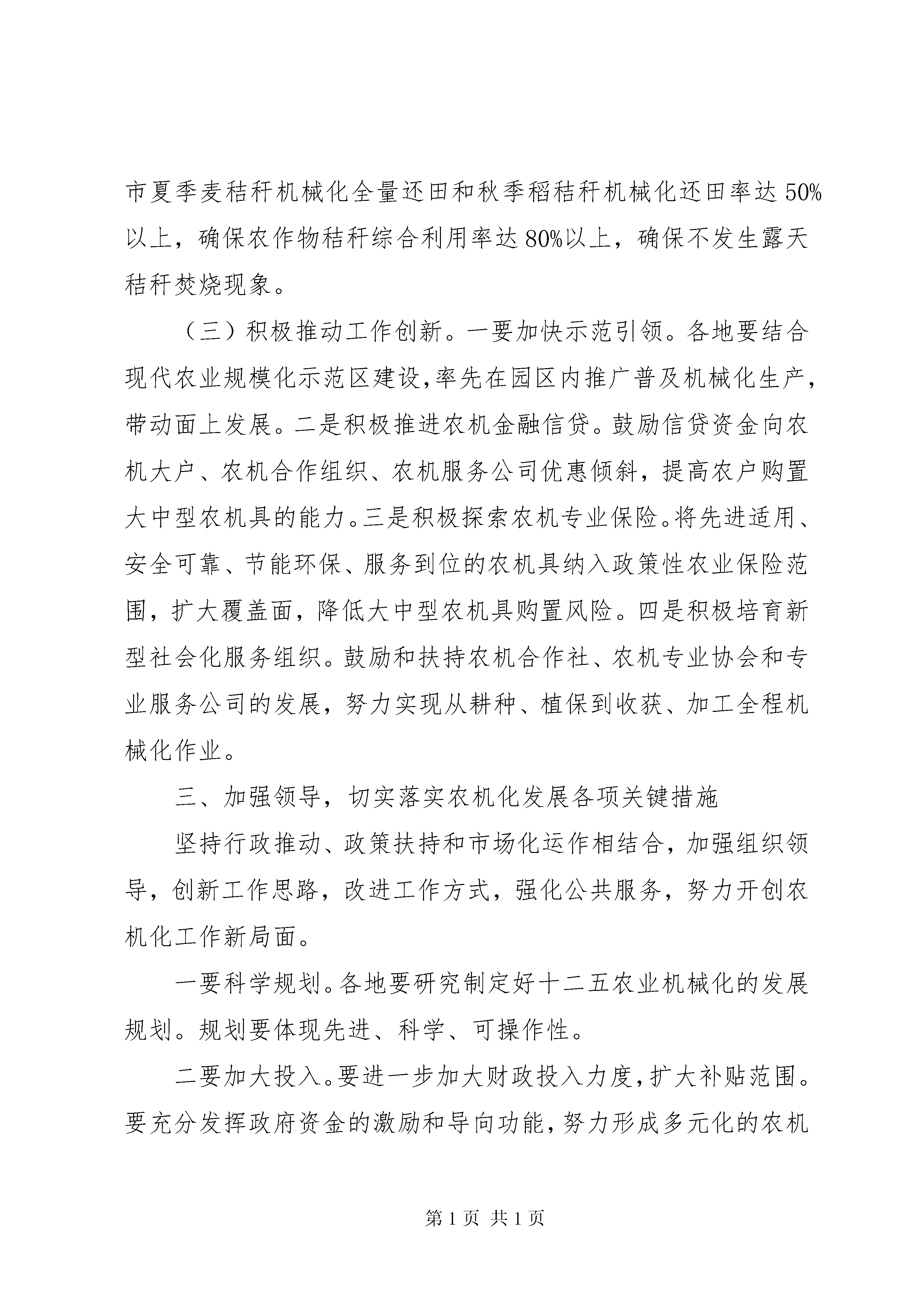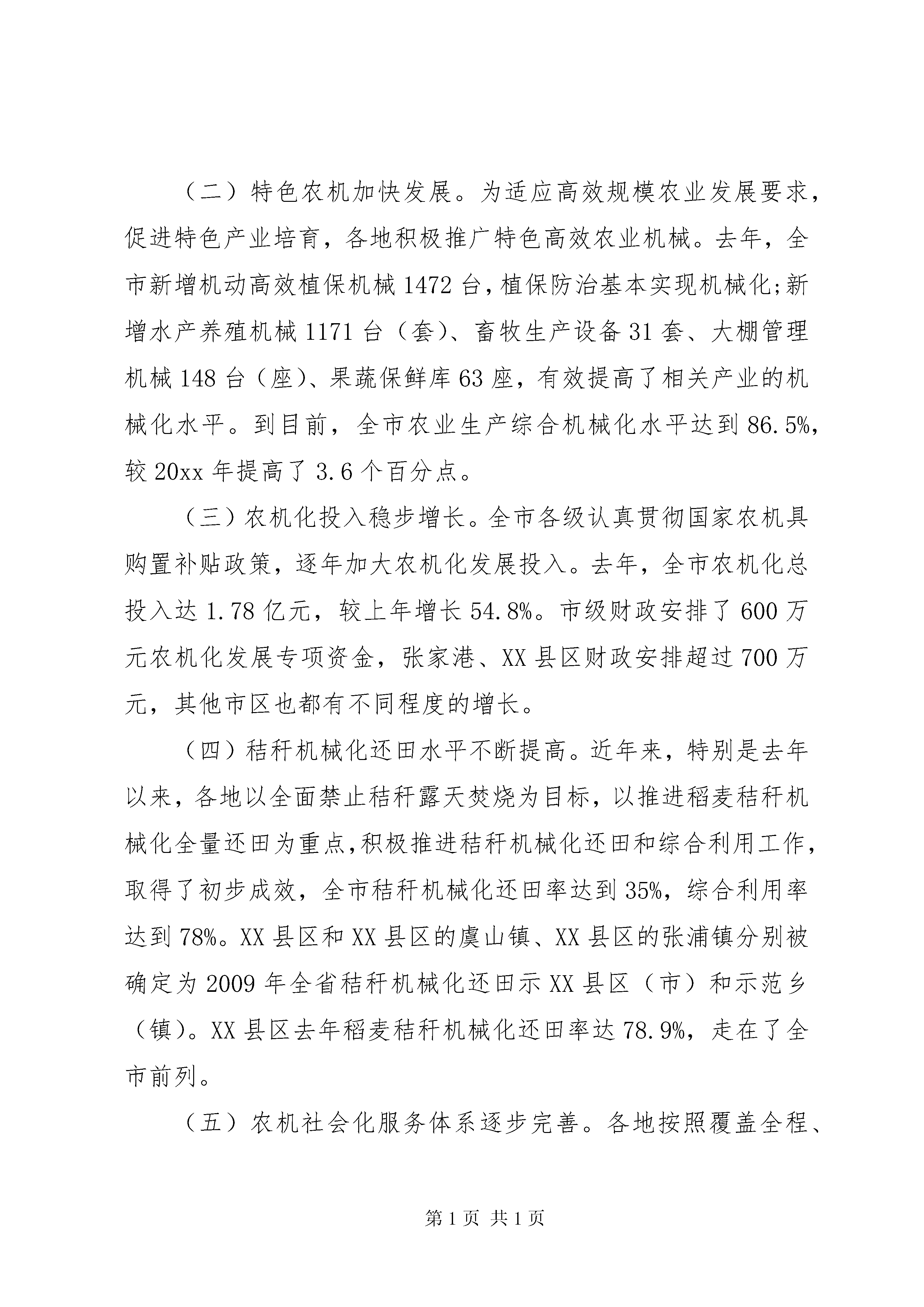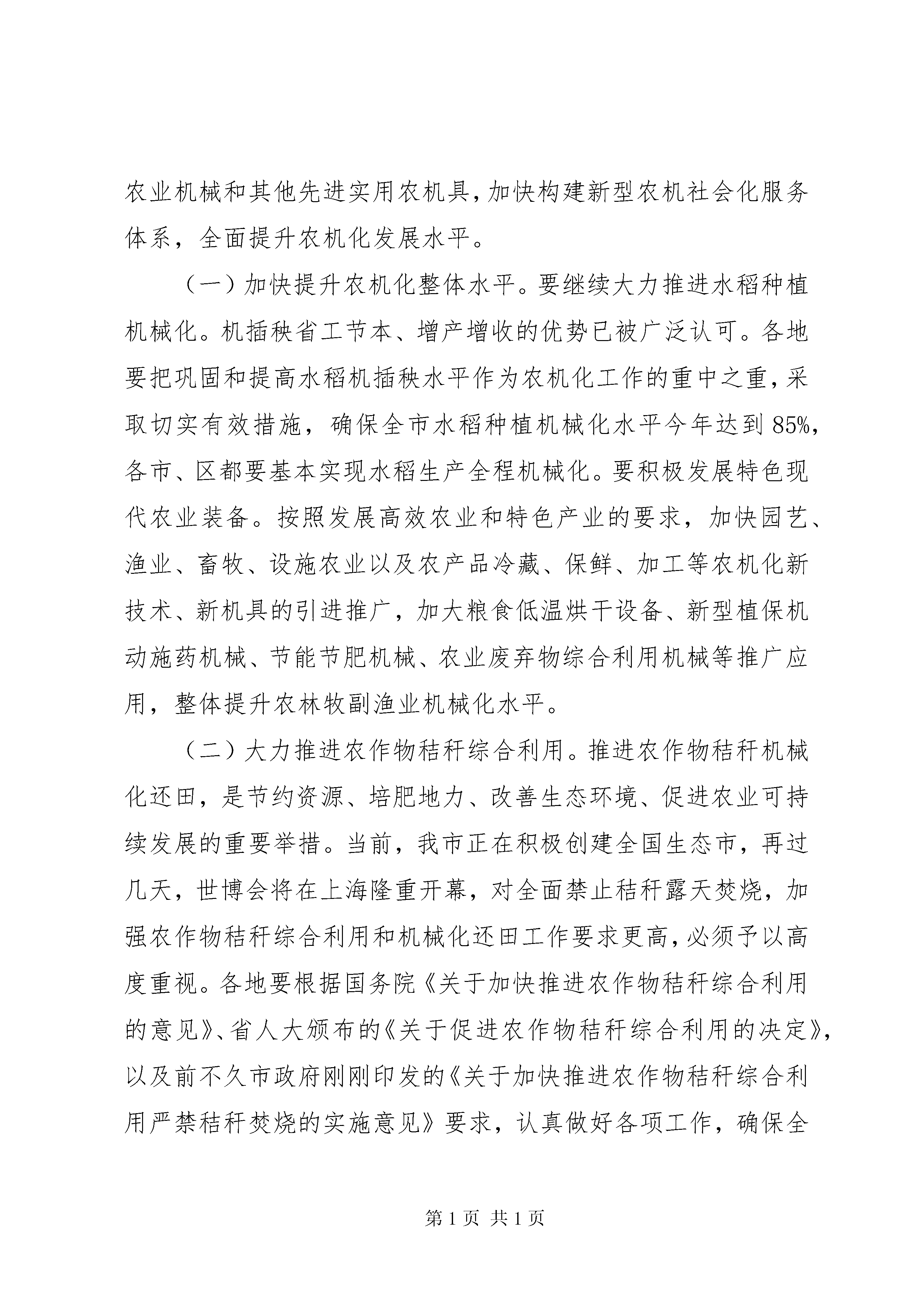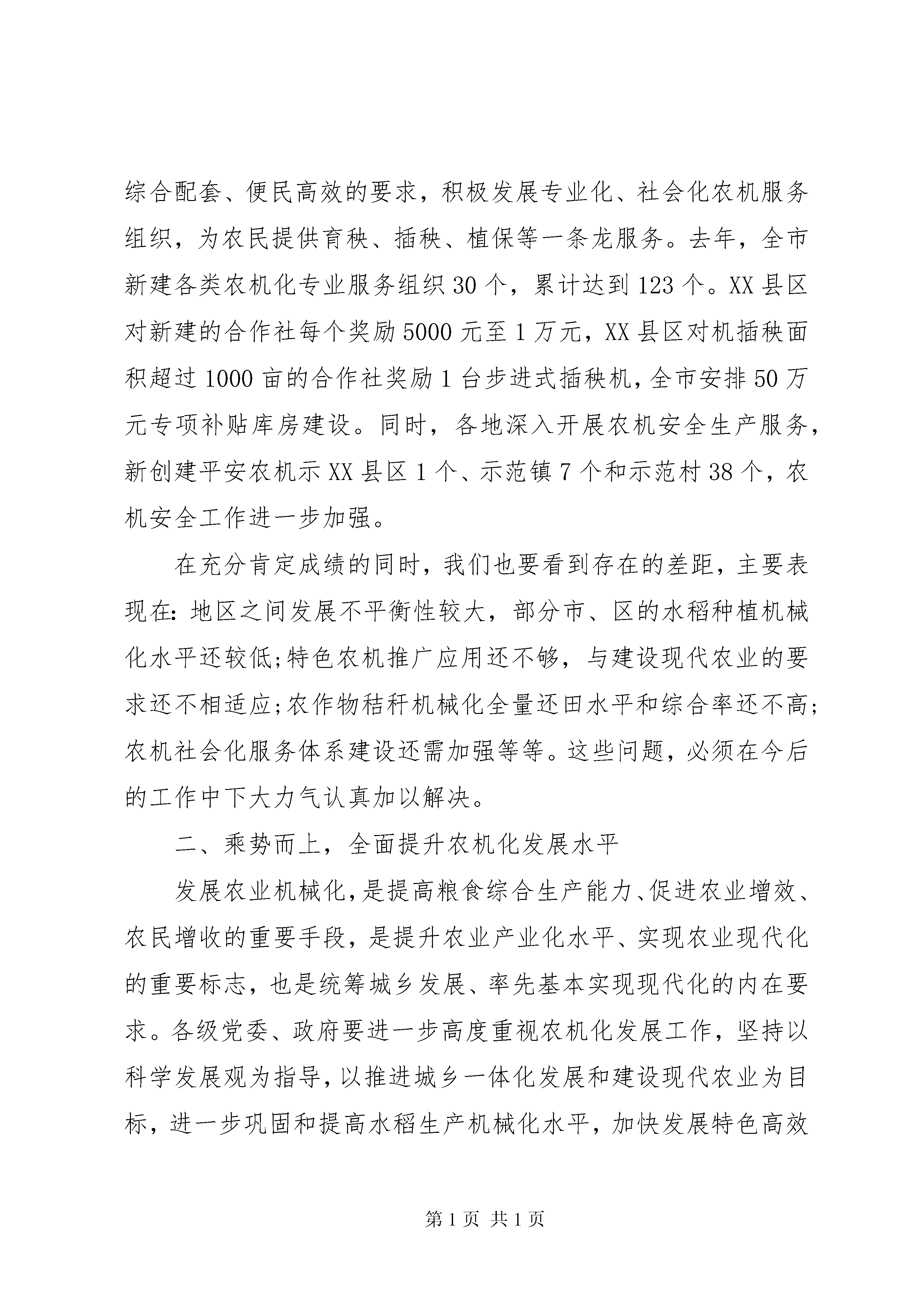 农机化工作会议讲话(2)农机化工作会议讲话(二):同志们:今天,市政府召开全市农机化工作会议,主要是传达贯彻全省农机化工作会议精神,回顾总结农机化发展情况,研究部署今后一段时期农机化工作任务。同时,对农产品质量安全和当前农业生产工作进行部署。下面,我就做好今后一段时期农机化工作先讲三点意见。一、充分肯定近年来全市农机化工作取得的成绩近年来,各级各有关部门高度重视农机化工作,加强领导,加大投入,全市农机化特别是水稻种植机械化水平得到了较快提升。主要表现在:(一)水稻种植机械化基本实现。这几年,我市把实现水稻种植机械化作为建设社会主义新农村和发展现代农业的重要内容,列入农机化工作的重中之重,大力推动。去年,全市新增水稻种植机械1026台,机插秧面积79.9万亩,水稻种植机械化水平达到80.5%,比20xx年翻了近一番,是近年来发展速度最快的一年,进入了全省率先基本实现水稻生产机械化市的先进行列,张家港、常熟、吴江3个市先后获得了率先基本实现水稻生产机械化县(市)称号,XX县区也基本实现了水稻种植机械化。(二)特色农机加快发展。为适应高效规模农业发展要求,促进特色产业培育,各地积极推广特色高效农业机械。去年,全市新增机动高效植保机械1472台,植保防治基本实现机械化;新增水产养殖机械1171台(套)、畜牧生产设备31套、大棚管理机械148台(座)、果蔬保鲜库63座,有效提高了相关产业的机械化水平。到目前,全市农业生产综合机械化水平达到86.5%,较20xx年提高了3.6个百分点。(三)农机化投入稳步增长。全市各级认真贯彻国家农机具购置补贴政策,逐年加大农机化发展投入。去年,全市农机化总投入达1.78亿元,较上年增长54.8%。市级财政安排了600万元农机化发展专项资金,张家港、XX县区财政安排超过700万元,其他市区也都有不同程度的增长。(四)秸秆机械化还田水平不断提高。近年来,特别是去年以来,各地以全面禁止秸秆露天焚烧为目标,以推进稻麦秸秆机械化全量还田为重点,积极推进秸秆机械化还田和综合利用工作,取得了初步成效,全市秸秆机械化还田率达到35%,综合利用率达到78%。XX县区和XX县区的虞山镇、XX县区的张浦镇分别被确定为2009年全省秸秆机械化还田示XX县区(市)和示范乡(镇)。XX县区去年稻麦秸秆机械化还田率达78.9%,走在了全市前列。(五)农机社会化服务体系逐步完善。各地按照覆盖全程、综合配套、便民高效的要求,积极发展专业化、社会化农机服务组织,为农民提供育秧、插秧、植保等一条龙服务。去年,全市新建各类农机化专业服务组织30个,累计达到123个。XX县区对新建的合作社每个奖励5000元至1万元,XX县区对机插秧面积超过1000亩的合作社奖励1台步进式插秧机,全市安排50万元专项补贴库房建设。同时,各地深入开展农机安全生产服务,新创建平安农机示XX县区1个、示范镇7个和示范村38个,农机安全工作进一步加强。在充分肯定成绩的同时,我们也要看到存在的差距,主要表现在:地区之间发展不平衡性较大,部分市、区的水稻种植机械化水平还较低;特色农机推广应用还不够,与建设现代农业的要求还不相适应;农作物秸秆机械化全量还田水平和综合率还不高;农机社会化服务体系建设还需加强等等。这些问题,必须在今后的工作中下大力气认真加以解决。二、乘势而上,全面提升农机化发展水平发展农业机械化,是提高粮食综合生产能力、促进农业增效、农民增收的重要手段,是提升农业产业化水平、实现农业现代化的重要标志,也是统筹城乡发展、率先基本实现现代化的内在要求。各级党委、政府要进一步高度重视农机化发展工作,坚持以科学发展观为指导,以推进城乡一体化发展和建设现代农业为目标,进一步巩固和提高水稻生产机械化水平,加快发展特色高效农业机械和其他先进实用农机具,加快构建新型农机社会化服务体系,全面提升农机化发展水平。(一)加快提升农机化整体水平。要继续大力推进水稻种植机械化。机插秧省工节本、增产增收的优势已被广泛认可。各地要把巩固和提高水稻机插秧水平作为农机化工作的重中之重,采取切实有效措施,确保全市水稻种植机械化水平今年达到85%,各市、区都要基本实现水稻生产全程机械化。要积极发展特色现代农业装备。按照发展高效农业和特色产业的要求,加快园艺、渔业、畜牧、设施农业以及农产品冷藏、保鲜、加工等农机化新技术、新机具的引进推广,加大粮食低温烘干设备、新型植保机动施药机械、节能节肥机械、农业废弃物综合利用机械等推广应用,整体提升农林牧副渔业机械化水平。(二)大力推进农作物秸秆综合利用。推进农作物秸秆机械化还田,是节约资源、培肥地力、改善生态环境、促进农业可持续发展的重要举措。当前,我市正在积极创建全国生态市,再过几天,世博会将在上海隆重开幕,对全面禁止秸秆露天焚烧,加