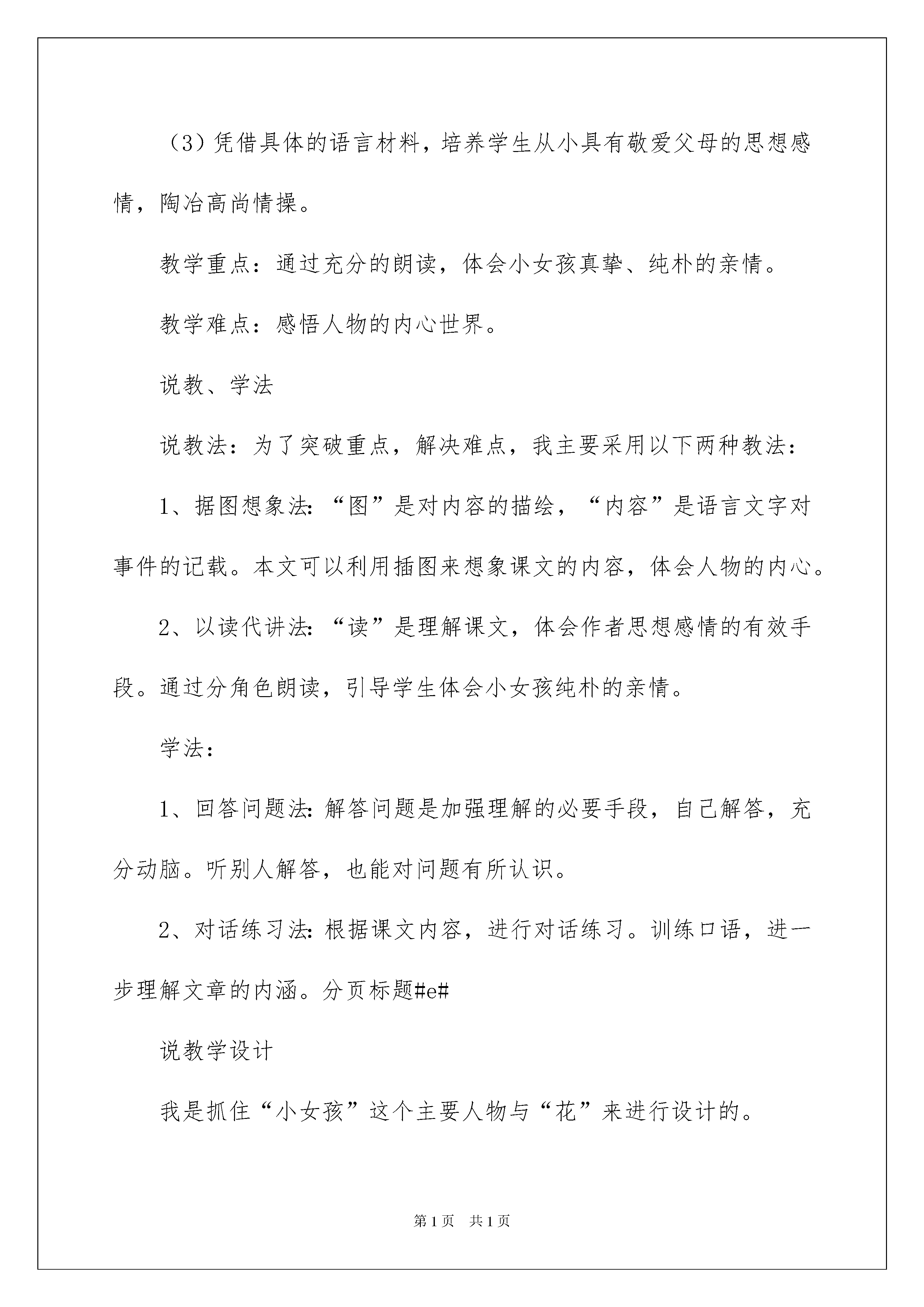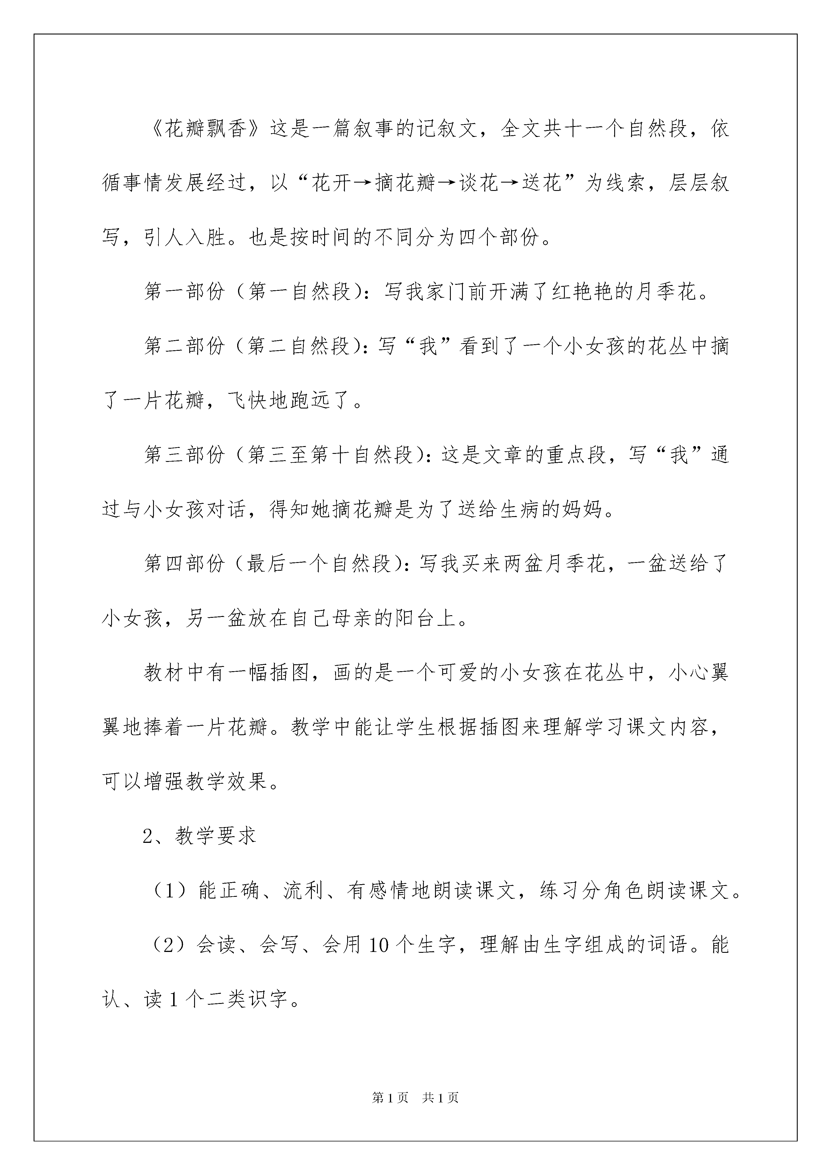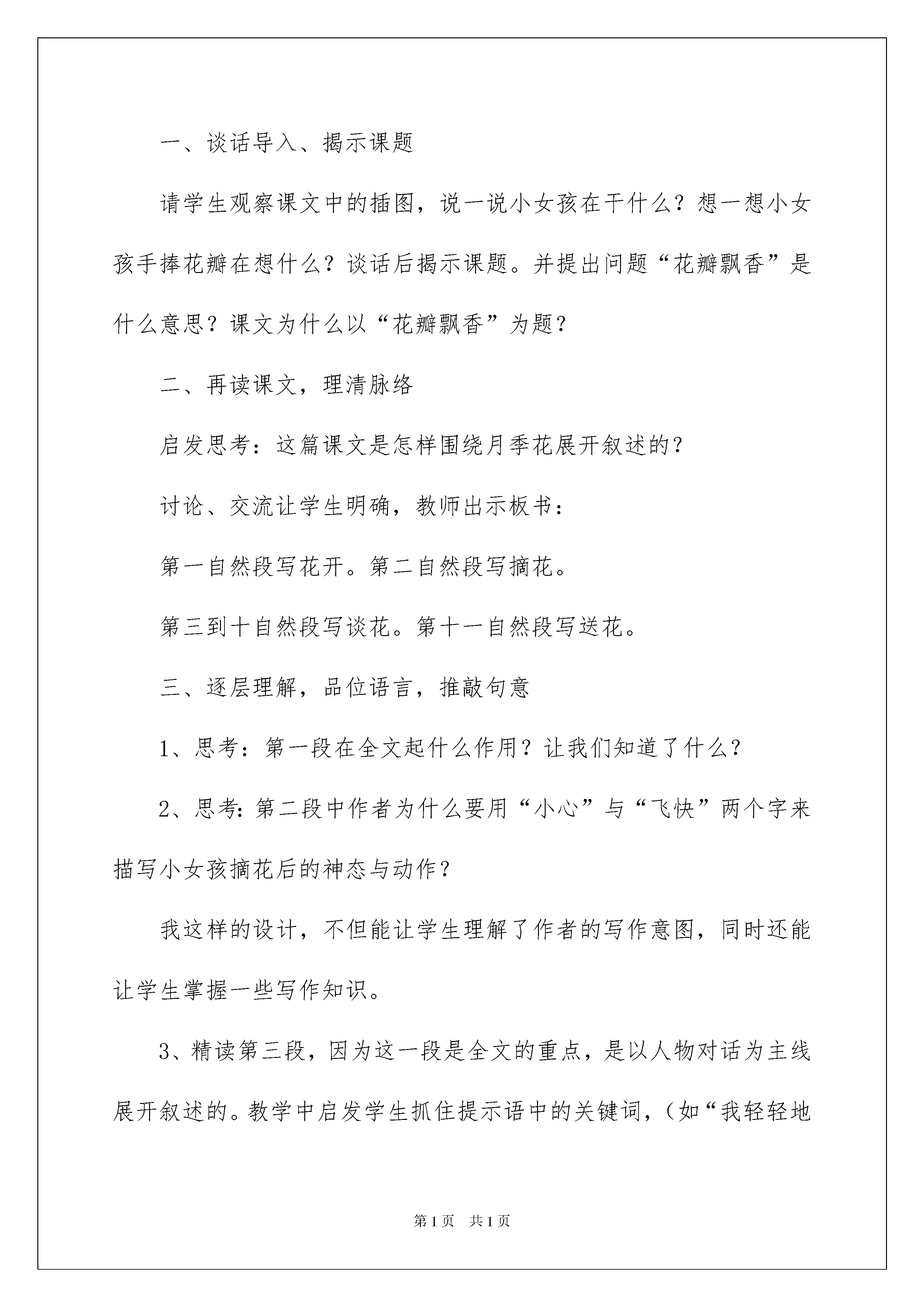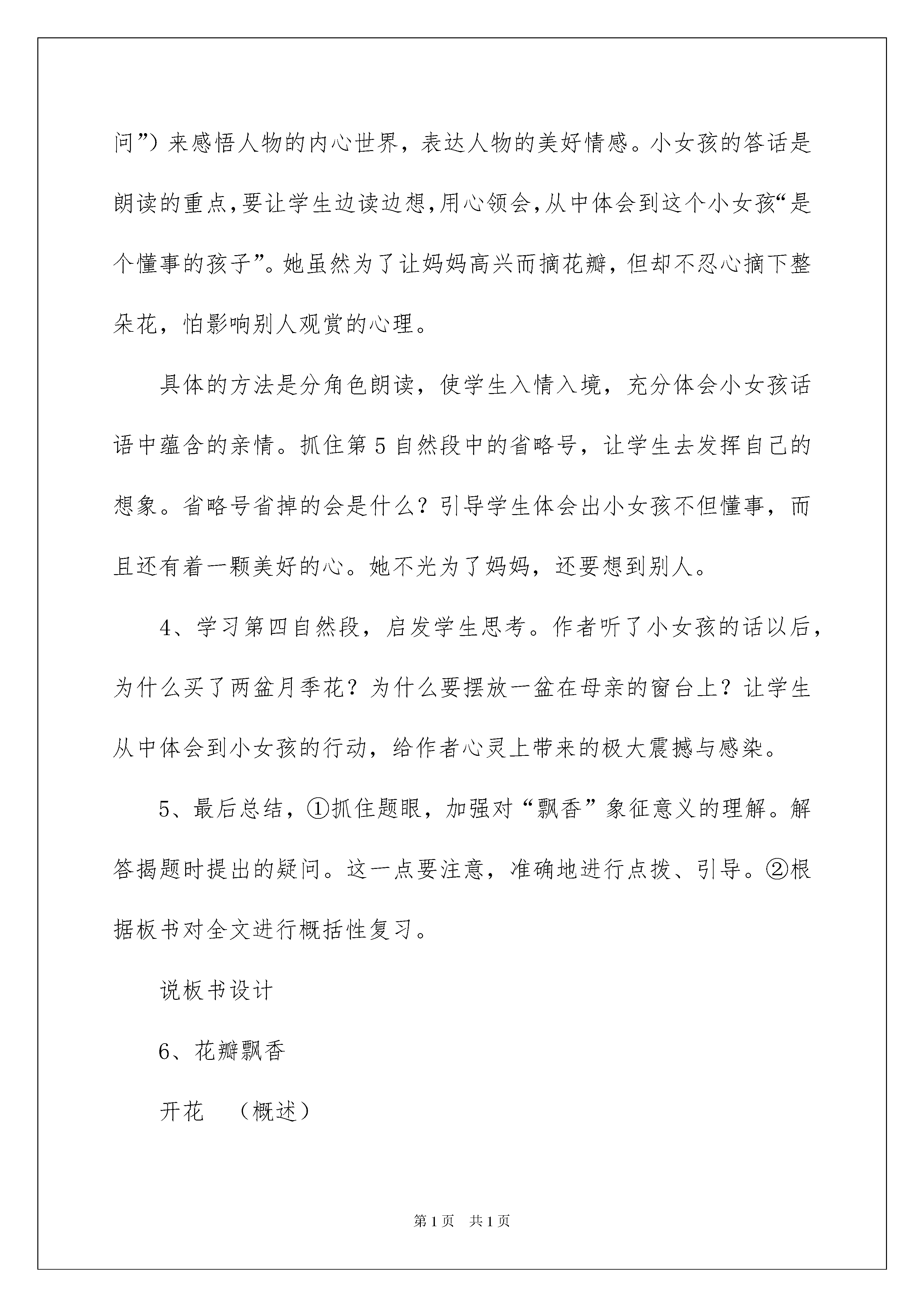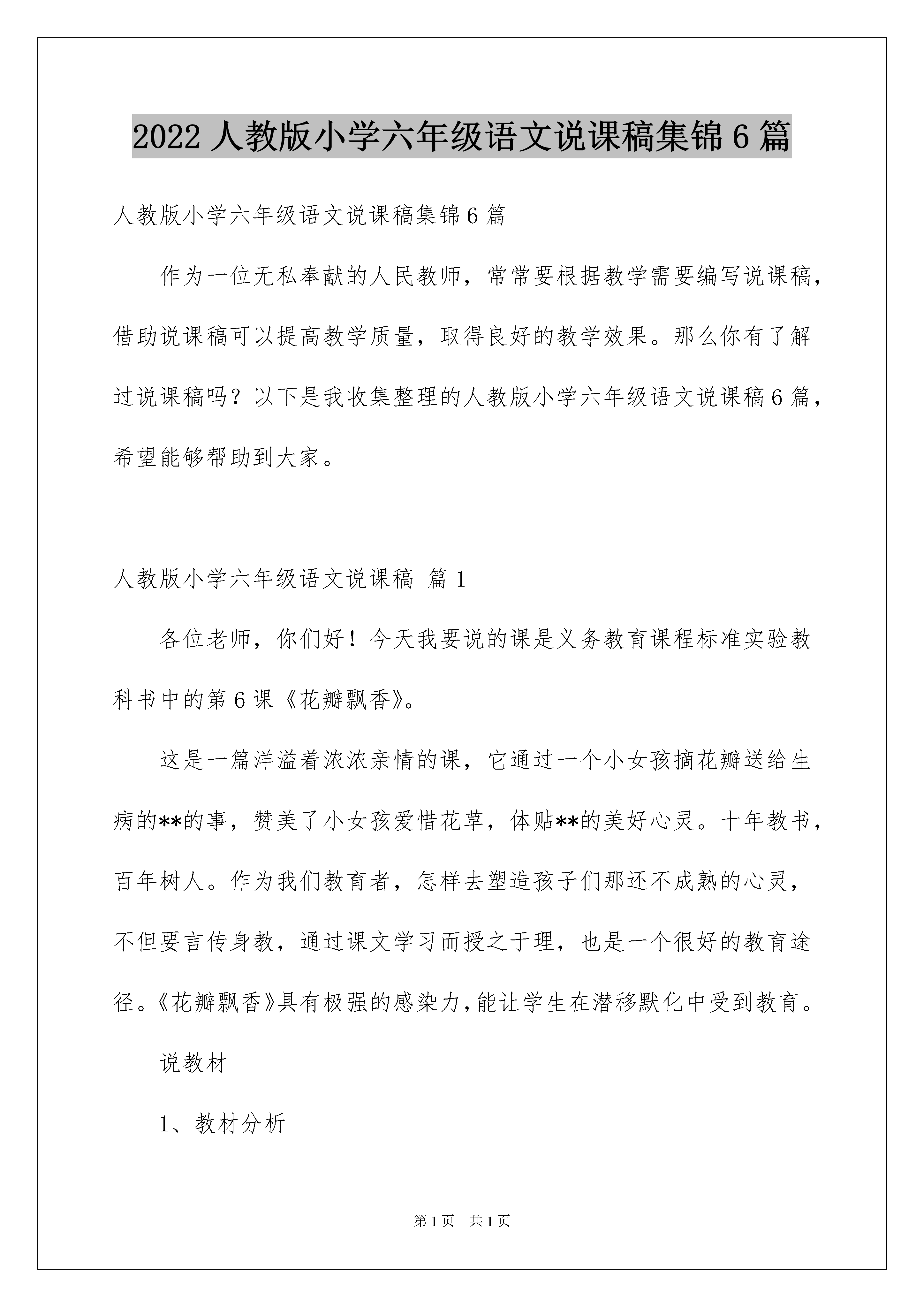 2022人教版小学六年级语文说课稿集锦6篇人教版小学六年级语文说课稿集锦6篇作为一位无私奉献的人民教师,常常要根据教学需要编写说课稿,借助说课稿可以提高教学质量,取得良好的教学效果。那么你有了解过说课稿吗?以下是我收集整理的人教版小学六年级语文说课稿6篇,希望能够帮助到大家。人教版小学六年级语文说课稿篇1各位老师,你们好!今天我要说的课是义务教育课程标准实验教科书中的第6课《花瓣飘香》。这是一篇洋溢着浓浓亲情的课,它通过一个小女孩摘花瓣送给生病的**的事,赞美了小女孩爱惜花草,体贴**的美好心灵。十年教书,百年树人。作为我们教育者,怎样去塑造孩子们那还不成熟的心灵,不但要言传身教,通过课文学习而授之于理,也是一个很好的教育途径。《花瓣飘香》具有极强的感染力,能让学生在潜移默化中受到教育。说教材1、教材分析《花瓣飘香》这是一篇叙事的记叙文,全文共十一个自然段,依循事情发展经过,以“花开→摘花瓣→谈花→送花”为线索,层层叙写,引人入胜。也是按时间的不同分为四个部份。第一部份(第一自然段):写我家门前开满了红艳艳的月季花。第二部份(第二自然段):写“我”看到了一个小女孩的花丛中摘了一片花瓣,飞快地跑远了。第三部份(第三至第十自然段):这是文章的重点段,写“我”通过与小女孩对话,得知她摘花瓣是为了送给生病的妈妈。第四部份(最后一个自然段):写我买来两盆月季花,一盆送给了小女孩,另一盆放在自己母亲的阳台上。教材中有一幅插图,画的是一个可爱的小女孩在花丛中,小心翼翼地捧着一片花瓣。教学中能让学生根据插图来理解学习课文内容,可以增强教学效果。2、教学要求(1)能正确、流利、有感情地朗读课文,练习分角色朗读课文。(2)会读、会写、会用10个生字,理解由生字组成的词语。能认、读1个二类识字。(3)凭借具体的语言材料,培养学生从小具有敬爱父母的思想感情,陶冶高尚情操。教学重点:通过充分的朗读,体会小女孩真挚、纯朴的亲情。教学难点:感悟人物的内心世界。说教、学法说教法:为了突破重点,解决难点,我主要采用以下两种教法:1、据图想象法:“图”是对内容的描绘,“内容”是语言文字对事件的记载。本文可以利用插图来想象课文的内容,体会人物的内心。2、以读代讲法:“读”是理解课文,体会作者思想感情的有效手段。通过分角色朗读,引导学生体会小女孩纯朴的亲情。学法:1、回答问题法:解答问题是加强理解的必要手段,自己解答,充分动脑。听别人解答,也能对问题有所认识。2、对话练习法:根据课文内容,进行对话练习。训练口语,进一步理解文章的内涵。分页标题#e#说教学设计我是抓住“小女孩”这个主要人物与“花”来进行设计的。一、谈话导入、揭示课题请学生观察课文中的插图,说一说小女孩在干什么?想一想小女孩手捧花瓣在想什么?谈话后揭示课题。并提出问题“花瓣飘香”是什么意思?课文为什么以“花瓣飘香”为题?二、再读课文,理清脉络启发思考:这篇课文是怎样围绕月季花展开叙述的?讨论、交流让学生明确,教师出示板书:第一自然段写花开。第二自然段写摘花。第三到十自然段写谈花。第十一自然段写送花。三、逐层理解,品位语言,推敲句意1、思考:第一段在全文起什么作用?让我们知道了什么?2、思考:第二段中作者为什么要用“小心”与“飞快”两个字来描写小女孩摘花后的神态与动作?我这样的设计,不但能让学生理解了作者的写作意图,同时还能让学生掌握一些写作知识。3、精读第三段,因为这一段是全文的重点,是以人物对话为主线展开叙述的。教学中启发学生抓住提示语中的关键词,(如“我轻轻地问”)来感悟人物的内心世界,表达人物的美好情感。小女孩的答话是朗读的重点,要让学生边读边想,用心领会,从中体会到这个小女孩“是个懂事的孩子”。她虽然为了让妈妈高兴而摘花瓣,但却不忍心摘下整朵花,怕影响别人观赏的心理。具体的方法是分角色朗读,使学生入情入境,充分体会小女孩话语中蕴含的亲情。抓住第5自然段中的省略号,让学生去发挥自己的想象。省略号省掉的会是什么?引导学生体会出小女孩不但懂事,而且还有着一颗美好的心。她不光为了妈妈,还要想到别人。4、学习第四自然段,启发学生思考。作者听了小女孩的话以后,为什么买了两盆月季花?为什么要摆放一盆在母亲的窗台上?让学生从中体会到小女孩的行动,给作者心灵上带来的极大震撼与感染。5、最后总结,①抓住题眼,加强对“飘香”象征意义的理解。解答揭题时提出的疑问。这一点要注意,准确地进行点拨、引导。②根据板书对全文进行概括性复习。说板书设计6、花瓣飘香开花(概述)摘花小心飞快谈花让妈妈高兴别人要观赏(懂事,心灵美)送花小女孩作者的母亲一个好的板书,不仅能清晰地显示