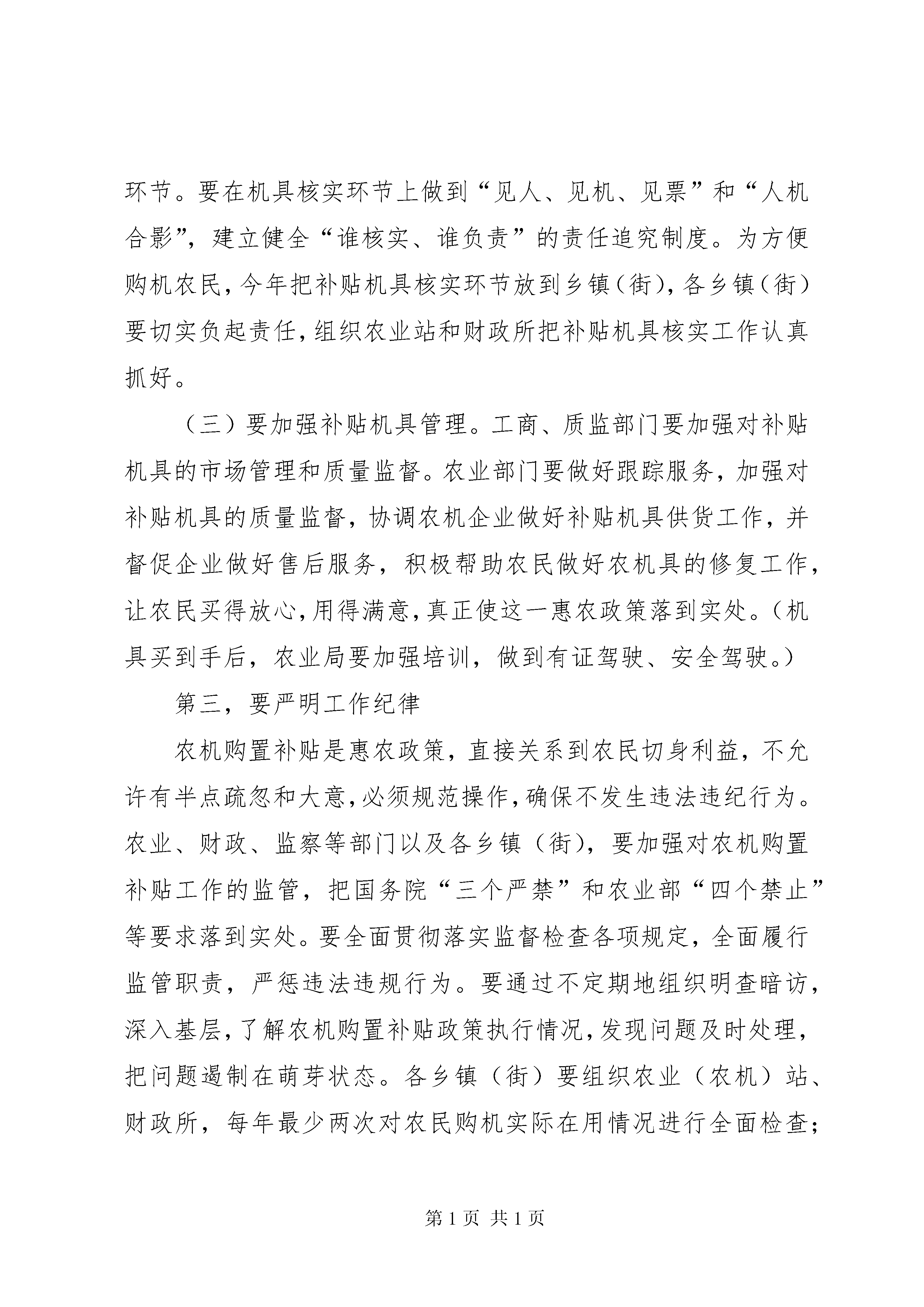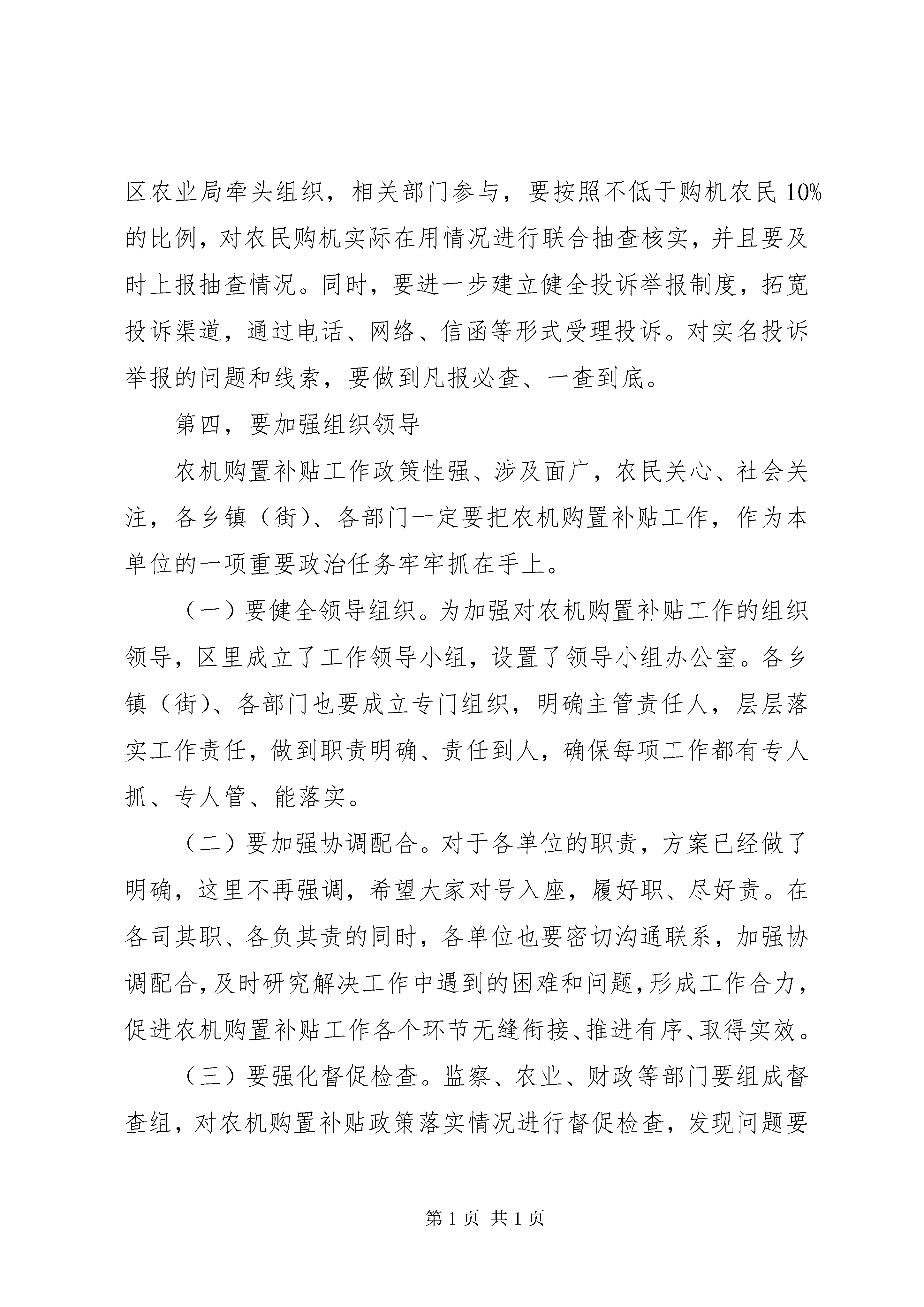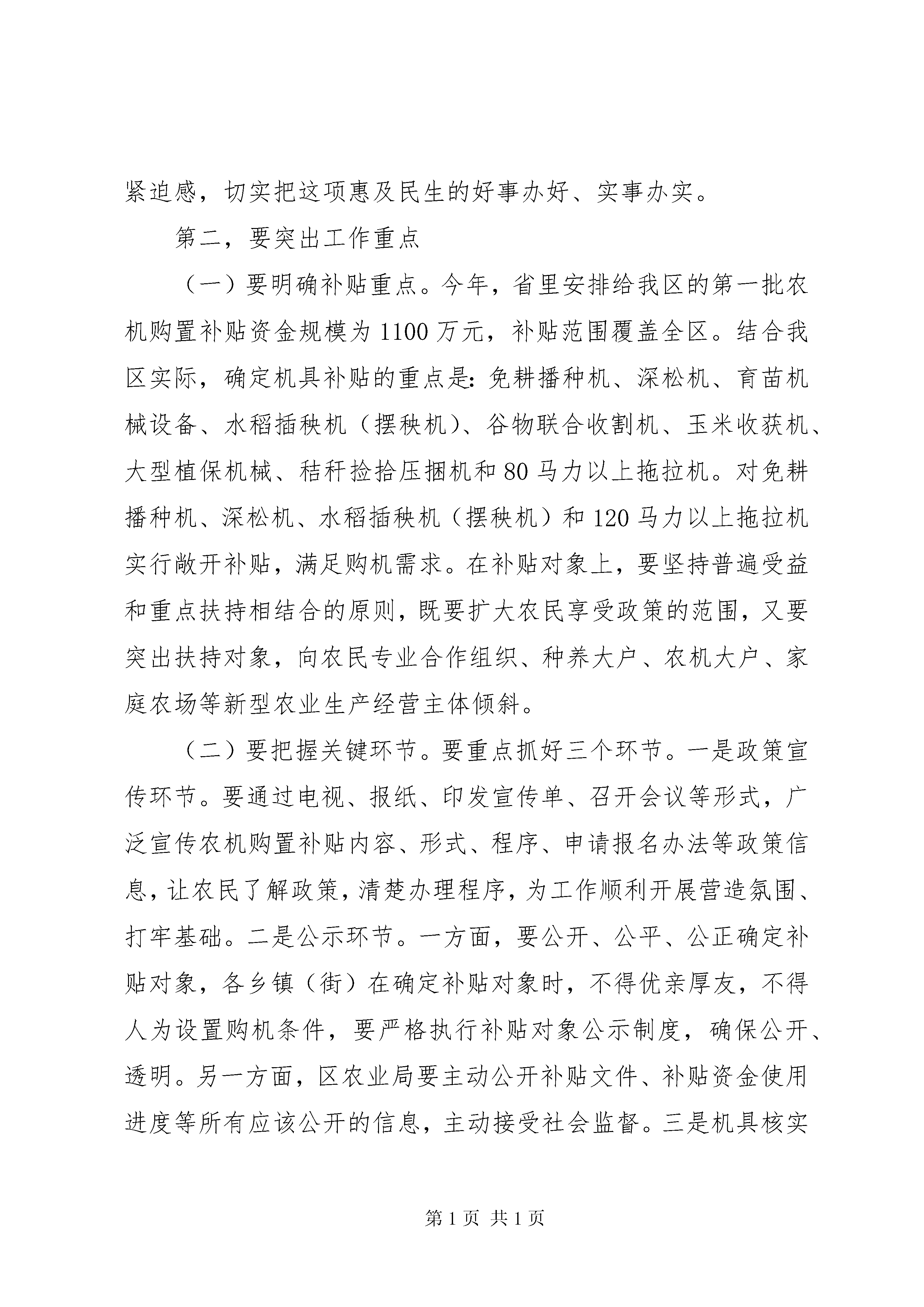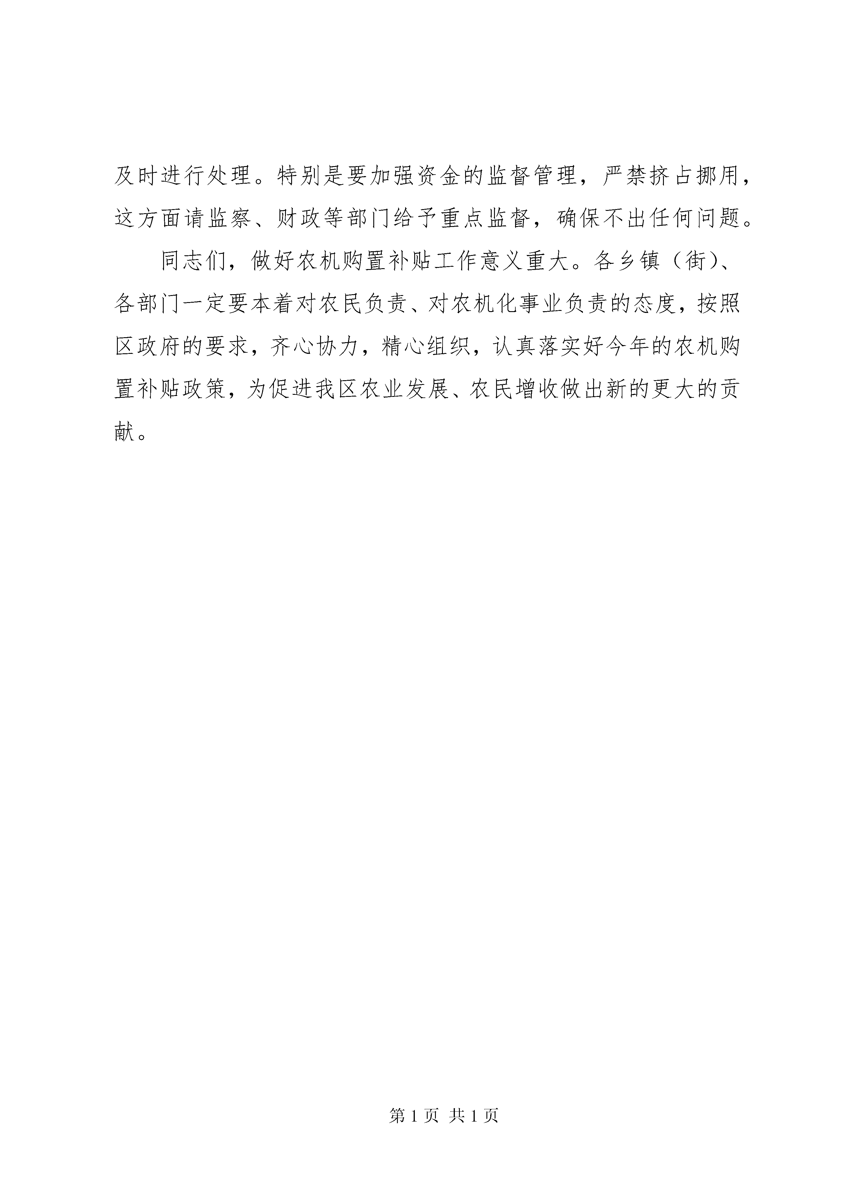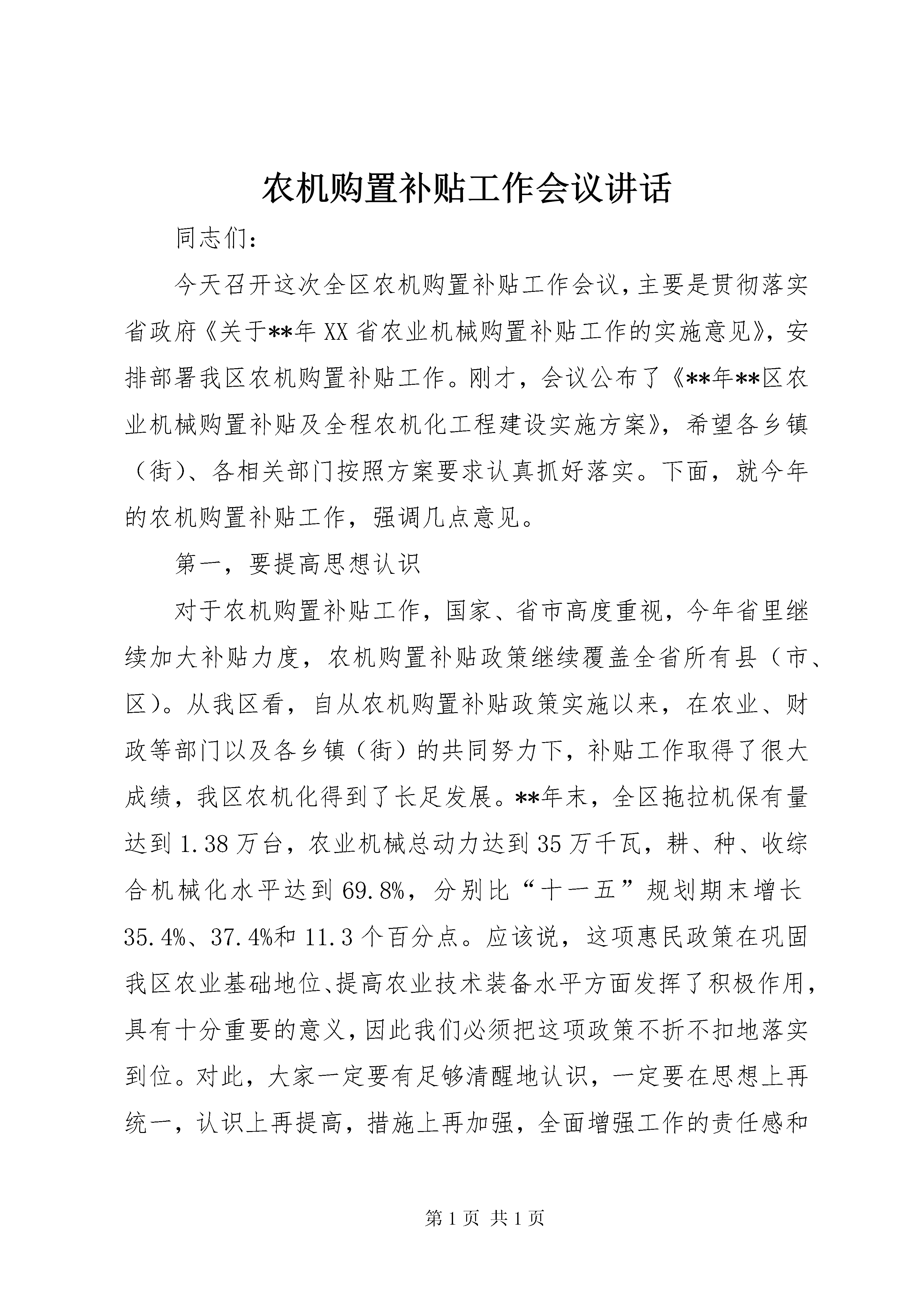 农机购置补贴工作会议讲话同志们:今天召开这次全区农机购置补贴工作会议,主要是贯彻落实省政府《关于**年XX省农业机械购置补贴工作的实施意见》,安排部署我区农机购置补贴工作。刚才,会议公布了《**年**区农业机械购置补贴及全程农机化工程建设实施方案》,希望各乡镇(街)、各相关部门按照方案要求认真抓好落实。下面,就今年的农机购置补贴工作,强调几点意见。第一,要提高思想认识对于农机购置补贴工作,国家、省市高度重视,今年省里继续加大补贴力度,农机购置补贴政策继续覆盖全省所有县(市、区)。从我区看,自从农机购置补贴政策实施以来,在农业、财政等部门以及各乡镇(街)的共同努力下,补贴工作取得了很大成绩,我区农机化得到了长足发展。**年末,全区拖拉机保有量达到1.38万台,农业机械总动力达到35万千瓦,耕、种、收综合机械化水平达到69.8%,分别比“十一五”规划期末增长35.4%、37.4%和11.3个百分点。应该说,这项惠民政策在巩固我区农业基础地位、提高农业技术装备水平方面发挥了积极作用,具有十分重要的意义,因此我们必须把这项政策不折不扣地落实到位。对此,大家一定要有足够清醒地认识,一定要在思想上再统一,认识上再提高,措施上再加强,全面增强工作的责任感和紧迫感,切实把这项惠及民生的好事办好、实事办实。第二,要突出工作重点(一)要明确补贴重点。今年,省里安排给我区的第一批农机购置补贴资金规模为1100万元,补贴范围覆盖全区。结合我区实际,确定机具补贴的重点是:免耕播种机、深松机、育苗机械设备、水稻插秧机(摆秧机)、谷物联合收割机、玉米收获机、大型植保机械、秸秆捡拾压捆机和80马力以上拖拉机。对免耕播种机、深松机、水稻插秧机(摆秧机)和120马力以上拖拉机实行敞开补贴,满足购机需求。在补贴对象上,要坚持普遍受益和重点扶持相结合的原则,既要扩大农民享受政策的范围,又要突出扶持对象,向农民专业合作组织、种养大户、农机大户、家庭农场等新型农业生产经营主体倾斜。(二)要把握关键环节。要重点抓好三个环节。一是政策宣传环节。要通过电视、报纸、印发宣传单、召开会议等形式,广泛宣传农机购置补贴内容、形式、程序、申请报名办法等政策信息,让农民了解政策,清楚办理程序,为工作顺利开展营造氛围、打牢基础。二是公示环节。一方面,要公开、公平、公正确定补贴对象,各乡镇(街)在确定补贴对象时,不得优亲厚友,不得人为设置购机条件,要严格执行补贴对象公示制度,确保公开、透明。另一方面,区农业局要主动公开补贴文件、补贴资金使用进度等所有应该公开的信息,主动接受社会监督。三是机具核实环节。要在机具核实环节上做到“见人、见机、见票”和“人机合影”,建立健全“谁核实、谁负责”的责任追究制度。为方便购机农民,今年把补贴机具核实环节放到乡镇(街),各乡镇(街)要切实负起责任,组织农业站和财政所把补贴机具核实工作认真抓好。(三)要加强补贴机具管理。工商、质监部门要加强对补贴机具的市场管理和质量监督。农业部门要做好跟踪服务,加强对补贴机具的质量监督,协调农机企业做好补贴机具供货工作,并督促企业做好售后服务,积极帮助农民做好农机具的修复工作,让农民买得放心,用得满意,真正使这一惠农政策落到实处。(机具买到手后,农业局要加强培训,做到有证驾驶、安全驾驶。)第三,要严明工作纪律农机购置补贴是惠农政策,直接关系到农民切身利益,不允许有半点疏忽和大意,必须规范操作,确保不发生违法违纪行为。农业、财政、监察等部门以及各乡镇(街),要加强对农机购置补贴工作的监管,把国务院“三个严禁”和农业部“四个禁止”等要求落到实处。要全面贯彻落实监督检查各项规定,全面履行监管职责,严惩违法违规行为。要通过不定期地组织明查暗访,深入基层,了解农机购置补贴政策执行情况,发现问题及时处理,把问题遏制在萌芽状态。各乡镇(街)要组织农业(农机)站、财政所,每年最少两次对农民购机实际在用情况进行全面检查;区农业局牵头组织,相关部门参与,要按照不低于购机农民10%的比例,对农民购机实际在用情况进行联合抽查核实,并且要及时上报抽查情况。同时,要进一步建立健全投诉举报制度,拓宽投诉渠道,通过电话、网络、信函等形式受理投诉。对实名投诉举报的问题和线索,要做到凡报必查、一查到底。第四,要加强组织领导农机购置补贴工作政策性强、涉及面广,农民关心、社会关注,各乡镇(街)、各部门一定要把农机购置补贴工作,作为本单位的一项重要政治任务牢牢抓在手上。(一)要健全领导组织。为加强对农机购置补贴工作的组织领导,区里成立了工作领导小组,设置了领导小组办公室。各乡镇(街)、各部门也要成立专门组织,明确主管责任人,层层落实工作责任,做到职责明确、责任到人,确保每项工作都有专人抓、专人管、能落实。(二)要加强协调配合。对于各单位的职责,