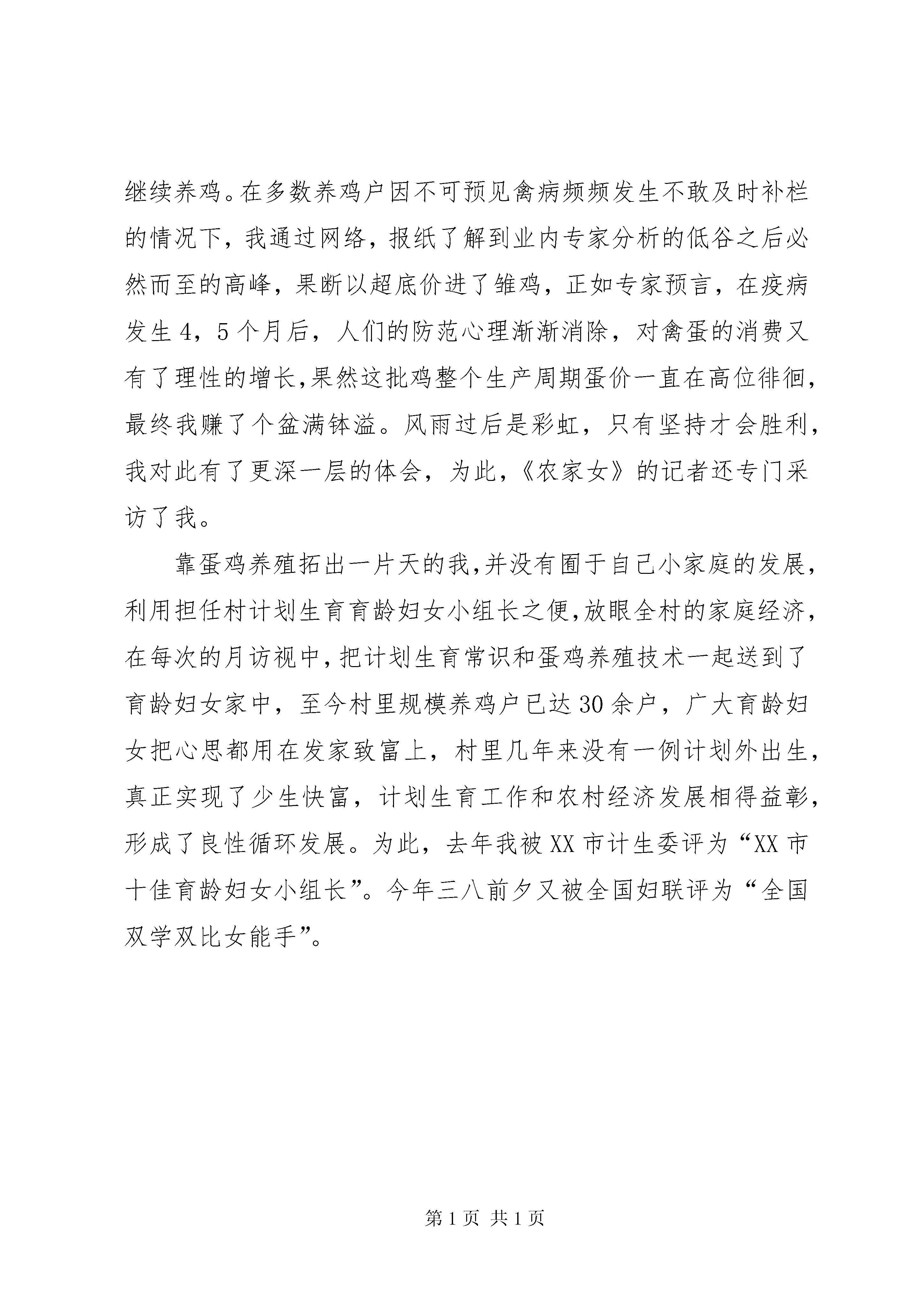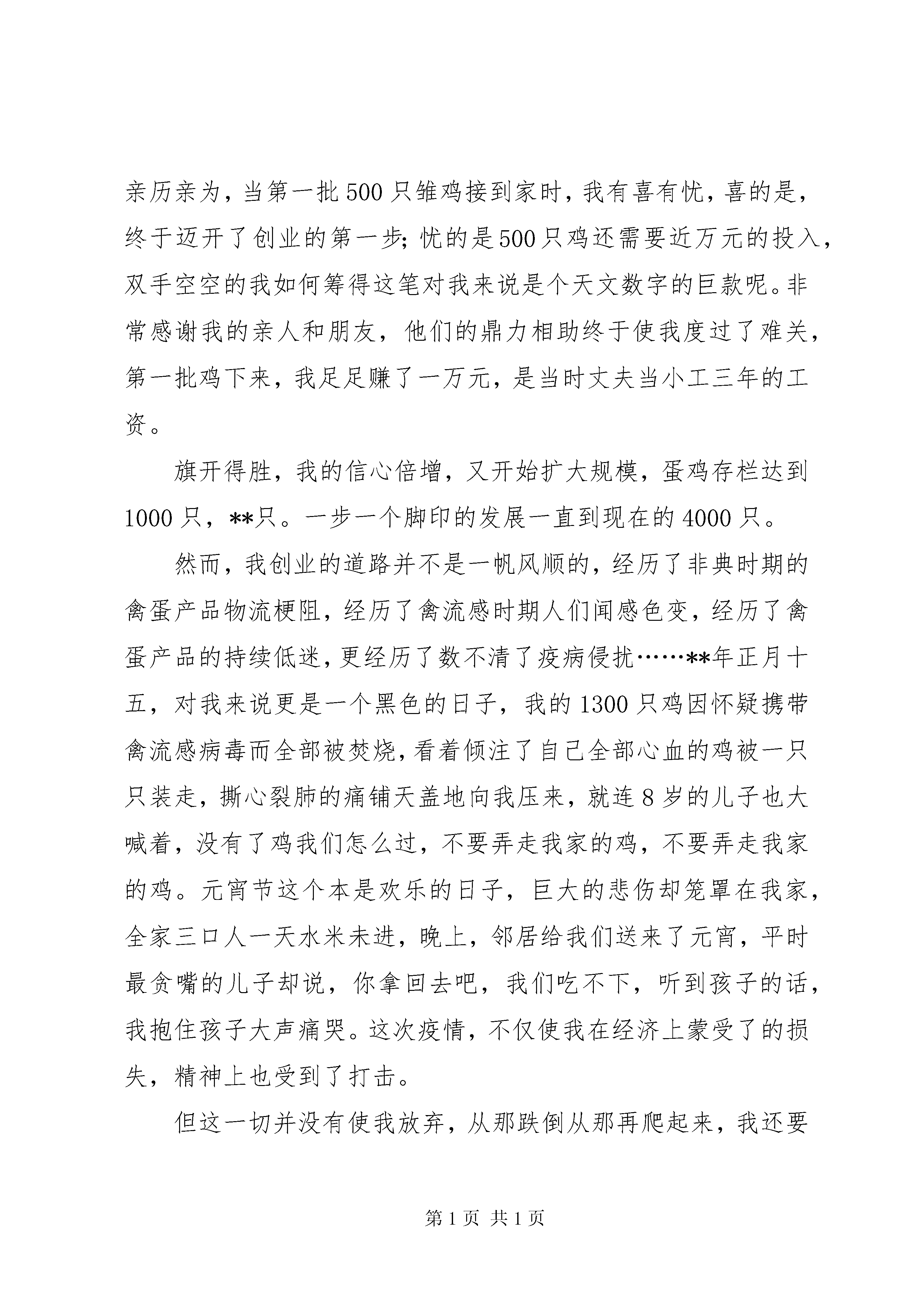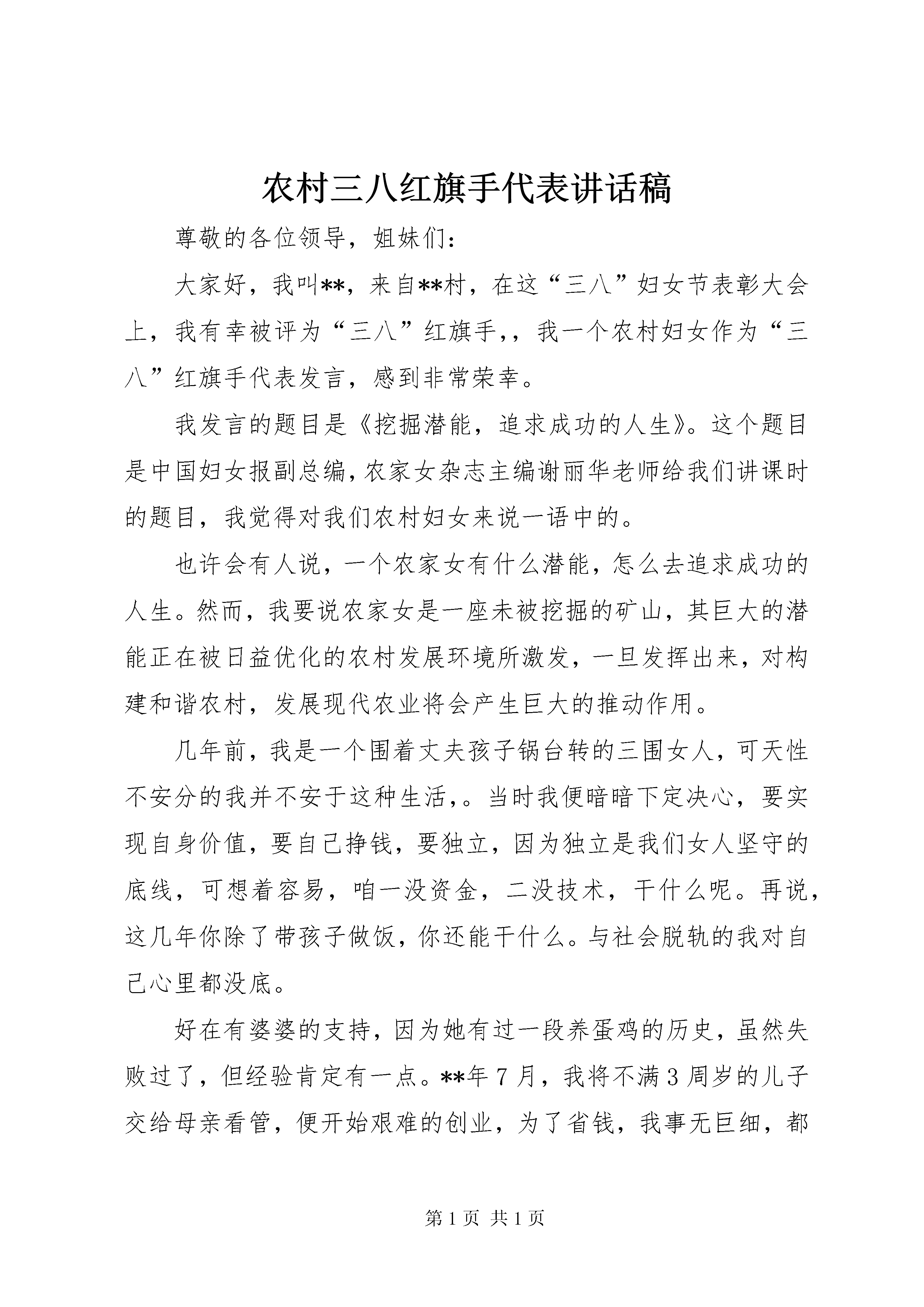 农村三八红旗手代表讲话稿尊敬的各位领导,姐妹们:大家好,我叫**,来自**村,在这“三八”妇女节表彰大会上,我有幸被评为“三八”红旗手,,我一个农村妇女作为“三八”红旗手代表发言,感到非常荣幸。我发言的题目是《挖掘潜能,追求成功的人生》。这个题目是中国妇女报副总编,农家女杂志主编谢丽华老师给我们讲课时的题目,我觉得对我们农村妇女来说一语中的。也许会有人说,一个农家女有什么潜能,怎么去追求成功的人生。然而,我要说农家女是一座未被挖掘的矿山,其巨大的潜能正在被日益优化的农村发展环境所激发,一旦发挥出来,对构建和谐农村,发展现代农业将会产生巨大的推动作用。几年前,我是一个围着丈夫孩子锅台转的三围女人,可天性不安分的我并不安于这种生活,。当时我便暗暗下定决心,要实现自身价值,要自己挣钱,要独立,因为独立是我们女人坚守的底线,可想着容易,咱一没资金,二没技术,干什么呢。再说,这几年你除了带孩子做饭,你还能干什么。与社会脱轨的我对自己心里都没底。好在有婆婆的支持,因为她有过一段养蛋鸡的历史,虽然失败过了,但经验肯定有一点。**年7月,我将不满3周岁的儿子交给母亲看管,便开始艰难的创业,为了省钱,我事无巨细,都亲历亲为,当第一批500只雏鸡接到家时,我有喜有忧,喜的是,终于迈开了创业的第一步;忧的是500只鸡还需要近万元的投入,双手空空的我如何筹得这笔对我来说是个天文数字的巨款呢。非常感谢我的亲人和朋友,他们的鼎力相助终于使我度过了难关,第一批鸡下来,我足足赚了一万元,是当时丈夫当小工三年的工资。旗开得胜,我的信心倍增,又开始扩大规模,蛋鸡存栏达到1000只,**只。一步一个脚印的发展一直到现在的4000只。然而,我创业的道路并不是一帆风顺的,经历了非典时期的禽蛋产品物流梗阻,经历了禽流感时期人们闻感色变,经历了禽蛋产品的持续低迷,更经历了数不清了疫病侵扰……**年正月十五,对我来说更是一个黑色的日子,我的1300只鸡因怀疑携带禽流感病毒而全部被焚烧,看着倾注了自己全部心血的鸡被一只只装走,撕心裂肺的痛铺天盖地向我压来,就连8岁的儿子也大喊着,没有了鸡我们怎么过,不要弄走我家的鸡,不要弄走我家的鸡。元宵节这个本是欢乐的日子,巨大的悲伤却笼罩在我家,全家三口人一天水米未进,晚上,邻居给我们送来了元宵,平时最贪嘴的儿子却说,你拿回去吧,我们吃不下,听到孩子的话,我抱住孩子大声痛哭。这次疫情,不仅使我在经济上蒙受了的损失,精神上也受到了打击。但这一切并没有使我放弃,从那跌倒从那再爬起来,我还要继续养鸡。在多数养鸡户因不可预见禽病频频发生不敢及时补栏的情况下,我通过网络,报纸了解到业内专家分析的低谷之后必然而至的高峰,果断以超底价进了雏鸡,正如专家预言,在疫病发生4,5个月后,人们的防范心理渐渐消除,对禽蛋的消费又有了理性的增长,果然这批鸡整个生产周期蛋价一直在高位徘徊,最终我赚了个盆满钵溢。风雨过后是彩虹,只有坚持才会胜利,我对此有了更深一层的体会,为此,《农家女》的记者还专门采访了我。靠蛋鸡养殖拓出一片天的我,并没有囿于自己小家庭的发展,利用担任村计划生育育龄妇女小组长之便,放眼全村的家庭经济,在每次的月访视中,把计划生育常识和蛋鸡养殖技术一起送到了育龄妇女家中,至今村里规模养鸡户已达30余户,广大育龄妇女把心思都用在发家致富上,村里几年来没有一例计划外出生,真正实现了少生快富,计划生育工作和农村经济发展相得益彰,形成了良性循环发展。为此,去年我被XX市计生委评为“XX市十佳育龄妇女小组长”。今年三八前夕又被全国妇联评为“全国双学双比女能手”。