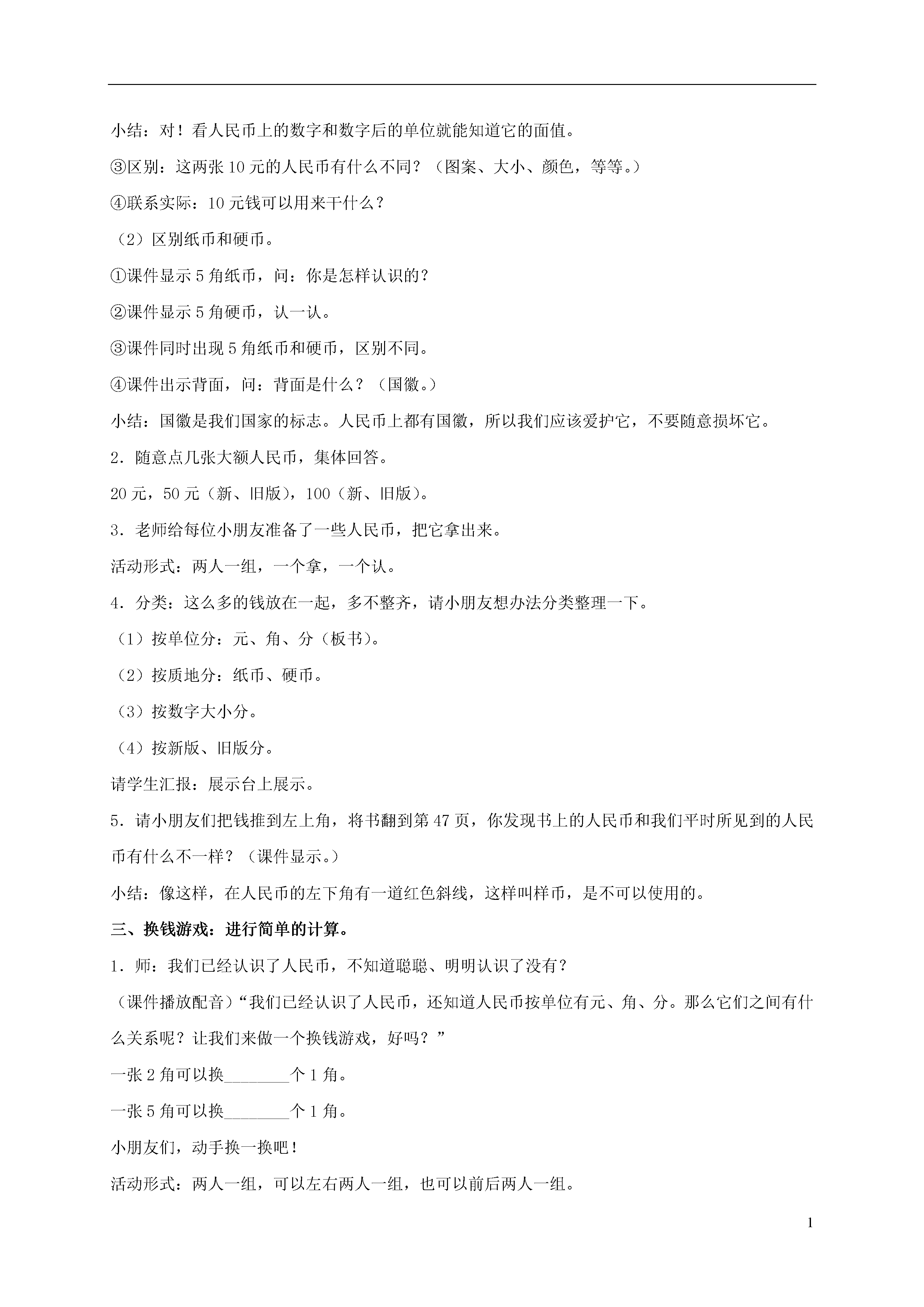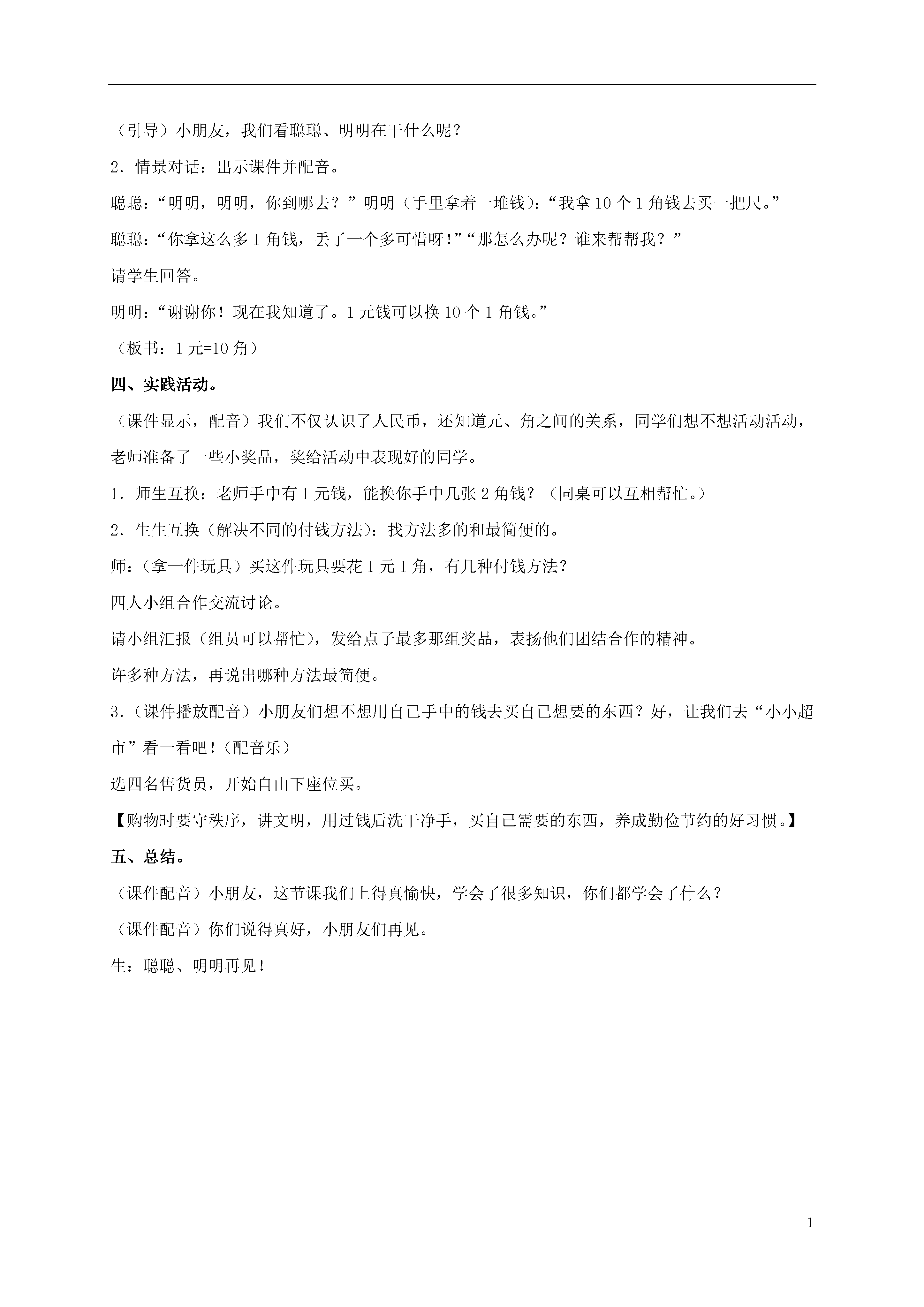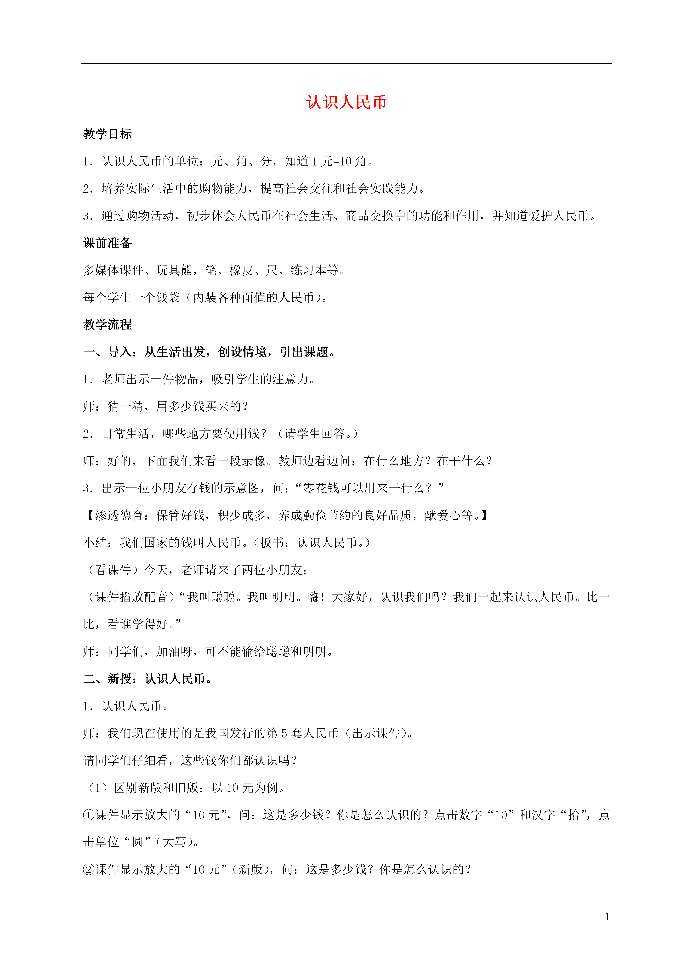 1认识人民币教学目标1.认识人民币的单位:元、角、分,知道1元=10角。2.培养实际生活中的购物能力,提高社会交往和社会实践能力。3.通过购物活动,初步体会人民币在社会生活、商品交换中的功能和作用,并知道爱护人民币。课前准备多媒体课件、玩具熊,笔、橡皮、尺、练习本等。每个学生一个钱袋(内装各种面值的人民币)。教学流程一、导入:从生活出发,创设情境,引出课题。1.老师出示一件物品,吸引学生的注意力。师:猜一猜,用多少钱买来的?2.日常生活,哪些地方要使用钱?(请学生回答。)师:好的,下面我们来看一段录像。教师边看边问:在什么地方?在干什么?3.出示一位小朋友存钱的示意图,问:“零花钱可以用来干什么?”【渗透德育:保管好钱,积少成多,养成勤俭节约的良好品质,献爱心等。】小结:我们国家的钱叫人民币。(板书:认识人民币。)(看课件)今天,老师请来了两位小朋友:(课件播放配音)“我叫聪聪。我叫明明。嗨!大家好,认识我们吗?我们一起来认识人民币。比一比,看谁学得好。”师:同学们,加油呀,可不能输给聪聪和明明。二、新授:认识人民币。1.认识人民币。师:我们现在使用的是我国发行的第5套人民币(出示课件)。请同学们仔细看,这些钱你们都认识吗?(1)区别新版和旧版:以10元为例。①课件显示放大的“10元”,问:这是多少钱?你是怎么认识的?点击数字“10”和汉字“拾”,点击单位“圆”(大写)。②课件显示放大的“10元”(新版),问:这是多少钱?你是怎么认识的?小结:对!看人民币上的数字和数字后的单位就能知道它的面值。③区别:这两张10元的人民币有什么不同?(图案、大小、颜色,等等。)④联系实际:10元钱可以用来干什么?(2)区别纸币和硬币。①课件显示5角纸币,问:你是怎样认识的?②课件显示5角硬币,认一认。③课件同时出现5角纸币和硬币,区别不同。④课件出示背面,问:背面是什么?(国徽。)小结:国徽是我们国家的标志。人民币上都有国徽,所以我们应该爱护它,不要随意损坏它。2.随意点几张大额人民币,集体回答。20元,50元(新、旧版),100(新、旧版)。3.老师给每位小朋友准备了一些人民币,把它拿出来。活动形式:两人一组,一个拿,一个认。4.分类:这么多的钱放在一起,多不整齐,请小朋友想办法分类整理一下。(1)按单位分:元、角、分(板书)。(2)按质地分:纸币、硬币。(3)按数字大小分。(4)按新版、旧版分。请学生汇报:展示台上展示。5.请小朋友们把钱推到左上角,将书翻到,你发现书上的人民币和我们平时所见到的人民币有什么不一样?(课件显示。)小结:像这样,在人民币的左下角有一道红色斜线,这样叫样币,是不可以使用的。三、换钱游戏:进行简单的计算。1.师:我们已经认识了人民币,不知道聪聪、明明认识了没有?(课件播放配音)“我们已经认识了人民币,还知道人民币按单位有元、角、分。那么它们之间有什么关系呢?让我们来做一个换钱游戏,好吗?”一张2角可以换________个1角。一张5角可以换________个1角。小朋友们,动手换一换吧!活动形式:两人一组,可以左右两人一组,也可以前后两人一组。(引导)小朋友,我们看聪聪、明明在干什么呢?2.情景对话:出示课件并配音。聪聪:“明明,明明,你到哪去?”明明(手里拿着一堆钱):“我拿10个1角钱去买一把尺。”聪聪:“你拿这么多1角钱,丢了一个多可惜呀!”“那怎么办呢?谁来帮帮我?”请学生回答。明明:“谢谢你!现在我知道了。1元钱可以换10个1角钱。”(板书:1元=10角)四、实践活动。(课件显示,配音)我们不仅认识了人民币,还知道元、角之间的关系,同学们想不想活动活动,老师准备了一些小奖品,奖给活动中表现好的同学。1.师生互换:老师手中有1元钱,能换你手中几张2角钱?(同桌可以互相帮忙。)2.生生互换(解决不同的付钱方法):找方法多的和最简便的。师:(拿一件玩具)买这件玩具要花1元1角,有几种付钱方法?四人小组合作交流讨论。请小组汇报(组员可以帮忙),发给点子最多那组奖品,表扬他们团结合作的精神。许多种方法,再说出哪种方法最简便。3.(课件播放配音)小朋友们想不想用自已手中的钱去买自已想要的东西?好,让我们去“小小超市”看一看吧!(配音乐)选四名售货员,开始自由下座位买。【购物时要守秩序,讲文明,用过钱后洗干净手,买自己需要的东西,养成勤俭节约的好习惯。】五、总结。(课件配音)小朋友,这节课我们上得真愉快,学会了很多知识,你们都学会了什么?(课件配音)你们说得真好,小朋友们再见。生:聪聪、明明再见!