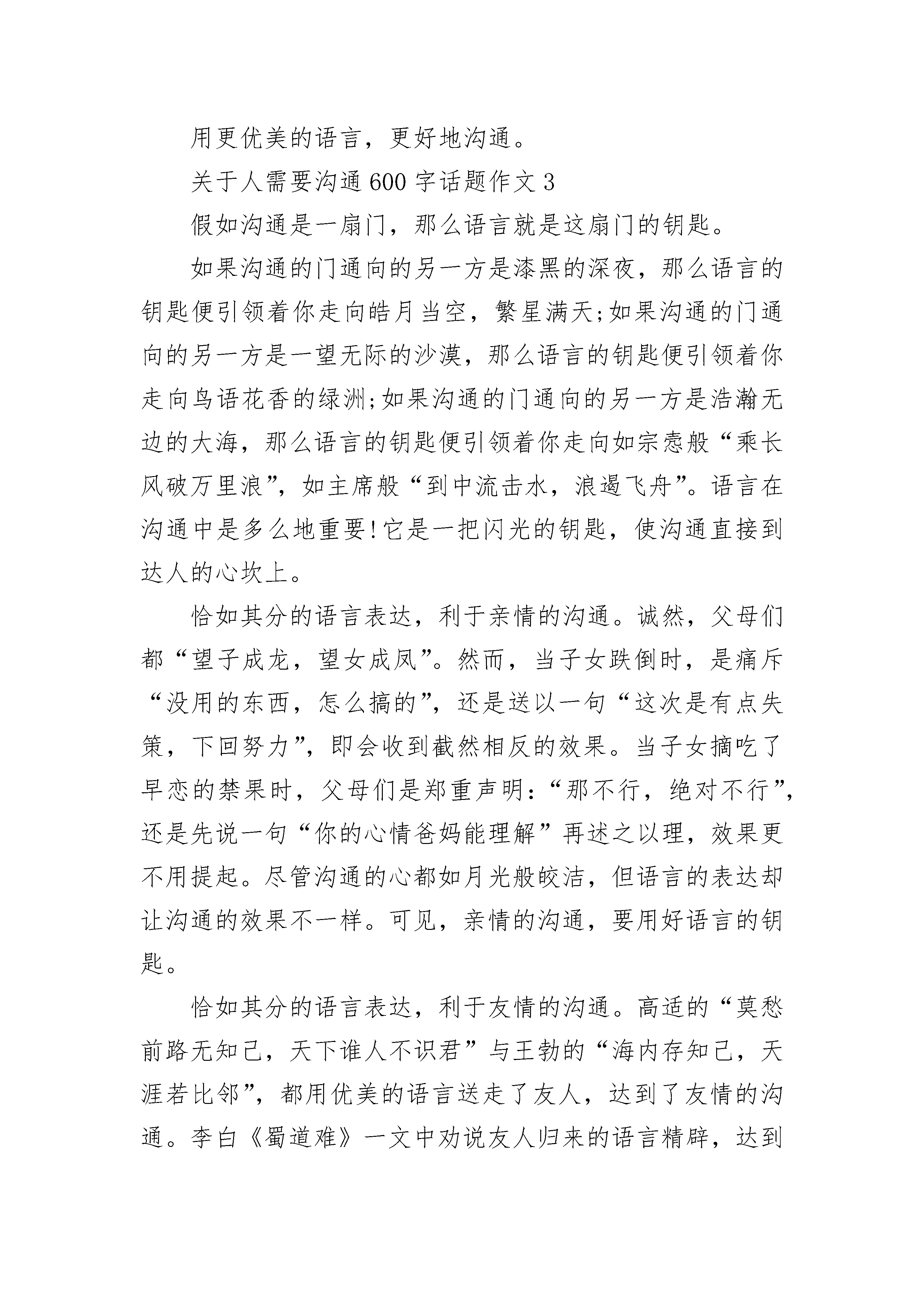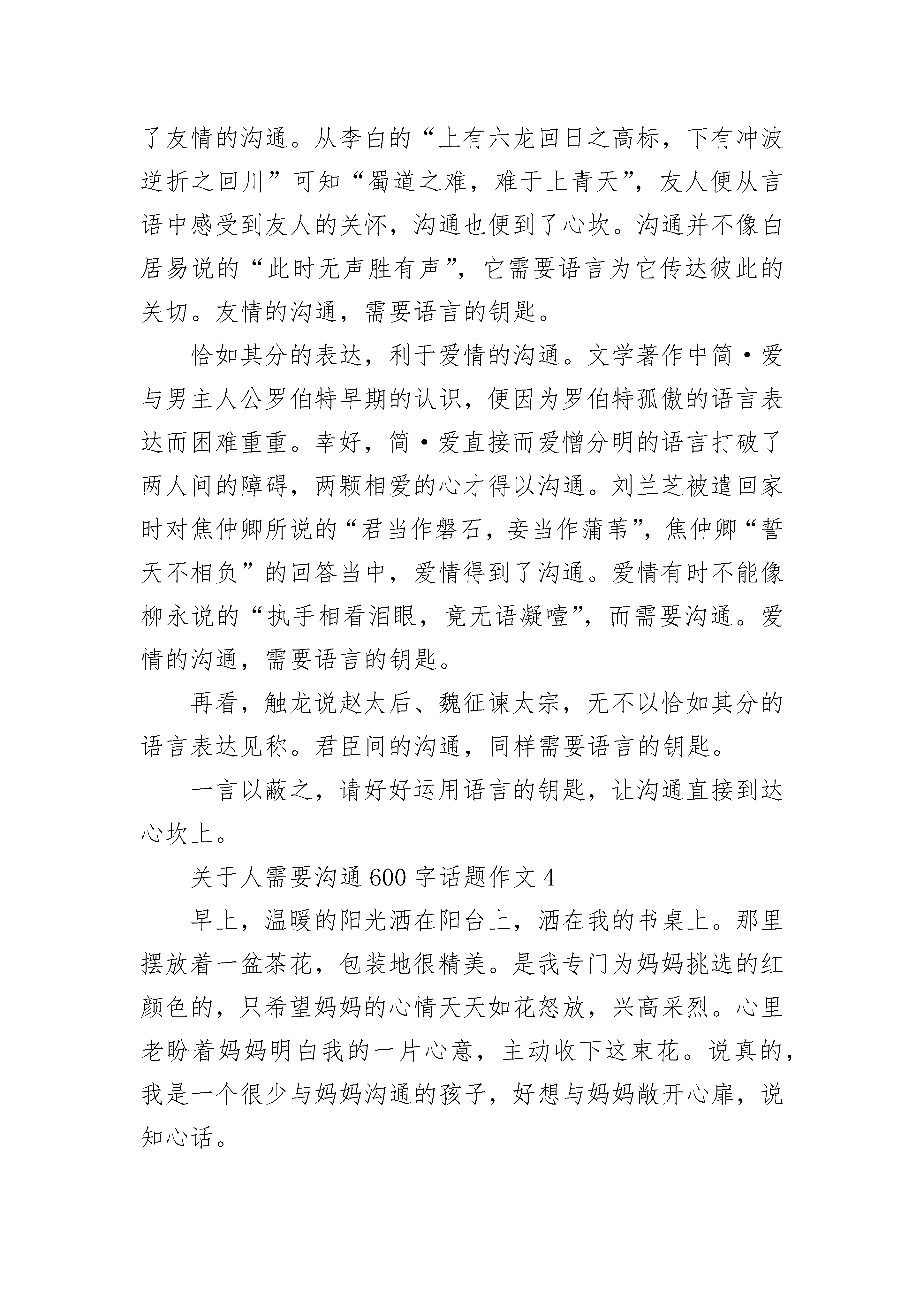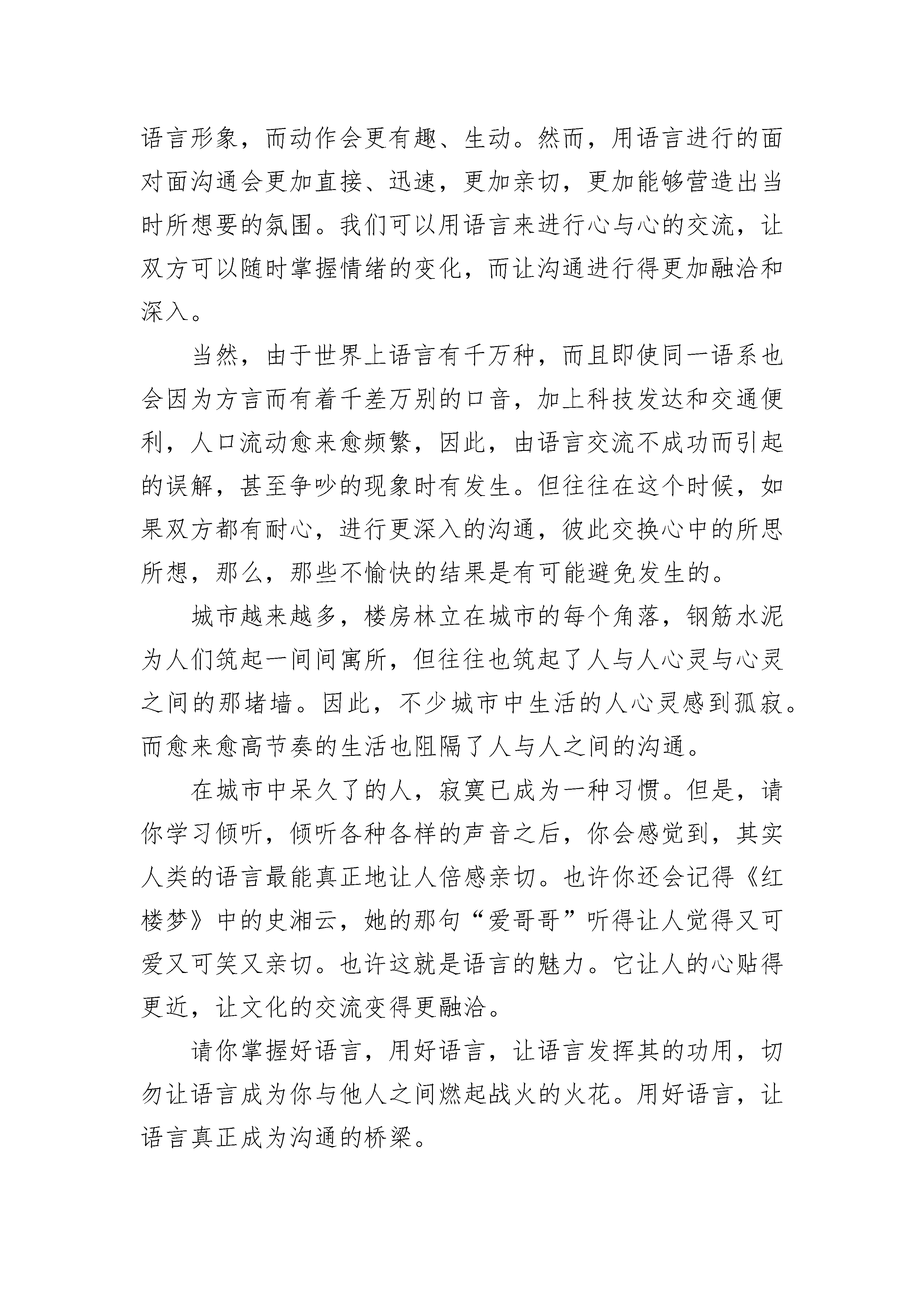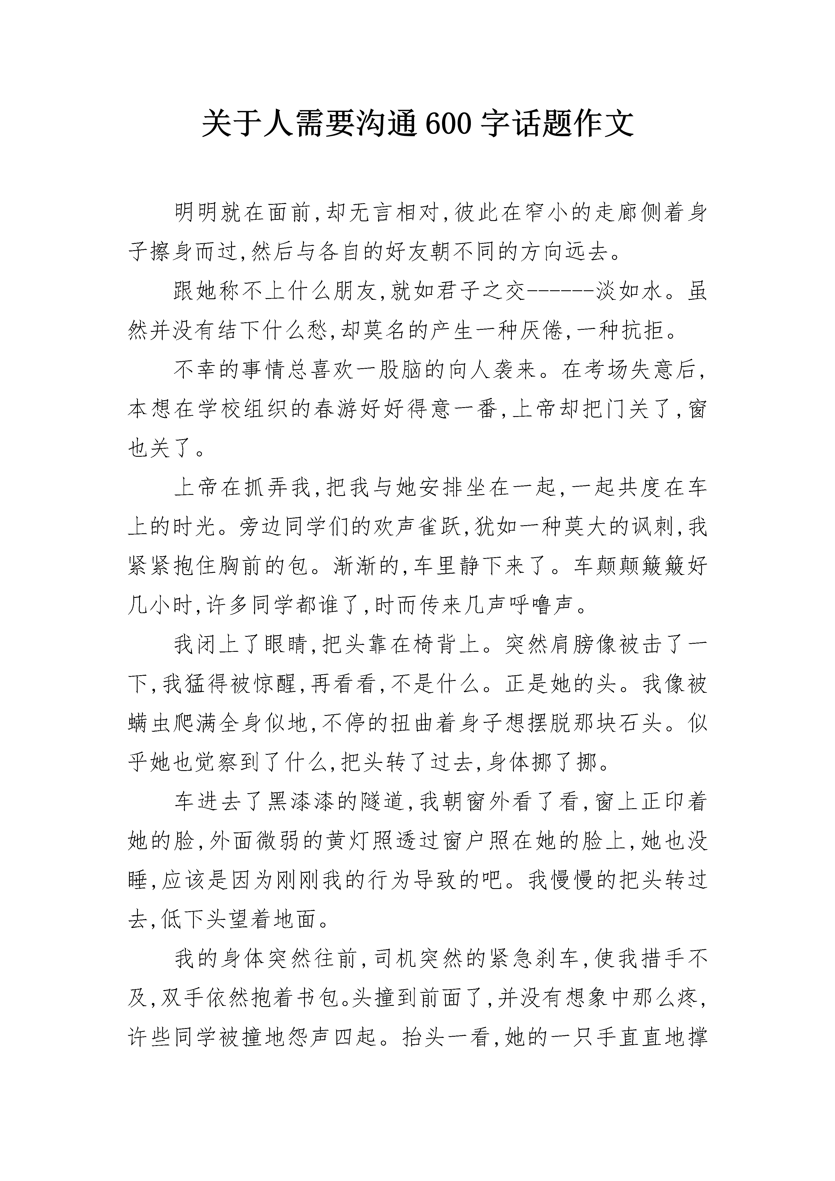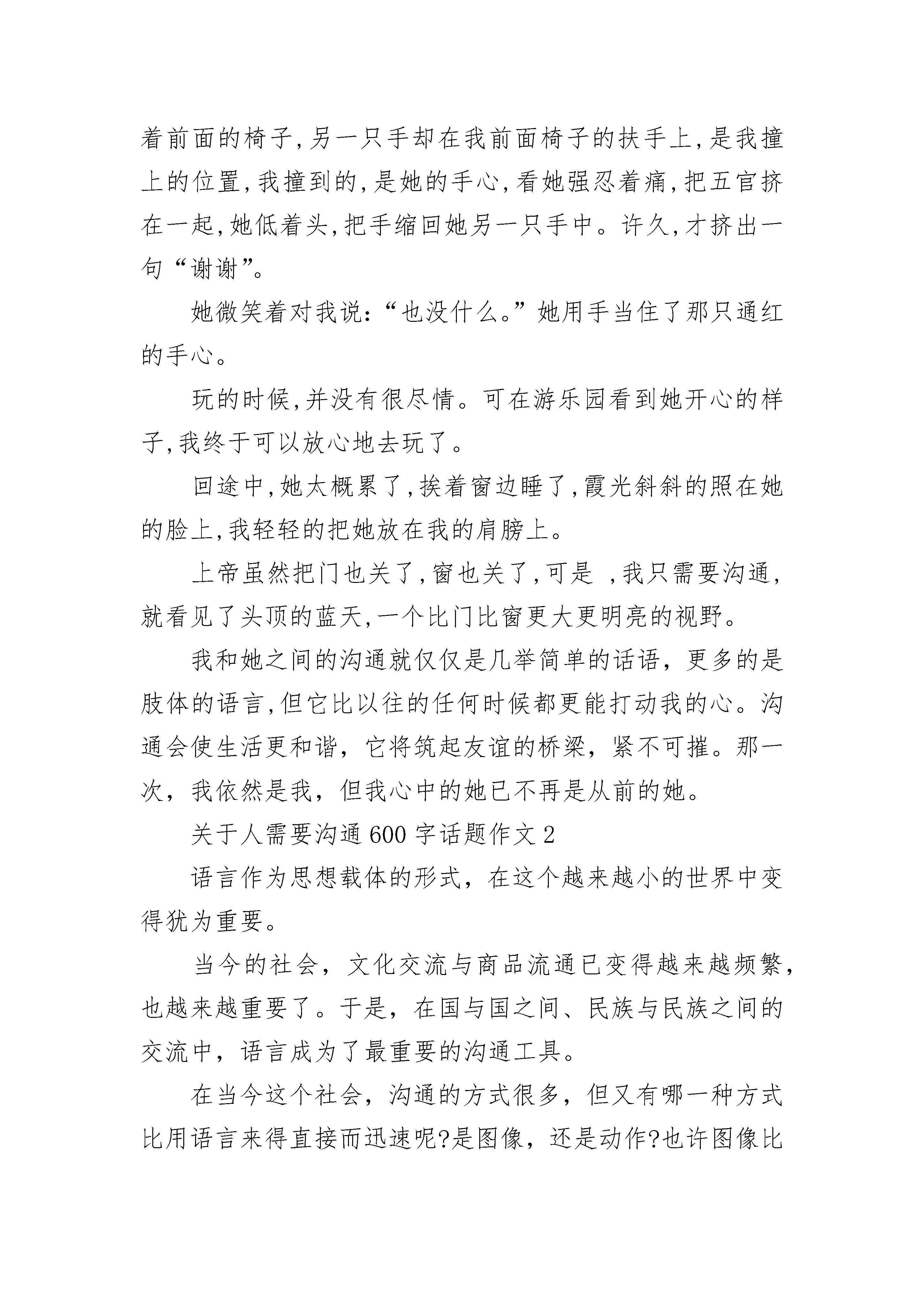 关于人需要沟通600字话题作文明明就在面前,却无言相对,彼此在窄小的走廊侧着身子擦身而过,然后与各自的好友朝不同的方向远去。跟她称不上什么朋友,就如君子之交------淡如水。虽然并没有结下什么愁,却莫名的产生一种厌倦,一种抗拒。不幸的事情总喜欢一股脑的向人袭来。在考场失意后,本想在学校组织的春游好好得意一番,上帝却把门关了,窗也关了。上帝在抓弄我,把我与她安排坐在一起,一起共度在车上的时光。旁边同学们的欢声雀跃,犹如一种莫大的讽刺,我紧紧抱住胸前的包。渐渐的,车里静下来了。车颠颠簸簸好几小时,许多同学都谁了,时而传来几声呼噜声。我闭上了眼睛,把头靠在椅背上。突然肩膀像被击了一下,我猛得被惊醒,再看看,不是什么。正是她的头。我像被螨虫爬满全身似地,不停的扭曲着身子想摆脱那块石头。似乎她也觉察到了什么,把头转了过去,身体挪了挪。车进去了黑漆漆的隧道,我朝窗外看了看,窗上正印着她的脸,外面微弱的黄灯照透过窗户照在她的脸上,她也没睡,应该是因为刚刚我的行为导致的吧。我慢慢的把头转过去,低下头望着地面。我的身体突然往前,司机突然的紧急刹车,使我措手不及,双手依然抱着书包。头撞到前面了,并没有想象中那么疼,许些同学被撞地怨声四起。抬头一看,她的一只手直直地撑着前面的椅子,另一只手却在我前面椅子的扶手上,是我撞上的位置,我撞到的,是她的手心,看她强忍着痛,把五官挤在一起,她低着头,把手缩回她另一只手中。许久,才挤出一句“谢谢”。她微笑着对我说:“也没什么。”她用手当住了那只通红的手心。玩的时候,并没有很尽情。可在游乐园看到她开心的样子,我终于可以放心地去玩了。回途中,她太概累了,挨着窗边睡了,霞光斜斜的照在她的脸上,我轻轻的把她放在我的肩膀上。上帝虽然把门也关了,窗也关了,可是,我只需要沟通,就看见了头顶的蓝天,一个比门比窗更大更明亮的视野。我和她之间的沟通就仅仅是几举简单的话语,更多的是肢体的语言,但它比以往的任何时候都更能打动我的心。沟通会使生活更和谐,它将筑起友谊的桥梁,紧不可摧。那一次,我依然是我,但我心中的她已不再是从前的她。关于人需要沟通600字话题作文2语言作为思想载体的形式,在这个越来越小的世界中变得犹为重要。当今的社会,文化交流与商品流通已变得越来越频繁,也越来越重要了。于是,在国与国之间、民族与民族之间的交流中,语言成为了最重要的沟通工具。在当今这个社会,沟通的方式很多,但又有哪一种方式比用语言来得直接而迅速呢?是图像,还是动作?也许图像比语言形象,而动作会更有趣、生动。然而,用语言进行的面对面沟通会更加直接、迅速,更加亲切,更加能够营造出当时所想要的氛围。我们可以用语言来进行心与心的交流,让双方可以随时掌握情绪的变化,而让沟通进行得更加融洽和深入。当然,由于世界上语言有千万种,而且即使同一语系也会因为方言而有着千差万别的口音,加上科技发达和交通便利,人口流动愈来愈频繁,因此,由语言交流不成功而引起的误解,甚至争吵的现象时有发生。但往往在这个时候,如果双方都有耐心,进行更深入的沟通,彼此交换心中的所思所想,那么,那些不愉快的结果是有可能避免发生的。城市越来越多,楼房林立在城市的每个角落,钢筋水泥为人们筑起一间间寓所,但往往也筑起了人与人心灵与心灵之间的那堵墙。因此,不少城市中生活的人心灵感到孤寂。而愈来愈高节奏的生活也阻隔了人与人之间的沟通。在城市中呆久了的人,寂寞已成为一种习惯。但是,请你学习倾听,倾听各种各样的声音之后,你会感觉到,其实人类的语言最能真正地让人倍感亲切。也许你还会记得《红楼梦》中的史湘云,她的那句“爱哥哥”听得让人觉得又可爱又可笑又亲切。也许这就是语言的魅力。它让人的心贴得更近,让文化的交流变得更融洽。请你掌握好语言,用好语言,让语言发挥其的功用,切勿让语言成为你与他人之间燃起战火的火花。用好语言,让语言真正成为沟通的桥梁。用更优美的语言,更好地沟通。关于人需要沟通600字话题作文3假如沟通是一扇门,那么语言就是这扇门的钥匙。如果沟通的门通向的另一方是漆黑的深夜,那么语言的钥匙便引领着你走向皓月当空,繁星满天;如果沟通的门通向的另一方是一望无际的沙漠,那么语言的钥匙便引领着你走向鸟语花香的绿洲;如果沟通的门通向的另一方是浩瀚无边的大海,那么语言的钥匙便引领着你走向如宗悫般“乘长风破万里浪”,如主席般“到中流击水,浪遏飞舟”。语言在沟通中是多么地重要!它是一把闪光的钥匙,使沟通直接到达人的心坎上。恰如其分的语言表达,利于亲情的沟通。诚然,父母们都“望子成龙,望女成凤”。然而,当子女跌倒时,是痛斥“没用的东西,怎么搞的”,还是送以一句“这次是有点失策,下回努力”,即会收到截然相反的效果。当子女摘吃了早恋的禁果时,父母们是郑重声明:“那不行,绝对不行”,还是先说一句“你的心情爸妈能理解”再述之以理,效