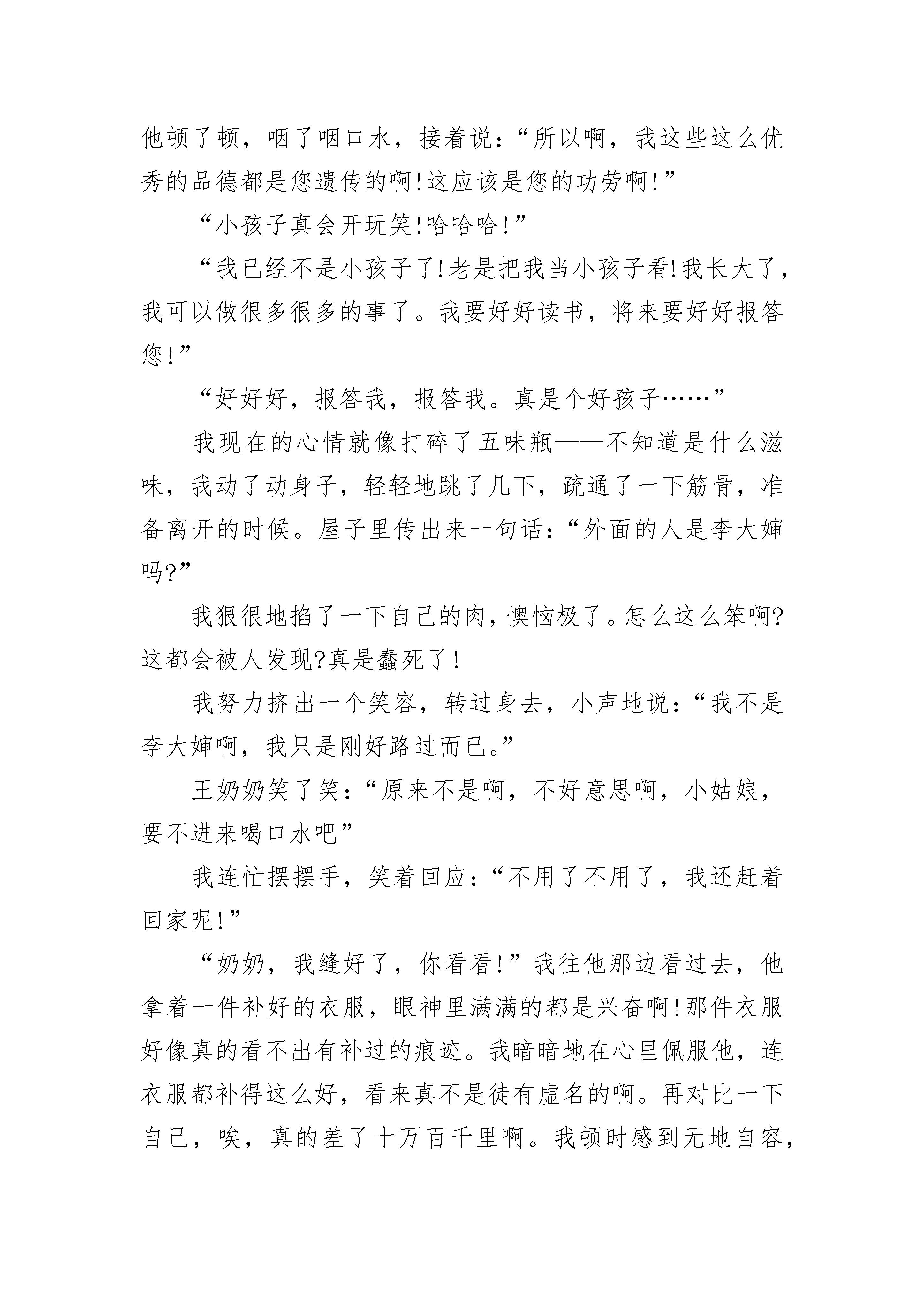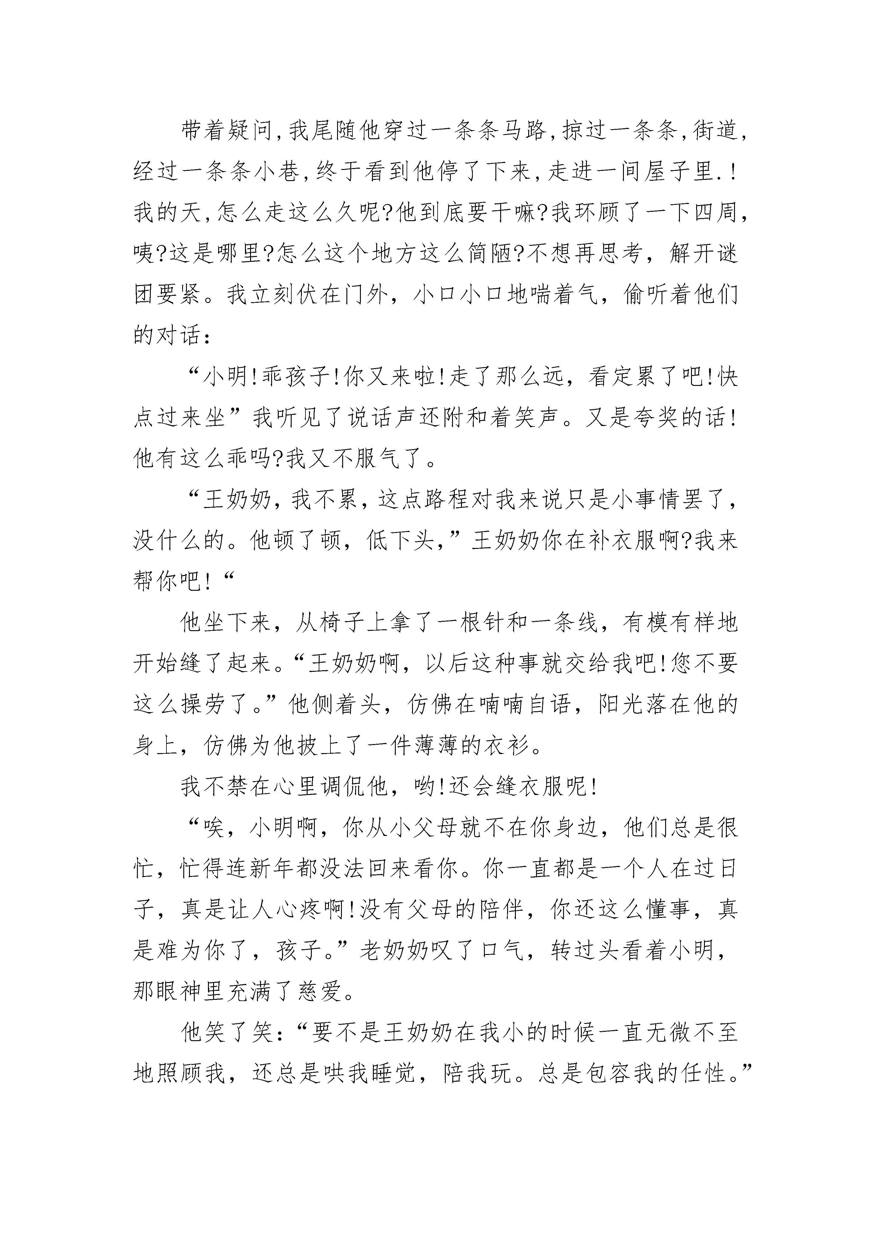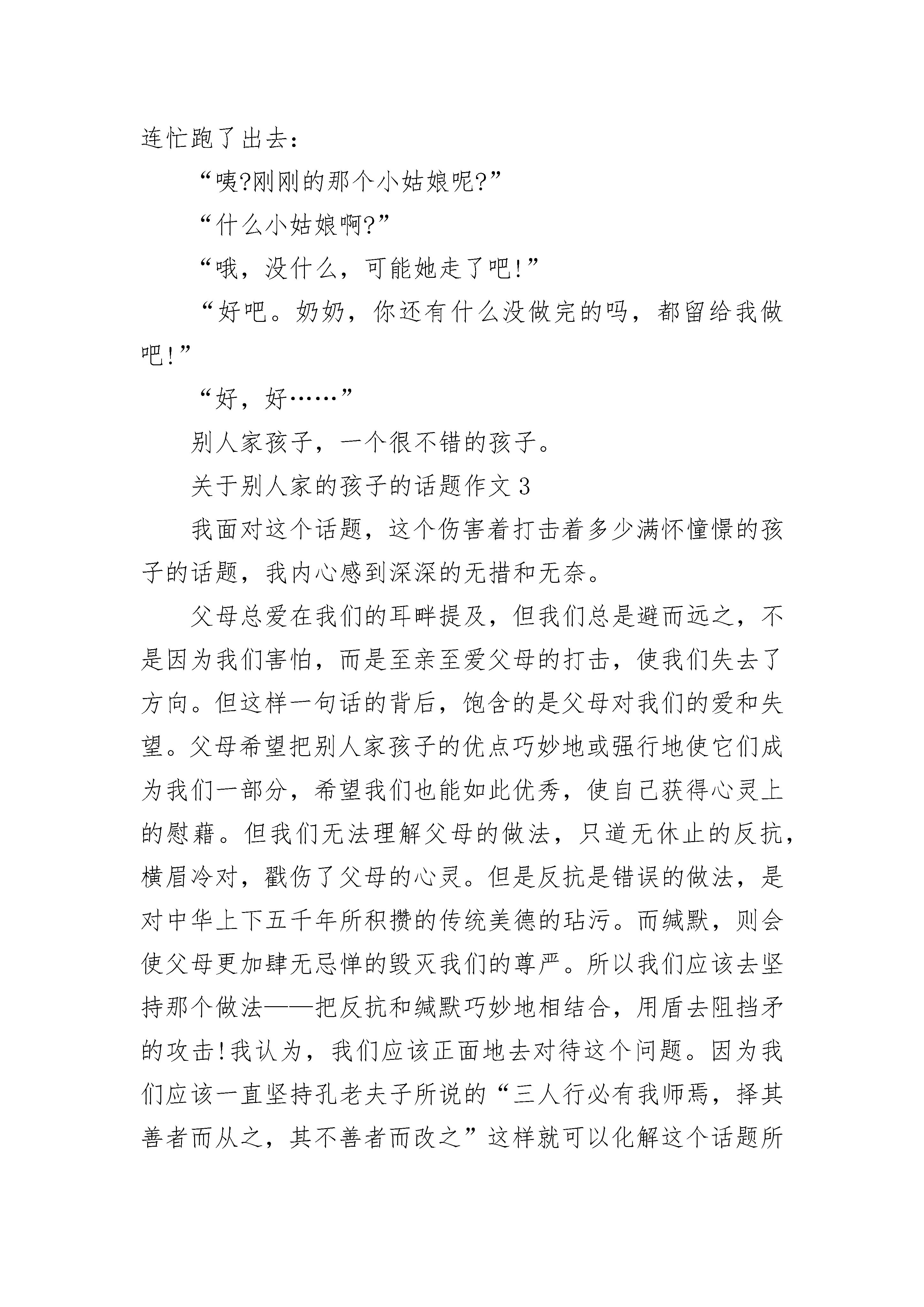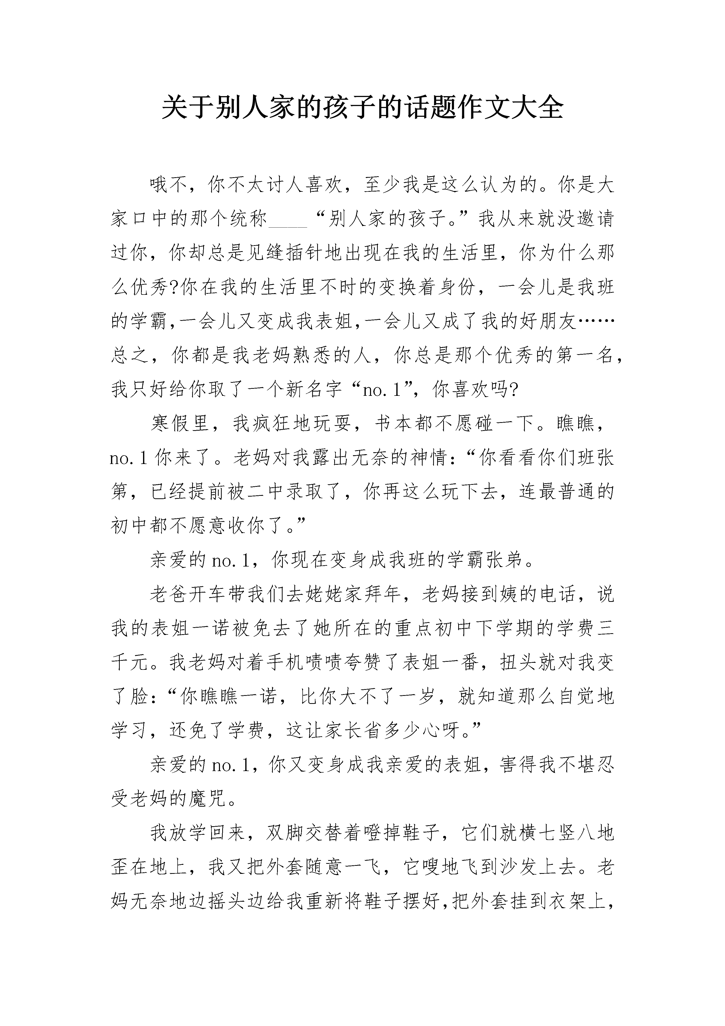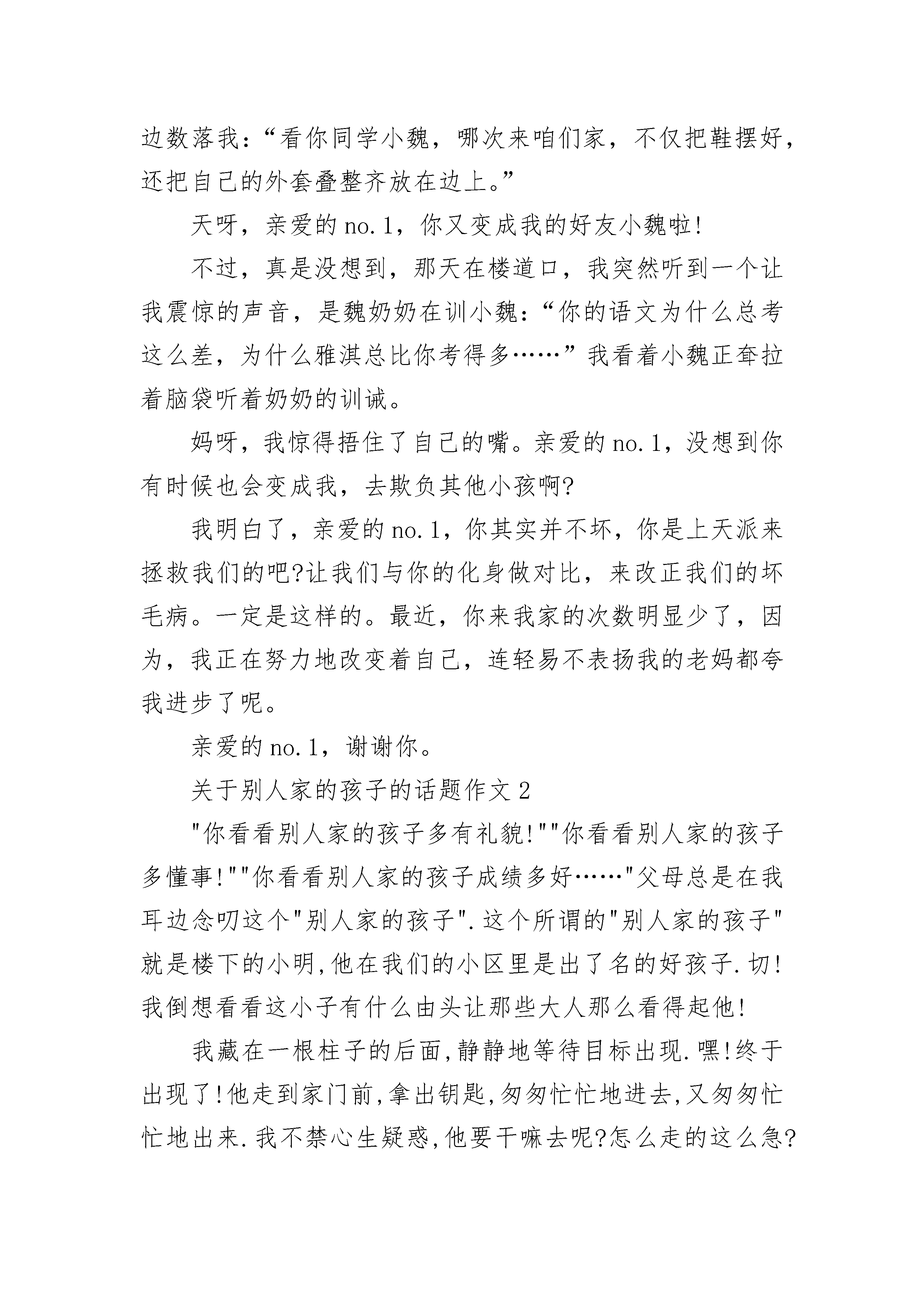 关于别人家的孩子的话题作文大全哦不,你不太讨人喜欢,至少我是这么认为的。你是大家口中的那个统称____“别人家的孩子。”我从来就没邀请过你,你却总是见缝插针地出现在我的生活里,你为什么那么优秀?你在我的生活里不时的变换着身份,一会儿是我班的学霸,一会儿又变成我表姐,一会儿又成了我的好朋友……总之,你都是我老妈熟悉的人,你总是那个优秀的第一名,我只好给你取了一个新名字“no.1”,你喜欢吗?寒假里,我疯狂地玩耍,书本都不愿碰一下。瞧瞧,no.1你来了。老妈对我露出无奈的神情:“你看看你们班张第,已经提前被二中录取了,你再这么玩下去,连最普通的初中都不愿意收你了。”亲爱的no.1,你现在变身成我班的学霸张弟。老爸开车带我们去姥姥家拜年,老妈接到姨的电话,说我的表姐一诺被免去了她所在的重点初中下学期的学费三千元。我老妈对着手机啧啧夸赞了表姐一番,扭头就对我变了脸:“你瞧瞧一诺,比你大不了一岁,就知道那么自觉地学习,还免了学费,这让家长省多少心呀。”亲爱的no.1,你又变身成我亲爱的表姐,害得我不堪忍受老妈的魔咒。我放学回来,双脚交替着噔掉鞋子,它们就横七竖八地歪在地上,我又把外套随意一飞,它嗖地飞到沙发上去。老妈无奈地边摇头边给我重新将鞋子摆好,把外套挂到衣架上,边数落我:“看你同学小魏,哪次来咱们家,不仅把鞋摆好,还把自己的外套叠整齐放在边上。”天呀,亲爱的no.1,你又变成我的好友小魏啦!不过,真是没想到,那天在楼道口,我突然听到一个让我震惊的声音,是魏奶奶在训小魏:“你的语文为什么总考这么差,为什么雅淇总比你考得多……”我看着小魏正耷拉着脑袋听着奶奶的训诫。妈呀,我惊得捂住了自己的嘴。亲爱的no.1,没想到你有时候也会变成我,去欺负其他小孩啊?我明白了,亲爱的no.1,你其实并不坏,你是上天派来拯救我们的吧?让我们与你的化身做对比,来改正我们的坏毛病。一定是这样的。最近,你来我家的次数明显少了,因为,我正在努力地改变着自己,连轻易不表扬我的老妈都夸我进步了呢。亲爱的no.1,谢谢你。关于别人家的孩子的话题作文2"你看看别人家的孩子多有礼貌!""你看看别人家的孩子多懂事!""你看看别人家的孩子成绩多好……"父母总是在我耳边念叨这个"别人家的孩子".这个所谓的"别人家的孩子"就是楼下的小明,他在我们的小区里是出了名的好孩子.切!我倒想看看这小子有什么由头让那些大人那么看得起他!我藏在一根柱子的后面,静静地等待目标出现.嘿!终于出现了!他走到家门前,拿出钥匙,匆匆忙忙地进去,又匆匆忙忙地出来.我不禁心生疑惑,他要干嘛去呢?怎么走的这么急?带着疑问,我尾随他穿过一条条马路,掠过一条条,街道,经过一条条小巷,终于看到他停了下来,走进一间屋子里.!我的天,怎么走这么久呢?他到底要干嘛?我环顾了一下四周,咦?这是哪里?怎么这个地方这么简陋?不想再思考,解开谜团要紧。我立刻伏在门外,小口小口地喘着气,偷听着他们的对话:“小明!乖孩子!你又来啦!走了那么远,看定累了吧!快点过来坐”我听见了说话声还附和着笑声。又是夸奖的话!他有这么乖吗?我又不服气了。“王奶奶,我不累,这点路程对我来说只是小事情罢了,没什么的。他顿了顿,低下头,”王奶奶你在补衣服啊?我来帮你吧!“他坐下来,从椅子上拿了一根针和一条线,有模有样地开始缝了起来。“王奶奶啊,以后这种事就交给我吧!您不要这么操劳了。”他侧着头,仿佛在喃喃自语,阳光落在他的身上,仿佛为他披上了一件薄薄的衣衫。我不禁在心里调侃他,哟!还会缝衣服呢!“唉,小明啊,你从小父母就不在你身边,他们总是很忙,忙得连新年都没法回来看你。你一直都是一个人在过日子,真是让人心疼啊!没有父母的陪伴,你还这么懂事,真是难为你了,孩子。”老奶奶叹了口气,转过头看着小明,那眼神里充满了慈爱。他笑了笑:“要不是王奶奶在我小的时候一直无微不至地照顾我,还总是哄我睡觉,陪我玩。总是包容我的任性。”他顿了顿,咽了咽口水,接着说:“所以啊,我这些这么优秀的品德都是您遗传的啊!这应该是您的功劳啊!”“小孩子真会开玩笑!哈哈哈!”“我已经不是小孩子了!老是把我当小孩子看!我长大了,我可以做很多很多的事了。我要好好读书,将来要好好报答您!”“好好好,报答我,报答我。真是个好孩子……”我现在的心情就像打碎了五味瓶——不知道是什么滋味,我动了动身子,轻轻地跳了几下,疏通了一下筋骨,准备离开的时候。屋子里传出来一句话:“外面的人是李大婶吗?”我狠很地掐了一下自己的肉,懊恼极了。怎么这么笨啊?这都会被人发现?真是蠢死了!我努力挤出一个笑容,转过身去,小声地说:“我不是李大婶啊,我只是刚好路过而已。”王奶奶笑了笑:“原来不是啊,不好意思啊,小姑娘,要不进来喝口水吧”我连忙摆摆手,笑着回应:“不用了不用了,我还赶着回家呢!”“奶奶,我缝好了,你看看!”我