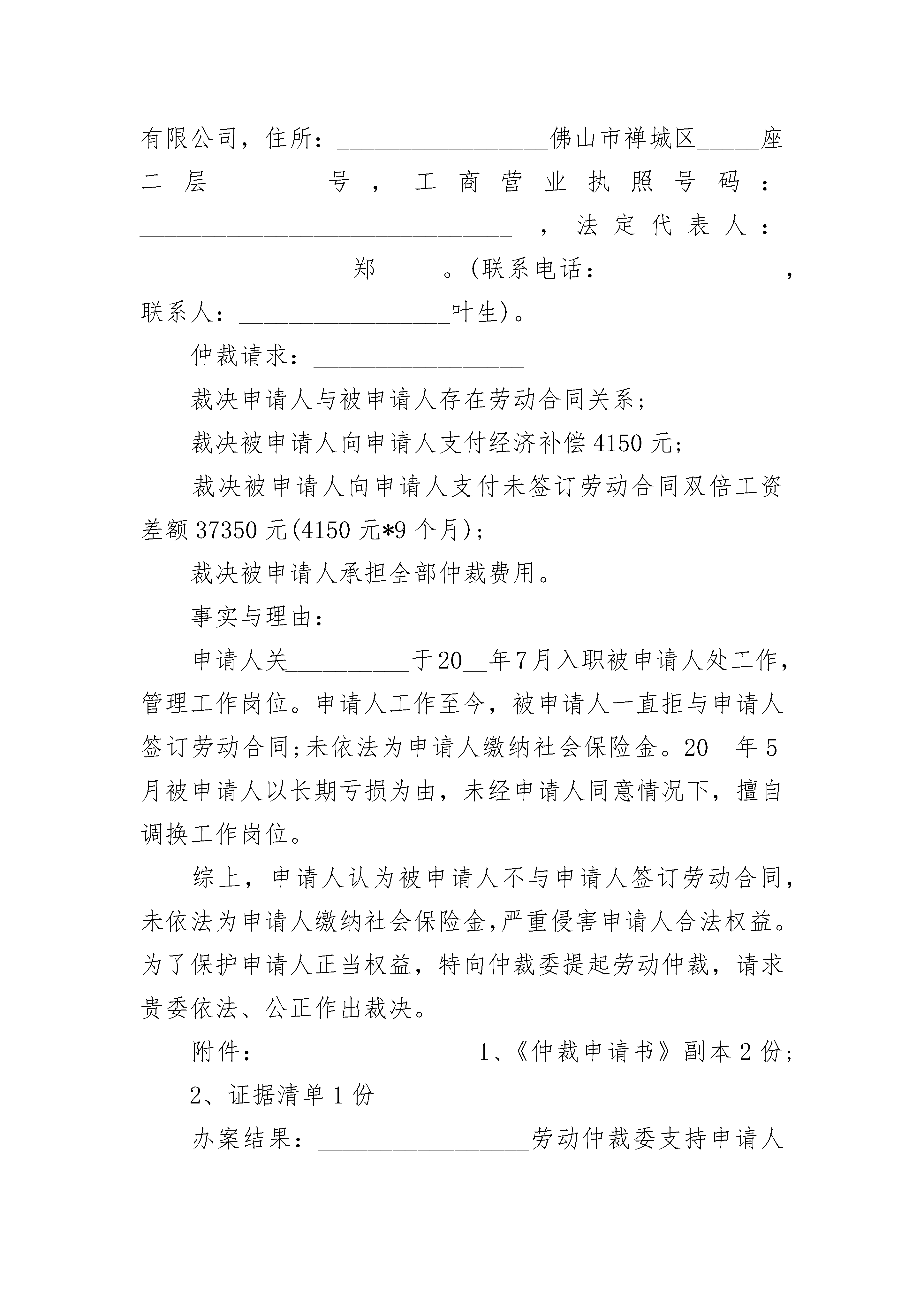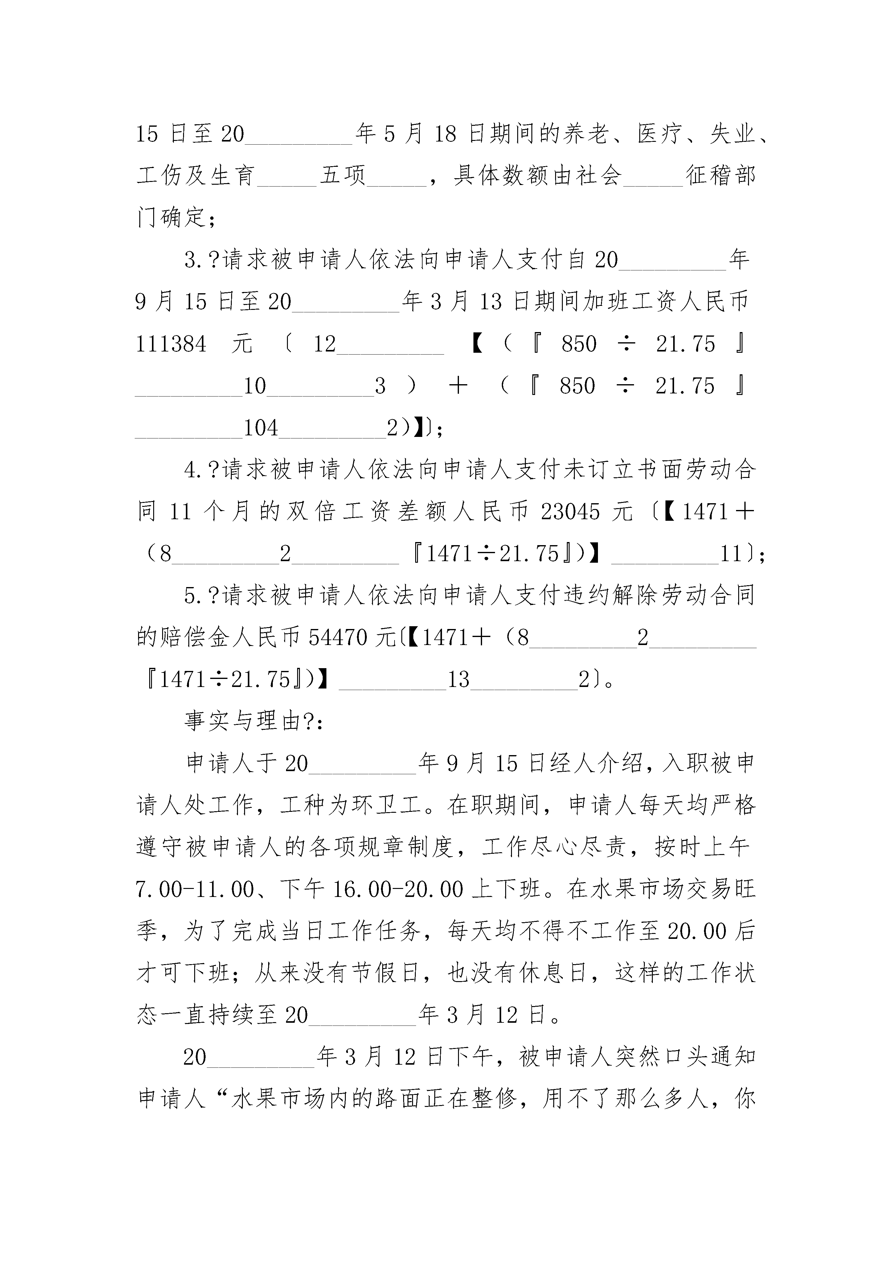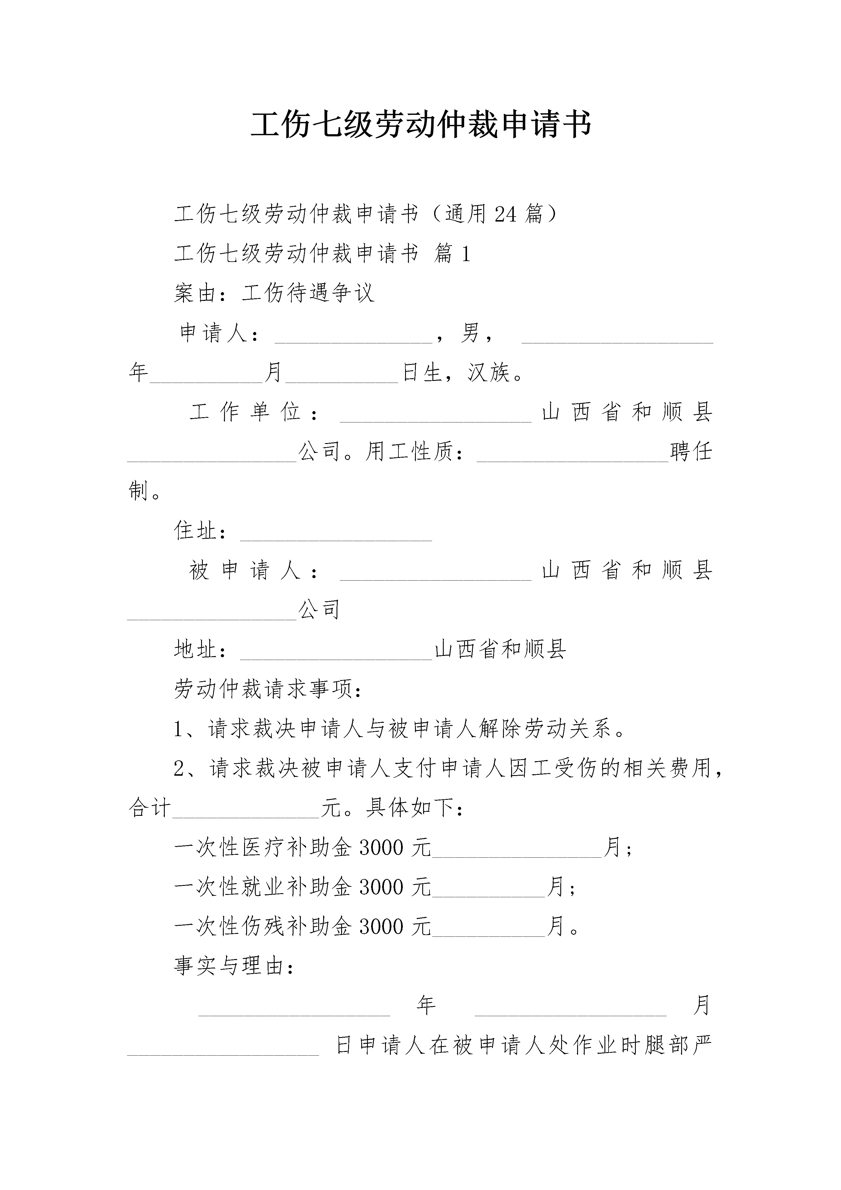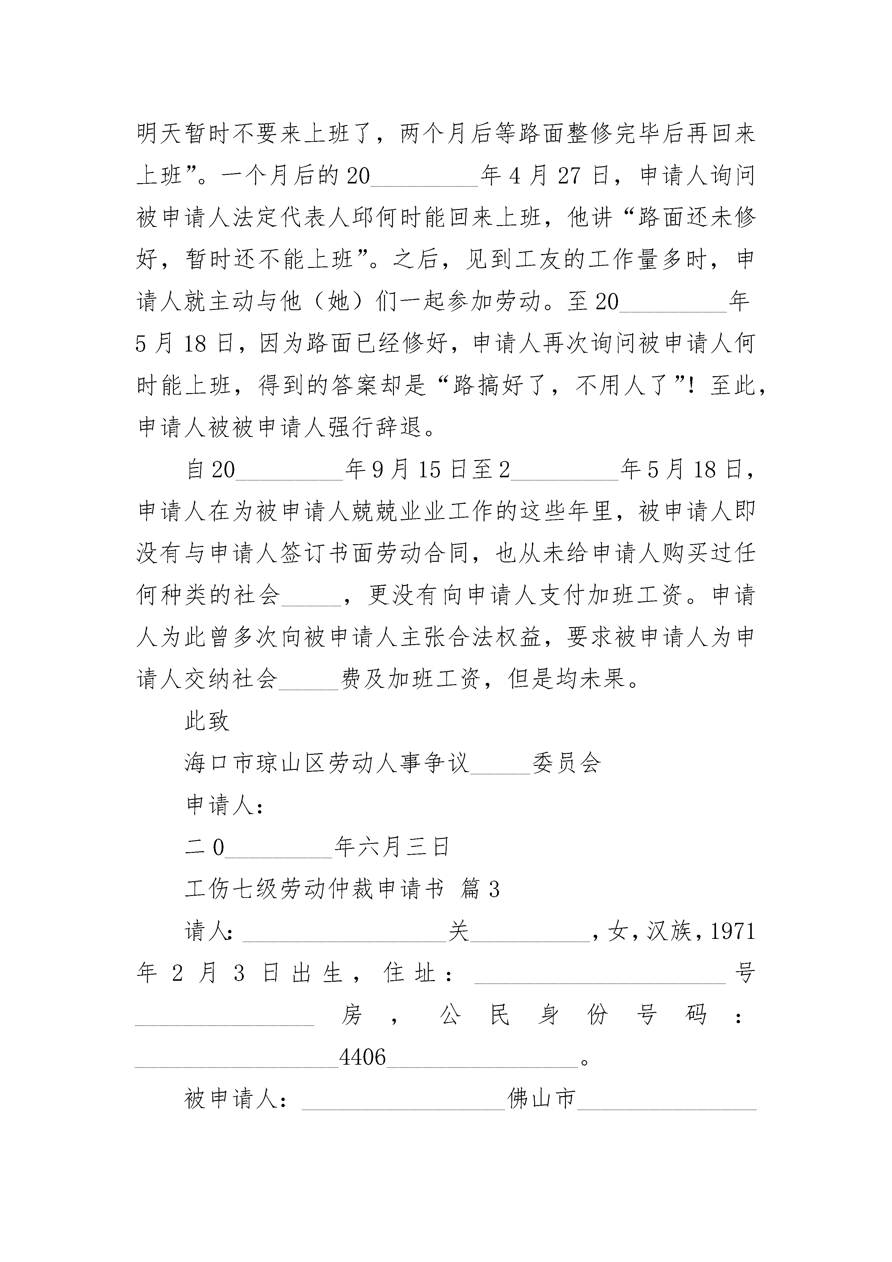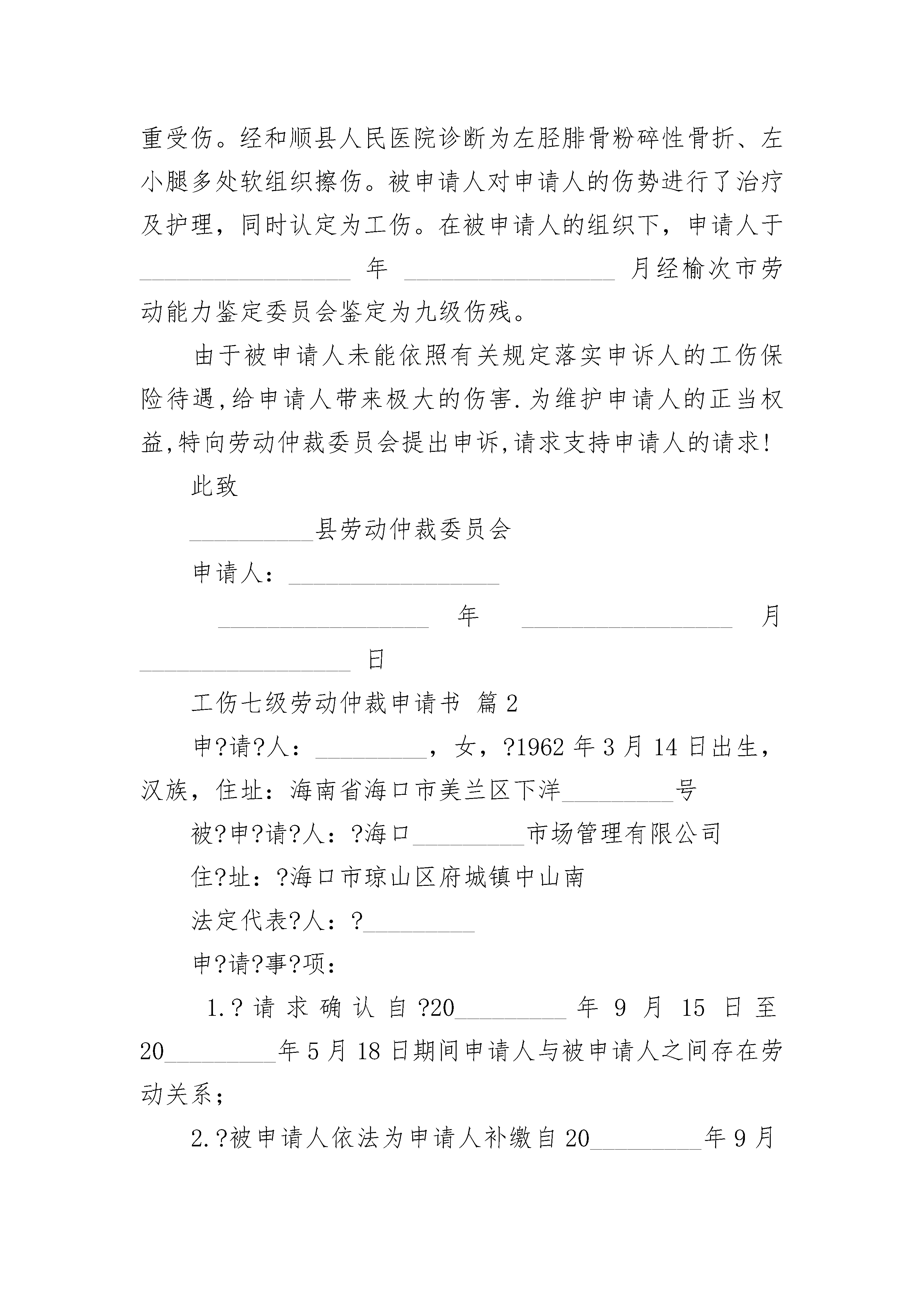 工伤七级劳动仲裁申请书工伤七级劳动仲裁申请书(通用24篇)工伤七级劳动仲裁申请书篇1案由:工伤待遇争议申请人:______________,男,_________________年__________月__________日生,汉族。工作单位:_________________山西省和顺县_______________公司。用工性质:_________________聘任制。住址:_________________被申请人:_________________山西省和顺县_______________公司地址:_________________山西省和顺县劳动仲裁请求事项:1、请求裁决申请人与被申请人解除劳动关系。2、请求裁决被申请人支付申请人因工受伤的相关费用,合计_____________元。具体如下:一次性医疗补助金3000元_______________月;一次性就业补助金3000元__________月;一次性伤残补助金3000元__________月。事实与理由:_________________年_________________月_________________日申请人在被申请人处作业时腿部严重受伤。经和顺县人民医院诊断为左胫腓骨粉碎性骨折、左小腿多处软组织擦伤。被申请人对申请人的伤势进行了治疗及护理,同时认定为工伤。在被申请人的组织下,申请人于_________________年_________________月经榆次市劳动能力鉴定委员会鉴定为九级伤残。由于被申请人未能依照有关规定落实申诉人的工伤保险待遇,给申请人带来极大的伤害.为维护申请人的正当权益,特向劳动仲裁委员会提出申诉,请求支持申请人的请求!此致__________县劳动仲裁委员会申请人:__________________________________年_________________月_________________日工伤七级劳动仲裁申请书篇2申?请?人:_________,女,?1962年3月14日出生,汉族,住址:海南省海口市美兰区下洋_________号被?申?请?人:?海口_________市场管理有限公司住?址:?海口市琼山区府城镇中山南法定代表?人:?_________申?请?事?项:1.?请求确认自?20_________年9月15日至20_________年5月18日期间申请人与被申请人之间存在劳动关系;2.?被申请人依法为申请人补缴自20_________年9月15日至20_________年5月18日期间的养老、医疗、失业、工伤及生育_____五项_____,具体数额由社会_____征稽部门确定;3.?请求被申请人依法向申请人支付自20_________年9月15日至20_________年3月13日期间加班工资人民币111384元〔12_________【(『850÷21.75』_________10_________3)+(『850÷21.75』_________104_________2)】〕;4.?请求被申请人依法向申请人支付未订立书面劳动合同11个月的双倍工资差额人民币23045元〔【1471+(8_________2_________『1471÷21.75』)】_________11〕;5.?请求被申请人依法向申请人支付违约解除劳动合同的赔偿金人民币54470元〔【1471+(8_________2_________『1471÷21.75』)】_________13_________2〕。事实与理由?:申请人于20_________年9月15日经人介绍,入职被申请人处工作,工种为环卫工。在职期间,申请人每天均严格遵守被申请人的各项规章制度,工作尽心尽责,按时上午7.00-11.00、下午16.00-20.00上下班。在水果市场交易旺季,为了完成当日工作任务,每天均不得不工作至20.00后才可下班;从来没有节假日,也没有休息日,这样的工作状态一直持续至20_________年3月12日。20_________年3月12日下午,被申请人突然口头通知申请人“水果市场内的路面正在整修,用不了那么多人,你明天暂时不要来上班了,两个月后等路面整修完毕后再回来上班”。一个月后的20_________年4月27日,申请人询问被申请人法定代表人邱何时能回来上班,他讲“路面还未修好,暂时还不能上班”。之后,见到工友的工作量多时,申请人就主动与他(她)们一起参加劳动。至20_________年5月18日,因为路面已经修好,申请人再次询问被申请人何时能上班,得到的答案却是“路搞好了,不用人了”!至此,申请人被被申请人强行辞退。自20_________年9月15日至2_________年5月18日,申请人在为被申请人兢兢业业工