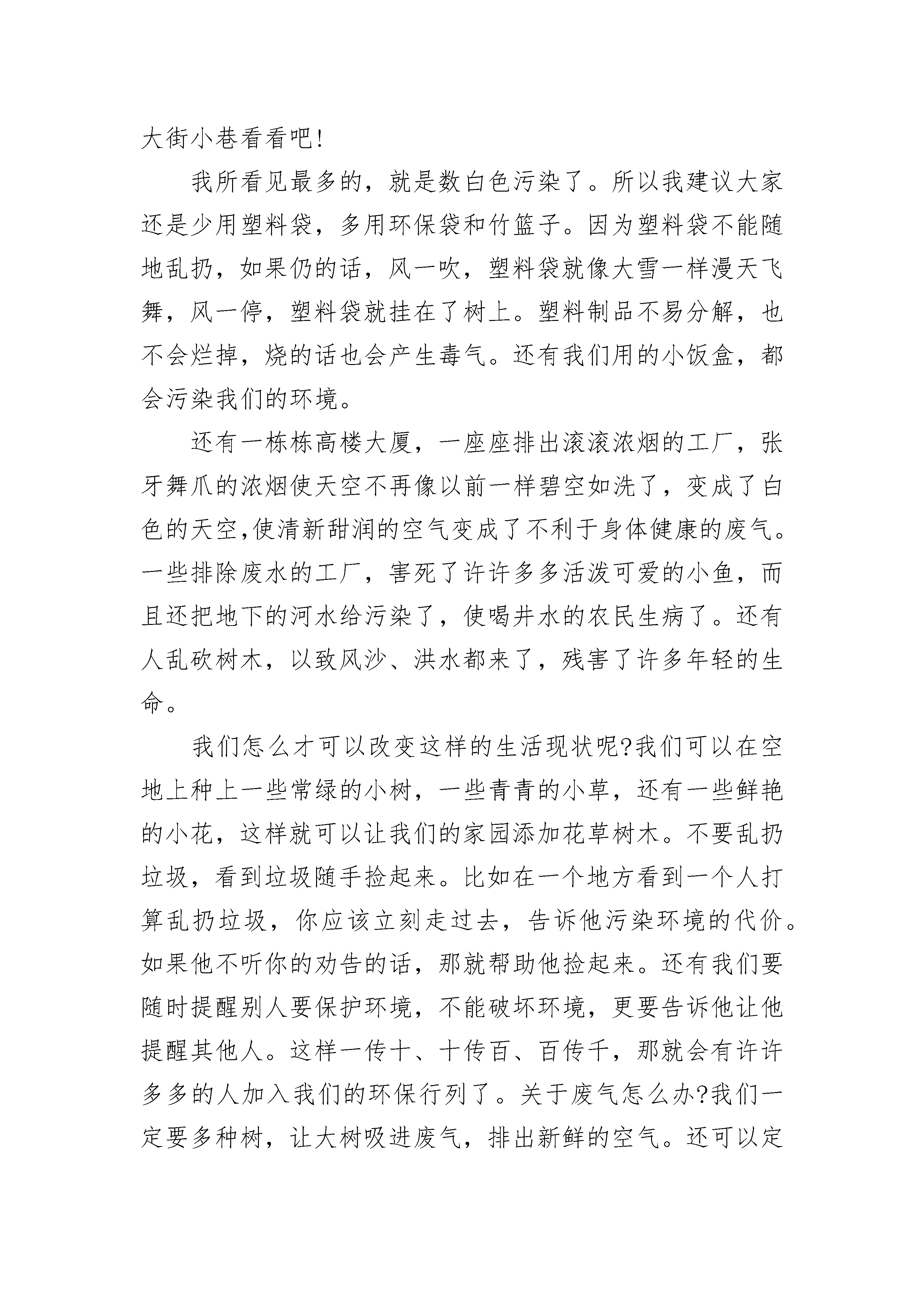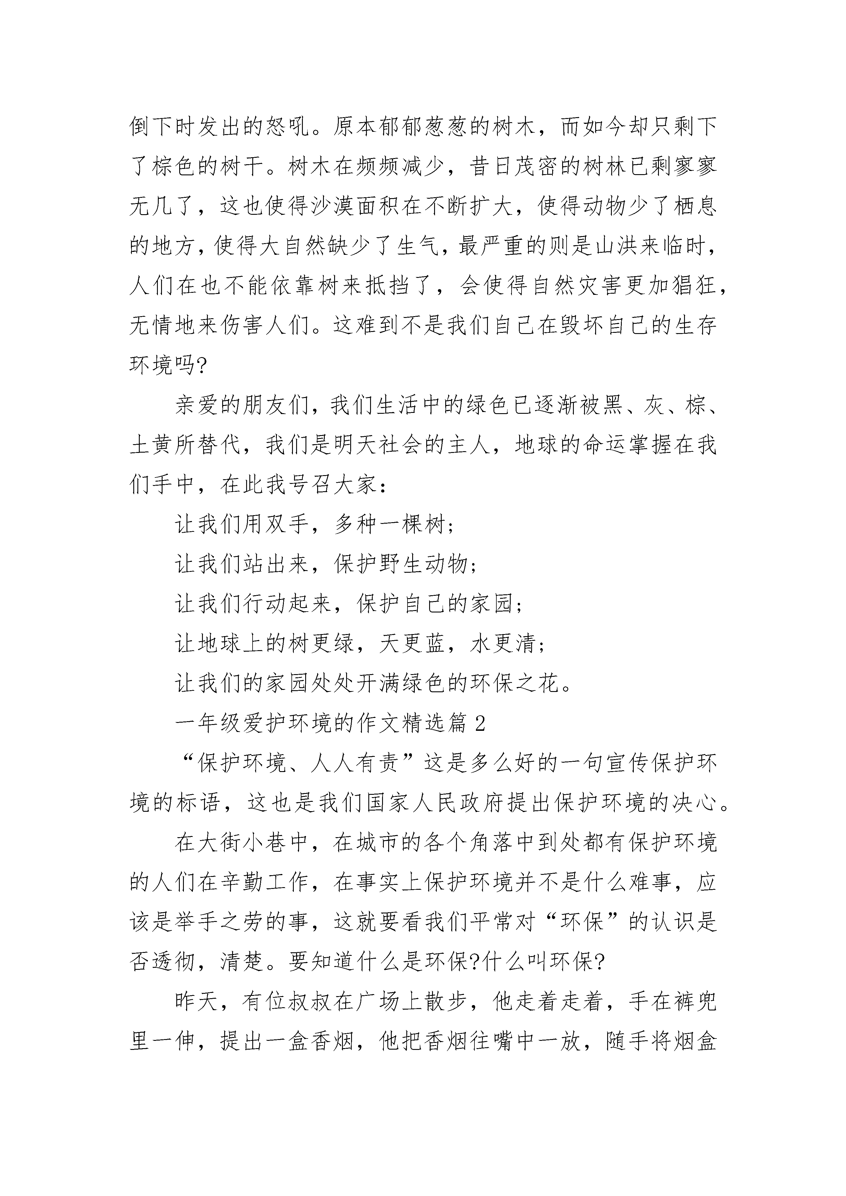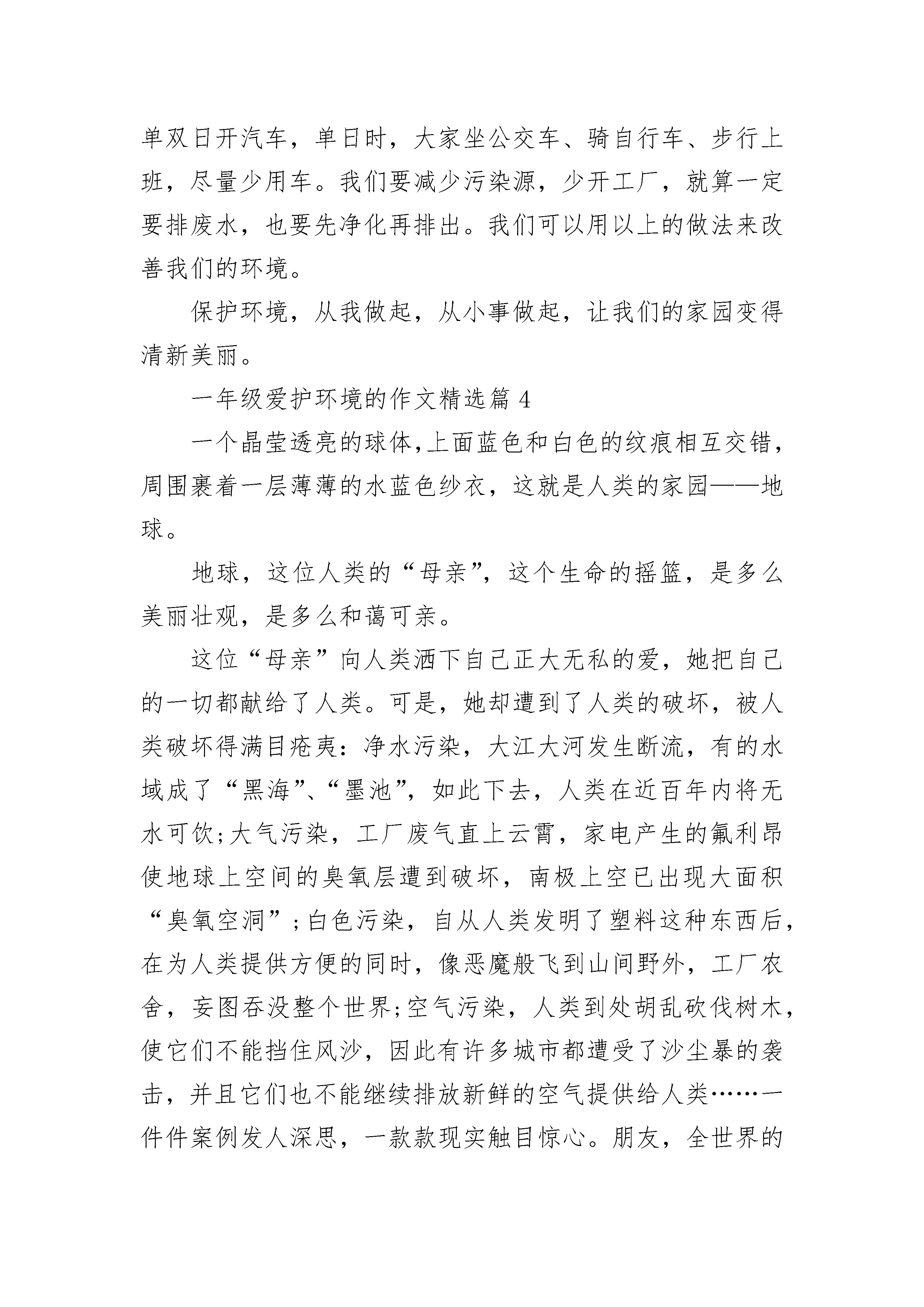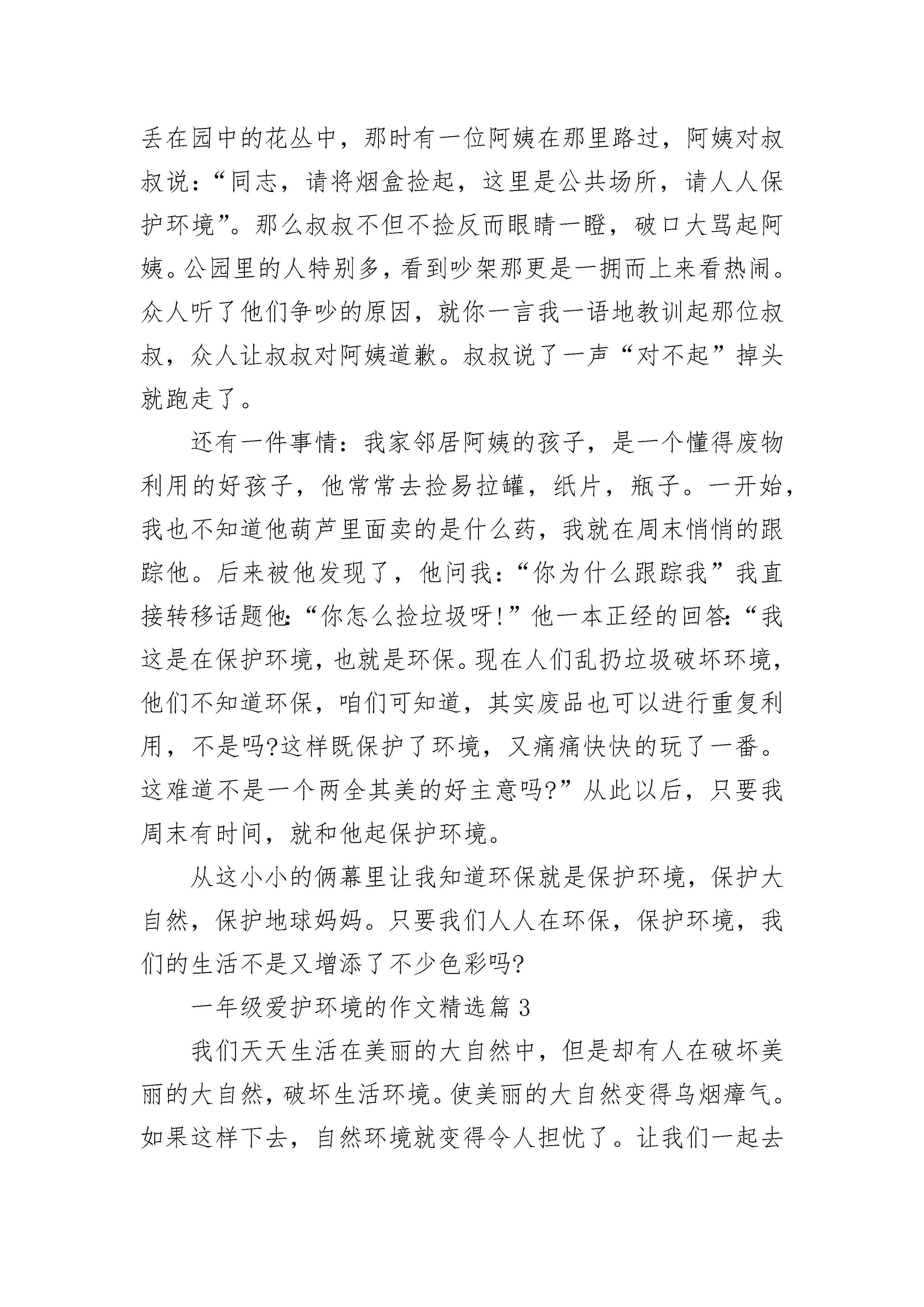 一年级爱护环境的作文一年级爱护环境的作文精选篇1环保的重要性是世人皆知的。环保是我们每个人义不容辞的责任和义务。如果大家不环保,那么我们这个世界即将被推到生死边缘。我常常想:环保是什么?绿色又是什么?当我们看见鸟儿在天空中遨游,您一定认为世界上的动物多得数不胜数吧!噢,不得不告诉您您完全想错了,如今,由于人们的大量捕杀和环境的日益污染,动物的家园已成了一片灰色,它们的生存已经受到了影响,正面临着危机,频临着灭绝。动物的生命与人类的生活息息相关。人们伤害动物就等于伤害自己。水是生命的源泉,一切生物都离不开它。现在,工厂越来越多,大多数河流都因为它们排放的污水而受到了污染,许多的小溪成了黑色的。动物们遭遇悲惨的命运。想象一下,如果您只能用生活中被污染的水,洗脸、洗手、洗头发了,人生中如此苦恼的事,你该怎么办?如果您家中停水一天该怎么办?一个月?一年?如果您走在沙漠里,炽热的太阳烤晒着大地,此时您已渴得嘴存干裂了,却没有一滴水,或许我们只有在这样的情况下,才会感到水的可贵,才能懂得珍惜水。树木,绿色的象征,它不但能净化空气,还能起到光合作用。每天都能听见嗡嗡的电锯声和一棵棵大树的呻吟声或倒下时发出的怒吼。原本郁郁葱葱的树木,而如今却只剩下了棕色的树干。树木在频频减少,昔日茂密的树林已剩寥寥无几了,这也使得沙漠面积在不断扩大,使得动物少了栖息的地方,使得大自然缺少了生气,最严重的则是山洪来临时,人们在也不能依靠树来抵挡了,会使得自然灾害更加猖狂,无情地来伤害人们。这难到不是我们自己在毁坏自己的生存环境吗?亲爱的朋友们,我们生活中的绿色已逐渐被黑、灰、棕、土黄所替代,我们是明天社会的主人,地球的命运掌握在我们手中,在此我号召大家:让我们用双手,多种一棵树;让我们站出来,保护野生动物;让我们行动起来,保护自己的家园;让地球上的树更绿,天更蓝,水更清;让我们的家园处处开满绿色的环保之花。一年级爱护环境的作文精选篇2“保护环境、人人有责”这是多么好的一句宣传保护环境的标语,这也是我们国家人民政府提出保护环境的决心。在大街小巷中,在城市的各个角落中到处都有保护环境的人们在辛勤工作,在事实上保护环境并不是什么难事,应该是举手之劳的事,这就要看我们平常对“环保”的认识是否透彻,清楚。要知道什么是环保?什么叫环保?昨天,有位叔叔在广场上散步,他走着走着,手在裤兜里一伸,提出一盒香烟,他把香烟往嘴中一放,随手将烟盒丢在园中的花丛中,那时有一位阿姨在那里路过,阿姨对叔叔说:“同志,请将烟盒捡起,这里是公共场所,请人人保护环境”。那么叔叔不但不捡反而眼睛一瞪,破口大骂起阿姨。公园里的人特别多,看到吵架那更是一拥而上来看热闹。众人听了他们争吵的原因,就你一言我一语地教训起那位叔叔,众人让叔叔对阿姨道歉。叔叔说了一声“对不起”掉头就跑走了。还有一件事情:我家邻居阿姨的孩子,是一个懂得废物利用的好孩子,他常常去捡易拉罐,纸片,瓶子。一开始,我也不知道他葫芦里面卖的是什么药,我就在周末悄悄的跟踪他。后来被他发现了,他问我:“你为什么跟踪我”我直接转移话题他:“你怎么捡垃圾呀!”他一本正经的回答:“我这是在保护环境,也就是环保。现在人们乱扔垃圾破坏环境,他们不知道环保,咱们可知道,其实废品也可以进行重复利用,不是吗?这样既保护了环境,又痛痛快快的玩了一番。这难道不是一个两全其美的好主意吗?”从此以后,只要我周末有时间,就和他起保护环境。从这小小的俩幕里让我知道环保就是保护环境,保护大自然,保护地球妈妈。只要我们人人在环保,保护环境,我们的生活不是又增添了不少色彩吗?一年级爱护环境的作文精选篇3我们天天生活在美丽的大自然中,但是却有人在破坏美丽的大自然,破坏生活环境。使美丽的大自然变得乌烟瘴气。如果这样下去,自然环境就变得令人担忧了。让我们一起去大街小巷看看吧!我所看见最多的,就是数白色污染了。所以我建议大家还是少用塑料袋,多用环保袋和竹篮子。因为塑料袋不能随地乱扔,如果仍的话,风一吹,塑料袋就像大雪一样漫天飞舞,风一停,塑料袋就挂在了树上。塑料制品不易分解,也不会烂掉,烧的话也会产生毒气。还有我们用的小饭盒,都会污染我们的环境。还有一栋栋高楼大厦,一座座排出滚滚浓烟的工厂,张牙舞爪的浓烟使天空不再像以前一样碧空如洗了,变成了白色的天空,使清新甜润的空气变成了不利于身体健康的废气。一些排除废水的工厂,害死了许许多多活泼可爱的小鱼,而且还把地下的河水给污染了,使喝井水的农民生病了。还有人乱砍树木,以致风沙、洪水都来了,残害了许多年轻的生命。我们怎么才可以改变这样的生活现状呢?我们可以在空地上种上一些常绿的小树,一些青青的小草,还有一些鲜艳的小花,这样就可以让我们的家园添加花草树木。不要乱扔垃圾,看到垃圾随手捡起来。比如在一个地方看到一个人打算乱扔垃圾,你应该立刻走过