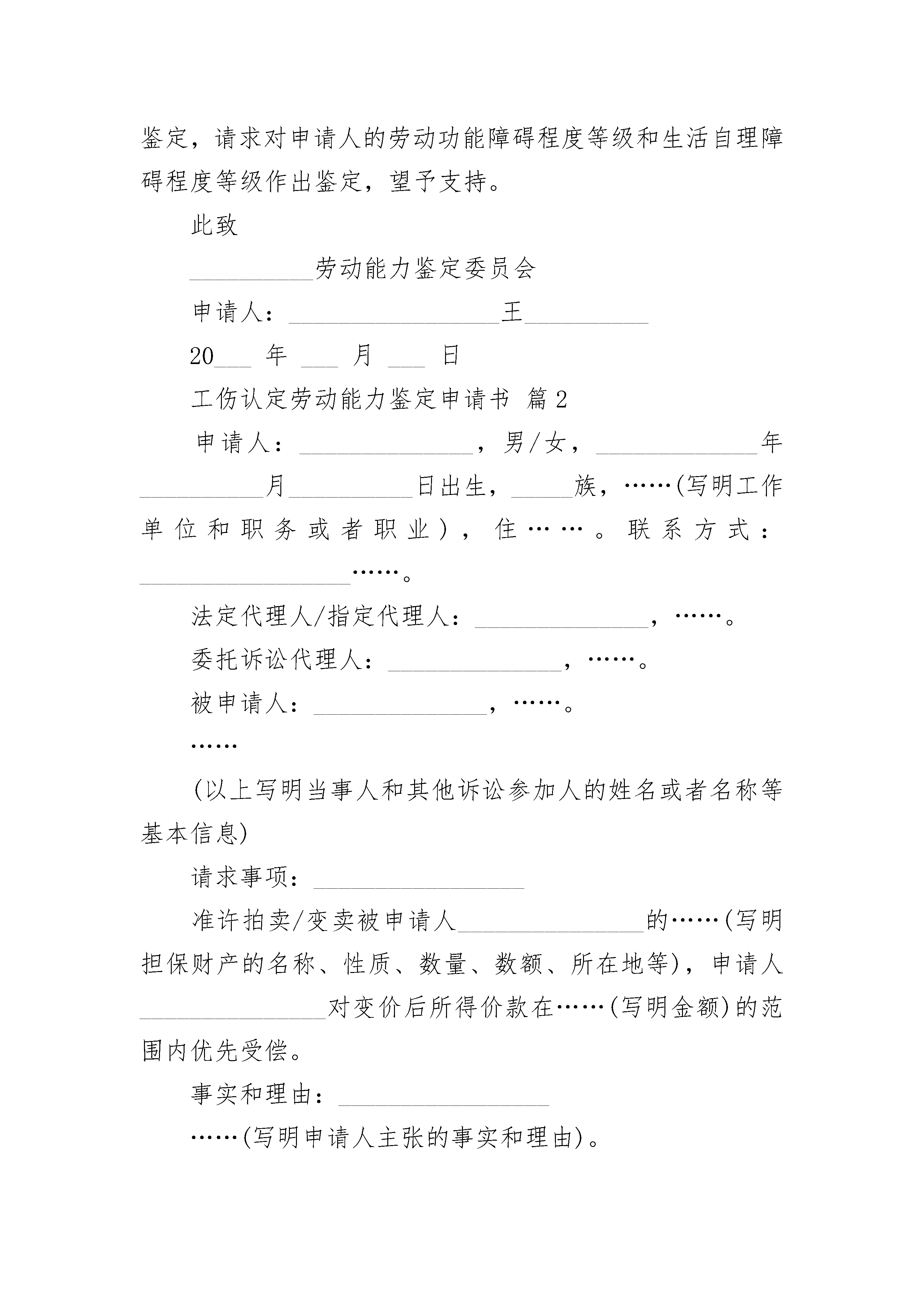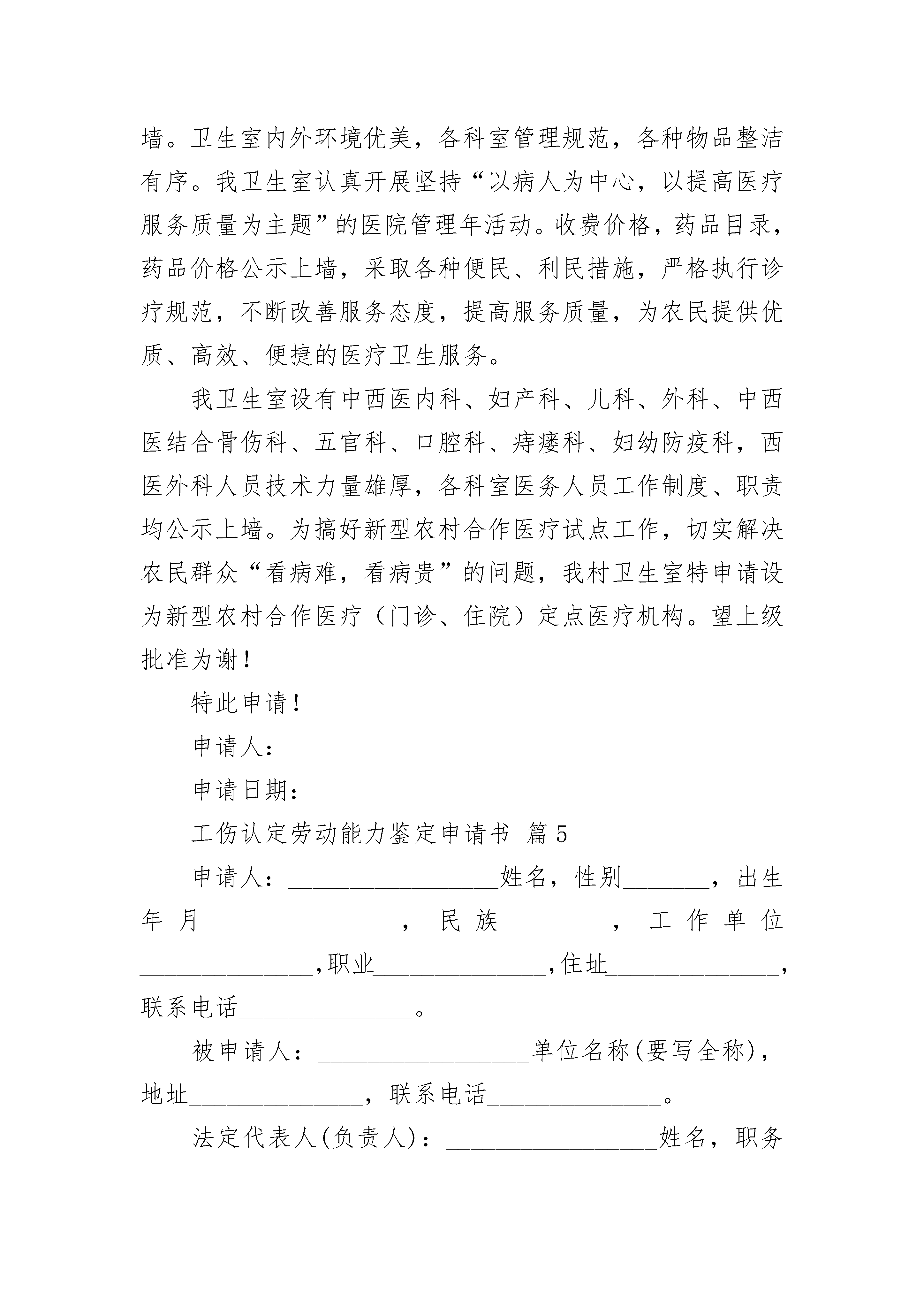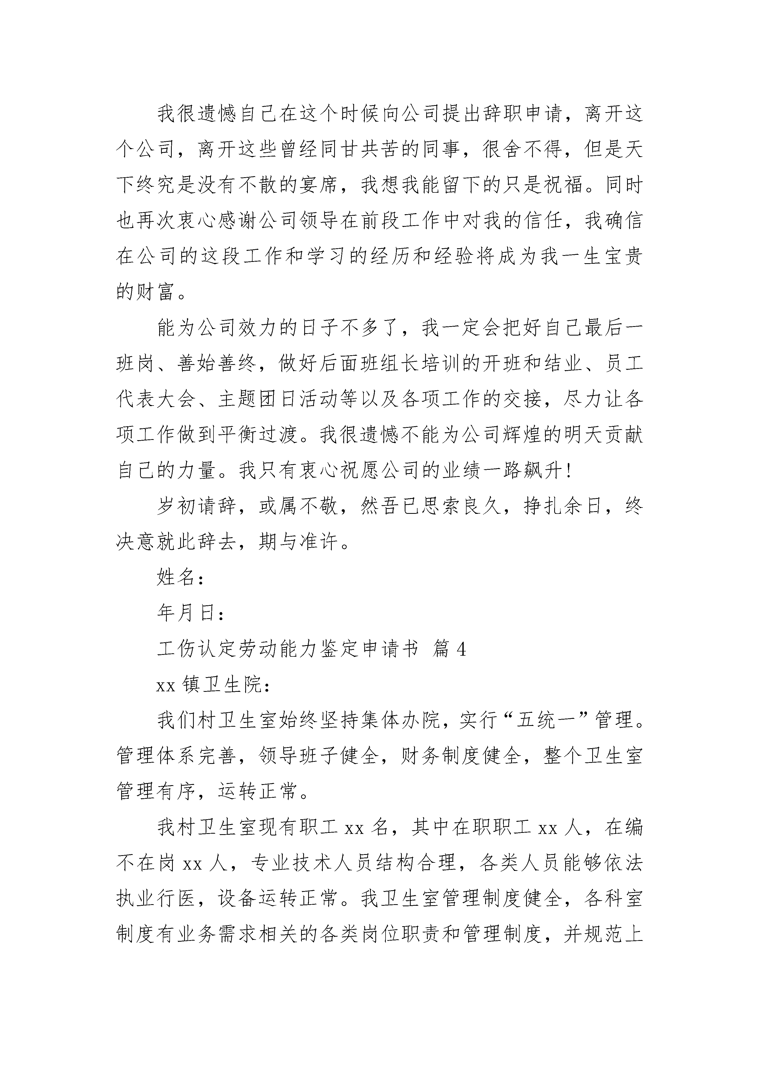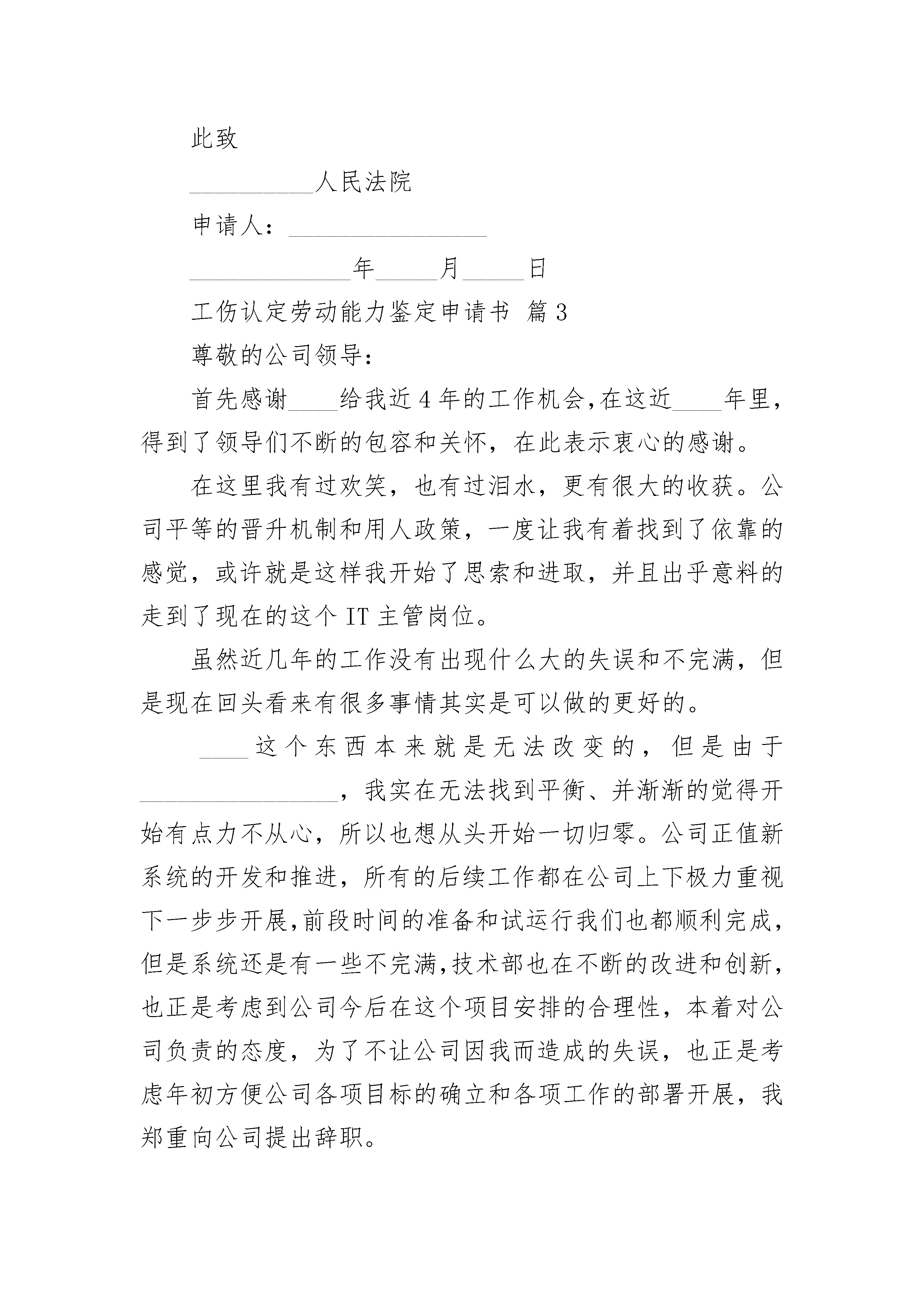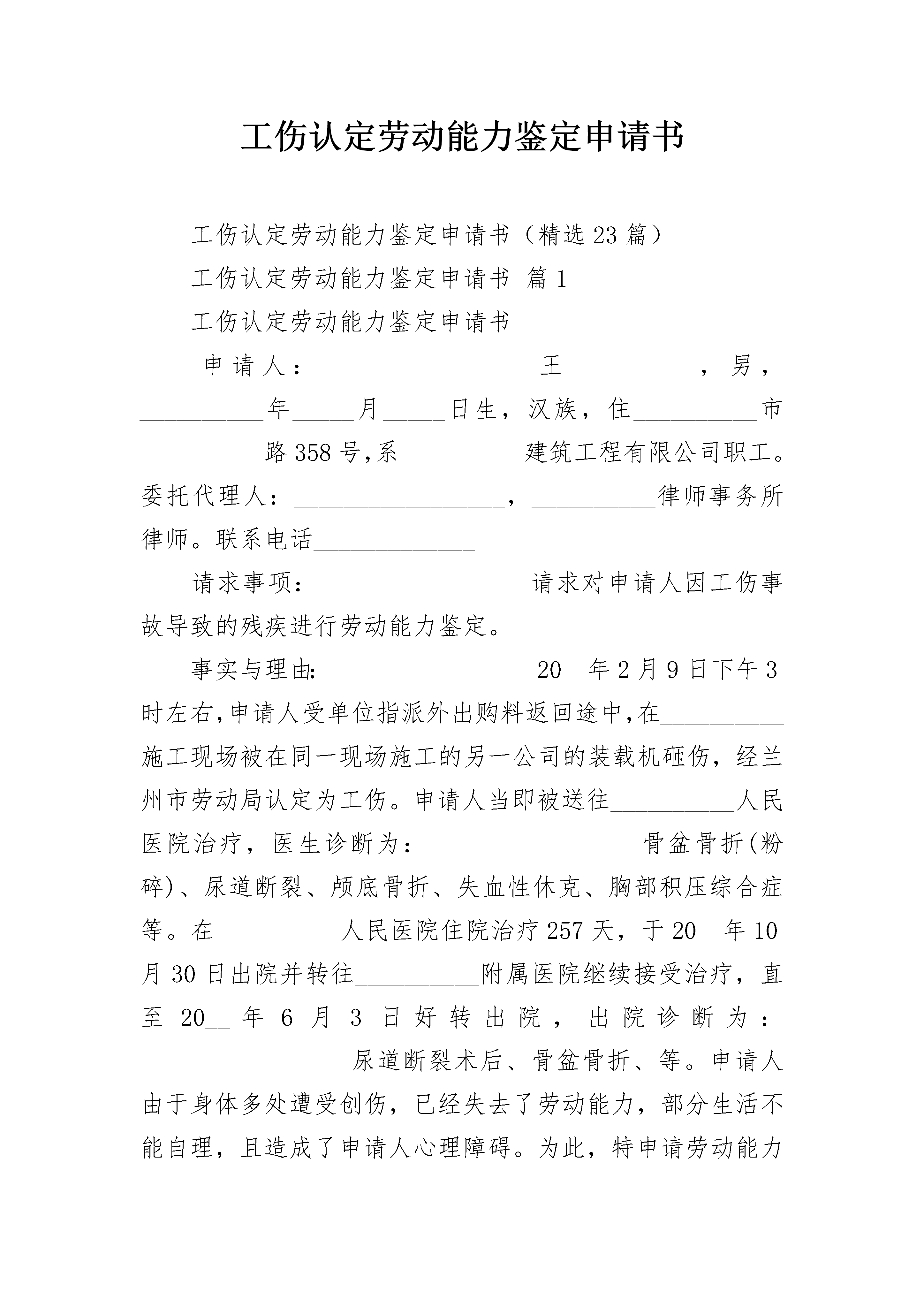 工伤认定劳动能力鉴定申请书工伤认定劳动能力鉴定申请书(精选23篇)工伤认定劳动能力鉴定申请书篇1工伤认定劳动能力鉴定申请书申请人:_________________王__________,男,__________年_____月_____日生,汉族,住__________市__________路358号,系__________建筑工程有限公司职工。委托代理人:_________________,__________律师事务所律师。联系电话_____________请求事项:_________________请求对申请人因工伤事故导致的残疾进行劳动能力鉴定。事实与理由:_________________20__年2月9日下午3时左右,申请人受单位指派外出购料返回途中,在__________施工现场被在同一现场施工的另一公司的装载机砸伤,经兰州市劳动局认定为工伤。申请人当即被送往__________人民医院治疗,医生诊断为:_________________骨盆骨折(粉碎)、尿道断裂、颅底骨折、失血性休克、胸部积压综合症等。在__________人民医院住院治疗257天,于20__年10月30日出院并转往__________附属医院继续接受治疗,直至20__年6月3日好转出院,出院诊断为:_________________尿道断裂术后、骨盆骨折、等。申请人由于身体多处遭受创伤,已经失去了劳动能力,部分生活不能自理,且造成了申请人心理障碍。为此,特申请劳动能力鉴定,请求对申请人的劳动功能障碍程度等级和生活自理障碍程度等级作出鉴定,望予支持。此致__________劳动能力鉴定委员会申请人:_________________王__________20___年___月___日工伤认定劳动能力鉴定申请书篇2申请人:______________,男/女,_____________年__________月__________日出生,_____族,……(写明工作单位和职务或者职业),住……。联系方式:_________________……。法定代理人/指定代理人:______________,……。委托诉讼代理人:______________,……。被申请人:______________,……。……(以上写明当事人和其他诉讼参加人的姓名或者名称等基本信息)请求事项:_________________准许拍卖/变卖被申请人_______________的……(写明担保财产的名称、性质、数量、数额、所在地等),申请人_______________对变价后所得价款在……(写明金额)的范围内优先受偿。事实和理由:_________________……(写明申请人主张的事实和理由)。此致__________人民法院申请人:_____________________________年_____月_____日工伤认定劳动能力鉴定申请书篇3尊敬的公司领导:首先感谢____给我近4年的工作机会,在这近____年里,得到了领导们不断的包容和关怀,在此表示衷心的感谢。在这里我有过欢笑,也有过泪水,更有很大的收获。公司平等的晋升机制和用人政策,一度让我有着找到了依靠的感觉,或许就是这样我开始了思索和进取,并且出乎意料的走到了现在的这个IT主管岗位。虽然近几年的工作没有出现什么大的失误和不完满,但是现在回头看来有很多事情其实是可以做的更好的。____这个东西本来就是无法改变的,但是由于________________,我实在无法找到平衡、并渐渐的觉得开始有点力不从心,所以也想从头开始一切归零。公司正值新系统的开发和推进,所有的后续工作都在公司上下极力重视下一步步开展,前段时间的准备和试运行我们也都顺利完成,但是系统还是有一些不完满,技术部也在不断的改进和创新,也正是考虑到公司今后在这个项目安排的合理性,本着对公司负责的态度,为了不让公司因我而造成的失误,也正是考虑年初方便公司各项目标的确立和各项工作的部署开展,我郑重向公司提出辞职。我很遗憾自己在这个时候向公司提出辞职申请,离开这个公司,离开这些曾经同甘共苦的同事,很舍不得,但是天下终究是没有不散的宴席,我想我能留下的只是祝福。同时也再次衷心感谢公司领导在前段工作中对我的信任,我确信在公司的这段工作和学习的经历和经验将成为我一生宝贵的财富。能为公司效力的日子不多了,我一定会把好自己最后一班岗、善始善终,做好后面班组长培训的开班和结业、员工代表大会、主题团日活动等以及各项工作的交接,尽力让各项工作做到平衡过渡。我很遗憾不能为公司辉煌的明天贡献自己的力量。我只有衷心祝愿公司的业绩一路飙升!岁初请辞,或属不敬,然吾已思索良久,挣扎余日,终决意就此辞去,期与准许。姓名:年月日:工伤认定劳动能力鉴定申请书篇4xx镇卫生院:我们村
