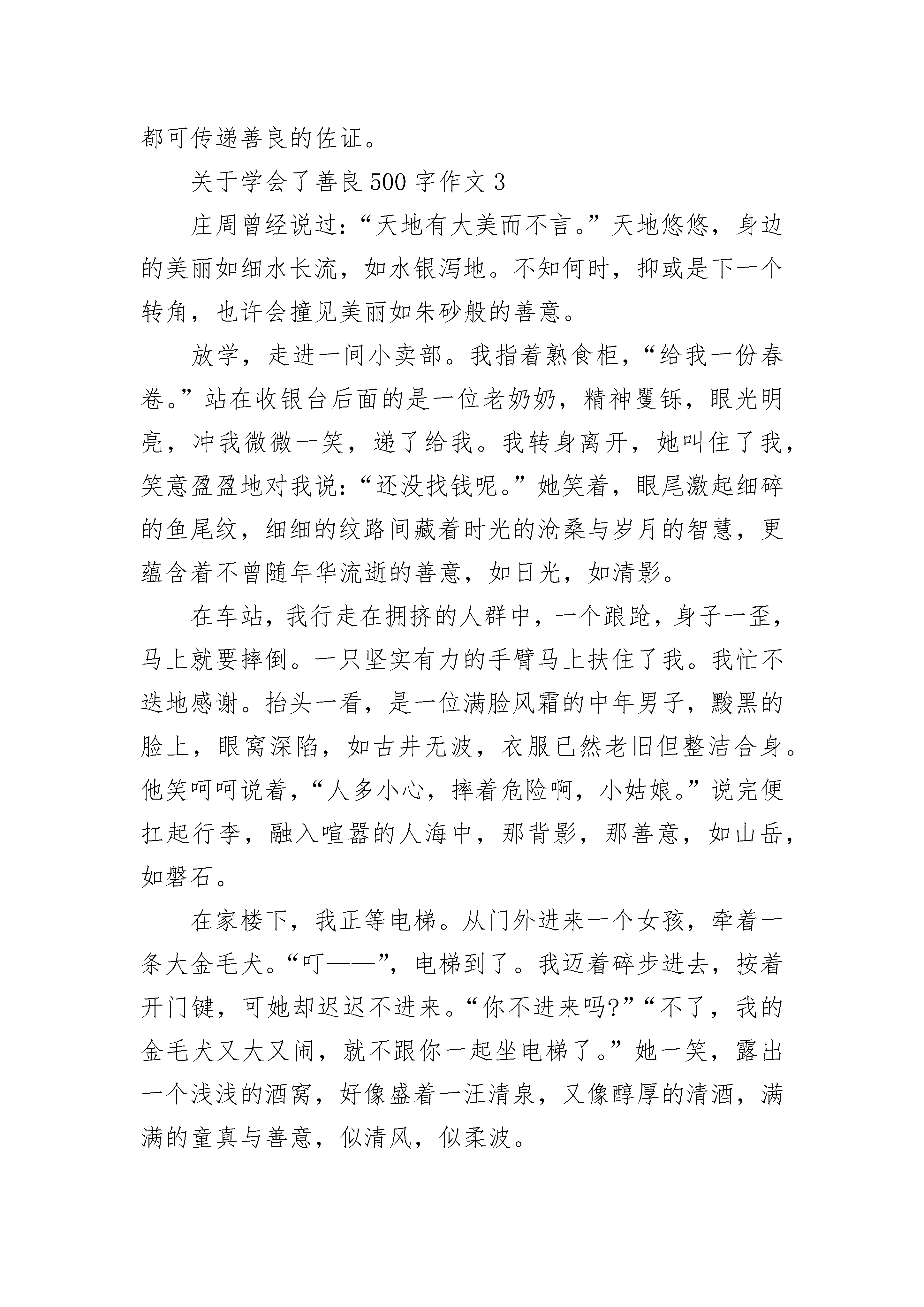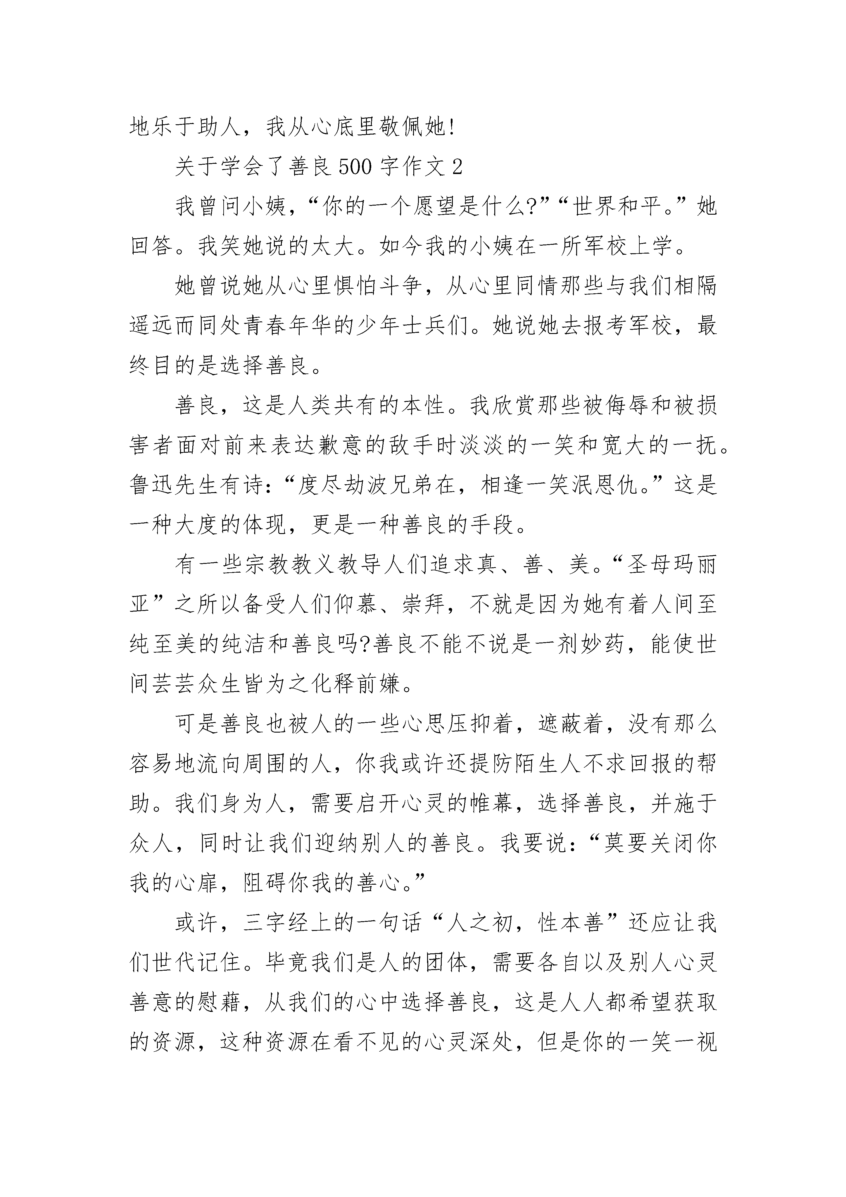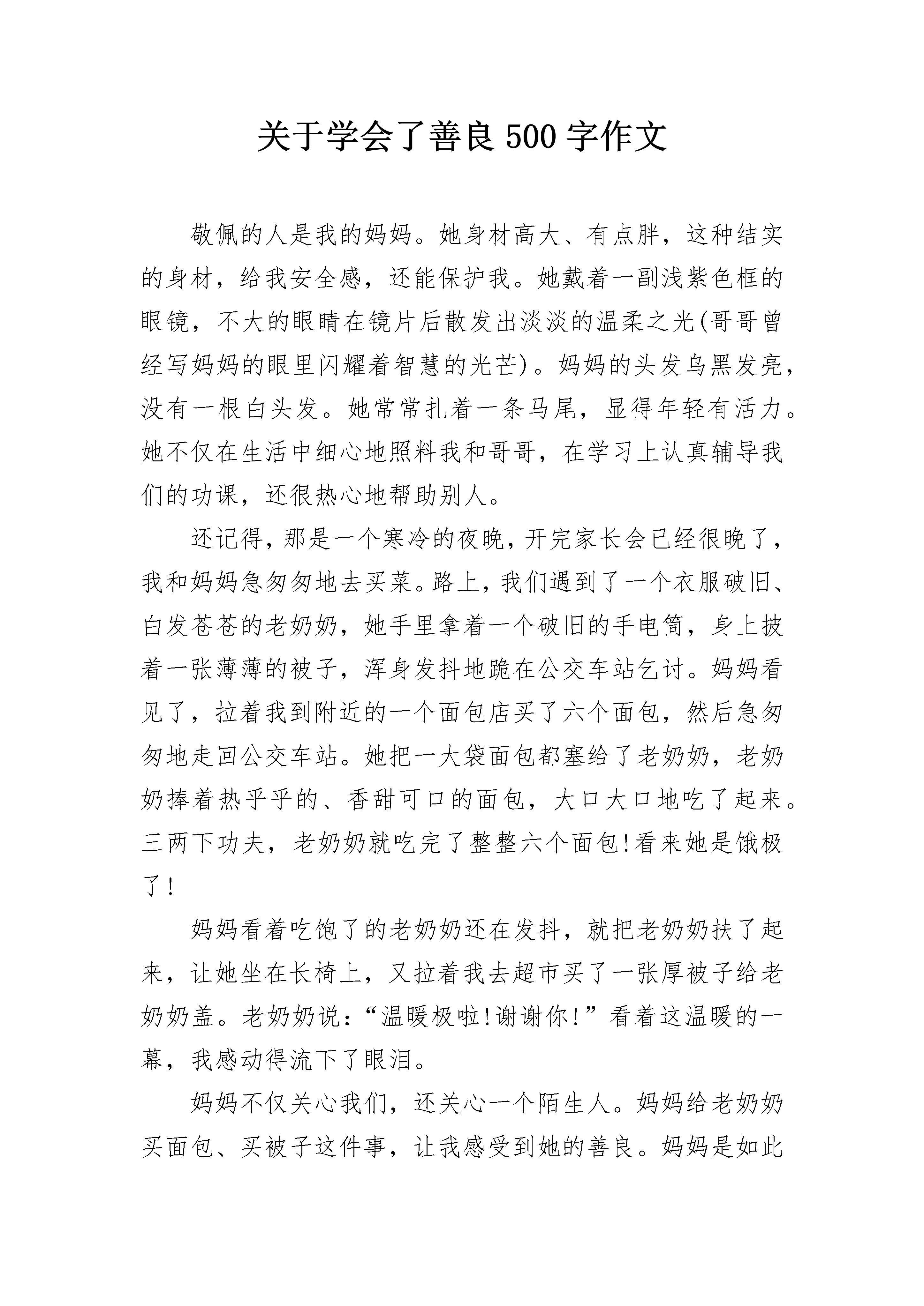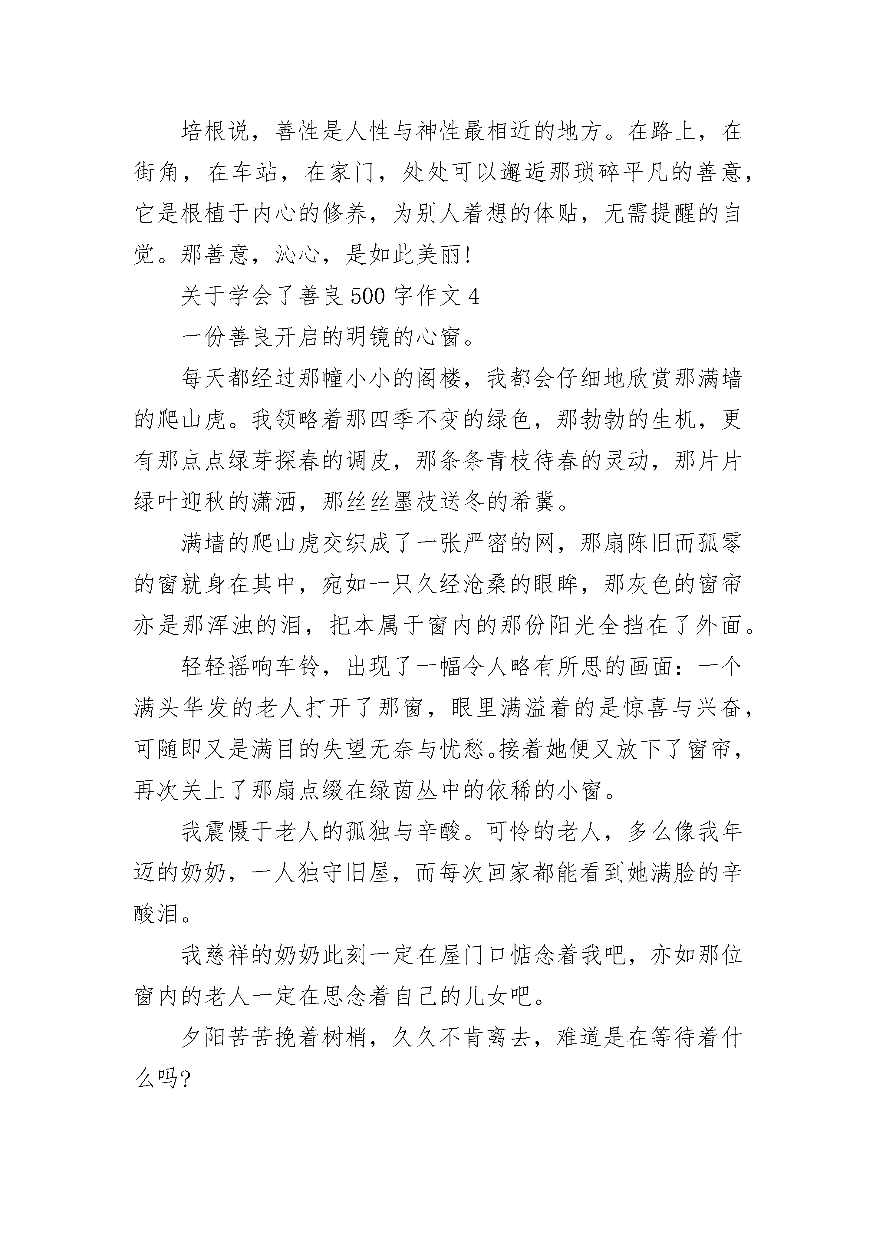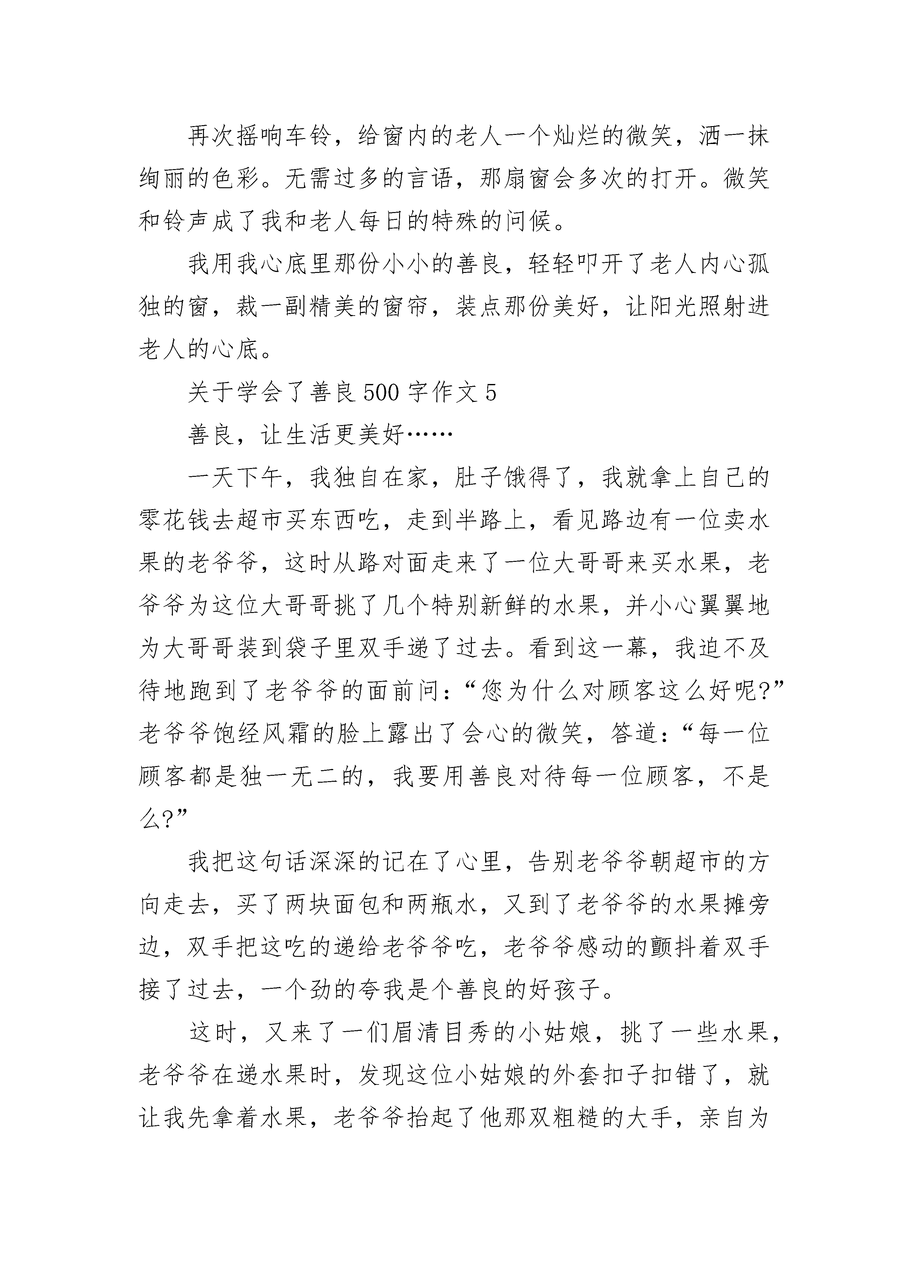 关于学会了善良500字作文敬佩的人是我的妈妈。她身材高大、有点胖,这种结实的身材,给我安全感,还能保护我。她戴着一副浅紫色框的眼镜,不大的眼睛在镜片后散发出淡淡的温柔之光(哥哥曾经写妈妈的眼里闪耀着智慧的光芒)。妈妈的头发乌黑发亮,没有一根白头发。她常常扎着一条马尾,显得年轻有活力。她不仅在生活中细心地照料我和哥哥,在学习上认真辅导我们的功课,还很热心地帮助别人。还记得,那是一个寒冷的夜晚,开完家长会已经很晚了,我和妈妈急匆匆地去买菜。路上,我们遇到了一个衣服破旧、白发苍苍的老奶奶,她手里拿着一个破旧的手电筒,身上披着一张薄薄的被子,浑身发抖地跪在公交车站乞讨。妈妈看见了,拉着我到附近的一个面包店买了六个面包,然后急匆匆地走回公交车站。她把一大袋面包都塞给了老奶奶,老奶奶捧着热乎乎的、香甜可口的面包,大口大口地吃了起来。三两下功夫,老奶奶就吃完了整整六个面包!看来她是饿极了!妈妈看着吃饱了的老奶奶还在发抖,就把老奶奶扶了起来,让她坐在长椅上,又拉着我去超市买了一张厚被子给老奶奶盖。老奶奶说:“温暖极啦!谢谢你!”看着这温暖的一幕,我感动得流下了眼泪。妈妈不仅关心我们,还关心一个陌生人。妈妈给老奶奶买面包、买被子这件事,让我感受到她的善良。妈妈是如此地乐于助人,我从心底里敬佩她!关于学会了善良500字作文2我曾问小姨,“你的一个愿望是什么?”“世界和平。”她回答。我笑她说的太大。如今我的小姨在一所军校上学。她曾说她从心里惧怕斗争,从心里同情那些与我们相隔遥远而同处青春年华的少年士兵们。她说她去报考军校,最终目的是选择善良。善良,这是人类共有的本性。我欣赏那些被侮辱和被损害者面对前来表达歉意的敌手时淡淡的一笑和宽大的一抚。鲁迅先生有诗:“度尽劫波兄弟在,相逢一笑泯恩仇。”这是一种大度的体现,更是一种善良的手段。有一些宗教教义教导人们追求真、善、美。“圣母玛丽亚”之所以备受人们仰慕、崇拜,不就是因为她有着人间至纯至美的纯洁和善良吗?善良不能不说是一剂妙药,能使世间芸芸众生皆为之化释前嫌。可是善良也被人的一些心思压抑着,遮蔽着,没有那么容易地流向周围的人,你我或许还提防陌生人不求回报的帮助。我们身为人,需要启开心灵的帷幕,选择善良,并施于众人,同时让我们迎纳别人的善良。我要说:“莫要关闭你我的心扉,阻碍你我的善心。”或许,三字经上的一句话“人之初,性本善”还应让我们世代记住。毕竟我们是人的团体,需要各自以及别人心灵善意的慰藉,从我们的心中选择善良,这是人人都希望获取的资源,这种资源在看不见的心灵深处,但是你的一笑一视都可传递善良的佐证。关于学会了善良500字作文3庄周曾经说过:“天地有大美而不言。”天地悠悠,身边的美丽如细水长流,如水银泻地。不知何时,抑或是下一个转角,也许会撞见美丽如朱砂般的善意。放学,走进一间小卖部。我指着熟食柜,“给我一份春卷。”站在收银台后面的是一位老奶奶,精神矍铄,眼光明亮,冲我微微一笑,递了给我。我转身离开,她叫住了我,笑意盈盈地对我说:“还没找钱呢。”她笑着,眼尾激起细碎的鱼尾纹,细细的纹路间藏着时光的沧桑与岁月的智慧,更蕴含着不曾随年华流逝的善意,如日光,如清影。在车站,我行走在拥挤的人群中,一个踉跄,身子一歪,马上就要摔倒。一只坚实有力的手臂马上扶住了我。我忙不迭地感谢。抬头一看,是一位满脸风霜的中年男子,黢黑的脸上,眼窝深陷,如古井无波,衣服已然老旧但整洁合身。他笑呵呵说着,“人多小心,摔着危险啊,小姑娘。”说完便扛起行李,融入喧嚣的人海中,那背影,那善意,如山岳,如磐石。在家楼下,我正等电梯。从门外进来一个女孩,牵着一条大金毛犬。“叮——”,电梯到了。我迈着碎步进去,按着开门键,可她却迟迟不进来。“你不进来吗?”“不了,我的金毛犬又大又闹,就不跟你一起坐电梯了。”她一笑,露出一个浅浅的酒窝,好像盛着一汪清泉,又像醇厚的清酒,满满的童真与善意,似清风,似柔波。培根说,善性是人性与神性最相近的地方。在路上,在街角,在车站,在家门,处处可以邂逅那琐碎平凡的善意,它是根植于内心的修养,为别人着想的体贴,无需提醒的自觉。那善意,沁心,是如此美丽!关于学会了善良500字作文4一份善良开启的明镜的心窗。每天都经过那幢小小的阁楼,我都会仔细地欣赏那满墙的爬山虎。我领略着那四季不变的绿色,那勃勃的生机,更有那点点绿芽探春的调皮,那条条青枝待春的灵动,那片片绿叶迎秋的潇洒,那丝丝墨枝送冬的希冀。满墙的爬山虎交织成了一张严密的网,那扇陈旧而孤零的窗就身在其中,宛如一只久经沧桑的眼眸,那灰色的窗帘亦是那浑浊的泪,把本属于窗内的那份阳光全挡在了外面。轻轻摇响车铃,出现了一幅令人略有所思的画面:一个满头华发的老人打开了那窗,眼里满溢着的是惊喜与兴奋,可随即又是满目的失望无奈与忧愁。接着她便又放下了窗帘,再次关上了那扇点缀
