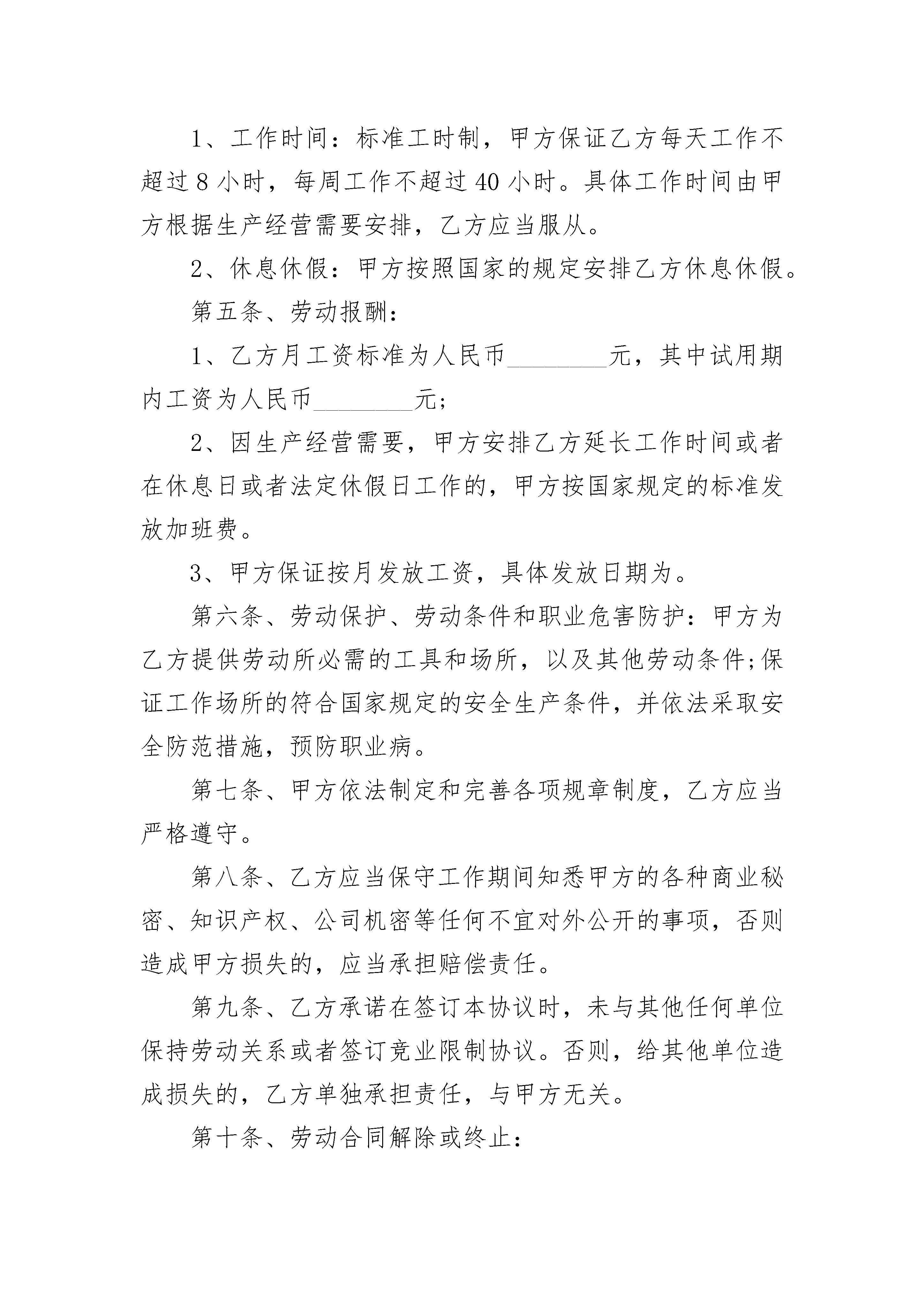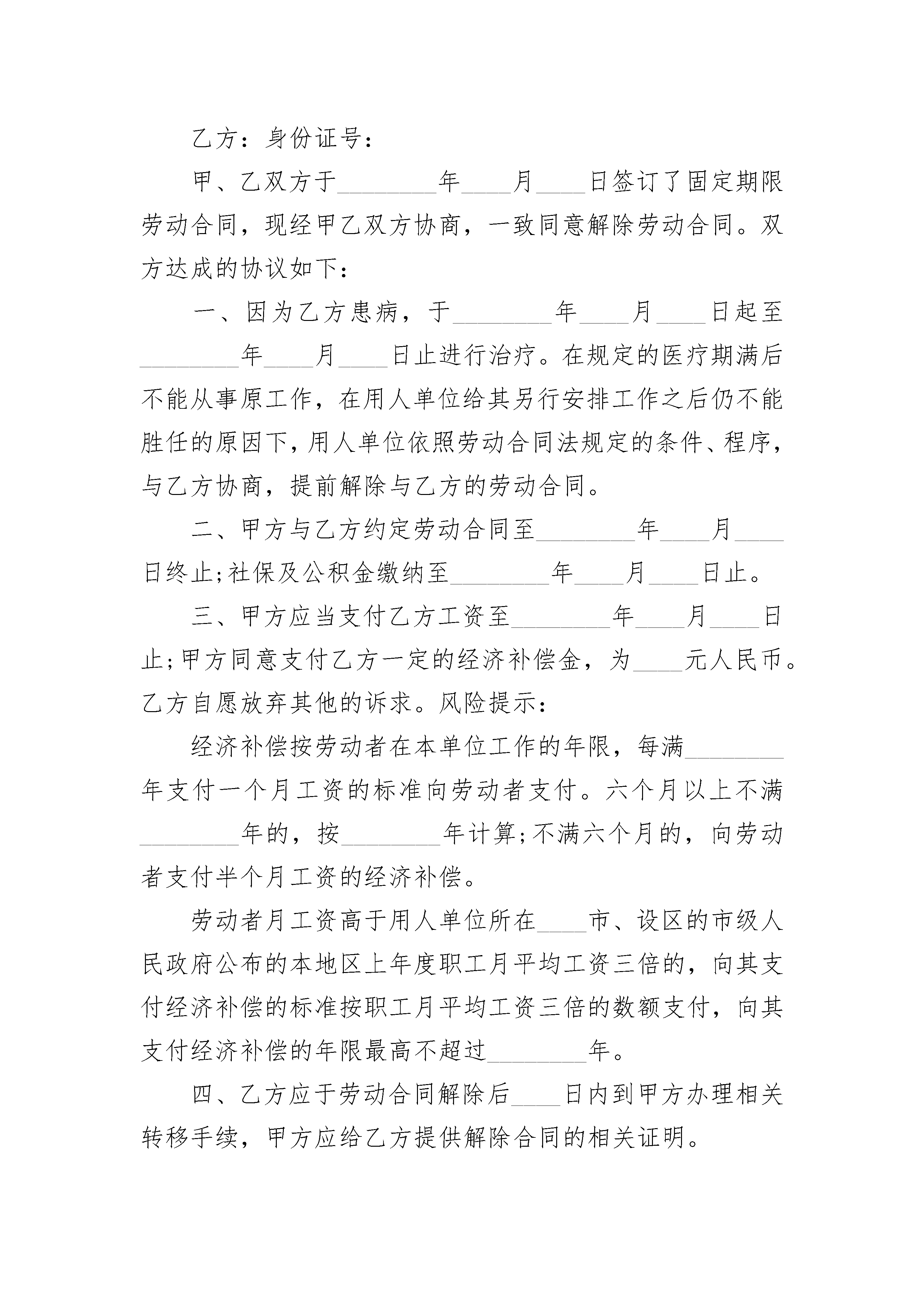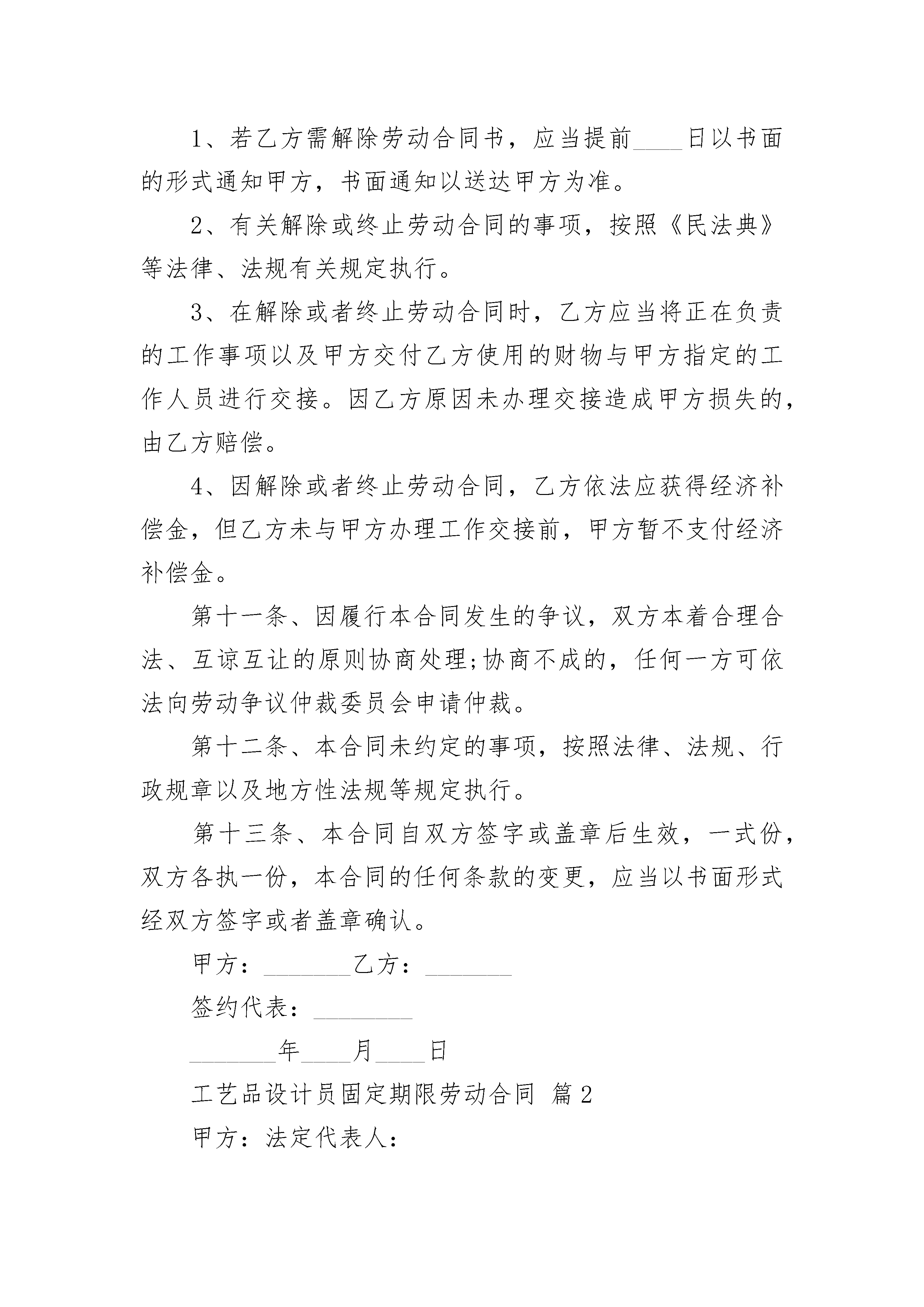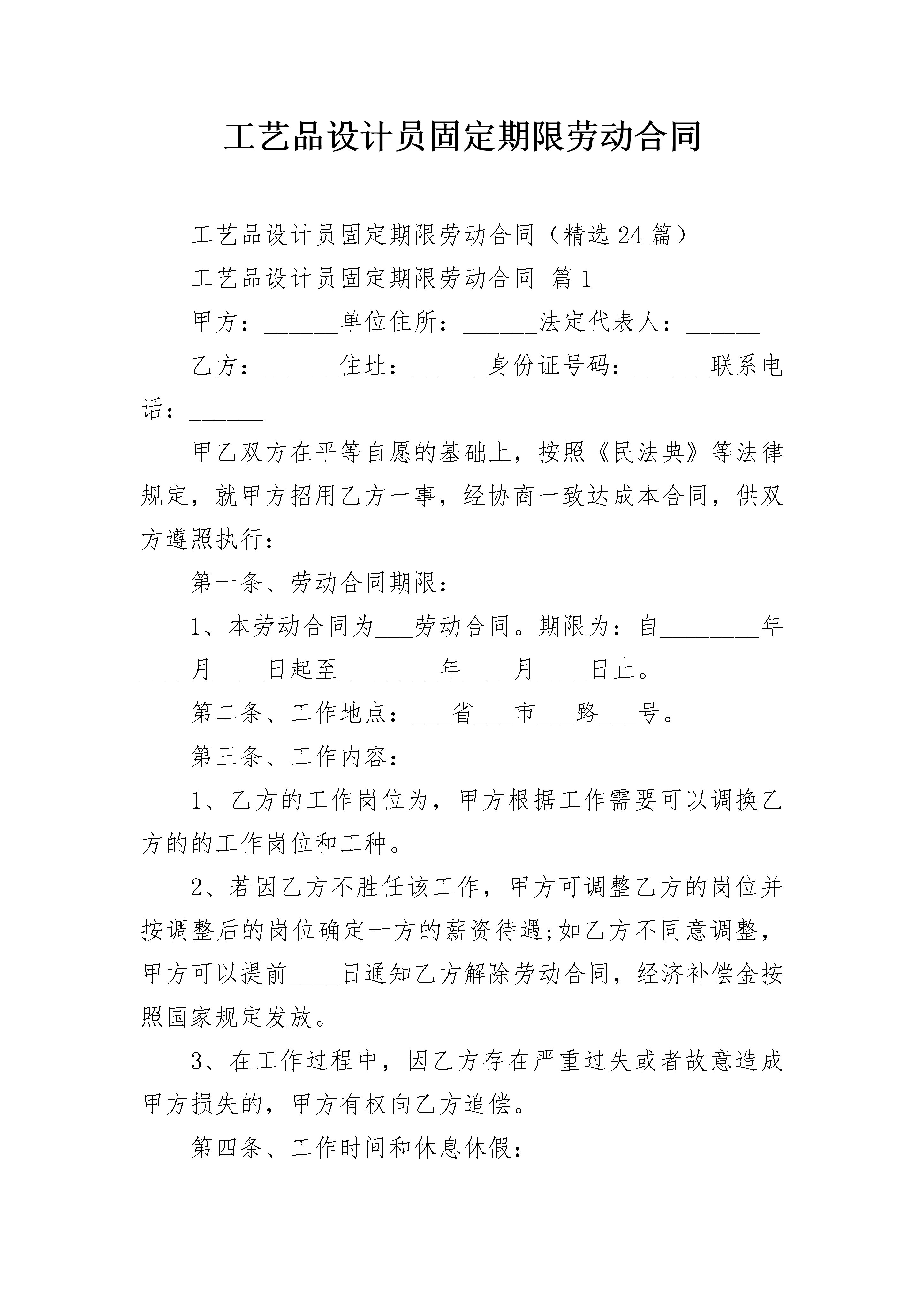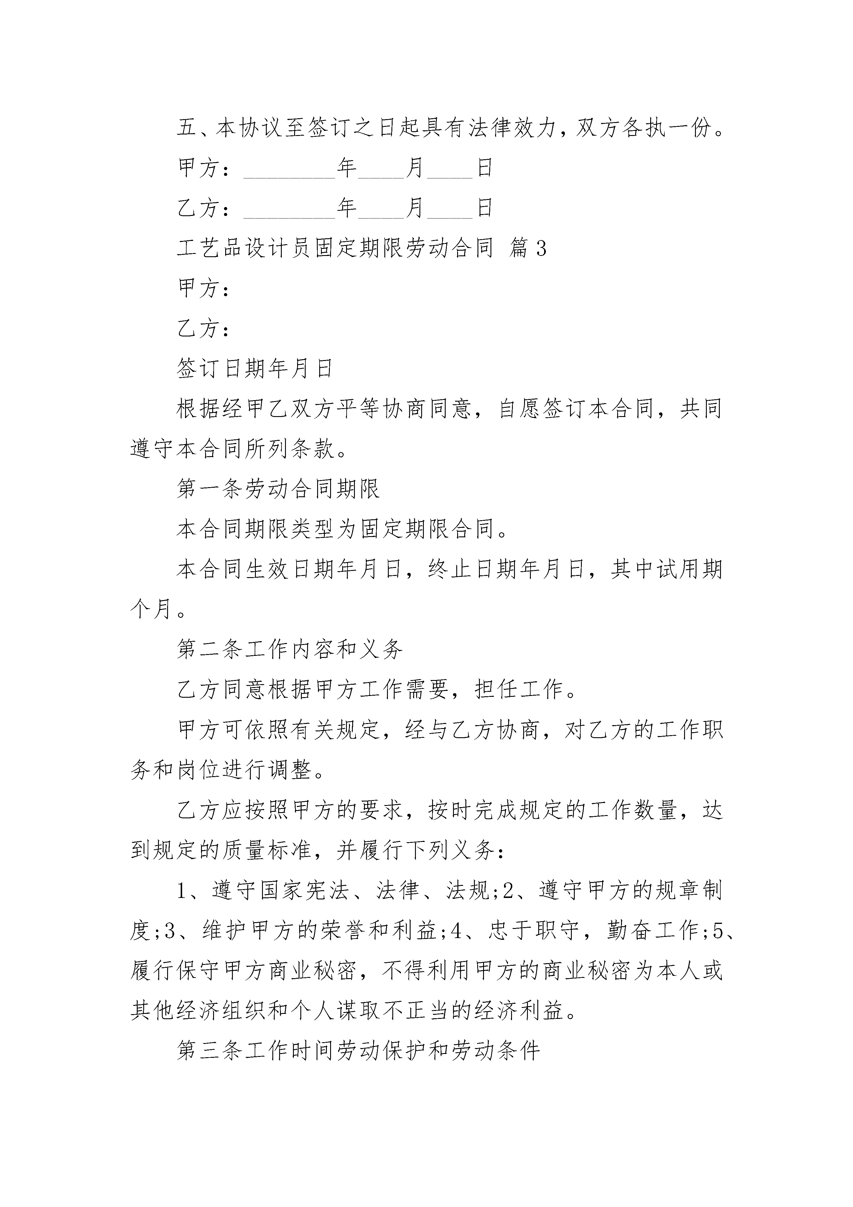 工艺品设计员固定期限劳动合同工艺品设计员固定期限劳动合同(精选24篇)工艺品设计员固定期限劳动合同篇1甲方:______单位住所:______法定代表人:______乙方:______住址:______身份证号码:______联系电话:______甲乙双方在平等自愿的基础上,按照《民法典》等法律规定,就甲方招用乙方一事,经协商一致达成本合同,供双方遵照执行:第一条、劳动合同期限:1、本劳动合同为___劳动合同。期限为:自________年____月____日起至________年____月____日止。第二条、工作地点:___省___市___路___号。第三条、工作内容:1、乙方的工作岗位为,甲方根据工作需要可以调换乙方的的工作岗位和工种。2、若因乙方不胜任该工作,甲方可调整乙方的岗位并按调整后的岗位确定一方的薪资待遇;如乙方不同意调整,甲方可以提前____日通知乙方解除劳动合同,经济补偿金按照国家规定发放。3、在工作过程中,因乙方存在严重过失或者故意造成甲方损失的,甲方有权向乙方追偿。第四条、工作时间和休息休假:1、工作时间:标准工时制,甲方保证乙方每天工作不超过8小时,每周工作不超过40小时。具体工作时间由甲方根据生产经营需要安排,乙方应当服从。2、休息休假:甲方按照国家的规定安排乙方休息休假。第五条、劳动报酬:1、乙方月工资标准为人民币________元,其中试用期内工资为人民币________元;2、因生产经营需要,甲方安排乙方延长工作时间或者在休息日或者法定休假日工作的,甲方按国家规定的标准发放加班费。3、甲方保证按月发放工资,具体发放日期为。第六条、劳动保护、劳动条件和职业危害防护:甲方为乙方提供劳动所必需的工具和场所,以及其他劳动条件;保证工作场所的符合国家规定的安全生产条件,并依法采取安全防范措施,预防职业病。第七条、甲方依法制定和完善各项规章制度,乙方应当严格遵守。第八条、乙方应当保守工作期间知悉甲方的各种商业秘密、知识产权、公司机密等任何不宜对外公开的事项,否则造成甲方损失的,应当承担赔偿责任。第九条、乙方承诺在签订本协议时,未与其他任何单位保持劳动关系或者签订竞业限制协议。否则,给其他单位造成损失的,乙方单独承担责任,与甲方无关。第十条、劳动合同解除或终止:1、若乙方需解除劳动合同书,应当提前____日以书面的形式通知甲方,书面通知以送达甲方为准。2、有关解除或终止劳动合同的事项,按照《民法典》等法律、法规有关规定执行。3、在解除或者终止劳动合同时,乙方应当将正在负责的工作事项以及甲方交付乙方使用的财物与甲方指定的工作人员进行交接。因乙方原因未办理交接造成甲方损失的,由乙方赔偿。4、因解除或者终止劳动合同,乙方依法应获得经济补偿金,但乙方未与甲方办理工作交接前,甲方暂不支付经济补偿金。第十一条、因履行本合同发生的争议,双方本着合理合法、互谅互让的原则协商处理;协商不成的,任何一方可依法向劳动争议仲裁委员会申请仲裁。第十二条、本合同未约定的事项,按照法律、法规、行政规章以及地方性法规等规定执行。第十三条、本合同自双方签字或盖章后生效,一式份,双方各执一份,本合同的任何条款的变更,应当以书面形式经双方签字或者盖章确认。甲方:_______乙方:_______签约代表:_______________年____月____日工艺品设计员固定期限劳动合同篇2甲方:法定代表人:乙方:身份证号:甲、乙双方于________年____月____日签订了固定期限劳动合同,现经甲乙双方协商,一致同意解除劳动合同。双方达成的协议如下:一、因为乙方患病,于________年____月____日起至________年____月____日止进行治疗。在规定的医疗期满后不能从事原工作,在用人单位给其另行安排工作之后仍不能胜任的原因下,用人单位依照劳动合同法规定的条件、程序,与乙方协商,提前解除与乙方的劳动合同。二、甲方与乙方约定劳动合同至________年____月____日终止;社保及公积金缴纳至________年____月____日止。三、甲方应当支付乙方工资至________年____月____日止;甲方同意支付乙方一定的经济补偿金,为____元人民币。乙方自愿放弃其他的诉求。风险提示:经济补偿按劳动者在本单位工作的年限,每满________年支付一个月工资的标准向劳动者支付。六个月以上不满________年的,按________年计算;不满六个月的,向劳动者支付半个月工资的经济补偿。劳动者月工资高于用人单位所在____市、设区的市级人民政府公布的本地区上年度职工月平均工资三倍的,向其支付经济补偿的标准按职工月平均工资三倍的数额支付,向其支付经济补偿的年限最高不超过________年。四、乙方应于劳动合同解除后____日内到甲