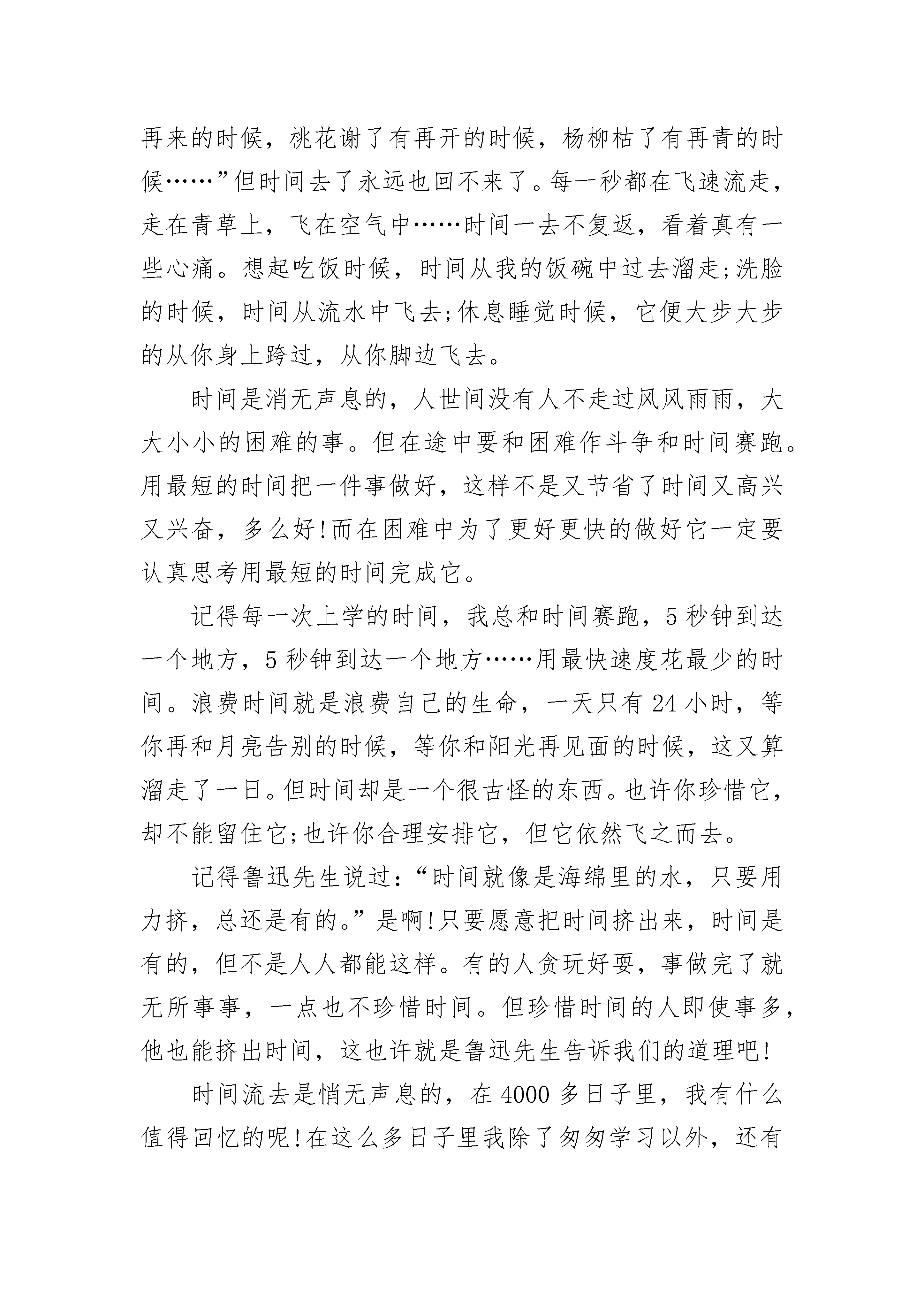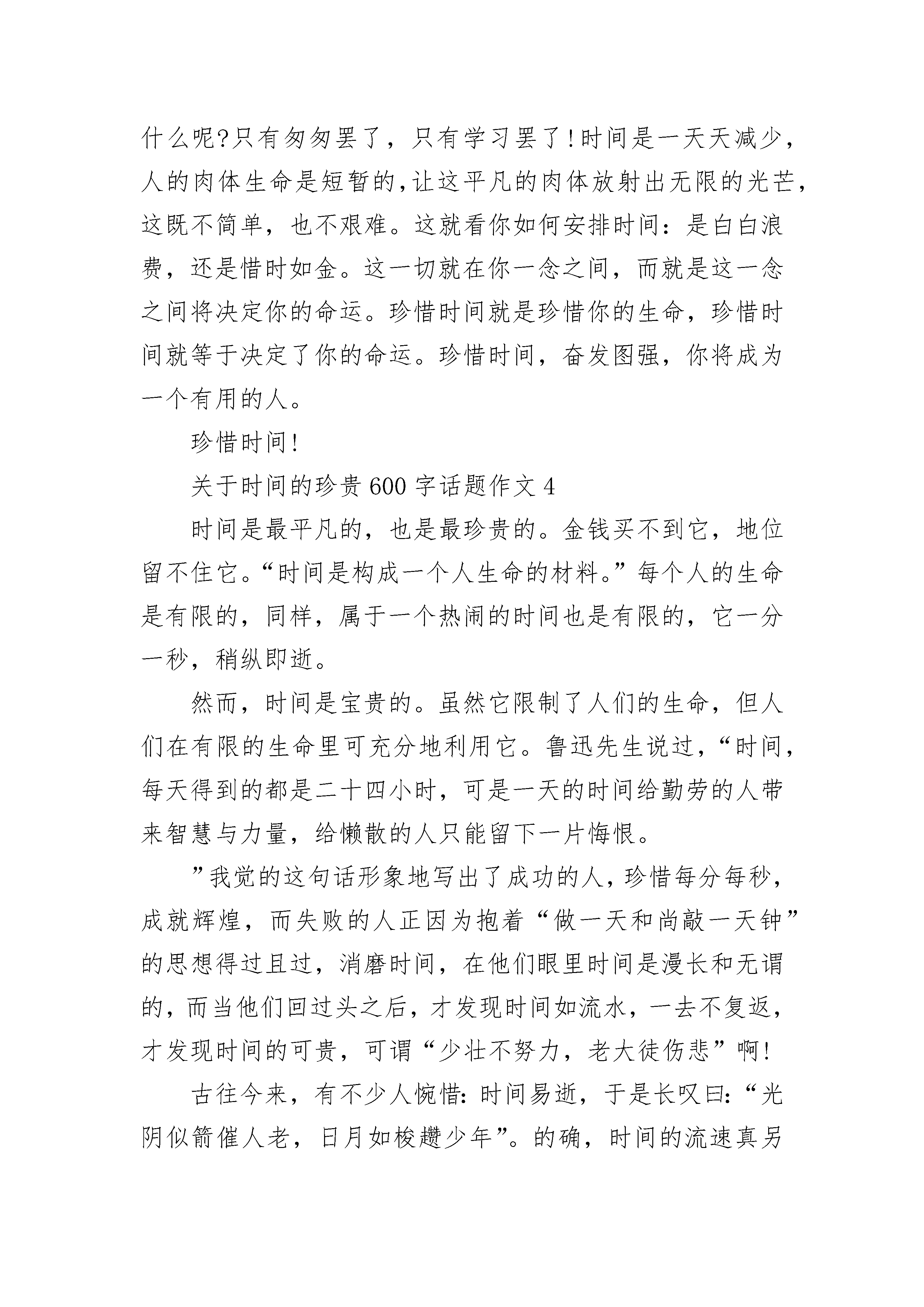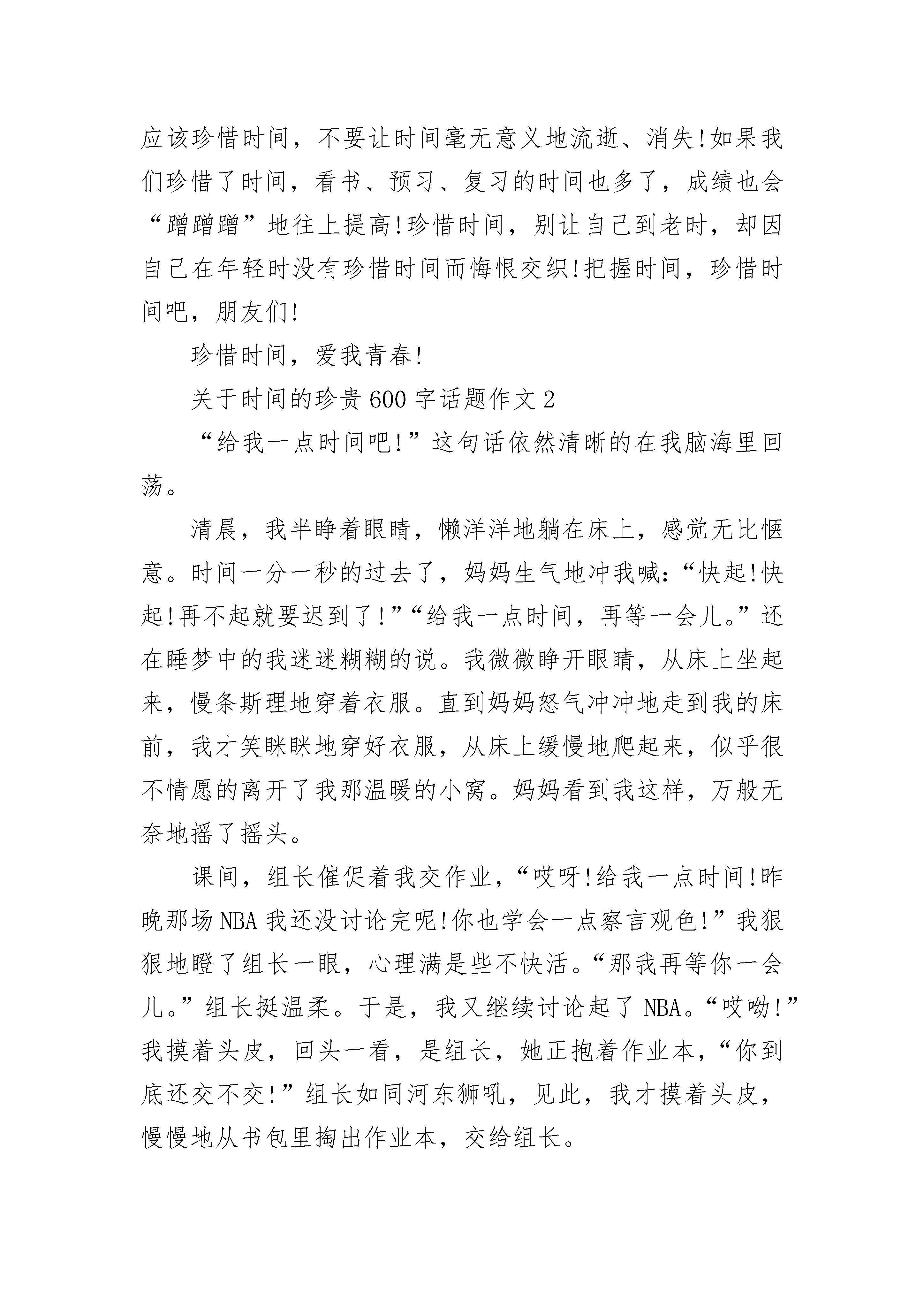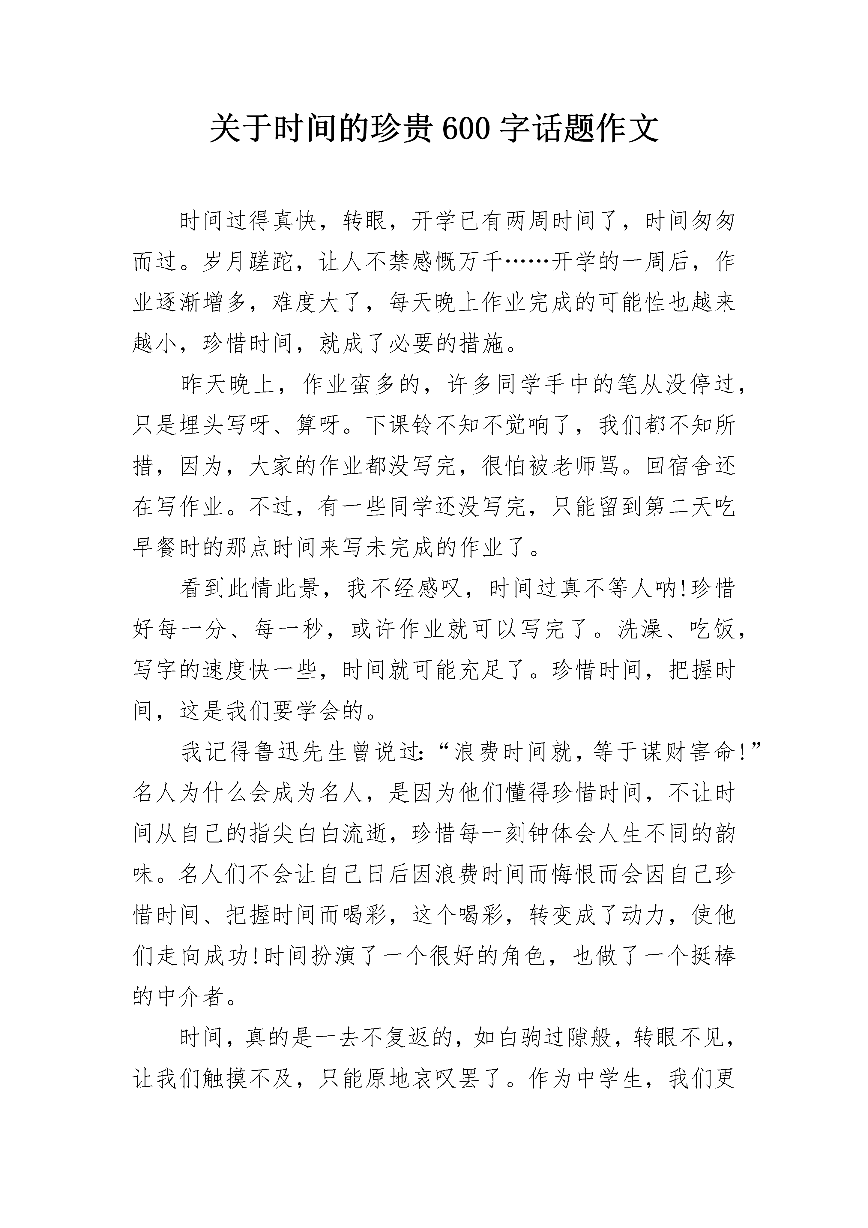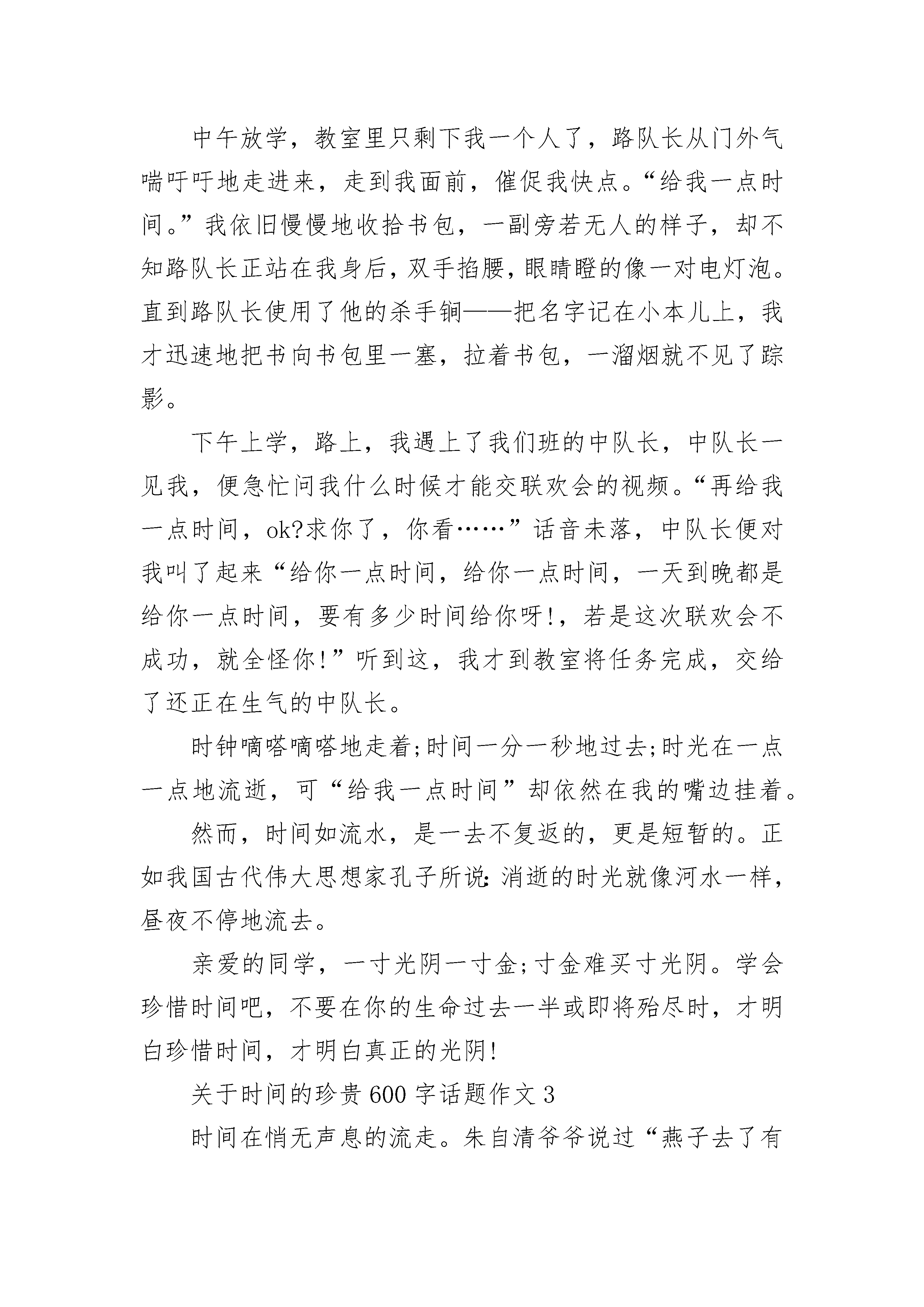 关于时间的珍贵600字话题作文时间过得真快,转眼,开学已有两周时间了,时间匆匆而过。岁月蹉跎,让人不禁感慨万千……开学的一周后,作业逐渐增多,难度大了,每天晚上作业完成的可能性也越来越小,珍惜时间,就成了必要的措施。昨天晚上,作业蛮多的,许多同学手中的笔从没停过,只是埋头写呀、算呀。下课铃不知不觉响了,我们都不知所措,因为,大家的作业都没写完,很怕被老师骂。回宿舍还在写作业。不过,有一些同学还没写完,只能留到第二天吃早餐时的那点时间来写未完成的作业了。看到此情此景,我不经感叹,时间过真不等人呐!珍惜好每一分、每一秒,或许作业就可以写完了。洗澡、吃饭,写字的速度快一些,时间就可能充足了。珍惜时间,把握时间,这是我们要学会的。我记得鲁迅先生曾说过:“浪费时间就,等于谋财害命!”名人为什么会成为名人,是因为他们懂得珍惜时间,不让时间从自己的指尖白白流逝,珍惜每一刻钟体会人生不同的韵味。名人们不会让自己日后因浪费时间而悔恨而会因自己珍惜时间、把握时间而喝彩,这个喝彩,转变成了动力,使他们走向成功!时间扮演了一个很好的角色,也做了一个挺棒的中介者。时间,真的是一去不复返的,如白驹过隙般,转眼不见,让我们触摸不及,只能原地哀叹罢了。作为中学生,我们更应该珍惜时间,不要让时间毫无意义地流逝、消失!如果我们珍惜了时间,看书、预习、复习的时间也多了,成绩也会“蹭蹭蹭”地往上提高!珍惜时间,别让自己到老时,却因自己在年轻时没有珍惜时间而悔恨交织!把握时间,珍惜时间吧,朋友们!珍惜时间,爱我青春!关于时间的珍贵600字话题作文2“给我一点时间吧!”这句话依然清晰的在我脑海里回荡。清晨,我半睁着眼睛,懒洋洋地躺在床上,感觉无比惬意。时间一分一秒的过去了,妈妈生气地冲我喊:“快起!快起!再不起就要迟到了!”“给我一点时间,再等一会儿。”还在睡梦中的我迷迷糊糊的说。我微微睁开眼睛,从床上坐起来,慢条斯理地穿着衣服。直到妈妈怒气冲冲地走到我的床前,我才笑眯眯地穿好衣服,从床上缓慢地爬起来,似乎很不情愿的离开了我那温暖的小窝。妈妈看到我这样,万般无奈地摇了摇头。课间,组长催促着我交作业,“哎呀!给我一点时间!昨晚那场NBA我还没讨论完呢!你也学会一点察言观色!”我狠狠地瞪了组长一眼,心理满是些不快活。“那我再等你一会儿。”组长挺温柔。于是,我又继续讨论起了NBA。“哎呦!”我摸着头皮,回头一看,是组长,她正抱着作业本,“你到底还交不交!”组长如同河东狮吼,见此,我才摸着头皮,慢慢地从书包里掏出作业本,交给组长。中午放学,教室里只剩下我一个人了,路队长从门外气喘吁吁地走进来,走到我面前,催促我快点。“给我一点时间。”我依旧慢慢地收拾书包,一副旁若无人的样子,却不知路队长正站在我身后,双手掐腰,眼睛瞪的像一对电灯泡。直到路队长使用了他的杀手锏——把名字记在小本儿上,我才迅速地把书向书包里一塞,拉着书包,一溜烟就不见了踪影。下午上学,路上,我遇上了我们班的中队长,中队长一见我,便急忙问我什么时候才能交联欢会的视频。“再给我一点时间,ok?求你了,你看……”话音未落,中队长便对我叫了起来“给你一点时间,给你一点时间,一天到晚都是给你一点时间,要有多少时间给你呀!,若是这次联欢会不成功,就全怪你!”听到这,我才到教室将任务完成,交给了还正在生气的中队长。时钟嘀嗒嘀嗒地走着;时间一分一秒地过去;时光在一点一点地流逝,可“给我一点时间”却依然在我的嘴边挂着。然而,时间如流水,是一去不复返的,更是短暂的。正如我国古代伟大思想家孔子所说:消逝的时光就像河水一样,昼夜不停地流去。亲爱的同学,一寸光阴一寸金;寸金难买寸光阴。学会珍惜时间吧,不要在你的生命过去一半或即将殆尽时,才明白珍惜时间,才明白真正的光阴!关于时间的珍贵600字话题作文3时间在悄无声息的流走。朱自清爷爷说过“燕子去了有再来的时候,桃花谢了有再开的时候,杨柳枯了有再青的时候……”但时间去了永远也回不来了。每一秒都在飞速流走,走在青草上,飞在空气中……时间一去不复返,看着真有一些心痛。想起吃饭时候,时间从我的饭碗中过去溜走;洗脸的时候,时间从流水中飞去;休息睡觉时候,它便大步大步的从你身上跨过,从你脚边飞去。时间是消无声息的,人世间没有人不走过风风雨雨,大大小小的困难的事。但在途中要和困难作斗争和时间赛跑。用最短的时间把一件事做好,这样不是又节省了时间又高兴又兴奋,多么好!而在困难中为了更好更快的做好它一定要认真思考用最短的时间完成它。记得每一次上学的时间,我总和时间赛跑,5秒钟到达一个地方,5秒钟到达一个地方……用最快速度花最少的时间。浪费时间就是浪费自己的生命,一天只有24小时,等你再和月亮告别的时候,等你和阳光再见面的时候,这又算溜走了一日。但时间却是一个很古怪的东西。也许你珍惜它,却不能留住它;也许你合