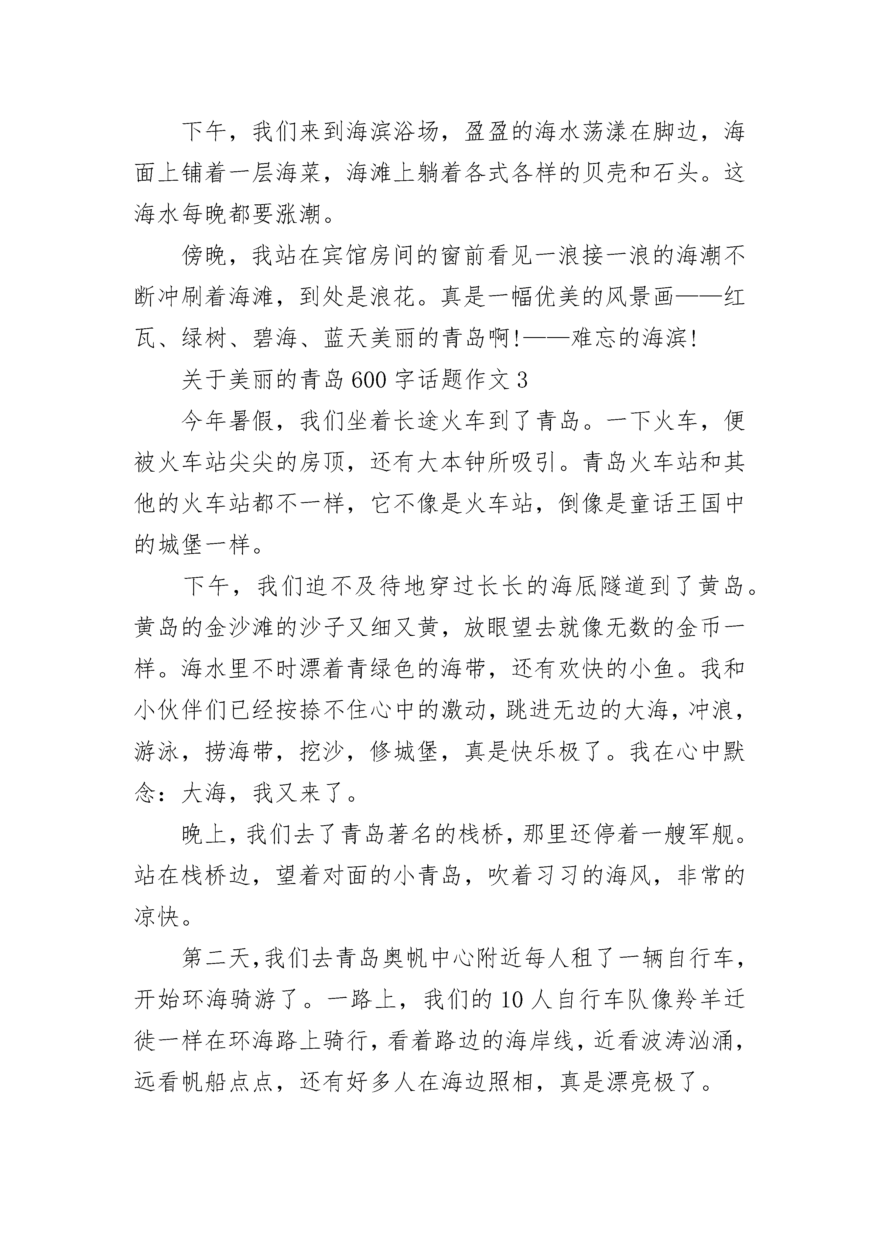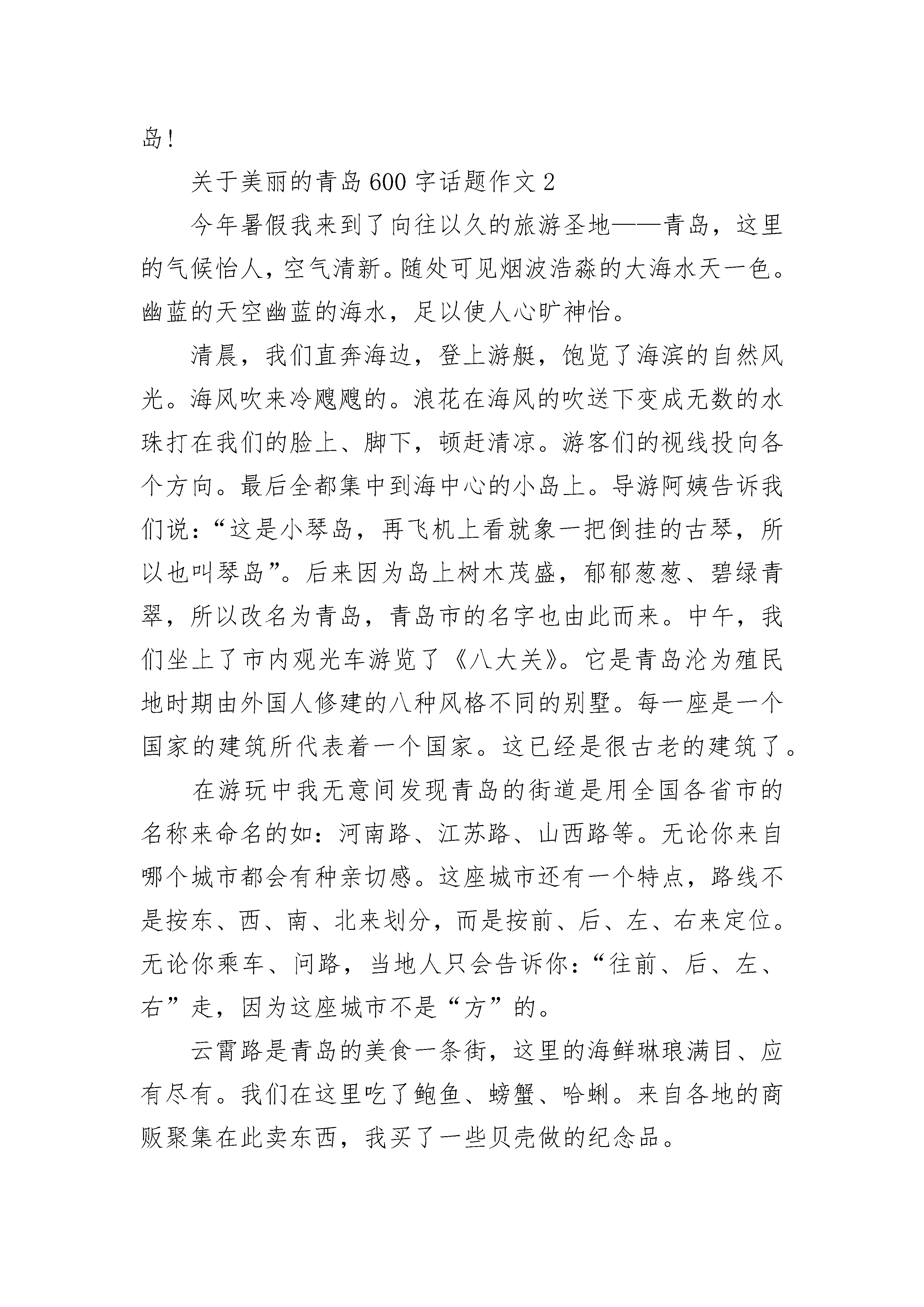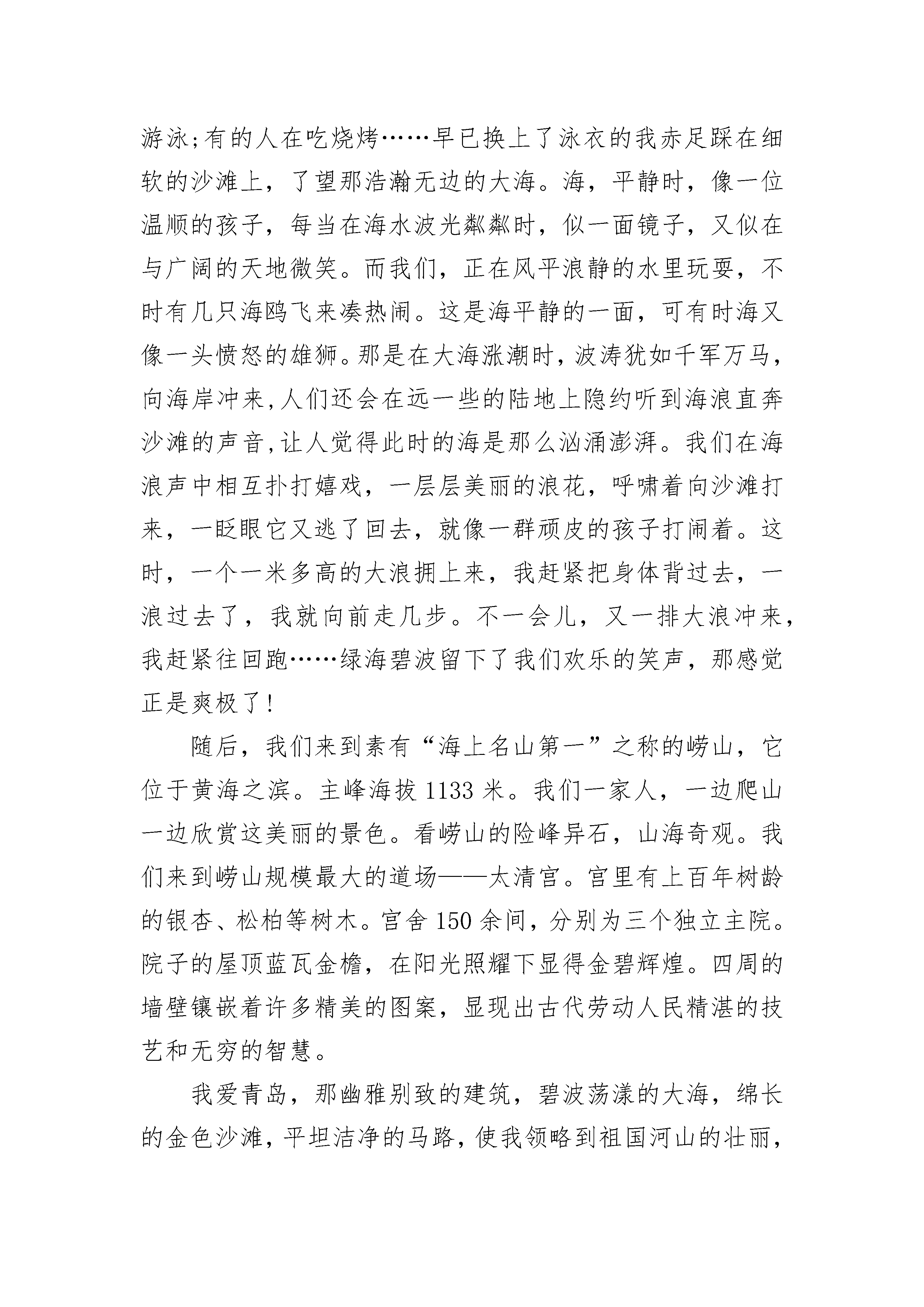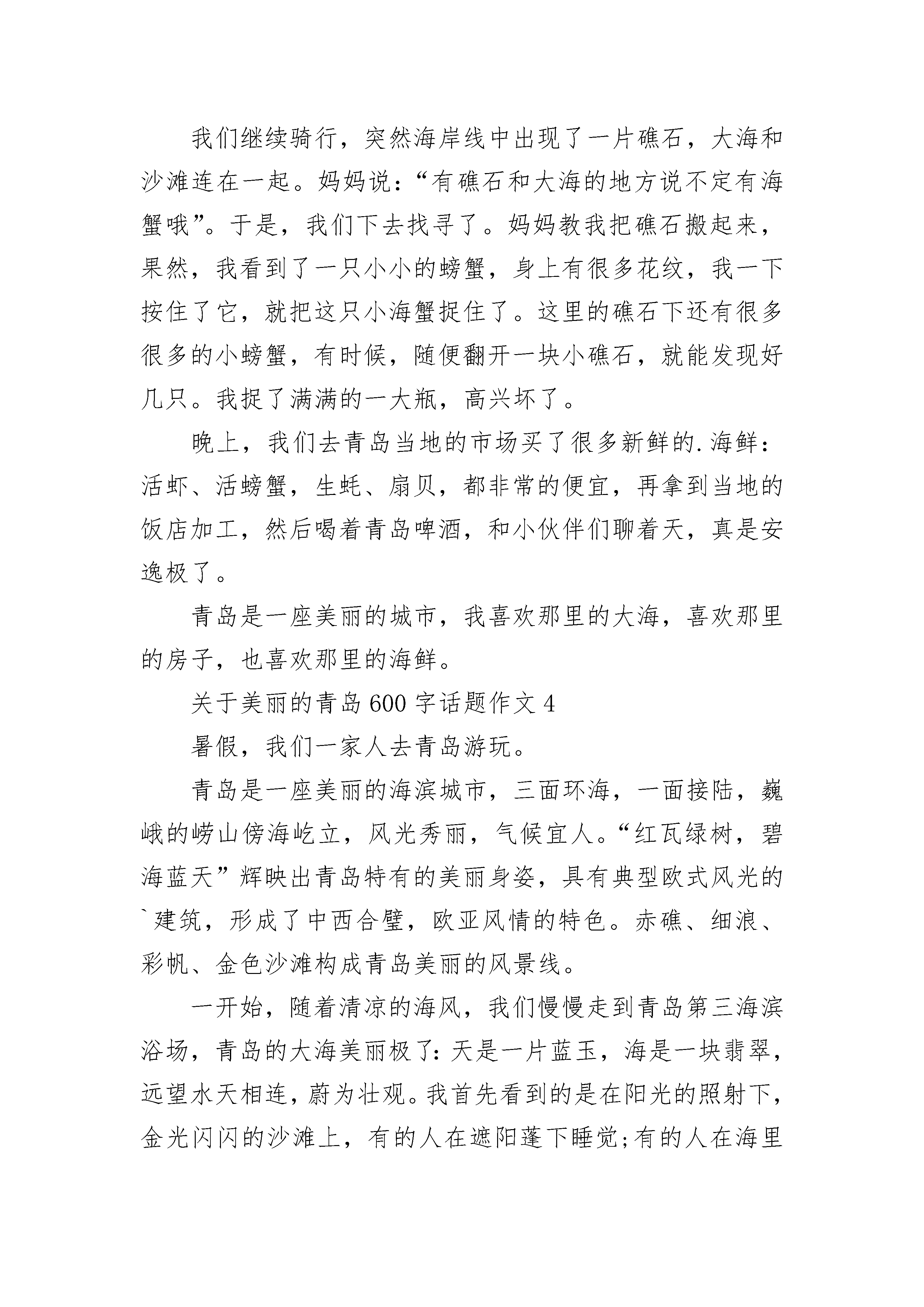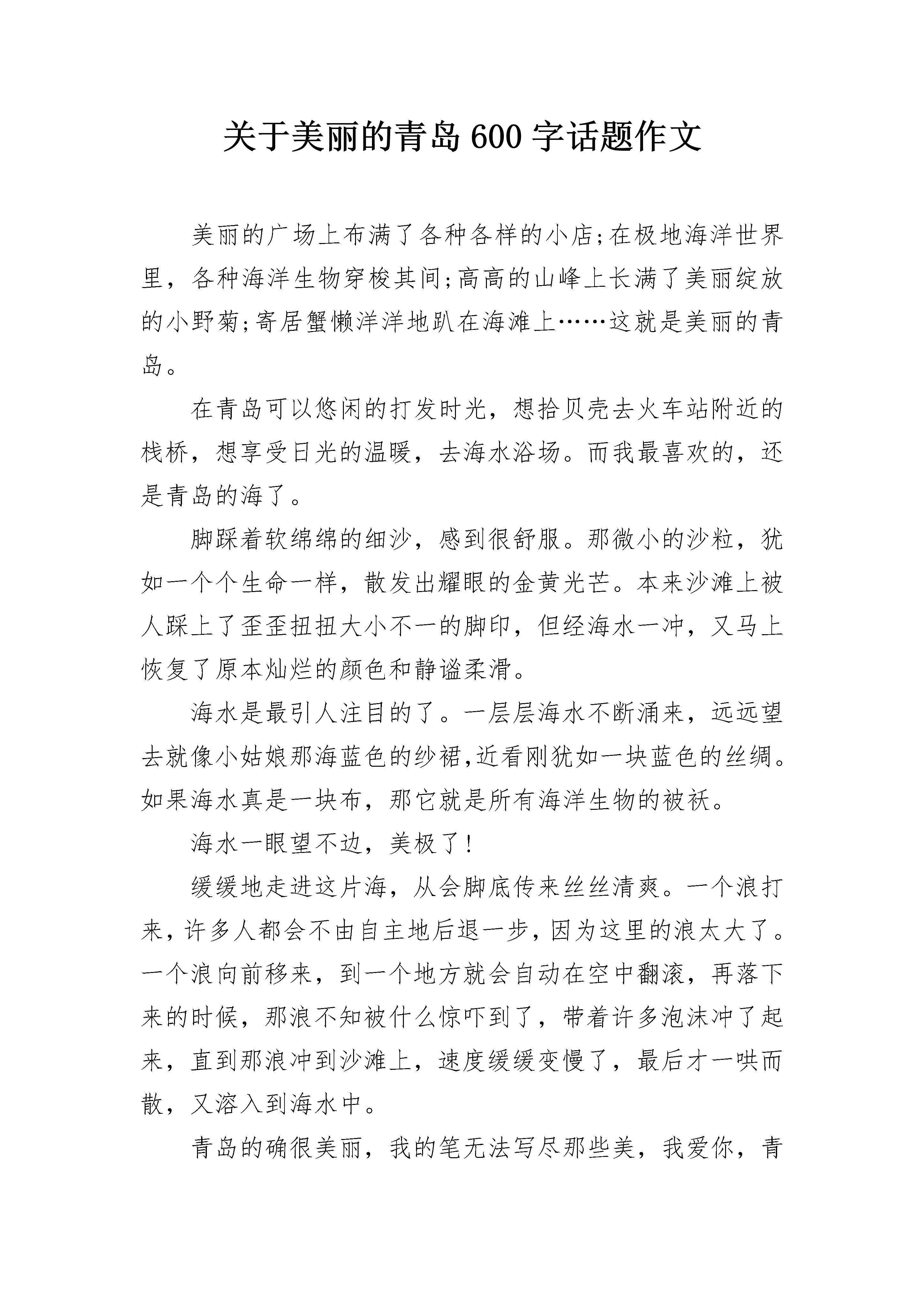 关于美丽的青岛600字话题作文美丽的广场上布满了各种各样的小店;在极地海洋世界里,各种海洋生物穿梭其间;高高的山峰上长满了美丽绽放的小野菊;寄居蟹懒洋洋地趴在海滩上……这就是美丽的青岛。在青岛可以悠闲的打发时光,想拾贝壳去火车站附近的栈桥,想享受日光的温暖,去海水浴场。而我最喜欢的,还是青岛的海了。脚踩着软绵绵的细沙,感到很舒服。那微小的沙粒,犹如一个个生命一样,散发出耀眼的金黄光芒。本来沙滩上被人踩上了歪歪扭扭大小不一的脚印,但经海水一冲,又马上恢复了原本灿烂的颜色和静谧柔滑。海水是最引人注目的了。一层层海水不断涌来,远远望去就像小姑娘那海蓝色的纱裙,近看刚犹如一块蓝色的丝绸。如果海水真是一块布,那它就是所有海洋生物的被袄。海水一眼望不边,美极了!缓缓地走进这片海,从会脚底传来丝丝清爽。一个浪打来,许多人都会不由自主地后退一步,因为这里的浪太大了。一个浪向前移来,到一个地方就会自动在空中翻滚,再落下来的时候,那浪不知被什么惊吓到了,带着许多泡沫冲了起来,直到那浪冲到沙滩上,速度缓缓变慢了,最后才一哄而散,又溶入到海水中。青岛的确很美丽,我的笔无法写尽那些美,我爱你,青岛!关于美丽的青岛600字话题作文2今年暑假我来到了向往以久的旅游圣地——青岛,这里的气候怡人,空气清新。随处可见烟波浩淼的大海水天一色。幽蓝的天空幽蓝的海水,足以使人心旷神怡。清晨,我们直奔海边,登上游艇,饱览了海滨的自然风光。海风吹来冷飕飕的。浪花在海风的吹送下变成无数的水珠打在我们的脸上、脚下,顿赶清凉。游客们的视线投向各个方向。最后全都集中到海中心的小岛上。导游阿姨告诉我们说:“这是小琴岛,再飞机上看就象一把倒挂的古琴,所以也叫琴岛”。后来因为岛上树木茂盛,郁郁葱葱、碧绿青翠,所以改名为青岛,青岛市的名字也由此而来。中午,我们坐上了市内观光车游览了《八大关》。它是青岛沦为殖民地时期由外国人修建的八种风格不同的别墅。每一座是一个国家的建筑所代表着一个国家。这已经是很古老的建筑了。在游玩中我无意间发现青岛的街道是用全国各省市的名称来命名的如:河南路、江苏路、山西路等。无论你来自哪个城市都会有种亲切感。这座城市还有一个特点,路线不是按东、西、南、北来划分,而是按前、后、左、右来定位。无论你乘车、问路,当地人只会告诉你:“往前、后、左、右”走,因为这座城市不是“方”的。云霄路是青岛的美食一条街,这里的海鲜琳琅满目、应有尽有。我们在这里吃了鲍鱼、螃蟹、哈蜊。来自各地的商贩聚集在此卖东西,我买了一些贝壳做的纪念品。下午,我们来到海滨浴场,盈盈的海水荡漾在脚边,海面上铺着一层海菜,海滩上躺着各式各样的贝壳和石头。这海水每晚都要涨潮。傍晚,我站在宾馆房间的窗前看见一浪接一浪的海潮不断冲刷着海滩,到处是浪花。真是一幅优美的风景画——红瓦、绿树、碧海、蓝天美丽的青岛啊!——难忘的海滨!关于美丽的青岛600字话题作文3今年暑假,我们坐着长途火车到了青岛。一下火车,便被火车站尖尖的房顶,还有大本钟所吸引。青岛火车站和其他的火车站都不一样,它不像是火车站,倒像是童话王国中的城堡一样。下午,我们迫不及待地穿过长长的海厎隧道到了黄岛。黄岛的金沙滩的沙子又细又黄,放眼望去就像无数的金币一样。海水里不时漂着青绿色的海带,还有欢快的小鱼。我和小伙伴们已经按捺不住心中的激动,跳进无边的大海,冲浪,游泳,捞海带,挖沙,修城堡,真是快乐极了。我在心中默念:大海,我又来了。晚上,我们去了青岛著名的栈桥,那里还停着一艘军舰。站在栈桥边,望着对面的小青岛,吹着习习的海风,非常的凉快。第二天,我们去青岛奥帆中心附近每人租了一辆自行车,开始环海骑游了。一路上,我们的10人自行车队像羚羊迁徙一样在环海路上骑行,看着路边的海岸线,近看波涛汹涌,远看帆船点点,还有好多人在海边照相,真是漂亮极了。我们继续骑行,突然海岸线中出现了一片礁石,大海和沙滩连在一起。妈妈说:“有礁石和大海的地方说不定有海蟹哦”。于是,我们下去找寻了。妈妈教我把礁石搬起来,果然,我看到了一只小小的螃蟹,身上有很多花纹,我一下按住了它,就把这只小海蟹捉住了。这里的礁石下还有很多很多的小螃蟹,有时候,随便翻开一块小礁石,就能发现好几只。我捉了满满的一大瓶,高兴坏了。晚上,我们去青岛当地的市场买了很多新鲜的.海鲜:活虾、活螃蟹,生蚝、扇贝,都非常的便宜,再拿到当地的饭店加工,然后喝着青岛啤酒,和小伙伴们聊着天,真是安逸极了。青岛是一座美丽的城市,我喜欢那里的大海,喜欢那里的房子,也喜欢那里的海鲜。关于美丽的青岛600字话题作文4暑假,我们一家人去青岛游玩。青岛是一座美丽的海滨城市,三面环海,一面接陆,巍峨的崂山傍海屹立,风光秀丽,气候宜人。“红瓦绿树,碧海蓝天”辉映出青岛特有的美丽身姿,具有典型欧式风光的`建筑,形成了中西合璧,欧亚风情的特色