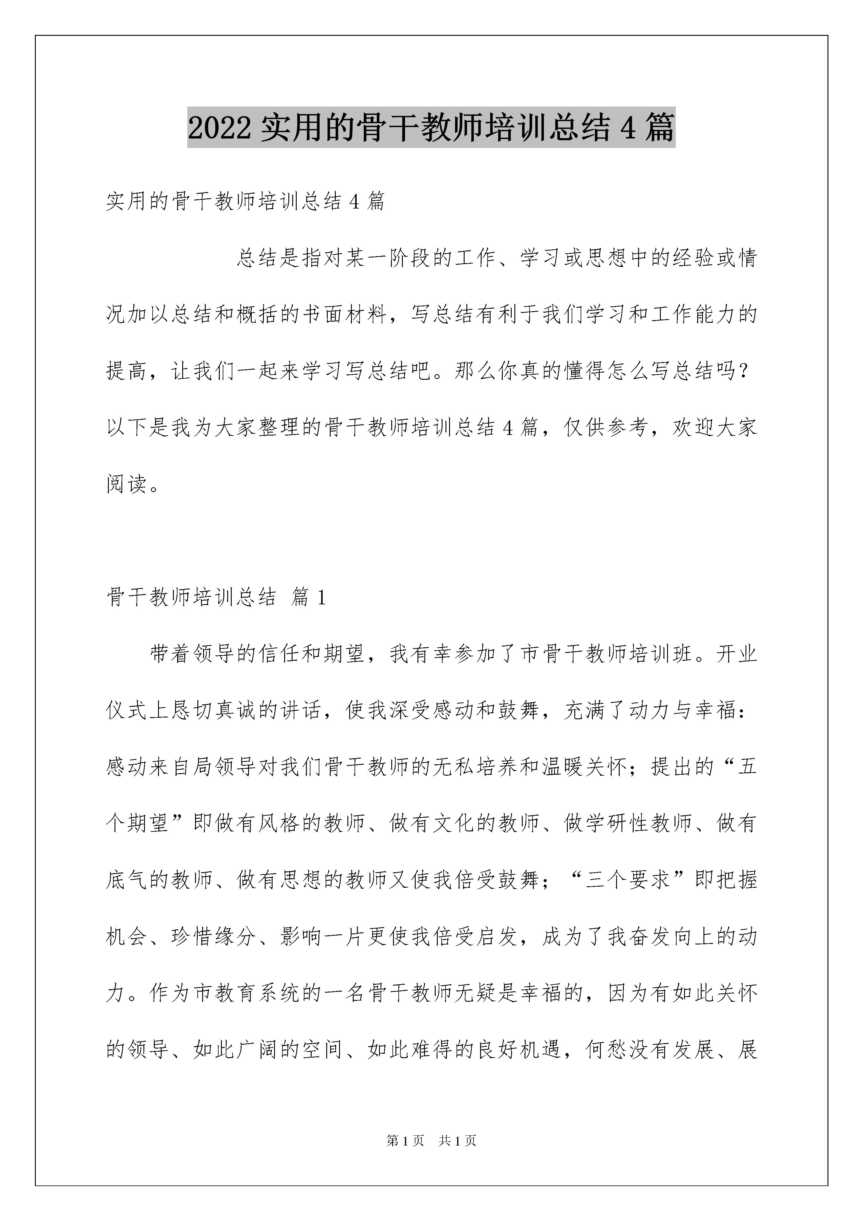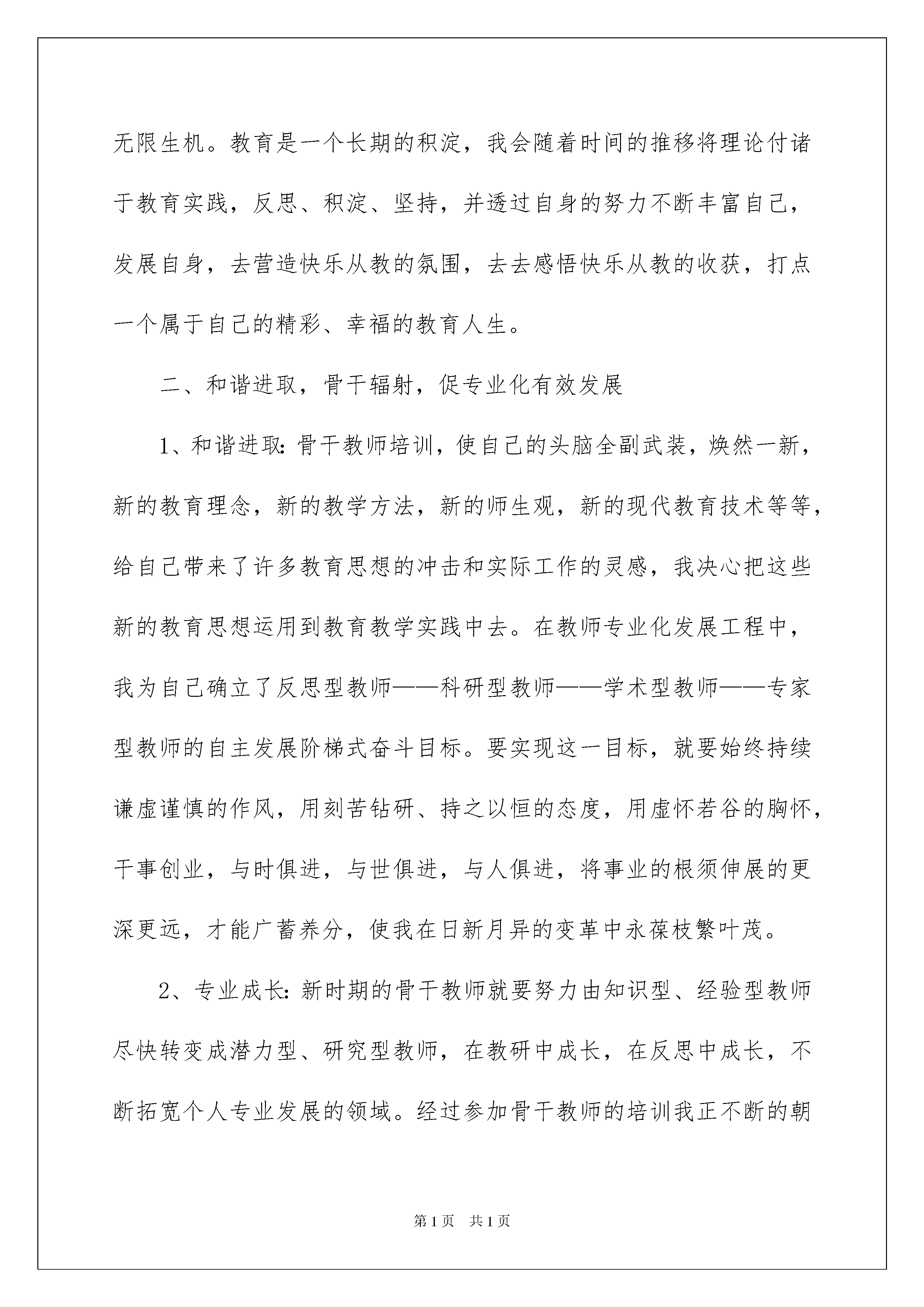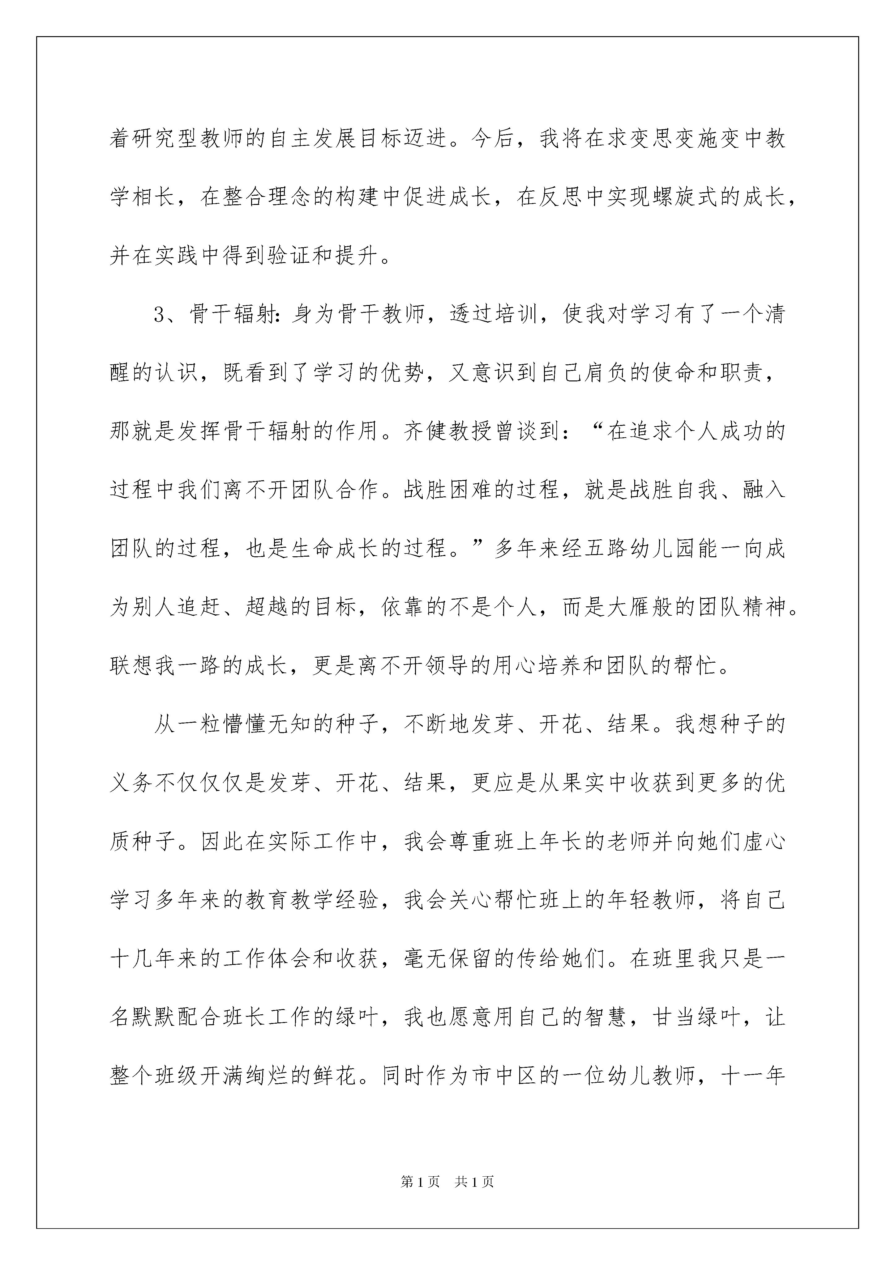 2022实用的骨干教师培训总结4篇实用的骨干教师培训总结4篇总结是指对某一阶段的工作、学习或思想中的经验或情况加以总结和概括的书面材料,写总结有利于我们学习和工作能力的提高,让我们一起来学习写总结吧。那么你真的懂得怎么写总结吗?以下是我为大家整理的骨干教师培训总结4篇,仅供参考,欢迎大家阅读。骨干教师培训总结篇1带着领导的信任和期望,我有幸参加了市骨干教师培训班。开业仪式上恳切真诚的讲话,使我深受感动和鼓舞,充满了动力与幸福:感动来自局领导对我们骨干教师的无私培养和温暖关怀;提出的“五个期望”即做有风格的教师、做有文化的教师、做学研性教师、做有底气的教师、做有思想的教师又使我倍受鼓舞;“三个要求”即把握机会、珍惜缘分、影响一片更使我倍受启发,成为了我奋发向上的动力。作为市教育系统的一名骨干教师无疑是幸福的,因为有如此关怀的领导、如此广阔的空间、如此难得的良好机遇,何愁没有发展、展示的舞台呢?抓住这次学习的机会,充实完善自我,以实际行动向局党委交一份满意答卷的思想,就这样开始在我的心中悄悄地萌动。历时一个多月的小班化的菜单式培训,资料丰富,形式多样,有理论学习、有观摩交流、有现场互动、有课后作业,我们不仅仅有幸领略了教育领域专家学者的风采,开阔了眼界,更重要的是明确了培训的目的和好处,那就是:怎样与自己的实际工作相结合,做到学以致用,学有所为。一、专家引领,完善自我,打点幸福人生感谢本次培训带给我们的专家引领,如果没有专业引领,也许我们只是一味埋头苦干;如果没有专业引领,也许我们只是一只“井底之蛙”。就应庆幸,我们能处在一个注重专业知识、提倡专家引领的市中教育,透过专家的引领,促进了我们自身的专业化成长。此刻回想,全国特级教师于永正“教出孩子恍然大悟”的精彩课堂场景仍时时浮现于眼前;省教育学院齐健教授对于“教师何以走向成功?”的精辟论述仍常常回荡耳边;省教育社陶继新总编机智幽默、乐观谦虚、宽容大度、高贵自信的大家风范仍时时撞击着我的心灵;心理学专家张桂薇老师形象生动、言简意赅阐述的四种类型教师心理健康对学生的影响使我们茅塞顿开;首席班主任王欢欢色香味俱全的“治班级若烹小鲜”使我们感同身受,回味无穷,久久沉浸在作为教师的幸福中……这些名师大家带给我们的不仅仅仅是独到的见解、先进的思想、丰富的知识及精湛的理论阐述,更重要的是带给了我们做学问和做人的道理。他们的讲座折射出一种职责:国家昌盛,系于教育;教育昌盛,系于我身;他们的阐述中表现出一种学者风范:敬业、精业、幽默、谦虚、乐观、朴实;他们的课堂传递着和谐、自信……这些精神与品质都深深感染着我,激励着我。聆听专家们的讲座使我意识到努力做到内在和谐、精神高贵、充满自信、走近审美,不断丰富自我、不断完善自我、不断超越自我,把自我完善与团队和谐统一齐来,才能与学生过上一种幸福完整的教育生活,实现教学生与教师发展的双赢。本次培训,我抱着感恩与珍惜的态度,力求抓住机会,尽自己所能去获取更多、更广、更新的信息,使我对教育教学的理论与方法掌握得更加系统;对一些教育观念的理解更加深刻;对教学理论的认识更加明晰;对开展教研活动的方式更加明确;对投身教育改革的激情更加充沛。此次师培训使我补了元气,添了灵气,去了骄气,焕发出无限生机。教育是一个长期的积淀,我会随着时间的推移将理论付诸于教育实践,反思、积淀、坚持,并透过自身的努力不断丰富自己,发展自身,去营造快乐从教的氛围,去去感悟快乐从教的收获,打点一个属于自己的精彩、幸福的教育人生。二、和谐进取,骨干辐射,促专业化有效发展1、和谐进取:骨干教师培训,使自己的头脑全副武装,焕然一新,新的教育理念,新的教学方法,新的师生观,新的现代教育技术等等,给自己带来了许多教育思想的冲击和实际工作的灵感,我决心把这些新的教育思想运用到教育教学实践中去。在教师专业化发展工程中,我为自己确立了反思型教师——科研型教师——学术型教师——专家型教师的自主发展阶梯式奋斗目标。要实现这一目标,就要始终持续谦虚谨慎的作风,用刻苦钻研、持之以恒的态度,用虚怀若谷的胸怀,干事创业,与时俱进,与世俱进,与人俱进,将事业的根须伸展的更深更远,才能广蓄养分,使我在日新月异的变革中永葆枝繁叶茂。2、专业成长:新时期的骨干教师就要努力由知识型、经验型教师尽快转变成潜力型、研究型教师,在教研中成长,在反思中成长,不断拓宽个人专业发展的领域。经过参加骨干教师的培训我正不断的朝着研究型教师的自主发展目标迈进。今后,我将在求变思变施变中教学相长,在整合理念的构建中促进成长,在反思中实现螺旋式的成长,并在实践中得到验证和提升。3、骨干辐射:身为骨干教