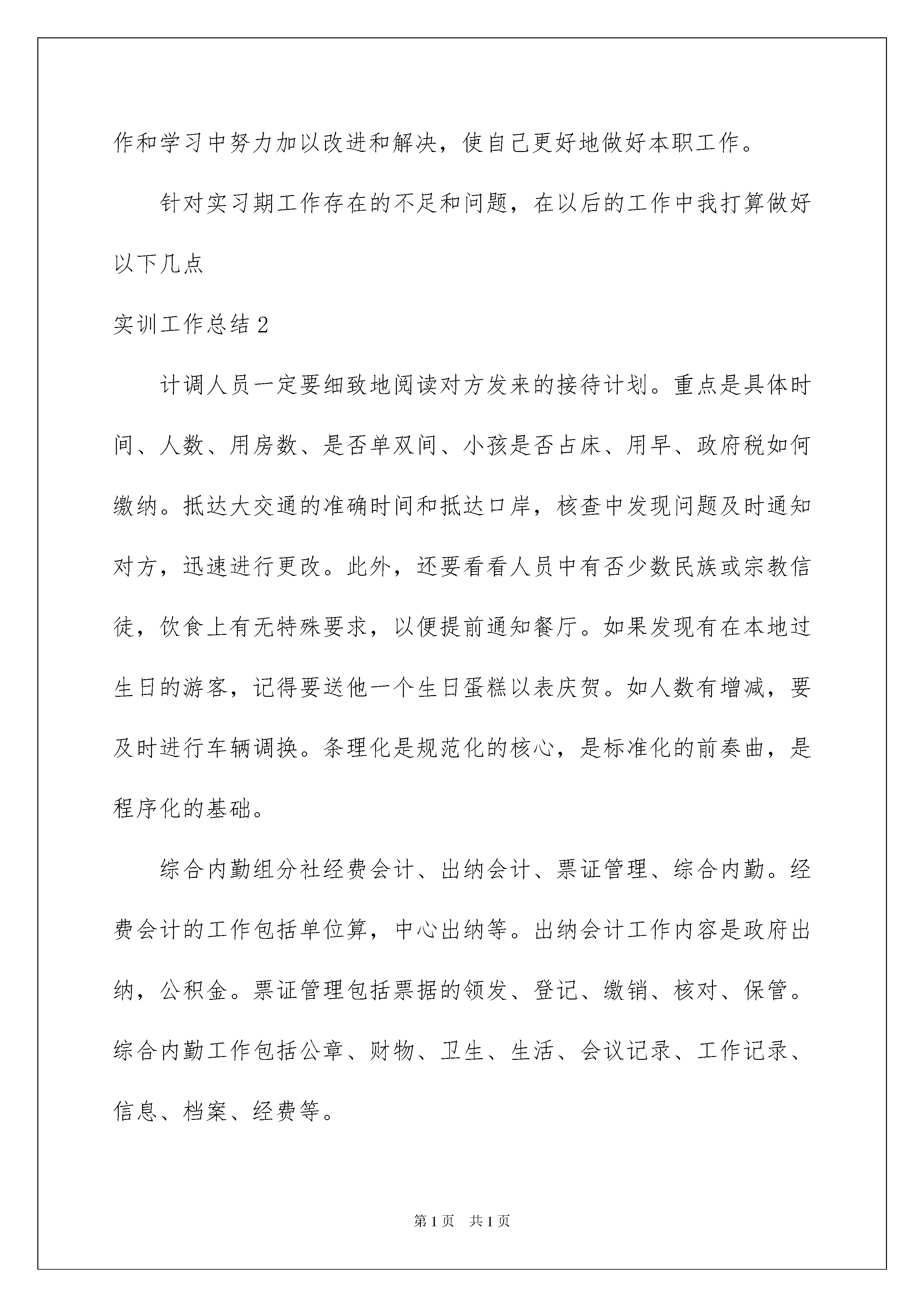 2022实训工作总结实训工作总结总结是事后对某一阶段的学习、工作或其完成情况加以回顾和分析的一种书面材料,它有助于我们寻找工作和事物发展的规律,从而掌握并运用这些规律,让我们来为自己写一份总结吧。那么你知道总结如何写吗?下面是我收集整理的实训工作总结,欢迎大家借鉴与参考,希望对大家有所帮助。实训工作总结1转眼之间,两个月的实习期即将结束,回顾这两个月的实习工作,感触很深,收获颇丰。这两个月,在领导和同事们的悉心关怀和指导下,通过我自身的不懈努力,我学到了人生难得的工作经验和社会见识。我将从以下几个方面总结软件技术岗位工作实习这段时间自己体会和心得:一、努力学习,理论结合实践,不断提高自身工作能力。在软件技术岗位工作的实习过程中,我始终把学习作为获得新知识、掌握方法、提高能力、解决问题的一条重要途径和方法,切实做到用理论武装头脑、指导实践、推动工作。思想上积极进取,积极的把自己现有的知识用于社会实践中,在实践中也才能检验知识的有用性。在这两个月的实习工作中给我最大的感触就是:我们在学校学到了很多的理论知识,但很少用于社会实践中,这样理论和实践就大大的脱节了,以至于在以后的学习和生活中找不到方向,无法学以致用。同时,在工作中不断的学习也是弥补自己的不足的有效方式。信息时代,瞬息万变,社会在变化,人也在变化,所以你一天不学习,你就会落伍。通过这两个月的实习,并结合软件技术岗位工作的实际情况,认真学习的软件技术岗位工作各项政策制度、管理制度和工作条例,使工作中的困难有了最有力地解决武器。通过这些工作条例的学习使我进一步加深了对各项工作的理解,可以求真务实的开展各项工作。二、围绕工作,突出重点,尽心尽力履行职责。在软件技术岗位工作中我都本着认真负责的态度去对待每项工作。虽然开始由于经验不足和认识不够,觉得在软件技术岗位工作中找不到事情做,不能得到锻炼的目的,但我迅速从自身出发寻找原因,和同事交流,认识到自己的不足,以至于迅速的转变自己的角色和工作定位。为使自己尽快熟悉工作,进入角色,我一方面抓紧时间查看相关资料,熟悉自己的工作职责,另一方面我虚心向领导、同事请教使自己对软件技术岗位工作的情况有了一个比较系统、全面的认知和了解。根据软件技术岗位工作的实际情况,结合自身的优势,把握工作的重点和难点,尽心尽力完成软件技术岗位工作的任务。两个月的实习工作,我经常得到了同事的好评和领导的赞许。三、转变角色,以极大的热情投入到工作中。从大学校门跨入到软件技术岗位工作岗位,一开始我难以适应角色的转变,不能发现问题,从而解决问题,认为没有多少事情可以做,我就有一点失望,开始的热情有点消退,完全找不到方向。但我还是尽量保持当初的那份热情,想干有用的事的态度,不断的做好一些杂事,同时也勇于协助同事做好各项工作,慢慢的就找到了自己的角色,明白自己该干什么,这就是一个热情的问题,只要我保持极大的热情,相信自己一定会得到认可,没有不会做,没有做不好,只有你愿不愿意做。转变自己的角色,从一位学生到一位工作人员的转变,不仅仅是角色的变化,更是思想观念的转变。四、发扬团队精神,在完成本职工作的同时协同其他同事。在工作间能得到领导的充分信任,并在按时完成上级分配给我的各项工作的同时,还能积极主动地协助其他同事处理一些内务工作。个人的能力只有融入团队,才能实现最大的价值。实习期的工作,让我充分认识到团队精神的重要性。团队的精髓是共同进步。没有共同进步,相互合作,团队如同一盘散沙。相互合作,团队就会齐心协力,成为一个强有力的集体。很多人经常把团队和工作团体混为一谈,其实两者之间存在本质上的区别。优秀的工作团体与团队一样,具有能够一起分享信息、观点和创意,共同决策以帮助每个成员能够更好地工作,同时强化个人工作标准的特点。但工作团体主要是把工作目标分解到个人,其本质上是注重个人目标和责任,工作团体目标只是个人目标的简单总和,工作团体的成员不会为超出自己义务范围的结果负责,也不会尝试那种因为多名成员共同工作而带来的增值效应。五、存在的问题。几个月来,我虽然努力做了一些工作,但距离领导的要求还有不小差距,如理论水平、工作能力上还有待进一步提高,对软件技术岗位工作岗位还不够熟悉等等,这些问题,我决心实习报告在今后的工作和学习中努力加以改进和解决,使自己更好地做好本职工作。针对实习期工作存在的不足和问题,在以后的工作中我打算做好以下几点实训工作总结2计调人员一定要细致地阅读对方发来的接待计划。重点是具体时间、人数、用房数、是否单双间、小孩是否占床、用早、政府税如何缴纳。抵达大交通的准确时间和抵达口岸,核查中发现问题及时通知对方,迅