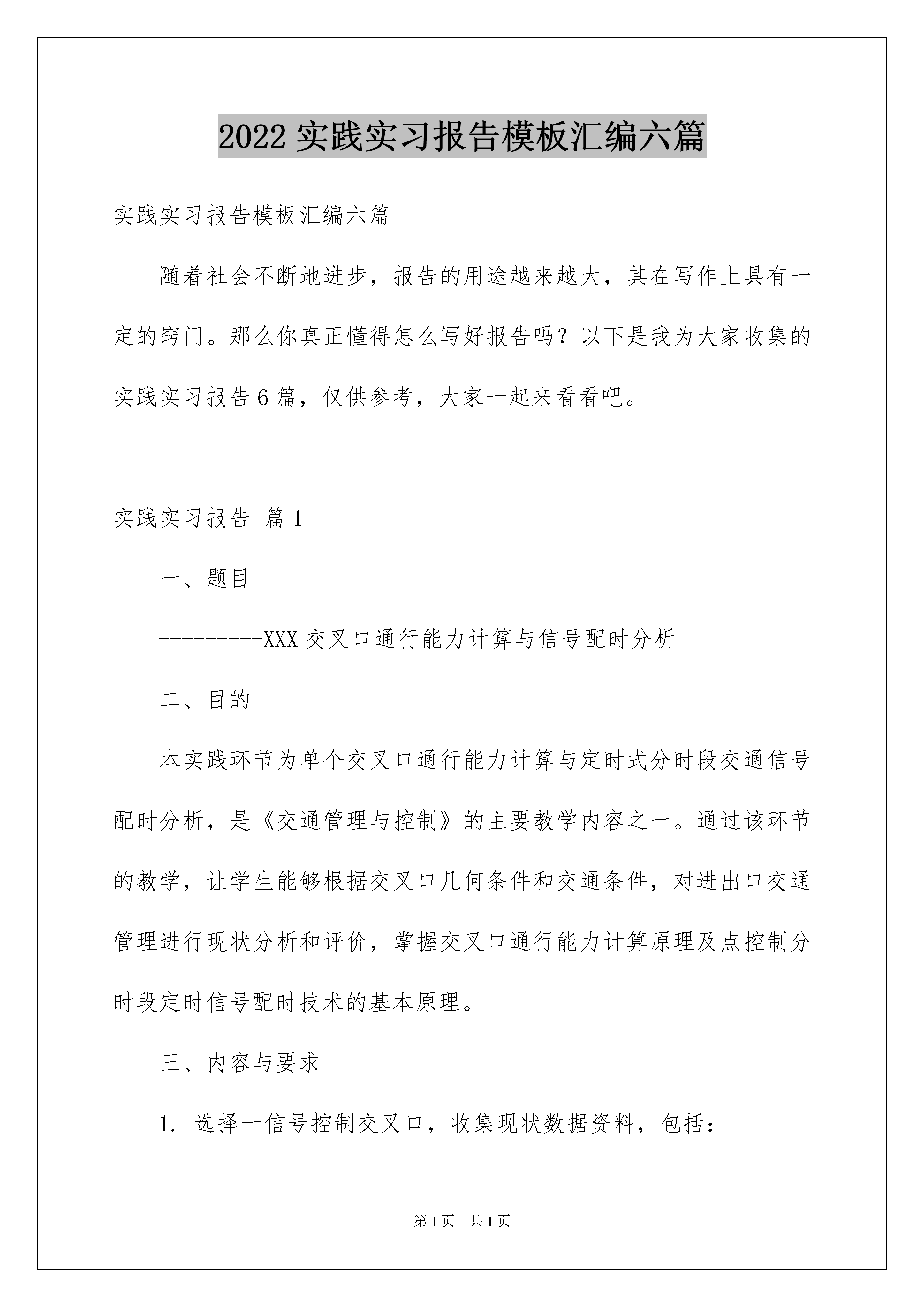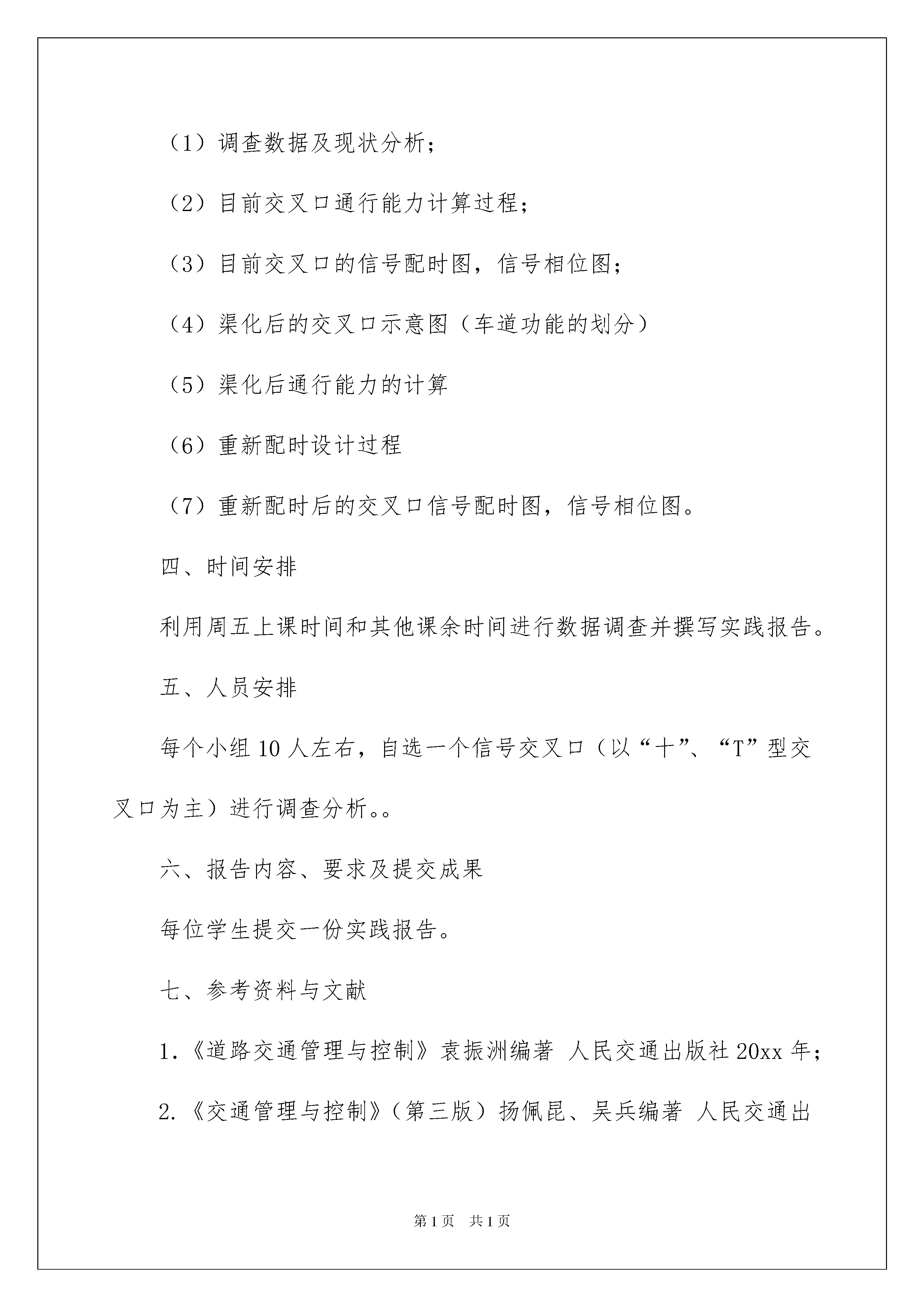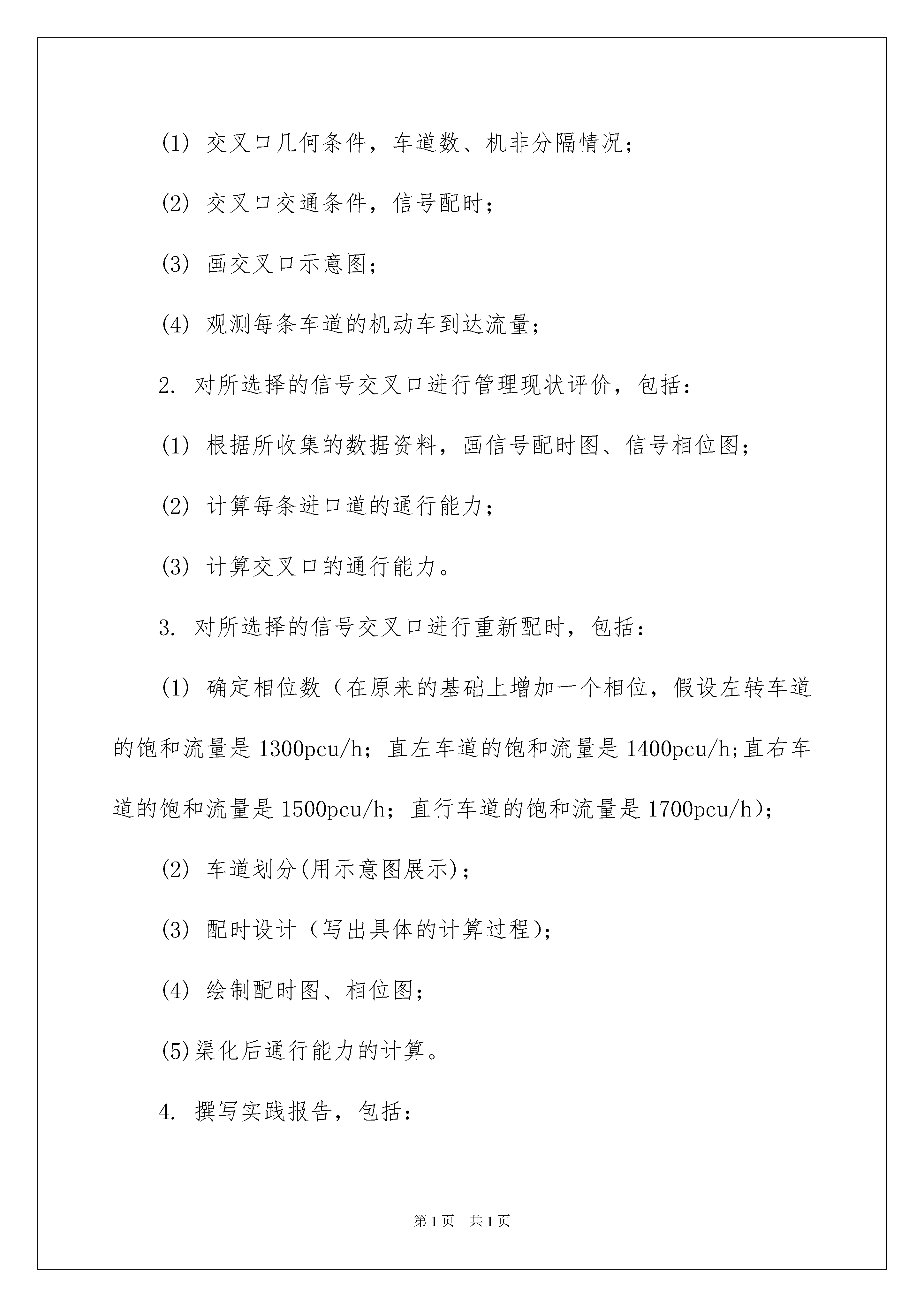 2022实践实习报告模板汇编六篇实践实习报告模板汇编六篇随着社会不断地进步,报告的用途越来越大,其在写作上具有一定的窍门。那么你真正懂得怎么写好报告吗?以下是我为大家收集的实践实习报告6篇,仅供参考,大家一起来看看吧。实践实习报告篇1一、题目---------XXX交叉口通行能力计算与信号配时分析二、目的本实践环节为单个交叉口通行能力计算与定时式分时段交通信号配时分析,是《交通管理与控制》的主要教学内容之一。通过该环节的教学,让学生能够根据交叉口几何条件和交通条件,对进出口交通管理进行现状分析和评价,掌握交叉口通行能力计算原理及点控制分时段定时信号配时技术的基本原理。三、内容与要求1.选择一信号控制交叉口,收集现状数据资料,包括:(1)交叉口几何条件,车道数、机非分隔情况;(2)交叉口交通条件,信号配时;(3)画交叉口示意图;(4)观测每条车道的机动车到达流量;2.对所选择的信号交叉口进行管理现状评价,包括:(1)根据所收集的数据资料,画信号配时图、信号相位图;(2)计算每条进口道的通行能力;(3)计算交叉口的通行能力。3.对所选择的信号交叉口进行重新配时,包括:(1)确定相位数(在原来的基础上增加一个相位,假设左转车道的饱和流量是1300pcu/h;直左车道的饱和流量是1400pcu/h;直右车道的饱和流量是1500pcu/h;直行车道的饱和流量是1700pcu/h);(2)车道划分(用示意图展示);(3)配时设计(写出具体的计算过程);(4)绘制配时图、相位图;(5)渠化后通行能力的计算。4.撰写实践报告,包括:(1)调查数据及现状分析;(2)目前交叉口通行能力计算过程;(3)目前交叉口的信号配时图,信号相位图;(4)渠化后的交叉口示意图(车道功能的划分)(5)渠化后通行能力的计算(6)重新配时设计过程(7)重新配时后的交叉口信号配时图,信号相位图。四、时间安排利用周五上课时间和其他课余时间进行数据调查并撰写实践报告。五、人员安排每个小组10人左右,自选一个信号交叉口(以“十”、“T”型交叉口为主)进行调查分析。。六、报告内容、要求及提交成果每位学生提交一份实践报告。七、参考资料与文献1.《道路交通管理与控制》袁振洲编著人民交通出版社20xx年;2.《交通管理与控制》(第三版)扬佩昆、吴兵编著人民交通出版社20xx年;3.《交通调查与分析》(第二版)王建军严宝杰主编著,李江主审,人民交通出版社,20xx年9月;4.《交通工程手册》人民交通出版社1998年5.《城市道路交通设计指南》杨晓光等著,人民交通出版社20xx年;6.《城市交通管理评价体系》陆化普王建伟等著,人民交通出版社20xx年;实践实习报告篇2(1)这里也是我们初涉社会的开端,迈向美好而残酷的未来,我一直坚信自己的能力,即使人生路如顺德四通八达的公路,但方向只有一个,那就是前进,永不言弃,永不退缩!(2)"纸上得来终觉浅,绝知此事要躬行."在短暂的实习过程中,我深深的感觉到自己所学知识的肤浅和在实际运用中的专业知识的匮乏,刚开始的一段时间里,对一些工作感到无从下手,茫然不知所措,这让我感到非常的难过.在学校总以为自己学的不错,一旦接触到实际,才发现自己知道的是多么少,这时才真正领悟到"学无止境"的含义.(3)实习的日子我们收获了大学的课堂里没有的许多东西,学到了为人处世的许多道理与方法,学会了怎样学习,也学会了把一根警醒自己的惰性、使自己始终保持自强不息良好心态.我觉得收获真是非常的大,实习报告的结束语。可能使我从家两点一式的生活所致,还有我对社会的渴望了解,实习报告《实习报告的结束语》。以后的每个假期我都会道公司实习,为毕业以后到社会工作奠定基础,铺平道路。该经理的总归都要经历,只是早与完的问题。,课本上学的知识都是最基本的知识,不管现实情况怎样变化,抓住了最基本的就可以以不变应万变。如今有不少学生实习时都觉得课堂上学的知识用不上,出现挫折感,可我觉得,要是没有书本知识作铺垫,又哪应付瞬息万变的社会呢?经过这次实践,虽然时间很短。可我学到的却是我一个学期在学校难以了解的。就比如何与同事们相处,相信人际关系是现今不少大学生刚踏出社会遇到的一大难题,于是在实习时我便有意观察前辈们是如何和同事以及上级相处的,而自己也尽量虚心求教,不耻下问。(4)实习是一次用自己的眼和耳去感受环境的机会,通过假期的这段实习,我受益匪浅,我对自己的专业有了更为详尽而深刻的了解,认识到了许多在学校学不到的东西,不在局限于书本,而是有了一个比较全面的了解。从而更深的了解的了自己的不足,该往哪个方向而努力,这些都是以前所部了解的。(5)