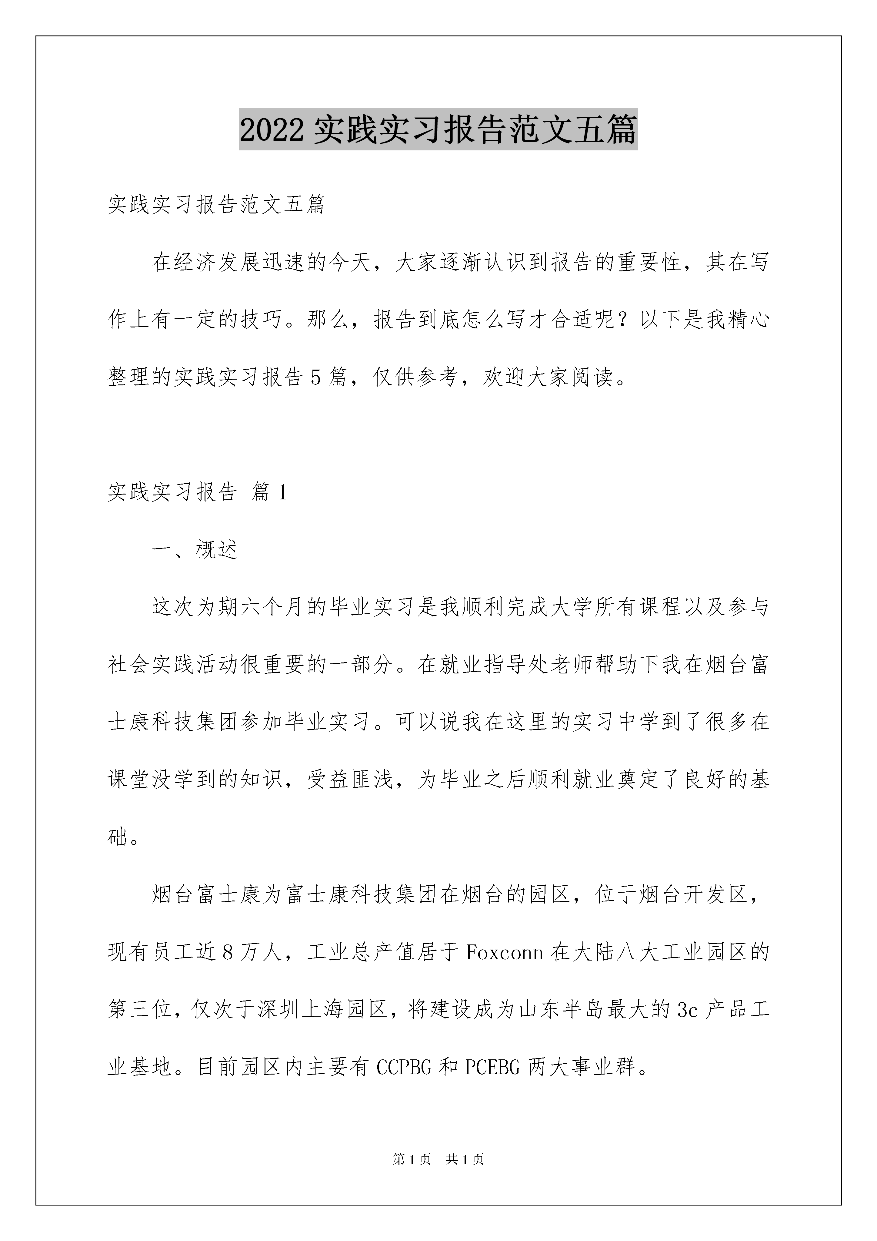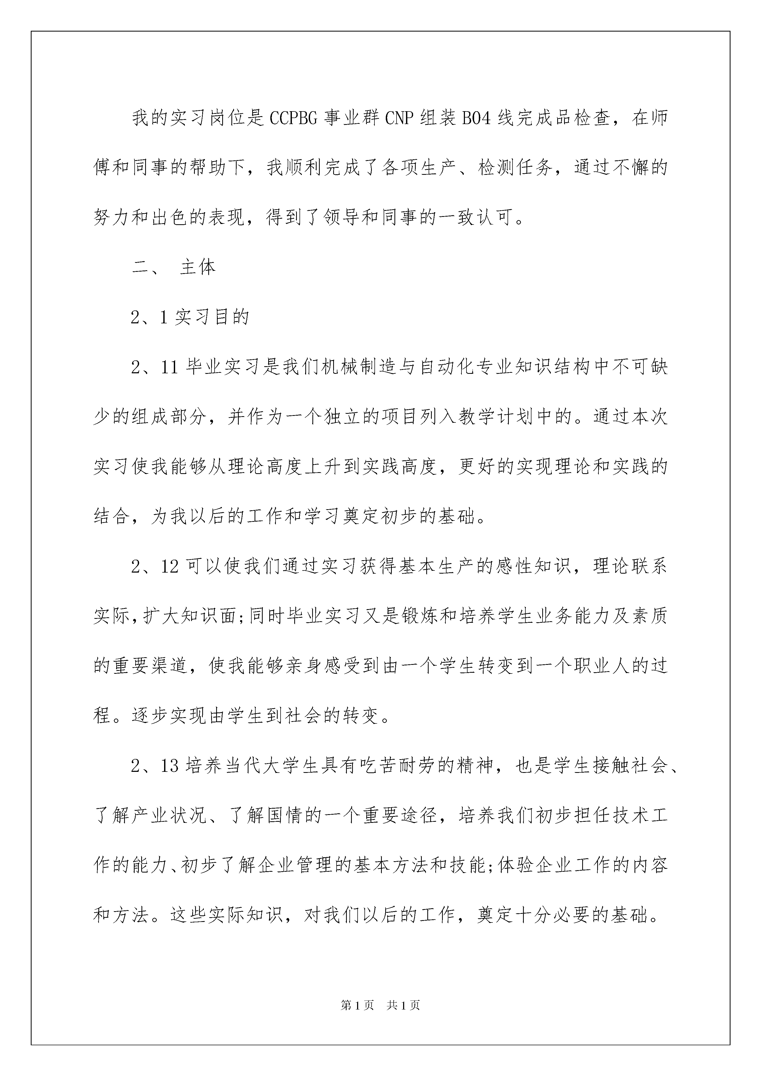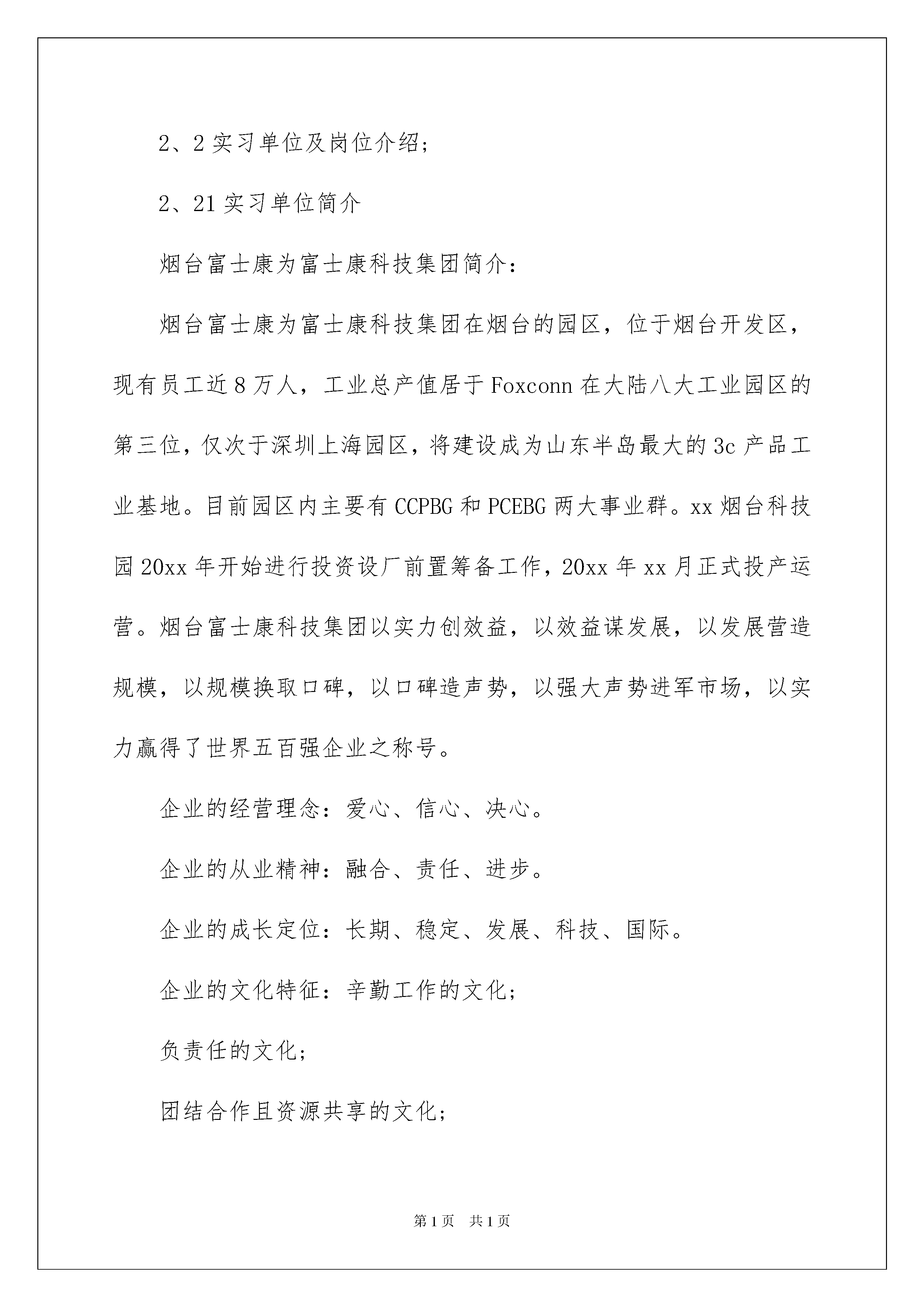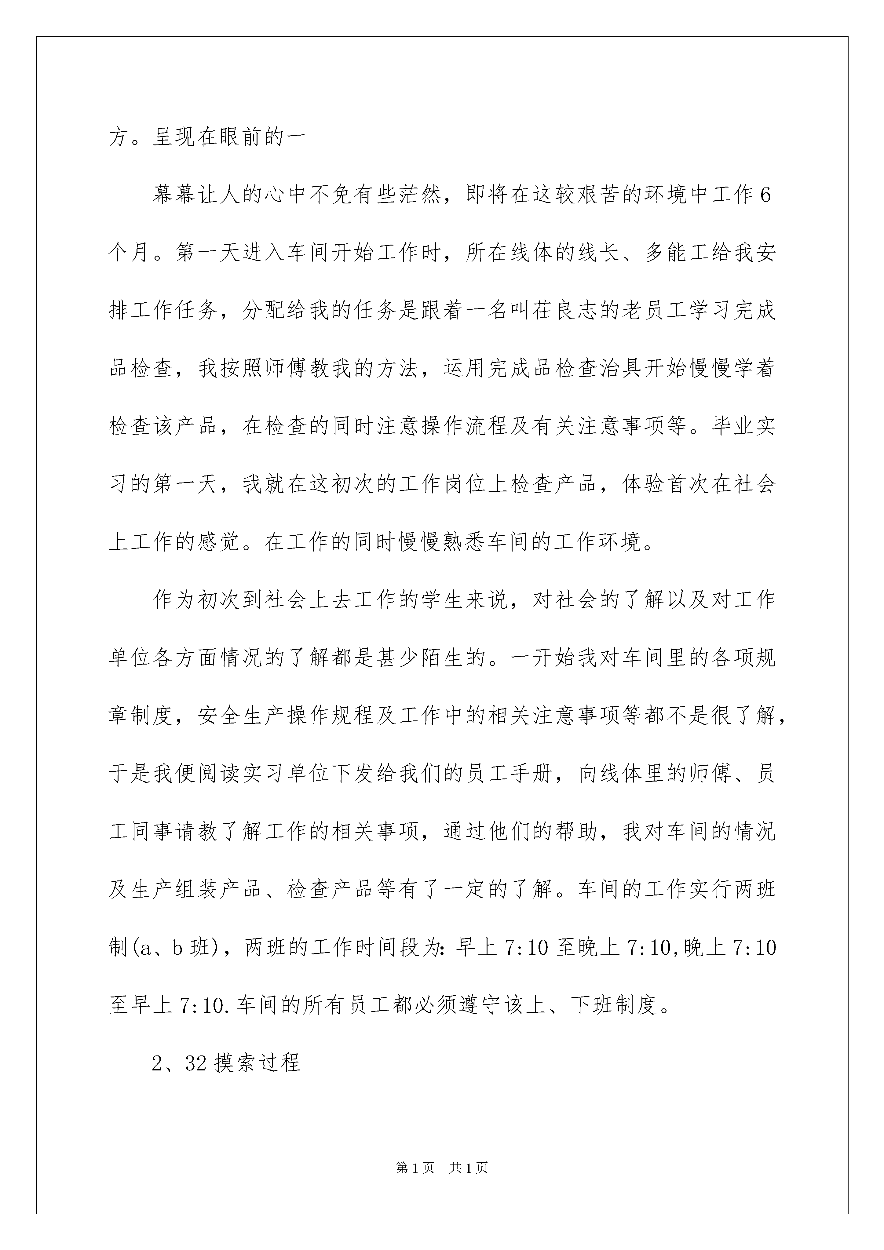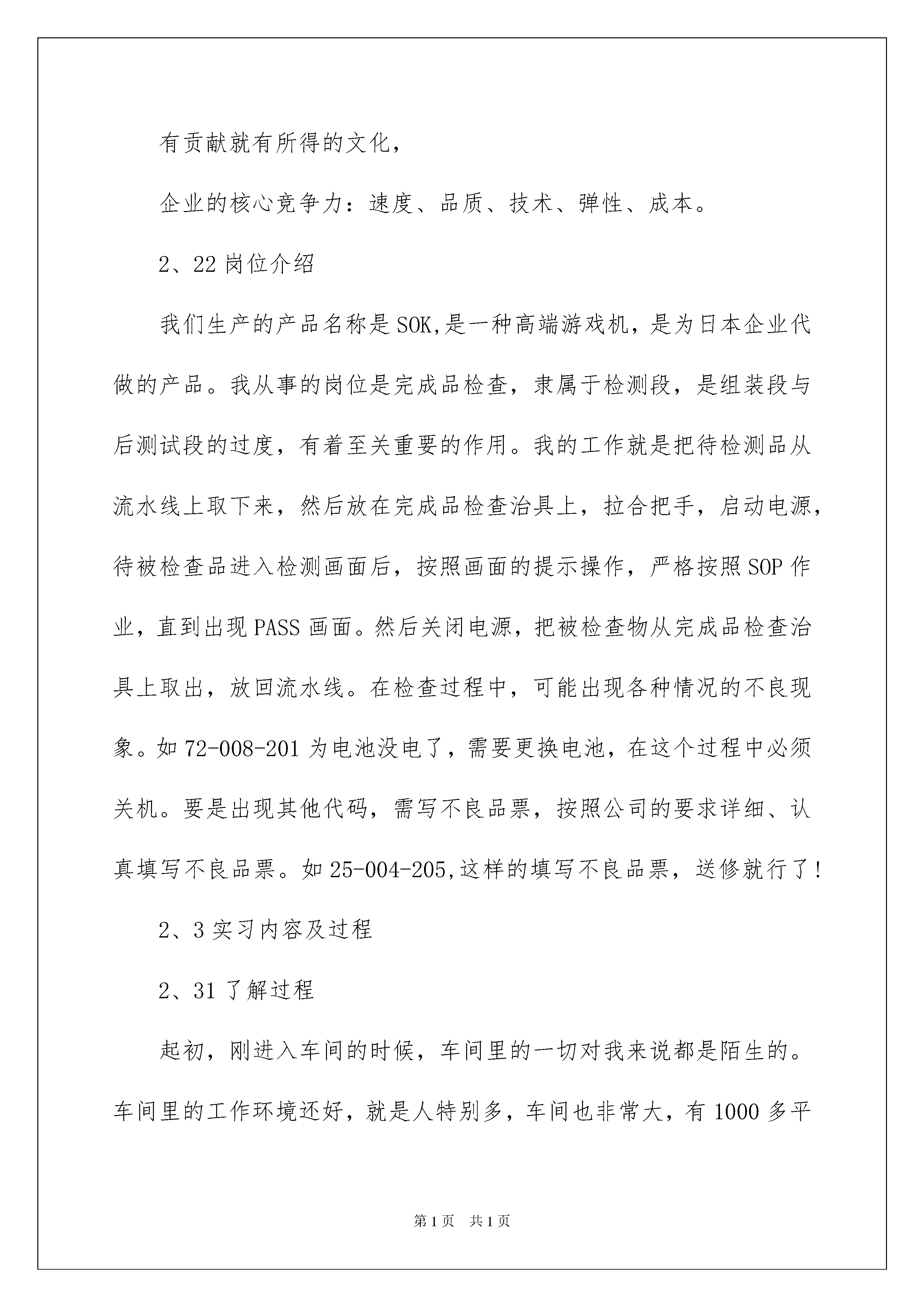 2022实践实习报告范文五篇实践实习报告范文五篇在经济发展迅速的今天,大家逐渐认识到报告的重要性,其在写作上有一定的技巧。那么,报告到底怎么写才合适呢?以下是我精心整理的实践实习报告5篇,仅供参考,欢迎大家阅读。实践实习报告篇1一、概述这次为期六个月的毕业实习是我顺利完成大学所有课程以及参与社会实践活动很重要的一部分。在就业指导处老师帮助下我在烟台富士康科技集团参加毕业实习。可以说我在这里的实习中学到了很多在课堂没学到的知识,受益匪浅,为毕业之后顺利就业奠定了良好的基础。烟台富士康为富士康科技集团在烟台的园区,位于烟台开发区,现有员工近8万人,工业总产值居于Foxconn在大陆八大工业园区的第三位,仅次于深圳上海园区,将建设成为山东半岛最大的3c产品工业基地。目前园区内主要有CCPBG和PCEBG两大事业群。我的实习岗位是CCPBG事业群CNP组装B04线完成品检查,在师傅和同事的帮助下,我顺利完成了各项生产、检测任务,通过不懈的努力和出色的表现,得到了领导和同事的一致认可。二、主体2、1实习目的2、11毕业实习是我们机械制造与自动化专业知识结构中不可缺少的组成部分,并作为一个独立的项目列入教学计划中的。通过本次实习使我能够从理论高度上升到实践高度,更好的实现理论和实践的结合,为我以后的工作和学习奠定初步的基础。2、12可以使我们通过实习获得基本生产的感性知识,理论联系实际,扩大知识面;同时毕业实习又是锻炼和培养学生业务能力及素质的重要渠道,使我能够亲身感受到由一个学生转变到一个职业人的过程。逐步实现由学生到社会的转变。2、13培养当代大学生具有吃苦耐劳的精神,也是学生接触社会、了解产业状况、了解国情的一个重要途径,培养我们初步担任技术工作的能力、初步了解企业管理的基本方法和技能;体验企业工作的内容和方法。这些实际知识,对我们以后的工作,奠定十分必要的基础。2、2实习单位及岗位介绍;2、21实习单位简介烟台富士康为富士康科技集团简介:烟台富士康为富士康科技集团在烟台的园区,位于烟台开发区,现有员工近8万人,工业总产值居于Foxconn在大陆八大工业园区的第三位,仅次于深圳上海园区,将建设成为山东半岛最大的3c产品工业基地。目前园区内主要有CCPBG和PCEBG两大事业群。xx烟台科技园20xx年开始进行投资设厂前置筹备工作,20xx年xx月正式投产运营。烟台富士康科技集团以实力创效益,以效益谋发展,以发展营造规模,以规模换取口碑,以口碑造声势,以强大声势进军市场,以实力赢得了世界五百强企业之称号。企业的经营理念:爱心、信心、决心。企业的从业精神:融合、责任、进步。企业的成长定位:长期、稳定、发展、科技、国际。企业的文化特征:辛勤工作的文化;负责任的文化;团结合作且资源共享的文化;有贡献就有所得的文化,企业的核心竞争力:速度、品质、技术、弹性、成本。2、22岗位介绍我们生产的产品名称是SOK,是一种高端游戏机,是为日本企业代做的产品。我从事的岗位是完成品检查,隶属于检测段,是组装段与后测试段的过度,有着至关重要的作用。我的工作就是把待检测品从流水线上取下来,然后放在完成品检查治具上,拉合把手,启动电源,待被检查品进入检测画面后,按照画面的提示操作,严格按照SOP作业,直到出现PASS画面。然后关闭电源,把被检查物从完成品检查治具上取出,放回流水线。在检查过程中,可能出现各种情况的不良现象。如72-008-201为电池没电了,需要更换电池,在这个过程中必须关机。要是出现其他代码,需写不良品票,按照公司的要求详细、认真填写不良品票。如25-004-205,这样的填写不良品票,送修就行了!2、3实习内容及过程2、31了解过程起初,刚进入车间的时候,车间里的一切对我来说都是陌生的。车间里的工作环境还好,就是人特别多,车间也非常大,有1000多平方。呈现在眼前的一幕幕让人的心中不免有些茫然,即将在这较艰苦的环境中工作6个月。第一天进入车间开始工作时,所在线体的线长、多能工给我安排工作任务,分配给我的任务是跟着一名叫茌良志的老员工学习完成品检查,我按照师傅教我的方法,运用完成品检查治具开始慢慢学着检查该产品,在检查的同时注意操作流程及有关注意事项等。毕业实习的第一天,我就在这初次的工作岗位上检查产品,体验首次在社会上工作的感觉。在工作的同时慢慢熟悉车间的工作环境。作为初次到社会上去工作的学生来说,对社会的了解以及对工作单位各方面情况的了解都是甚少陌生的。一开始我对车间里的各项规章制度,安全生产操作规程及工作中的相关注意事项等都不是很了解,于是我便阅读实习单位下发给我们的员工手册,向线体